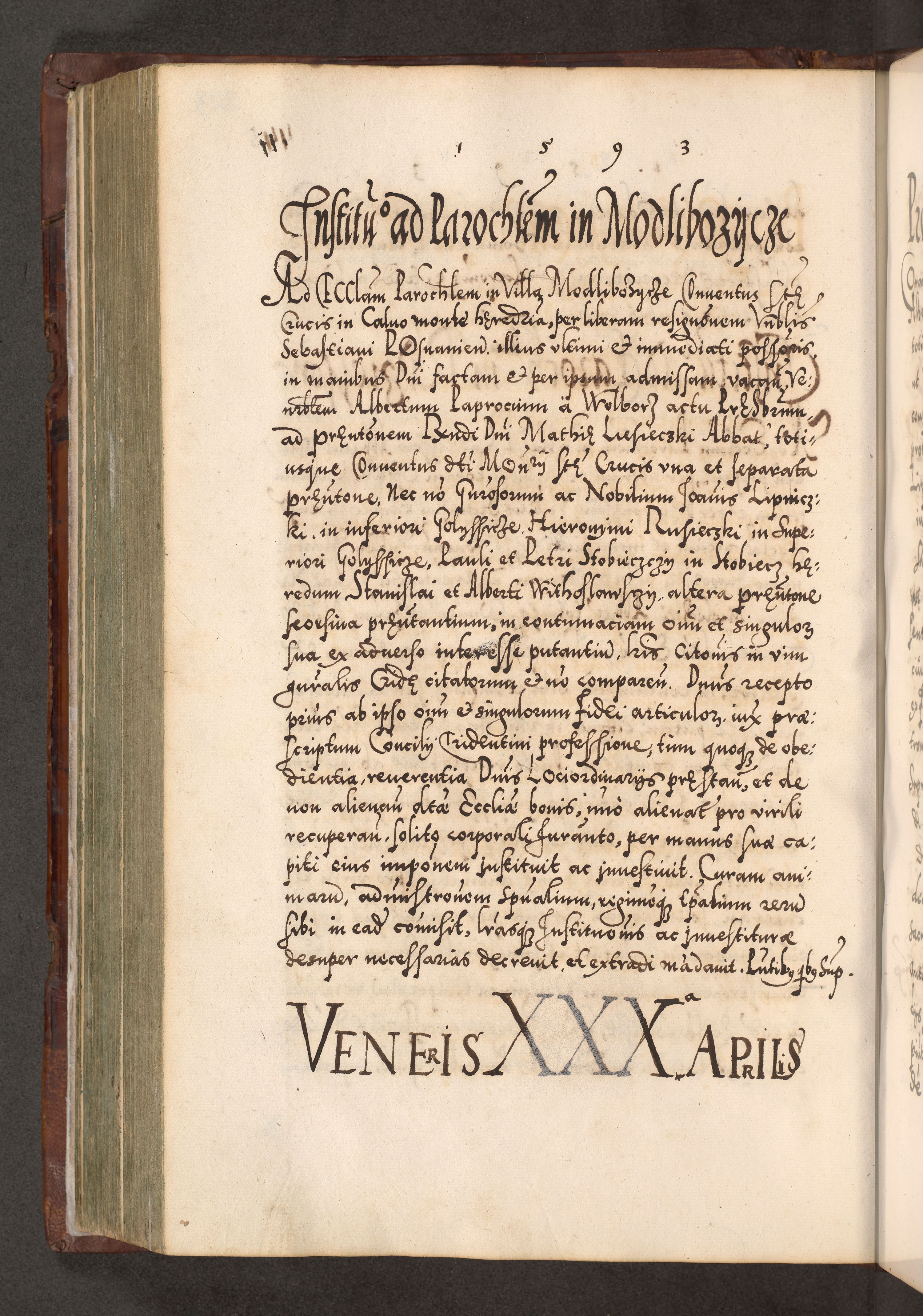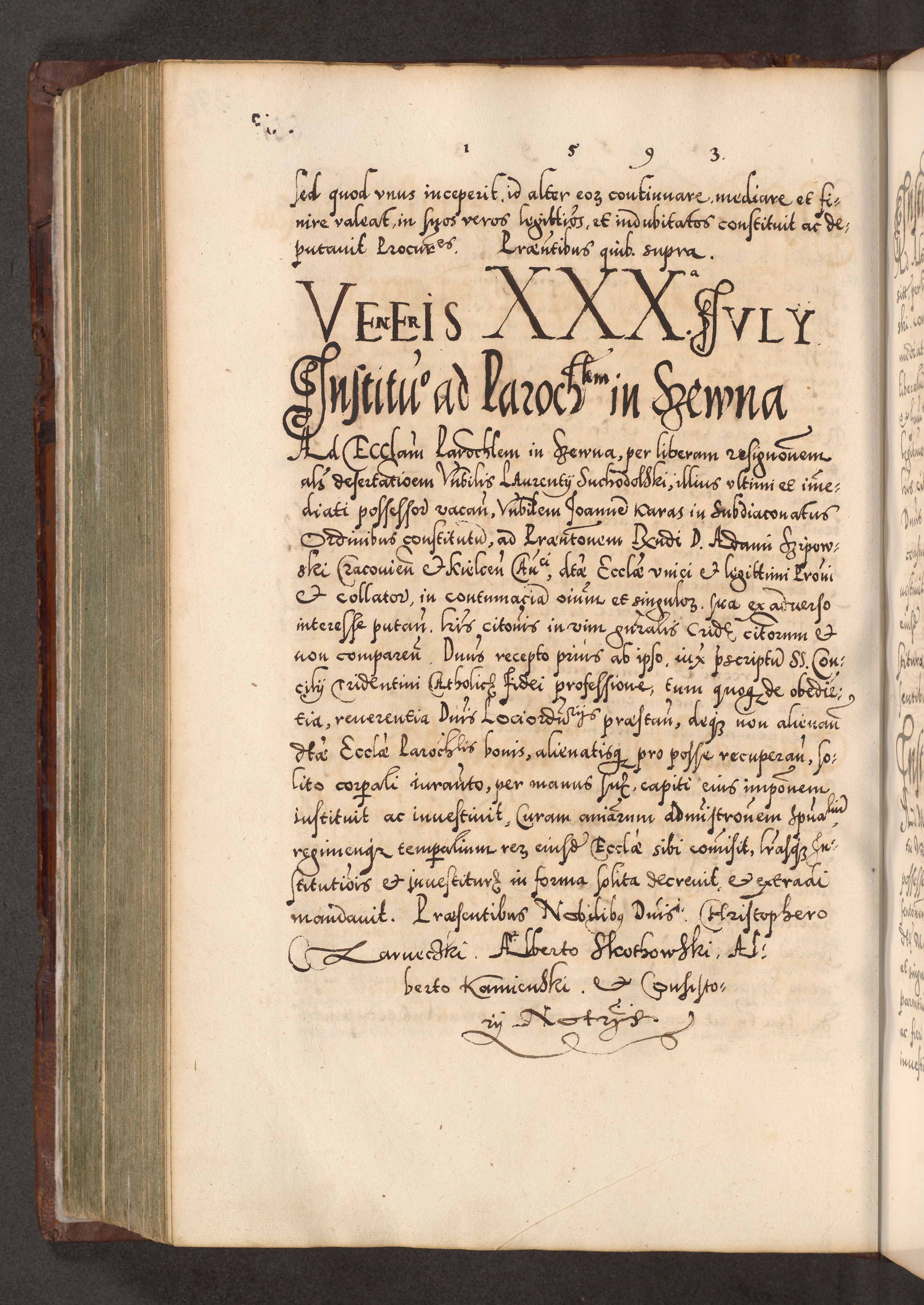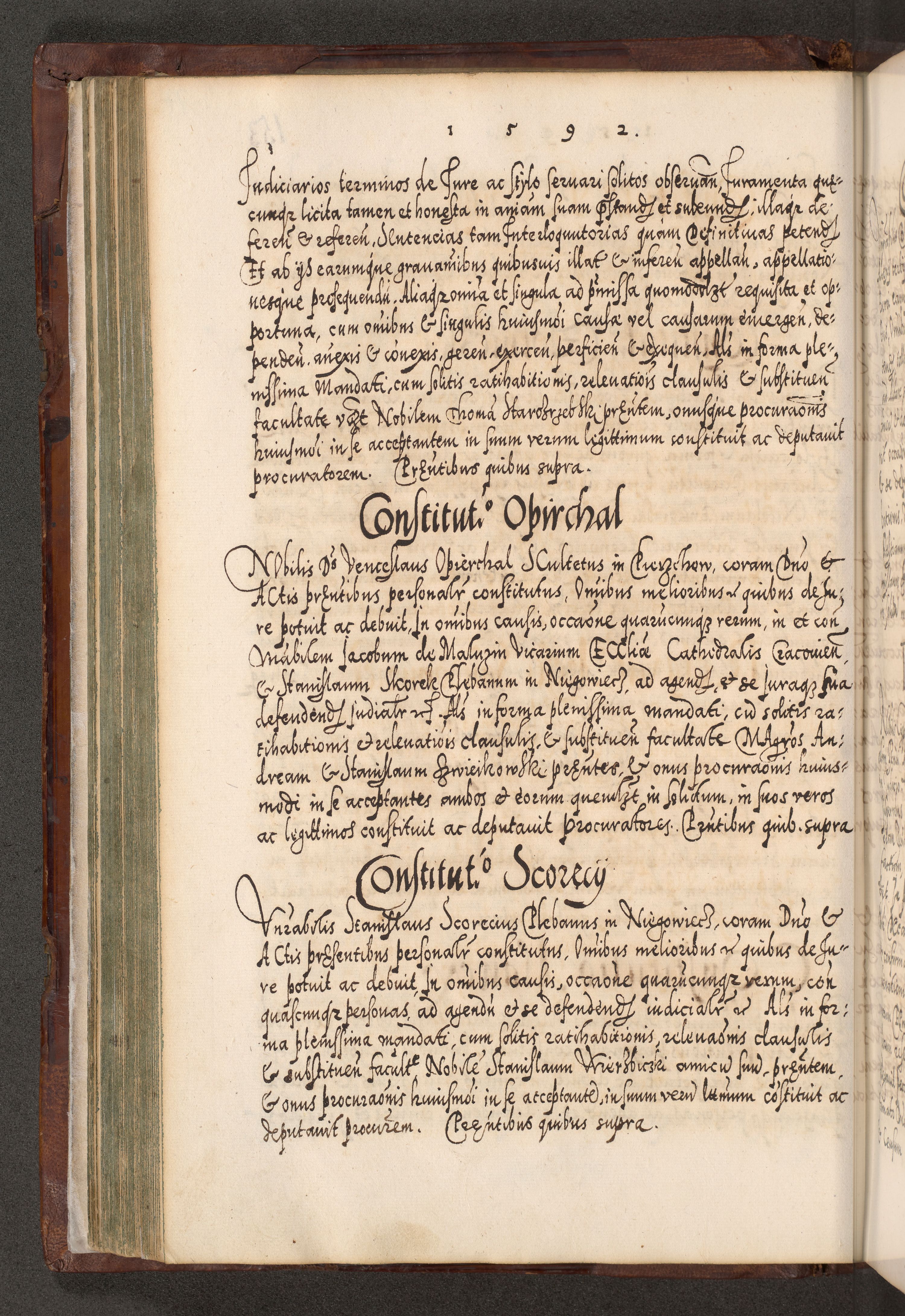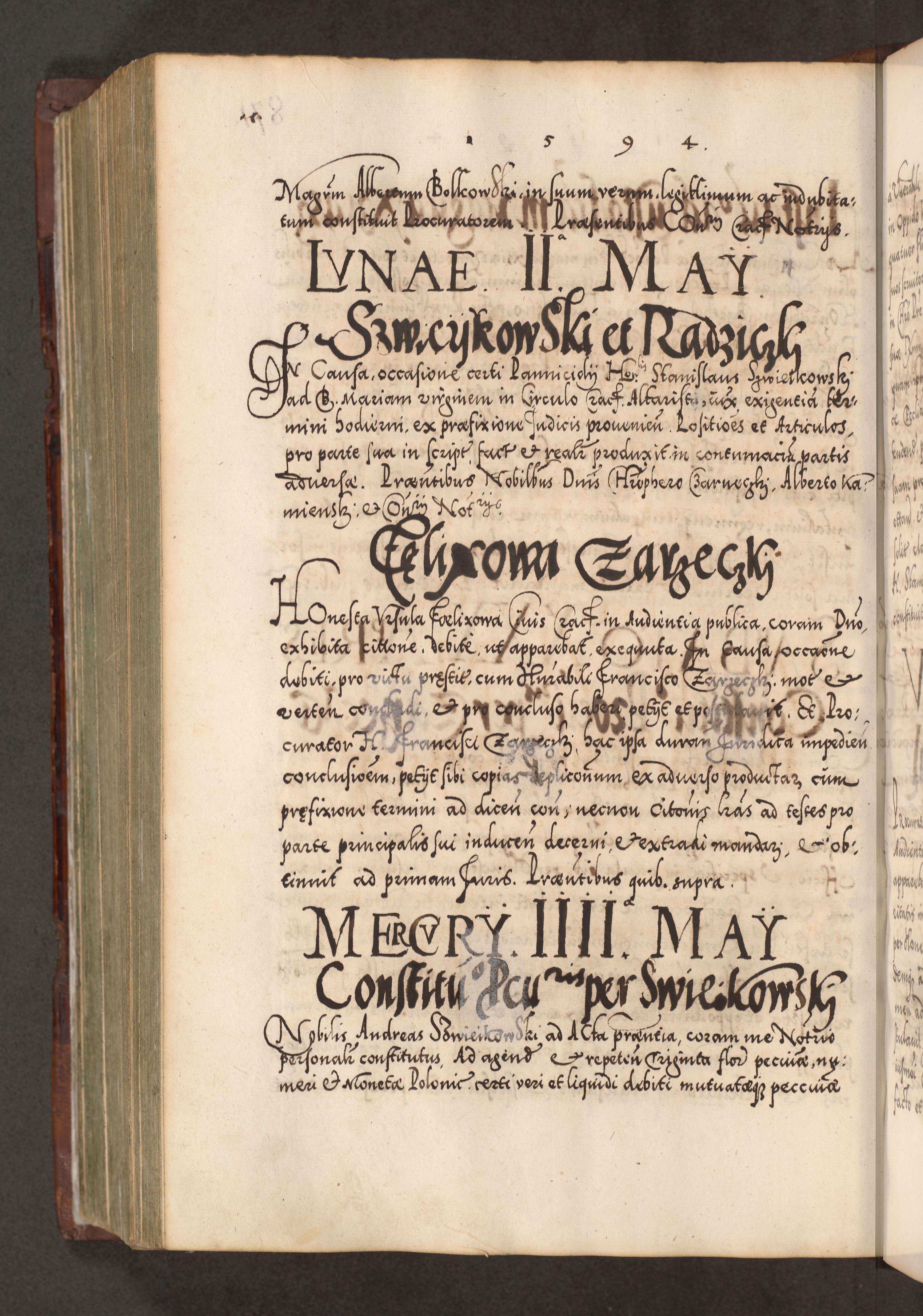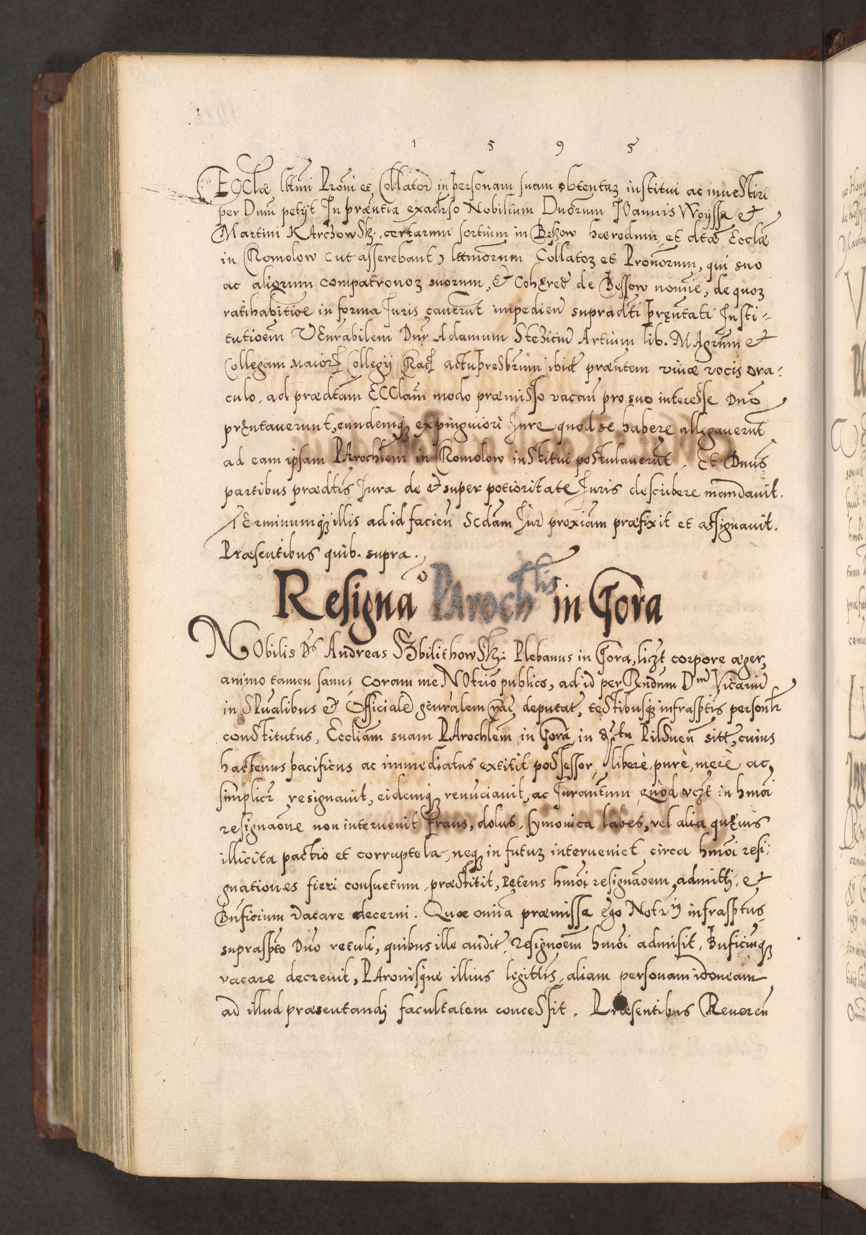 Illistrissimo et revedissimo in Christo Patre Domino Domino Georgio Rzadziwił Miserone Divina Sacrostae R. E. Tituli S. Sixti Presbitero Cardinali Duce in Olyka et Niesswiesz ad Gubernacula Ecclessiae Cracoviensis cuius administratorialem a Sancta Sede Apostolica obtinverat feliciter sedente. Acta actorum, causarum, sententiarum tam deffinitivarum quam interloquutoriarum decretorum, obligationum, quietationum, recognitionum, constitutionum procuratorum etc. coram Reverendo Domino Stanislao Crassinskz de Crasne Archidiacono Cracoviensis, Scholastico Gnesnesis, Custode Plocensis etc. Vicario et Officiali Generali Cracoviensi in Ano Domini Millesimo Quingentesimo Nonagesimo Primo cuius indictio quarta pontificatus SS. Domini Nostri Gregorii XIIII Anno I psius prio feliciter incipiut