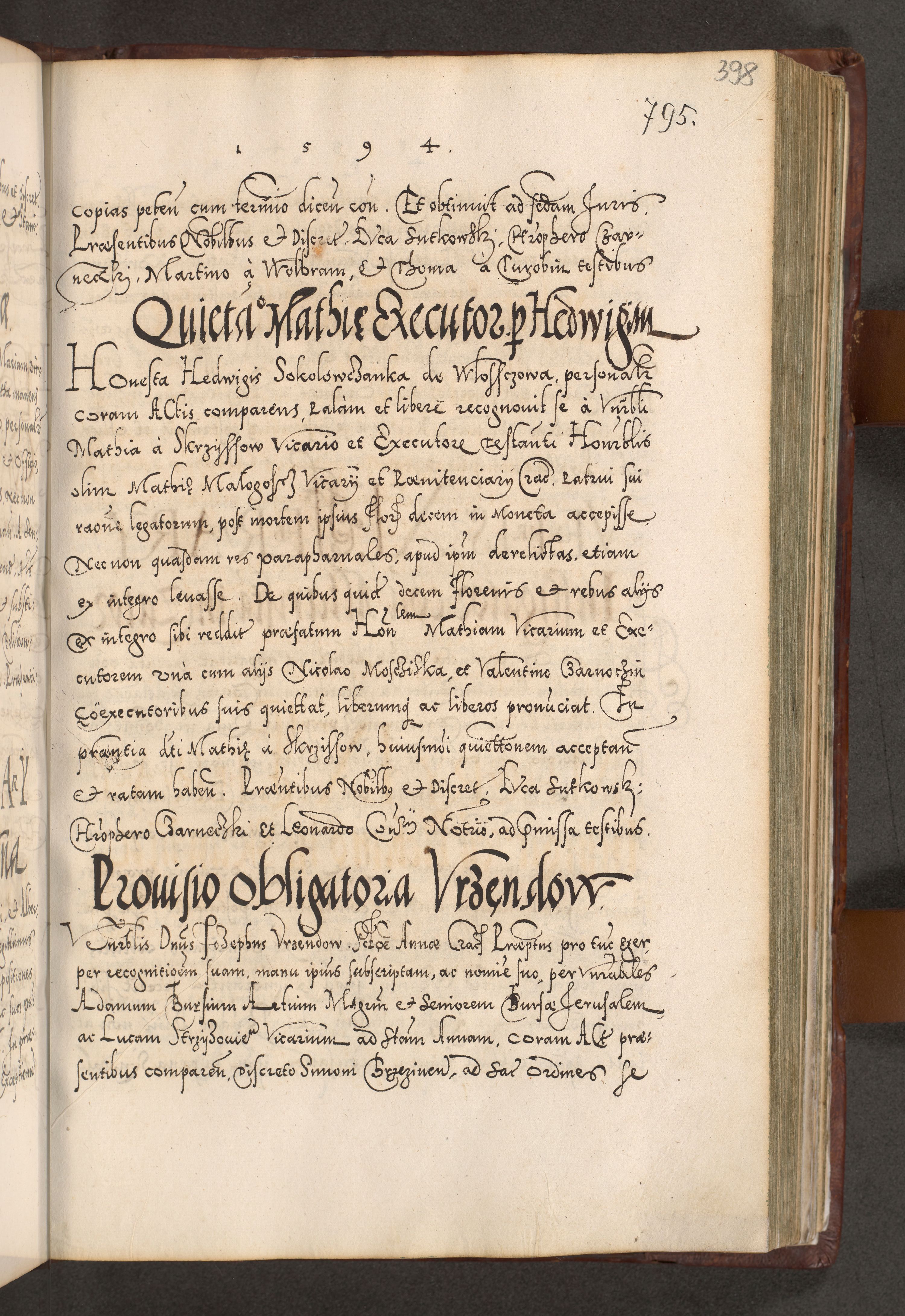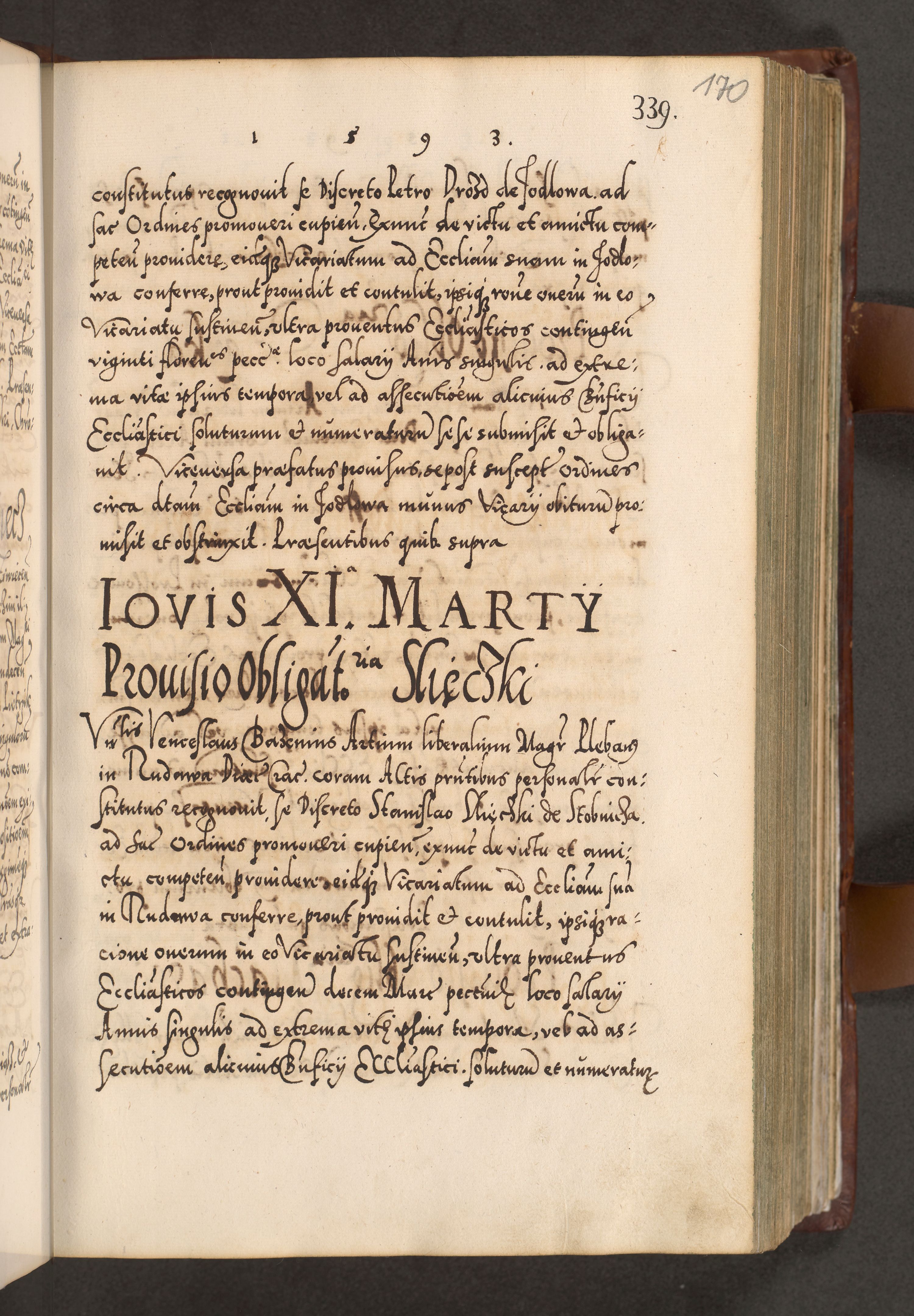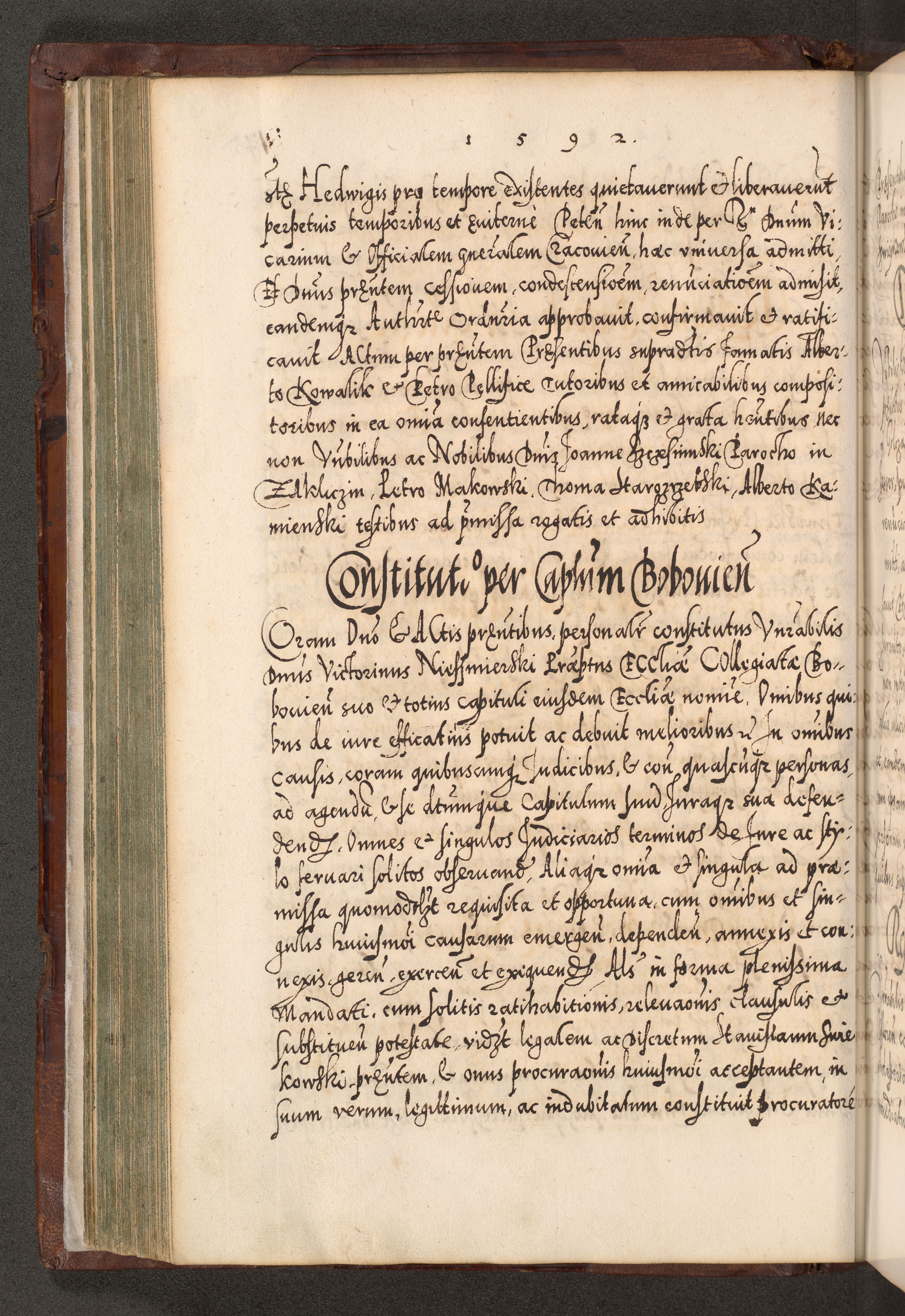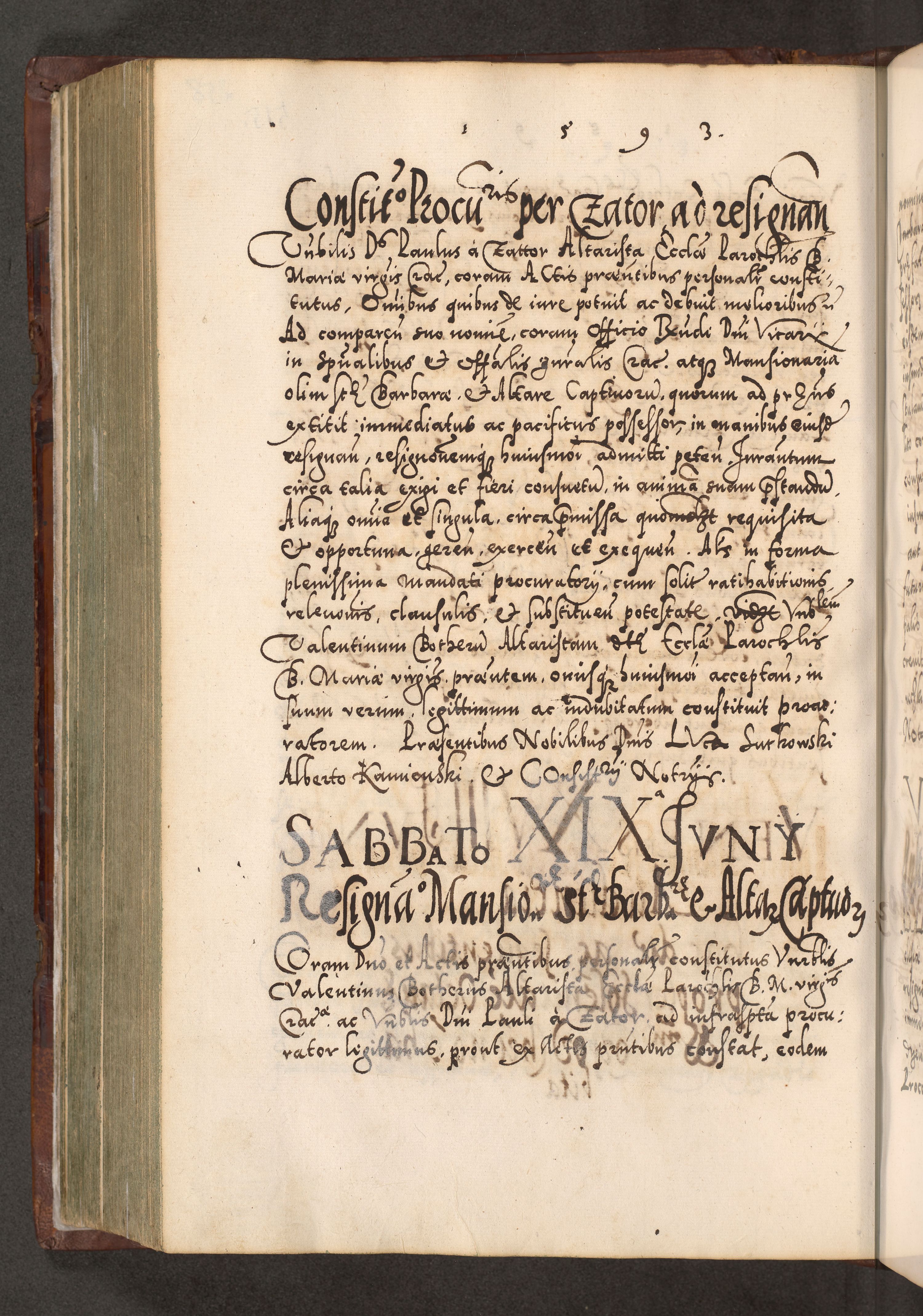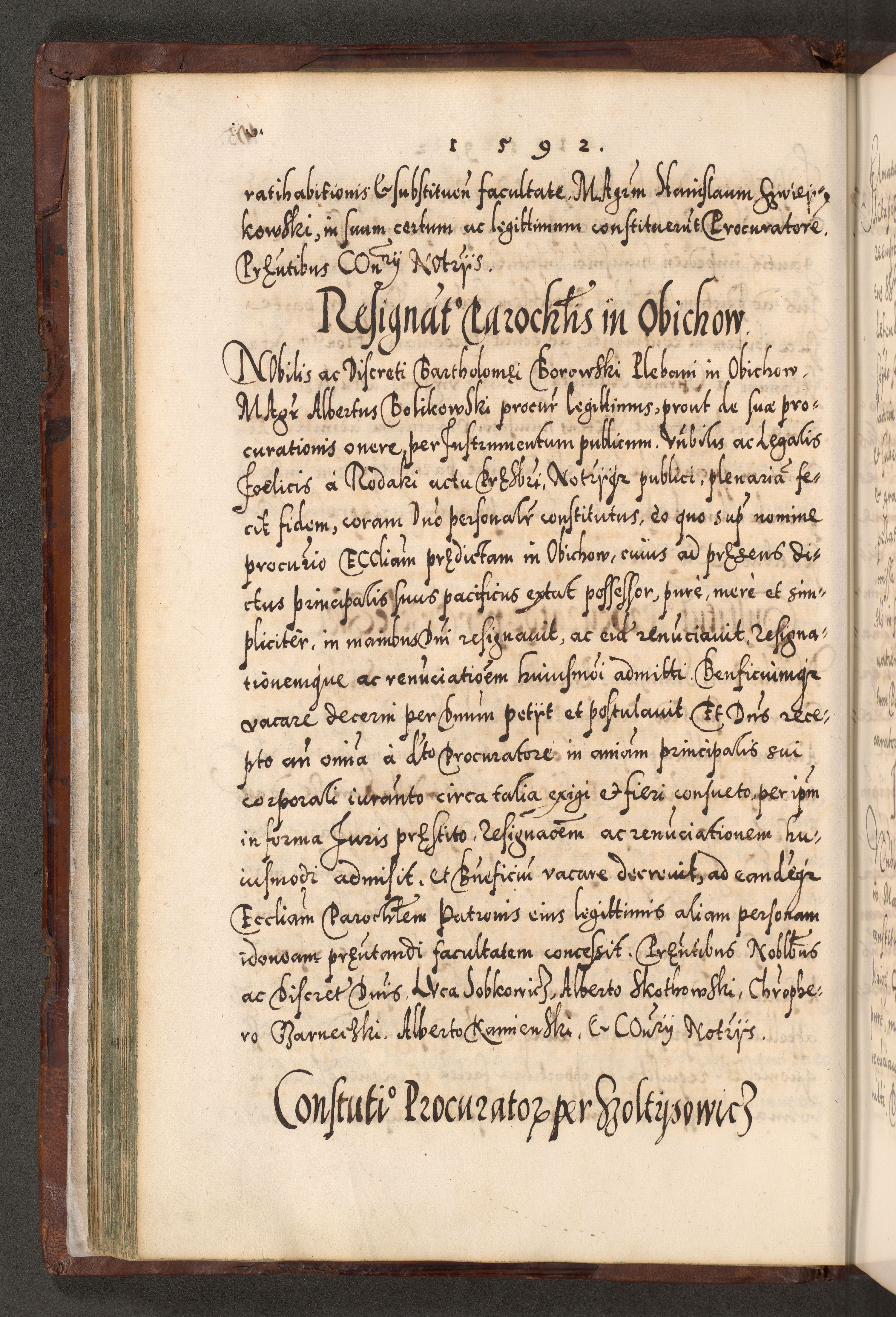 Illistrissimo et revedissimo in Christo Patre Domino Domino Georgio Rzadziwił Miserone Divina Sacrostae R. E. Tituli S. Sixti Presbitero Cardinali Duce in Olyka et Niesswiesz ad Gubernacula Ecclessiae Cracoviensis cuius administratorialem a Sancta Sede Apostolica obtinverat feliciter sedente. Acta actorum, causarum, sententiarum tam deffinitivarum quam interloquutoriarum decretorum, obligationum, quietationum, recognitionum, constitutionum procuratorum etc. coram Reverendo Domino Stanislao Crassinskz de Crasne Archidiacono Cracoviensis, Scholastico Gnesnesis, Custode Plocensis etc. Vicario et Officiali Generali Cracoviensi in Ano Domini Millesimo Quingentesimo Nonagesimo Primo cuius indictio quarta pontificatus SS. Domini Nostri Gregorii XIIII Anno I psius prio feliciter incipiut