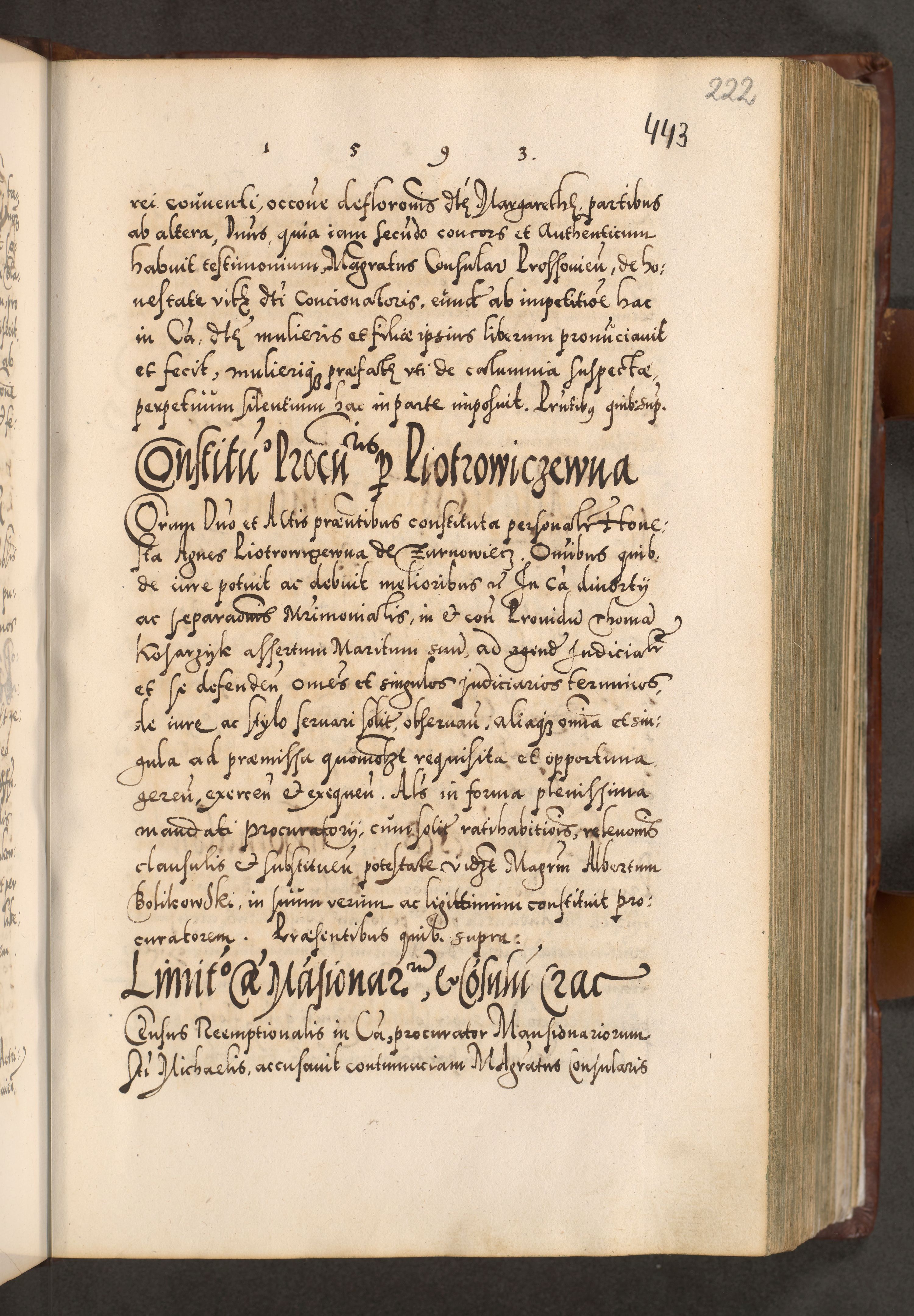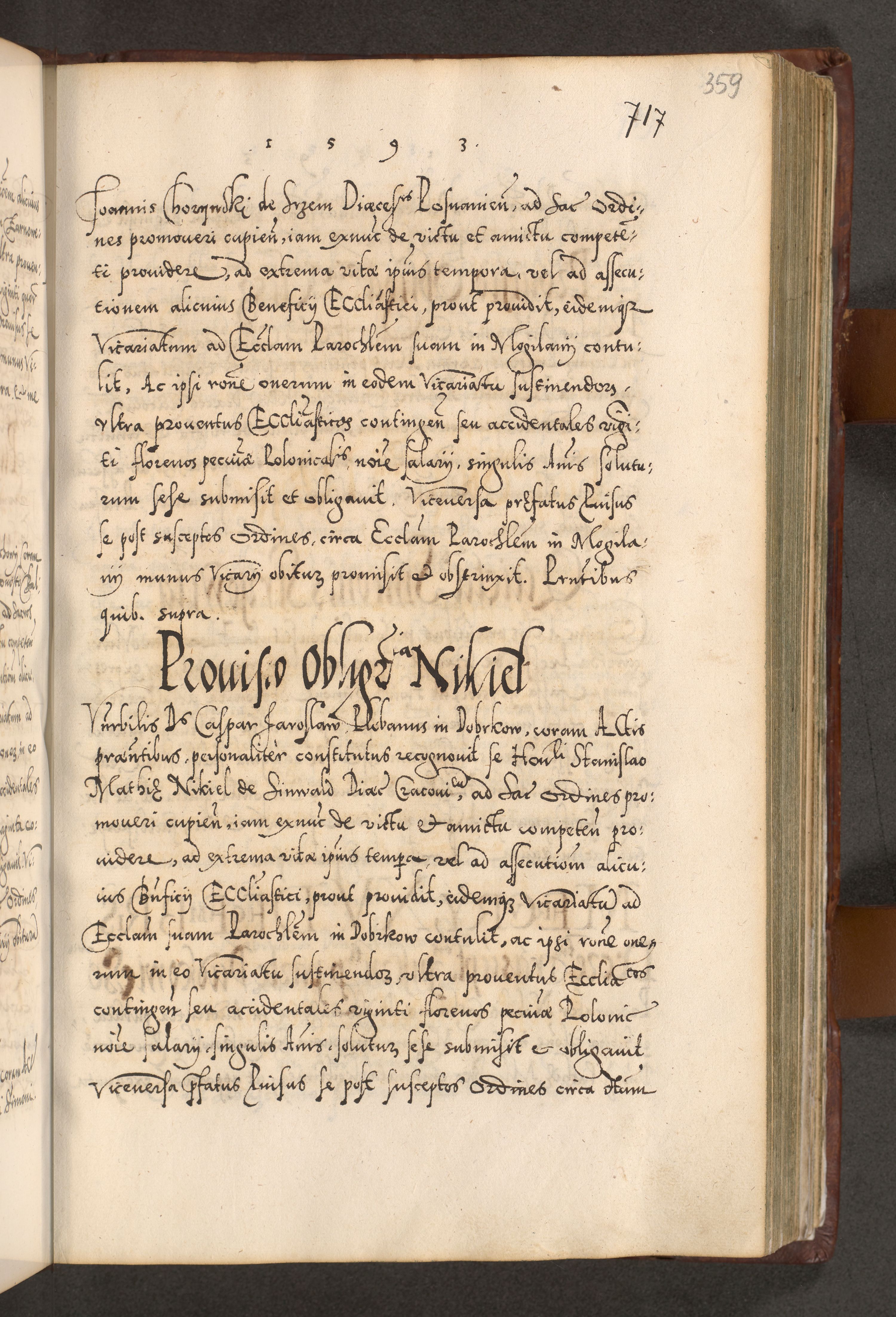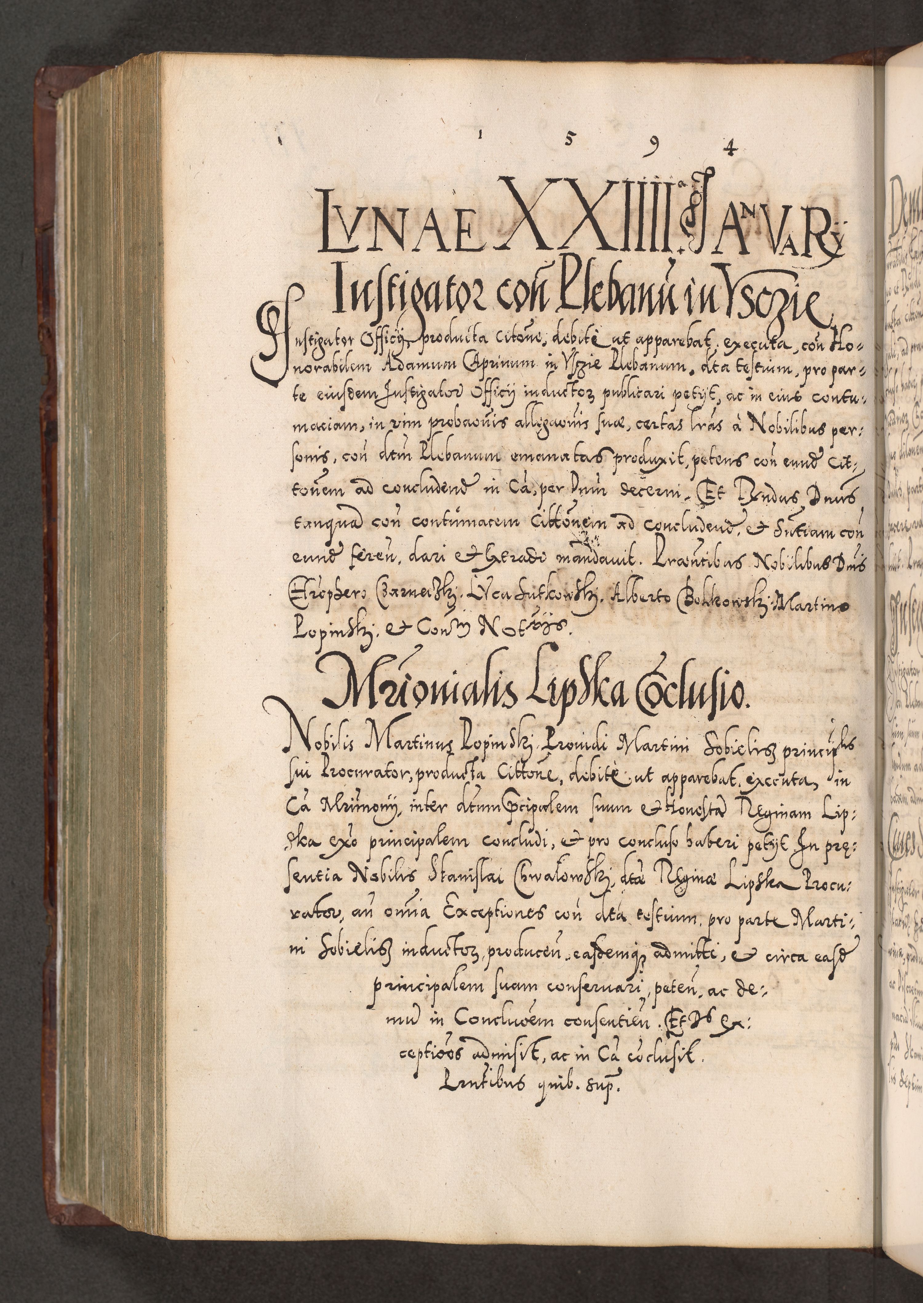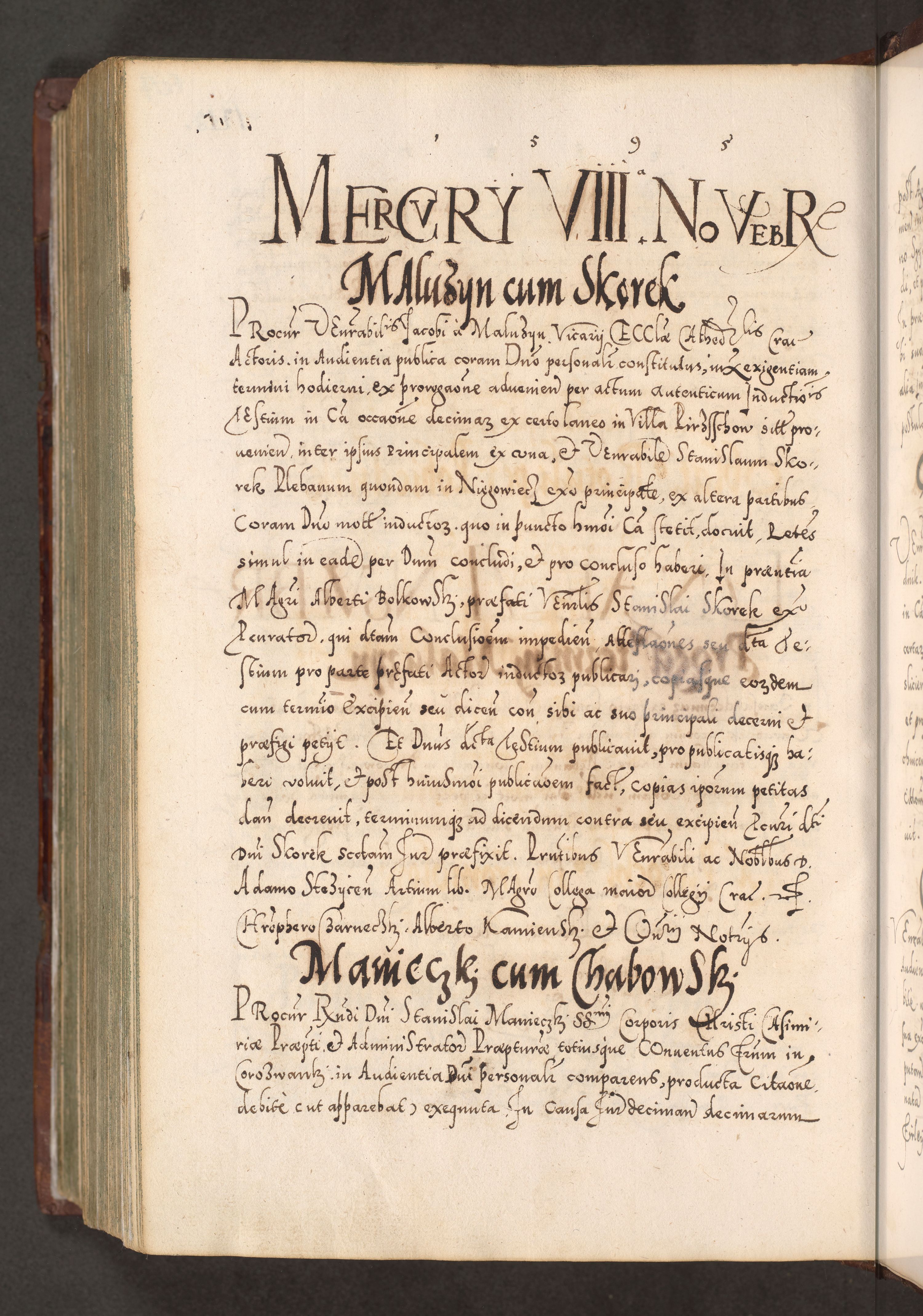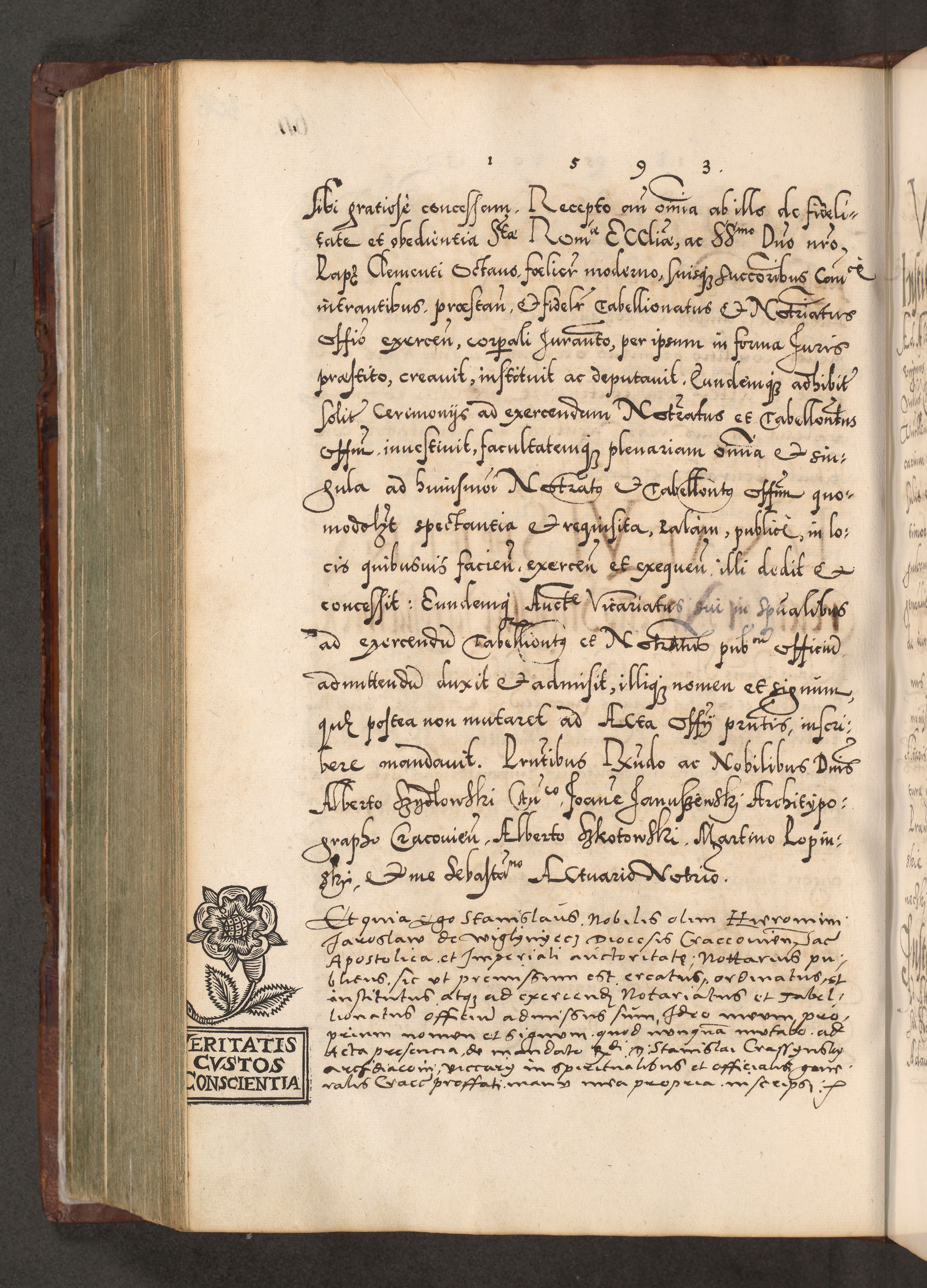 Illistrissimo et revedissimo in Christo Patre Domino Domino Georgio Rzadziwił Miserone Divina Sacrostae R. E. Tituli S. Sixti Presbitero Cardinali Duce in Olyka et Niesswiesz ad Gubernacula Ecclessiae Cracoviensis cuius administratorialem a Sancta Sede Apostolica obtinverat feliciter sedente. Acta actorum, causarum, sententiarum tam deffinitivarum quam interloquutoriarum decretorum, obligationum, quietationum, recognitionum, constitutionum procuratorum etc. coram Reverendo Domino Stanislao Crassinskz de Crasne Archidiacono Cracoviensis, Scholastico Gnesnesis, Custode Plocensis etc. Vicario et Officiali Generali Cracoviensi in Ano Domini Millesimo Quingentesimo Nonagesimo Primo cuius indictio quarta pontificatus SS. Domini Nostri Gregorii XIIII Anno I psius prio feliciter incipiut