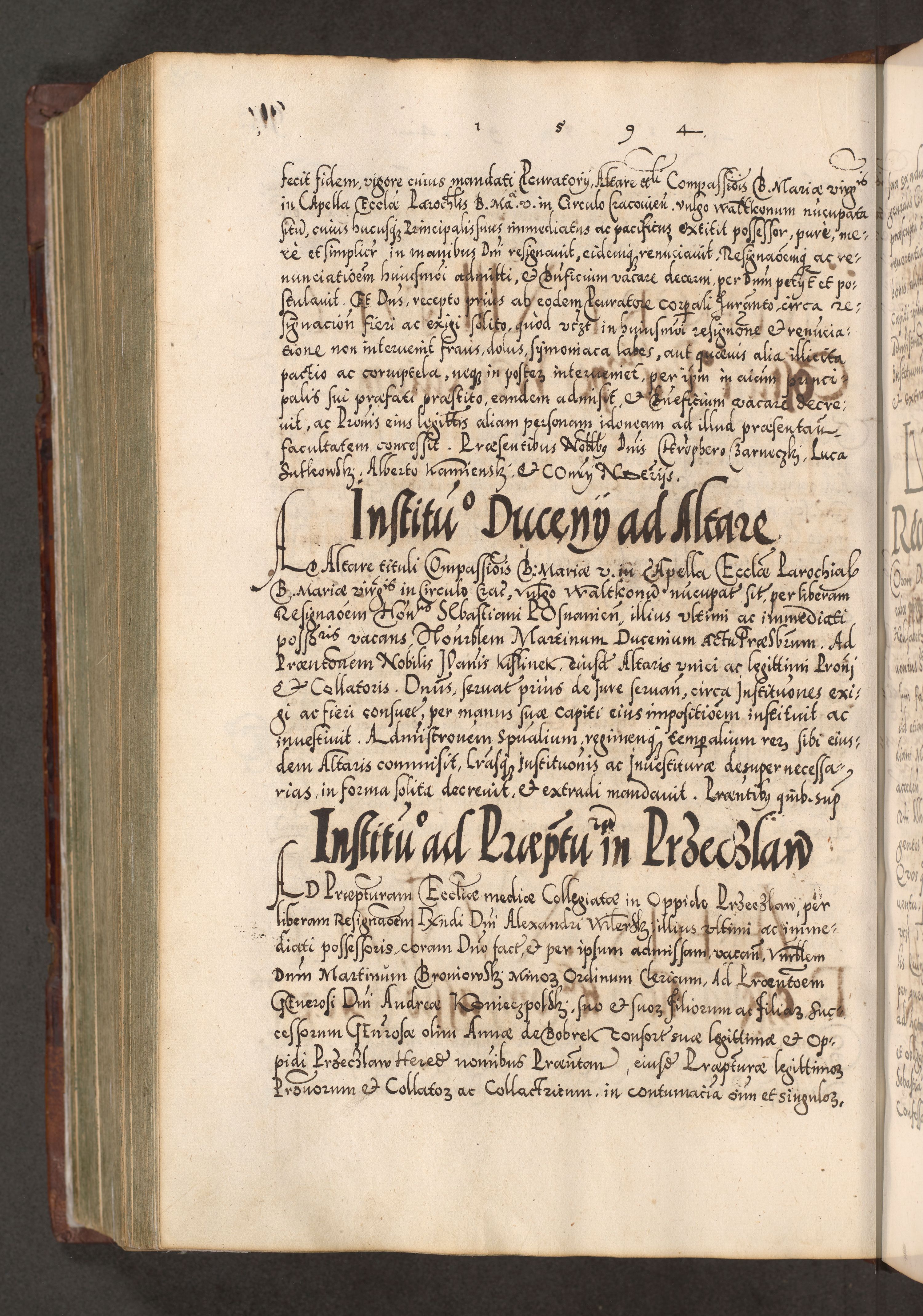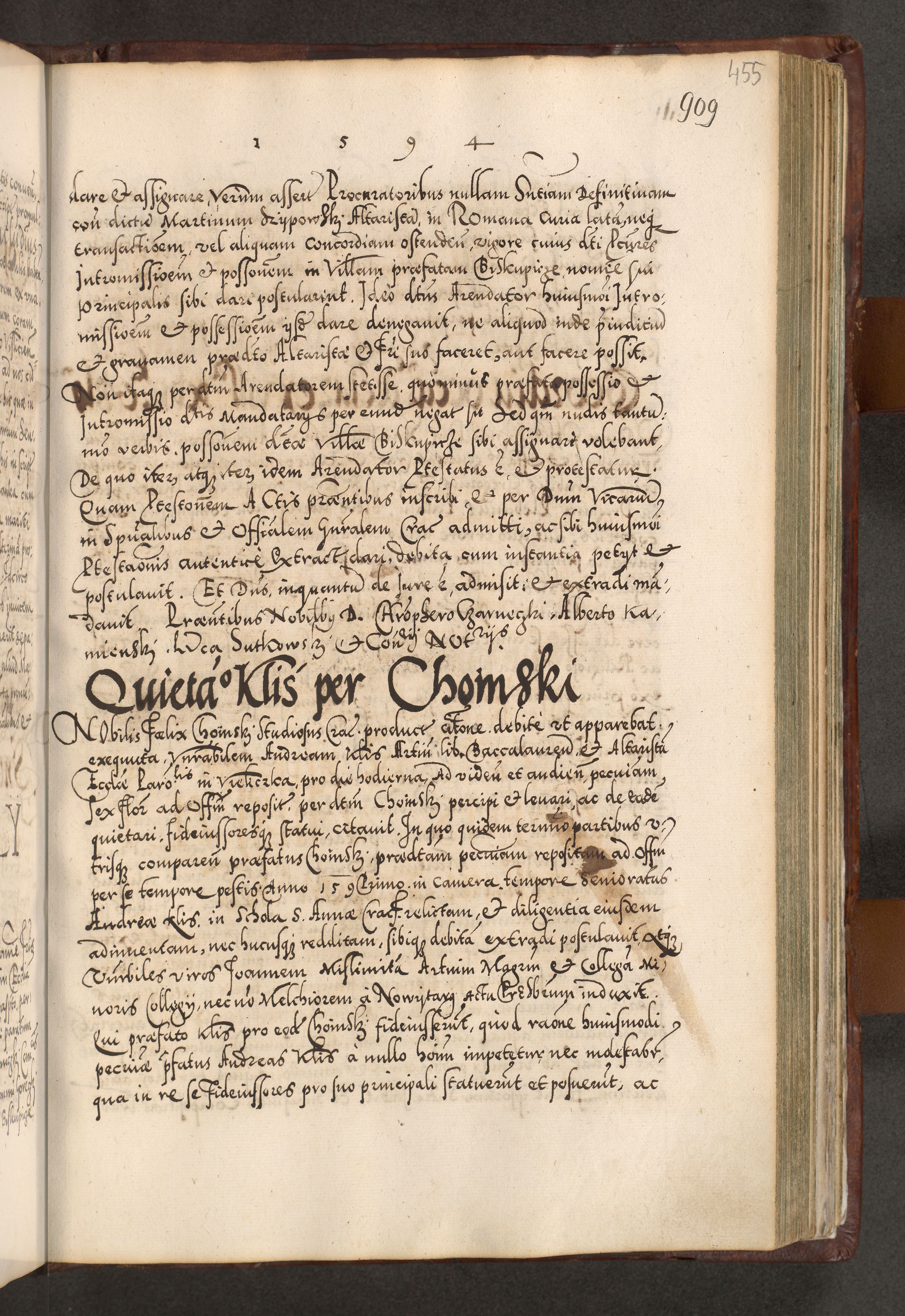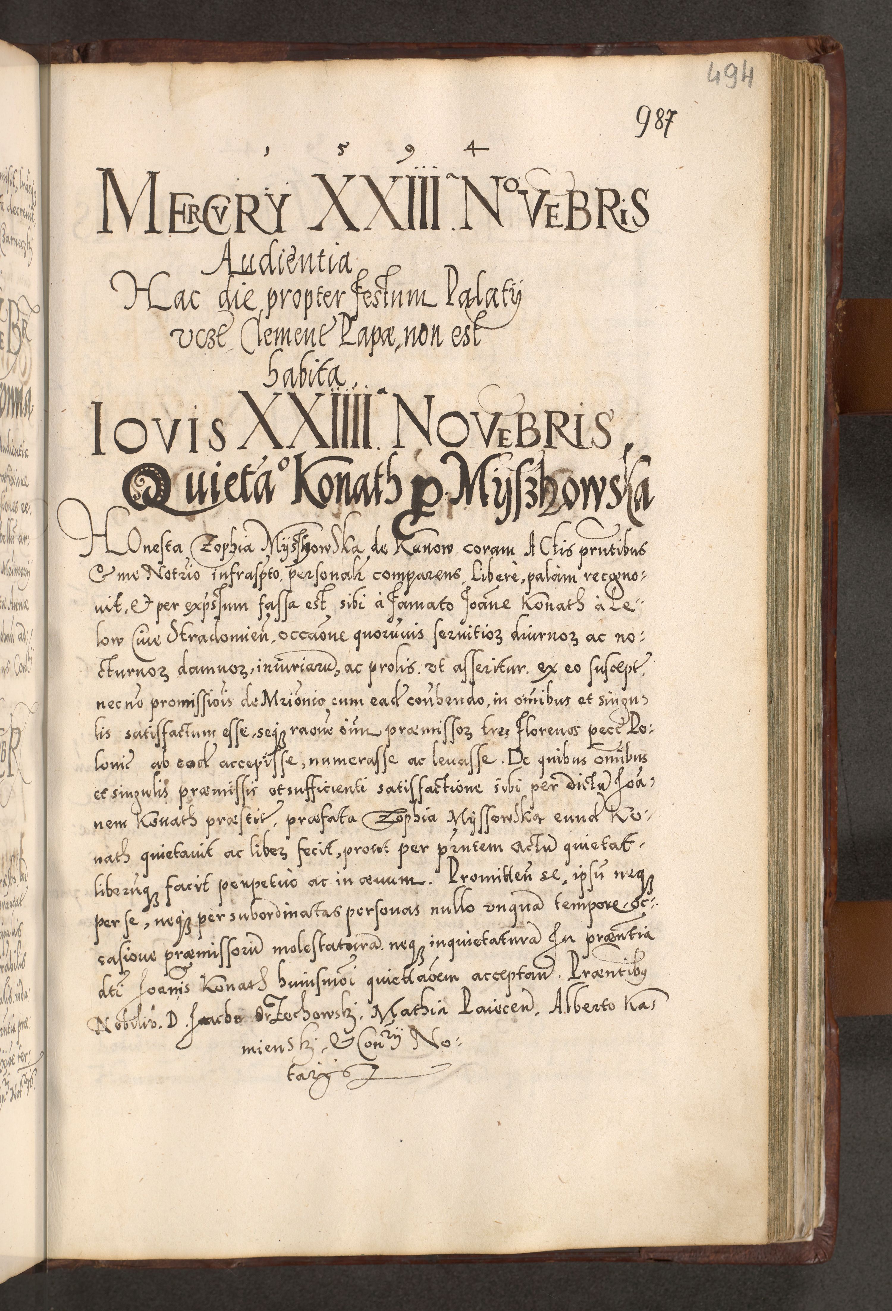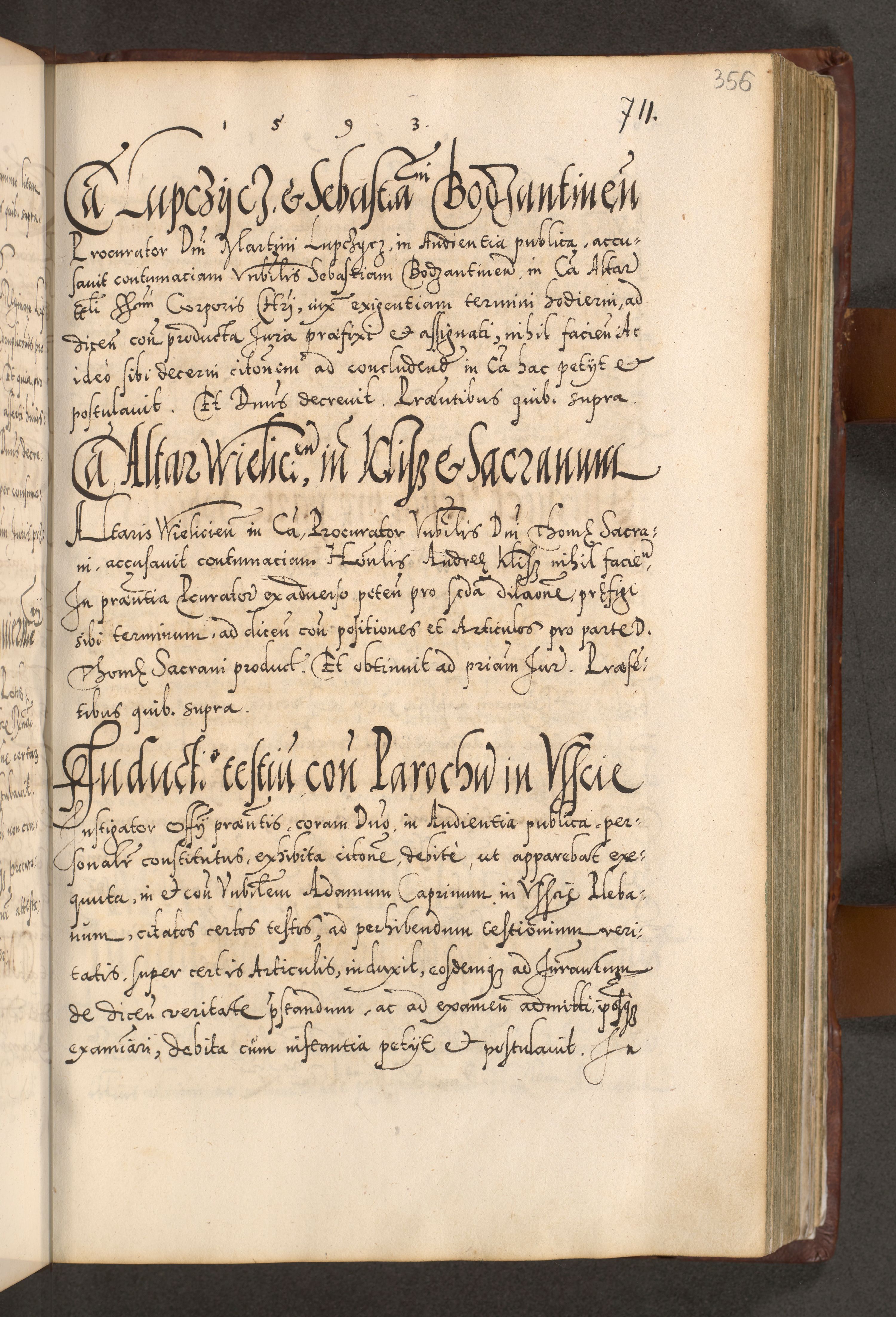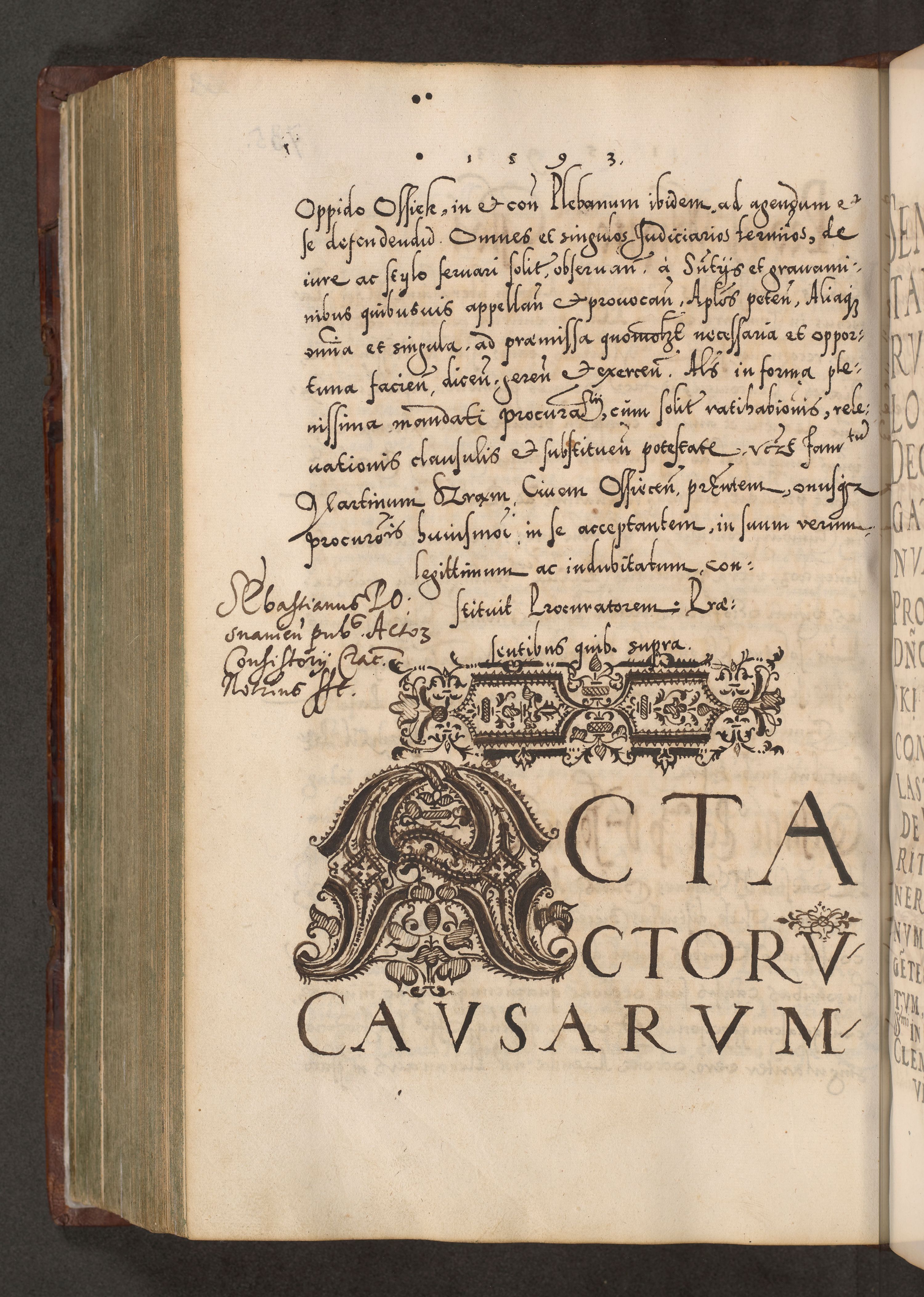 Illistrissimo et revedissimo in Christo Patre Domino Domino Georgio Rzadziwił Miserone Divina Sacrostae R. E. Tituli S. Sixti Presbitero Cardinali Duce in Olyka et Niesswiesz ad Gubernacula Ecclessiae Cracoviensis cuius administratorialem a Sancta Sede Apostolica obtinverat feliciter sedente. Acta actorum, causarum, sententiarum tam deffinitivarum quam interloquutoriarum decretorum, obligationum, quietationum, recognitionum, constitutionum procuratorum etc. coram Reverendo Domino Stanislao Crassinskz de Crasne Archidiacono Cracoviensis, Scholastico Gnesnesis, Custode Plocensis etc. Vicario et Officiali Generali Cracoviensi in Ano Domini Millesimo Quingentesimo Nonagesimo Primo cuius indictio quarta pontificatus SS. Domini Nostri Gregorii XIIII Anno I psius prio feliciter incipiut