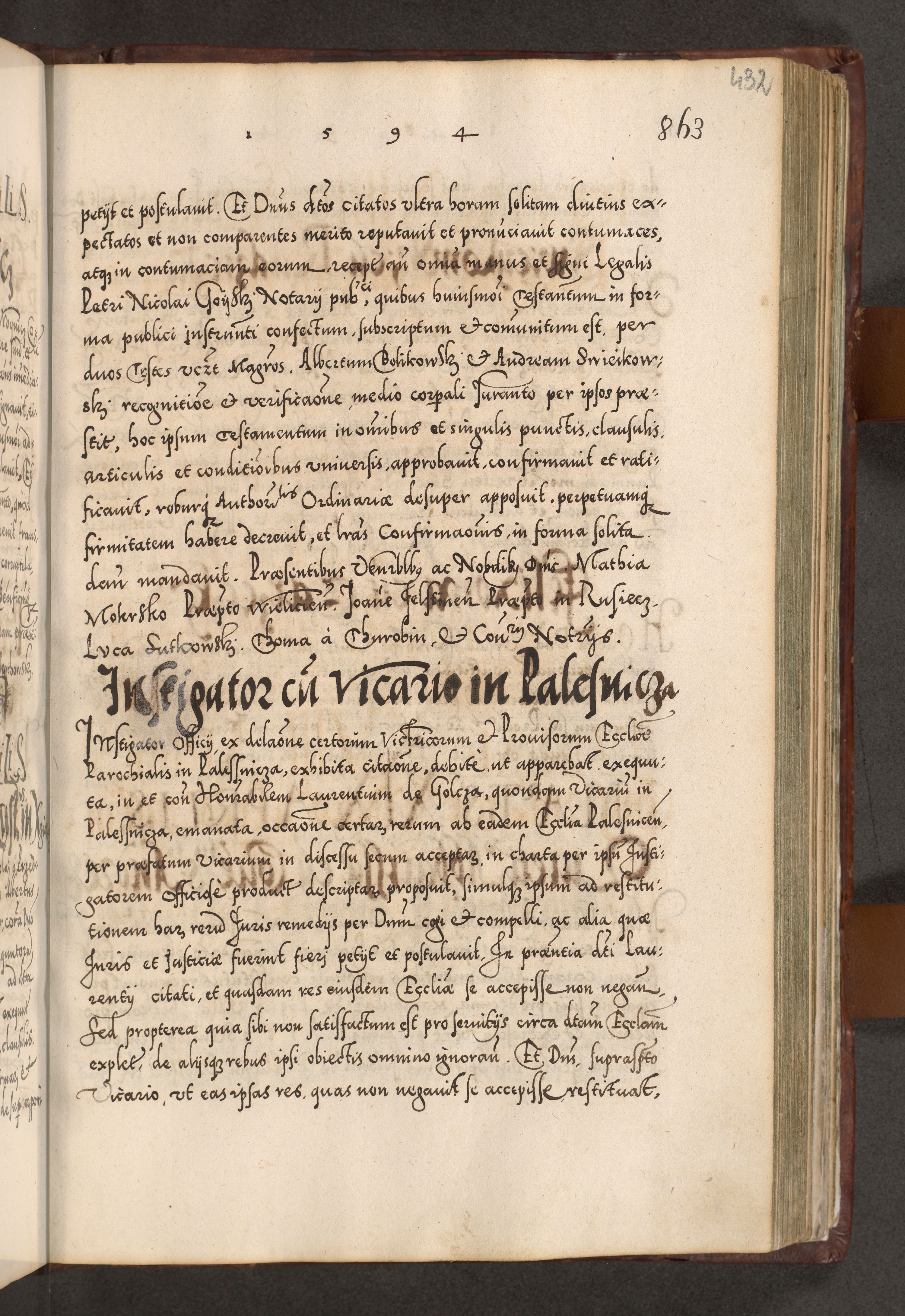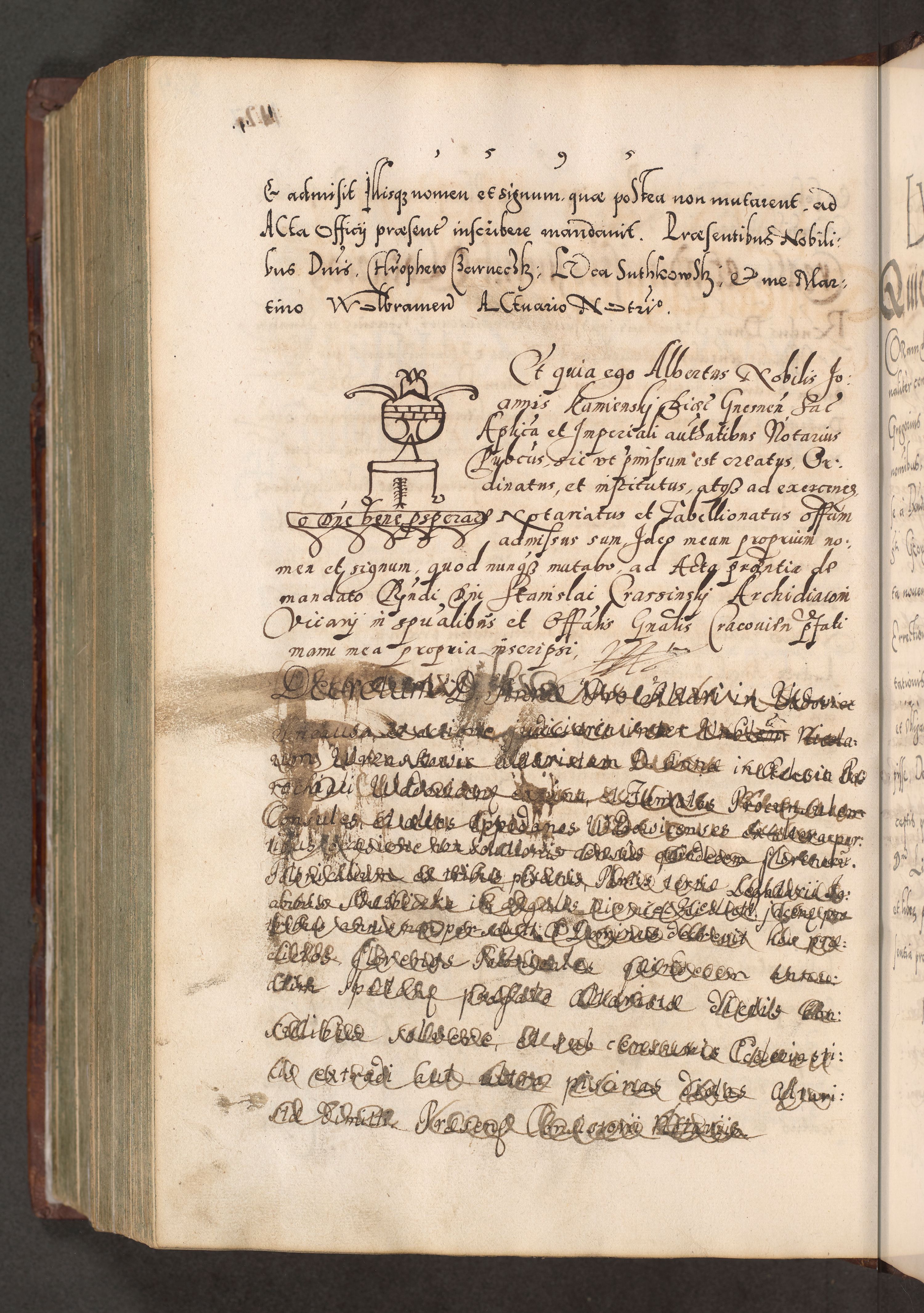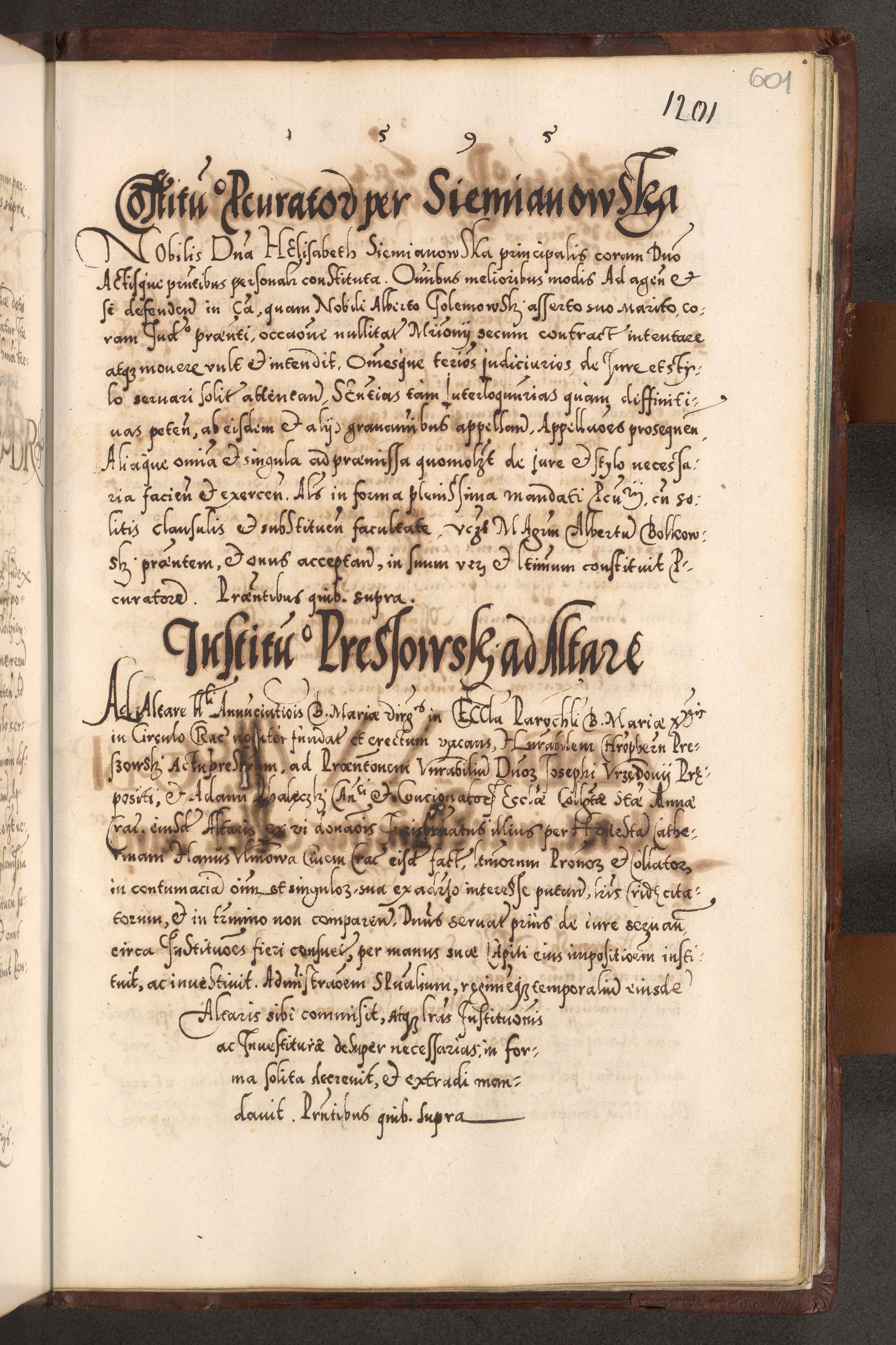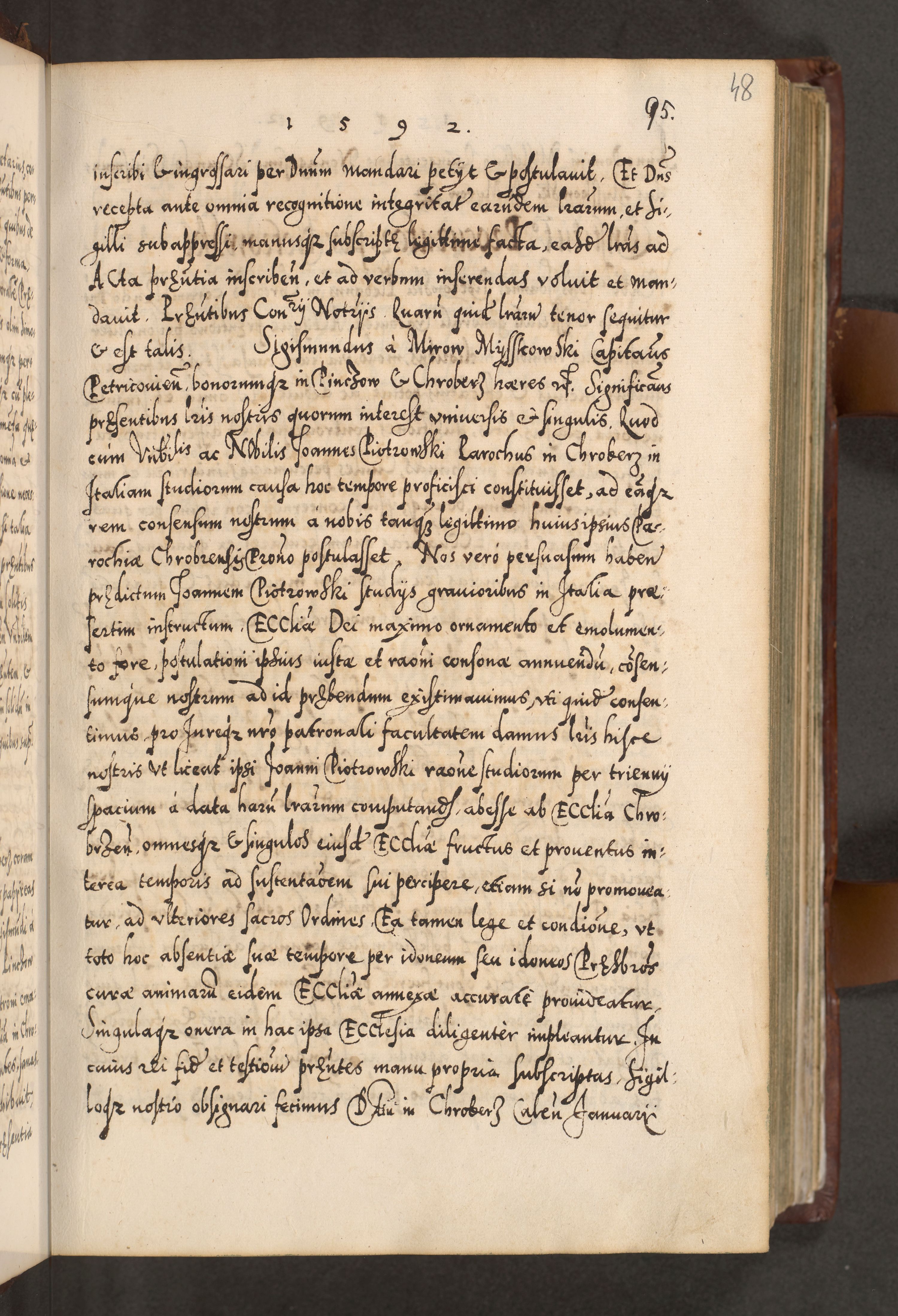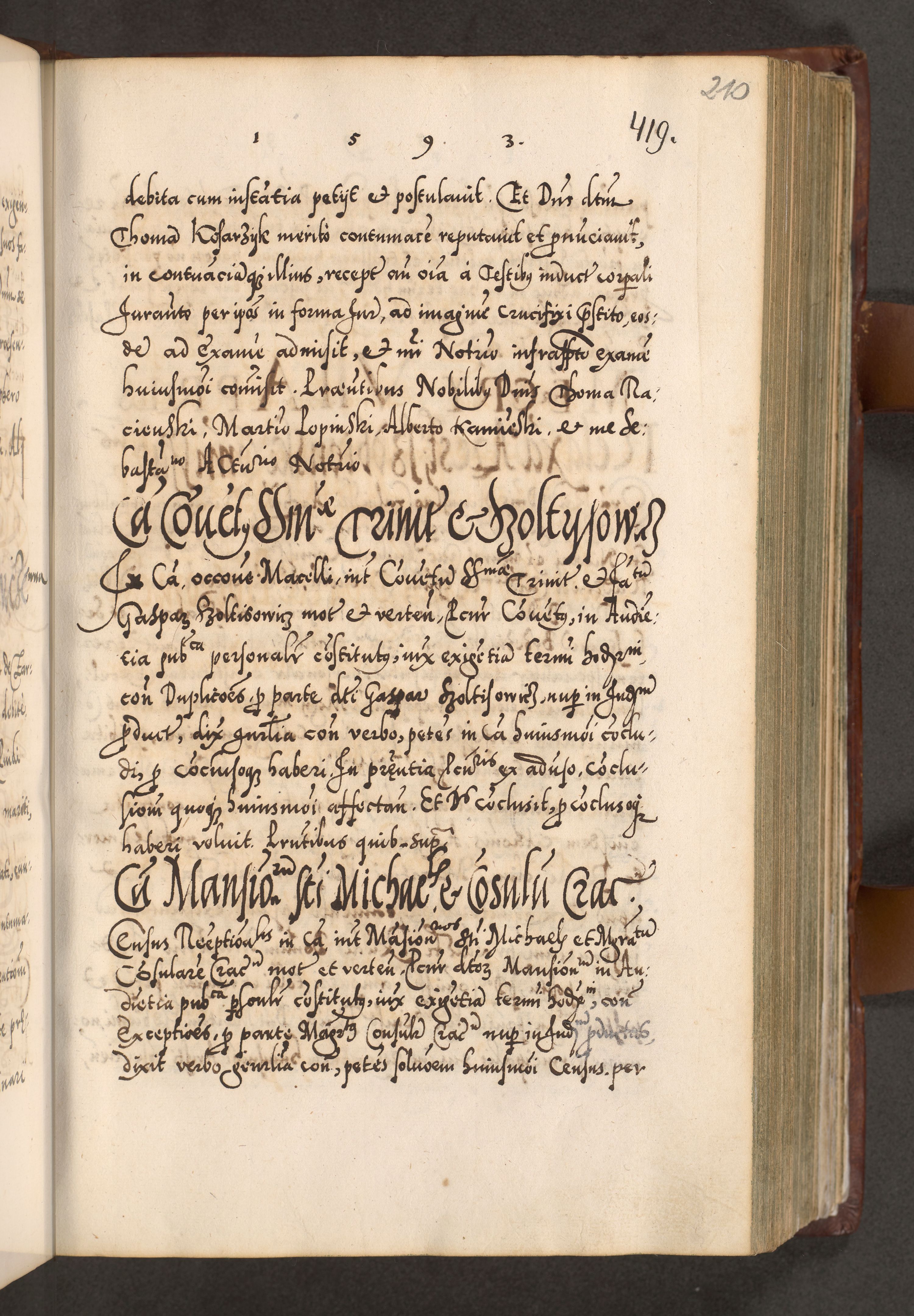 Illistrissimo et revedissimo in Christo Patre Domino Domino Georgio Rzadziwił Miserone Divina Sacrostae R. E. Tituli S. Sixti Presbitero Cardinali Duce in Olyka et Niesswiesz ad Gubernacula Ecclessiae Cracoviensis cuius administratorialem a Sancta Sede Apostolica obtinverat feliciter sedente. Acta actorum, causarum, sententiarum tam deffinitivarum quam interloquutoriarum decretorum, obligationum, quietationum, recognitionum, constitutionum procuratorum etc. coram Reverendo Domino Stanislao Crassinskz de Crasne Archidiacono Cracoviensis, Scholastico Gnesnesis, Custode Plocensis etc. Vicario et Officiali Generali Cracoviensi in Ano Domini Millesimo Quingentesimo Nonagesimo Primo cuius indictio quarta pontificatus SS. Domini Nostri Gregorii XIIII Anno I psius prio feliciter incipiut