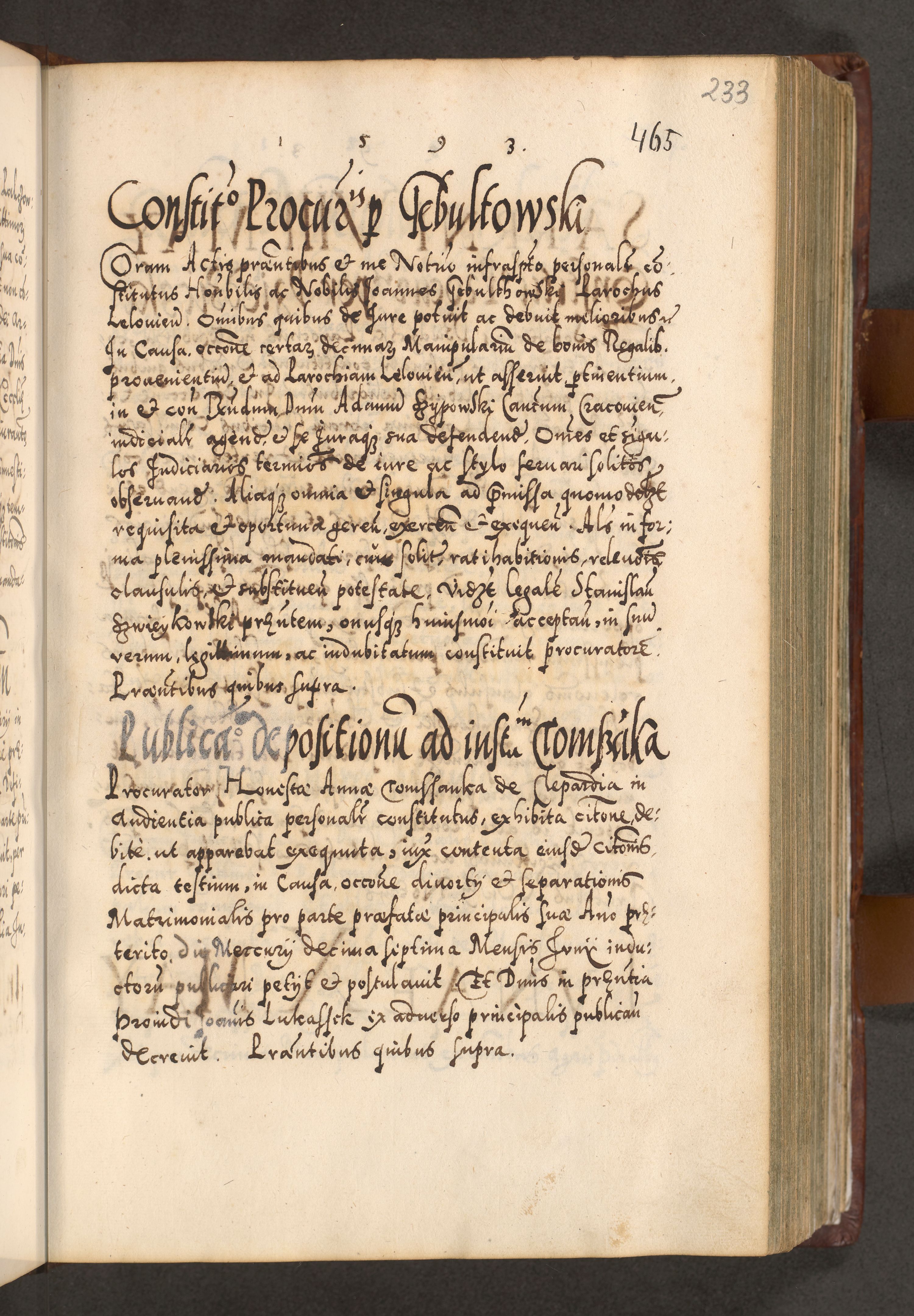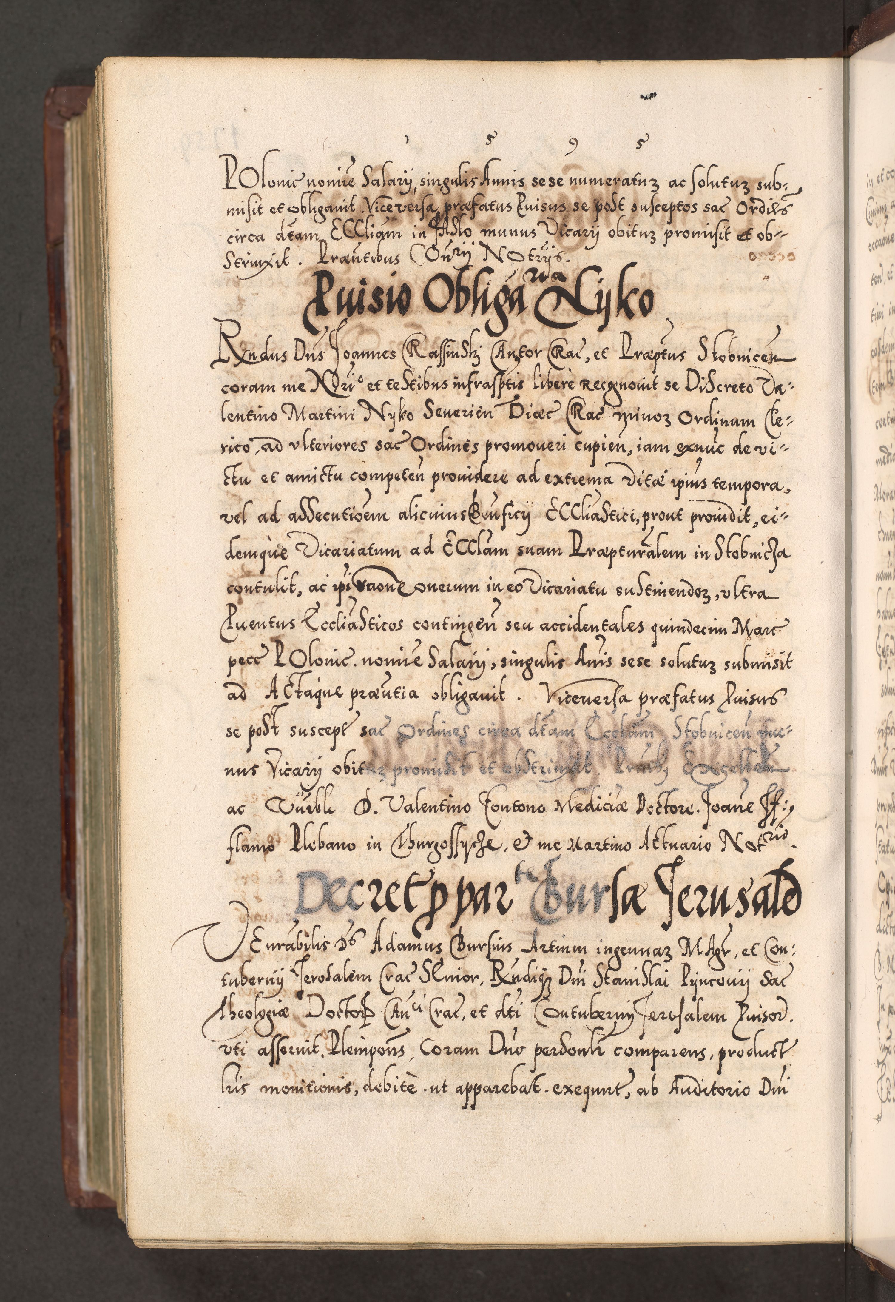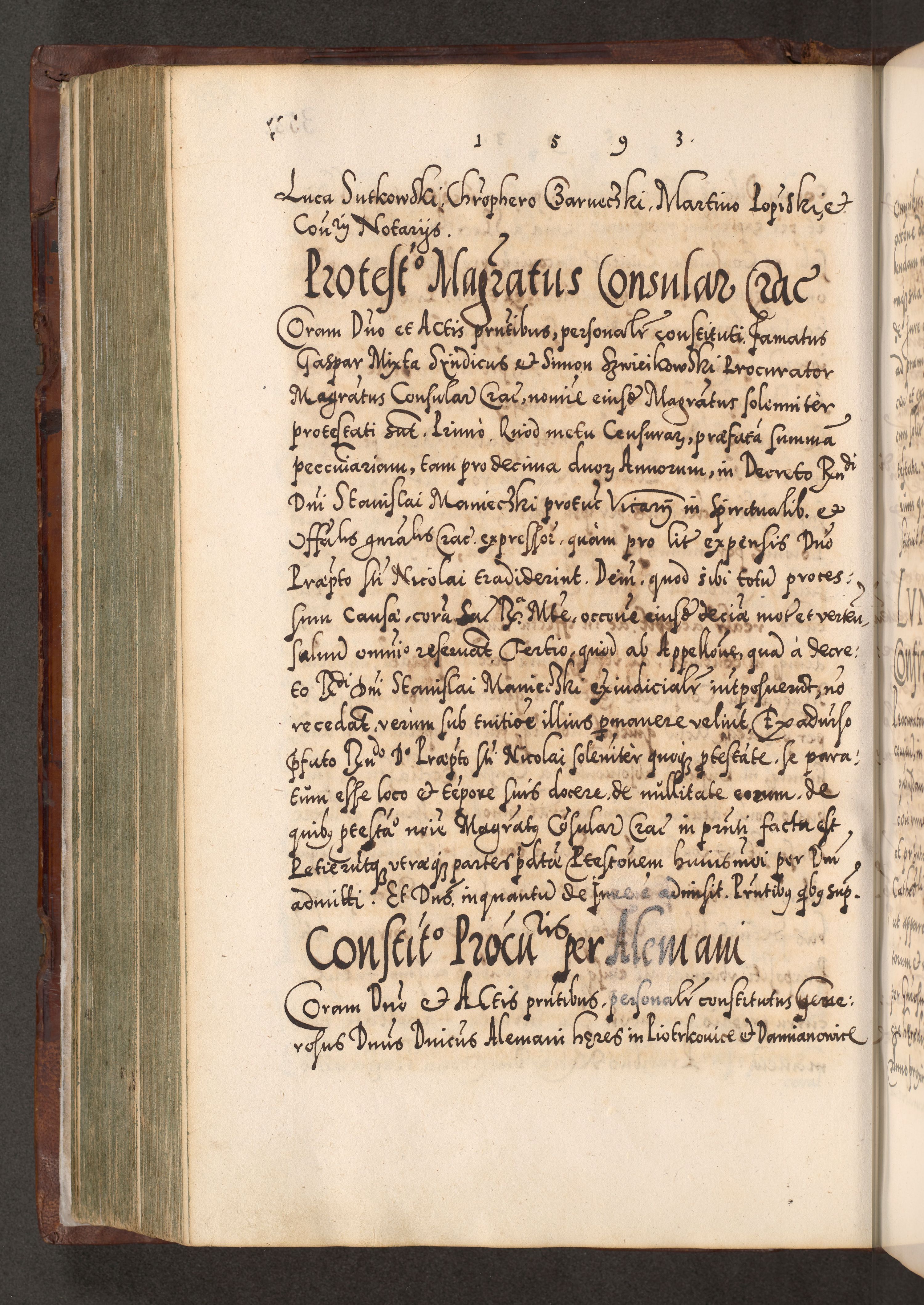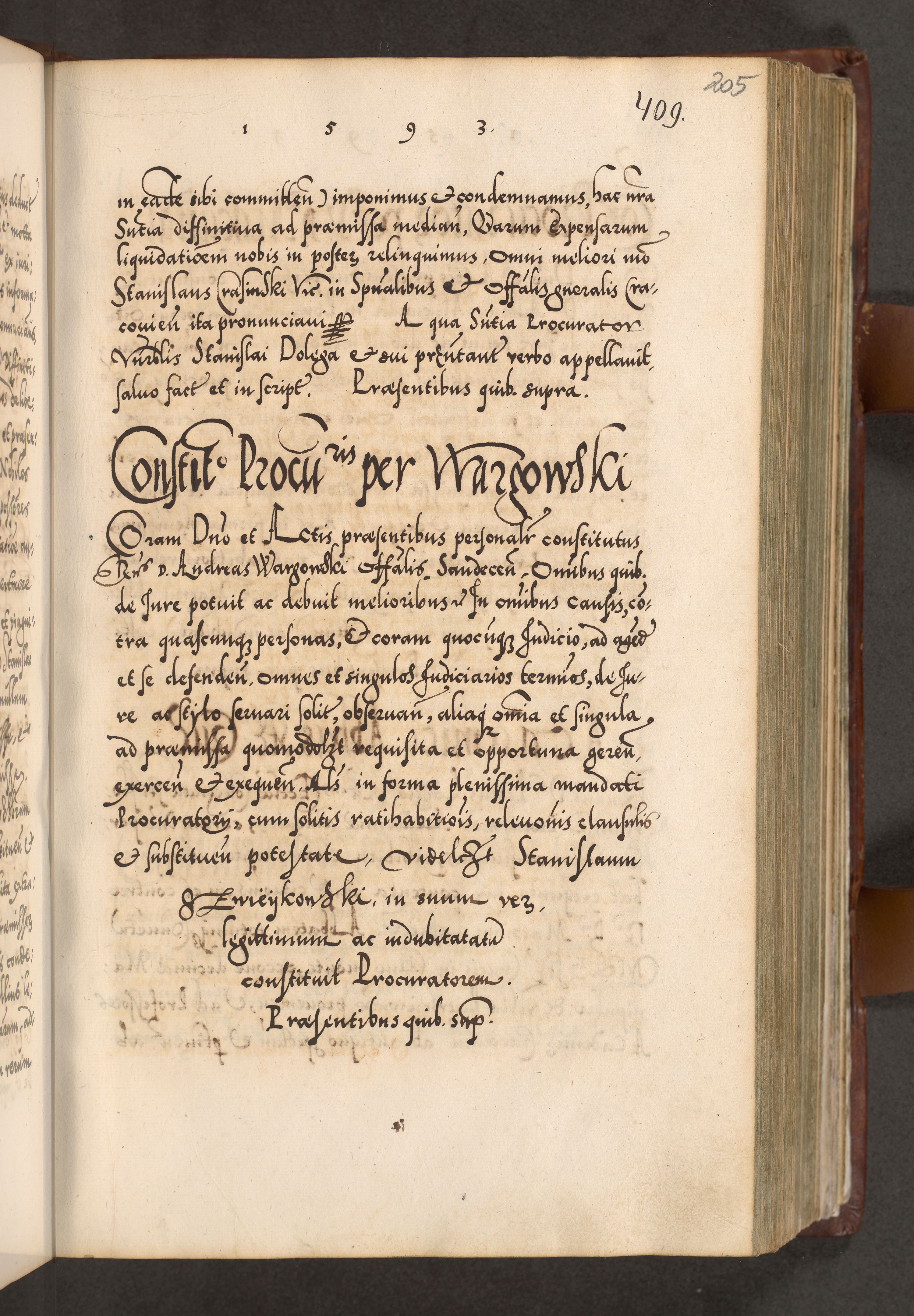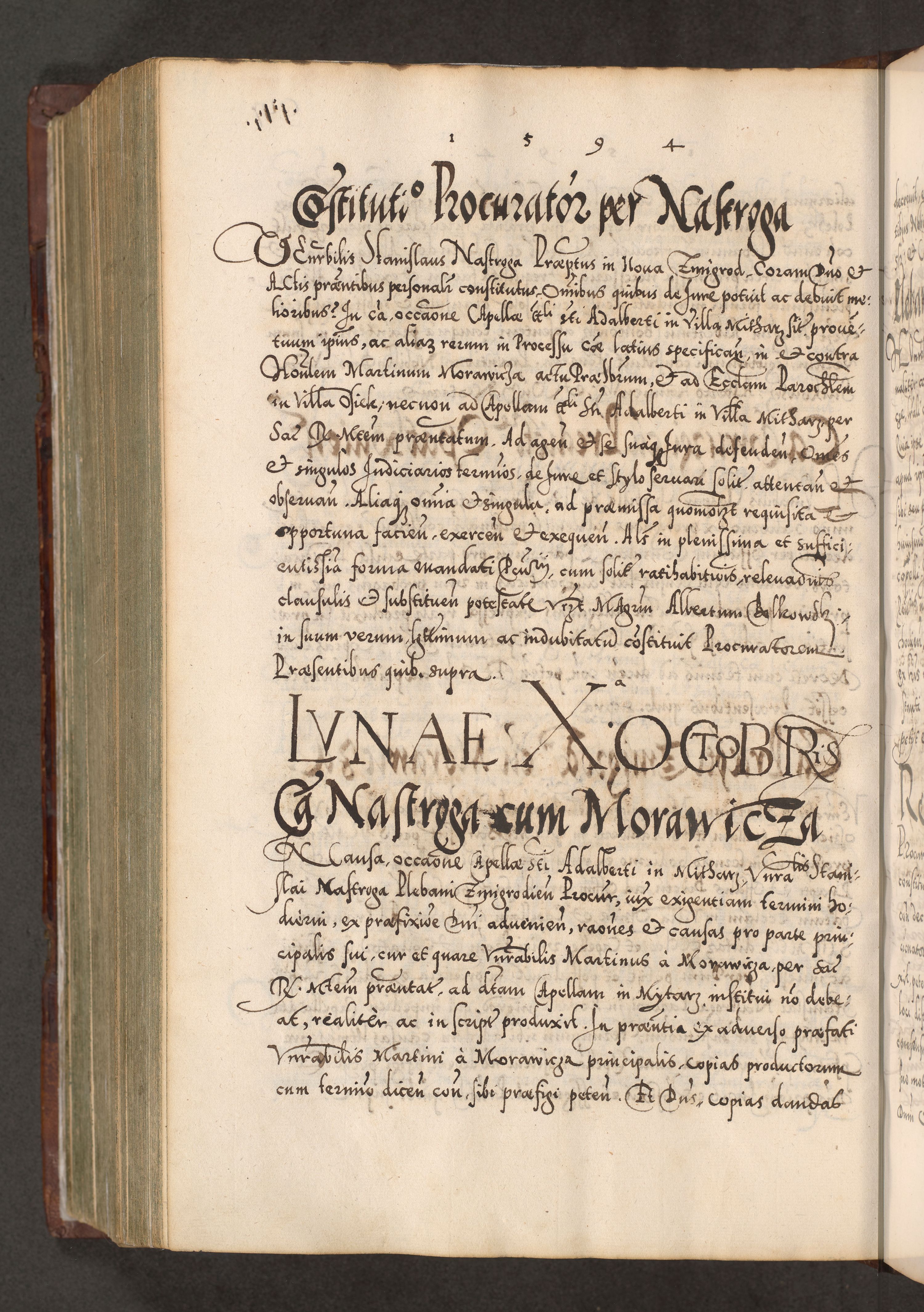 Illistrissimo et revedissimo in Christo Patre Domino Domino Georgio Rzadziwił Miserone Divina Sacrostae R. E. Tituli S. Sixti Presbitero Cardinali Duce in Olyka et Niesswiesz ad Gubernacula Ecclessiae Cracoviensis cuius administratorialem a Sancta Sede Apostolica obtinverat feliciter sedente. Acta actorum, causarum, sententiarum tam deffinitivarum quam interloquutoriarum decretorum, obligationum, quietationum, recognitionum, constitutionum procuratorum etc. coram Reverendo Domino Stanislao Crassinskz de Crasne Archidiacono Cracoviensis, Scholastico Gnesnesis, Custode Plocensis etc. Vicario et Officiali Generali Cracoviensi in Ano Domini Millesimo Quingentesimo Nonagesimo Primo cuius indictio quarta pontificatus SS. Domini Nostri Gregorii XIIII Anno I psius prio feliciter incipiut