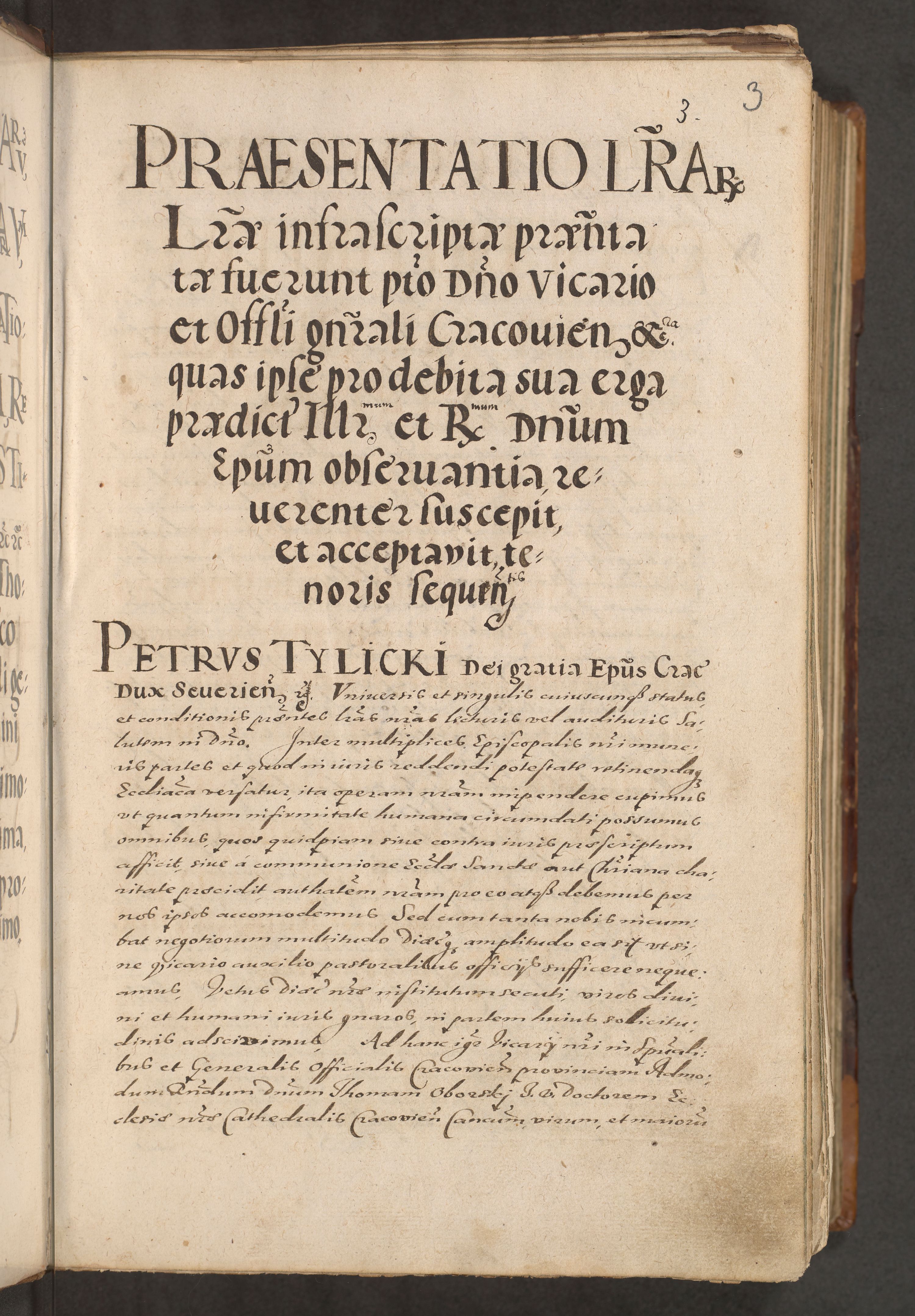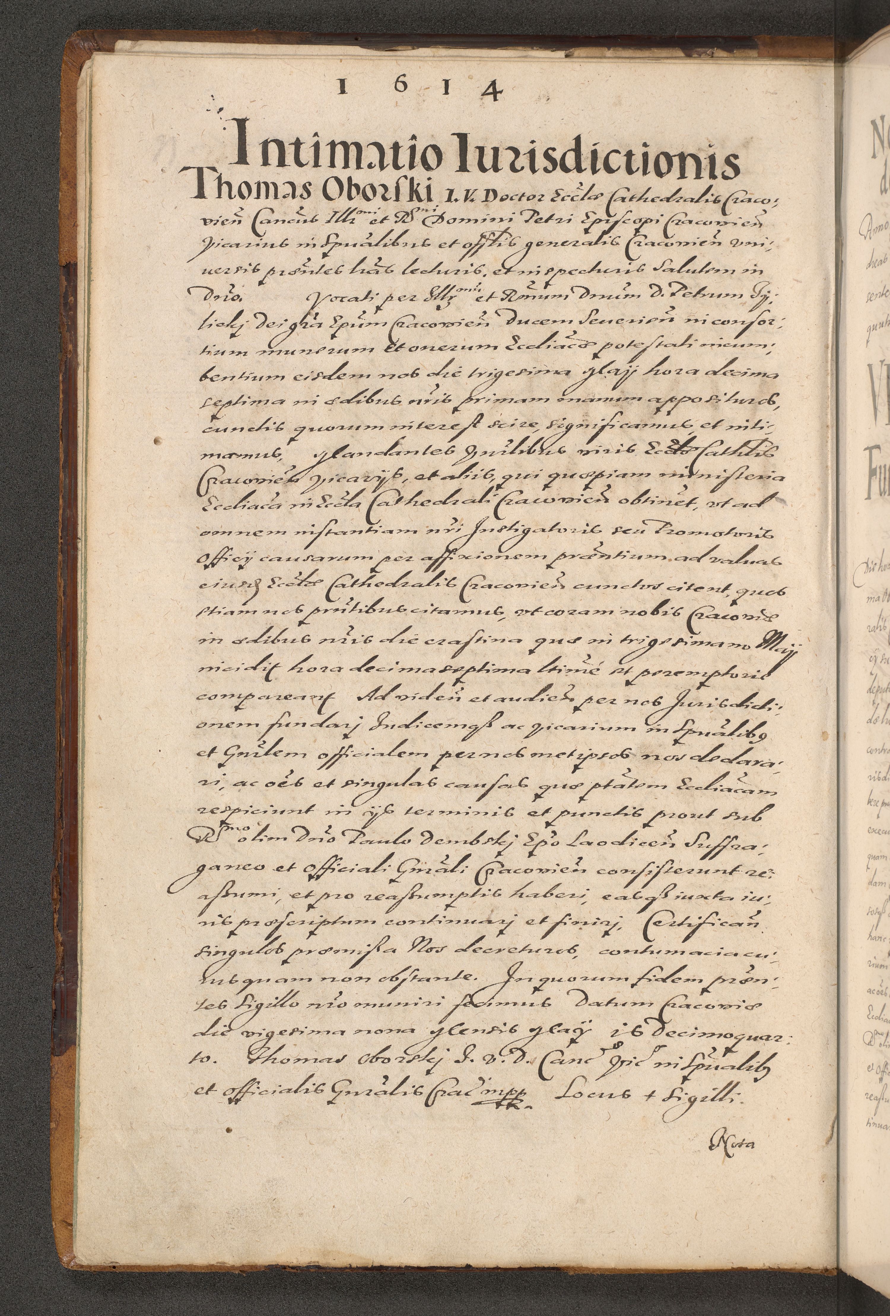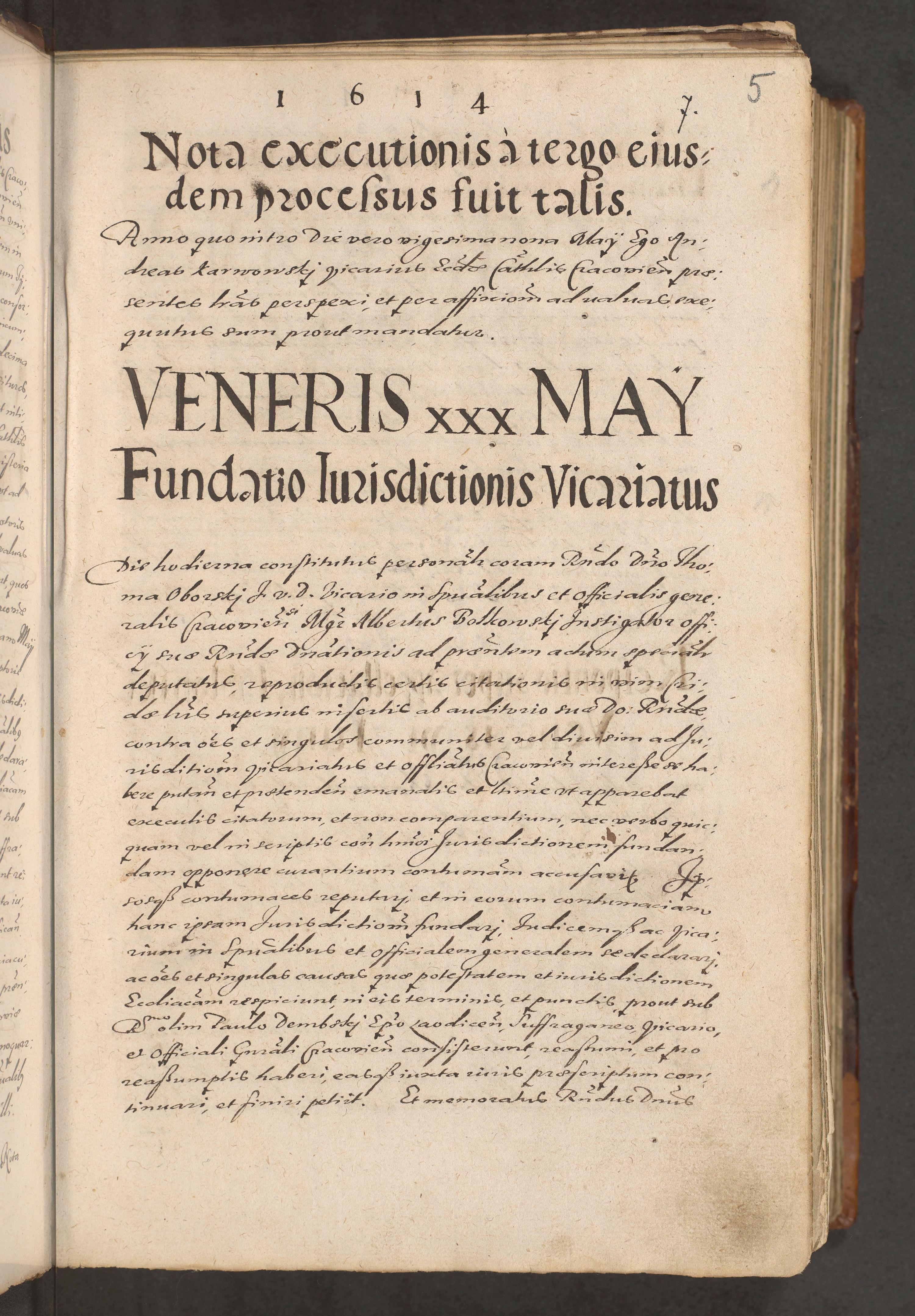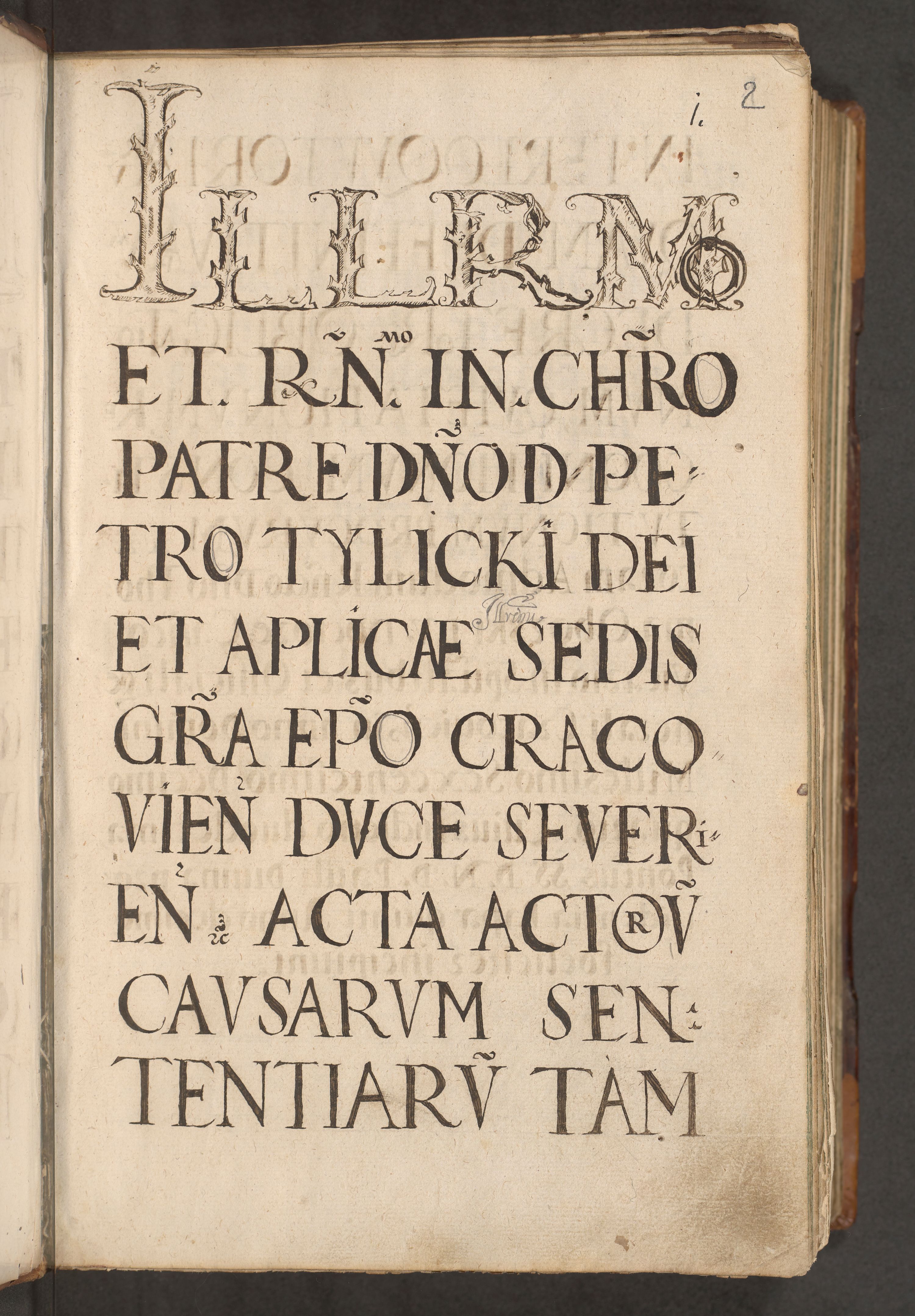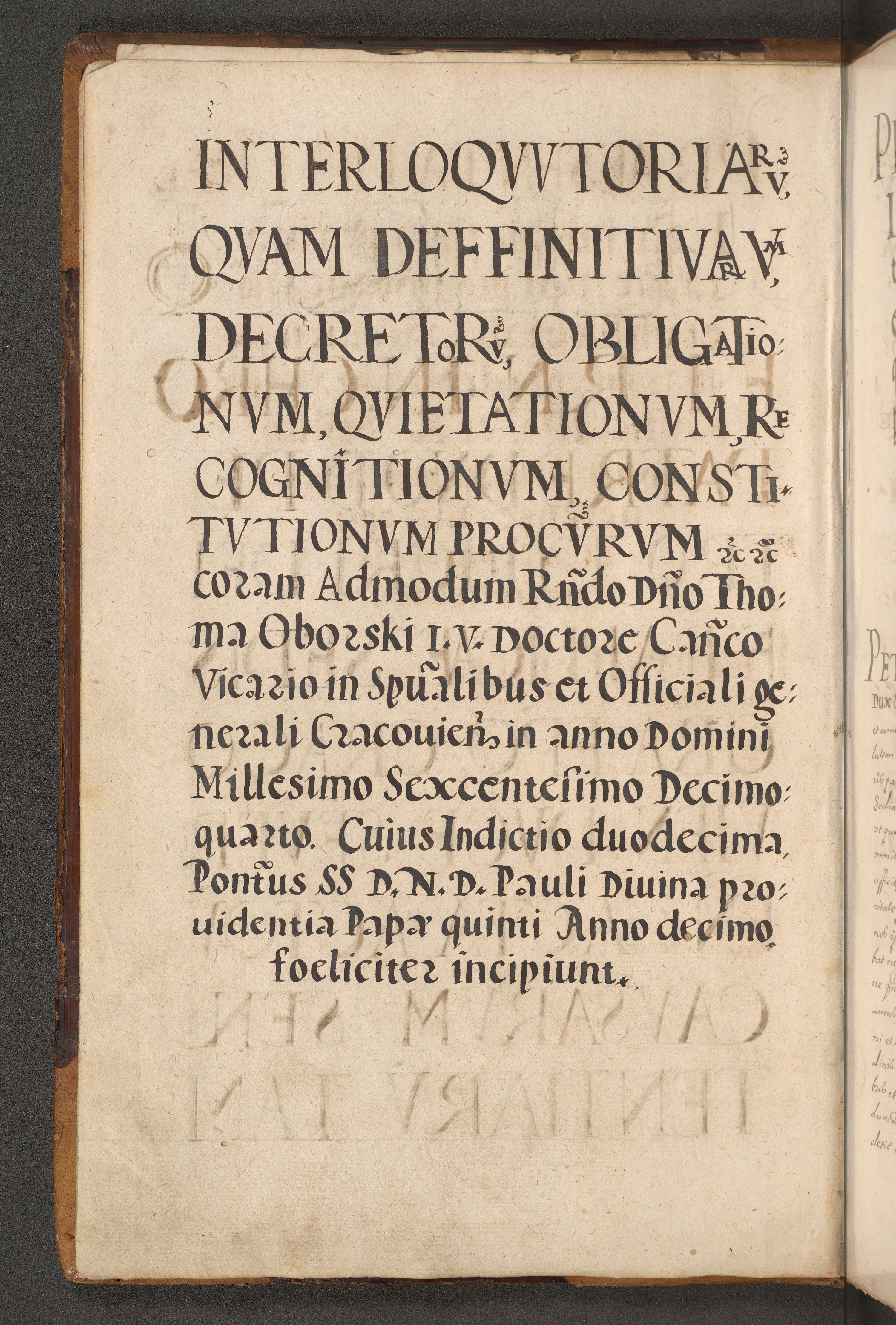 Illustrissimo et Reverendissimo in Christo Patre Domino Domino Petro Tylicki Dei et Apostolice Sedis Gratia Episcopo Cracoviensis Duce Severiensis Acta actorum causarum sententiarum tam interloquutoriarum quam definitivarum decretorum obligationum, quietationum, recognitionum, constitutionum procuratorum etc. etc. coram Admodum Reverendo Domino Thoma Oborski I. V. Doctore Canonico Vicario in Spiritualibus et Officiali generali Cracoviensis in anno Domini Millesimo Sexcentessimo Decimoquarto Cuius Indictio duodecima Pontificus SS. D. N. D. Pauli Divina providentia Papae quinti Anno decimo foeliciter incipiunt