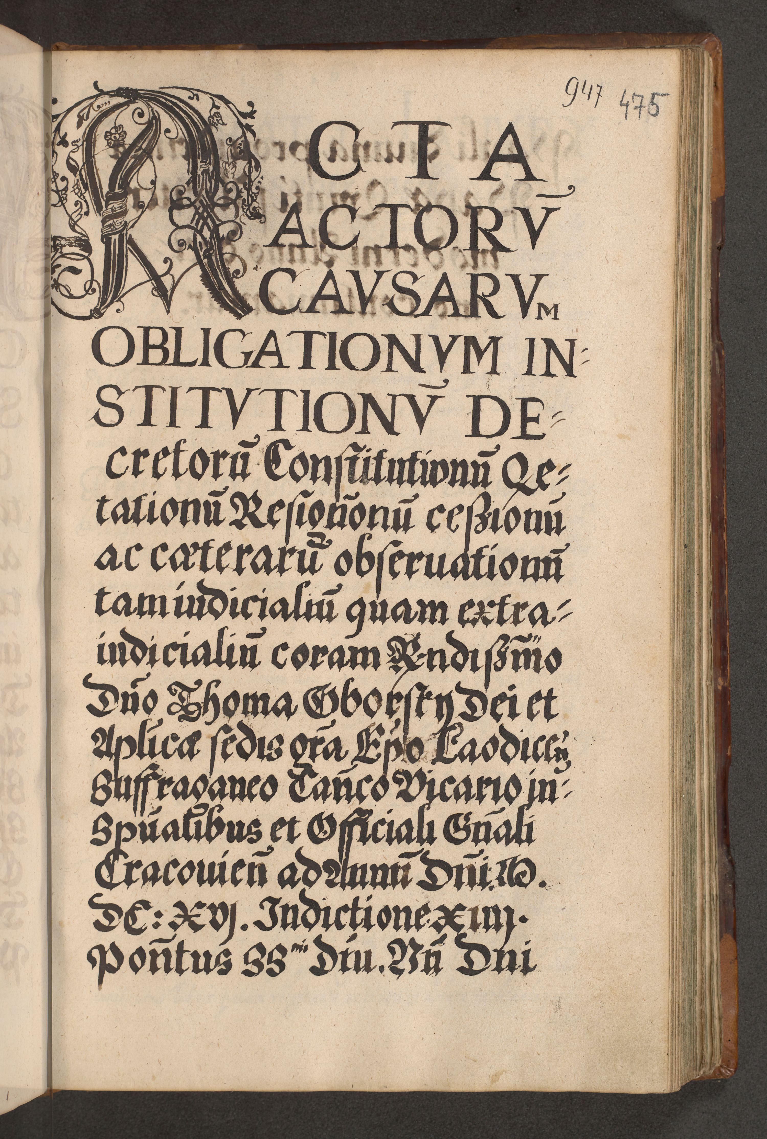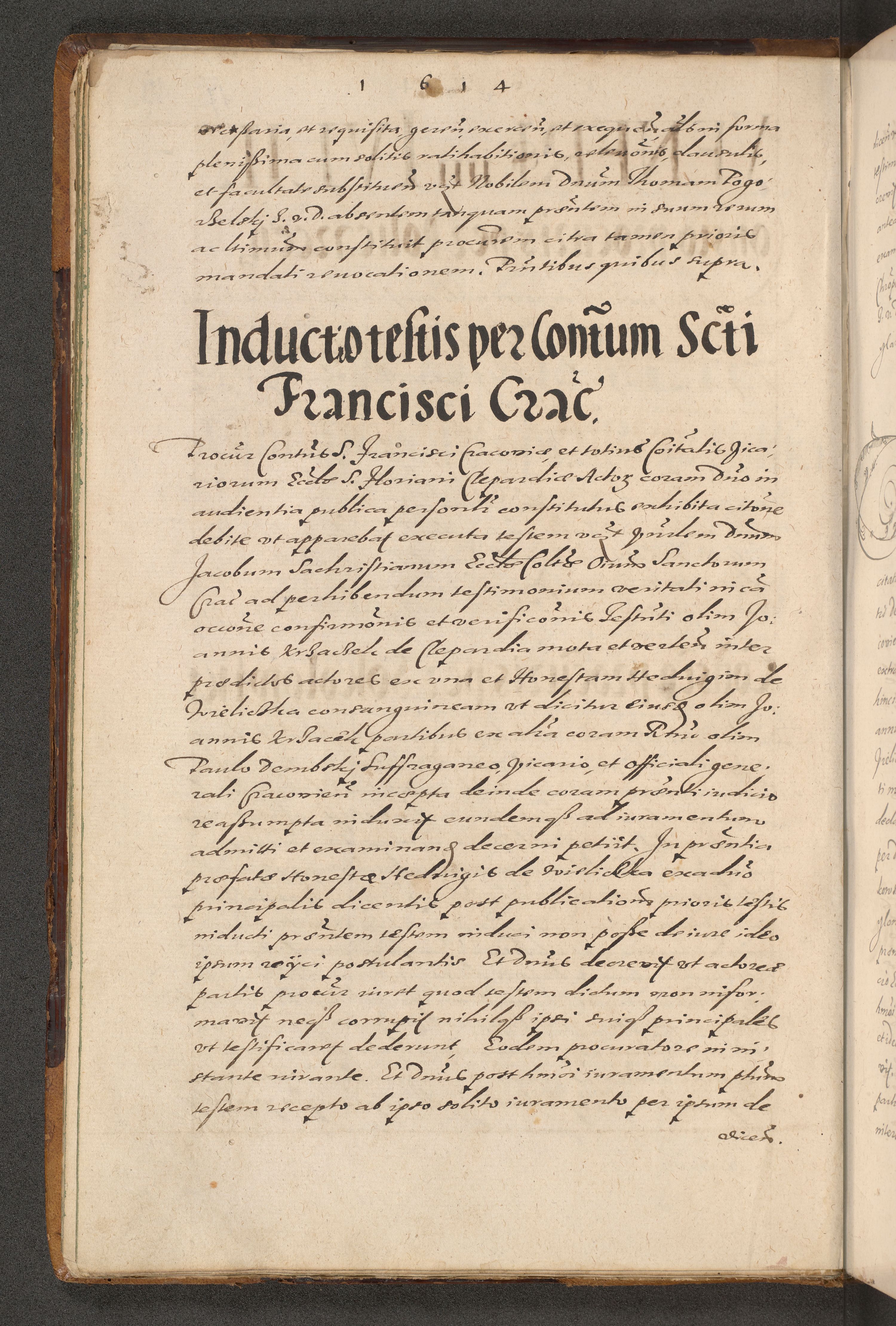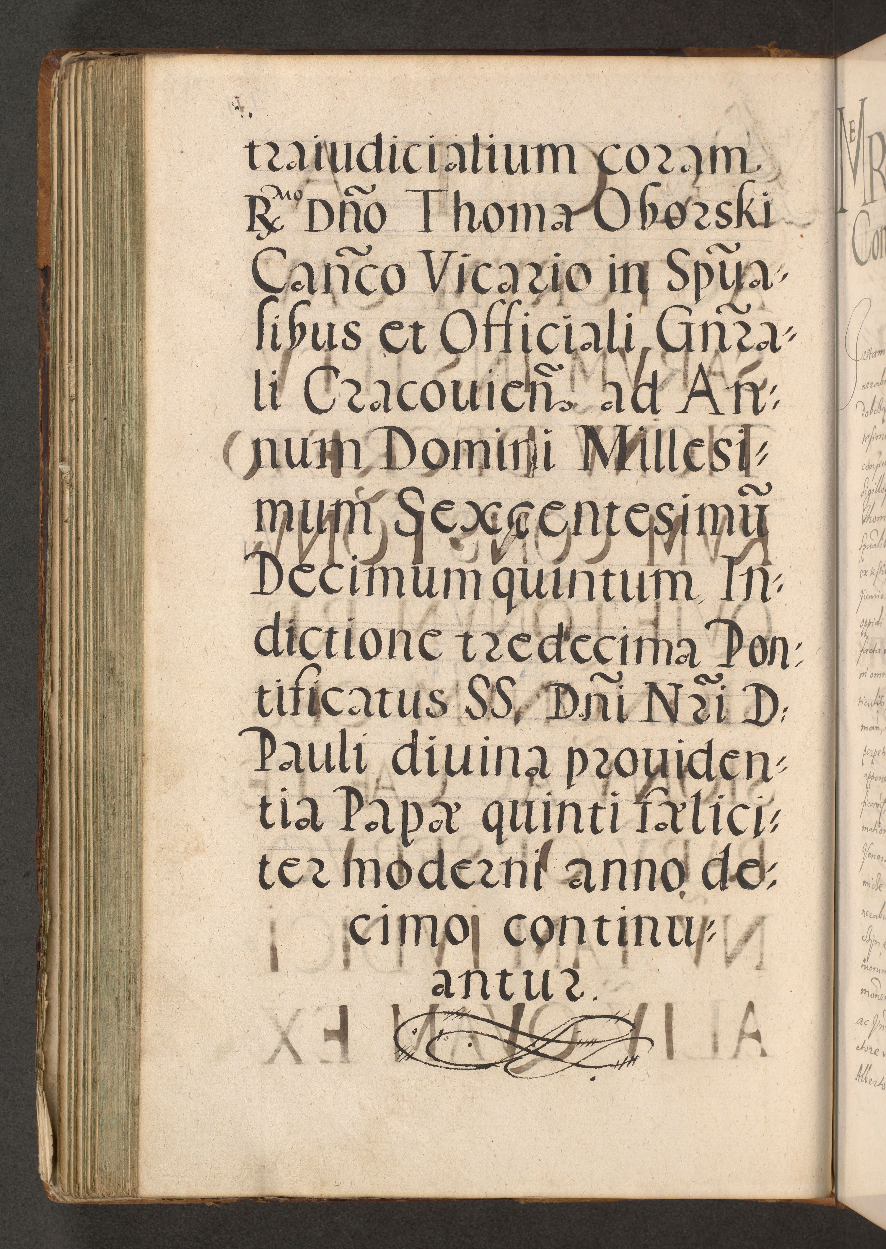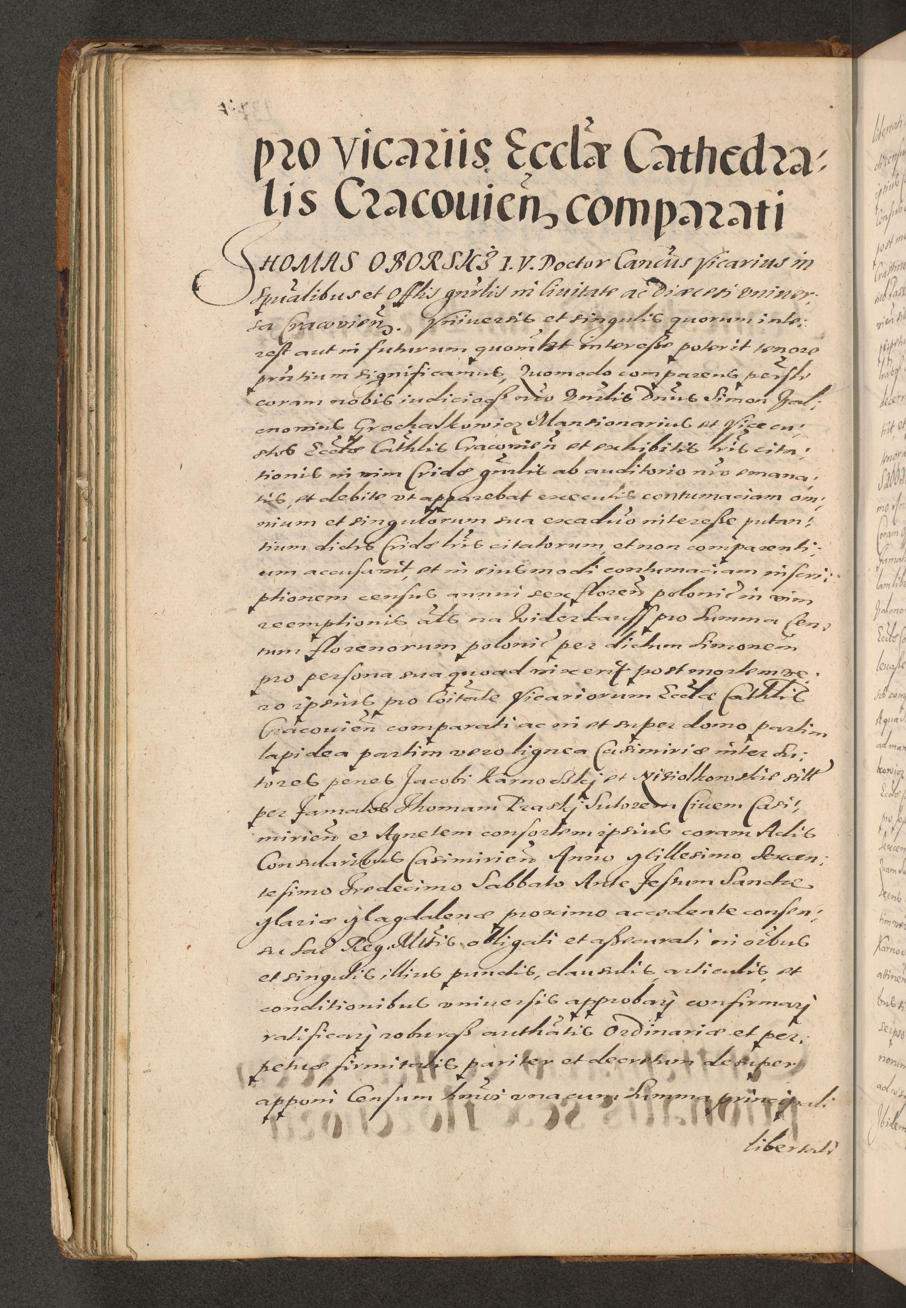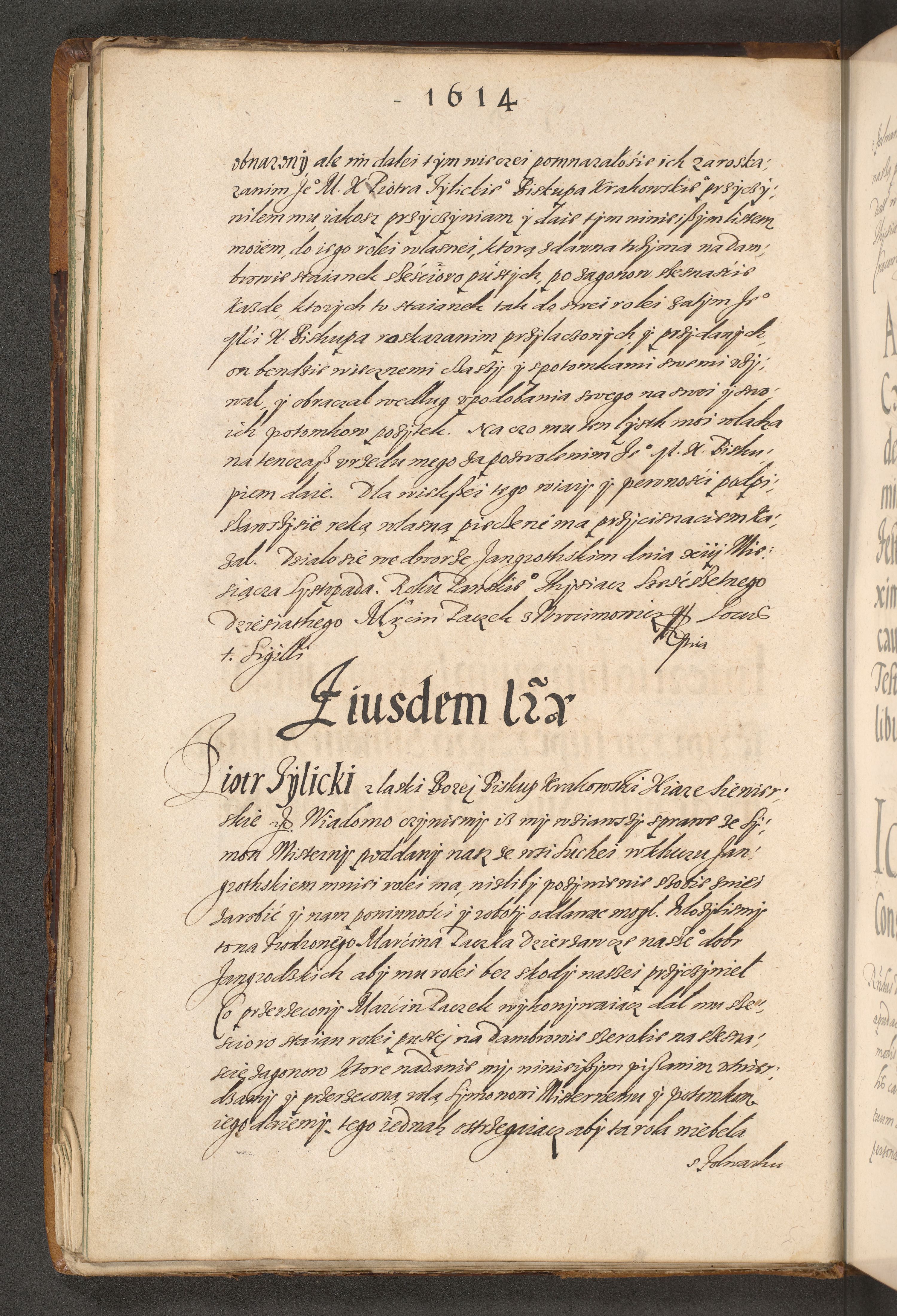 Illustrissimo et Reverendissimo in Christo Patre Domino Domino Petro Tylicki Dei et Apostolice Sedis Gratia Episcopo Cracoviensis Duce Severiensis Acta actorum causarum sententiarum tam interloquutoriarum quam definitivarum decretorum obligationum, quietationum, recognitionum, constitutionum procuratorum etc. etc. coram Admodum Reverendo Domino Thoma Oborski I. V. Doctore Canonico Vicario in Spiritualibus et Officiali generali Cracoviensis in anno Domini Millesimo Sexcentessimo Decimoquarto Cuius Indictio duodecima Pontificus SS. D. N. D. Pauli Divina providentia Papae quinti Anno decimo foeliciter incipiunt