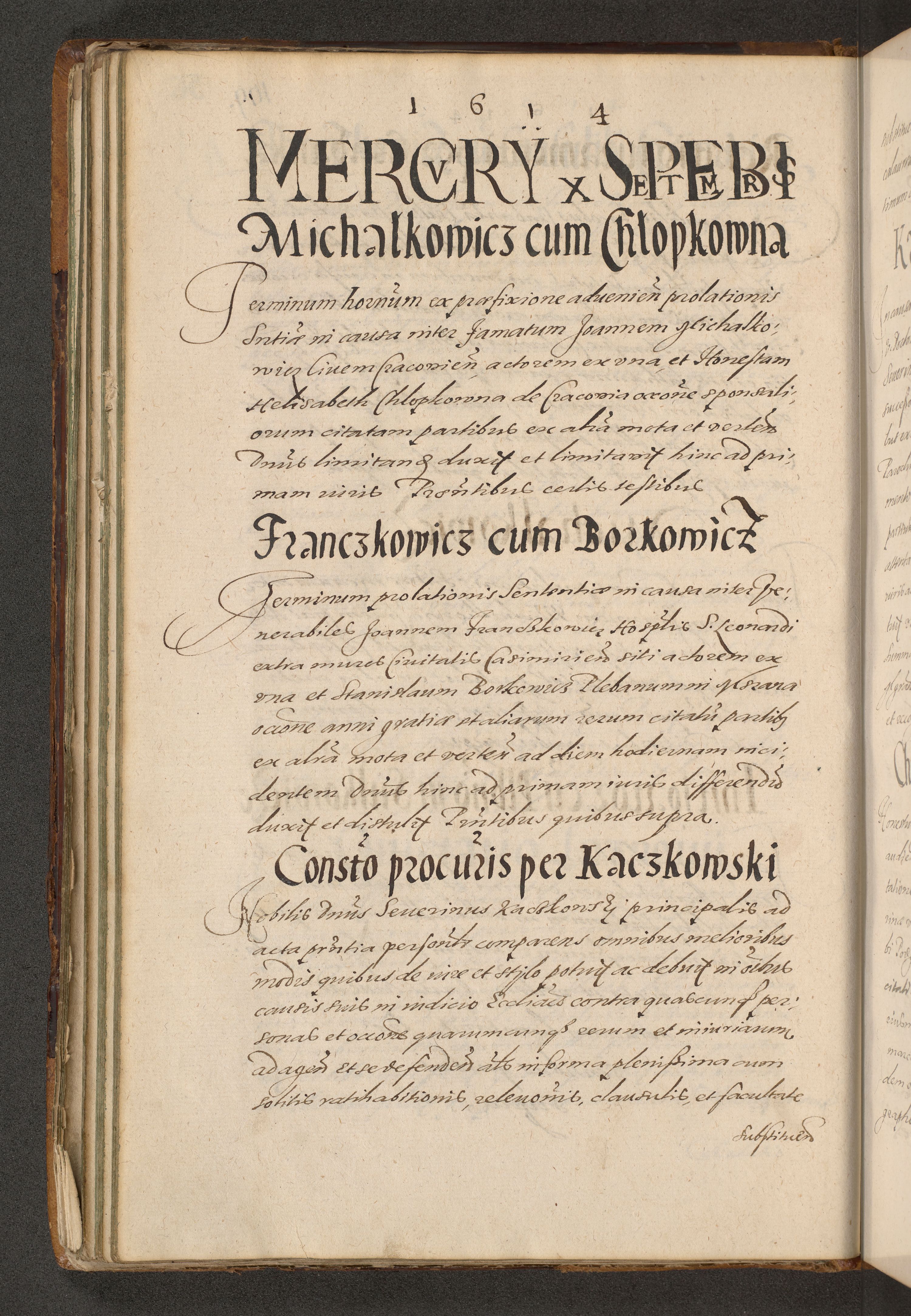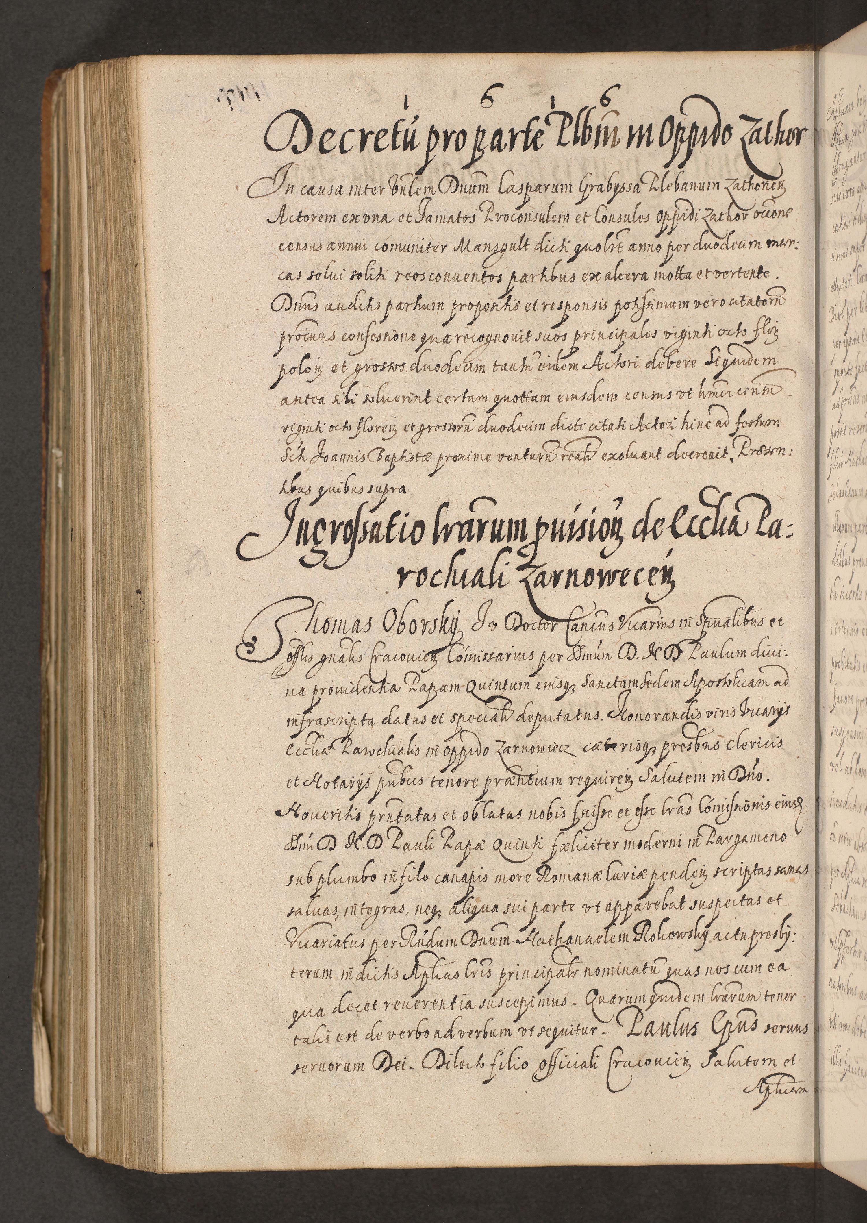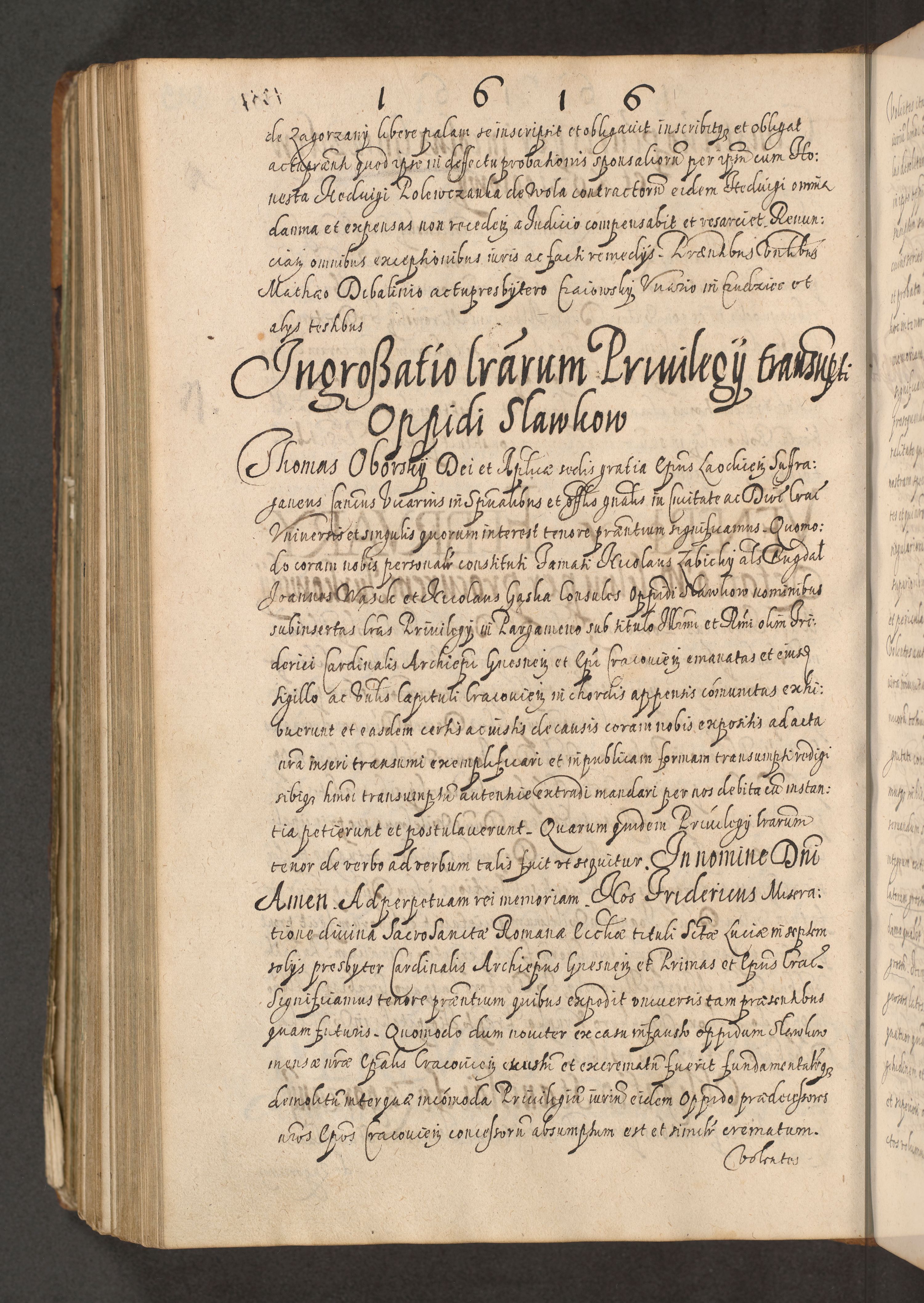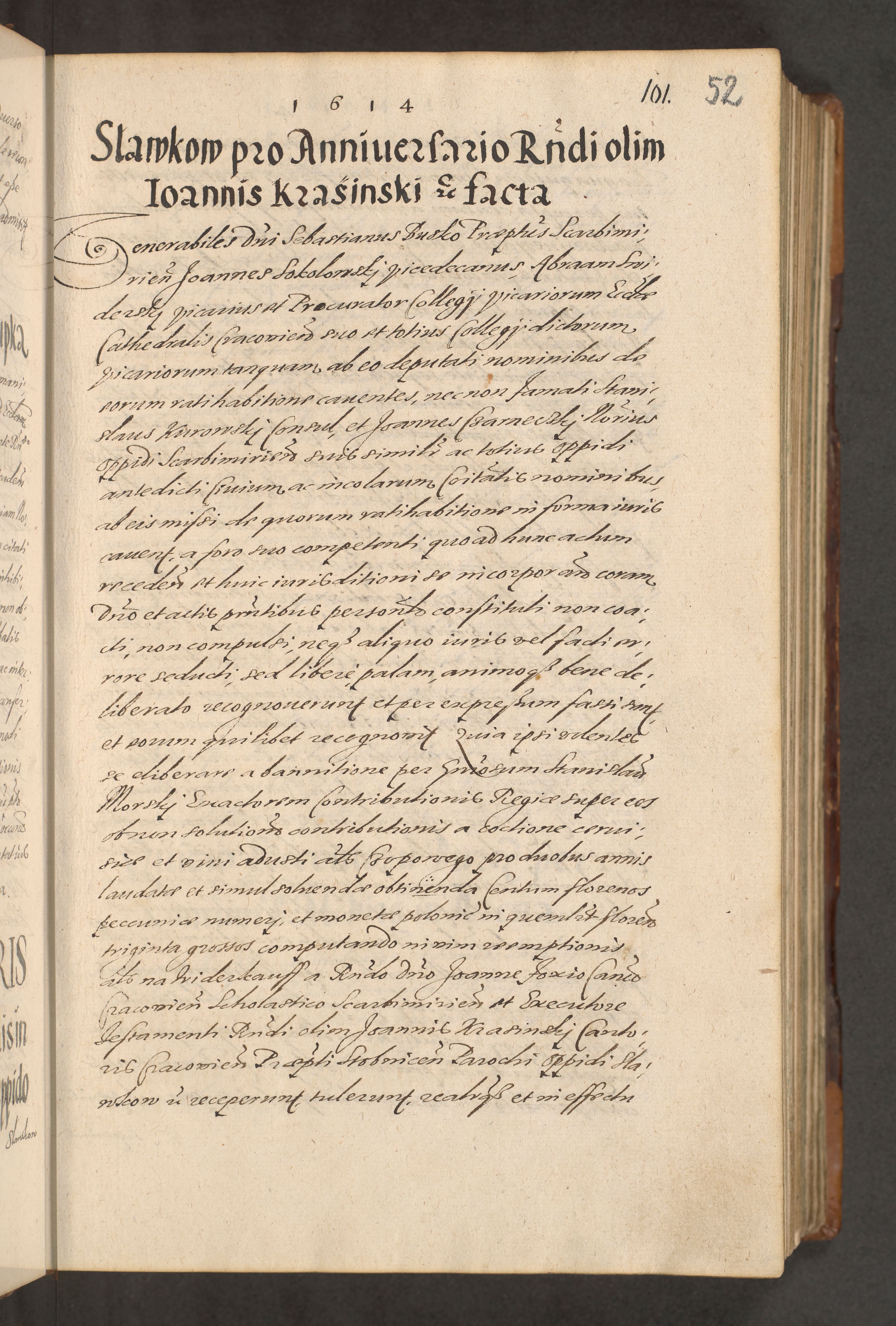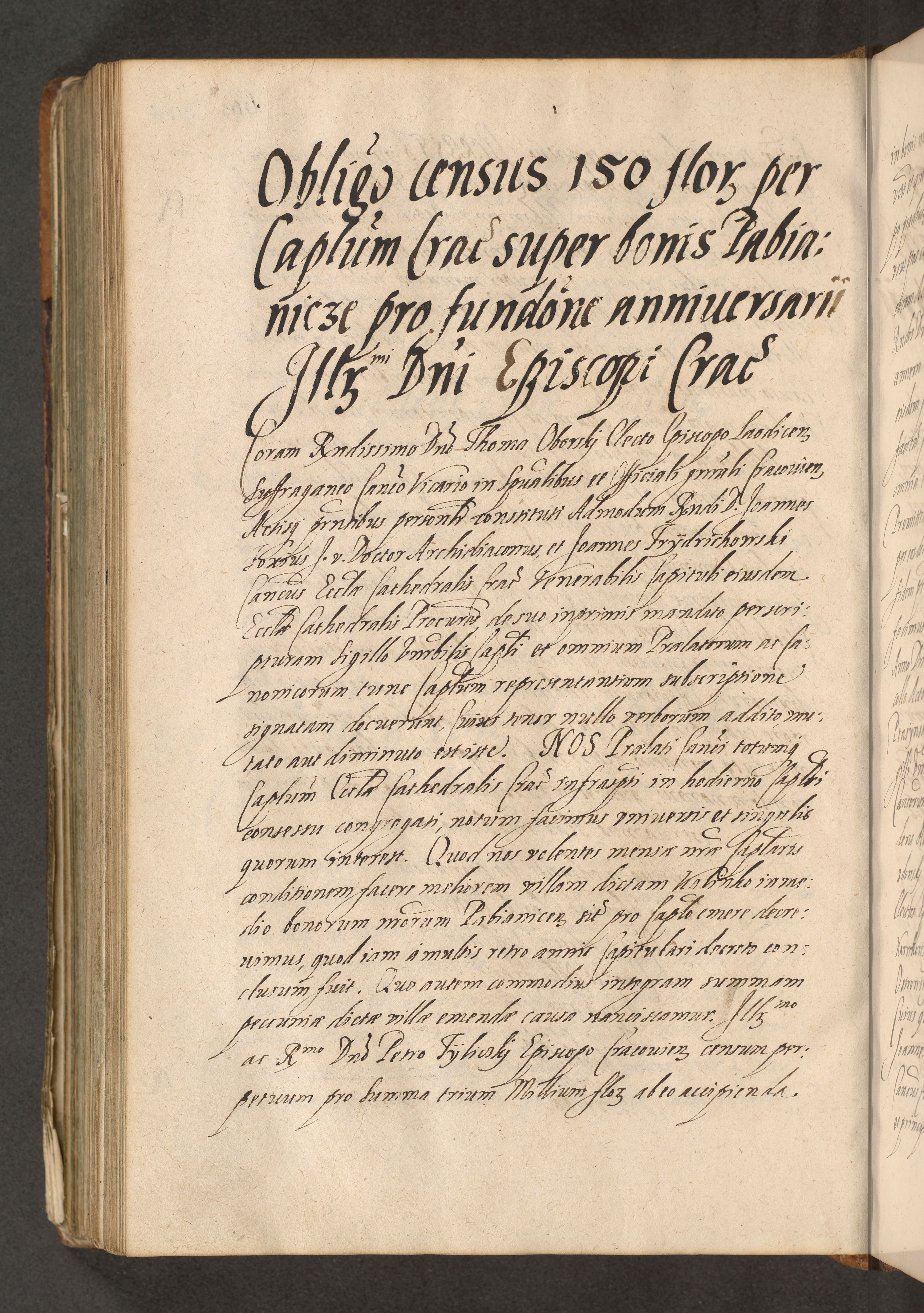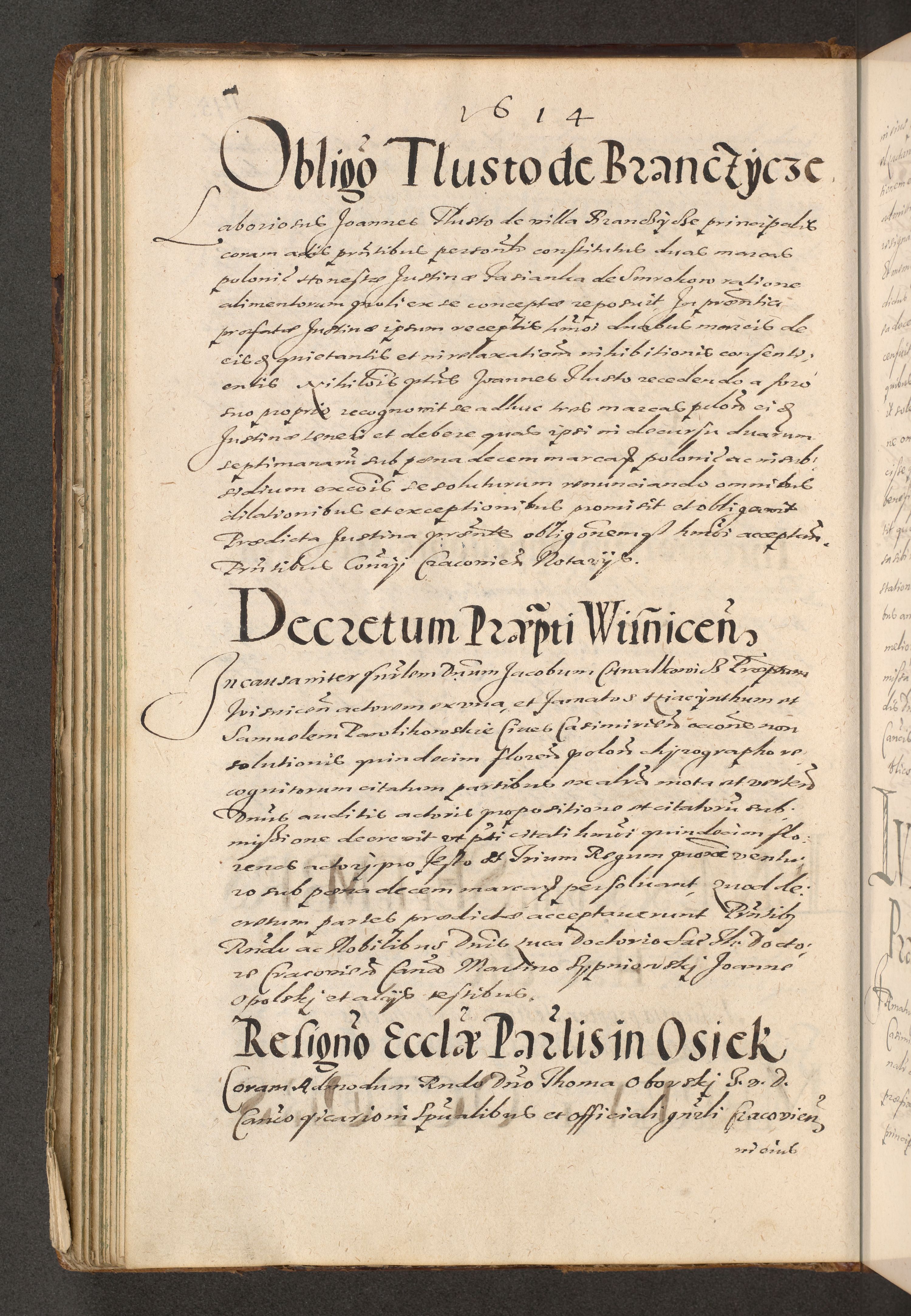 Illustrissimo et Reverendissimo in Christo Patre Domino Domino Petro Tylicki Dei et Apostolice Sedis Gratia Episcopo Cracoviensis Duce Severiensis Acta actorum causarum sententiarum tam interloquutoriarum quam definitivarum decretorum obligationum, quietationum, recognitionum, constitutionum procuratorum etc. etc. coram Admodum Reverendo Domino Thoma Oborski I. V. Doctore Canonico Vicario in Spiritualibus et Officiali generali Cracoviensis in anno Domini Millesimo Sexcentessimo Decimoquarto Cuius Indictio duodecima Pontificus SS. D. N. D. Pauli Divina providentia Papae quinti Anno decimo foeliciter incipiunt