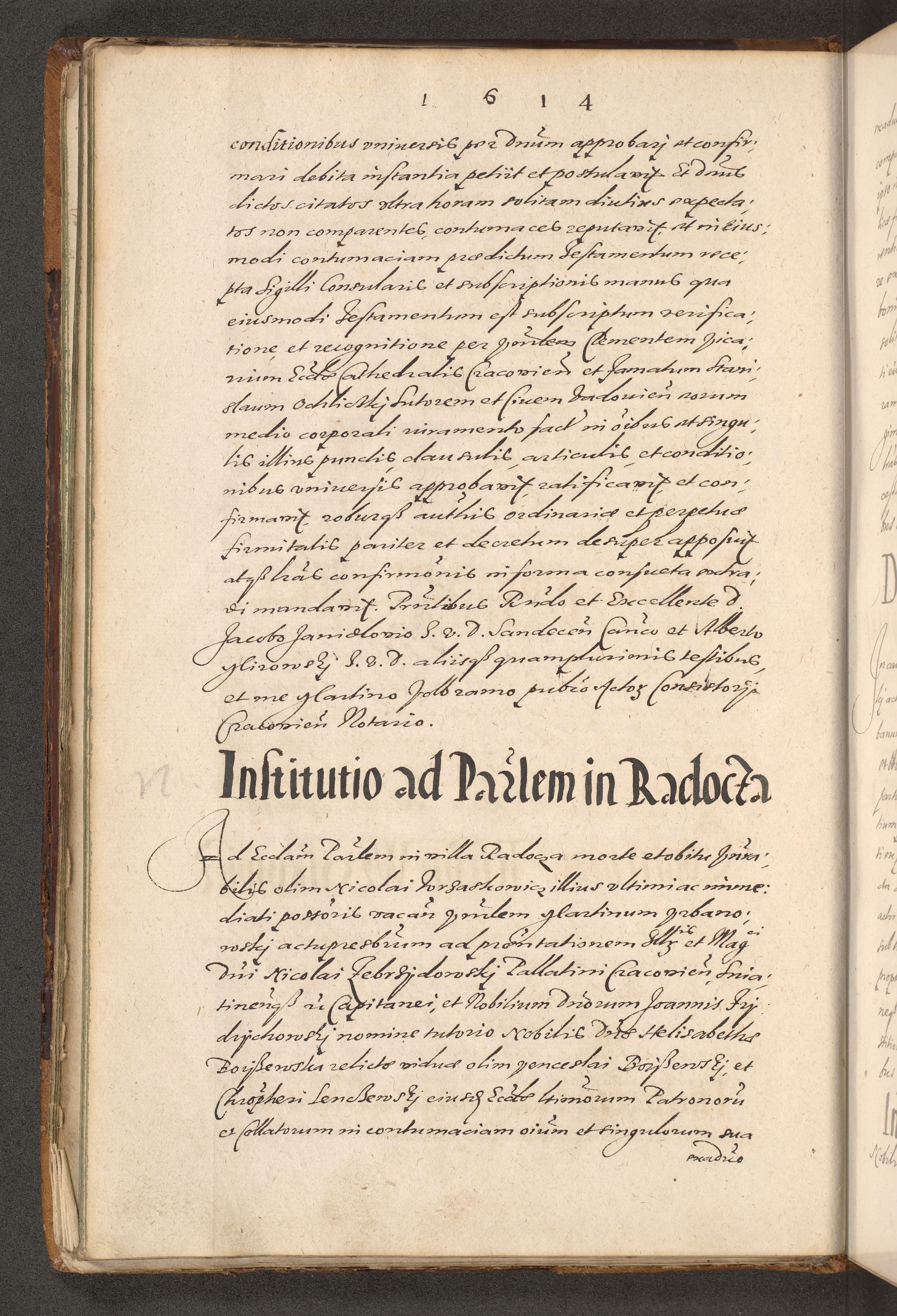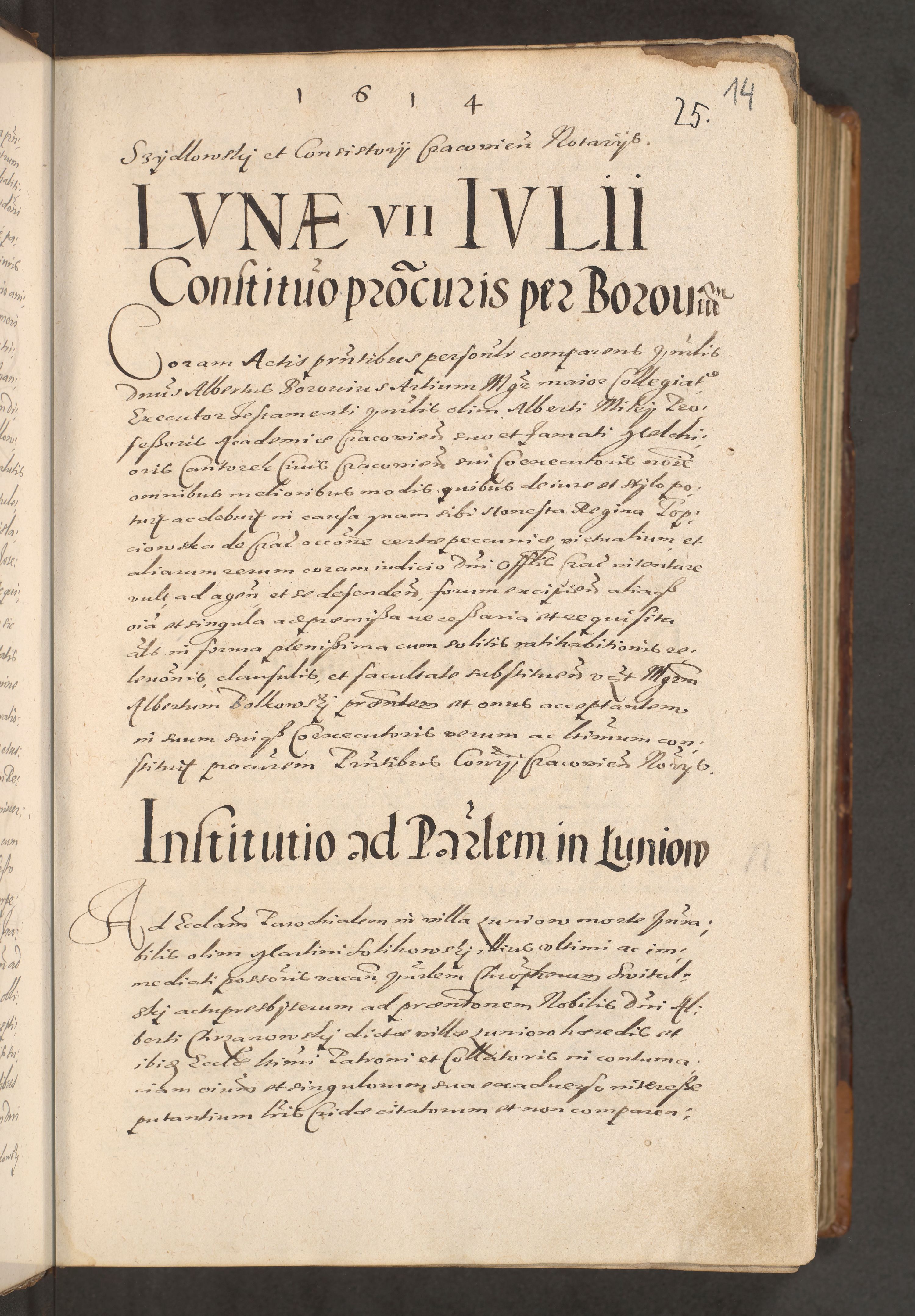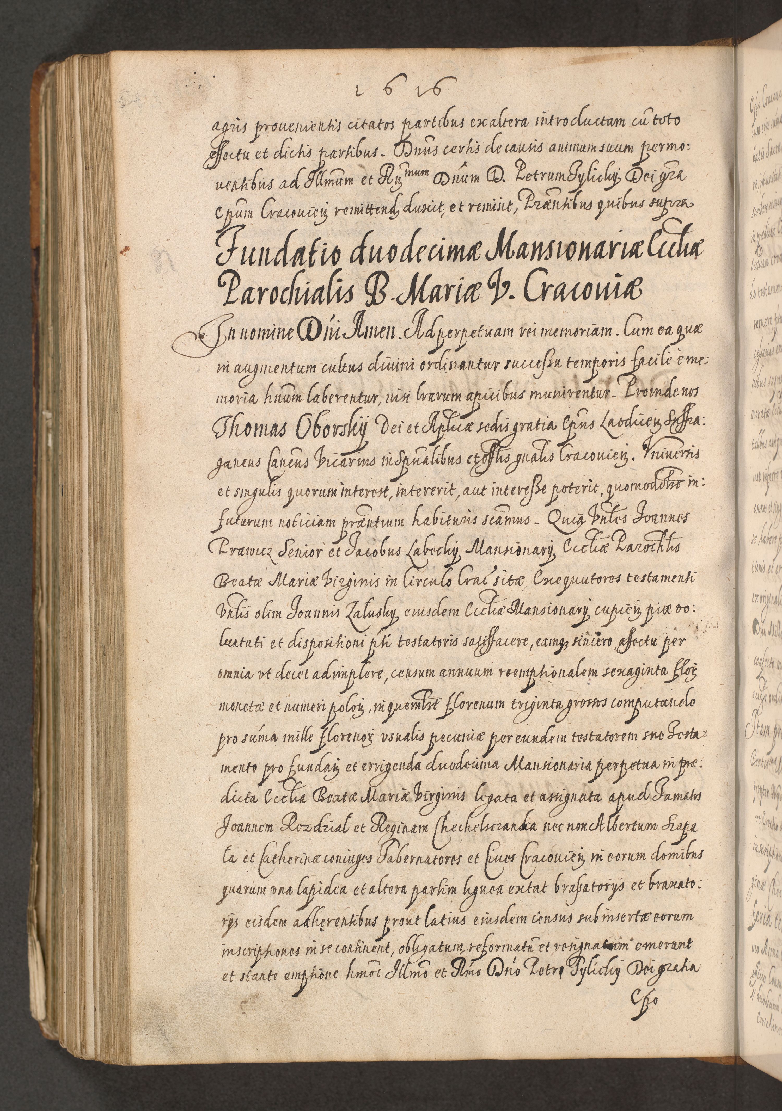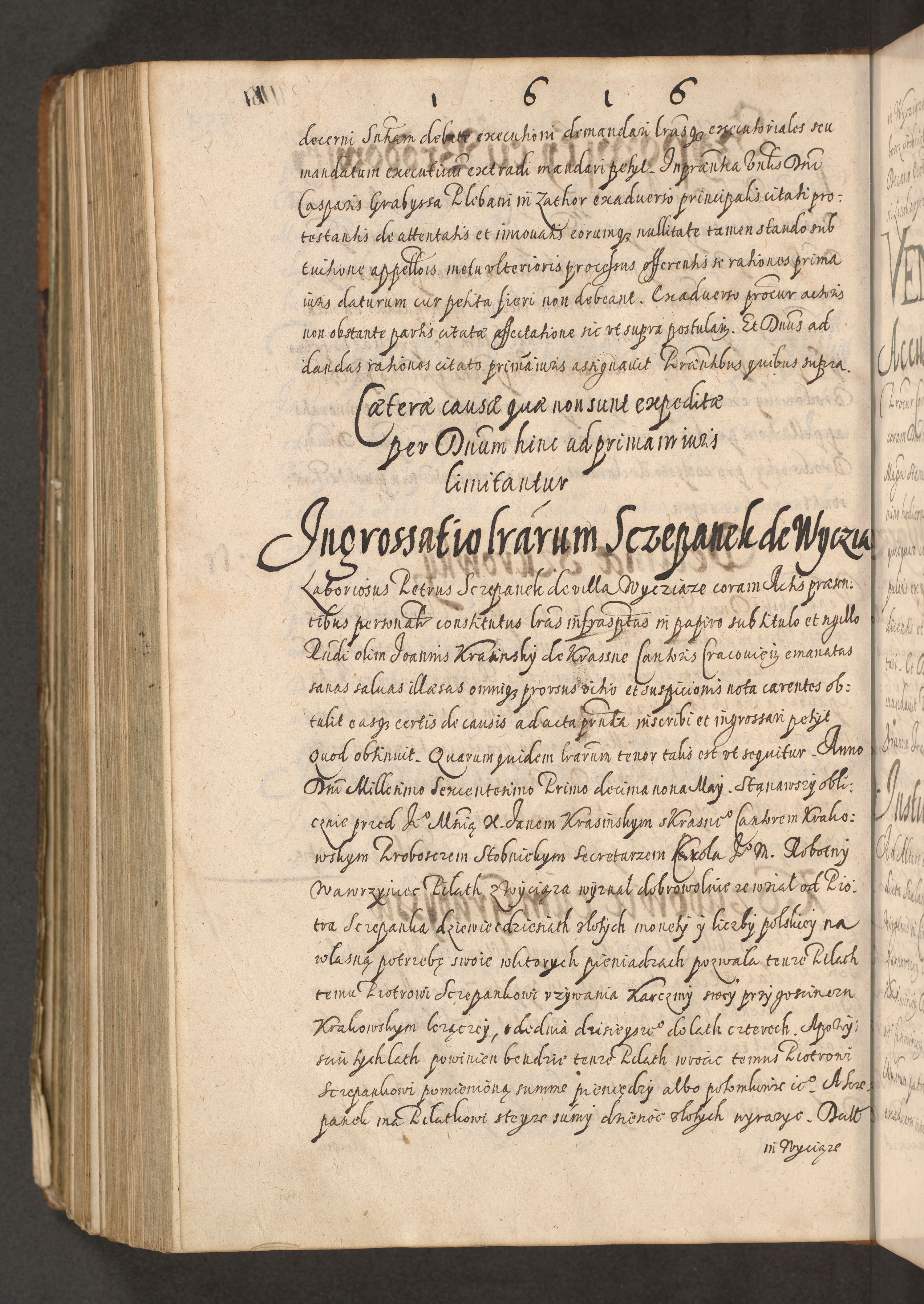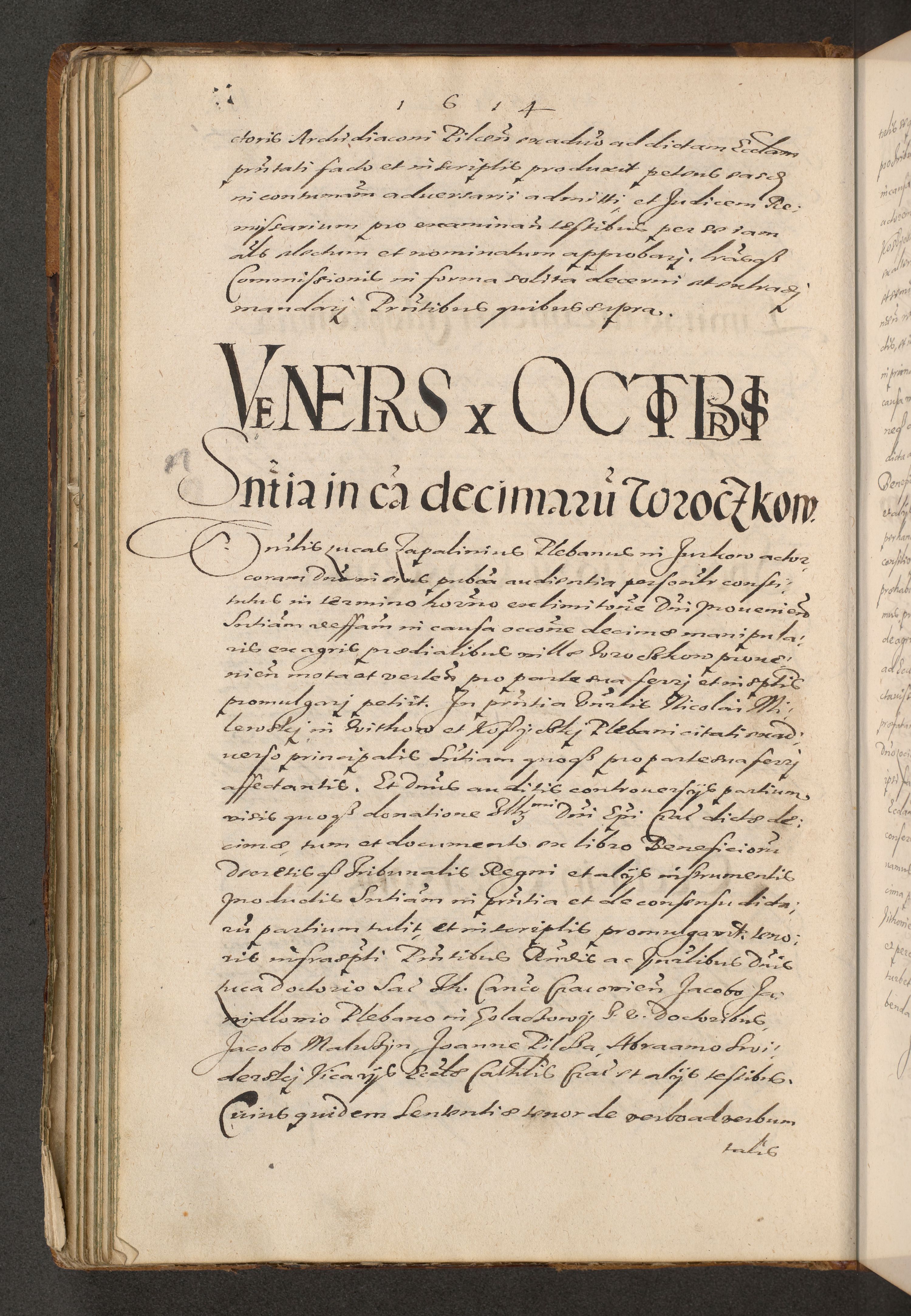 Illustrissimo et Reverendissimo in Christo Patre Domino Domino Petro Tylicki Dei et Apostolice Sedis Gratia Episcopo Cracoviensis Duce Severiensis Acta actorum causarum sententiarum tam interloquutoriarum quam definitivarum decretorum obligationum, quietationum, recognitionum, constitutionum procuratorum etc. etc. coram Admodum Reverendo Domino Thoma Oborski I. V. Doctore Canonico Vicario in Spiritualibus et Officiali generali Cracoviensis in anno Domini Millesimo Sexcentessimo Decimoquarto Cuius Indictio duodecima Pontificus SS. D. N. D. Pauli Divina providentia Papae quinti Anno decimo foeliciter incipiunt