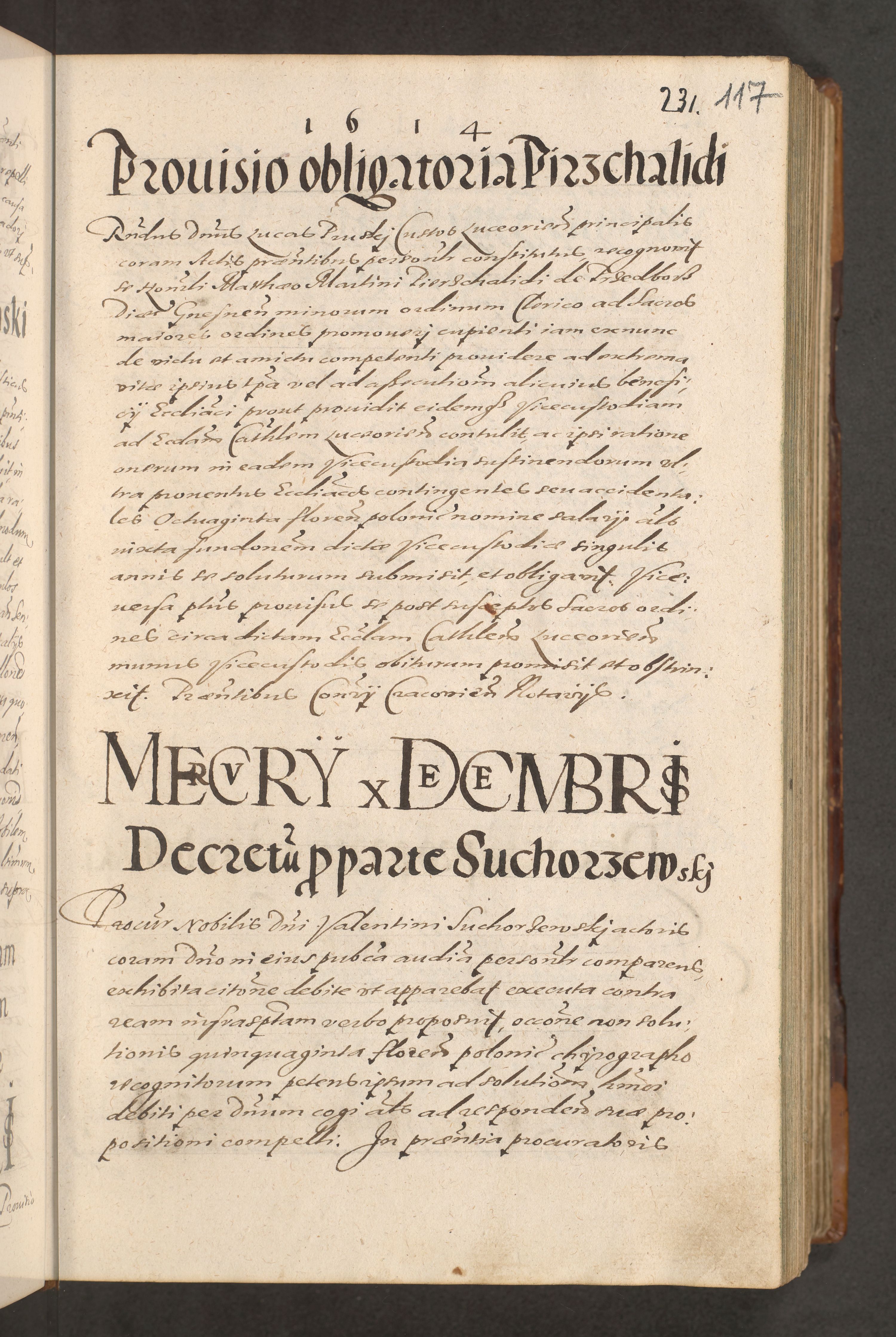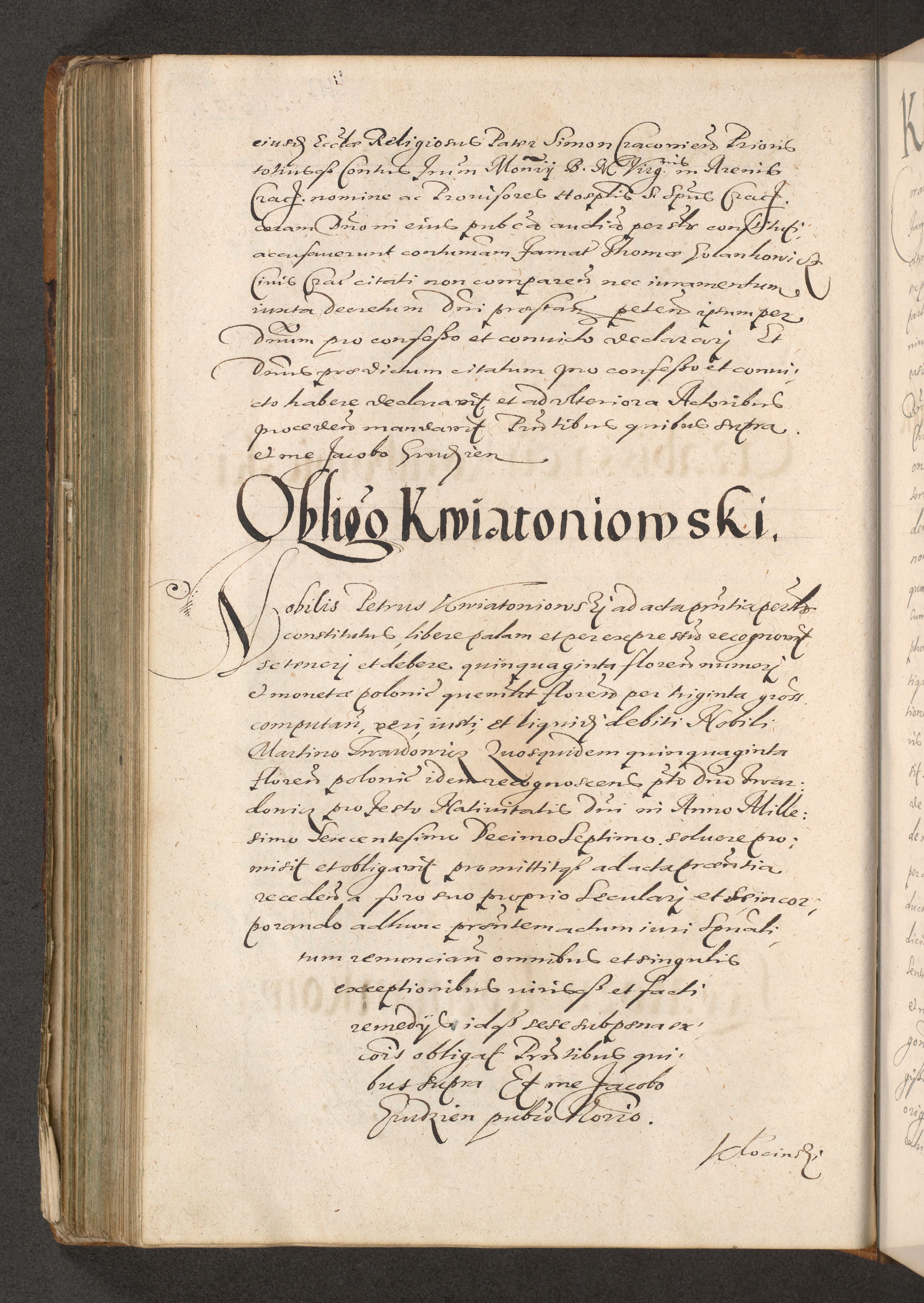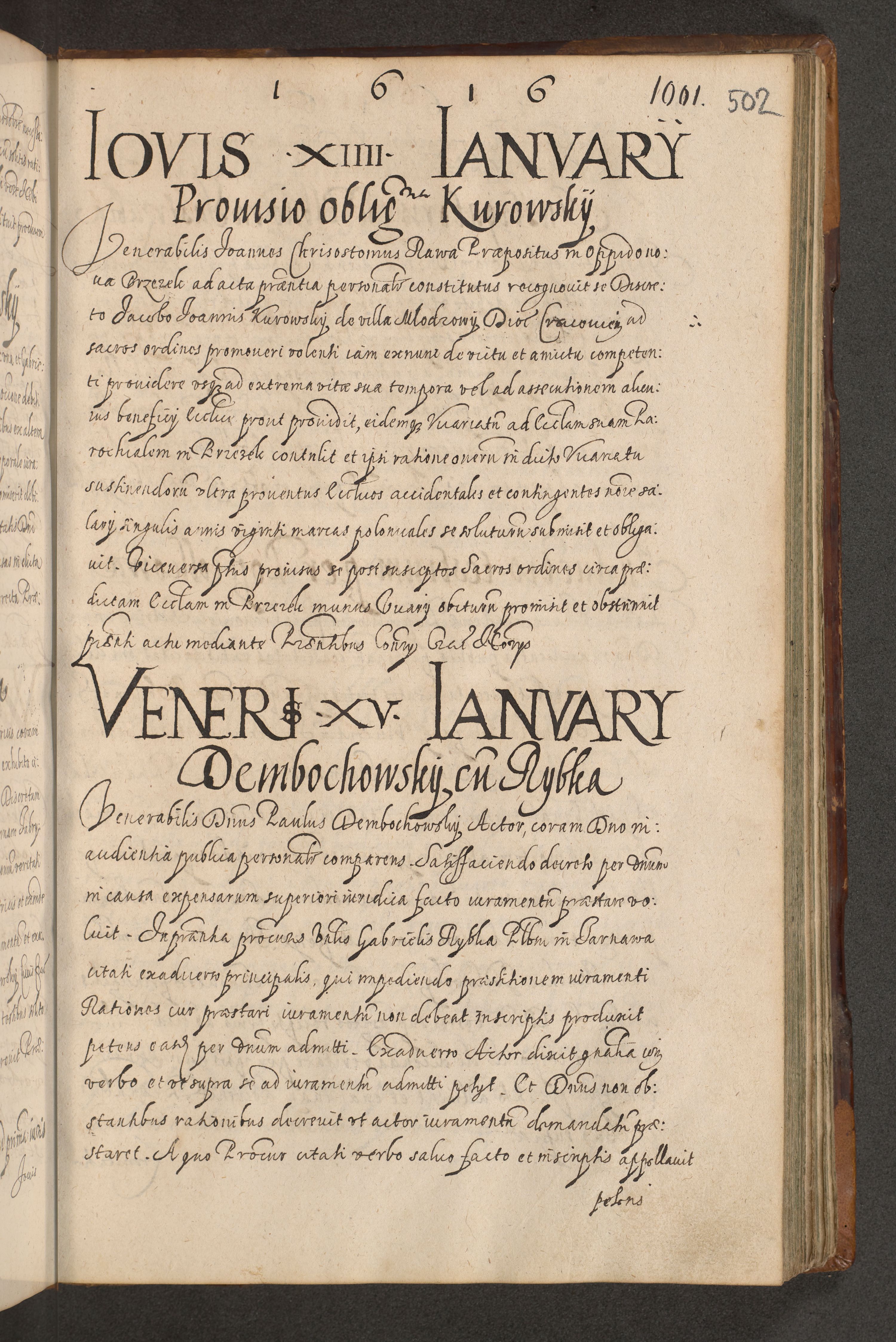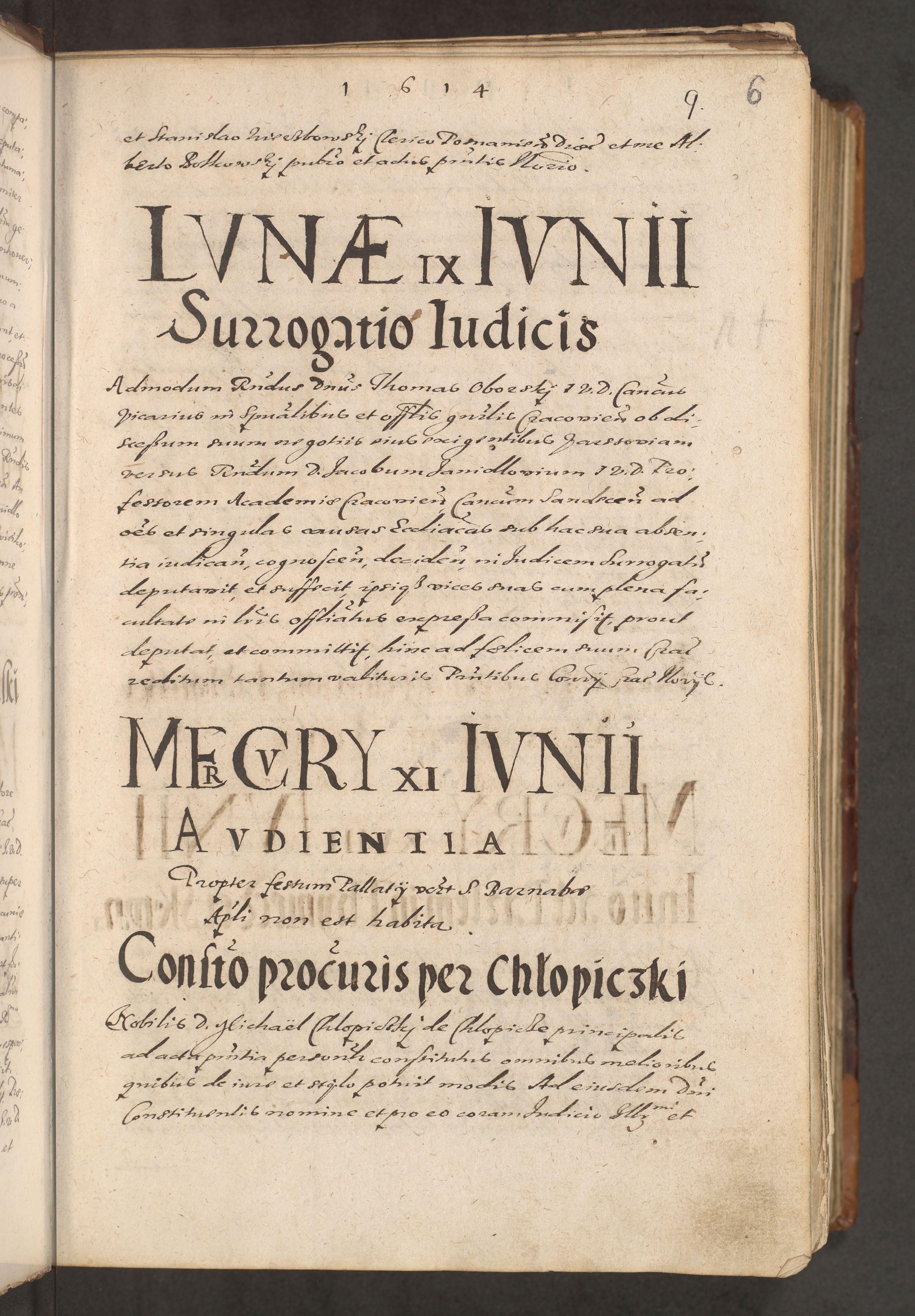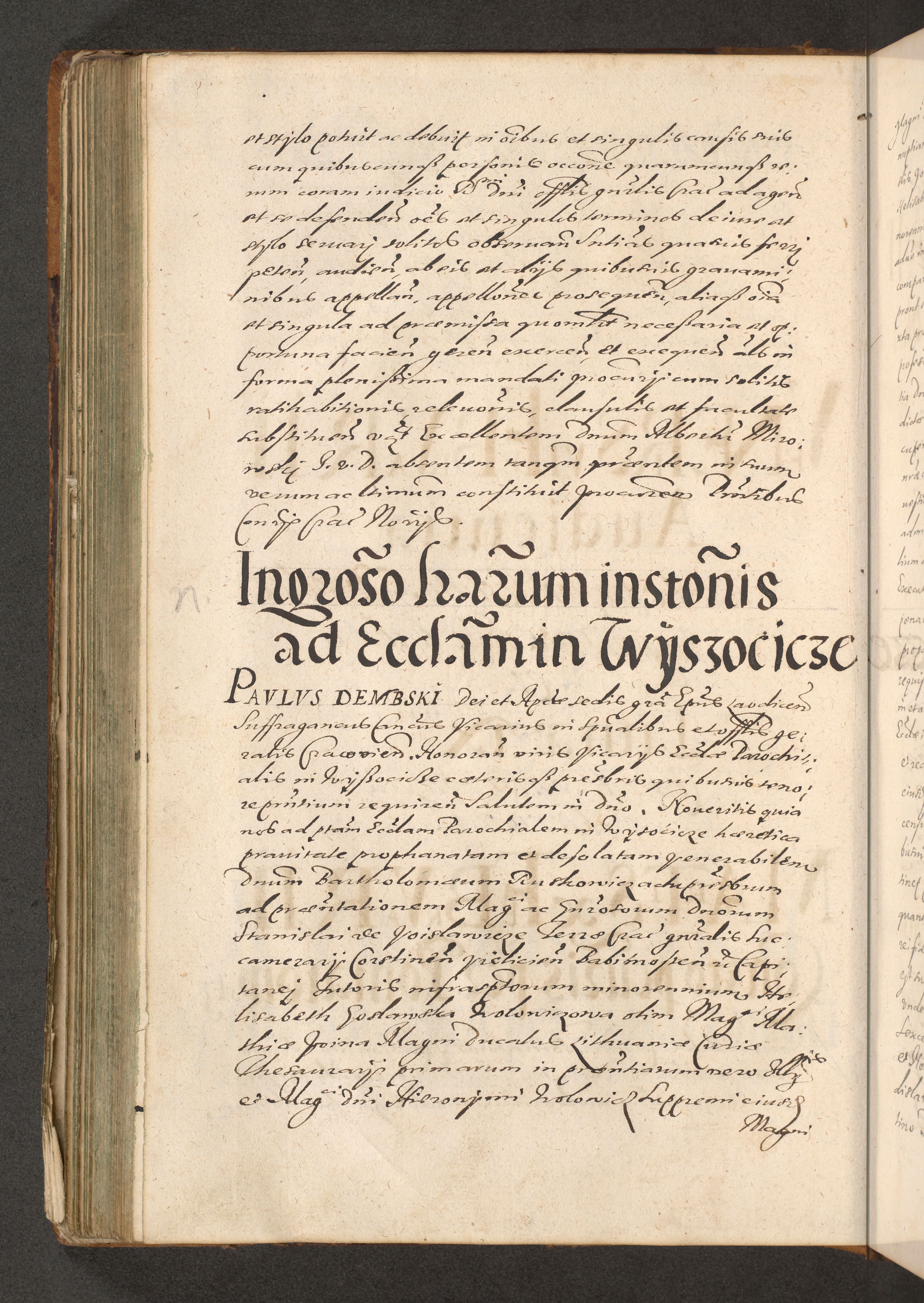 Illustrissimo et Reverendissimo in Christo Patre Domino Domino Petro Tylicki Dei et Apostolice Sedis Gratia Episcopo Cracoviensis Duce Severiensis Acta actorum causarum sententiarum tam interloquutoriarum quam definitivarum decretorum obligationum, quietationum, recognitionum, constitutionum procuratorum etc. etc. coram Admodum Reverendo Domino Thoma Oborski I. V. Doctore Canonico Vicario in Spiritualibus et Officiali generali Cracoviensis in anno Domini Millesimo Sexcentessimo Decimoquarto Cuius Indictio duodecima Pontificus SS. D. N. D. Pauli Divina providentia Papae quinti Anno decimo foeliciter incipiunt