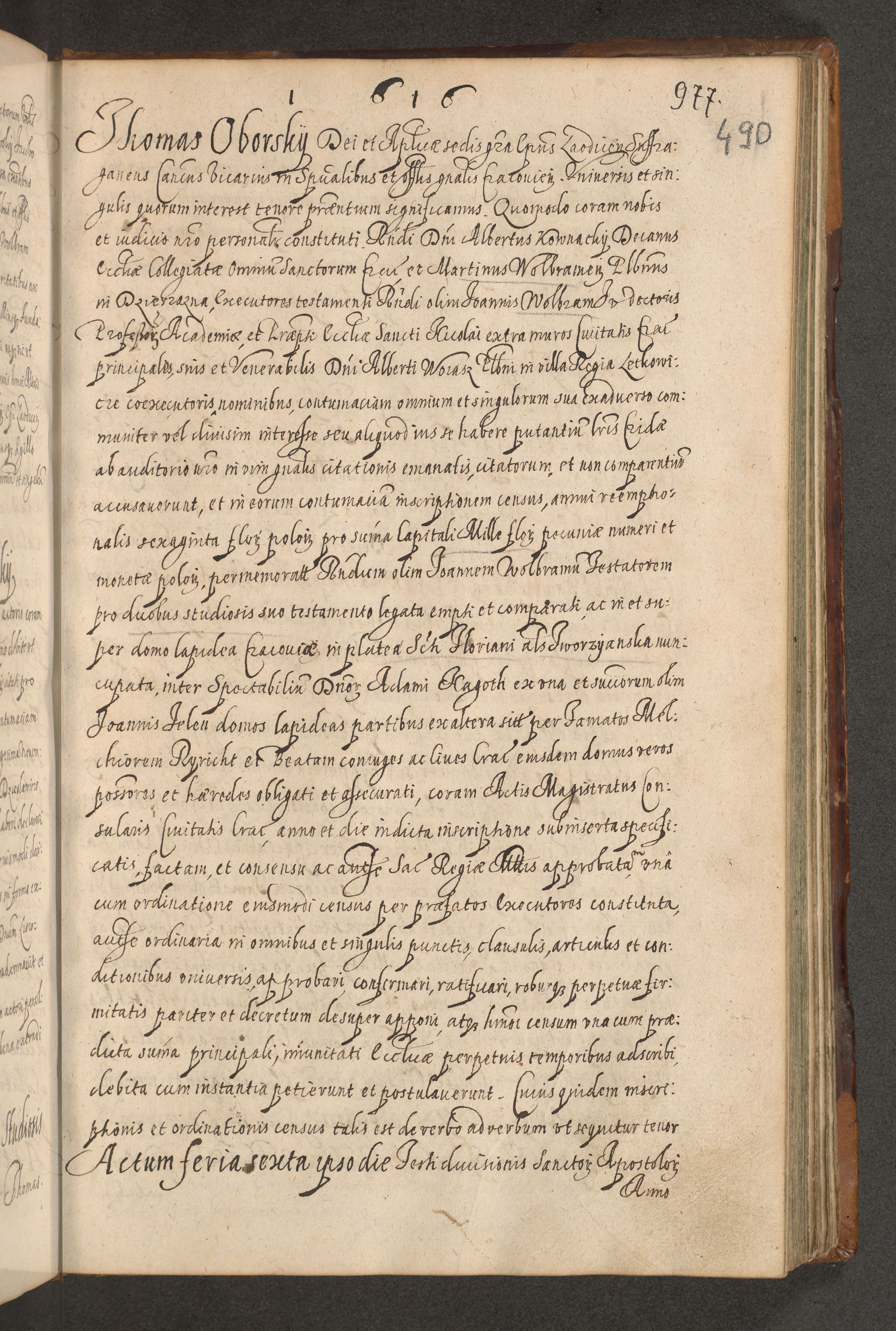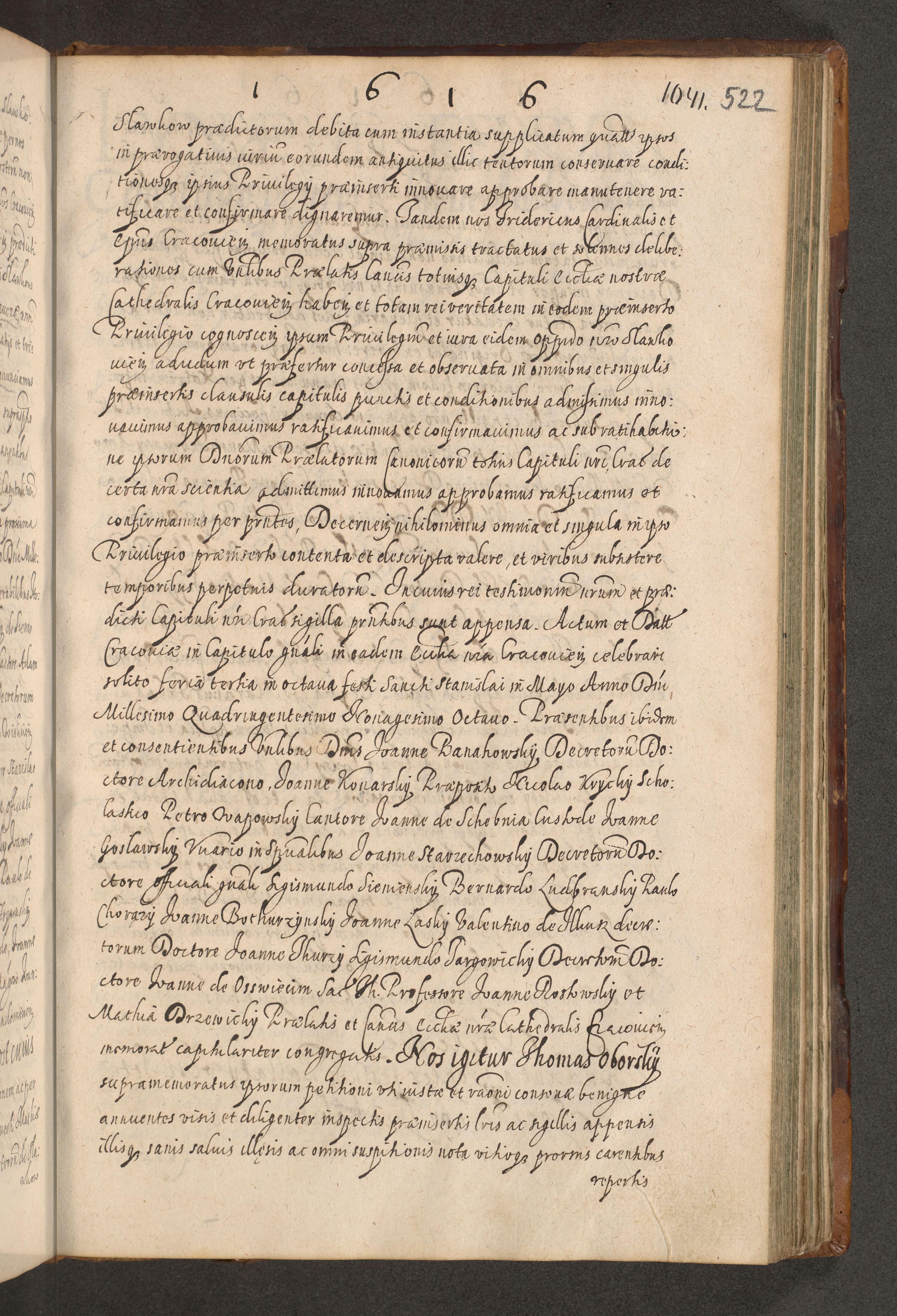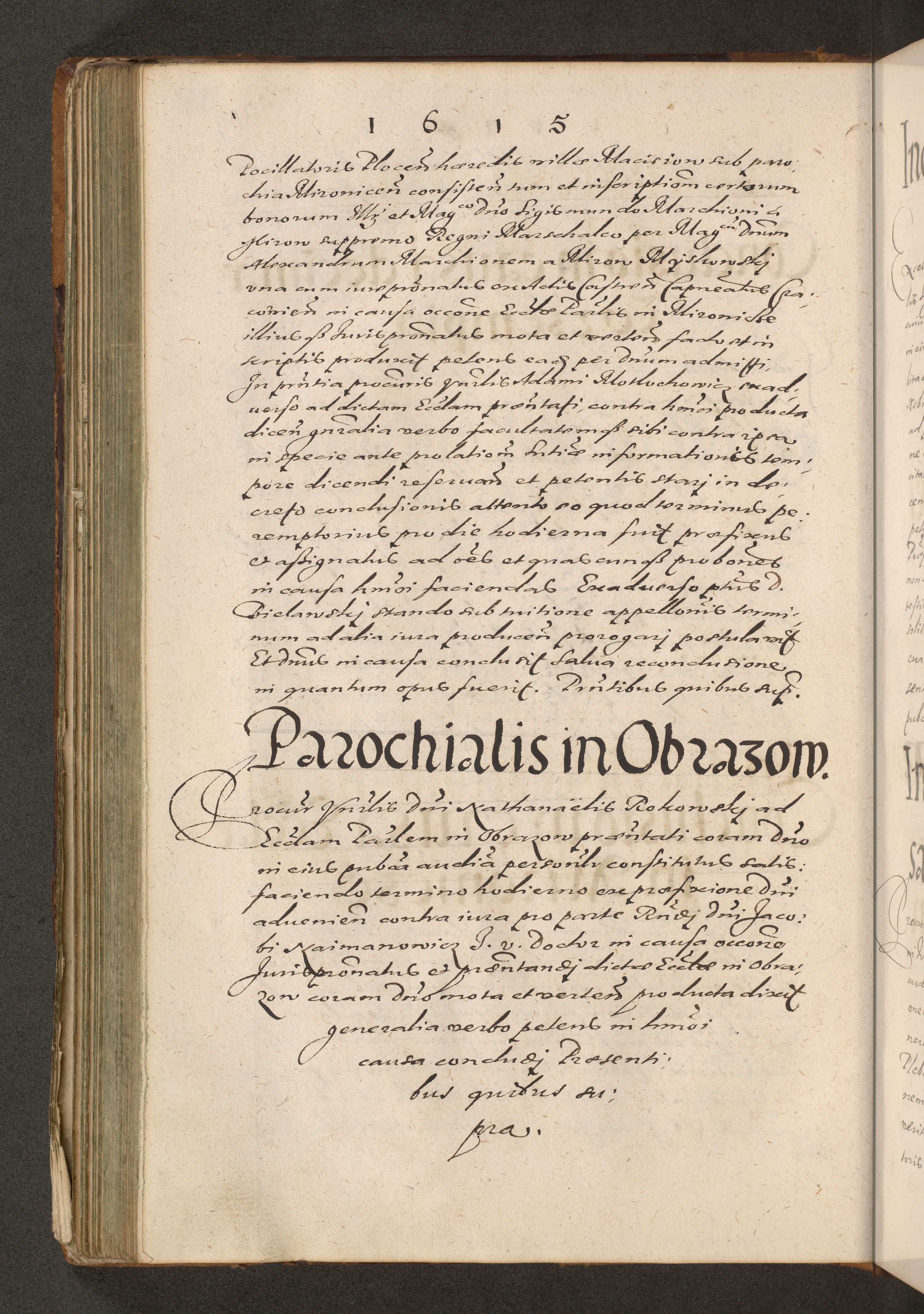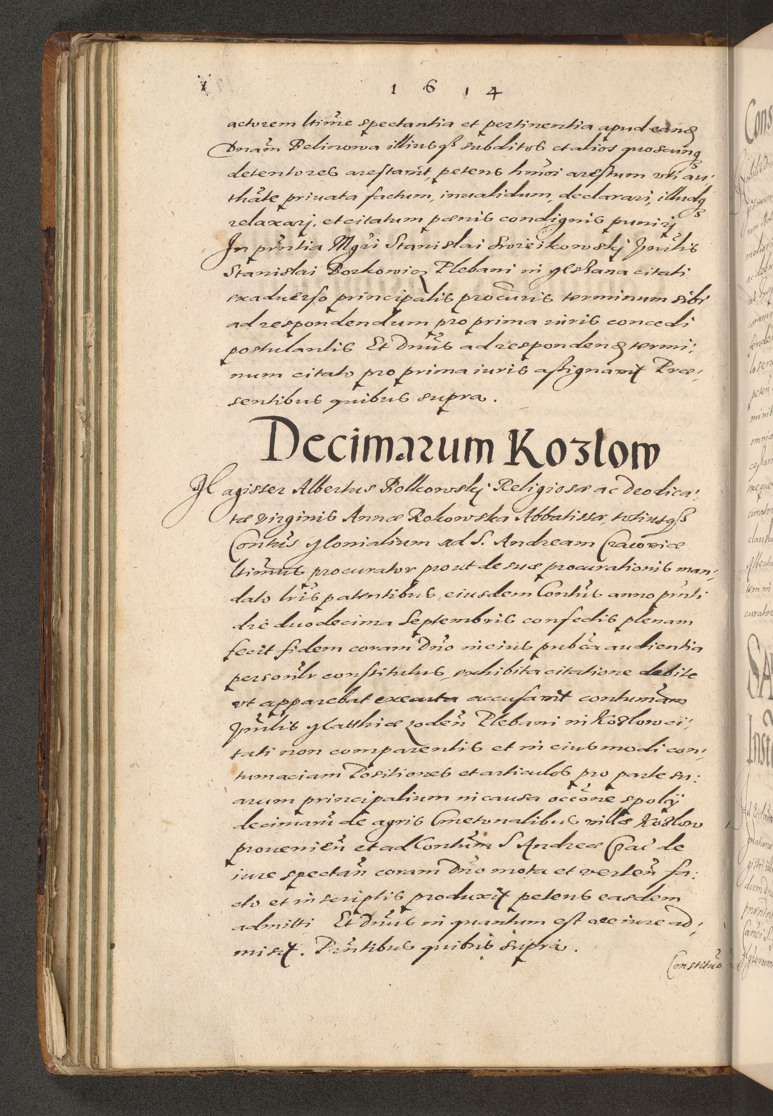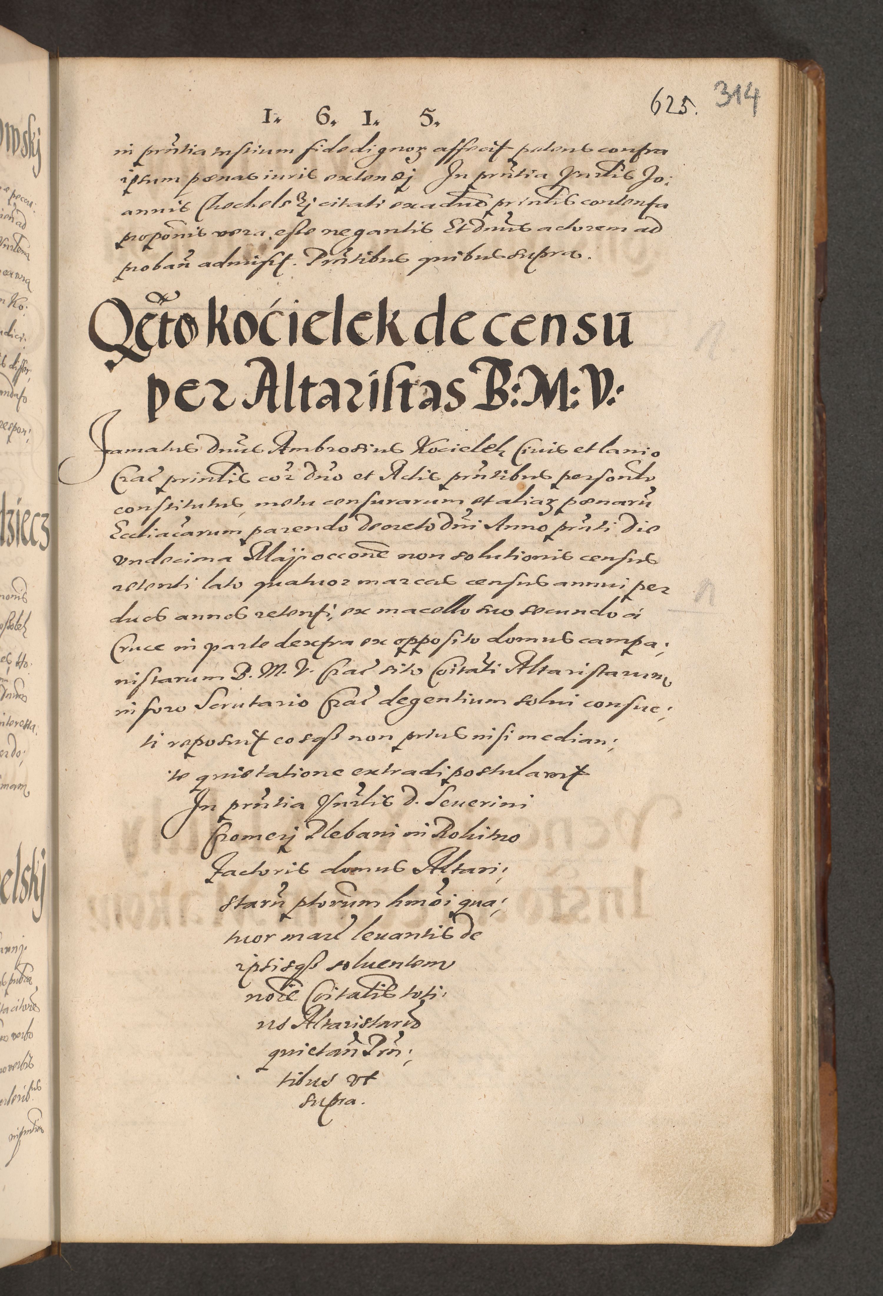 Illustrissimo et Reverendissimo in Christo Patre Domino Domino Petro Tylicki Dei et Apostolice Sedis Gratia Episcopo Cracoviensis Duce Severiensis Acta actorum causarum sententiarum tam interloquutoriarum quam definitivarum decretorum obligationum, quietationum, recognitionum, constitutionum procuratorum etc. etc. coram Admodum Reverendo Domino Thoma Oborski I. V. Doctore Canonico Vicario in Spiritualibus et Officiali generali Cracoviensis in anno Domini Millesimo Sexcentessimo Decimoquarto Cuius Indictio duodecima Pontificus SS. D. N. D. Pauli Divina providentia Papae quinti Anno decimo foeliciter incipiunt