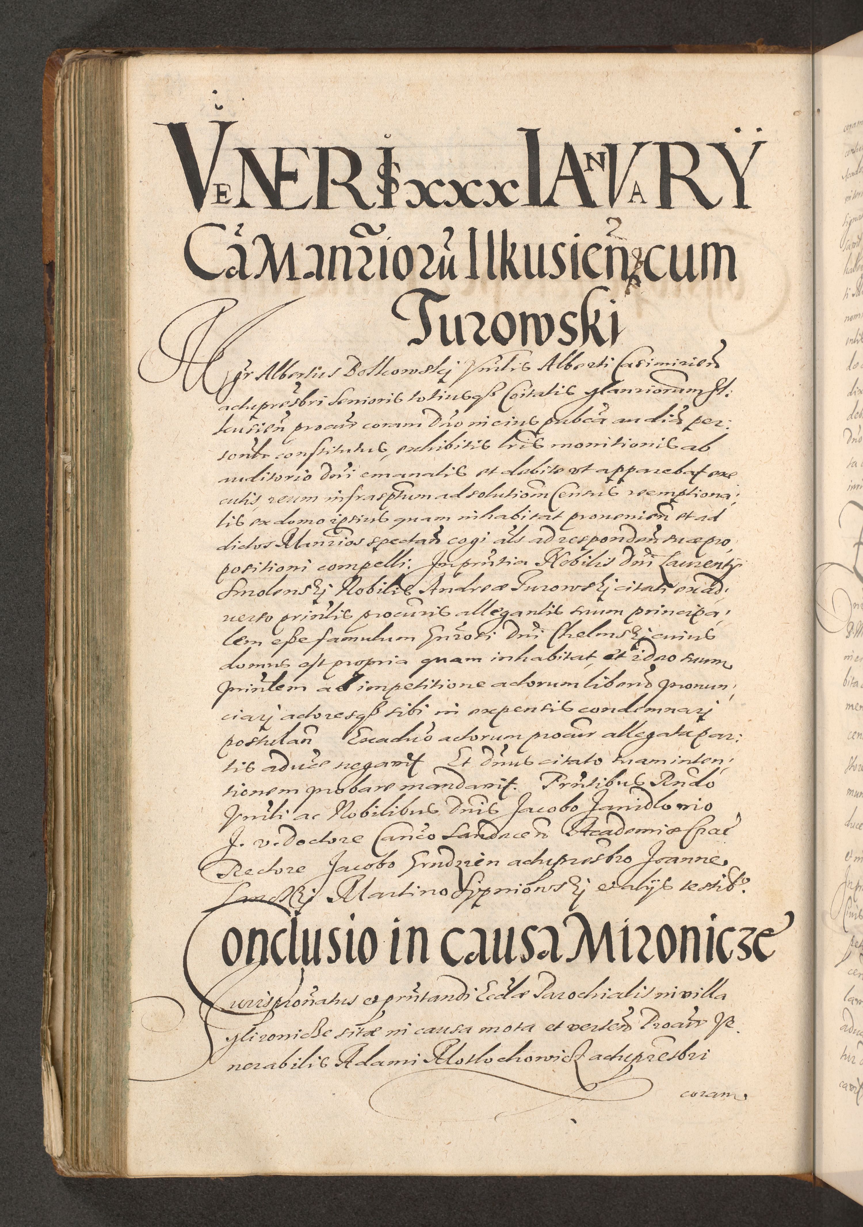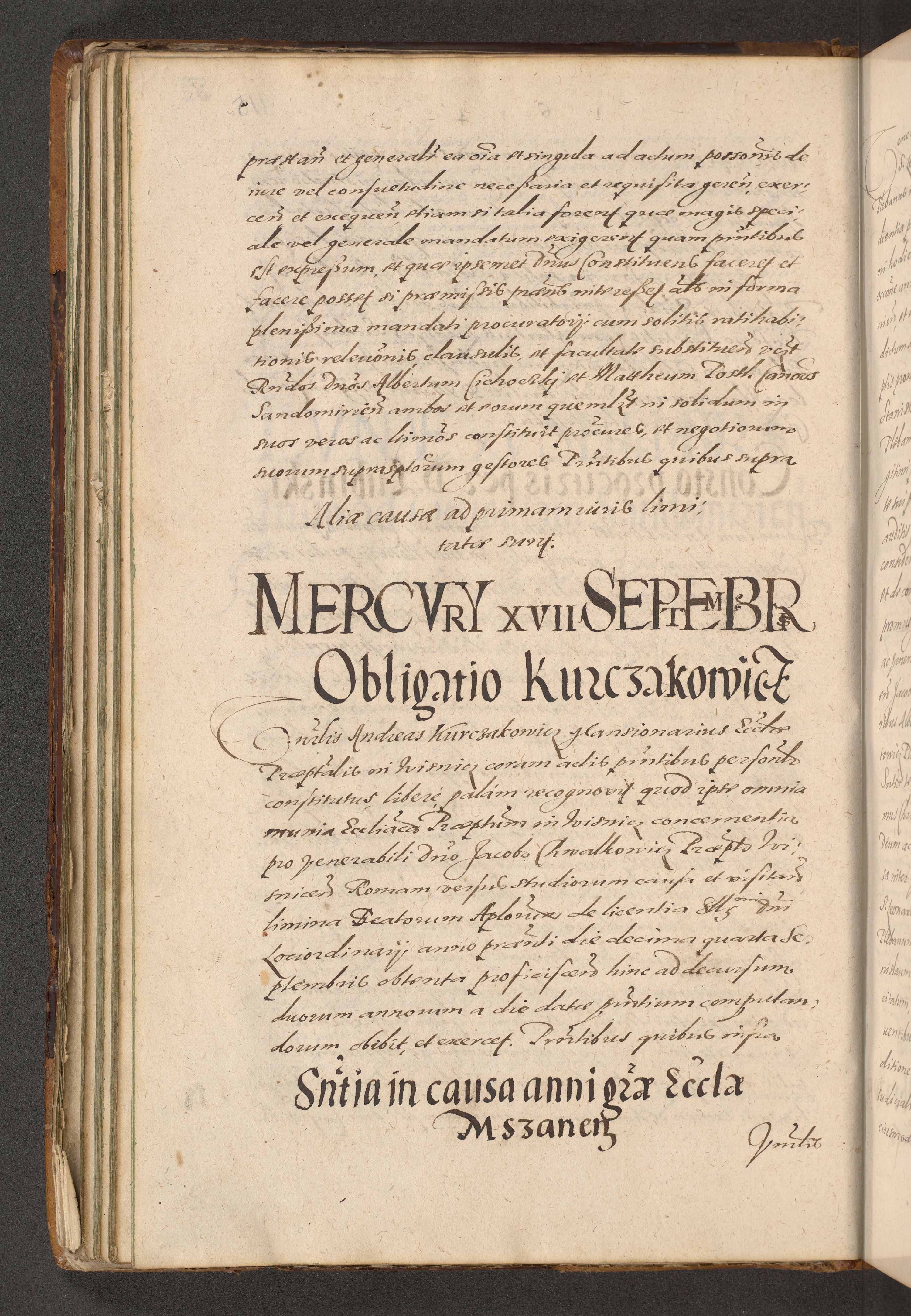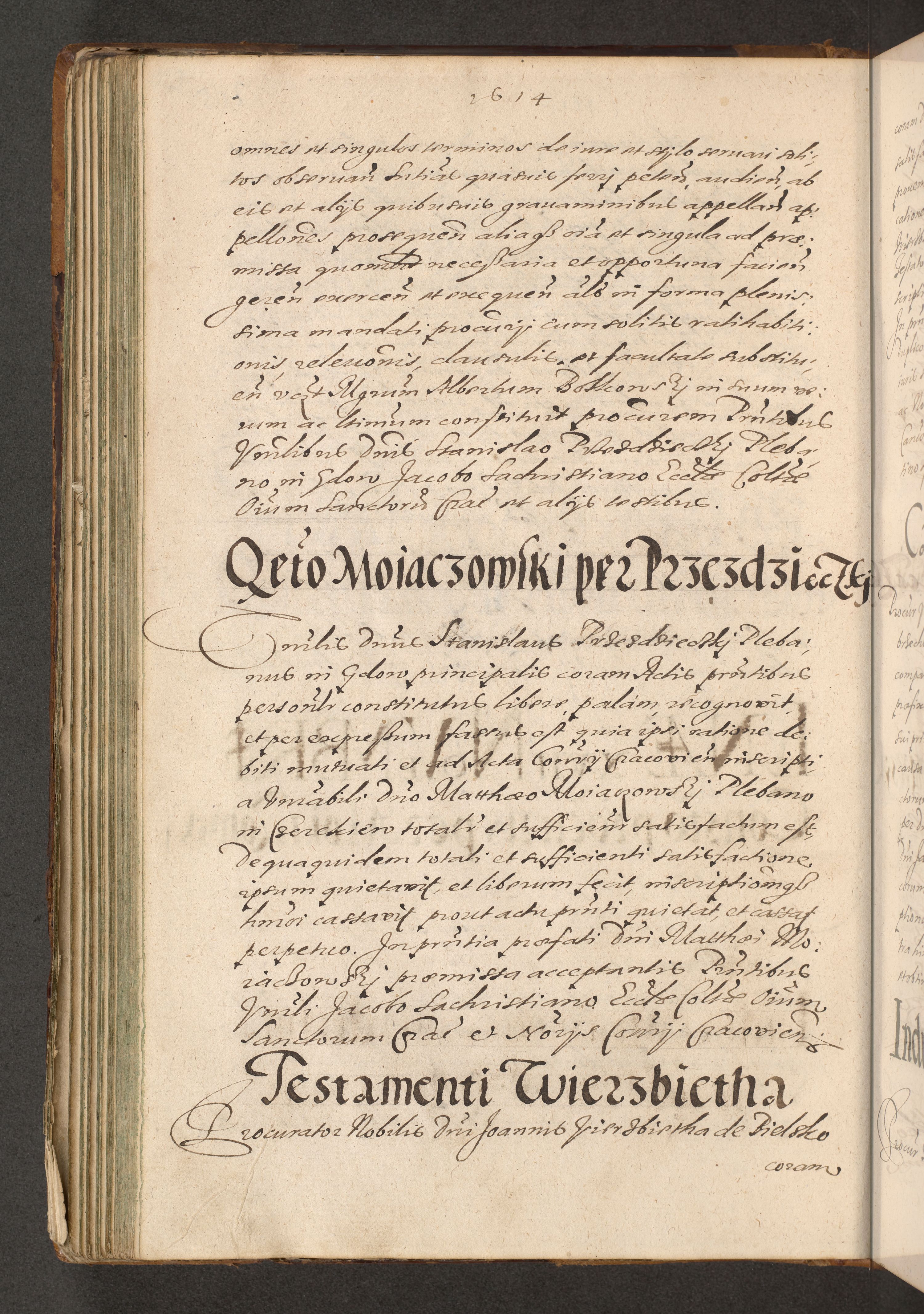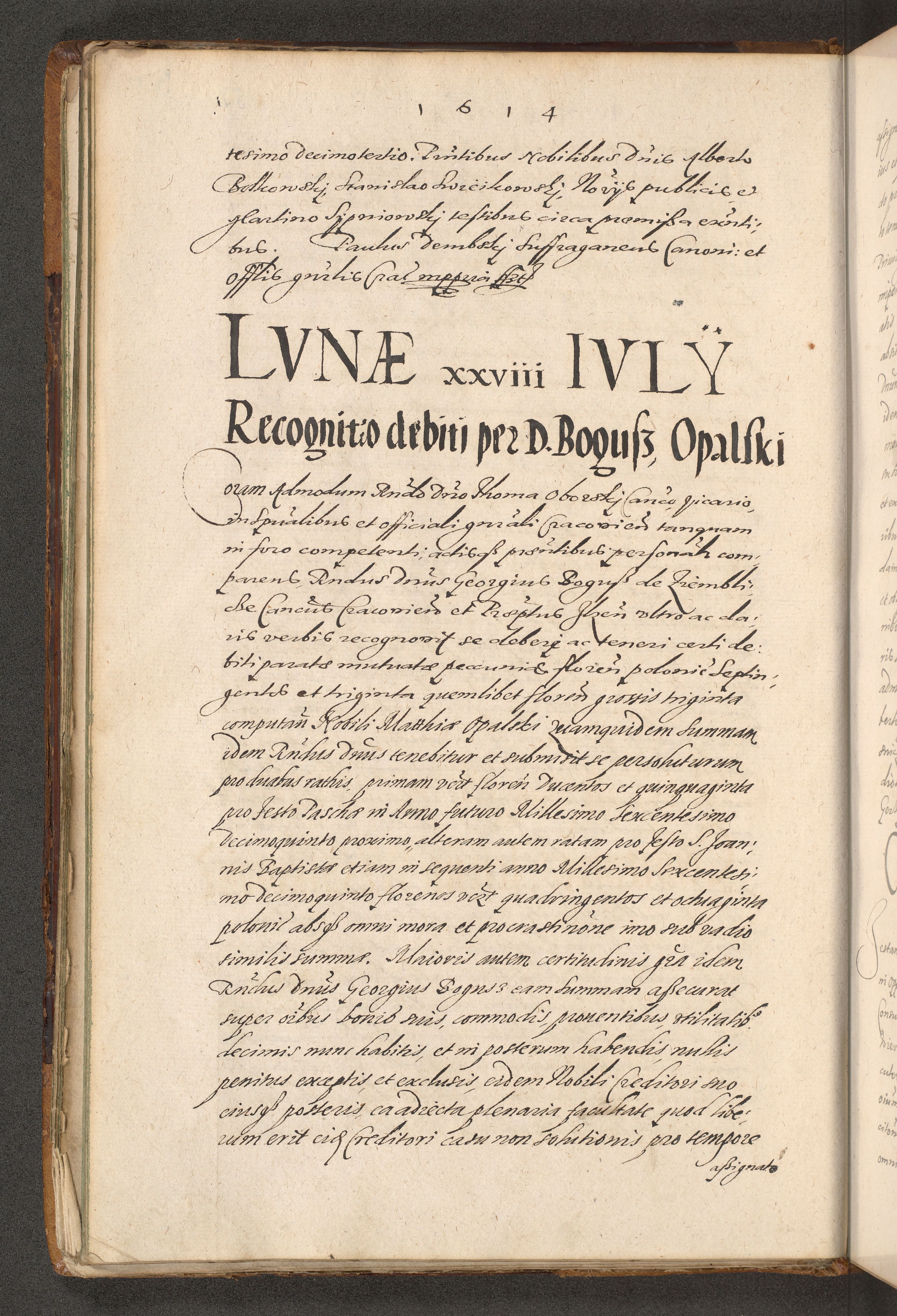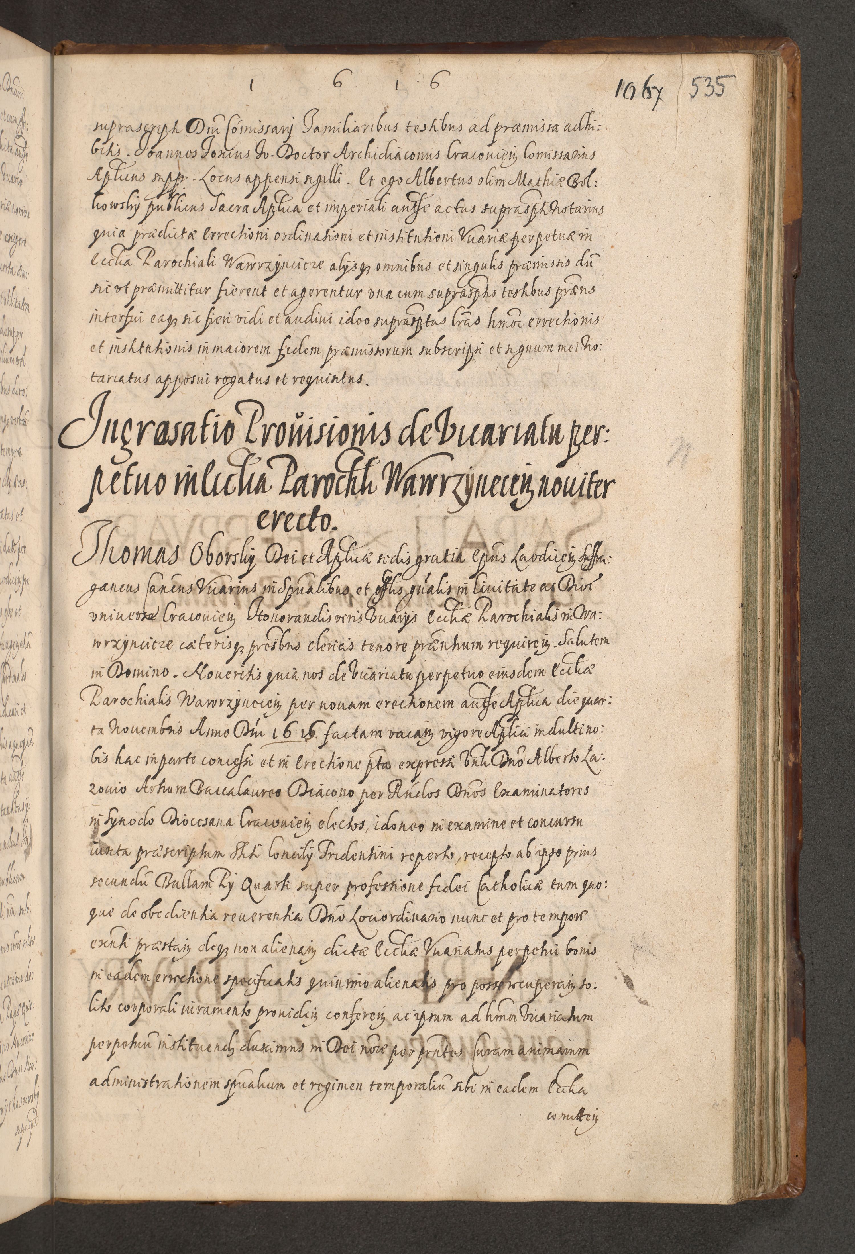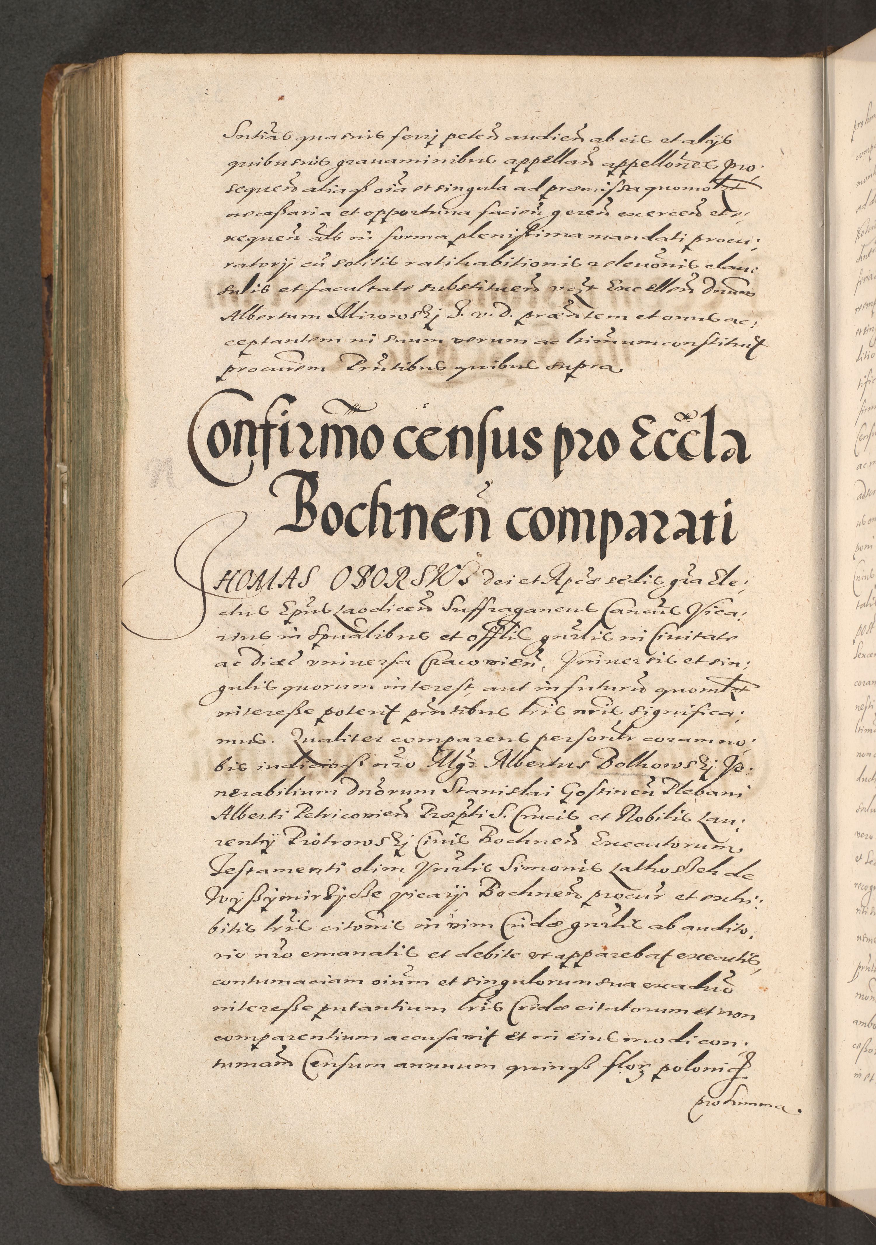 Illustrissimo et Reverendissimo in Christo Patre Domino Domino Petro Tylicki Dei et Apostolice Sedis Gratia Episcopo Cracoviensis Duce Severiensis Acta actorum causarum sententiarum tam interloquutoriarum quam definitivarum decretorum obligationum, quietationum, recognitionum, constitutionum procuratorum etc. etc. coram Admodum Reverendo Domino Thoma Oborski I. V. Doctore Canonico Vicario in Spiritualibus et Officiali generali Cracoviensis in anno Domini Millesimo Sexcentessimo Decimoquarto Cuius Indictio duodecima Pontificus SS. D. N. D. Pauli Divina providentia Papae quinti Anno decimo foeliciter incipiunt