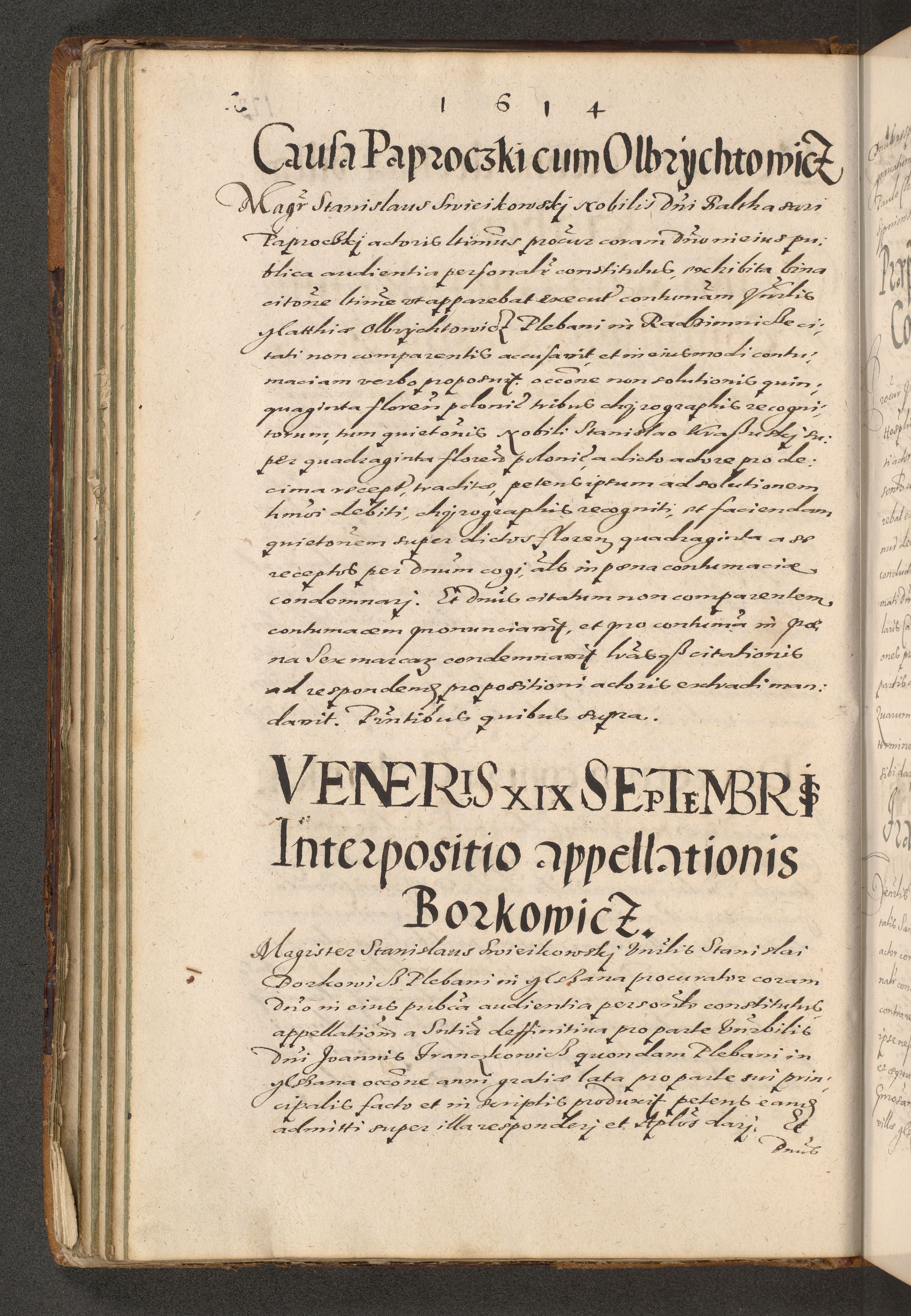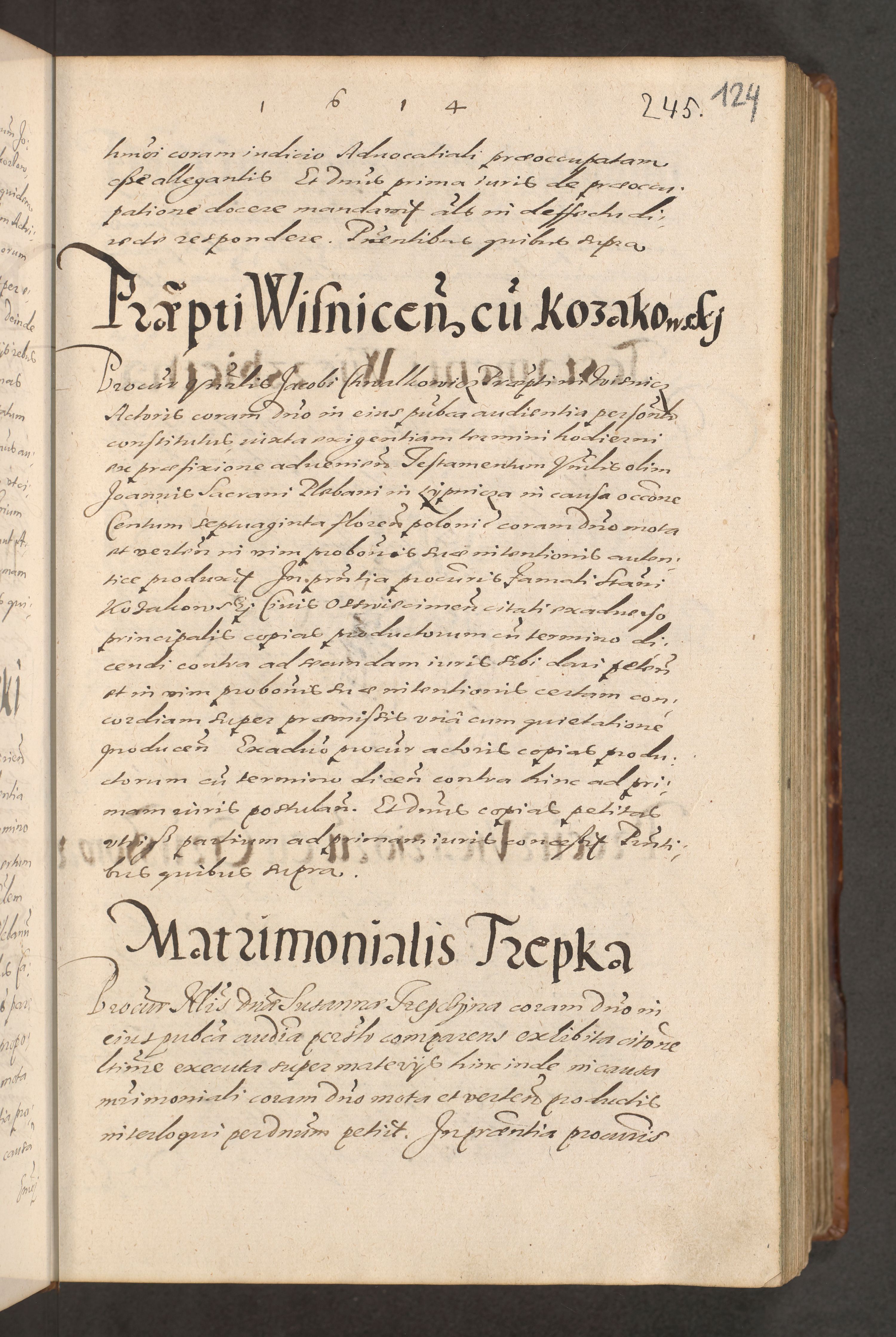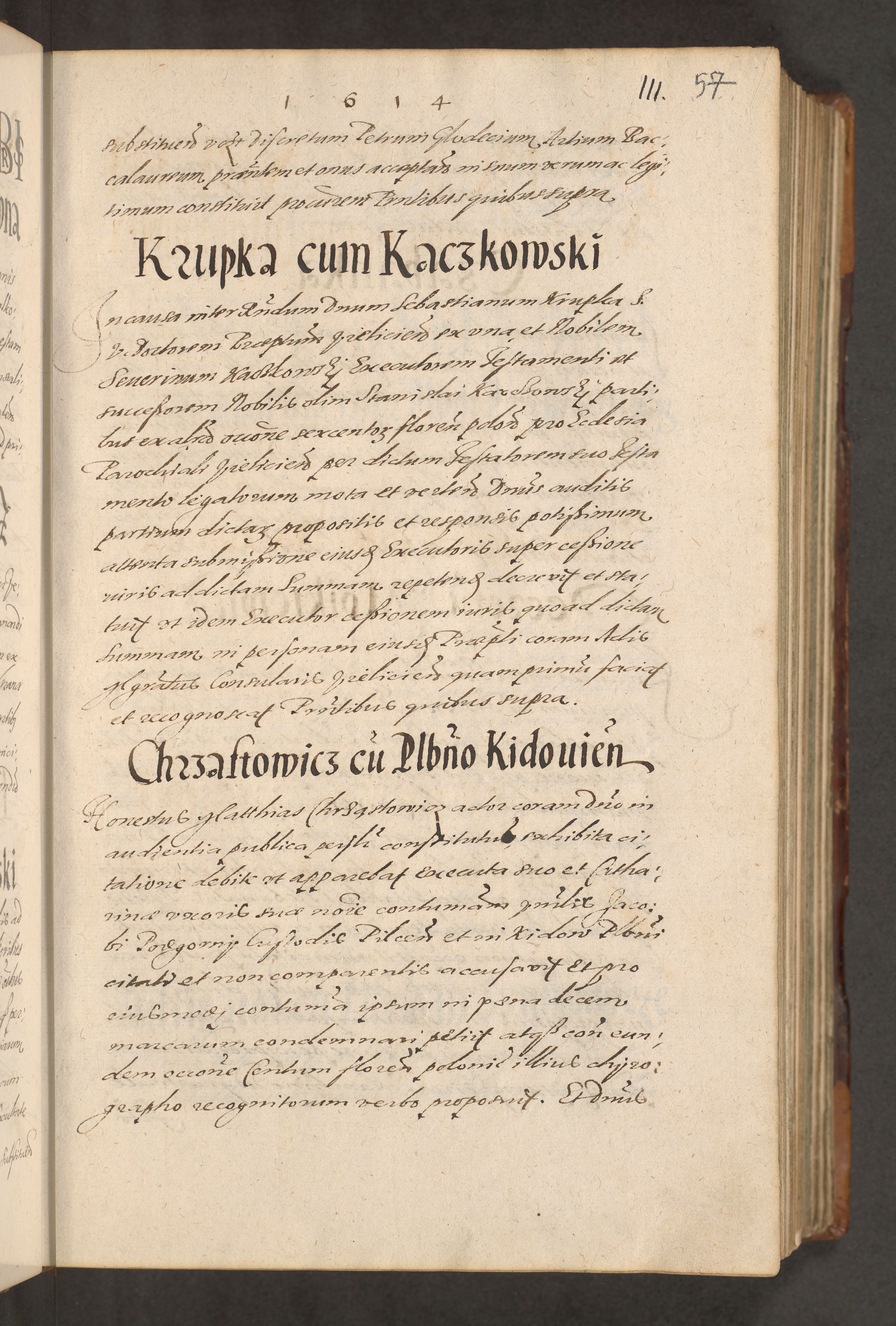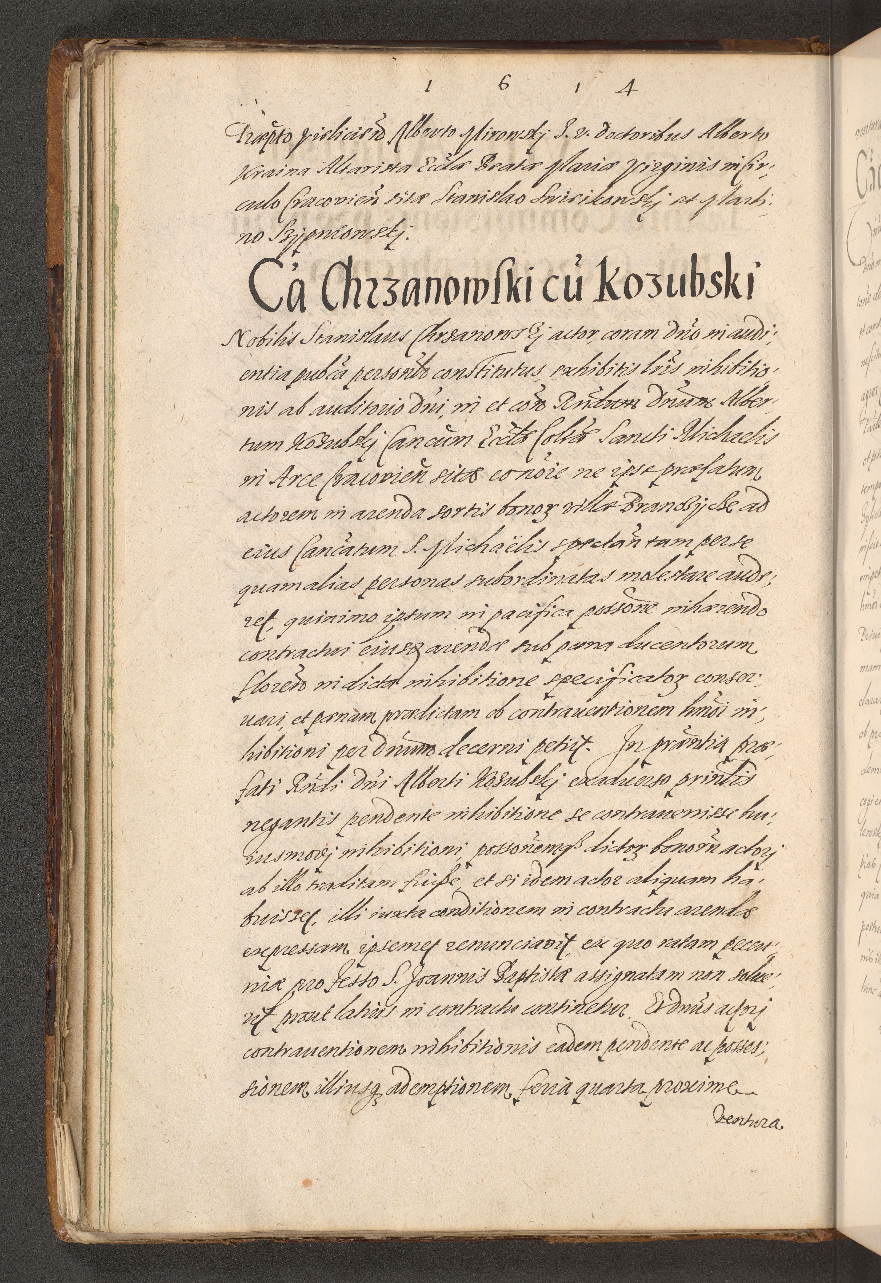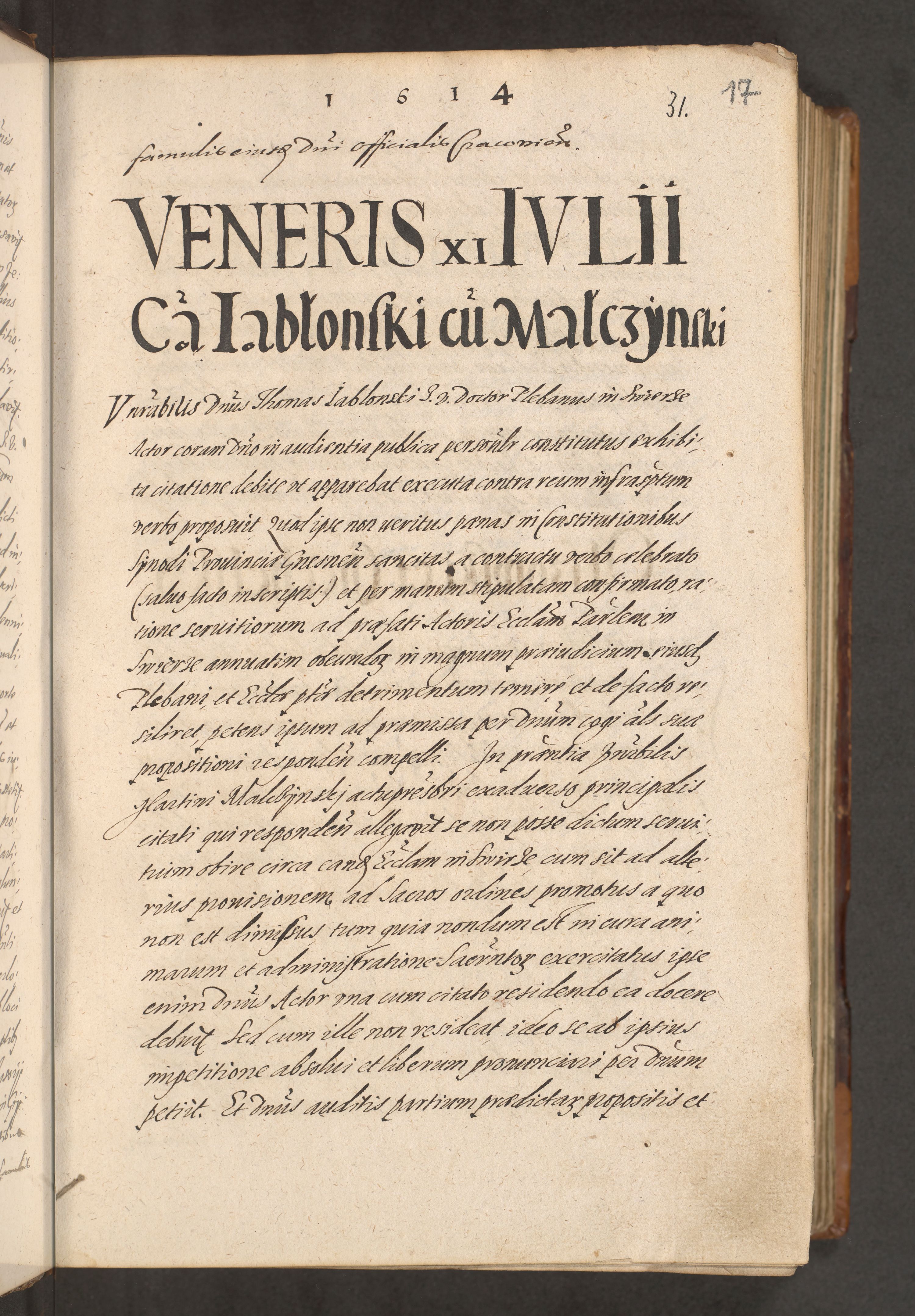 Illustrissimo et Reverendissimo in Christo Patre Domino Domino Petro Tylicki Dei et Apostolice Sedis Gratia Episcopo Cracoviensis Duce Severiensis Acta actorum causarum sententiarum tam interloquutoriarum quam definitivarum decretorum obligationum, quietationum, recognitionum, constitutionum procuratorum etc. etc. coram Admodum Reverendo Domino Thoma Oborski I. V. Doctore Canonico Vicario in Spiritualibus et Officiali generali Cracoviensis in anno Domini Millesimo Sexcentessimo Decimoquarto Cuius Indictio duodecima Pontificus SS. D. N. D. Pauli Divina providentia Papae quinti Anno decimo foeliciter incipiunt
