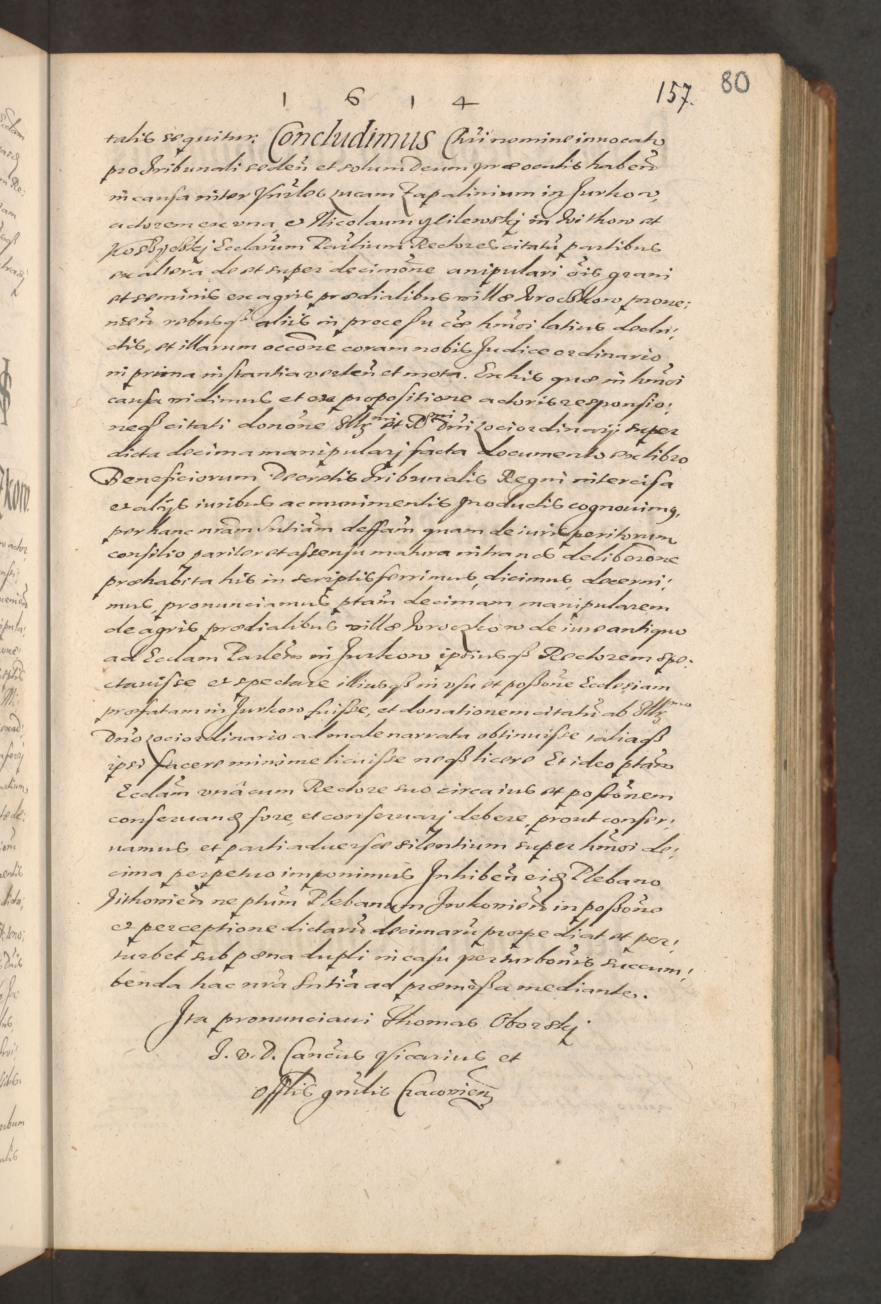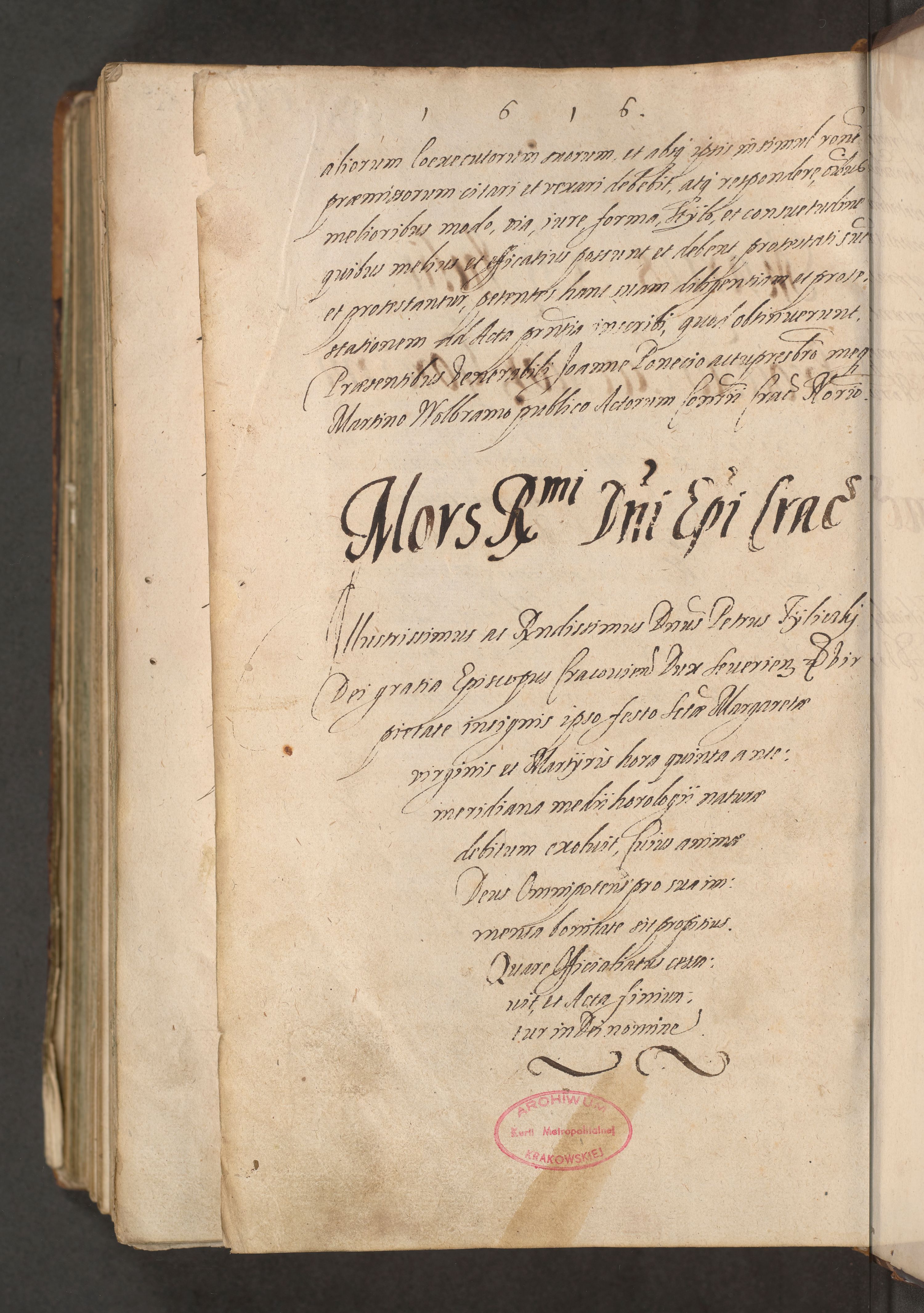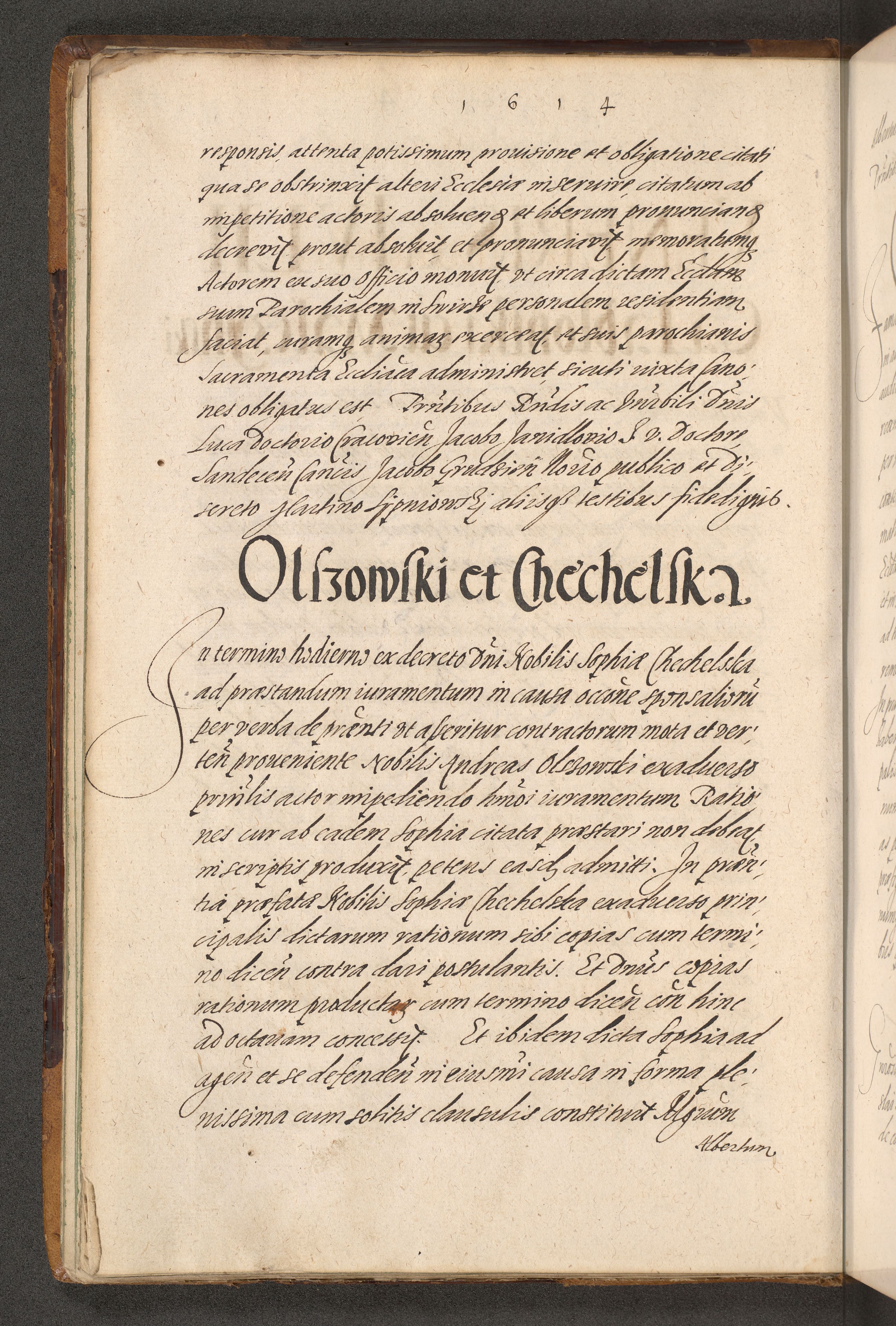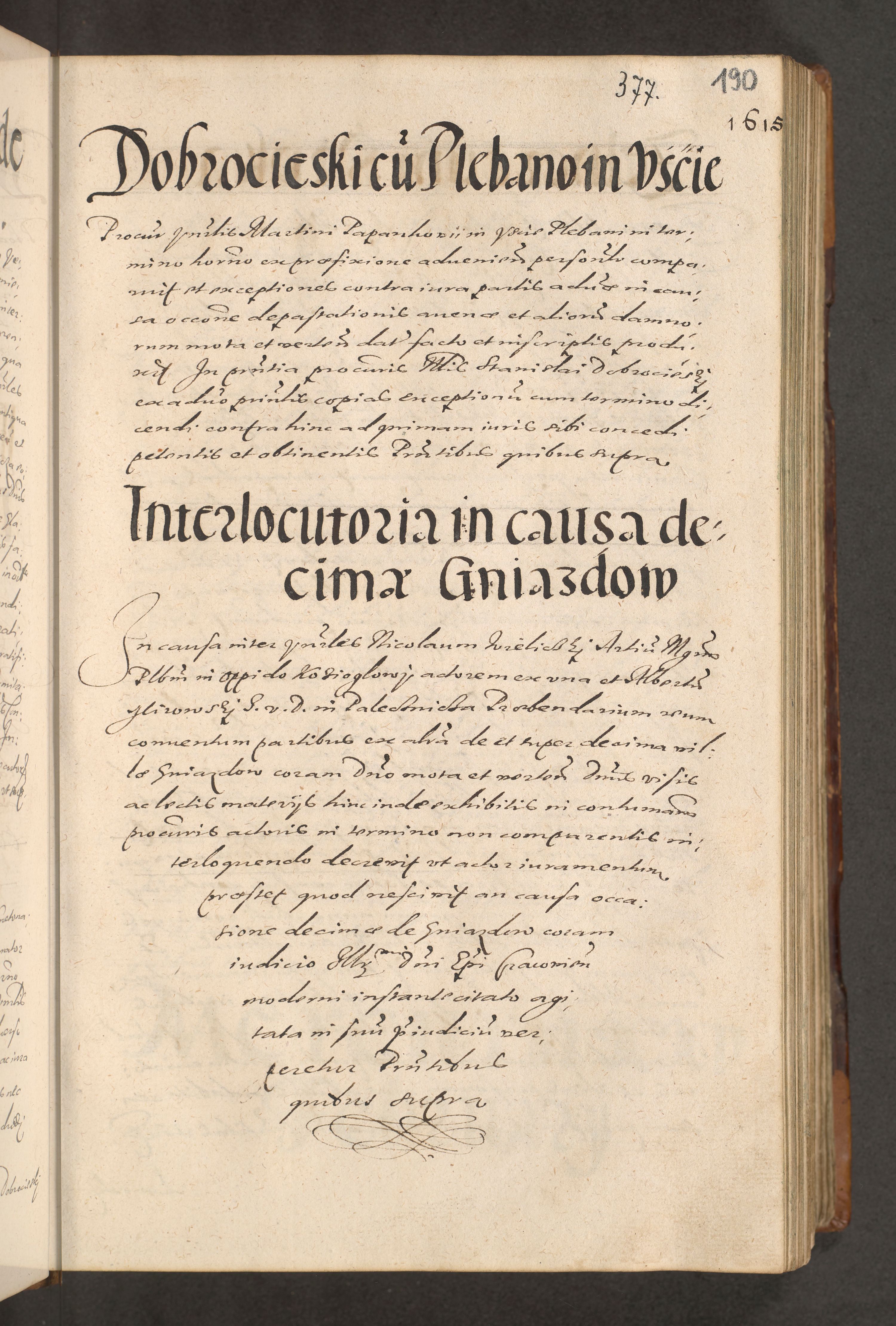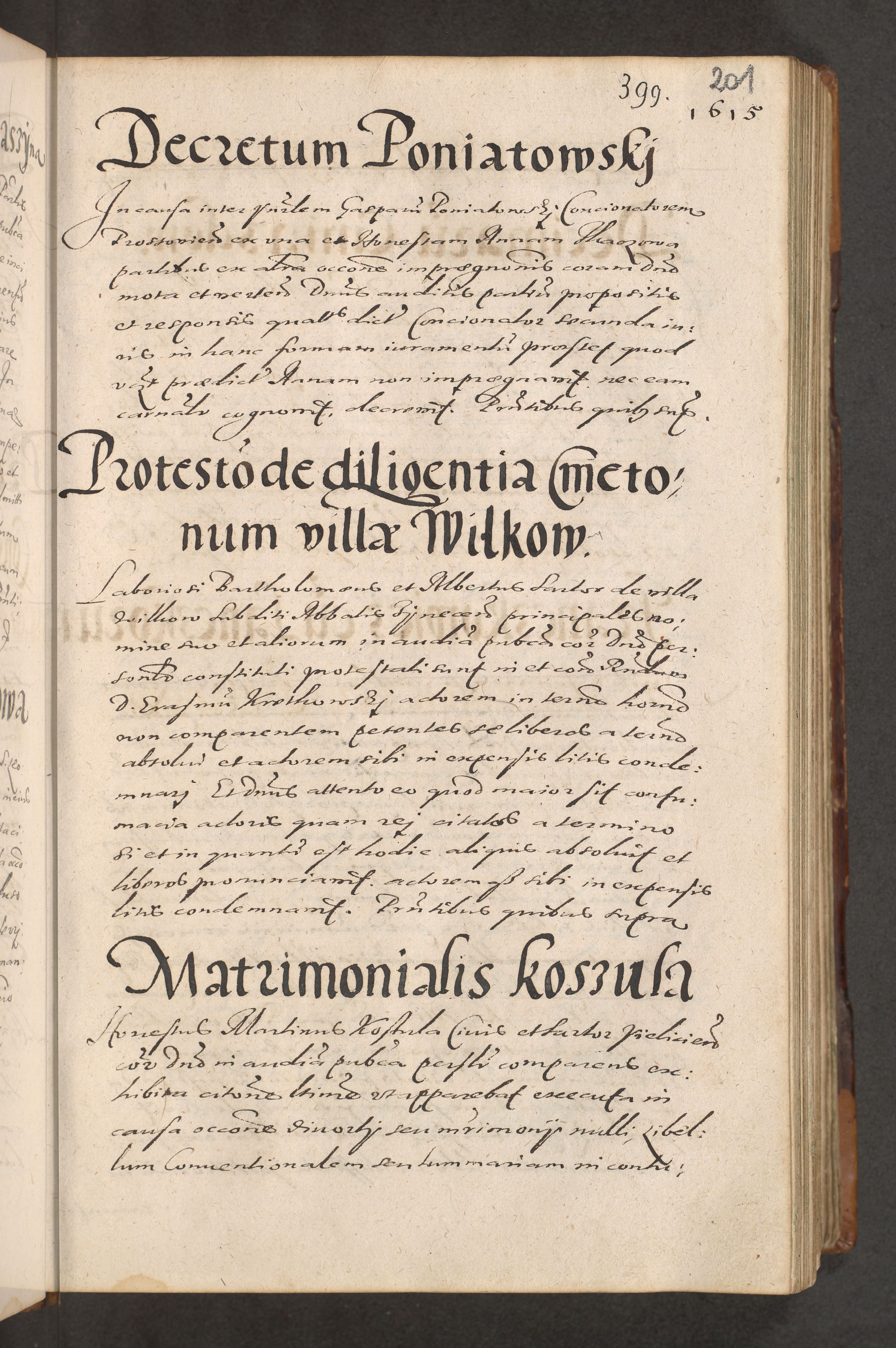 Illustrissimo et Reverendissimo in Christo Patre Domino Domino Petro Tylicki Dei et Apostolice Sedis Gratia Episcopo Cracoviensis Duce Severiensis Acta actorum causarum sententiarum tam interloquutoriarum quam definitivarum decretorum obligationum, quietationum, recognitionum, constitutionum procuratorum etc. etc. coram Admodum Reverendo Domino Thoma Oborski I. V. Doctore Canonico Vicario in Spiritualibus et Officiali generali Cracoviensis in anno Domini Millesimo Sexcentessimo Decimoquarto Cuius Indictio duodecima Pontificus SS. D. N. D. Pauli Divina providentia Papae quinti Anno decimo foeliciter incipiunt