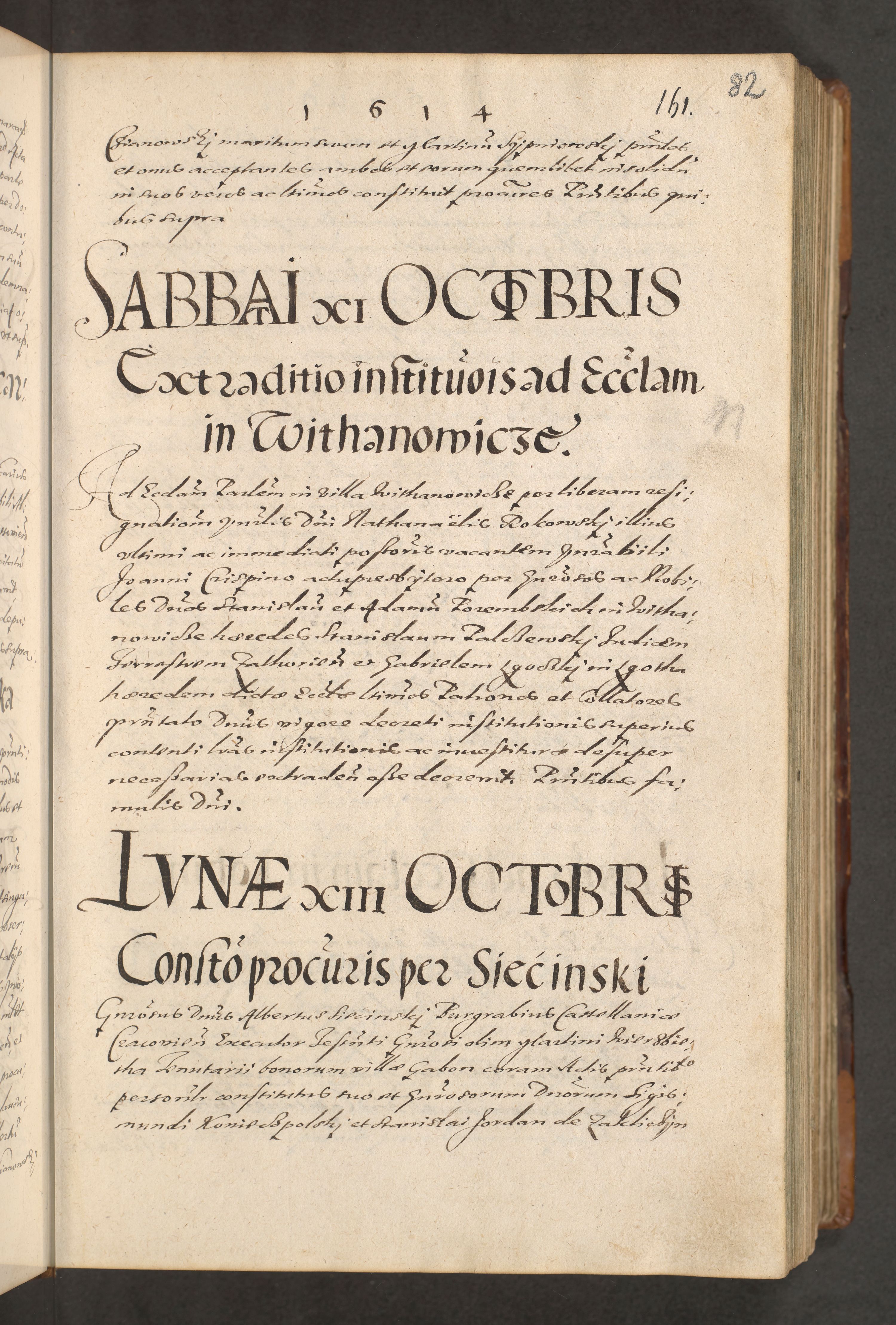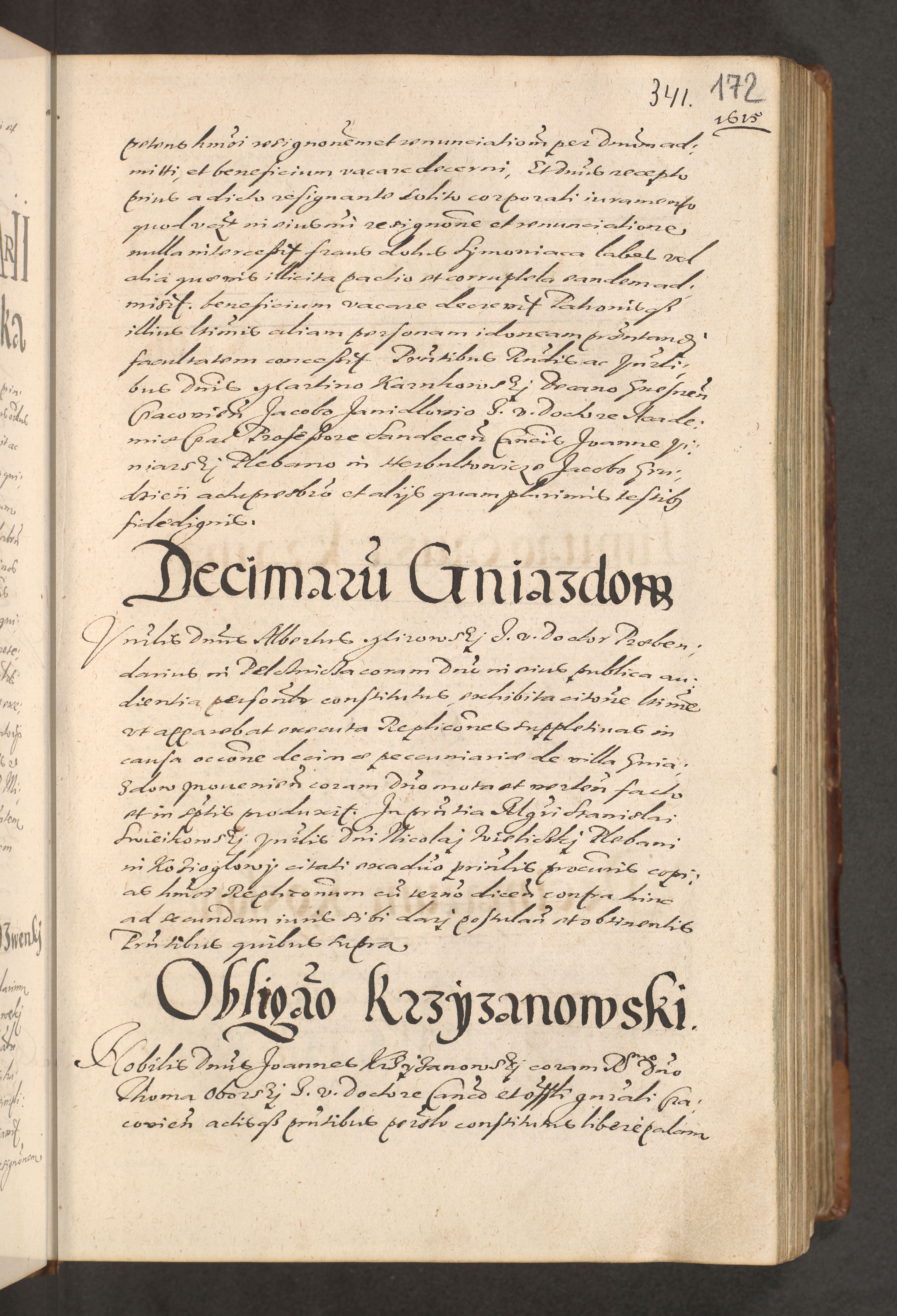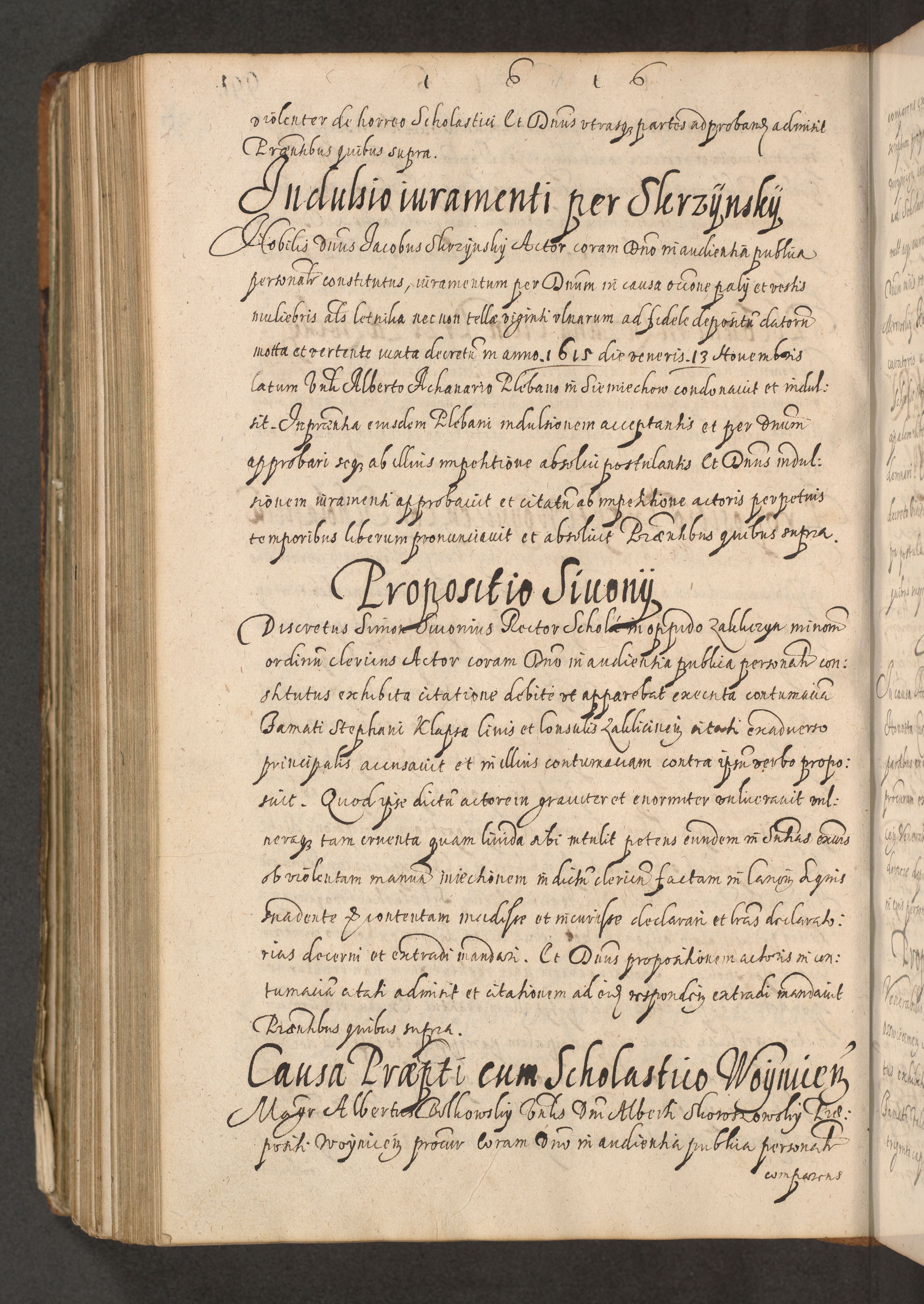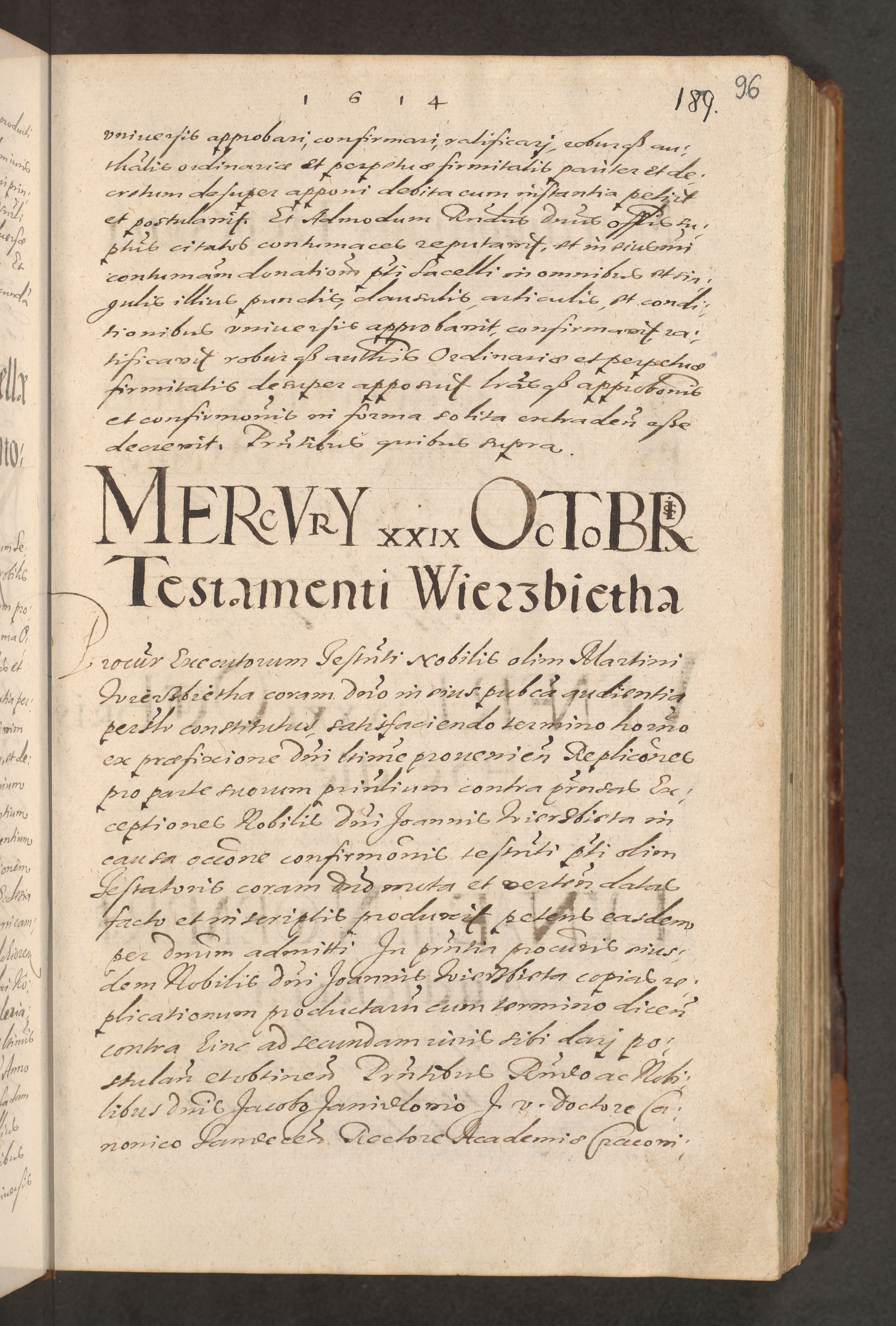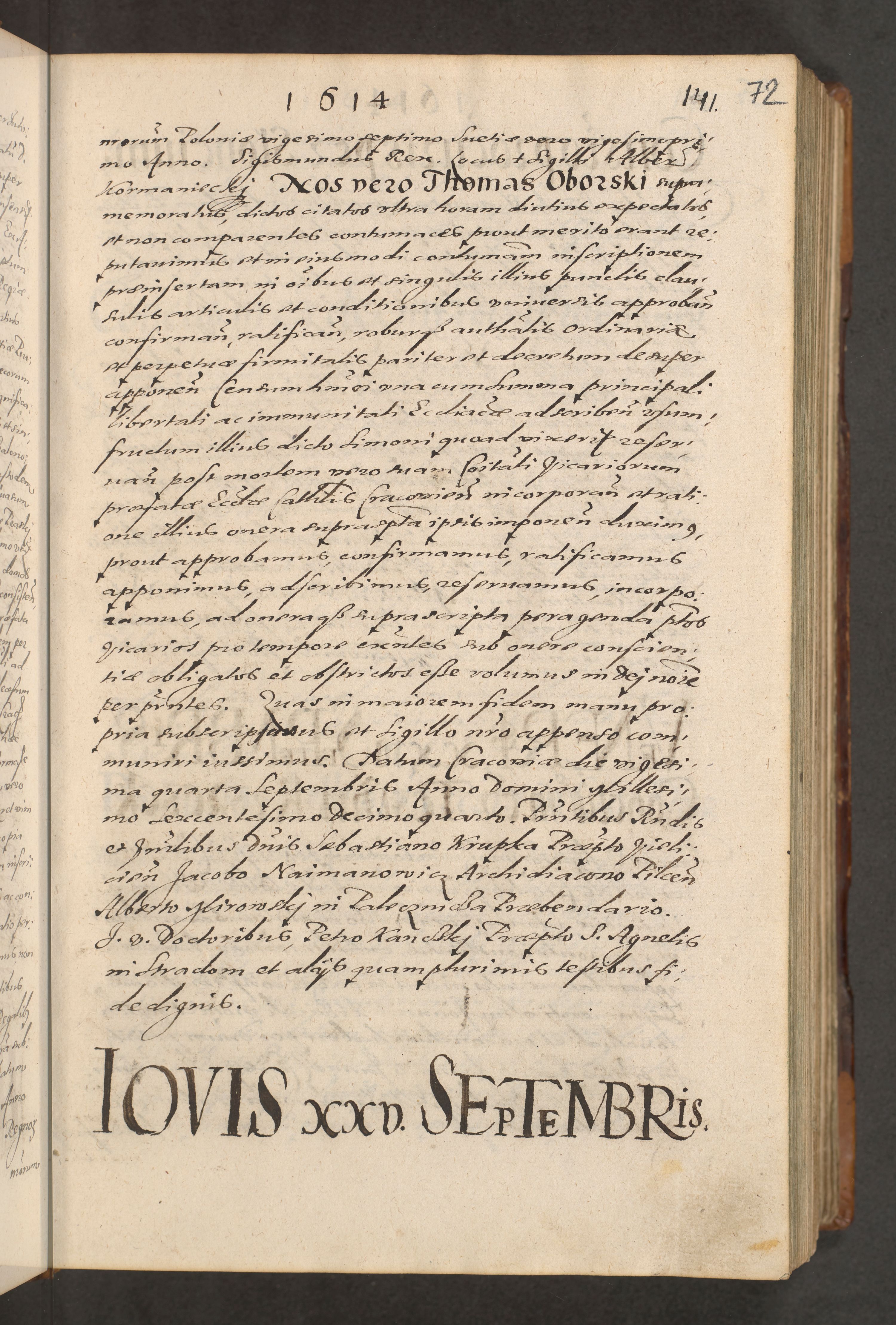 Illustrissimo et Reverendissimo in Christo Patre Domino Domino Petro Tylicki Dei et Apostolice Sedis Gratia Episcopo Cracoviensis Duce Severiensis Acta actorum causarum sententiarum tam interloquutoriarum quam definitivarum decretorum obligationum, quietationum, recognitionum, constitutionum procuratorum etc. etc. coram Admodum Reverendo Domino Thoma Oborski I. V. Doctore Canonico Vicario in Spiritualibus et Officiali generali Cracoviensis in anno Domini Millesimo Sexcentessimo Decimoquarto Cuius Indictio duodecima Pontificus SS. D. N. D. Pauli Divina providentia Papae quinti Anno decimo foeliciter incipiunt