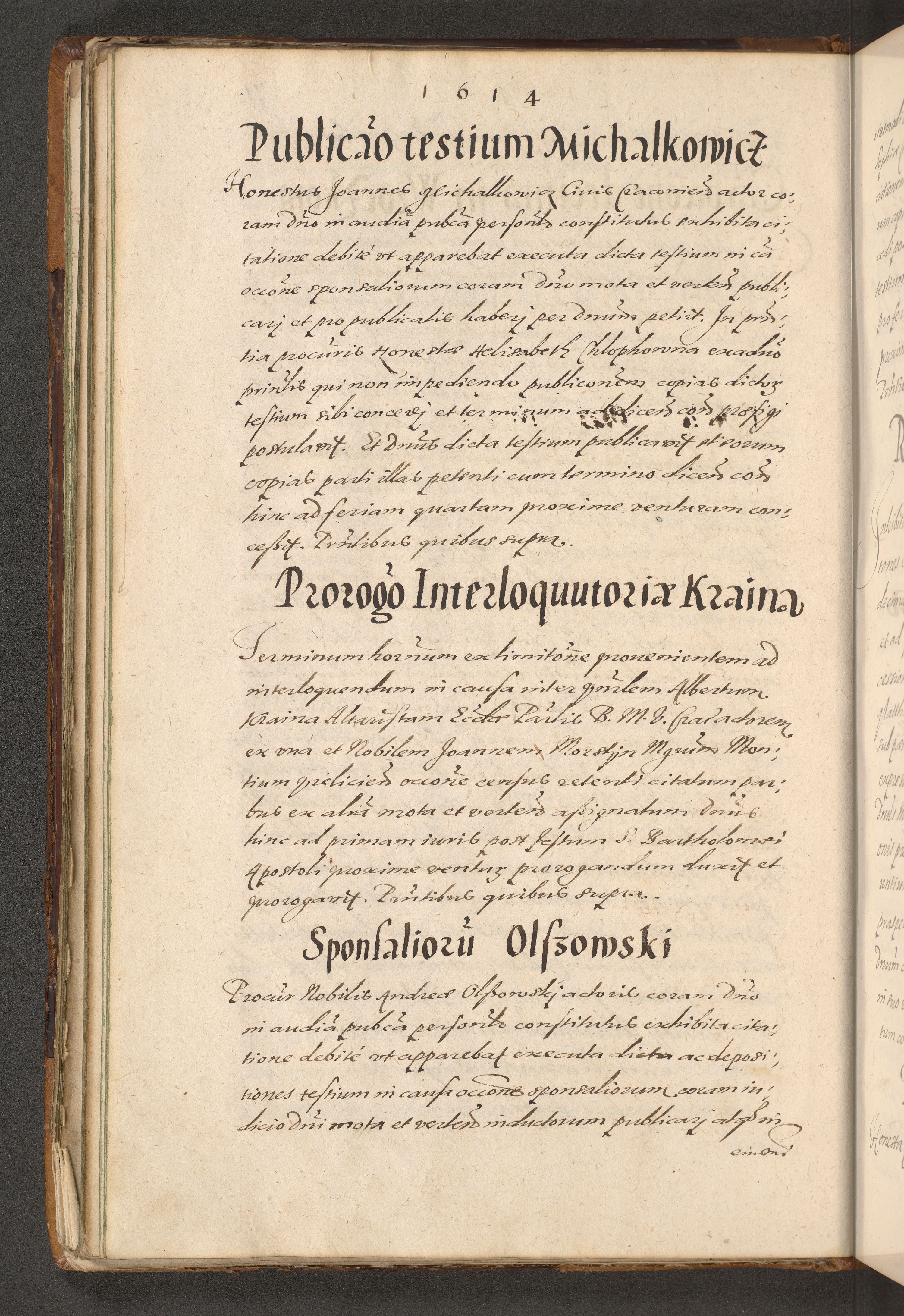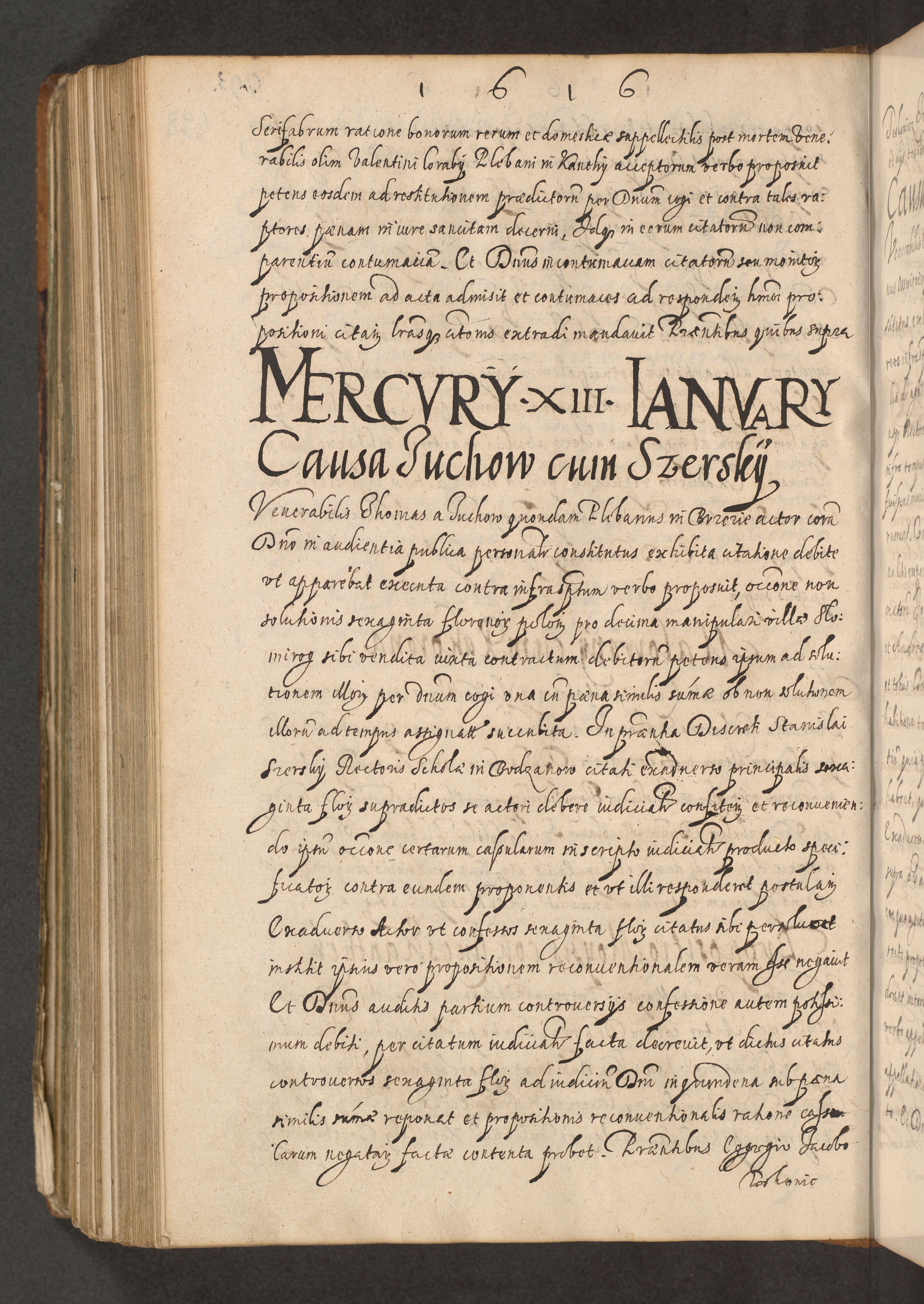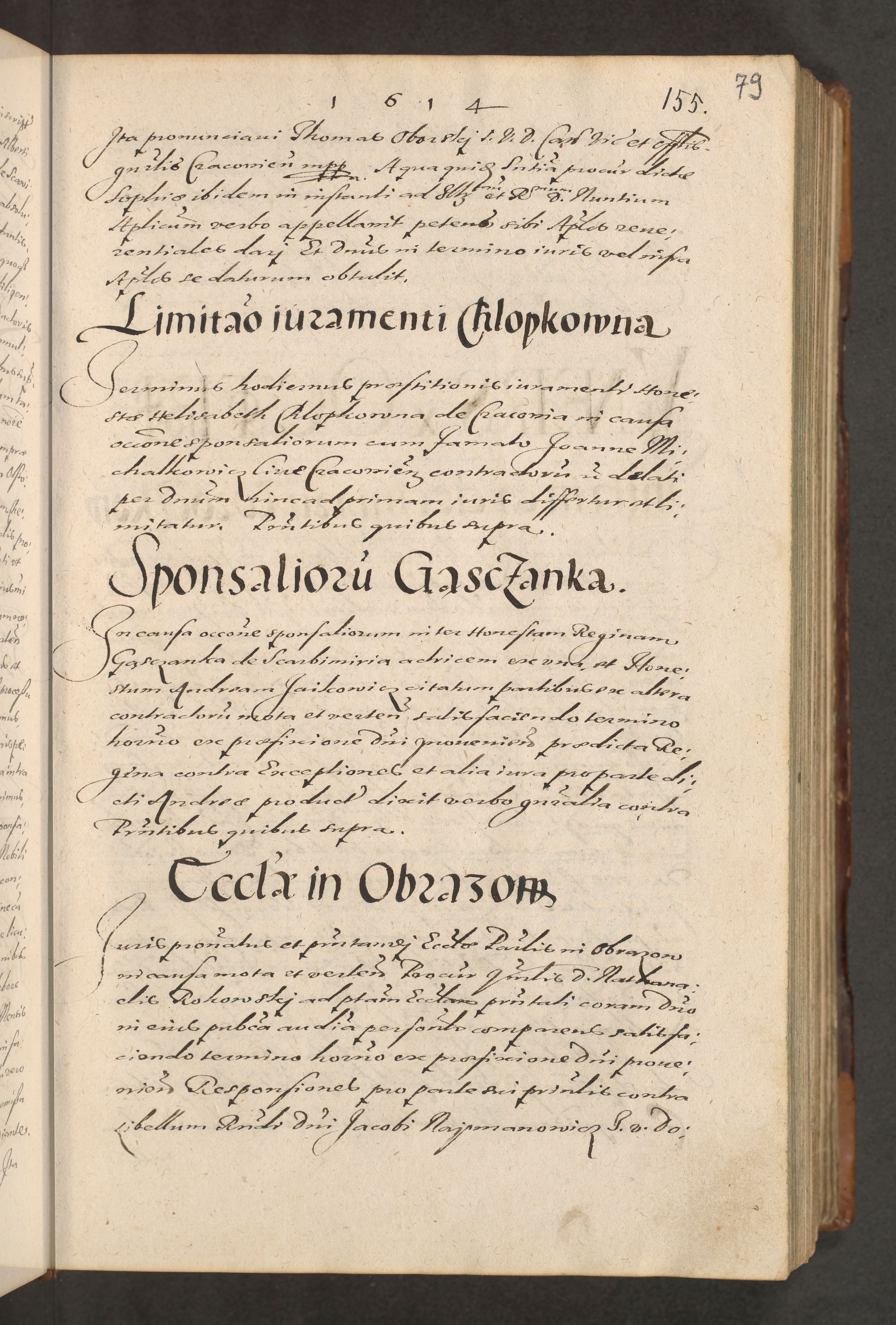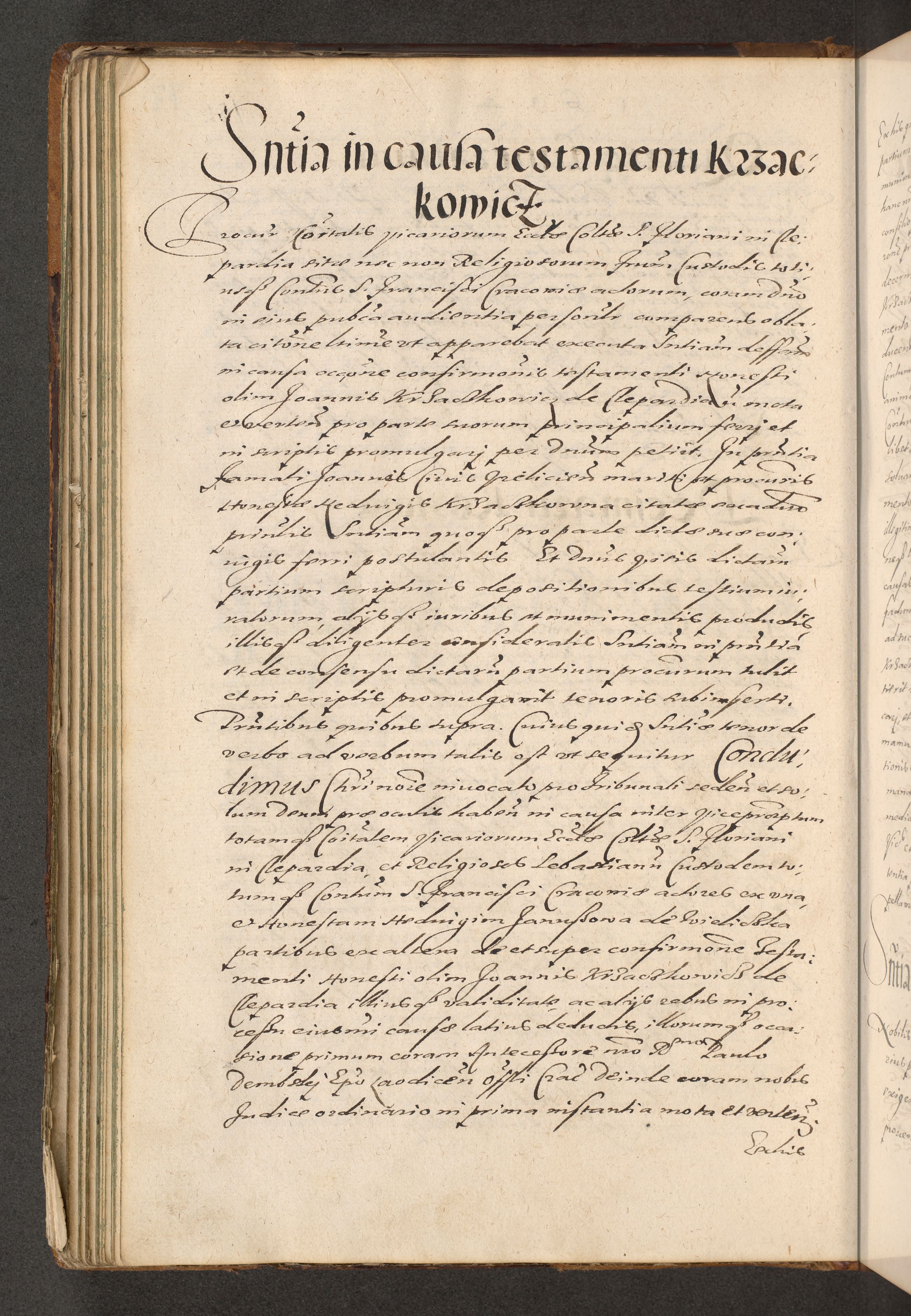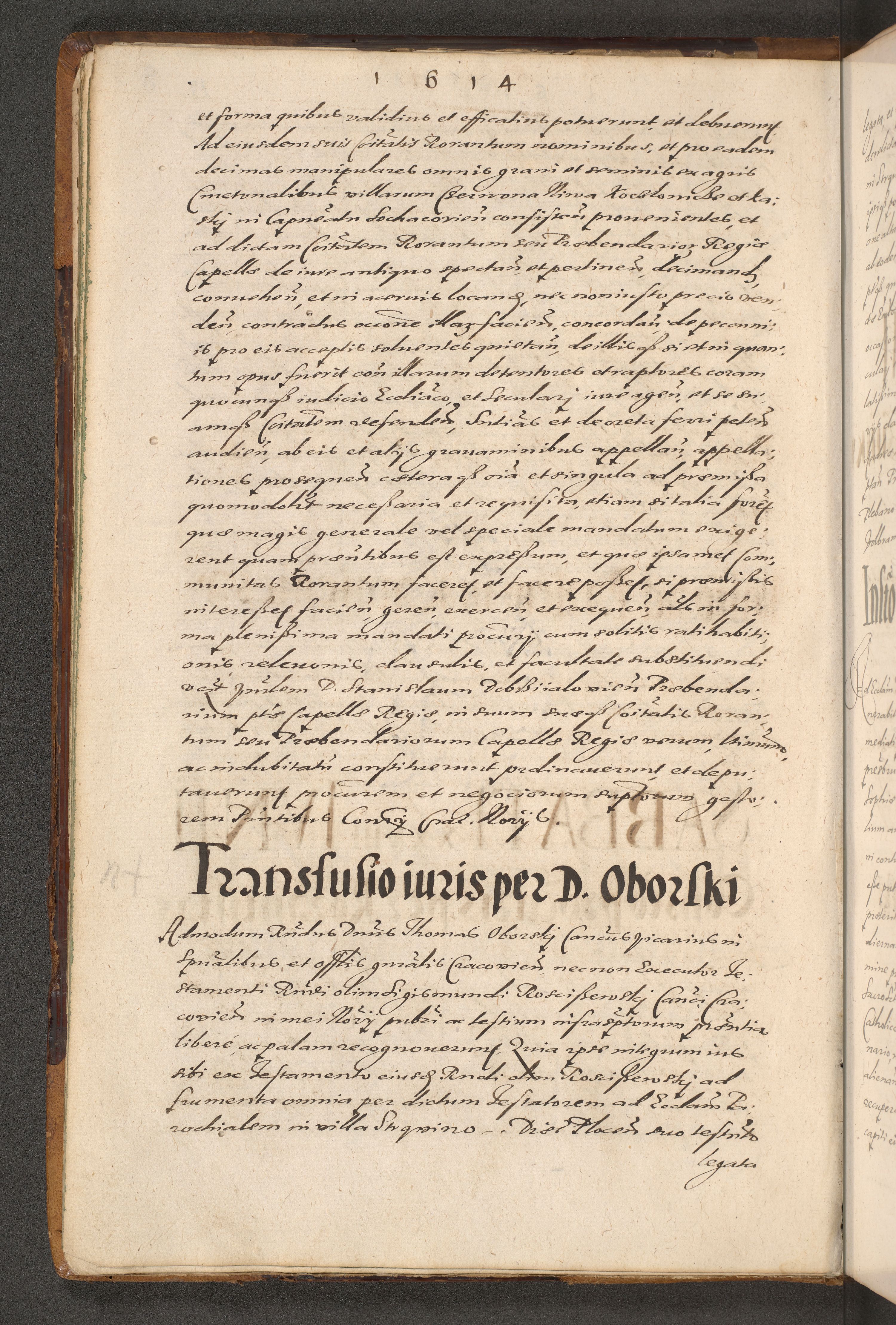 Illustrissimo et Reverendissimo in Christo Patre Domino Domino Petro Tylicki Dei et Apostolice Sedis Gratia Episcopo Cracoviensis Duce Severiensis Acta actorum causarum sententiarum tam interloquutoriarum quam definitivarum decretorum obligationum, quietationum, recognitionum, constitutionum procuratorum etc. etc. coram Admodum Reverendo Domino Thoma Oborski I. V. Doctore Canonico Vicario in Spiritualibus et Officiali generali Cracoviensis in anno Domini Millesimo Sexcentessimo Decimoquarto Cuius Indictio duodecima Pontificus SS. D. N. D. Pauli Divina providentia Papae quinti Anno decimo foeliciter incipiunt