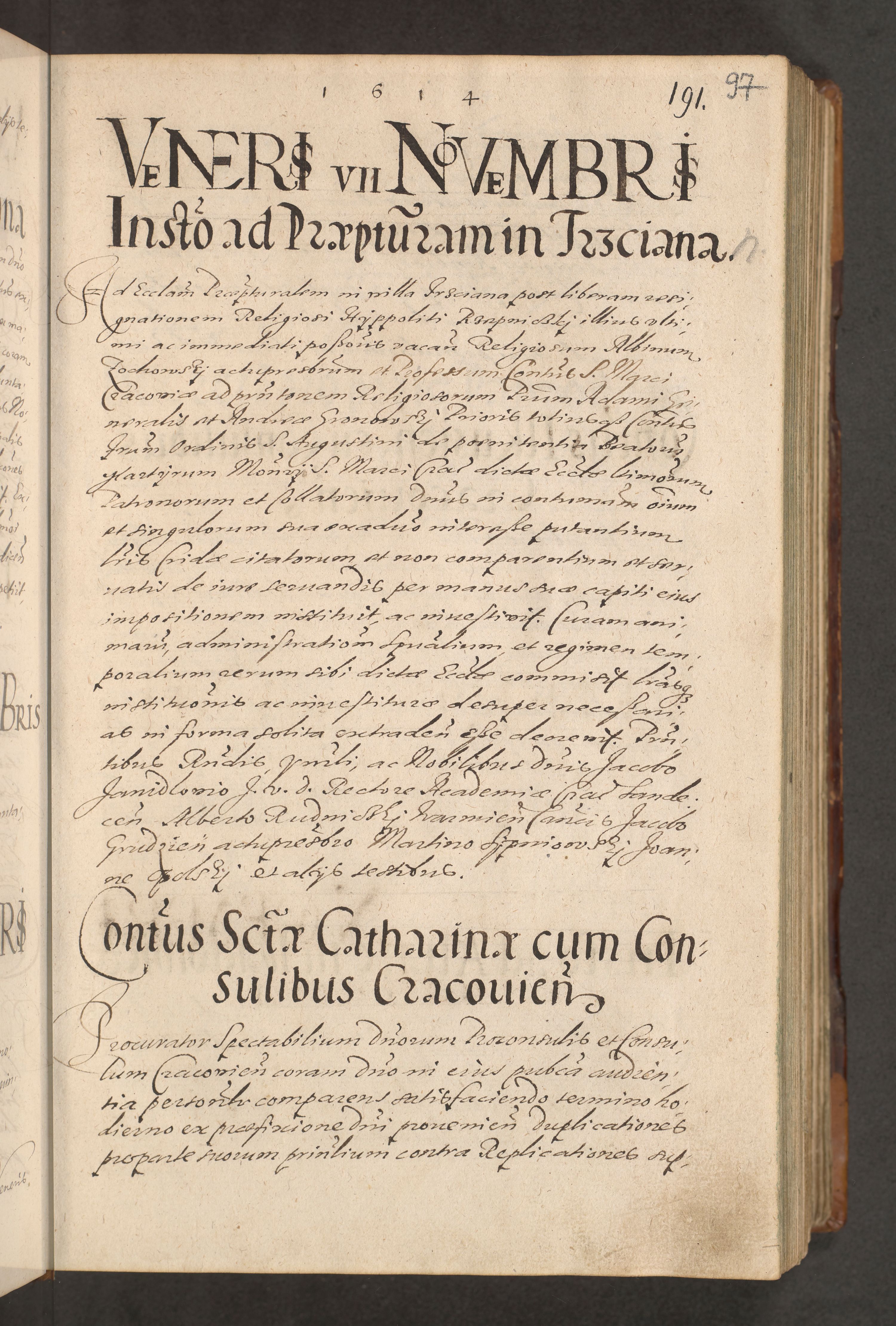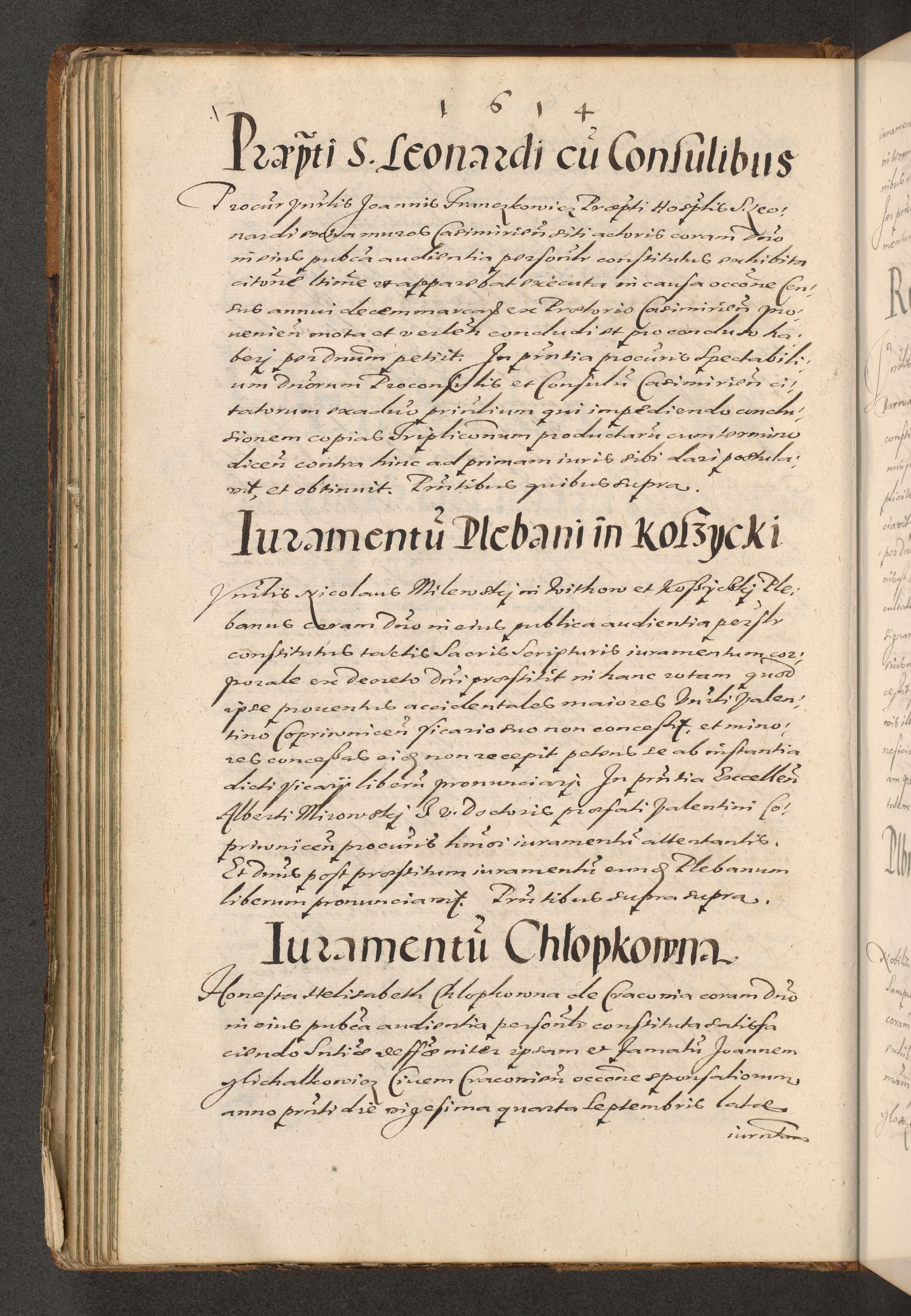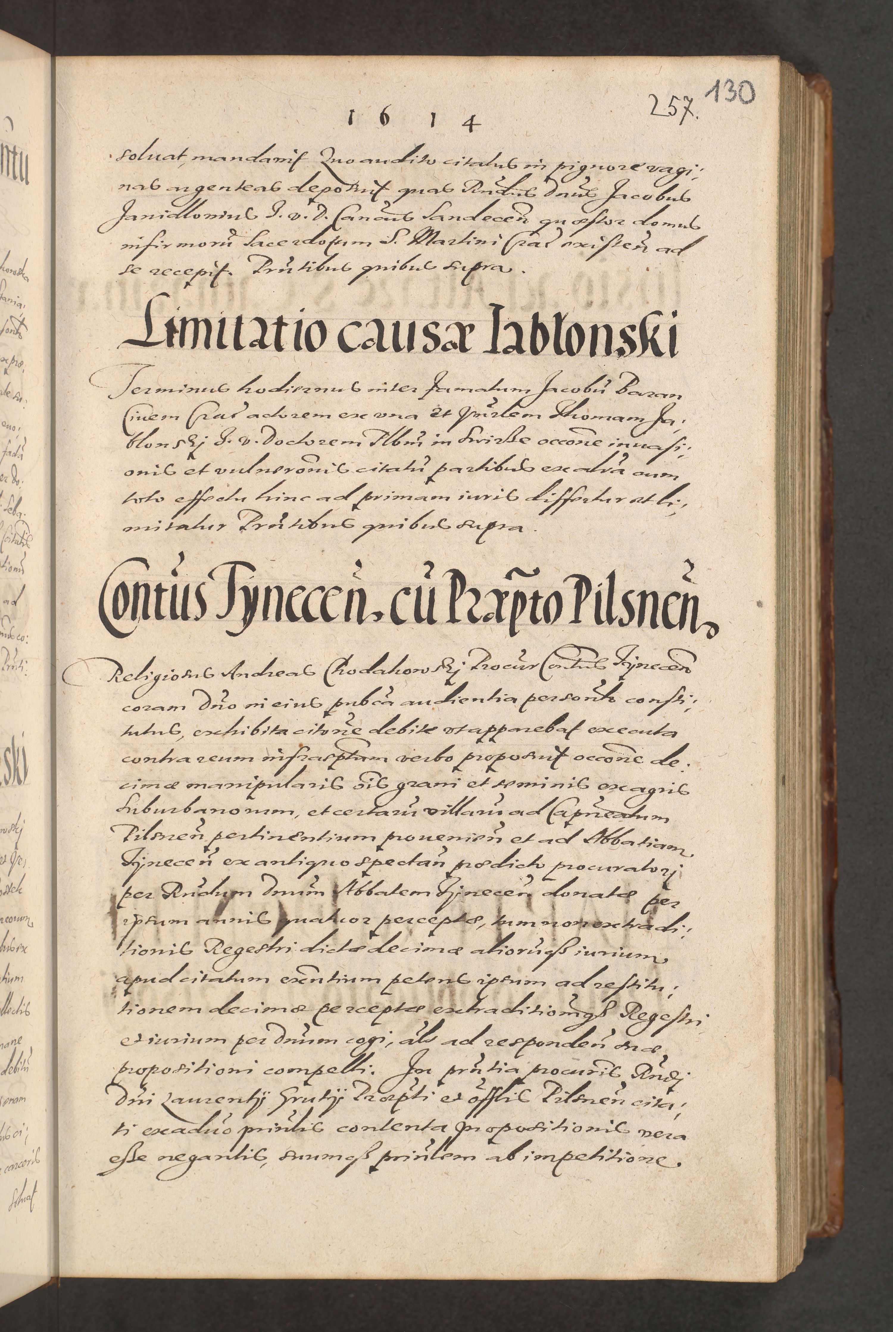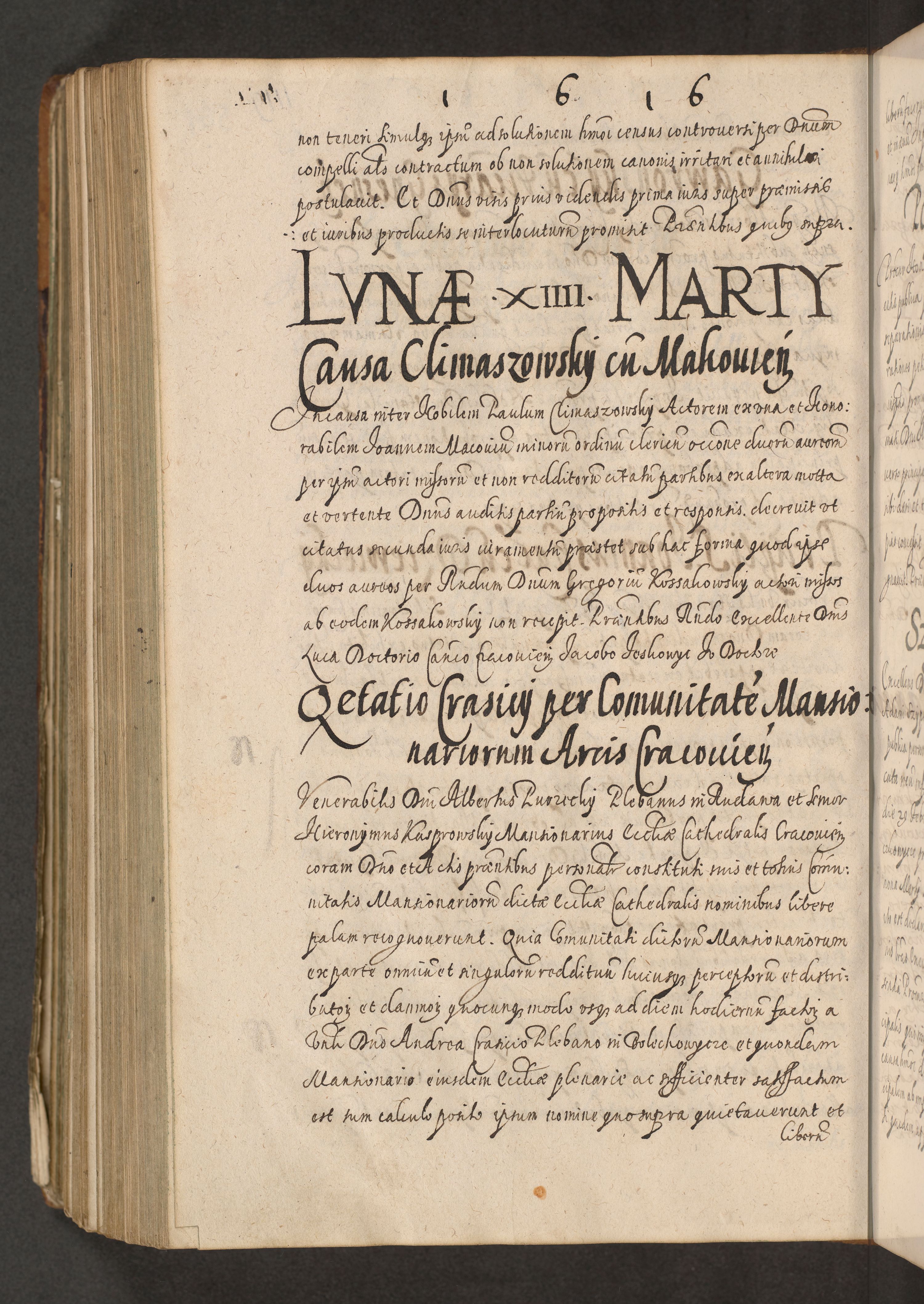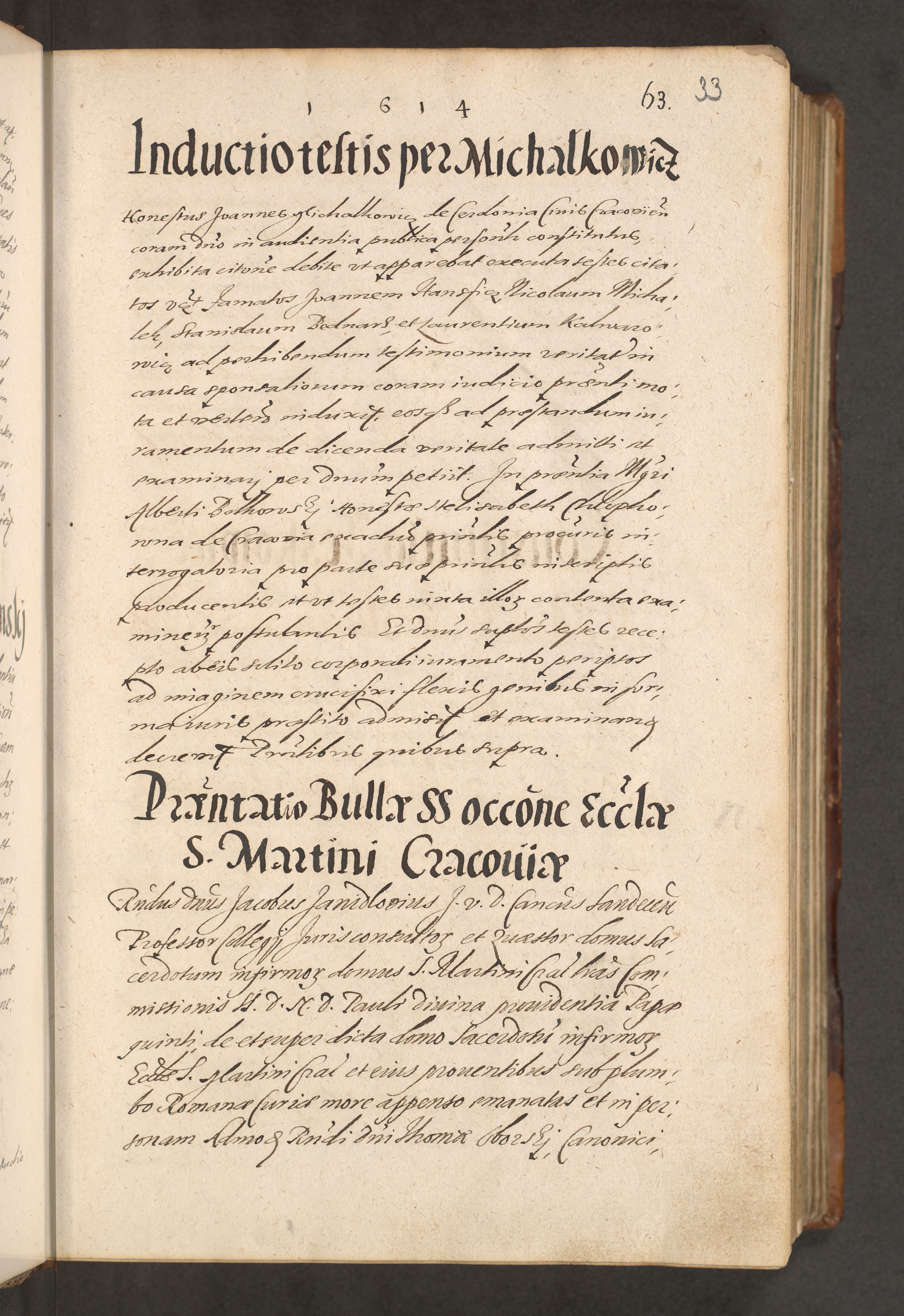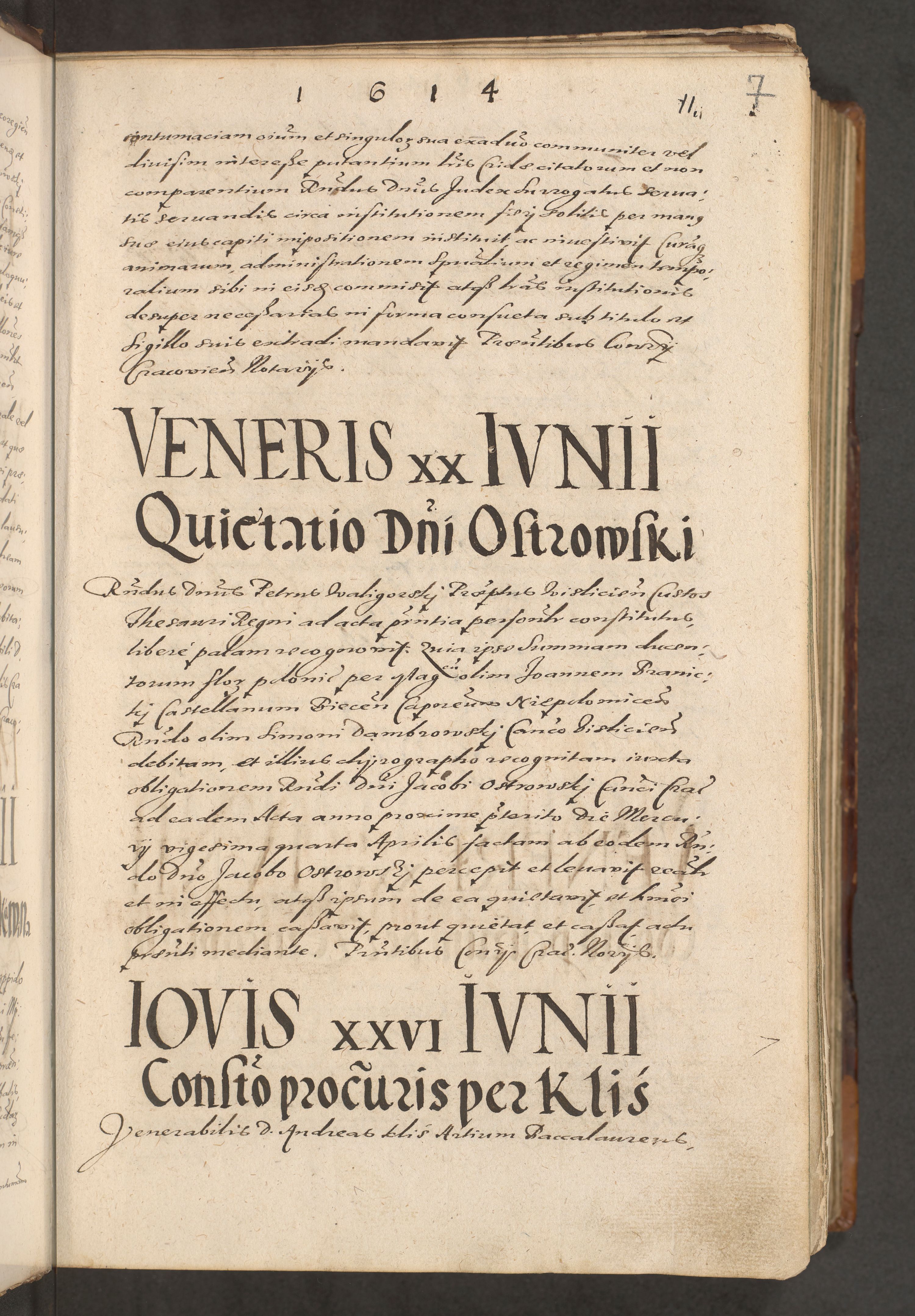 Illustrissimo et Reverendissimo in Christo Patre Domino Domino Petro Tylicki Dei et Apostolice Sedis Gratia Episcopo Cracoviensis Duce Severiensis Acta actorum causarum sententiarum tam interloquutoriarum quam definitivarum decretorum obligationum, quietationum, recognitionum, constitutionum procuratorum etc. etc. coram Admodum Reverendo Domino Thoma Oborski I. V. Doctore Canonico Vicario in Spiritualibus et Officiali generali Cracoviensis in anno Domini Millesimo Sexcentessimo Decimoquarto Cuius Indictio duodecima Pontificus SS. D. N. D. Pauli Divina providentia Papae quinti Anno decimo foeliciter incipiunt
