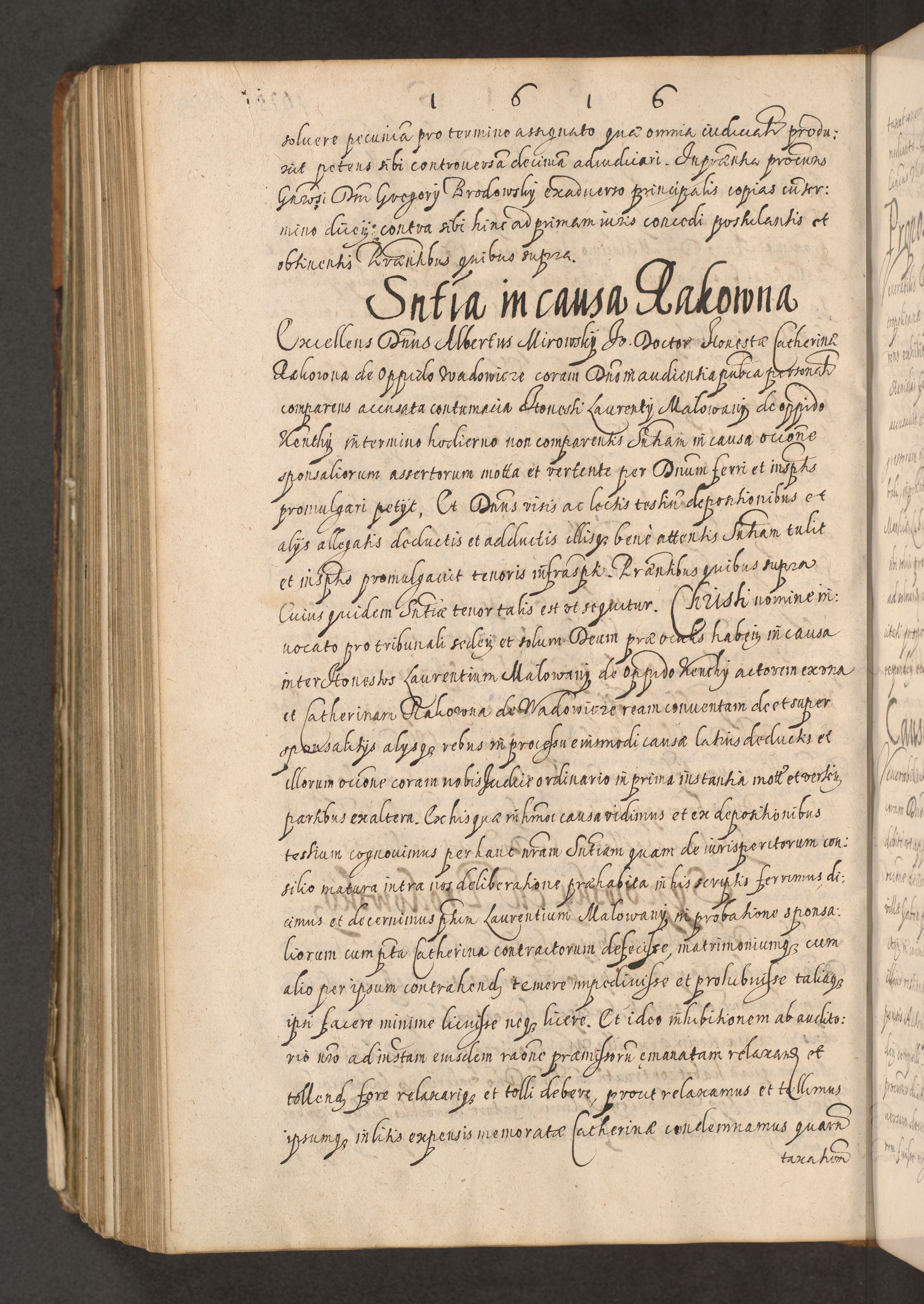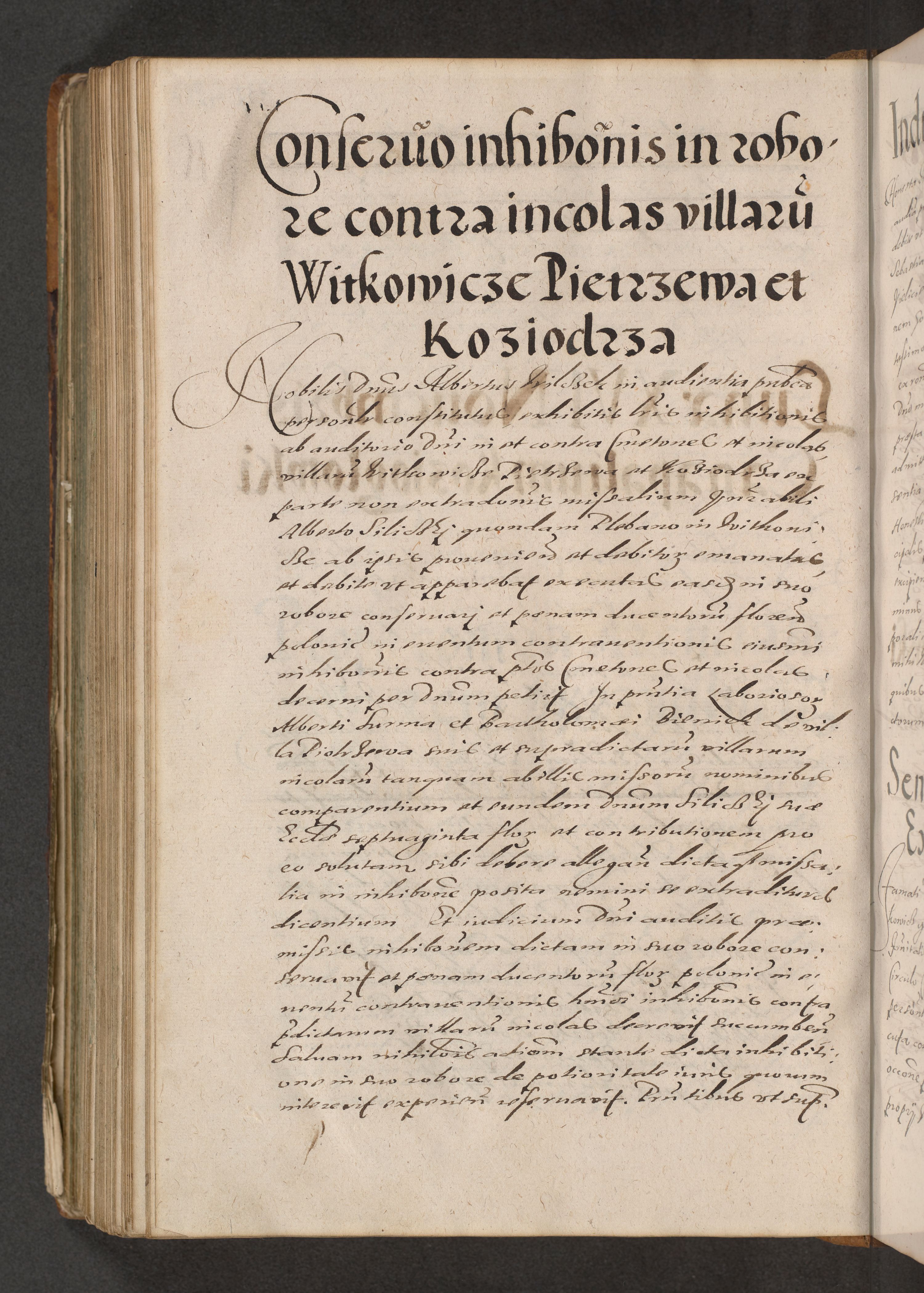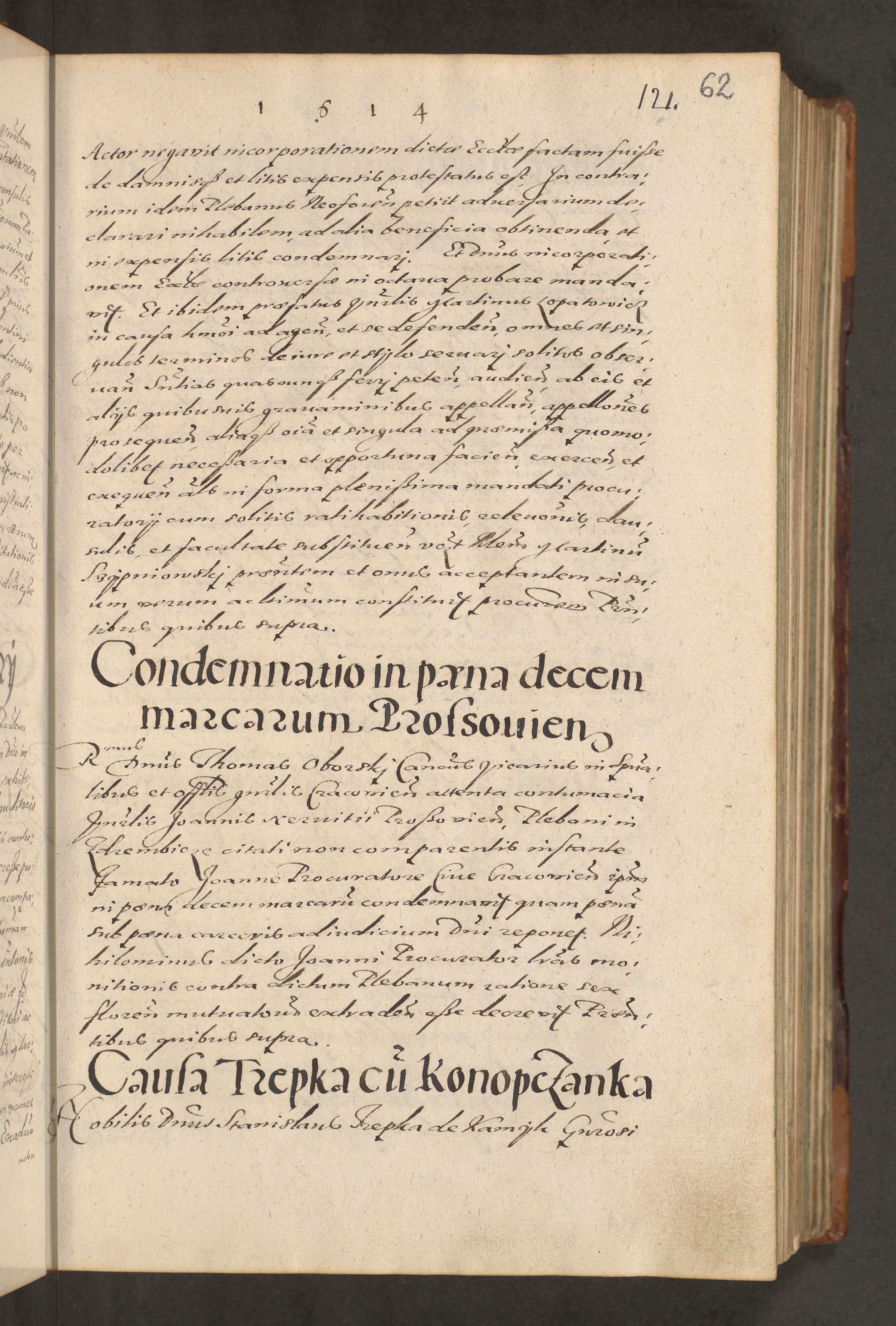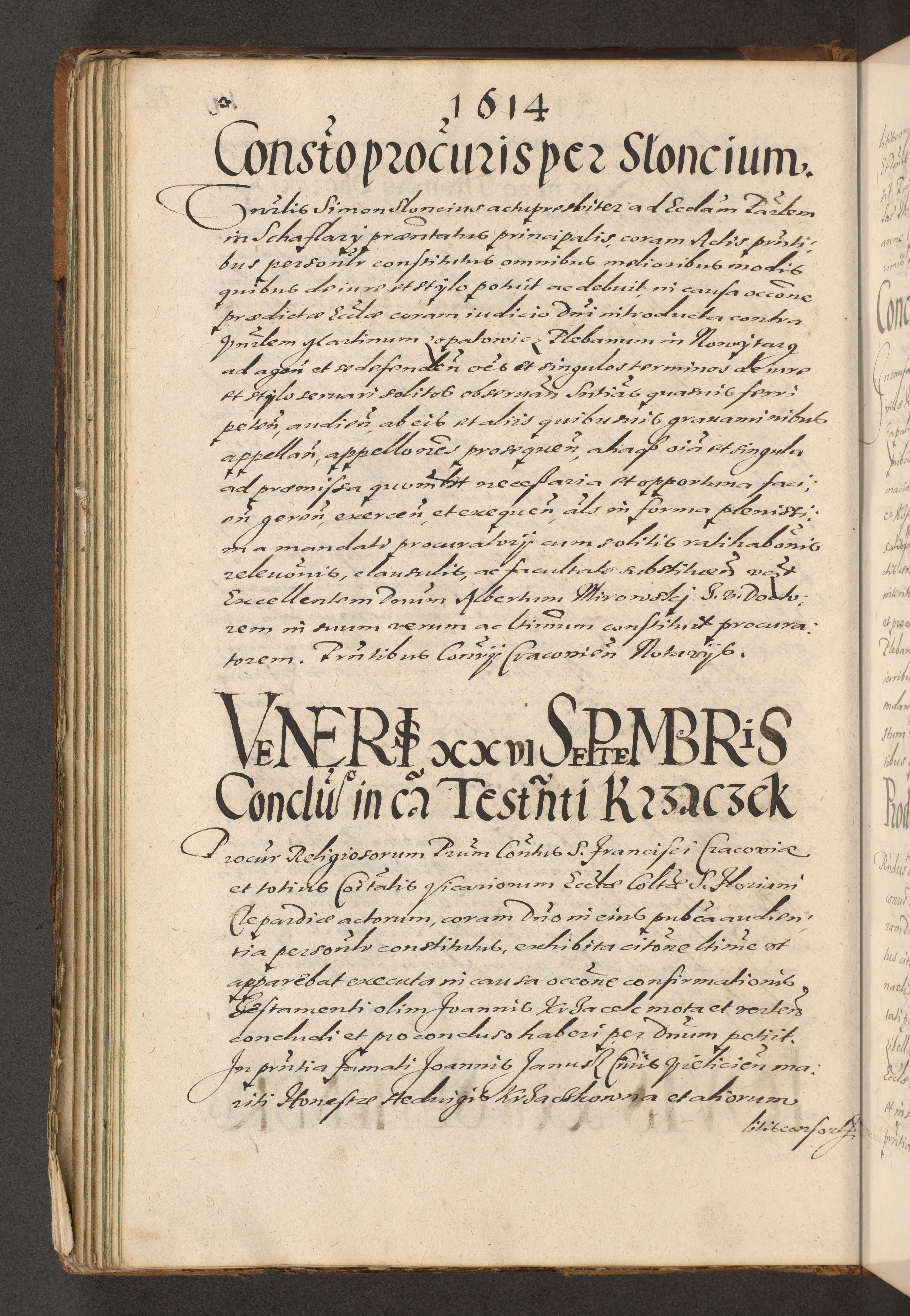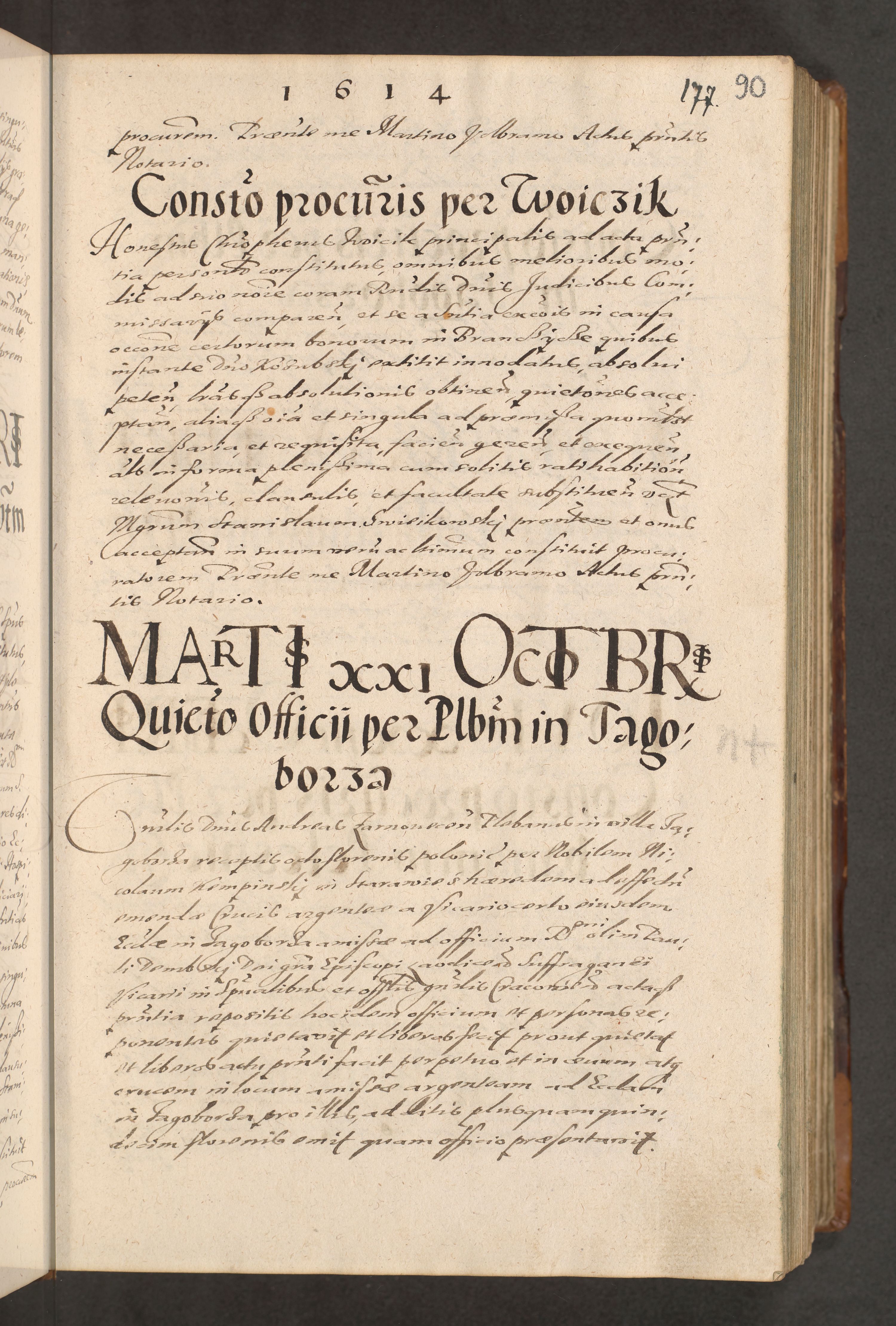 Illustrissimo et Reverendissimo in Christo Patre Domino Domino Petro Tylicki Dei et Apostolice Sedis Gratia Episcopo Cracoviensis Duce Severiensis Acta actorum causarum sententiarum tam interloquutoriarum quam definitivarum decretorum obligationum, quietationum, recognitionum, constitutionum procuratorum etc. etc. coram Admodum Reverendo Domino Thoma Oborski I. V. Doctore Canonico Vicario in Spiritualibus et Officiali generali Cracoviensis in anno Domini Millesimo Sexcentessimo Decimoquarto Cuius Indictio duodecima Pontificus SS. D. N. D. Pauli Divina providentia Papae quinti Anno decimo foeliciter incipiunt