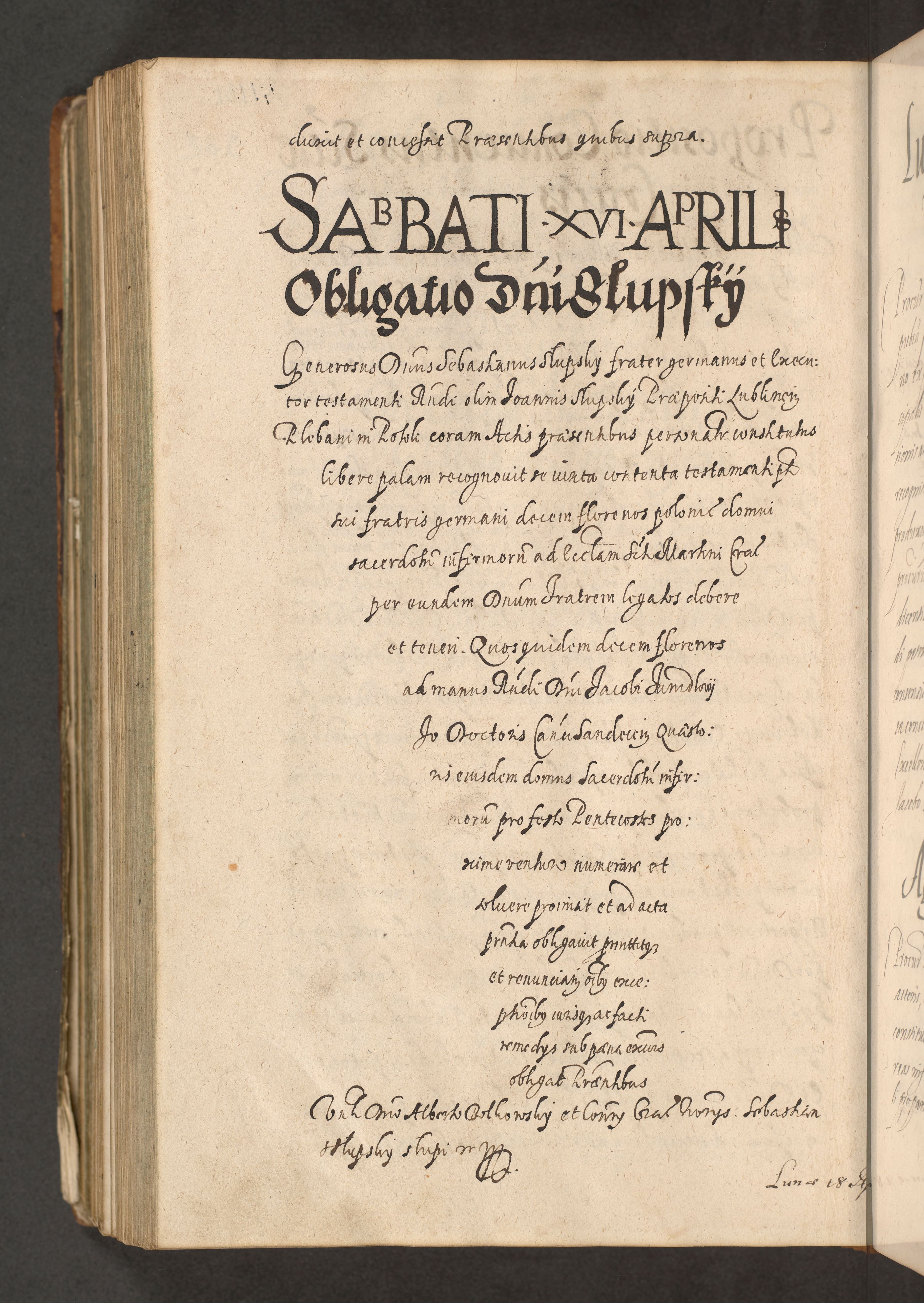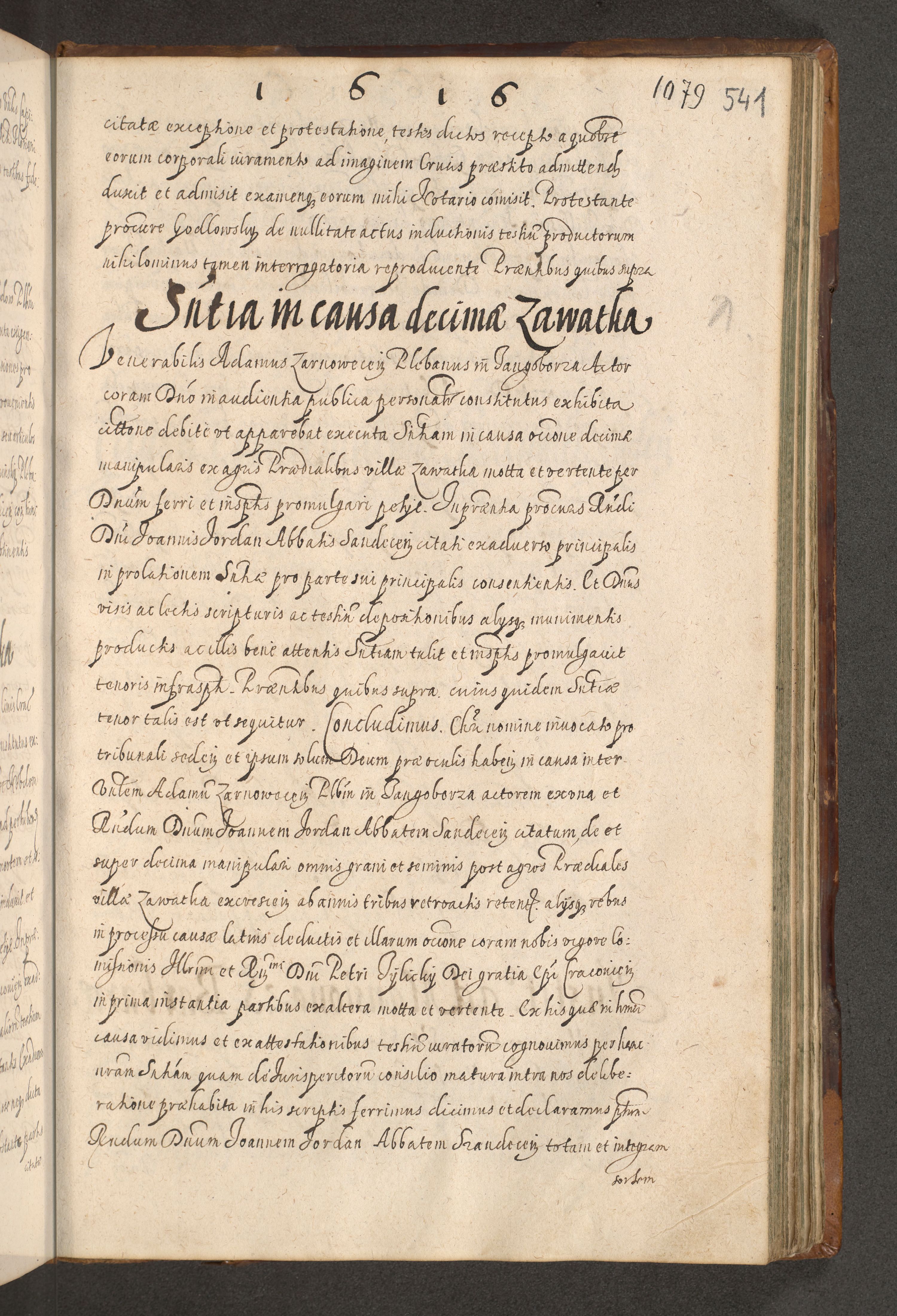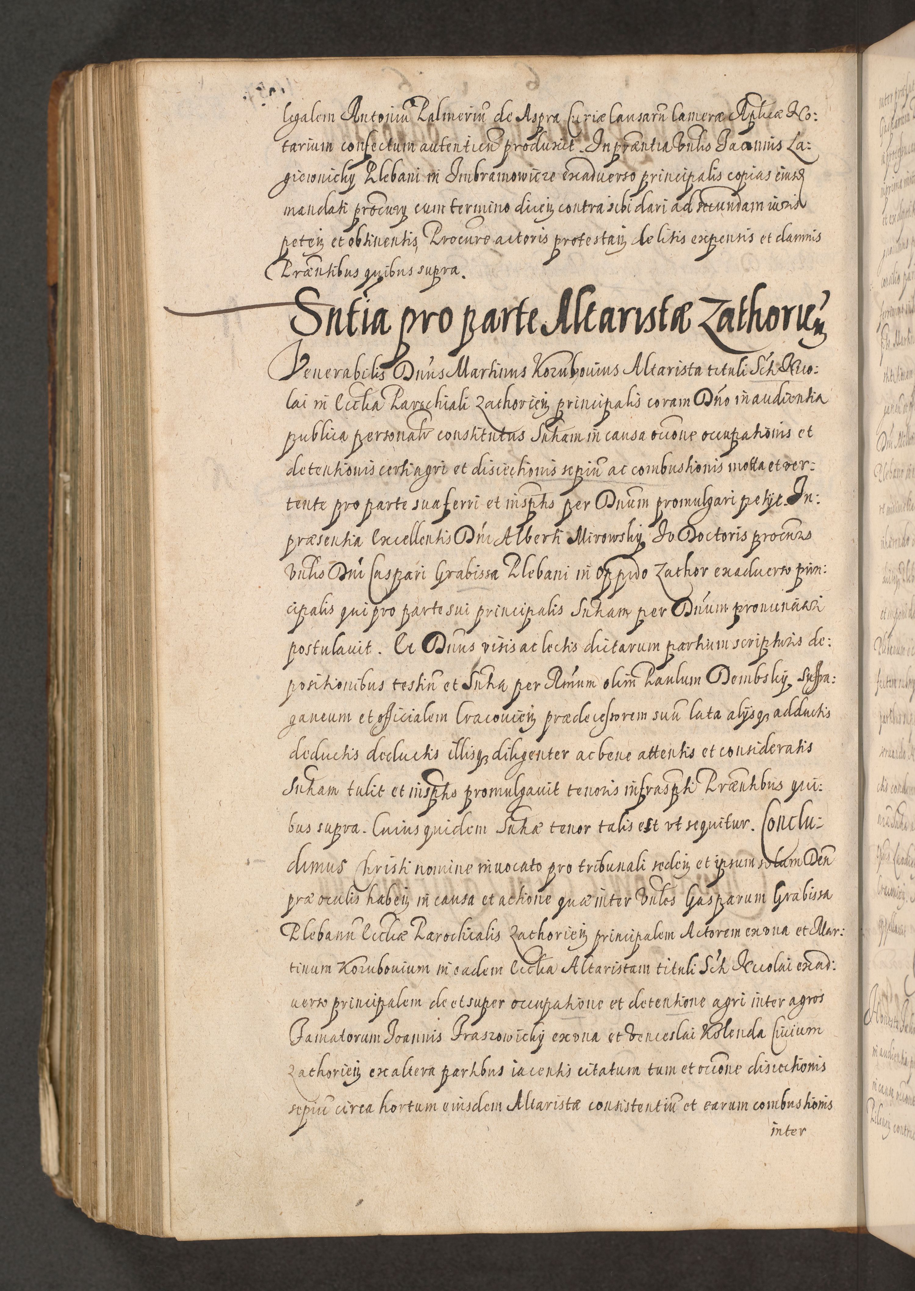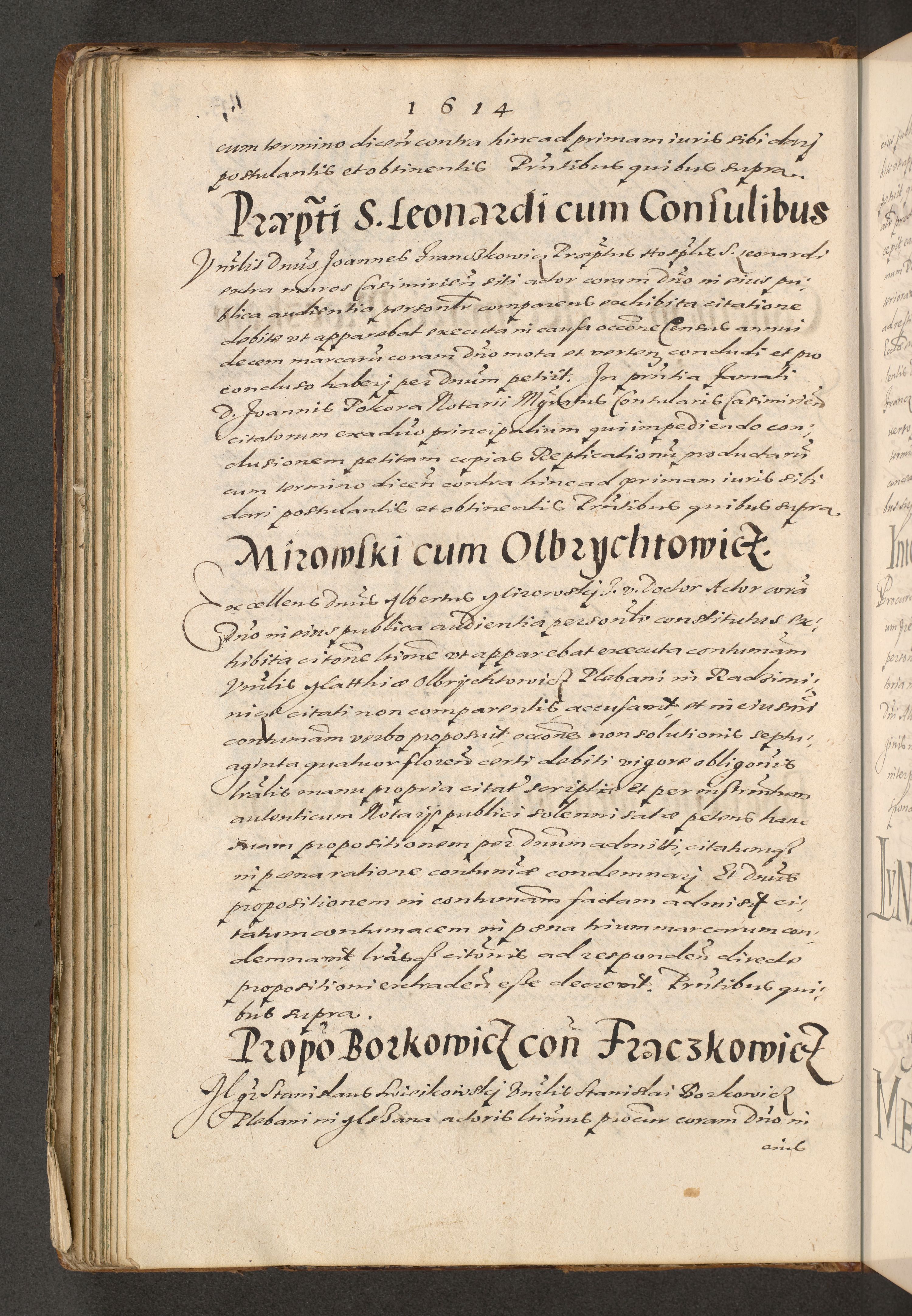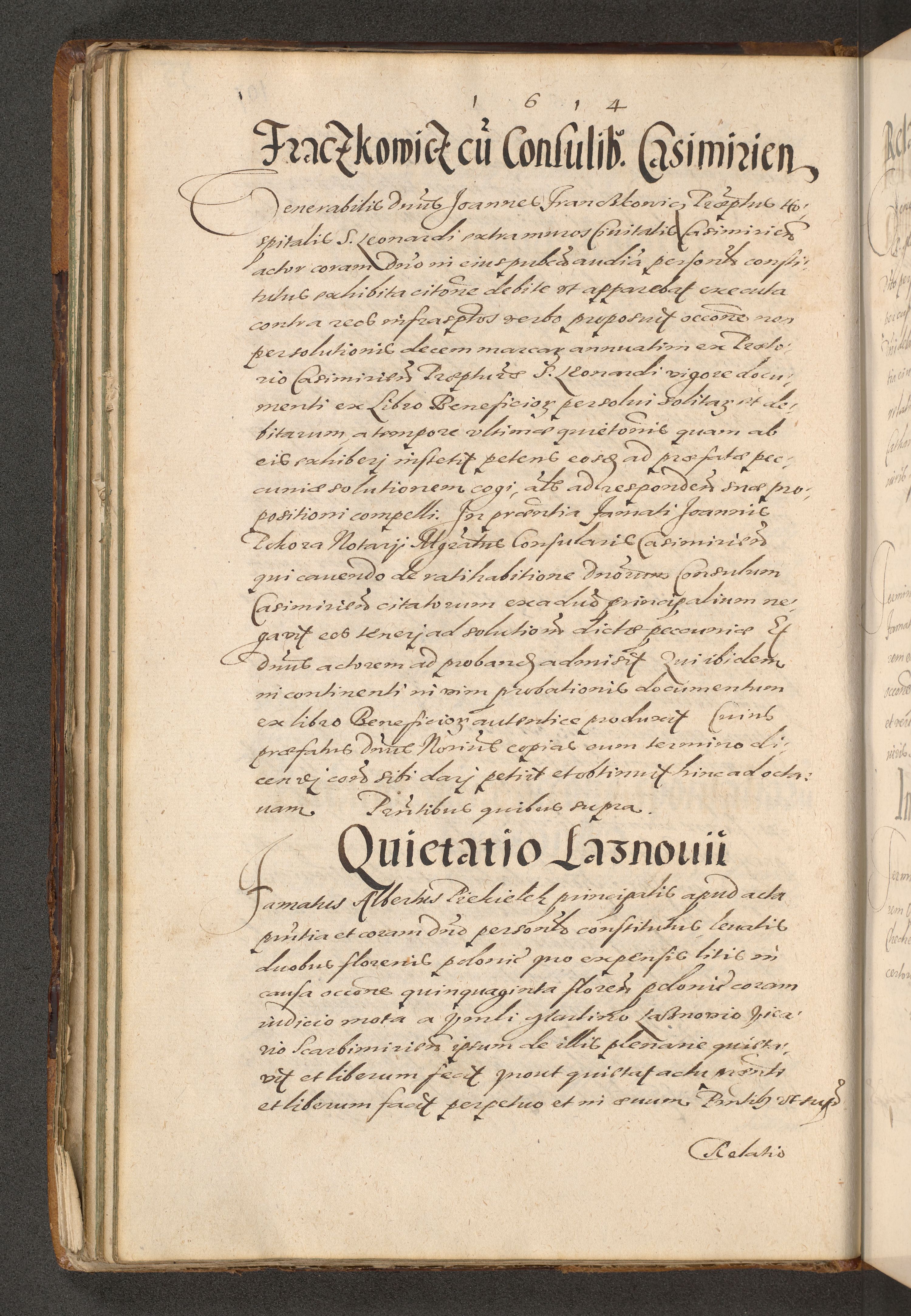 Illustrissimo et Reverendissimo in Christo Patre Domino Domino Petro Tylicki Dei et Apostolice Sedis Gratia Episcopo Cracoviensis Duce Severiensis Acta actorum causarum sententiarum tam interloquutoriarum quam definitivarum decretorum obligationum, quietationum, recognitionum, constitutionum procuratorum etc. etc. coram Admodum Reverendo Domino Thoma Oborski I. V. Doctore Canonico Vicario in Spiritualibus et Officiali generali Cracoviensis in anno Domini Millesimo Sexcentessimo Decimoquarto Cuius Indictio duodecima Pontificus SS. D. N. D. Pauli Divina providentia Papae quinti Anno decimo foeliciter incipiunt