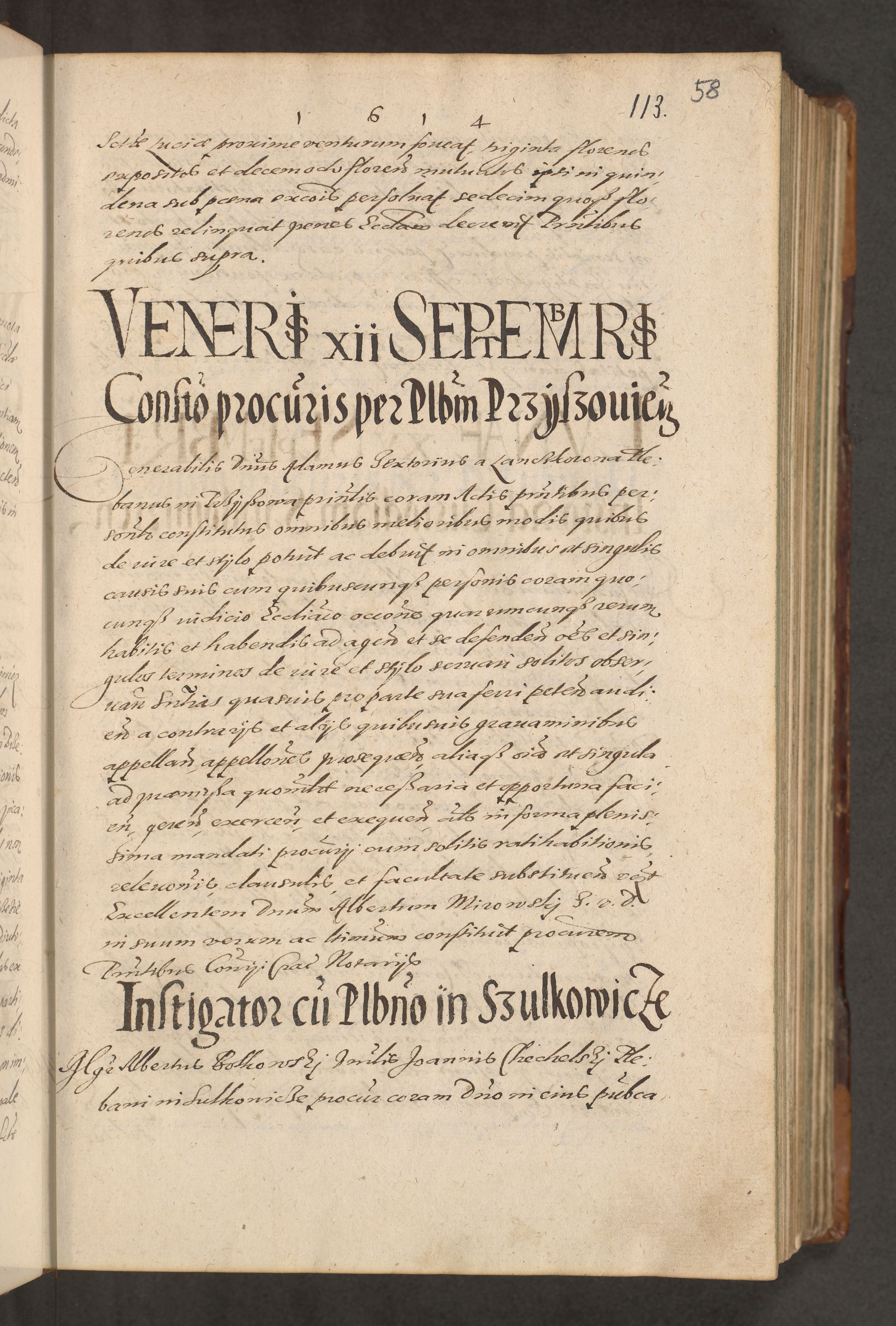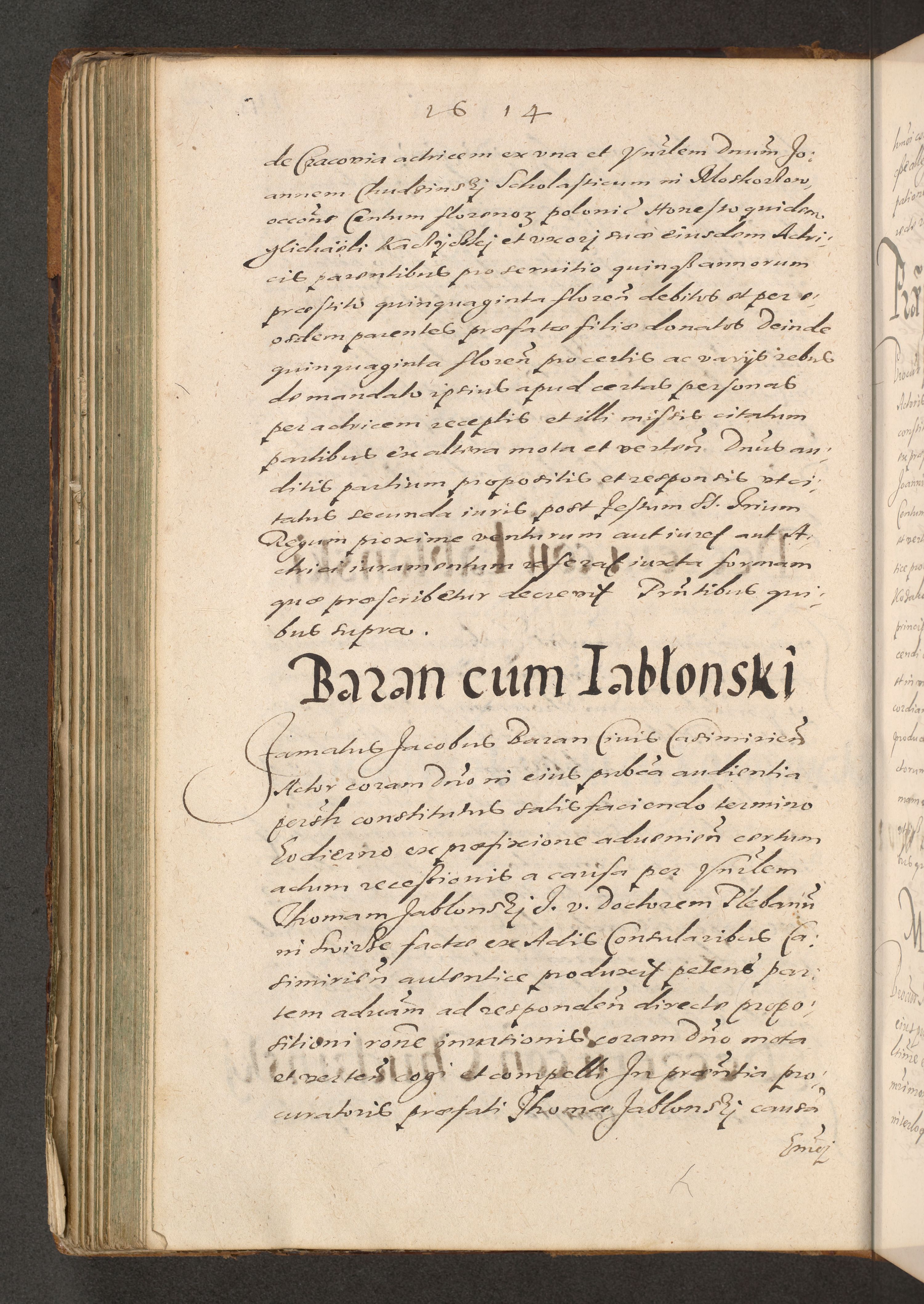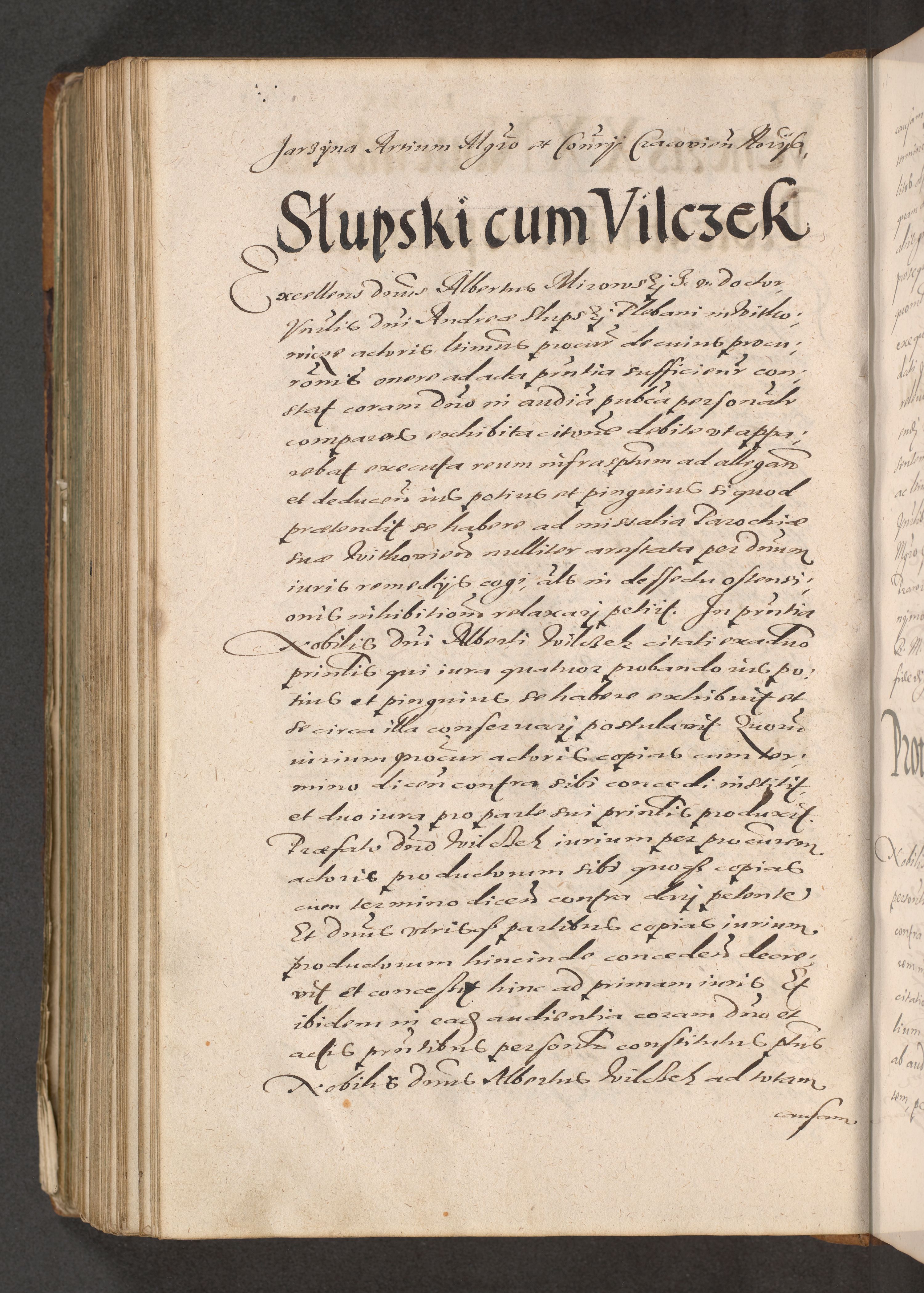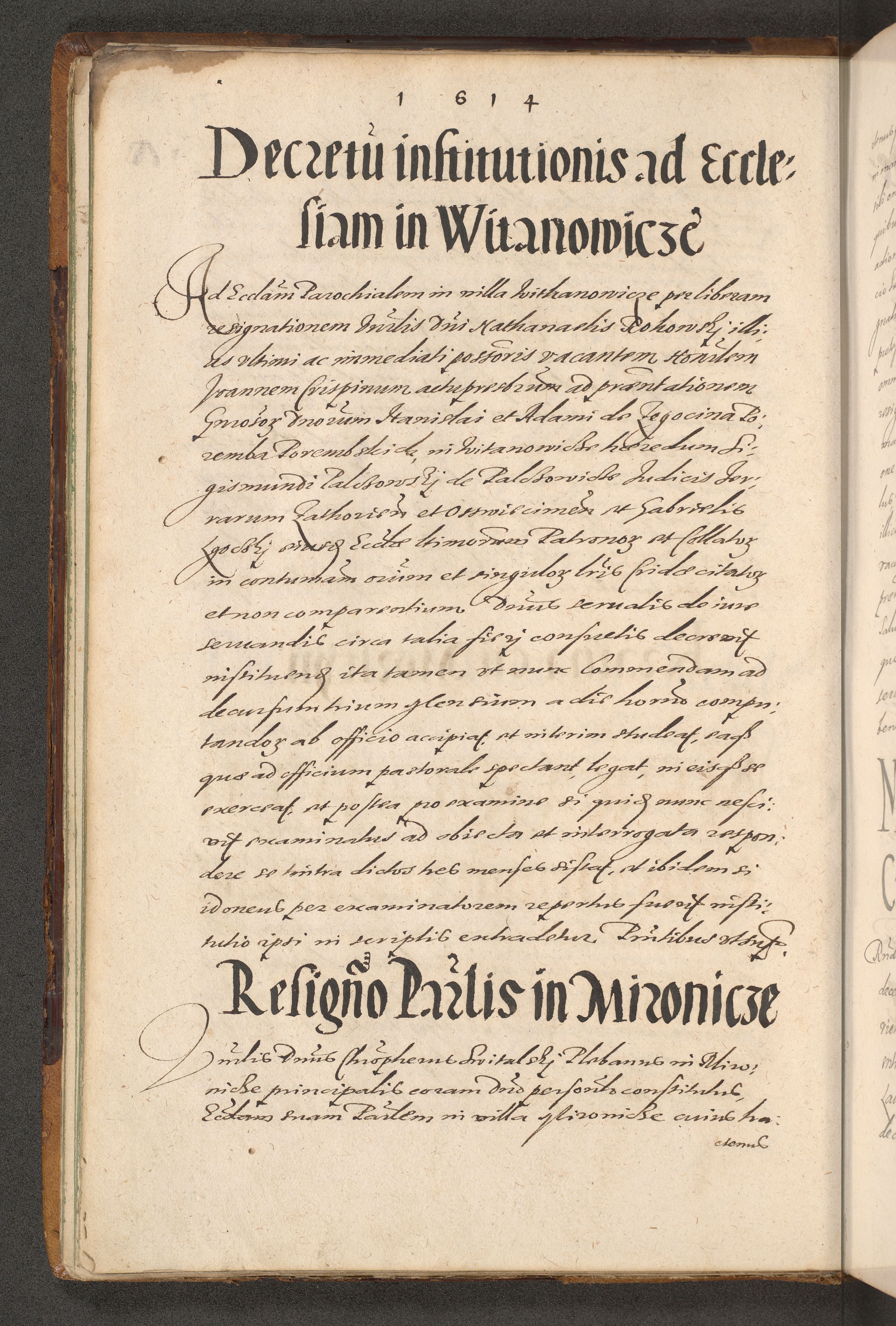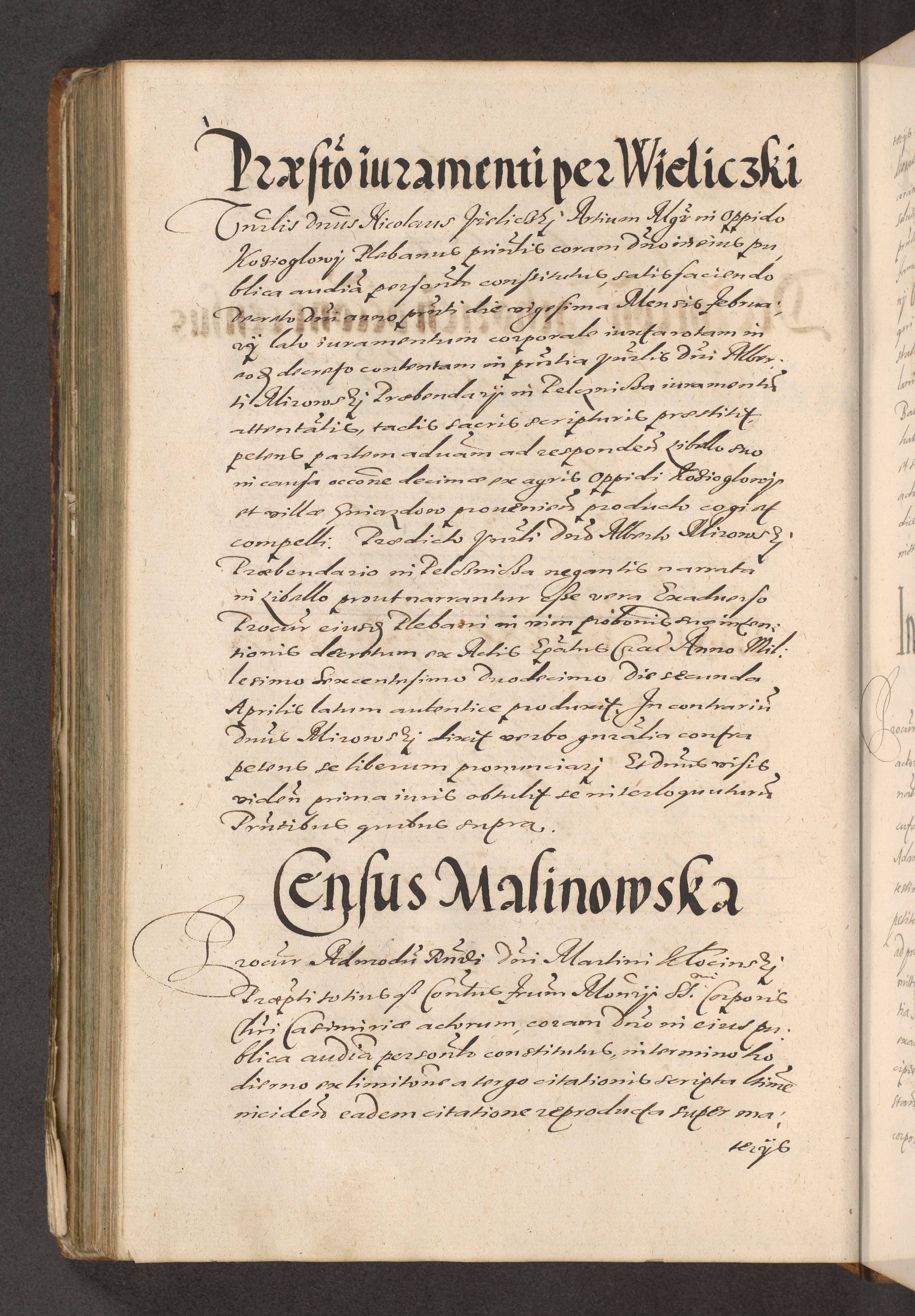 Illustrissimo et Reverendissimo in Christo Patre Domino Domino Petro Tylicki Dei et Apostolice Sedis Gratia Episcopo Cracoviensis Duce Severiensis Acta actorum causarum sententiarum tam interloquutoriarum quam definitivarum decretorum obligationum, quietationum, recognitionum, constitutionum procuratorum etc. etc. coram Admodum Reverendo Domino Thoma Oborski I. V. Doctore Canonico Vicario in Spiritualibus et Officiali generali Cracoviensis in anno Domini Millesimo Sexcentessimo Decimoquarto Cuius Indictio duodecima Pontificus SS. D. N. D. Pauli Divina providentia Papae quinti Anno decimo foeliciter incipiunt