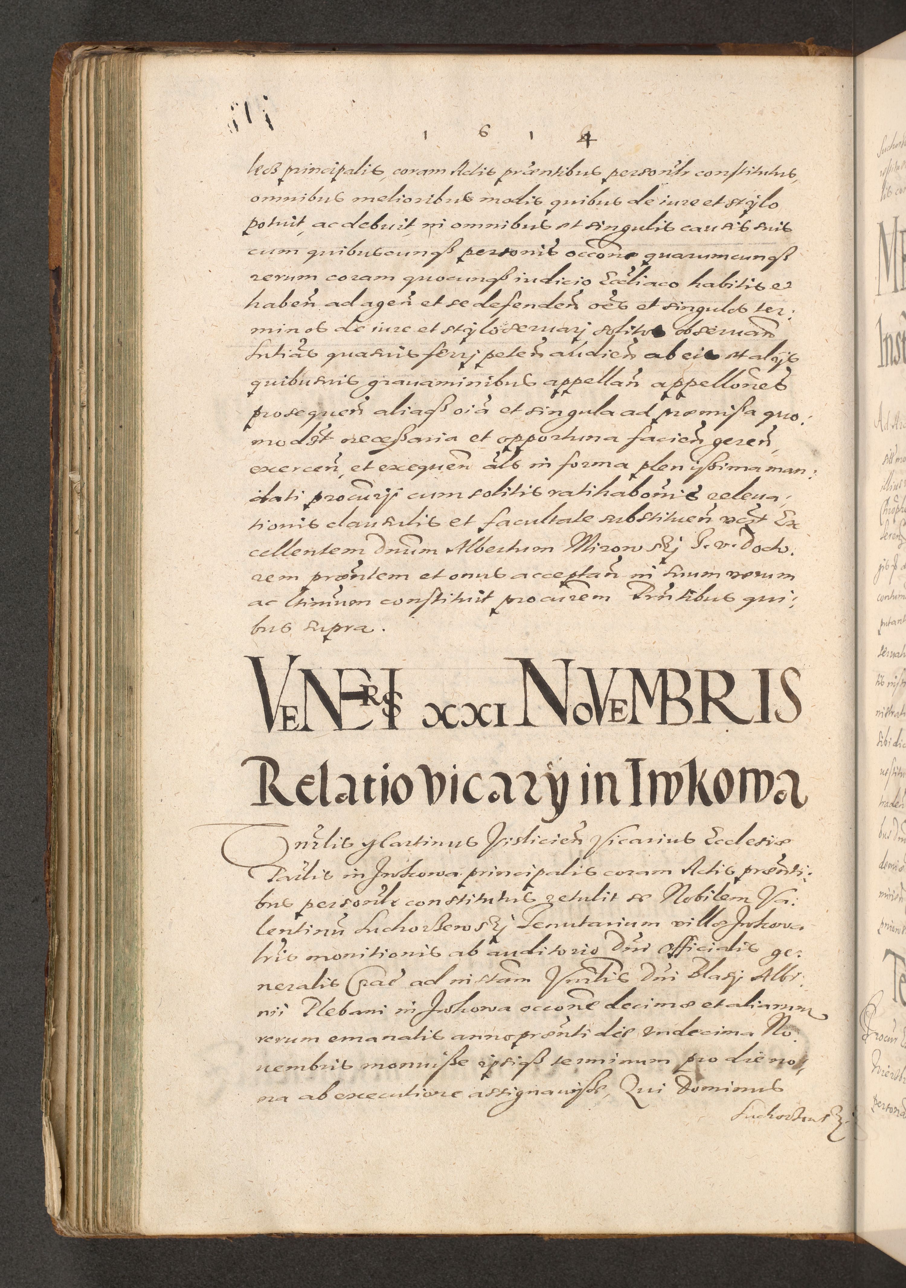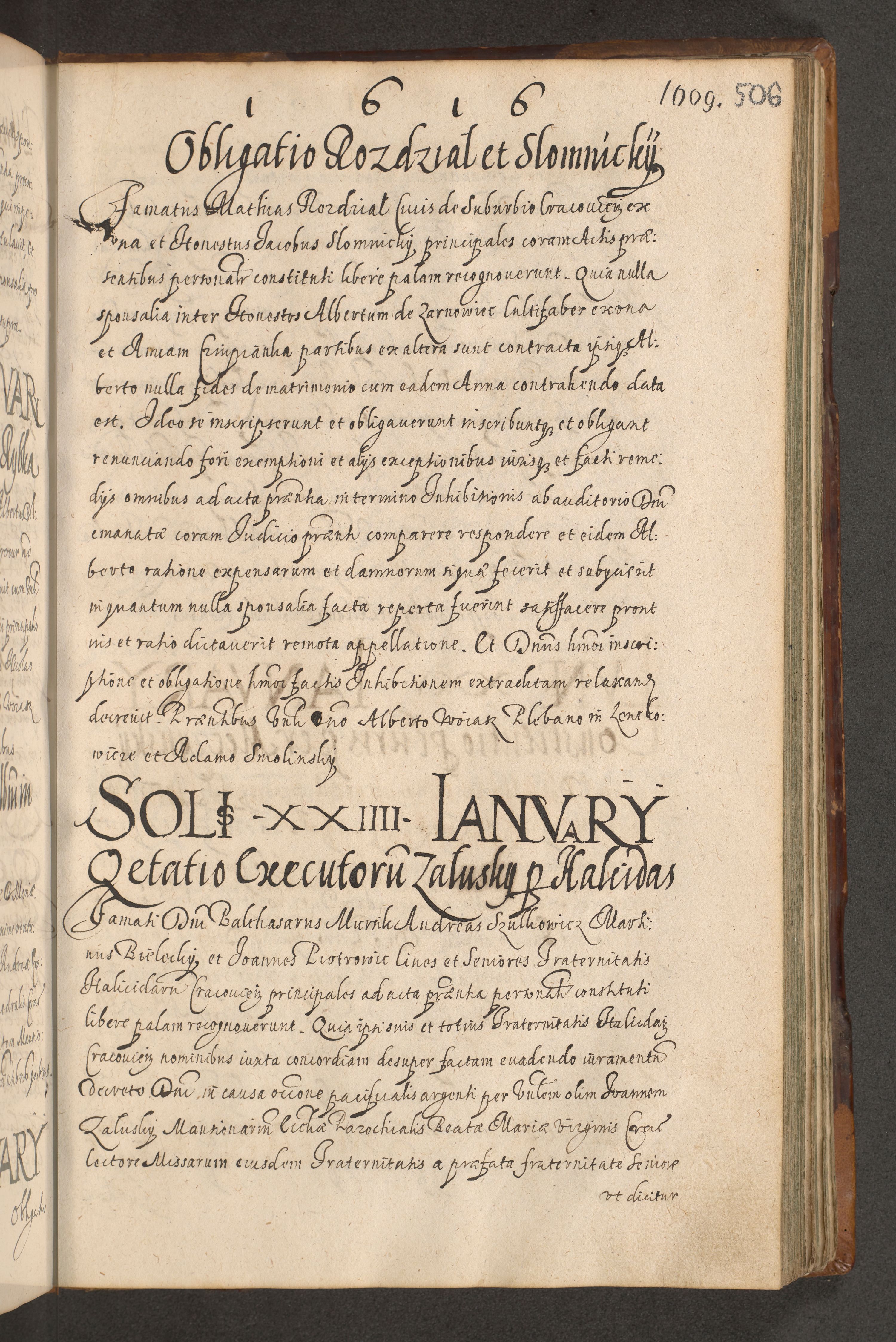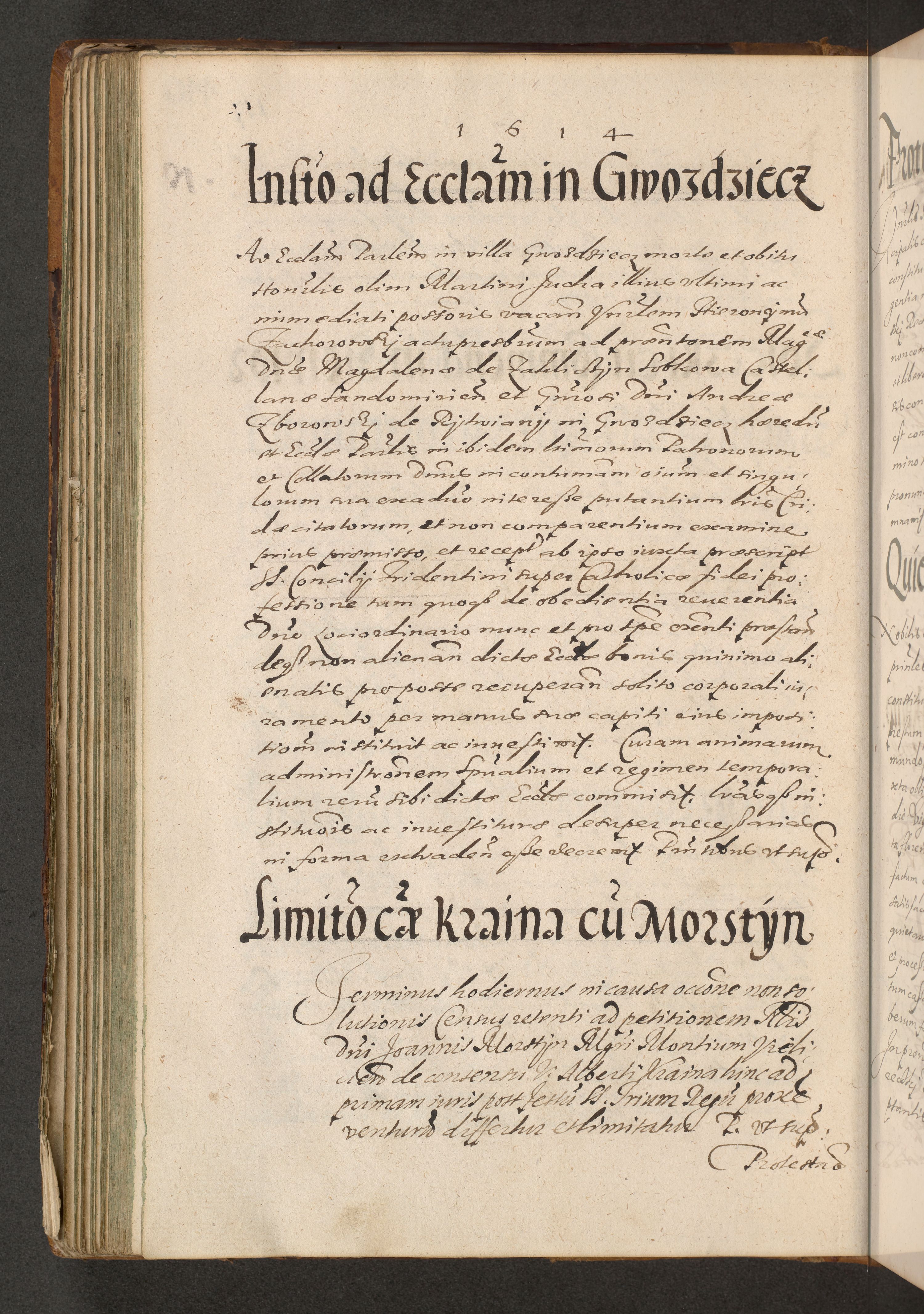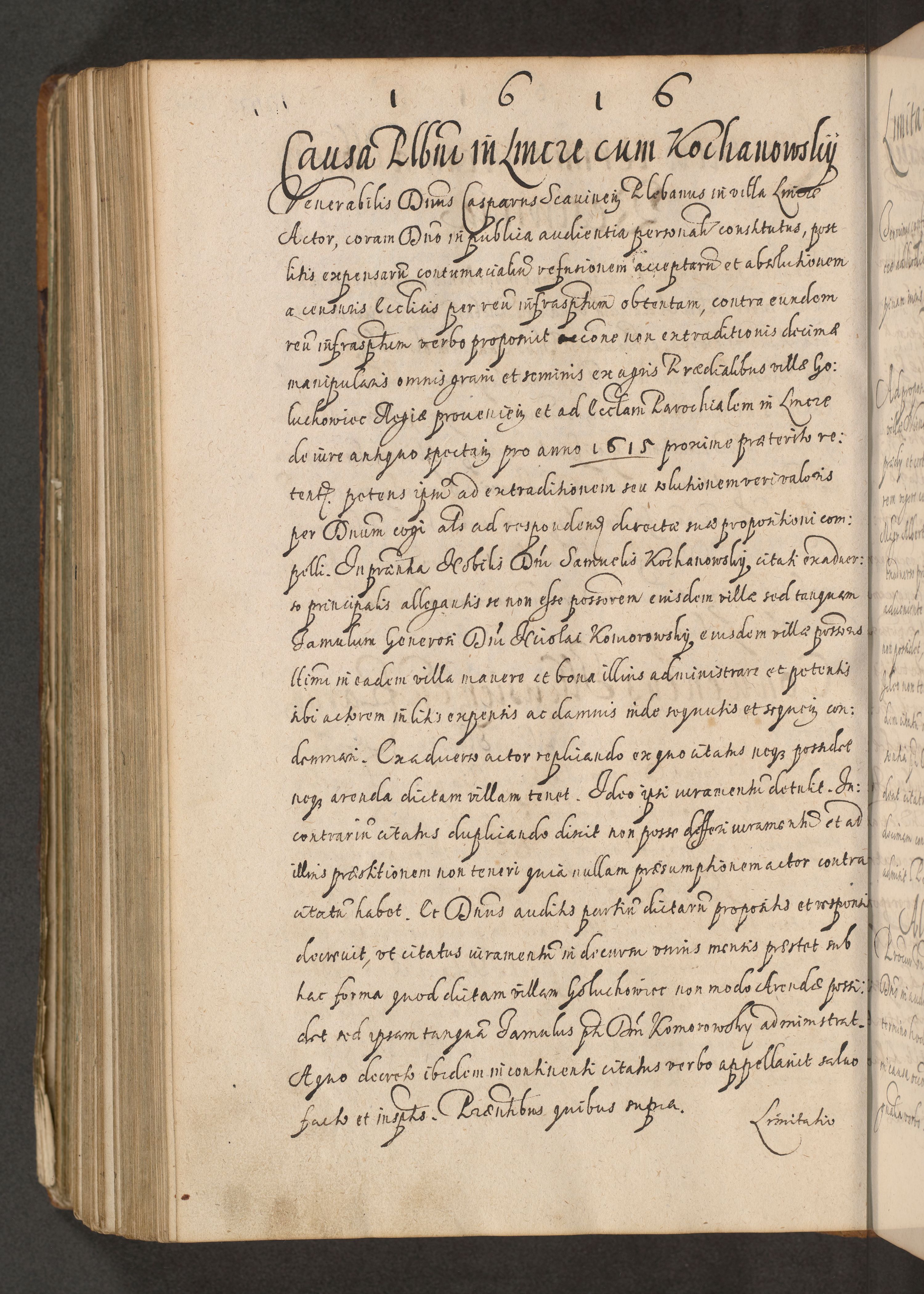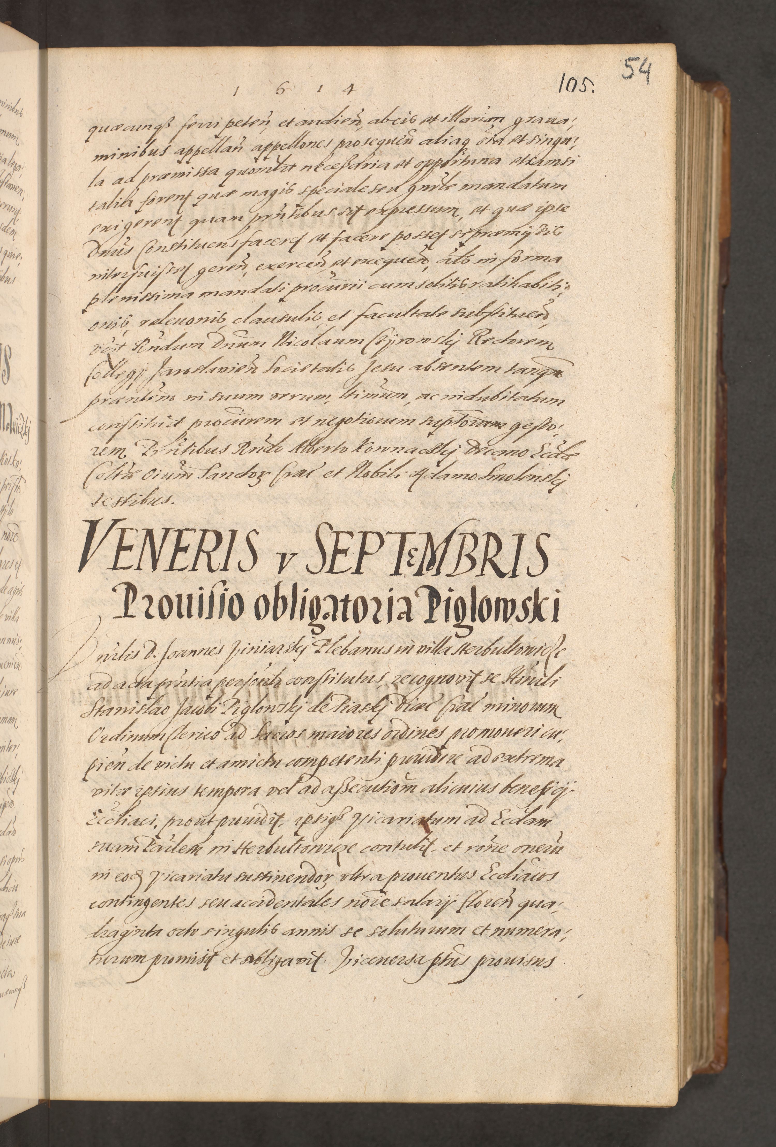 Illustrissimo et Reverendissimo in Christo Patre Domino Domino Petro Tylicki Dei et Apostolice Sedis Gratia Episcopo Cracoviensis Duce Severiensis Acta actorum causarum sententiarum tam interloquutoriarum quam definitivarum decretorum obligationum, quietationum, recognitionum, constitutionum procuratorum etc. etc. coram Admodum Reverendo Domino Thoma Oborski I. V. Doctore Canonico Vicario in Spiritualibus et Officiali generali Cracoviensis in anno Domini Millesimo Sexcentessimo Decimoquarto Cuius Indictio duodecima Pontificus SS. D. N. D. Pauli Divina providentia Papae quinti Anno decimo foeliciter incipiunt