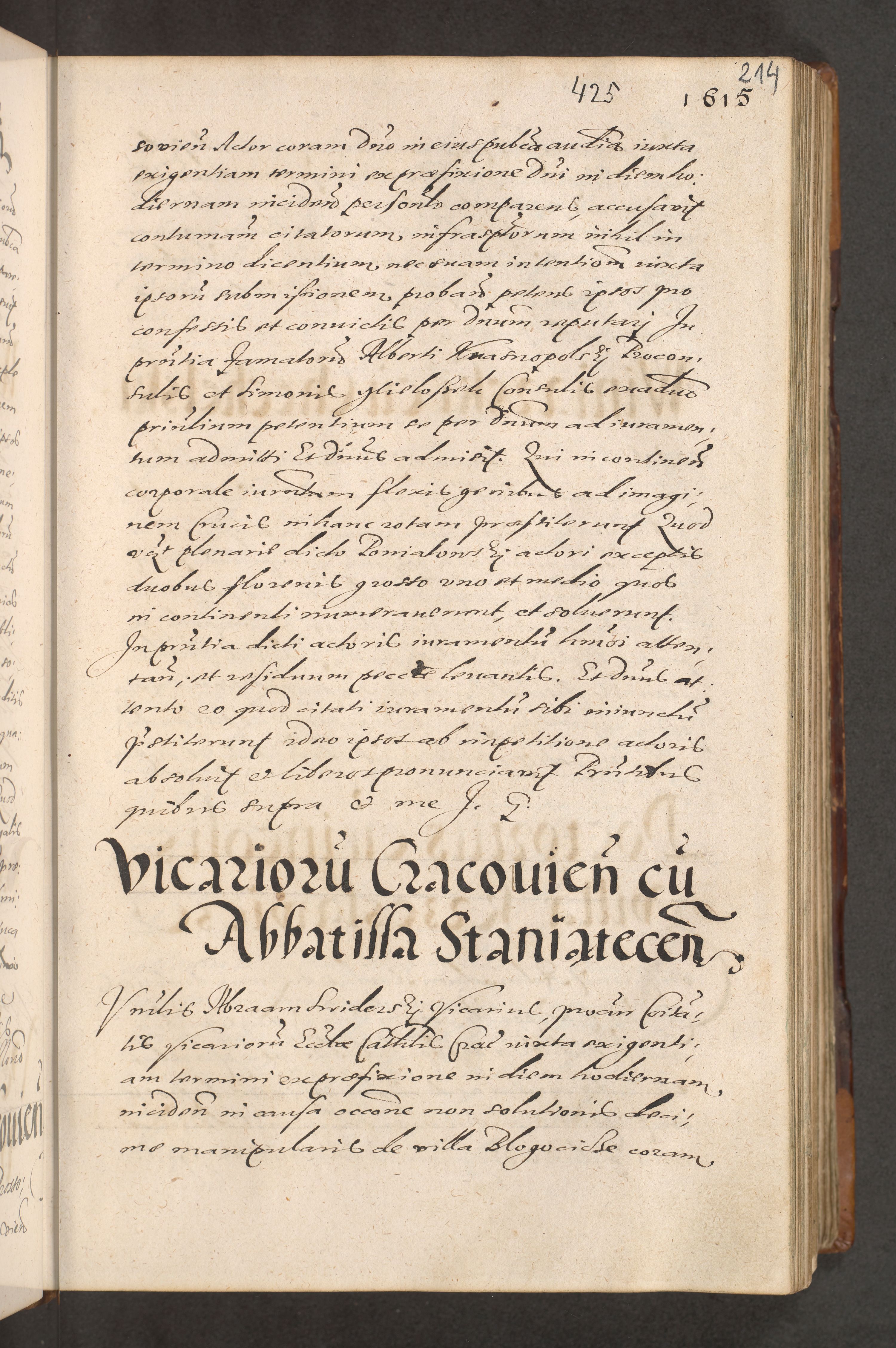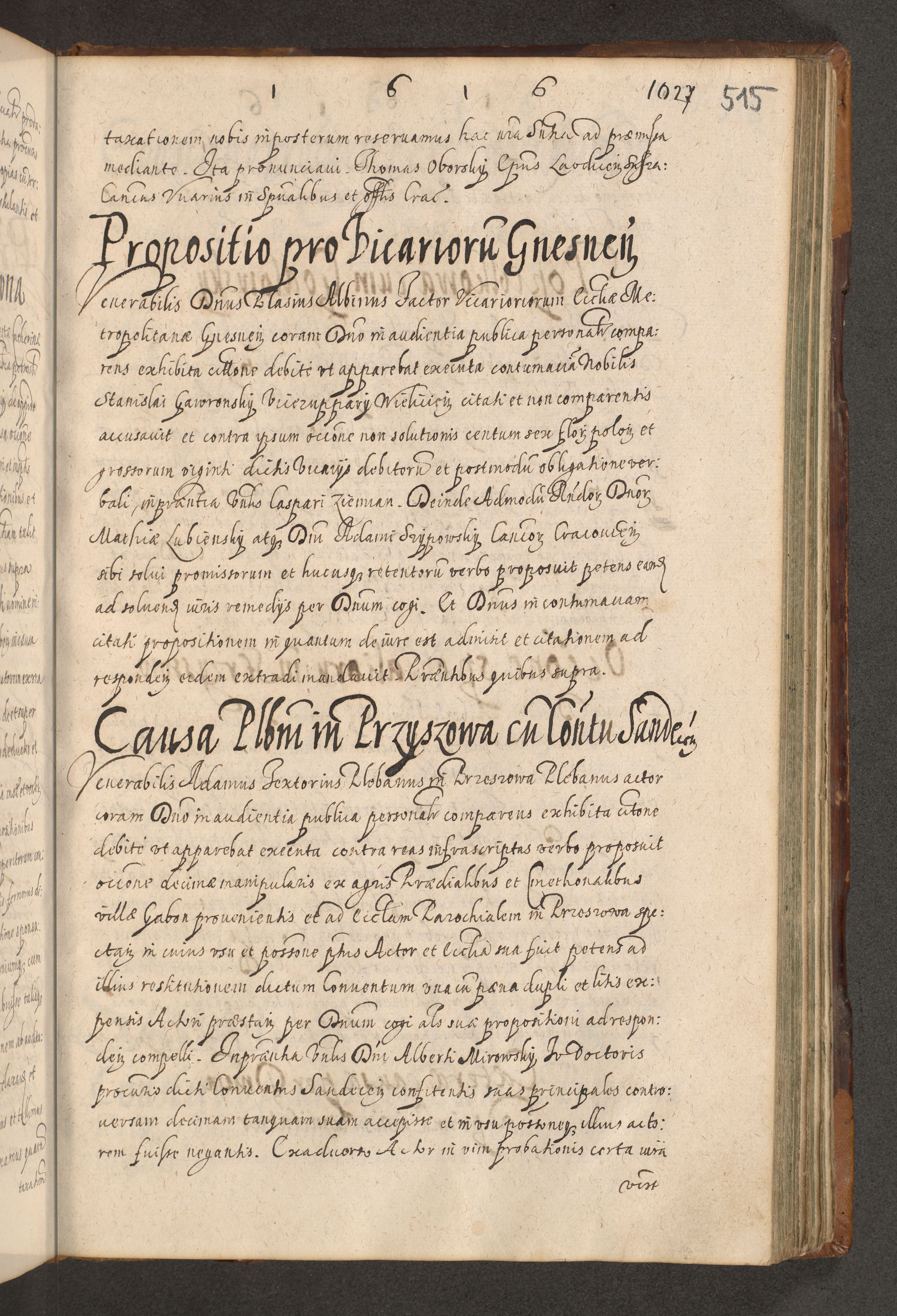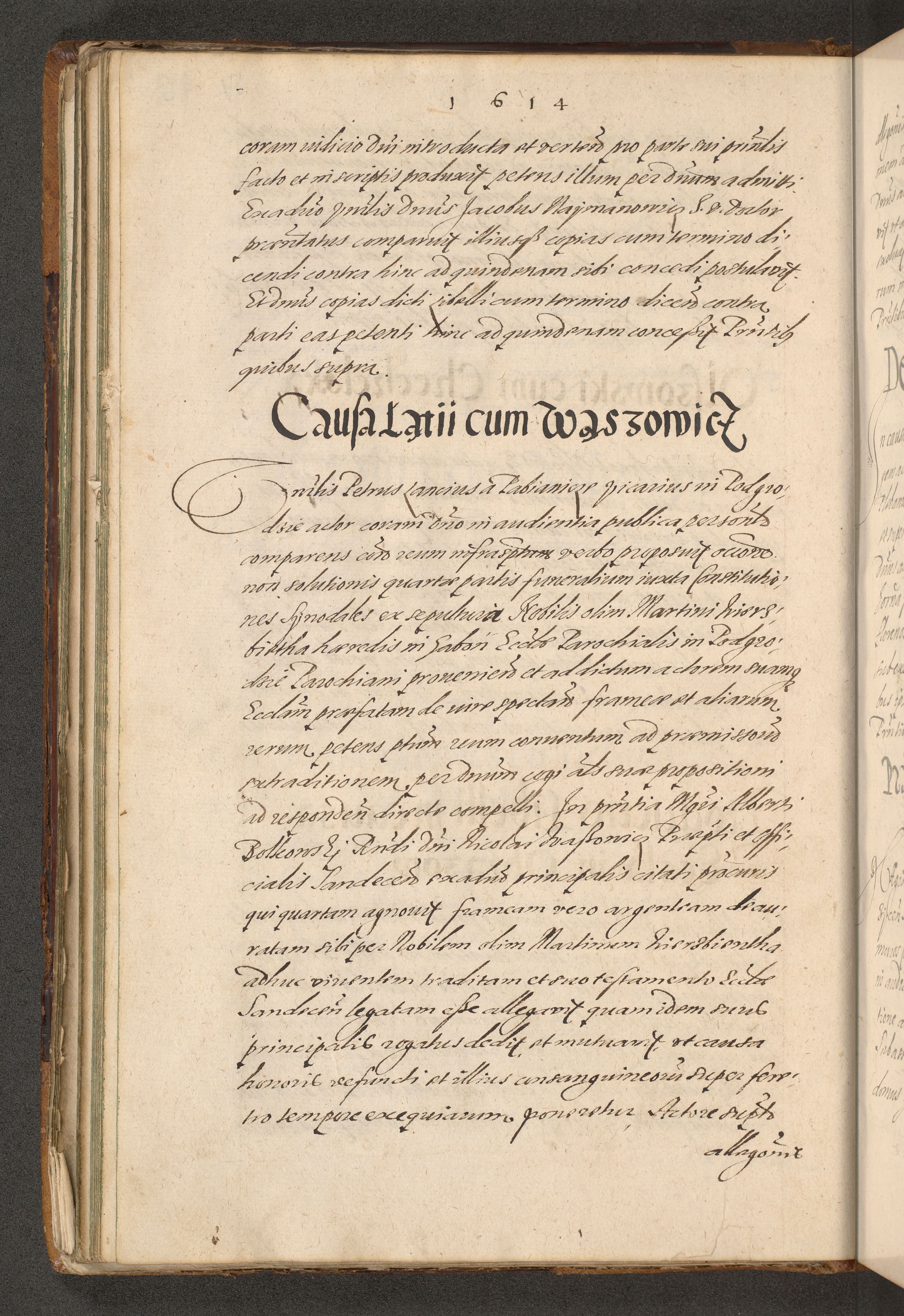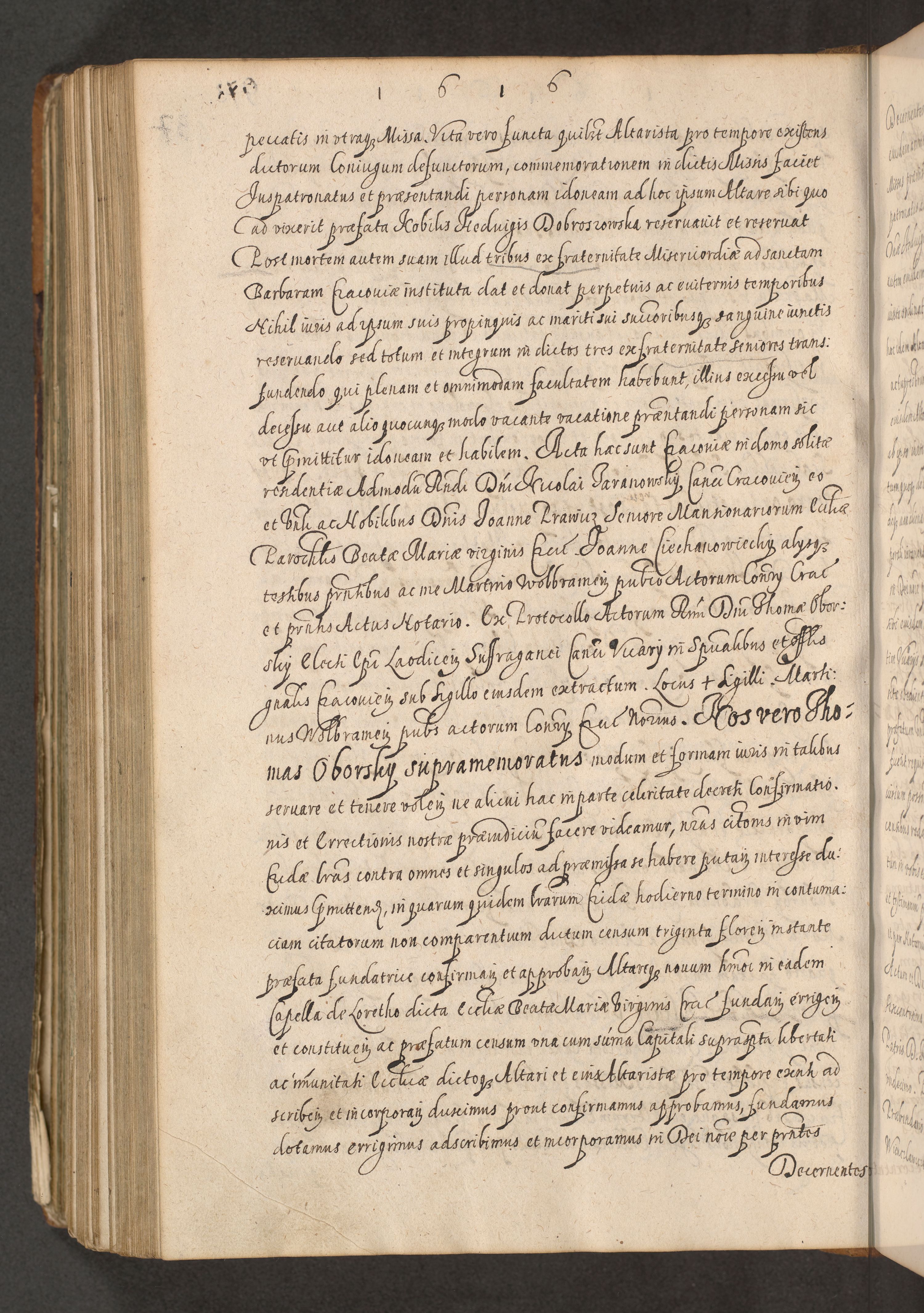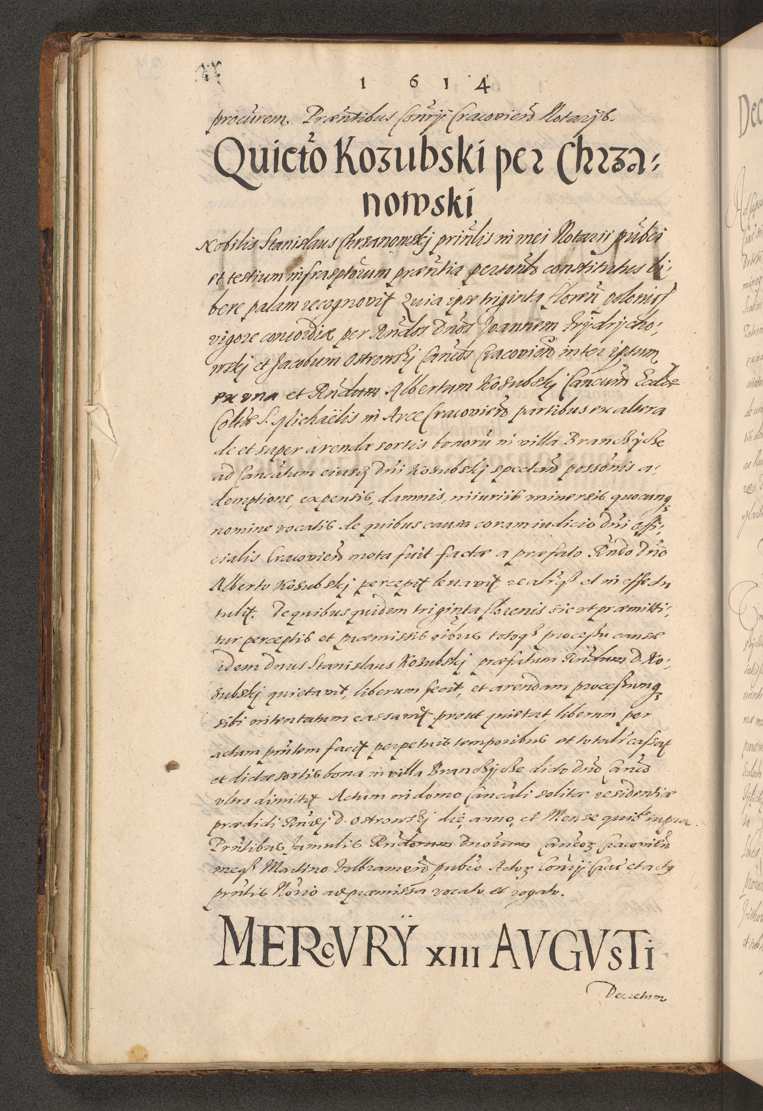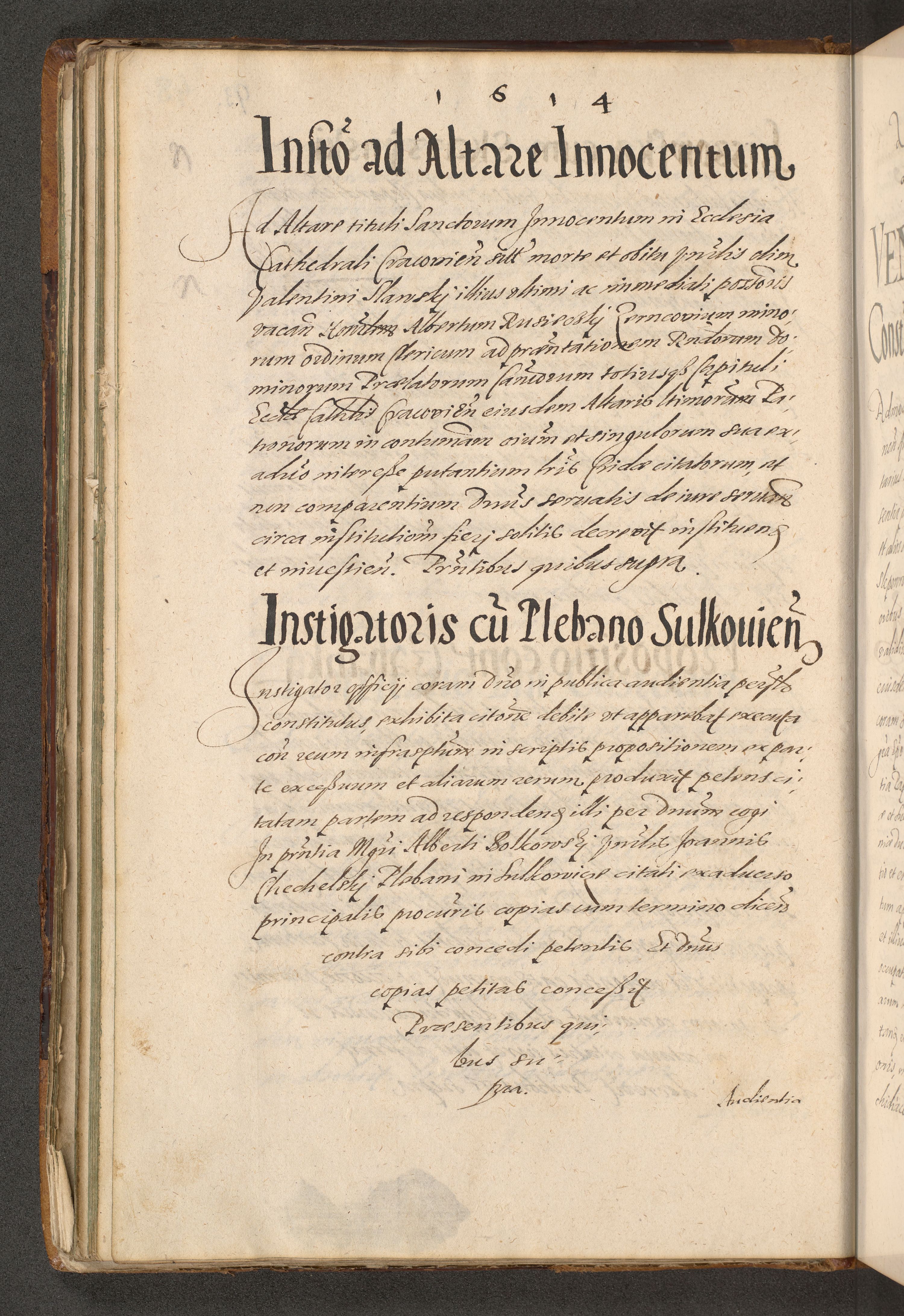 Illustrissimo et Reverendissimo in Christo Patre Domino Domino Petro Tylicki Dei et Apostolice Sedis Gratia Episcopo Cracoviensis Duce Severiensis Acta actorum causarum sententiarum tam interloquutoriarum quam definitivarum decretorum obligationum, quietationum, recognitionum, constitutionum procuratorum etc. etc. coram Admodum Reverendo Domino Thoma Oborski I. V. Doctore Canonico Vicario in Spiritualibus et Officiali generali Cracoviensis in anno Domini Millesimo Sexcentessimo Decimoquarto Cuius Indictio duodecima Pontificus SS. D. N. D. Pauli Divina providentia Papae quinti Anno decimo foeliciter incipiunt