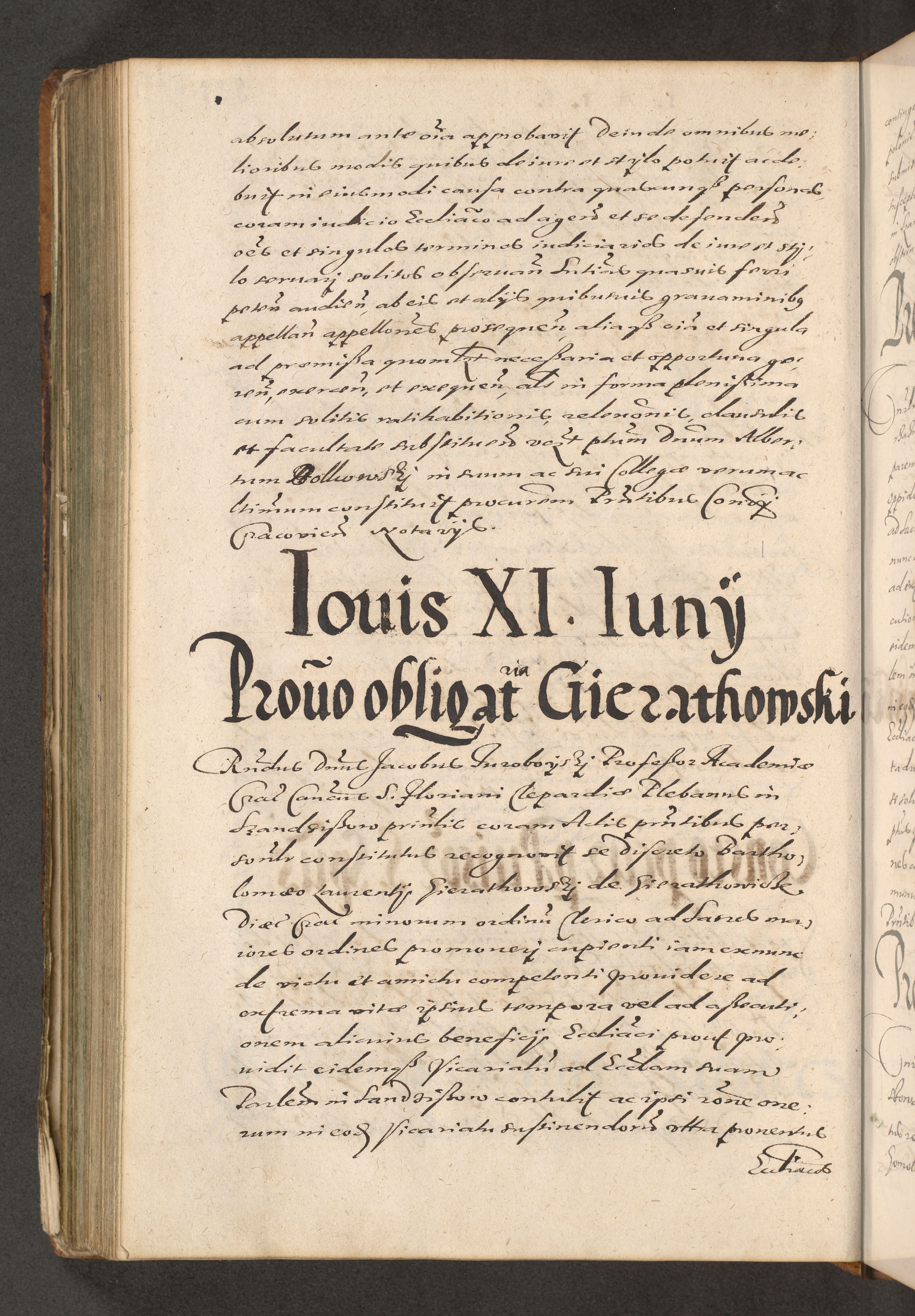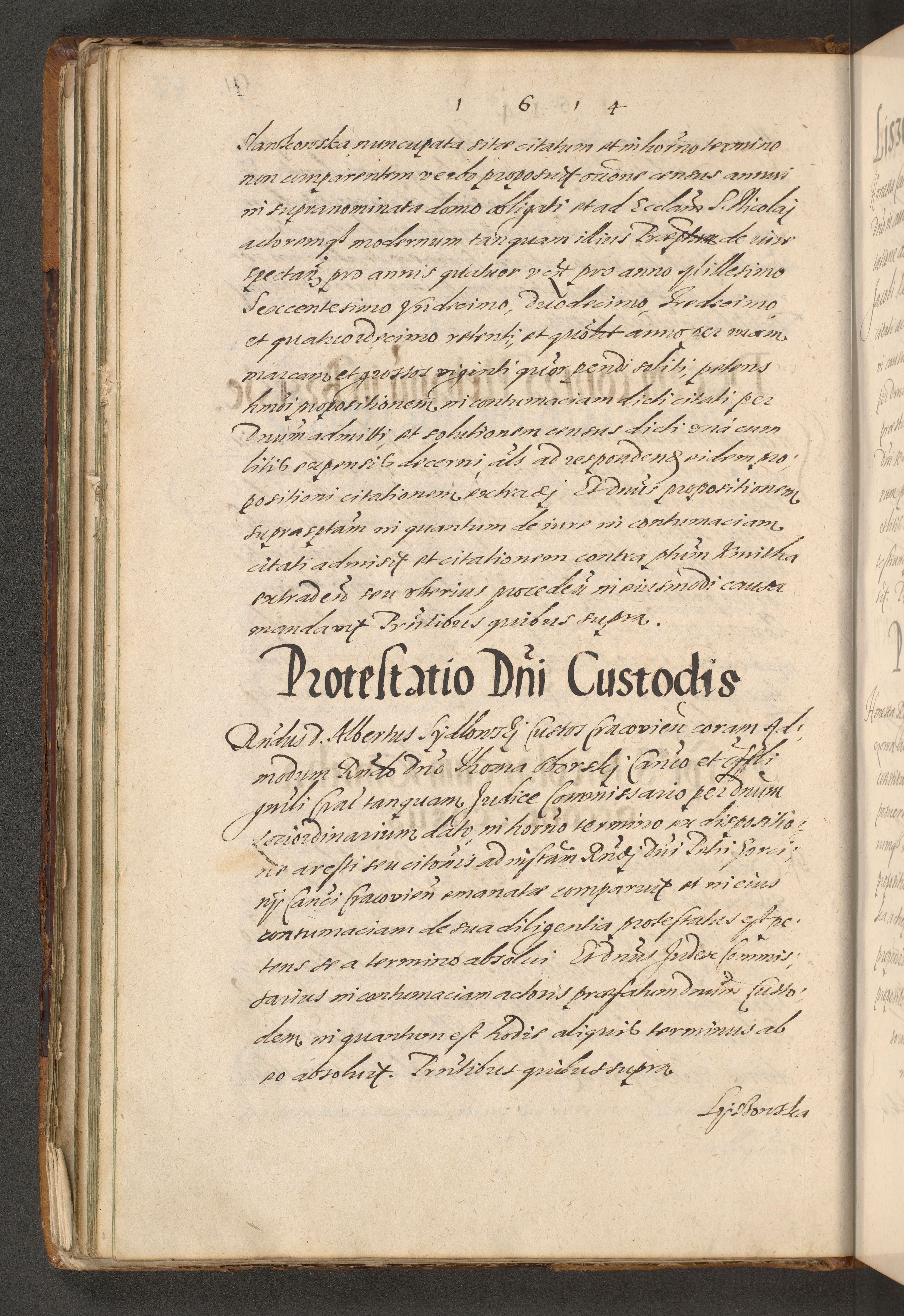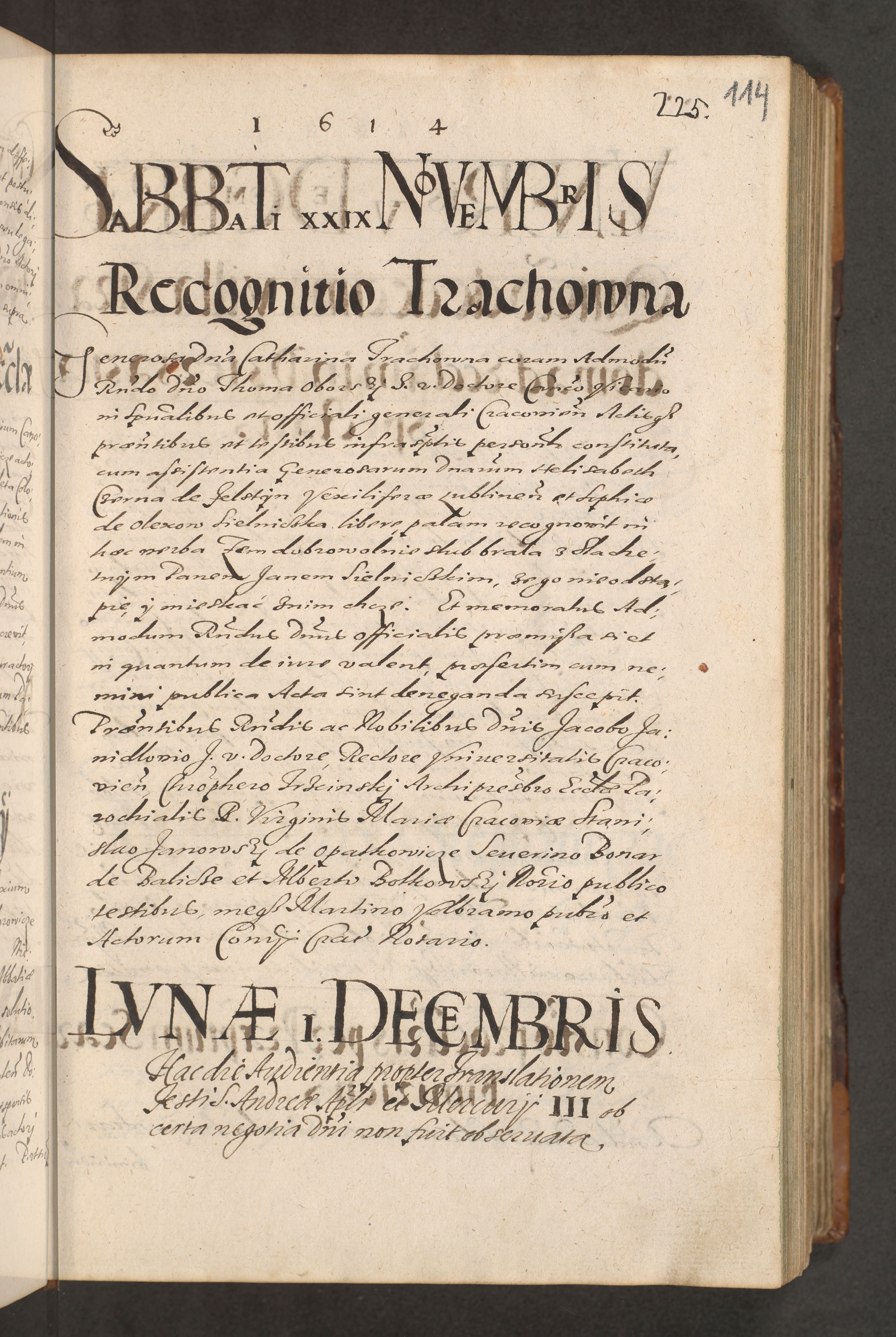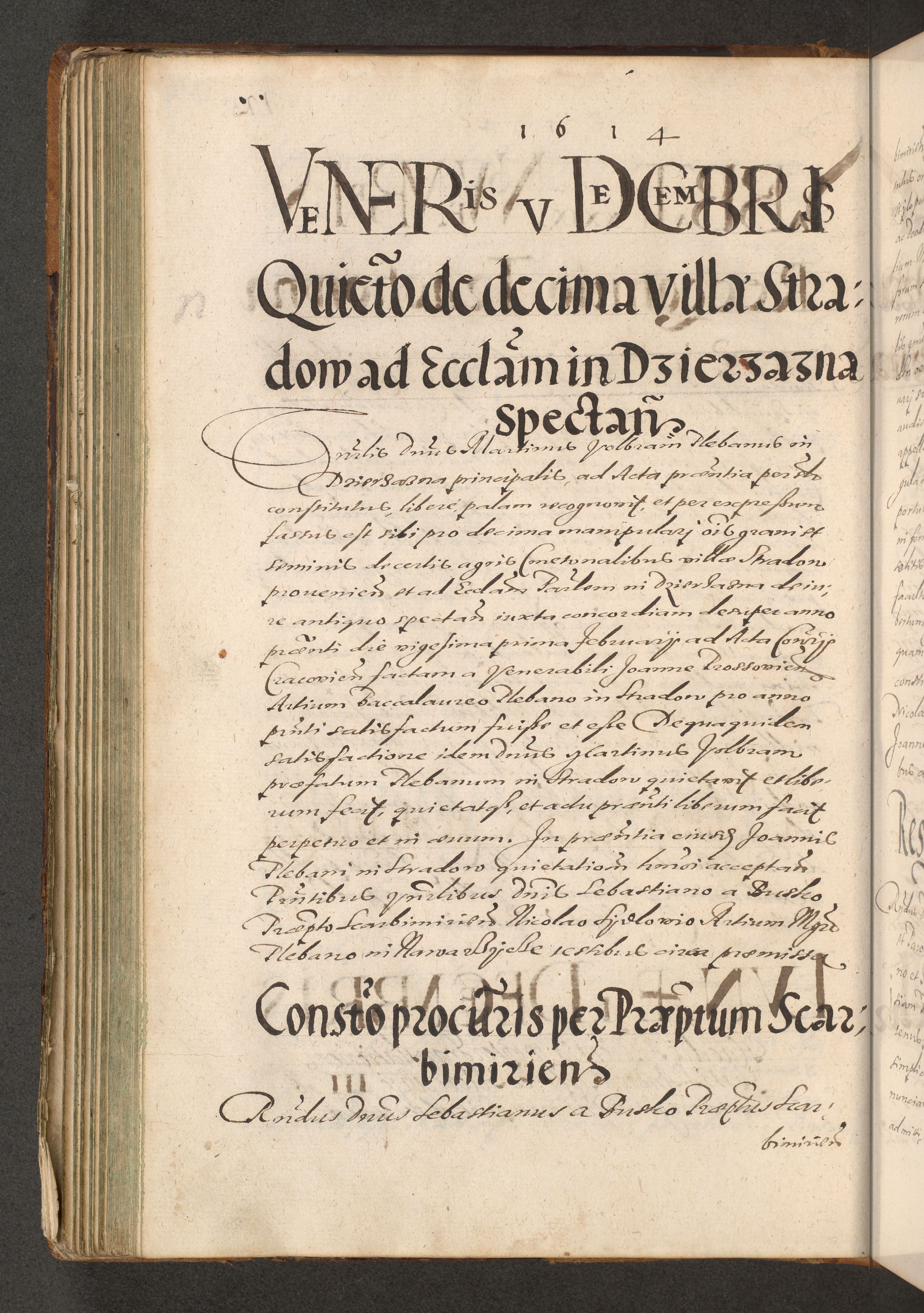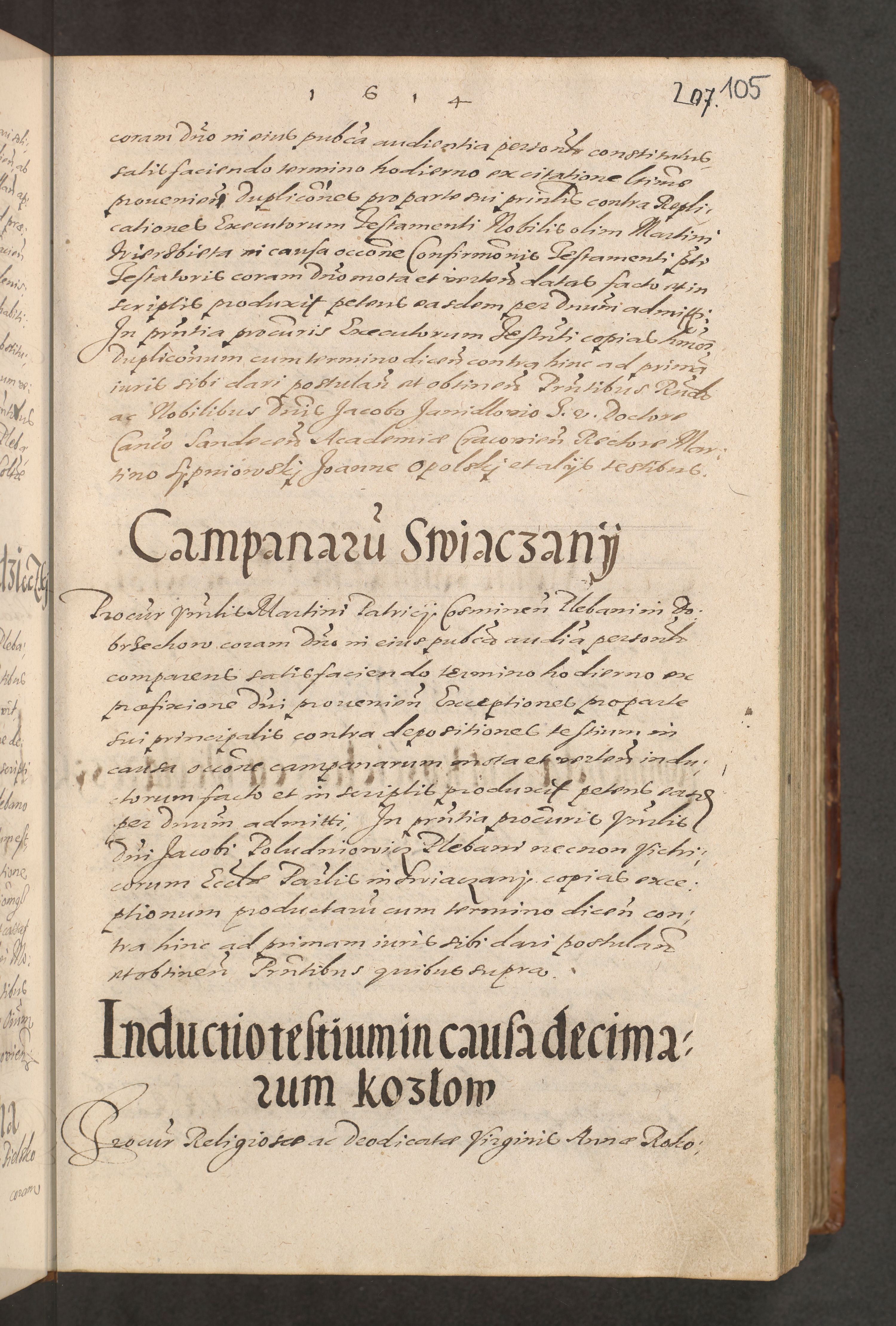 Illustrissimo et Reverendissimo in Christo Patre Domino Domino Petro Tylicki Dei et Apostolice Sedis Gratia Episcopo Cracoviensis Duce Severiensis Acta actorum causarum sententiarum tam interloquutoriarum quam definitivarum decretorum obligationum, quietationum, recognitionum, constitutionum procuratorum etc. etc. coram Admodum Reverendo Domino Thoma Oborski I. V. Doctore Canonico Vicario in Spiritualibus et Officiali generali Cracoviensis in anno Domini Millesimo Sexcentessimo Decimoquarto Cuius Indictio duodecima Pontificus SS. D. N. D. Pauli Divina providentia Papae quinti Anno decimo foeliciter incipiunt