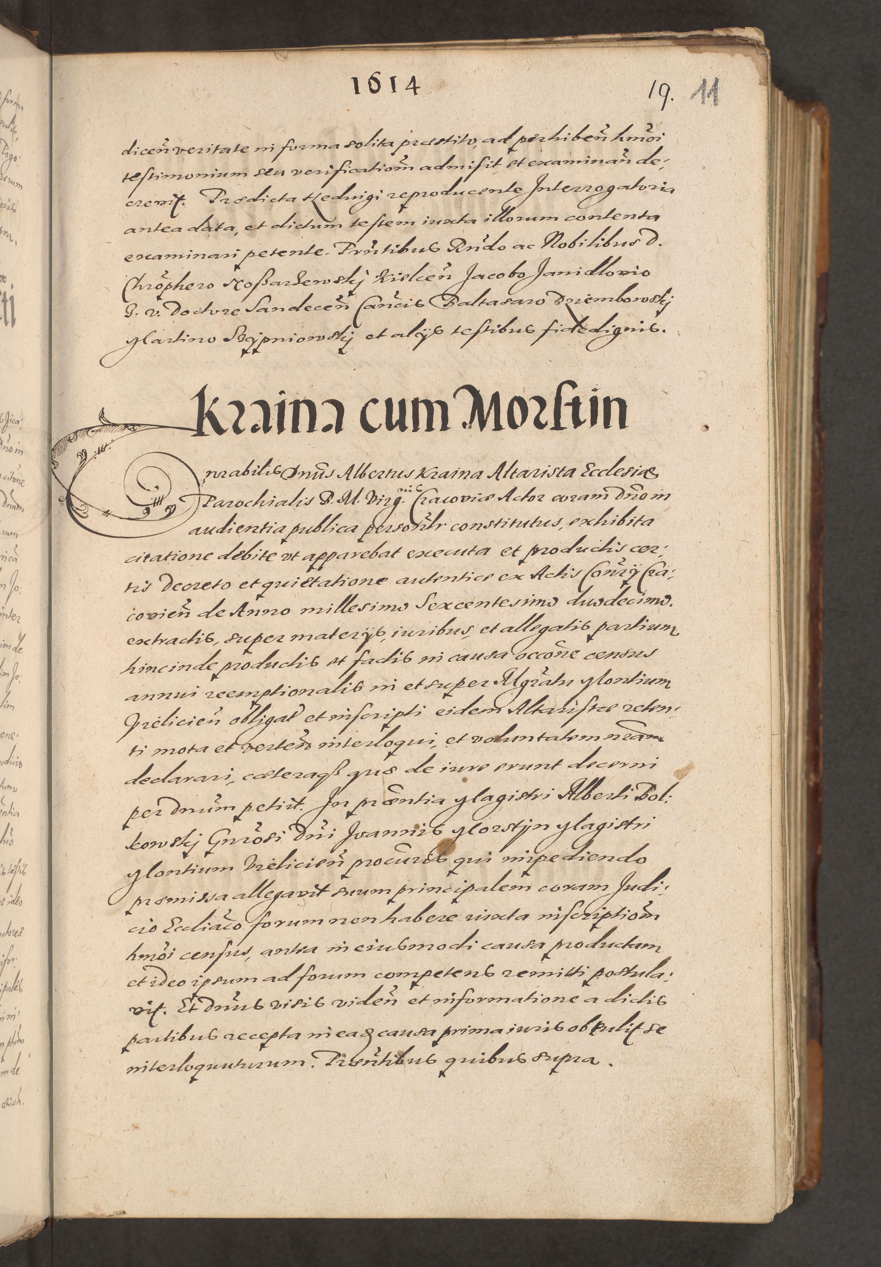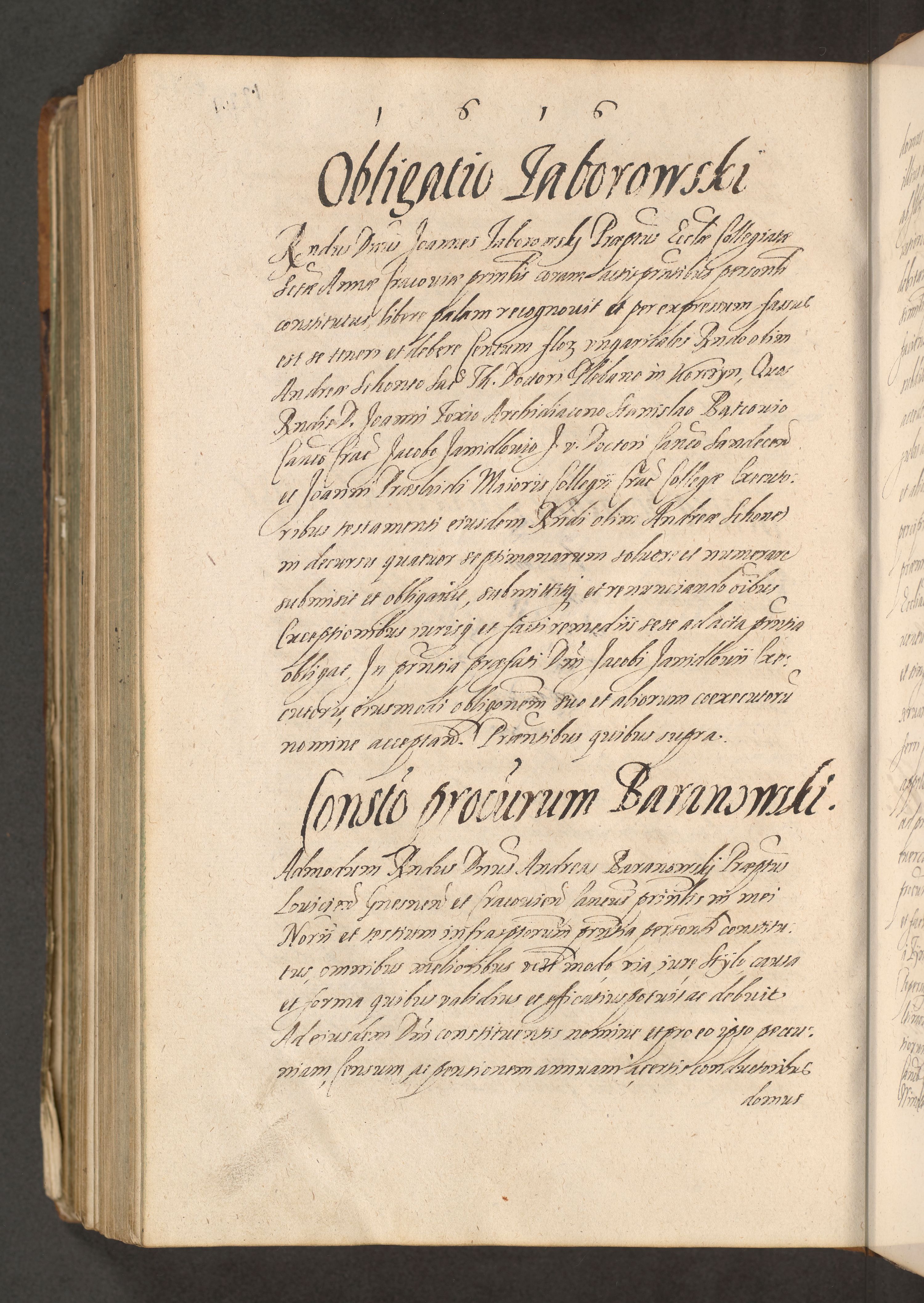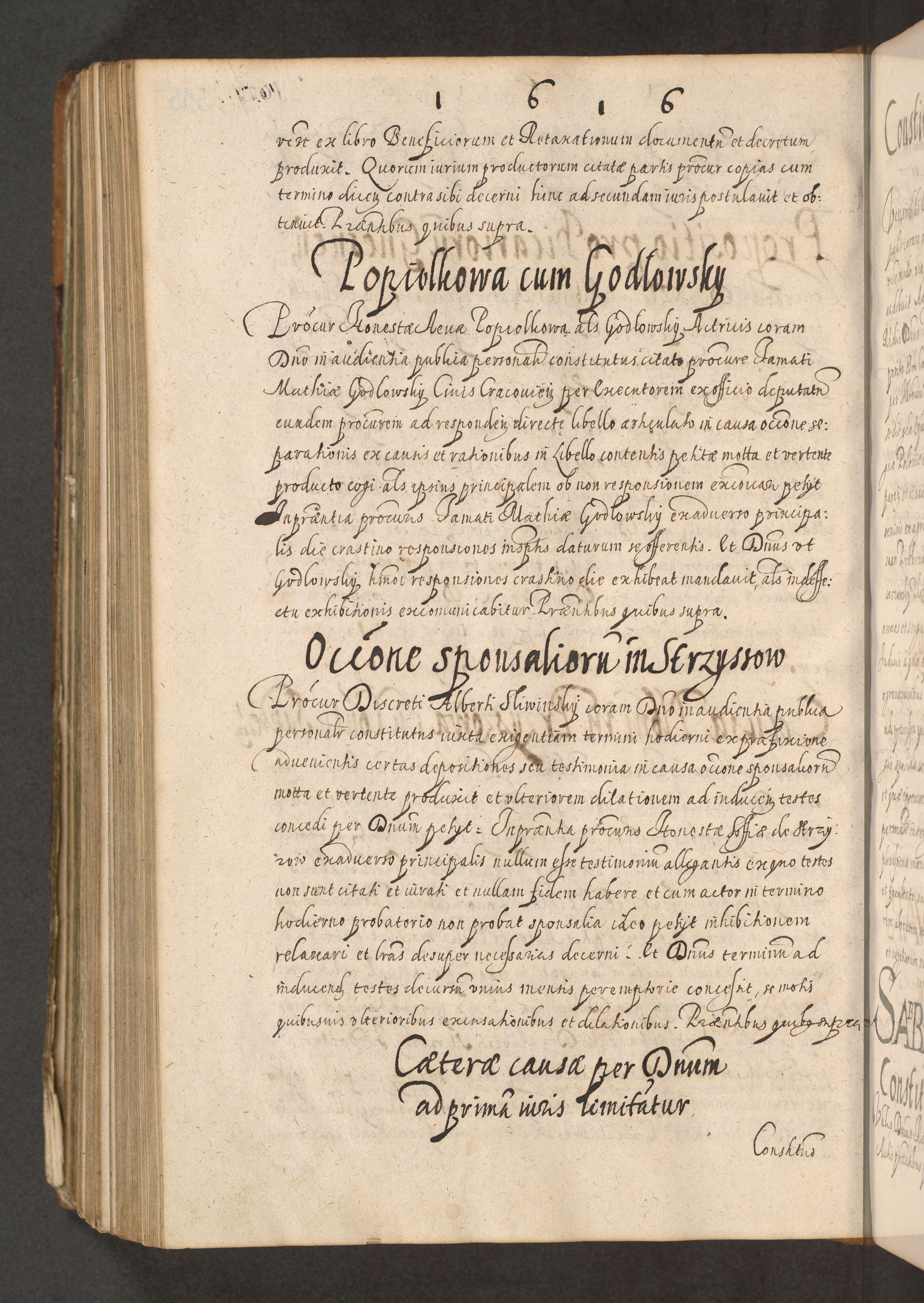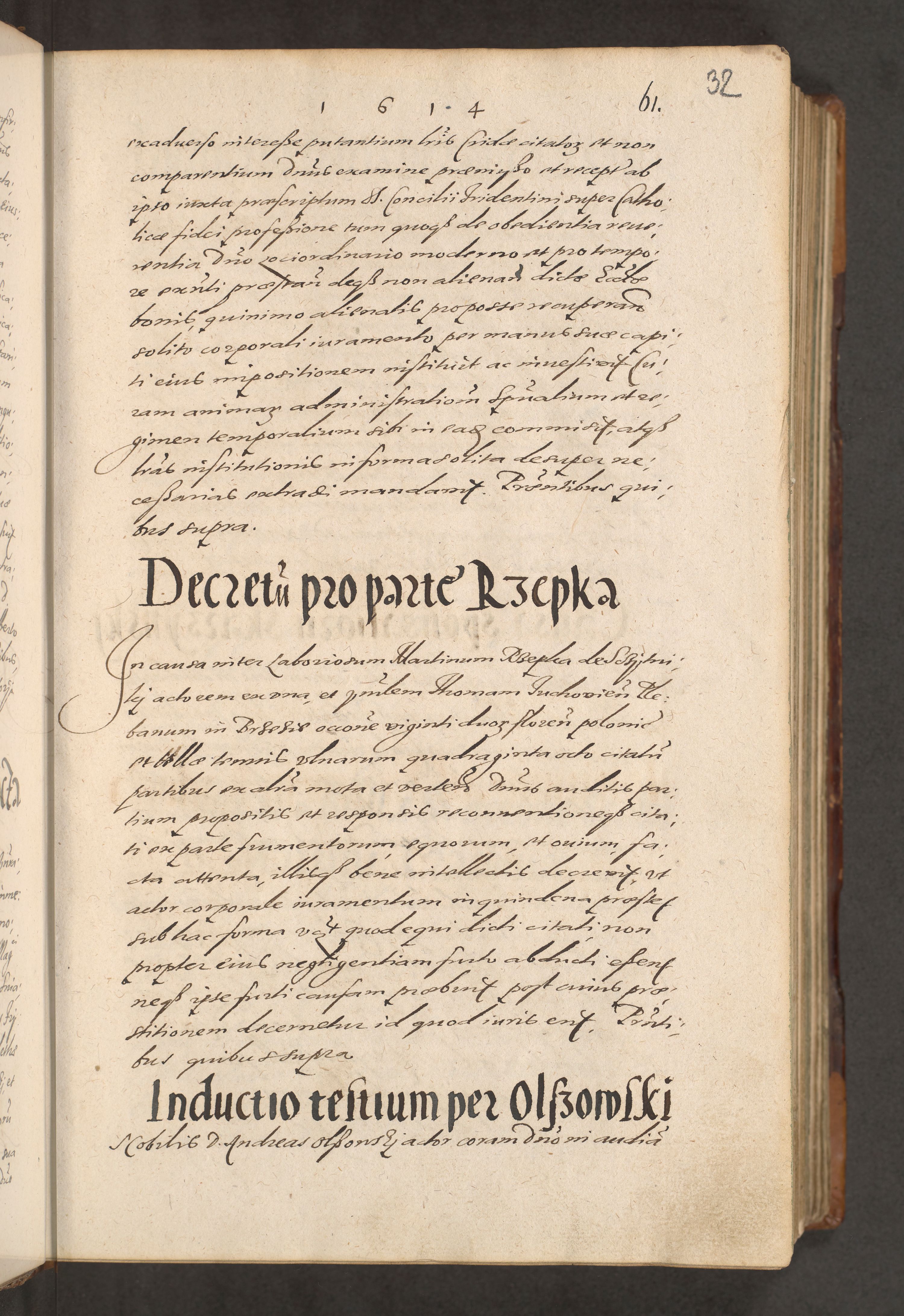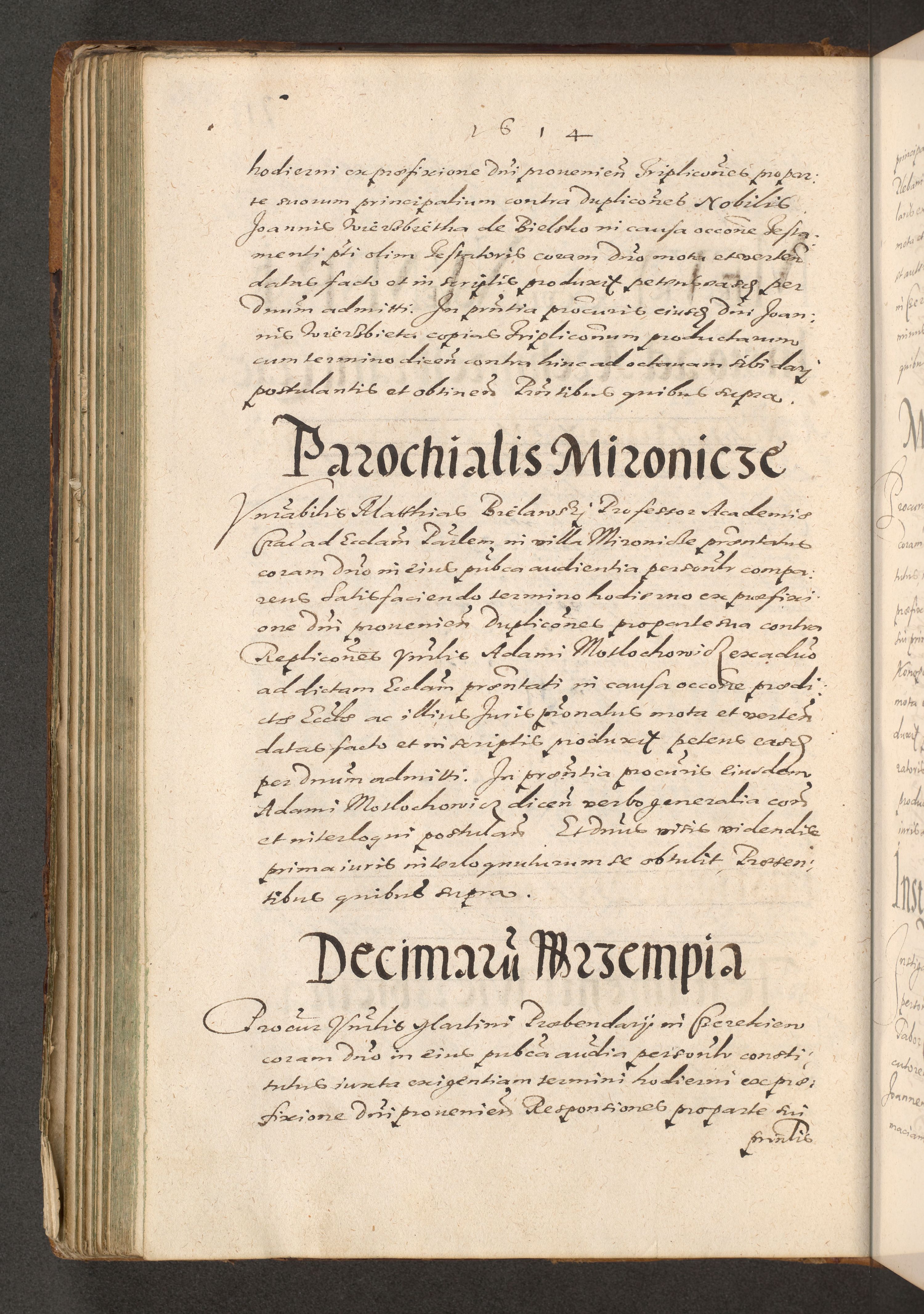Illustrissimo et Reverendissimo in Christo Patre Domino Domino Petro Tylicki Dei et Apostolice Sedis Gratia Episcopo Cracoviensis Duce Severiensis Acta actorum causarum sententiarum tam interloquutoriarum quam definitivarum decretorum obligationum, quietationum, recognitionum, constitutionum procuratorum etc. etc. coram Admodum Reverendo Domino Thoma Oborski I. V. Doctore Canonico Vicario in Spiritualibus et Officiali generali Cracoviensis in anno Domini Millesimo Sexcentessimo Decimoquarto Cuius Indictio duodecima Pontificus SS. D. N. D. Pauli Divina providentia Papae quinti Anno decimo foeliciter incipiunt