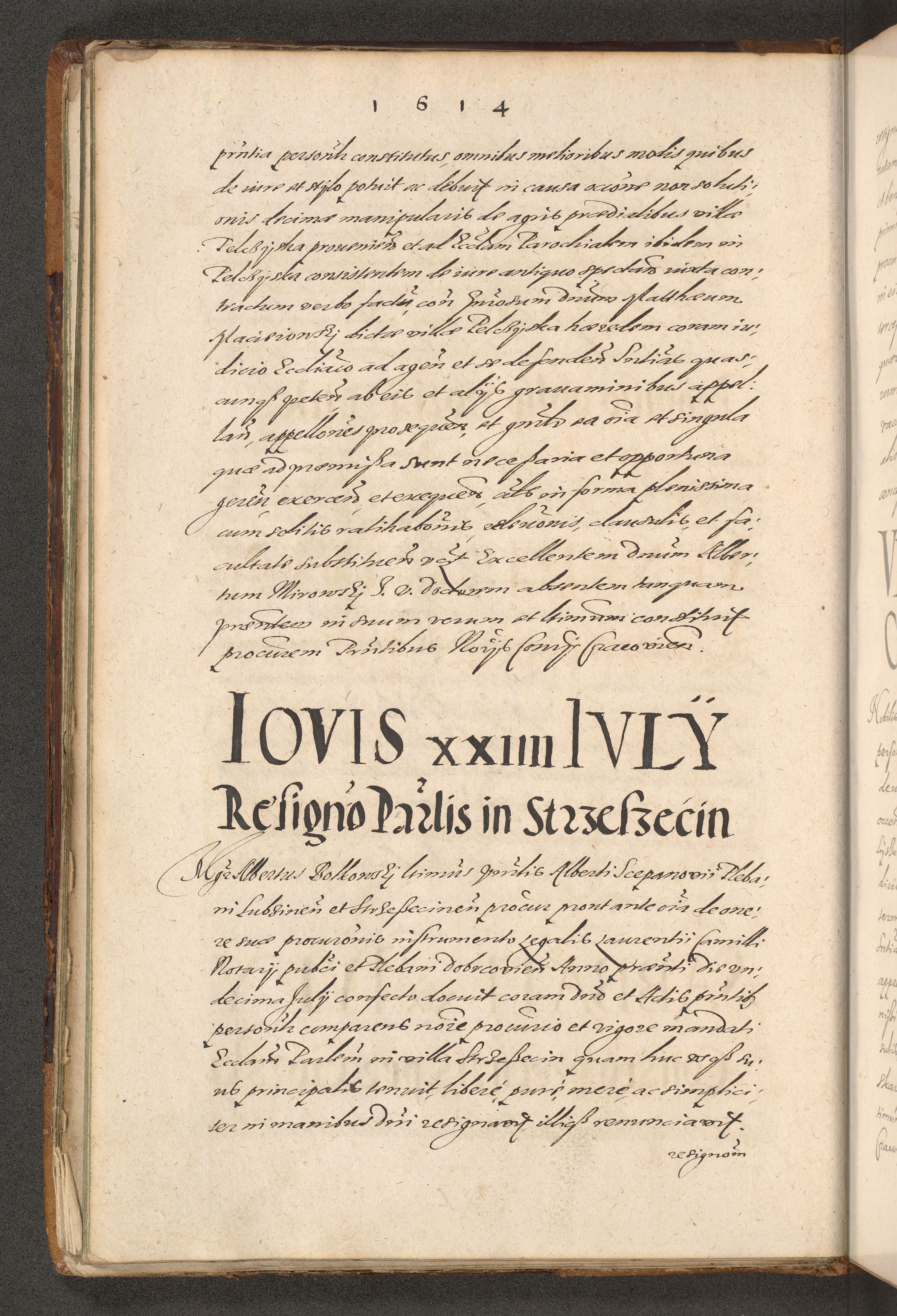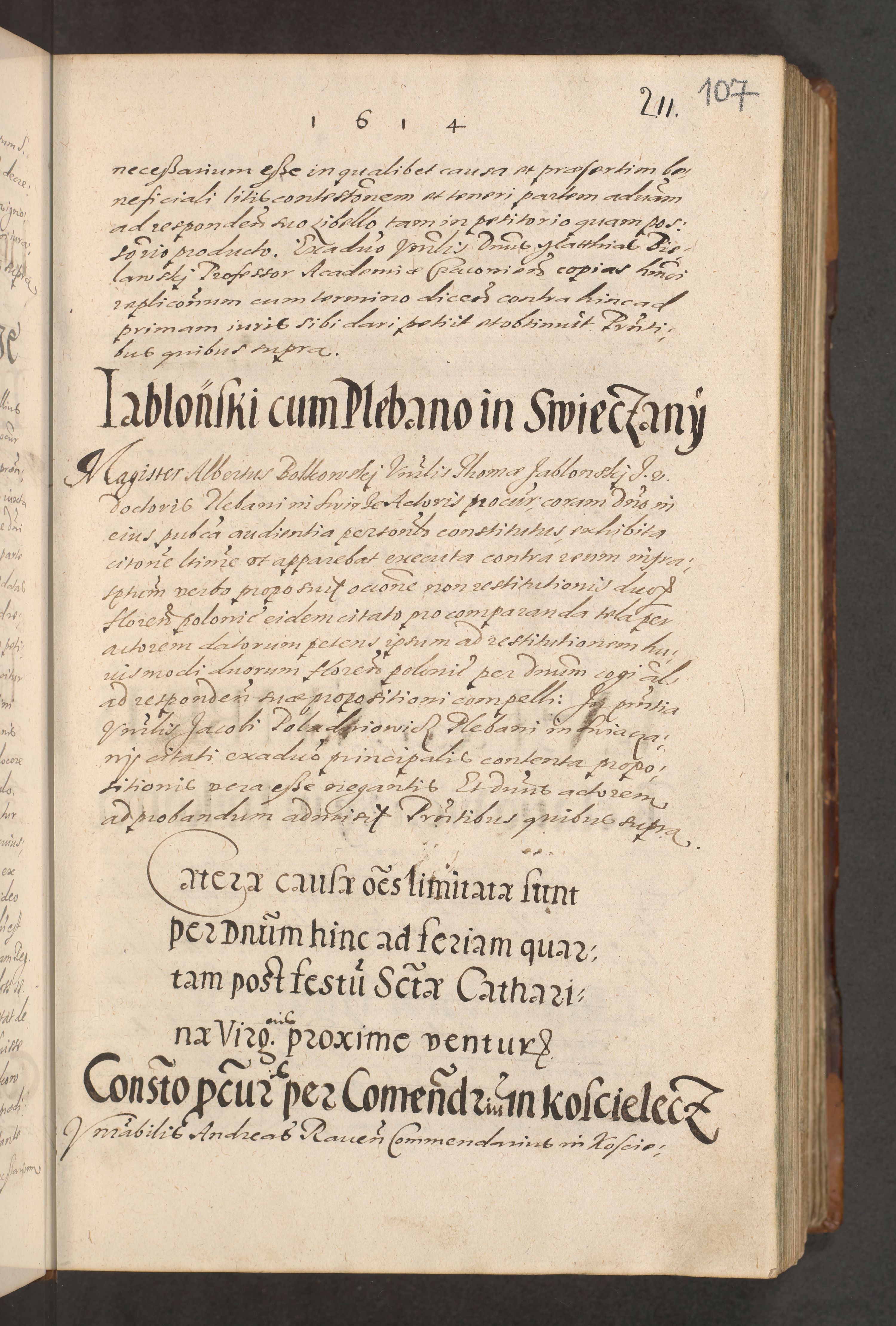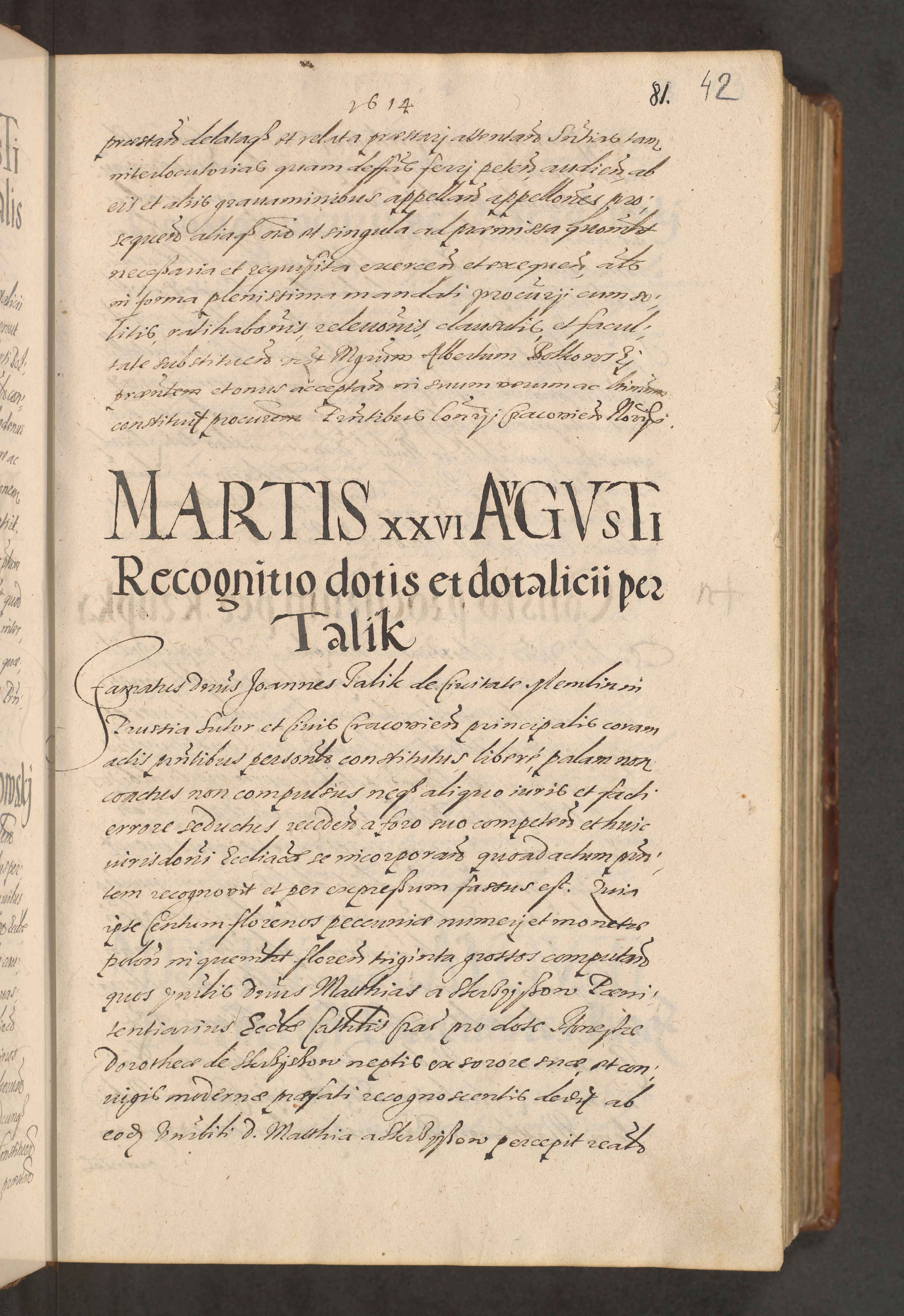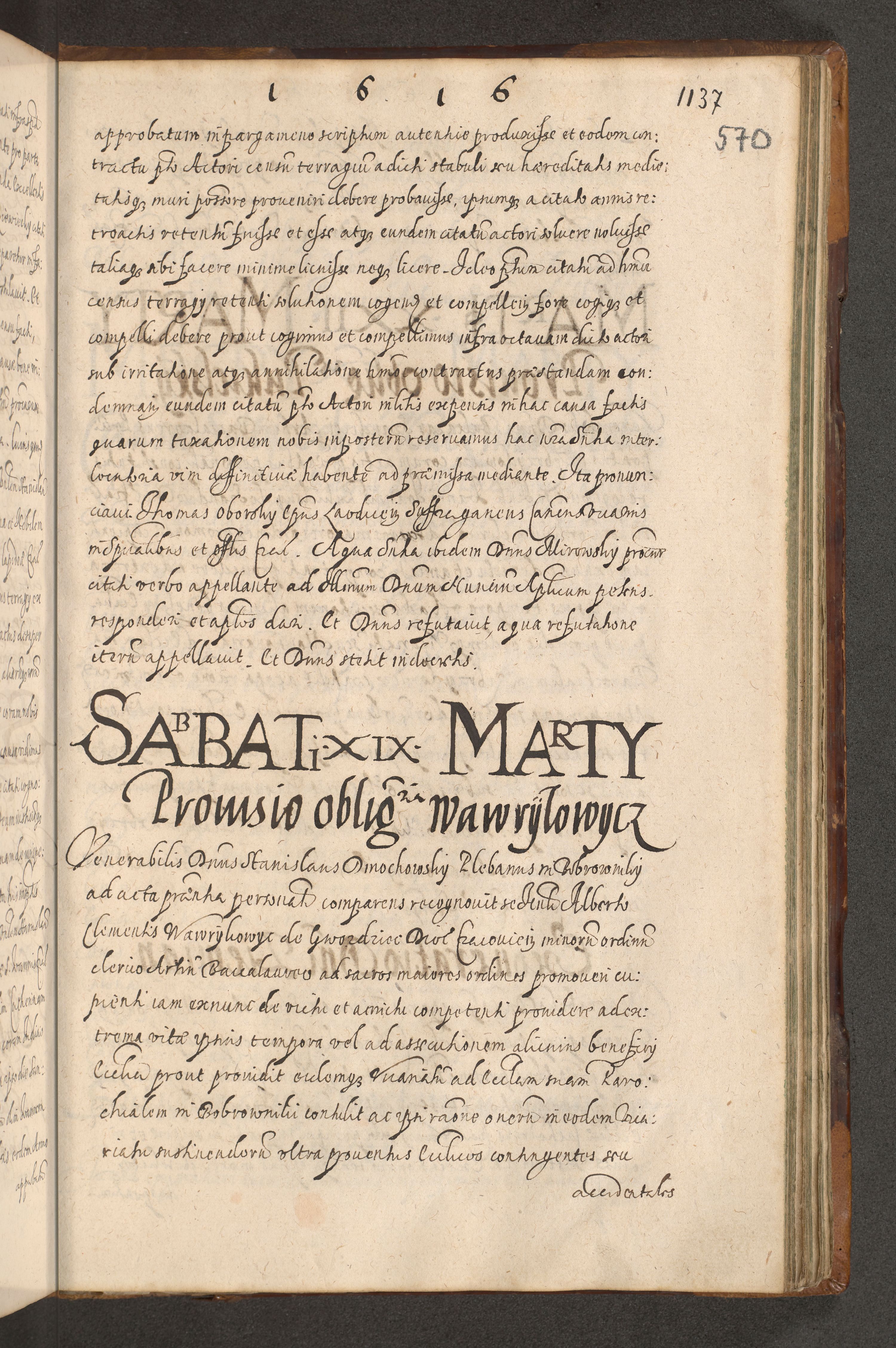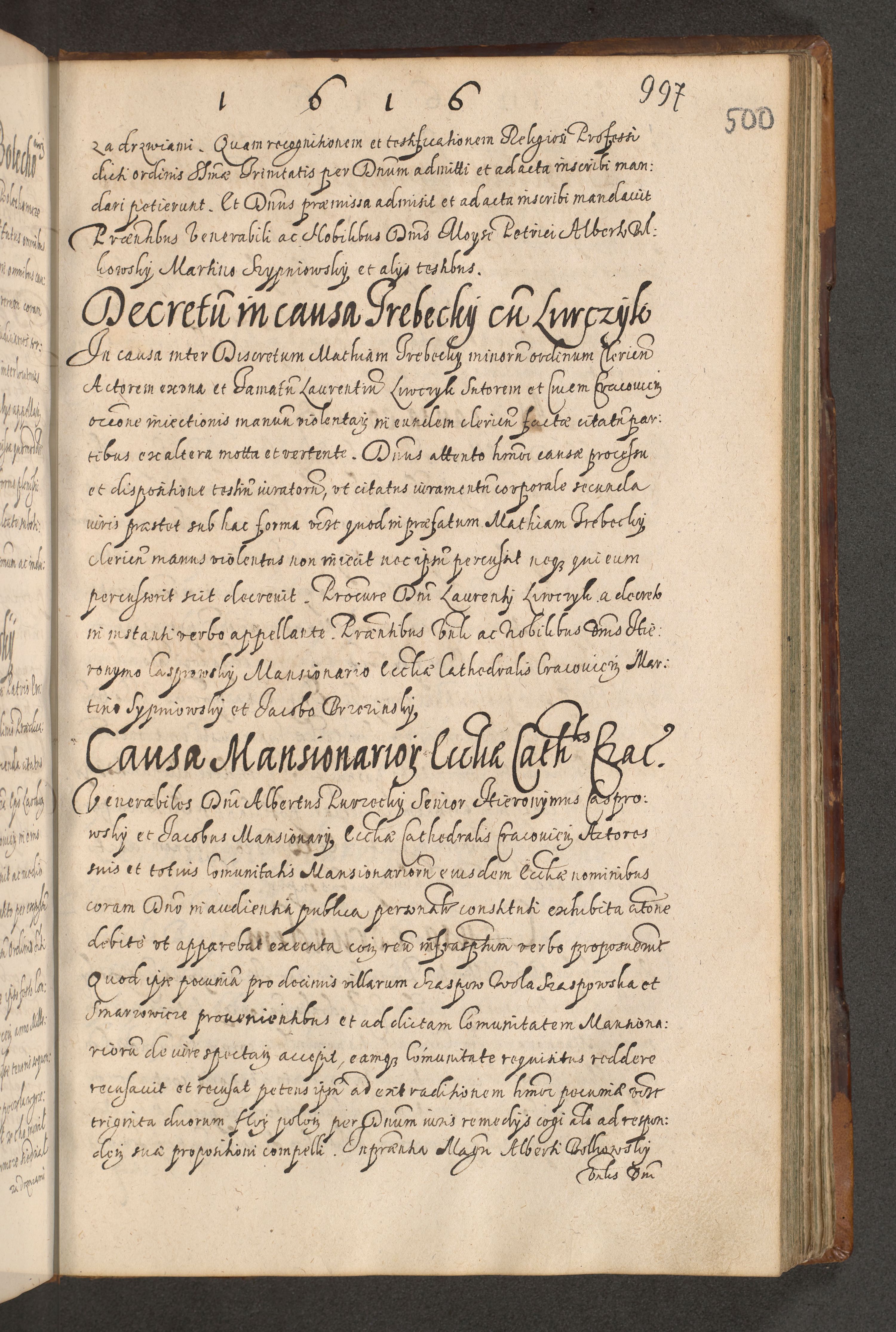 Illustrissimo et Reverendissimo in Christo Patre Domino Domino Petro Tylicki Dei et Apostolice Sedis Gratia Episcopo Cracoviensis Duce Severiensis Acta actorum causarum sententiarum tam interloquutoriarum quam definitivarum decretorum obligationum, quietationum, recognitionum, constitutionum procuratorum etc. etc. coram Admodum Reverendo Domino Thoma Oborski I. V. Doctore Canonico Vicario in Spiritualibus et Officiali generali Cracoviensis in anno Domini Millesimo Sexcentessimo Decimoquarto Cuius Indictio duodecima Pontificus SS. D. N. D. Pauli Divina providentia Papae quinti Anno decimo foeliciter incipiunt