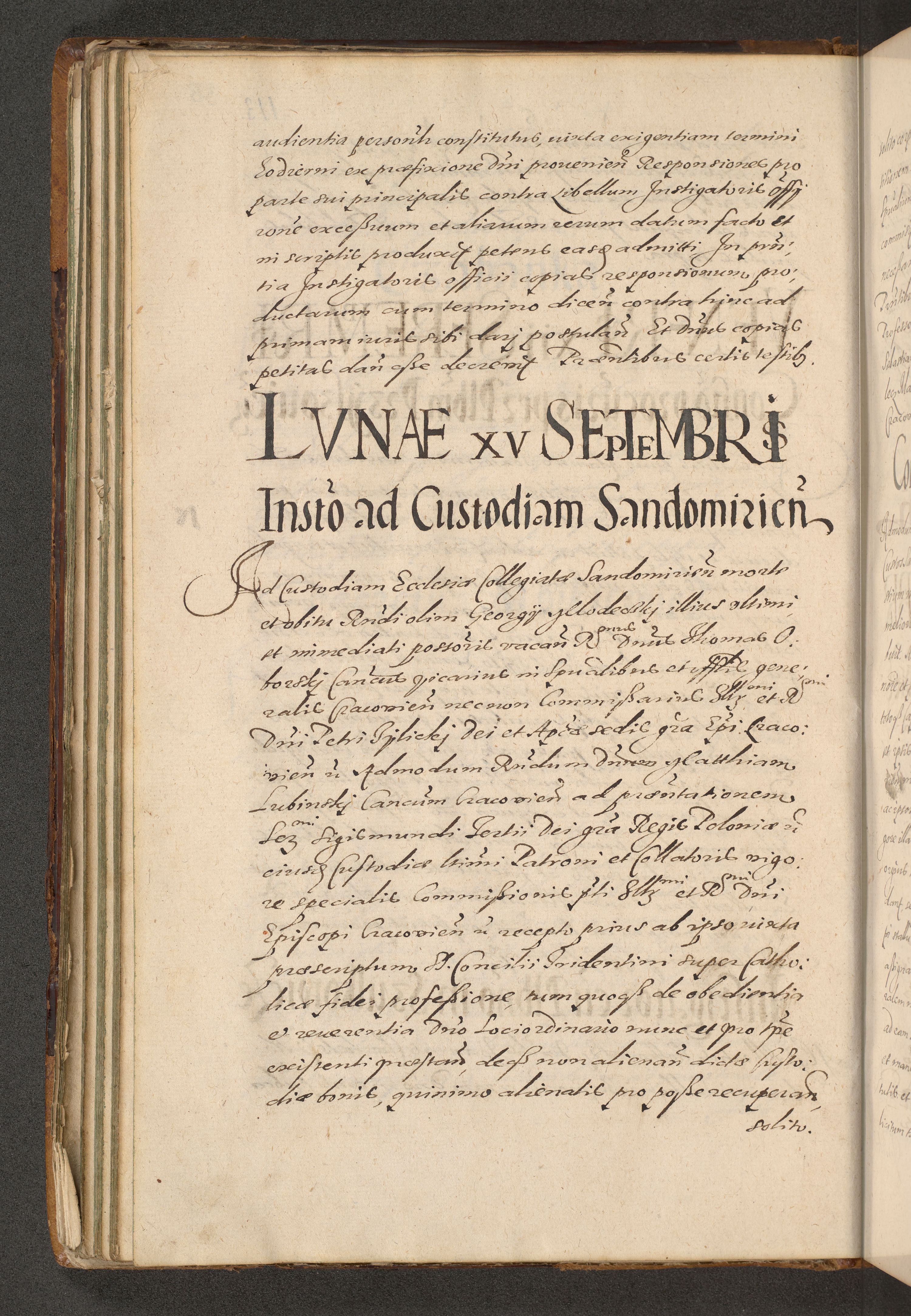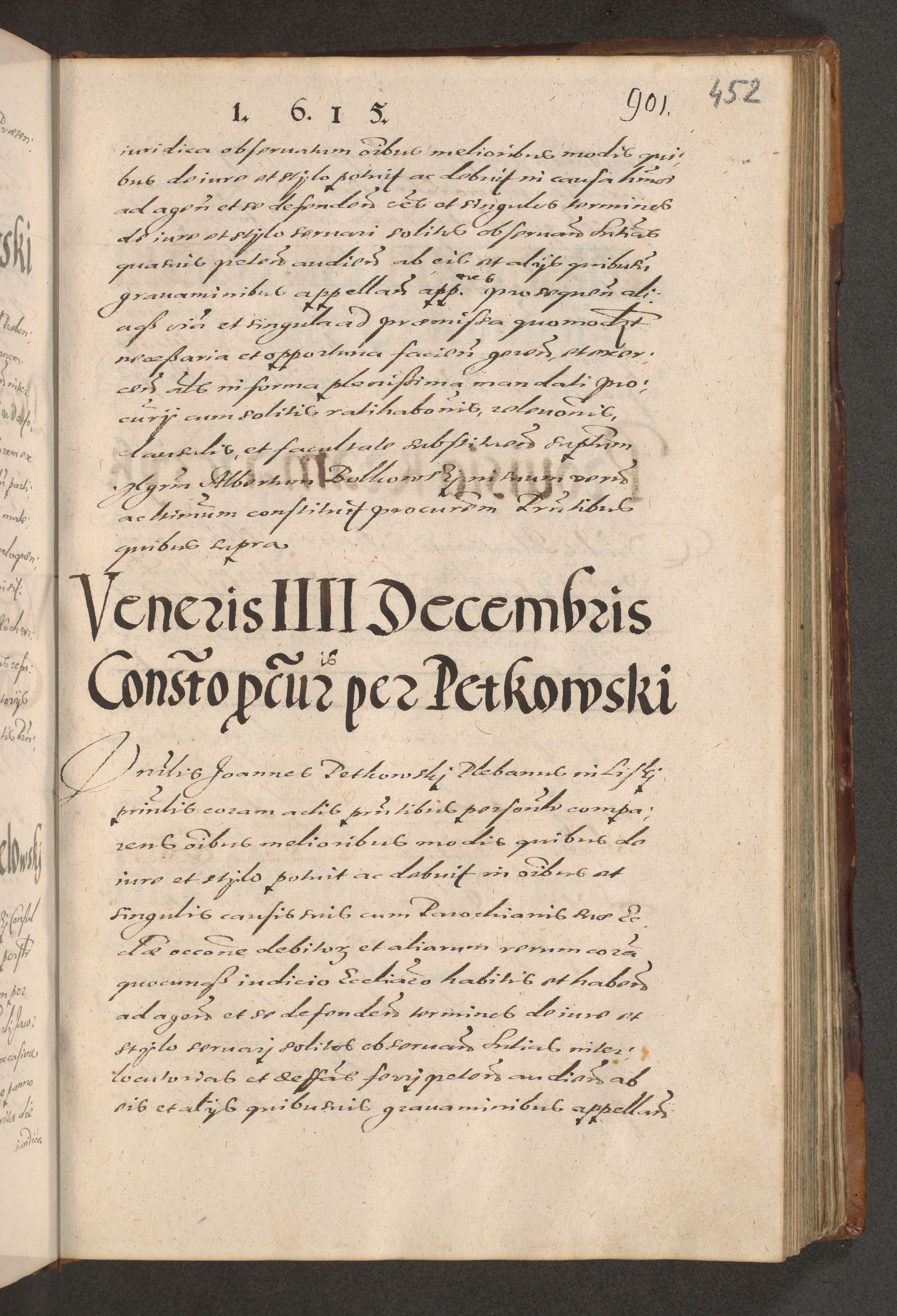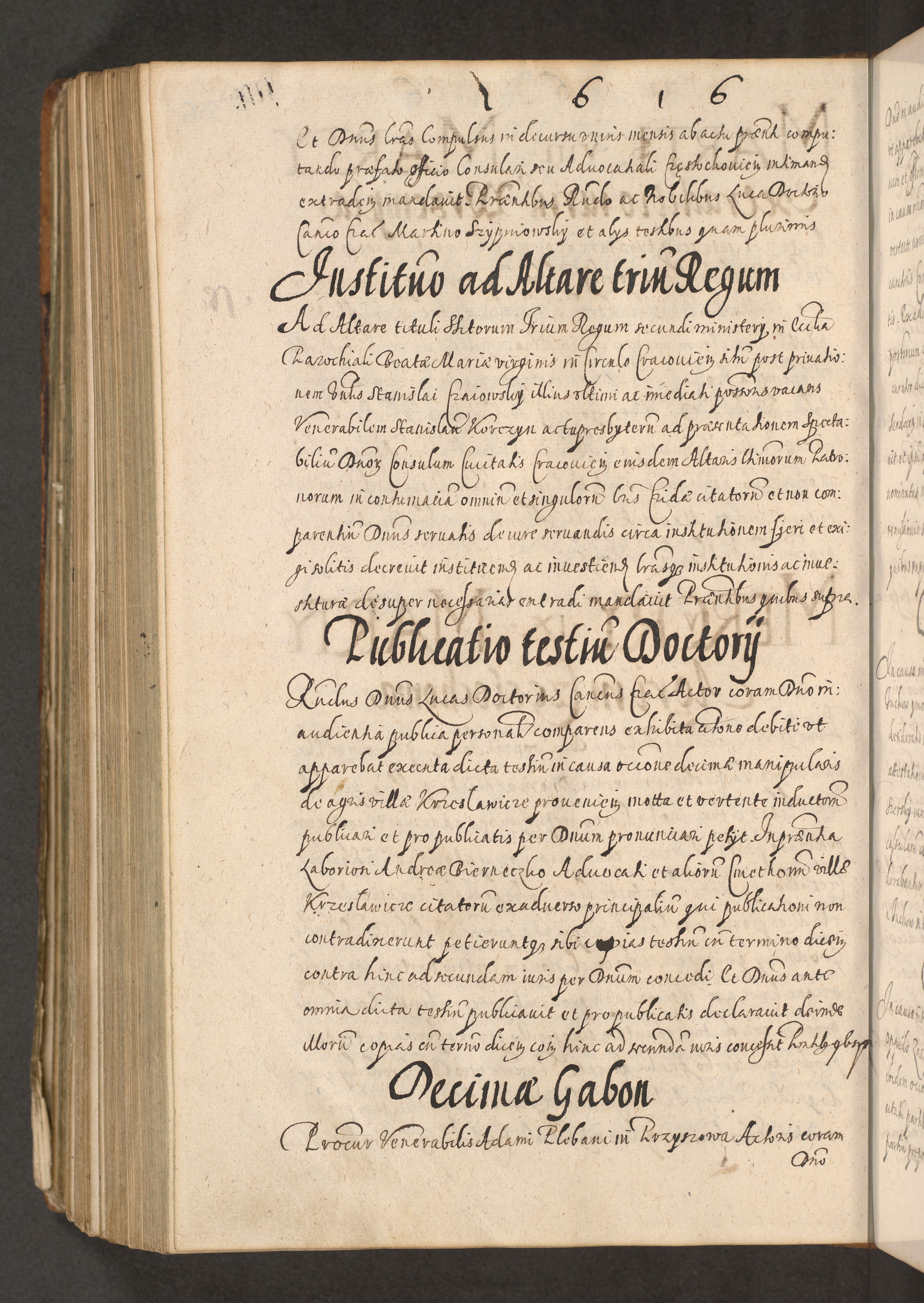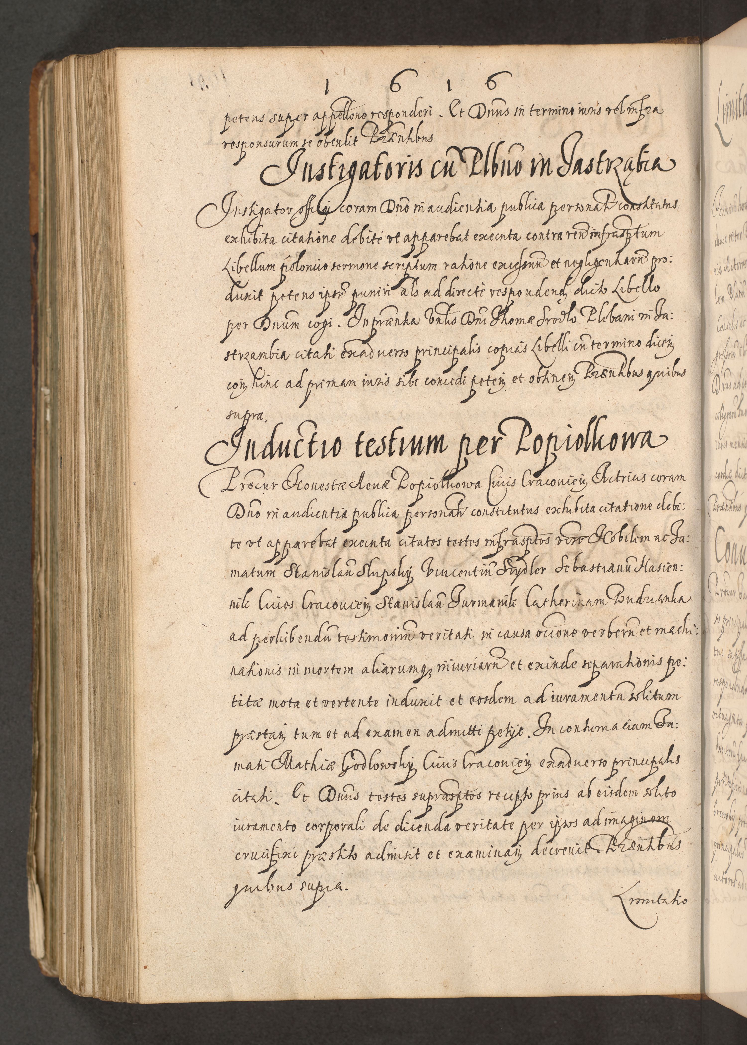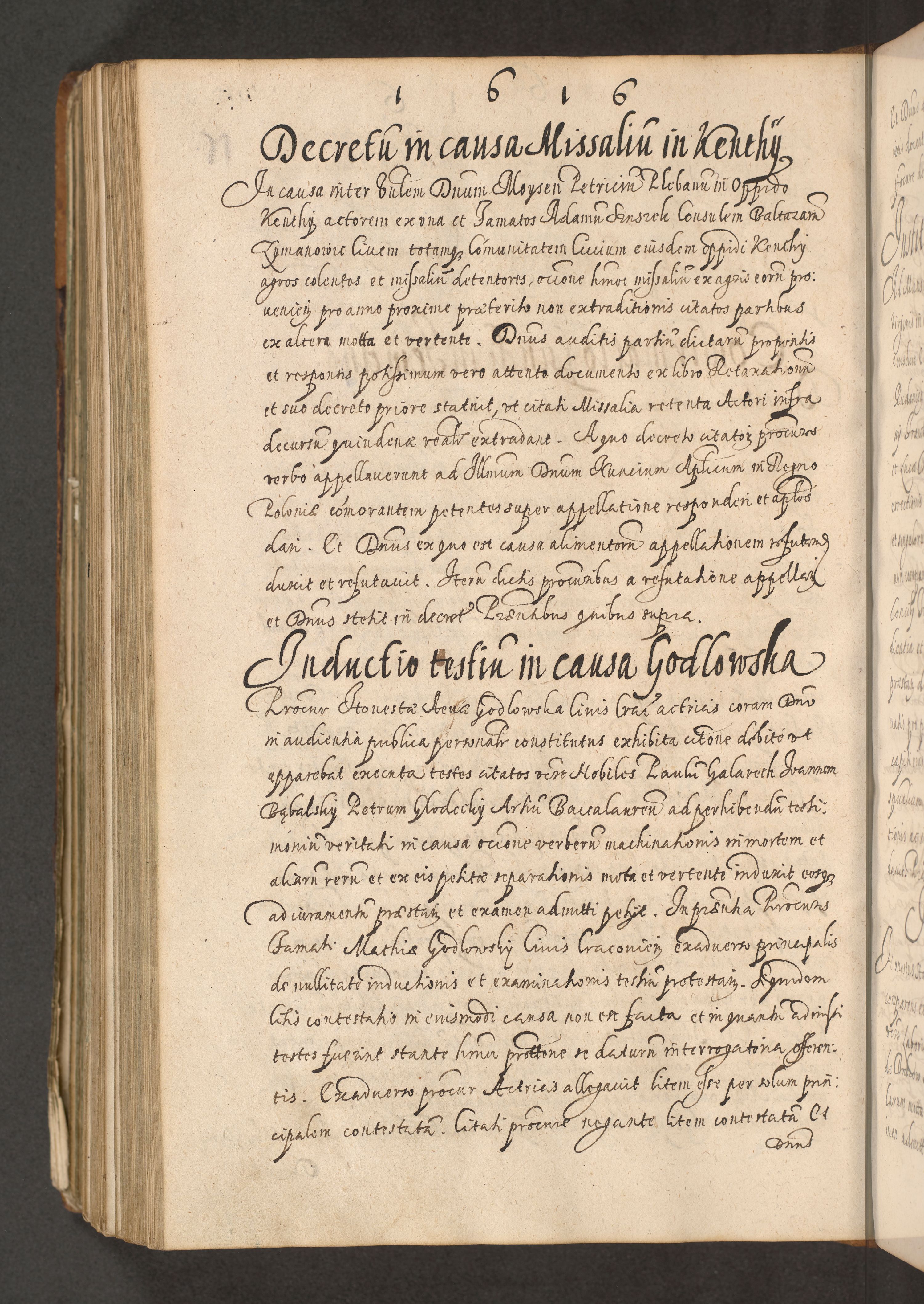 Illustrissimo et Reverendissimo in Christo Patre Domino Domino Petro Tylicki Dei et Apostolice Sedis Gratia Episcopo Cracoviensis Duce Severiensis Acta actorum causarum sententiarum tam interloquutoriarum quam definitivarum decretorum obligationum, quietationum, recognitionum, constitutionum procuratorum etc. etc. coram Admodum Reverendo Domino Thoma Oborski I. V. Doctore Canonico Vicario in Spiritualibus et Officiali generali Cracoviensis in anno Domini Millesimo Sexcentessimo Decimoquarto Cuius Indictio duodecima Pontificus SS. D. N. D. Pauli Divina providentia Papae quinti Anno decimo foeliciter incipiunt