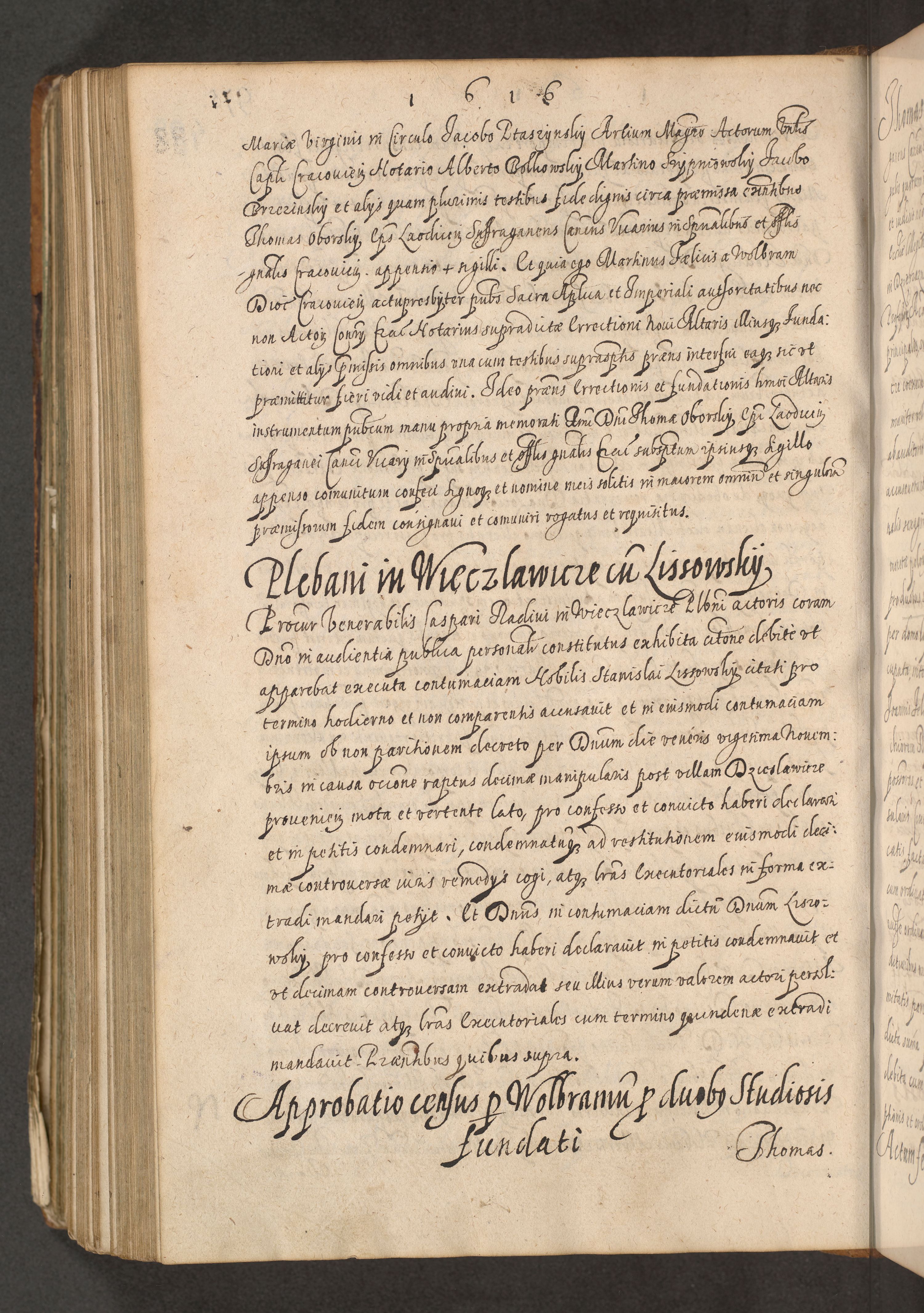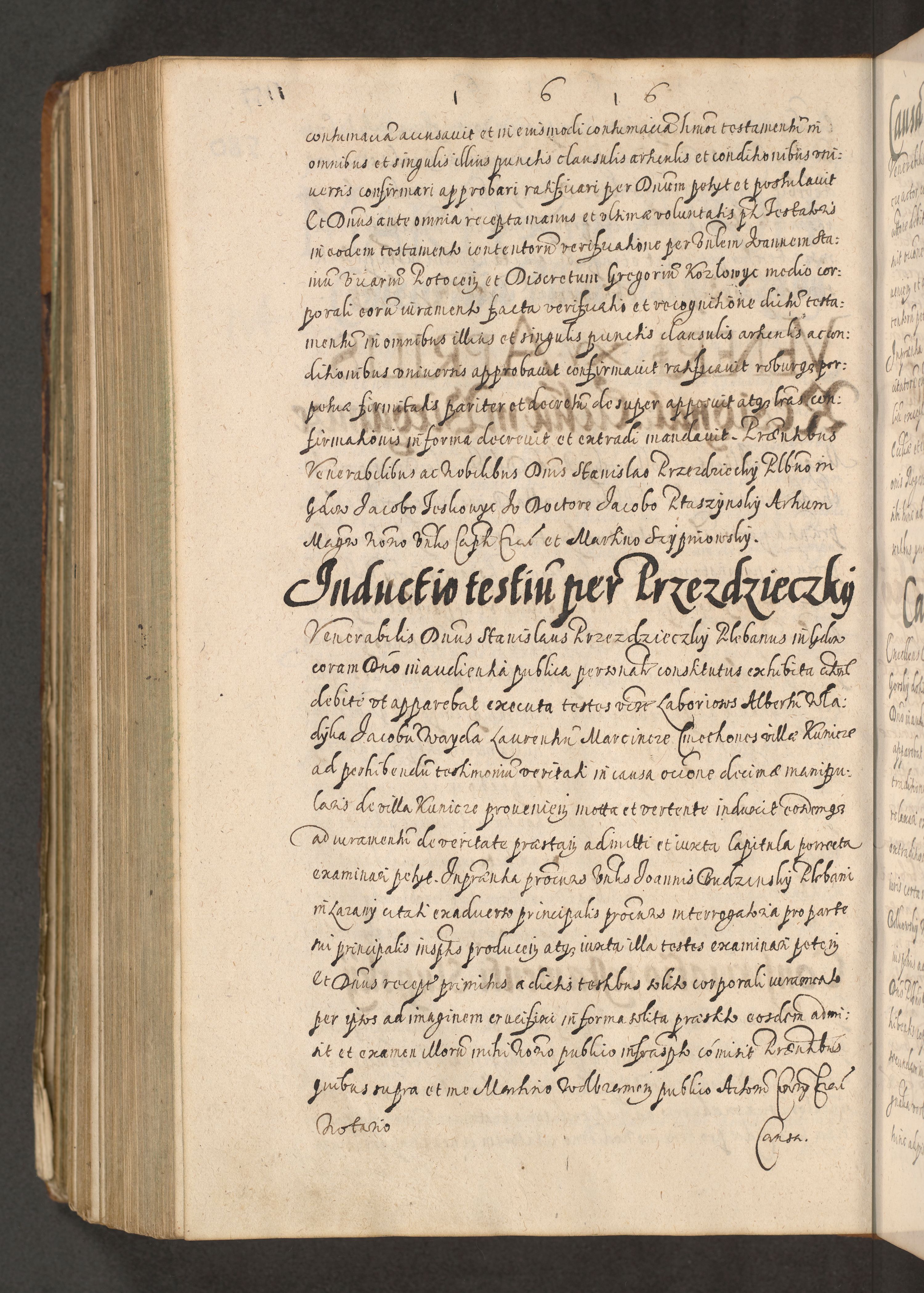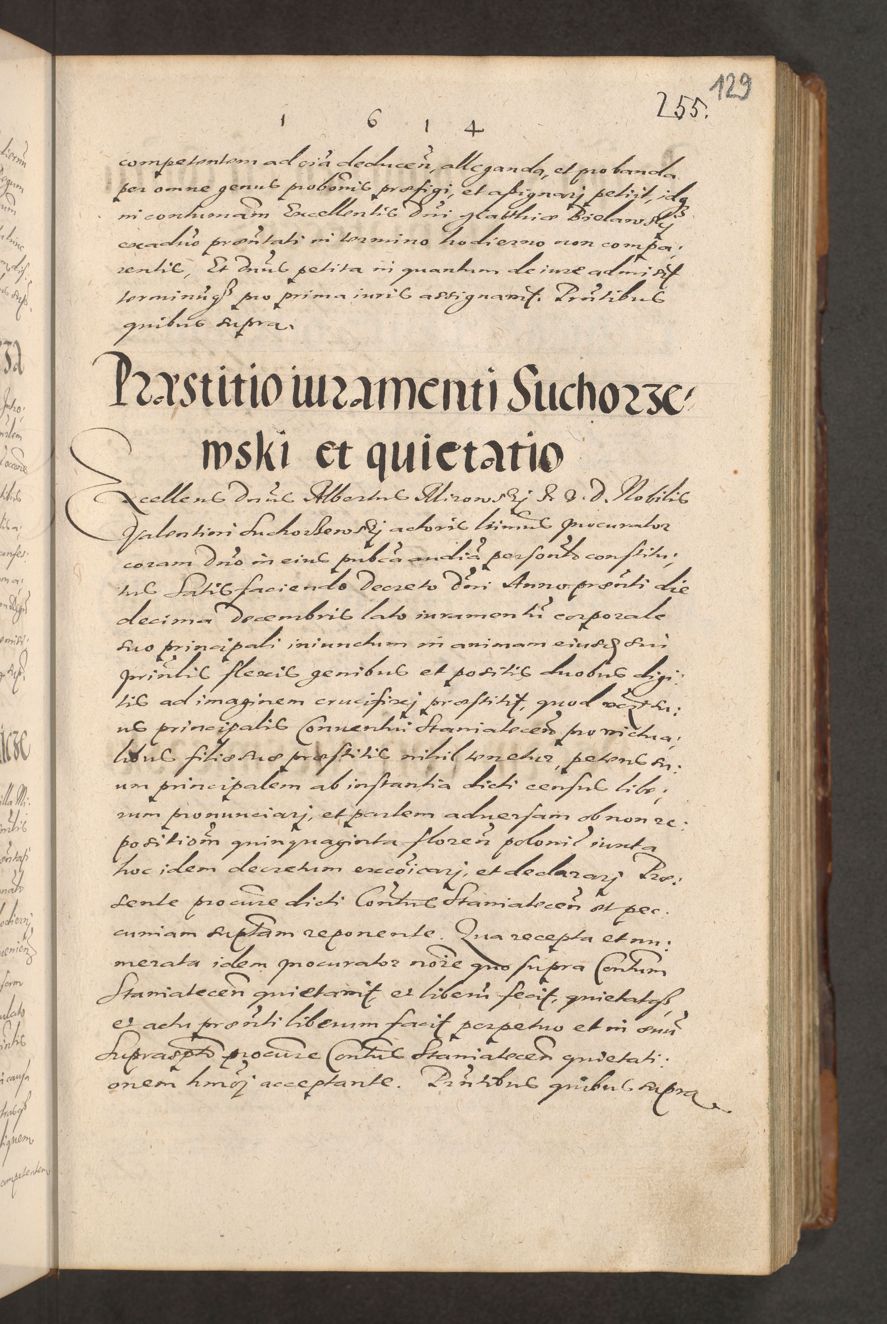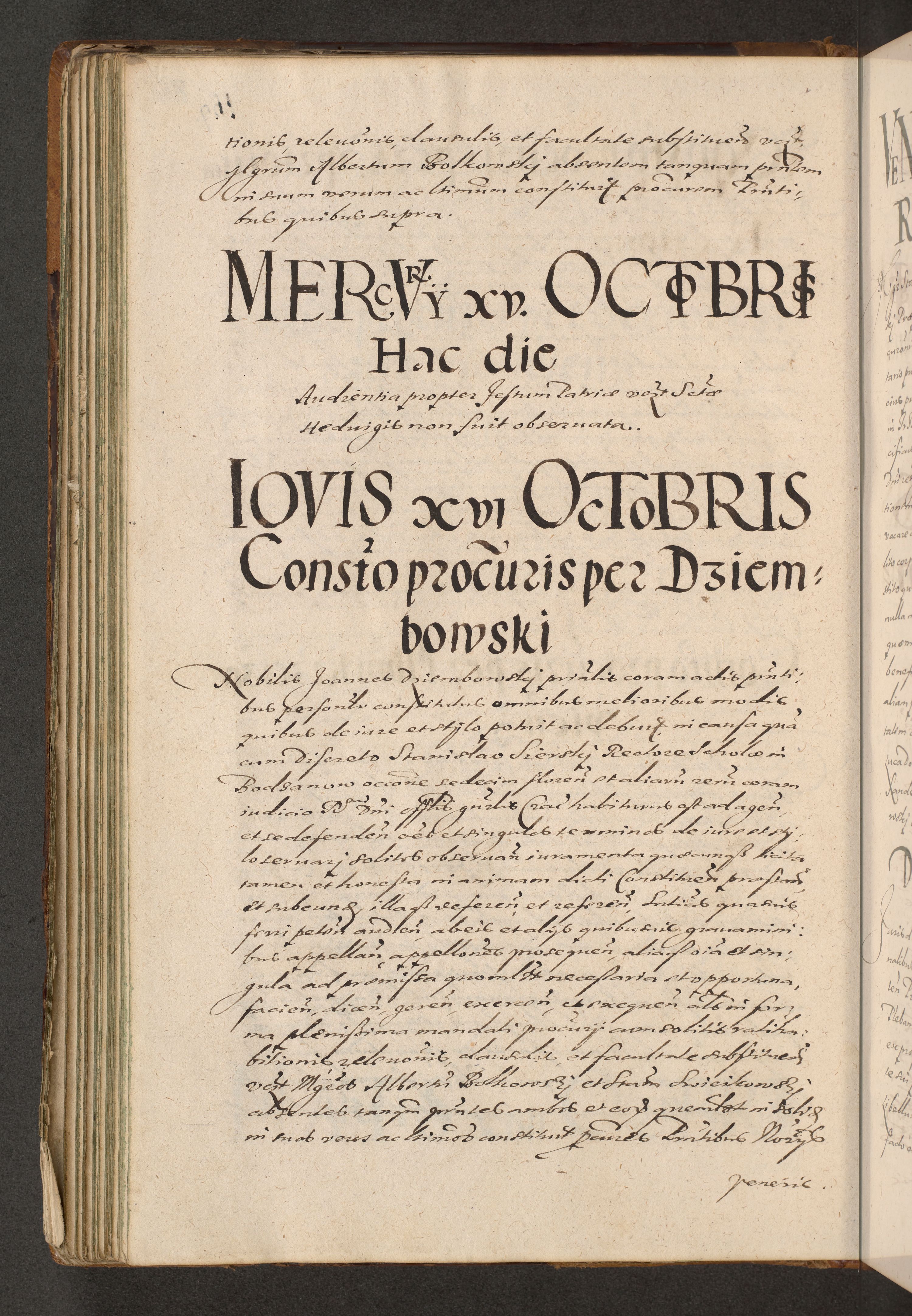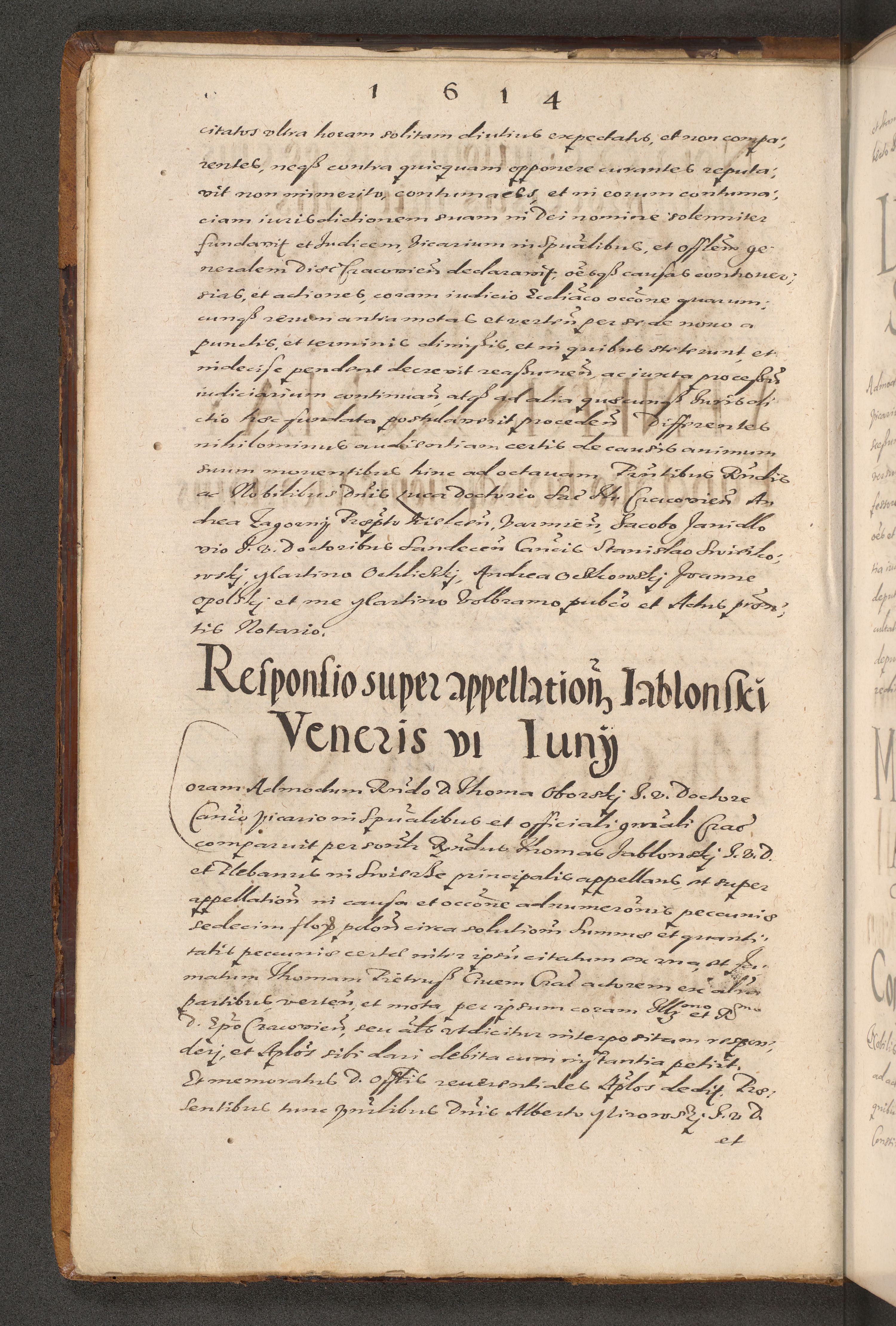 Illustrissimo et Reverendissimo in Christo Patre Domino Domino Petro Tylicki Dei et Apostolice Sedis Gratia Episcopo Cracoviensis Duce Severiensis Acta actorum causarum sententiarum tam interloquutoriarum quam definitivarum decretorum obligationum, quietationum, recognitionum, constitutionum procuratorum etc. etc. coram Admodum Reverendo Domino Thoma Oborski I. V. Doctore Canonico Vicario in Spiritualibus et Officiali generali Cracoviensis in anno Domini Millesimo Sexcentessimo Decimoquarto Cuius Indictio duodecima Pontificus SS. D. N. D. Pauli Divina providentia Papae quinti Anno decimo foeliciter incipiunt