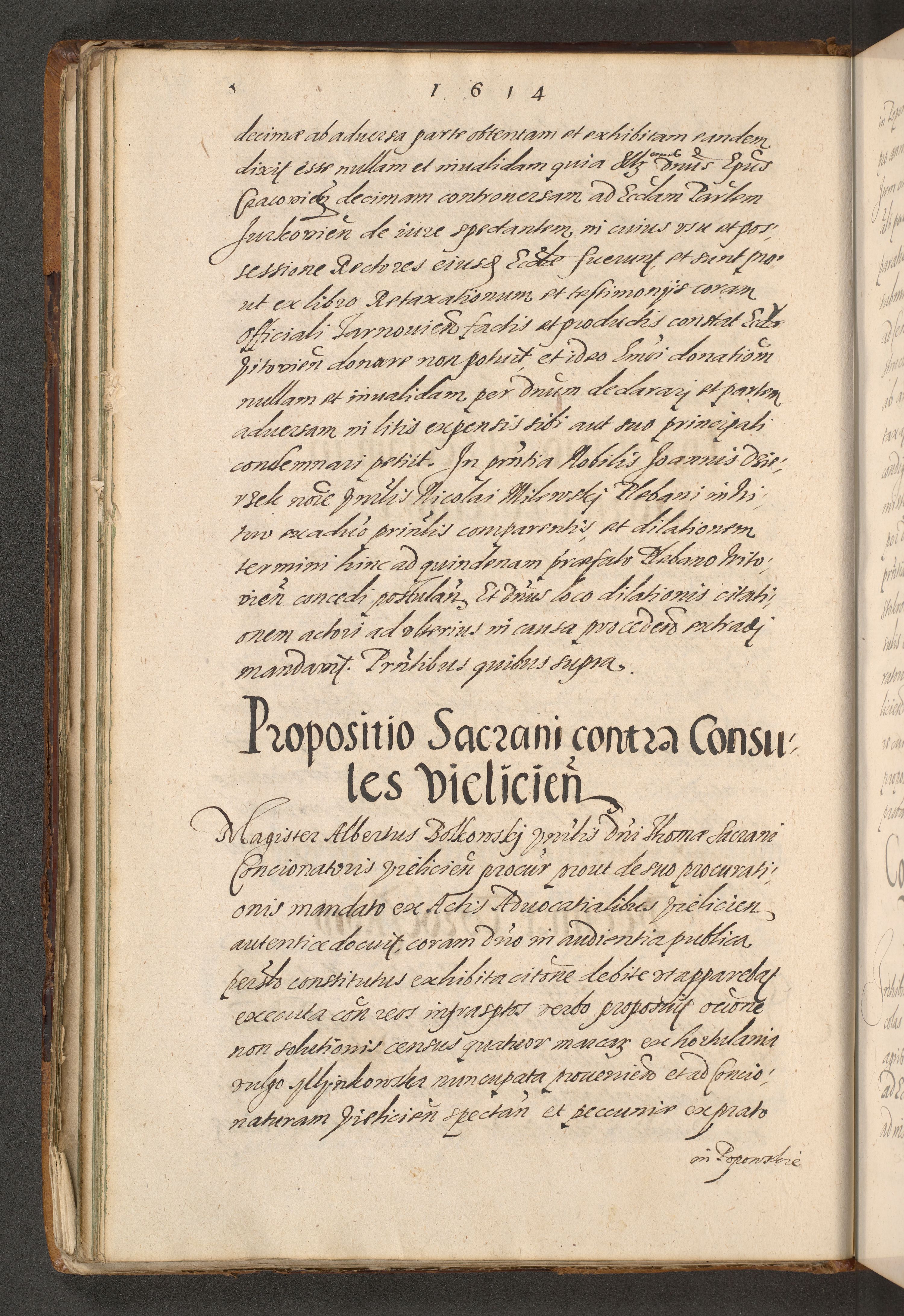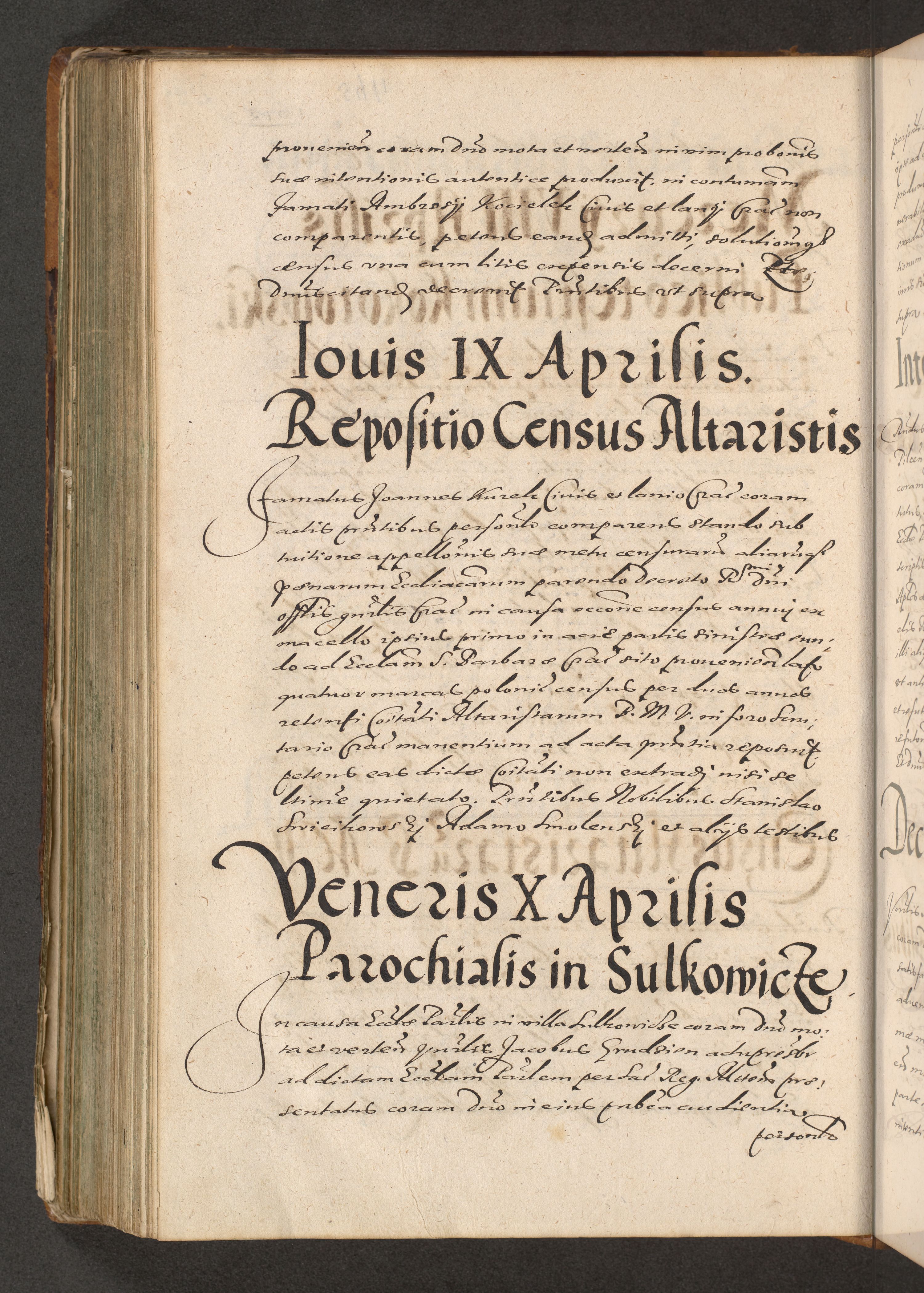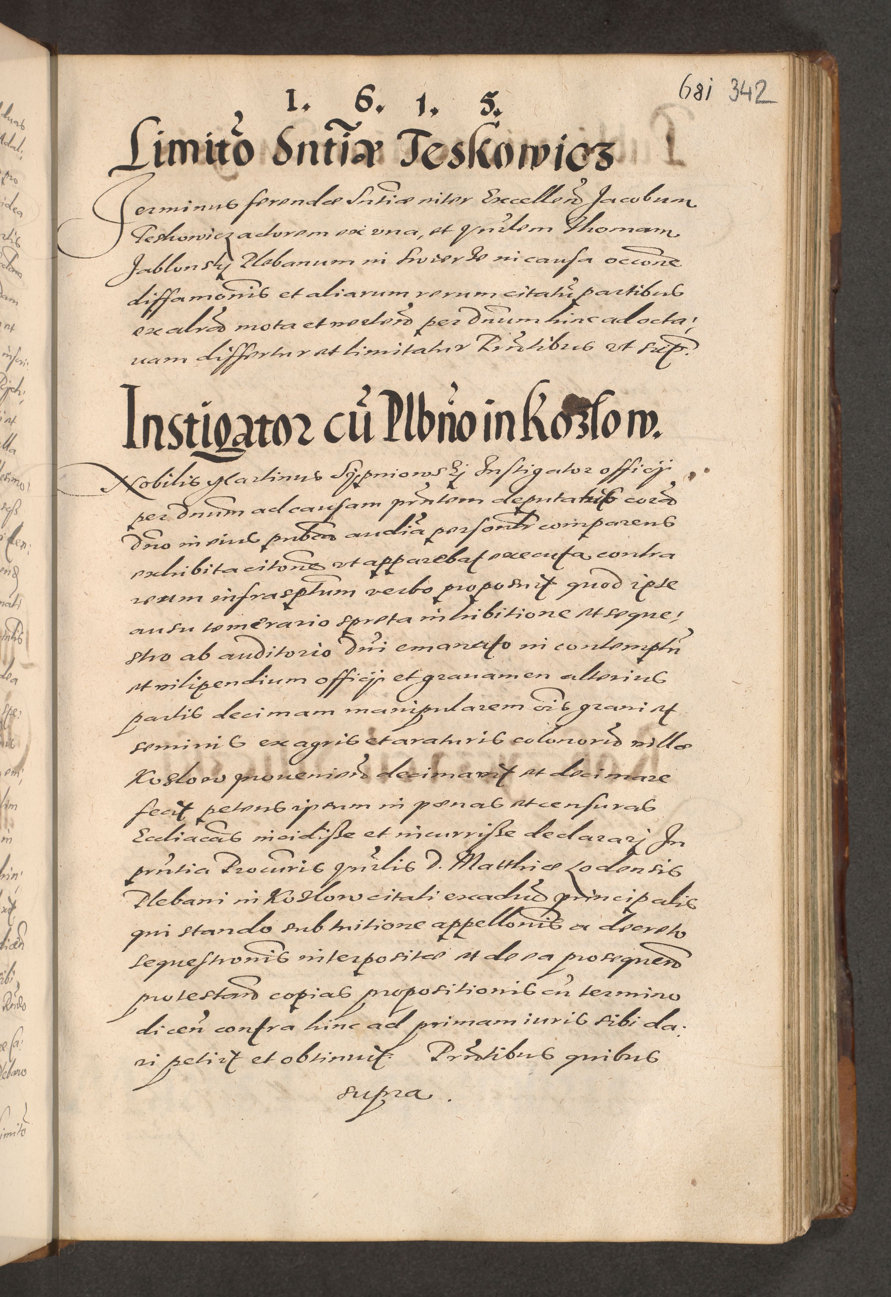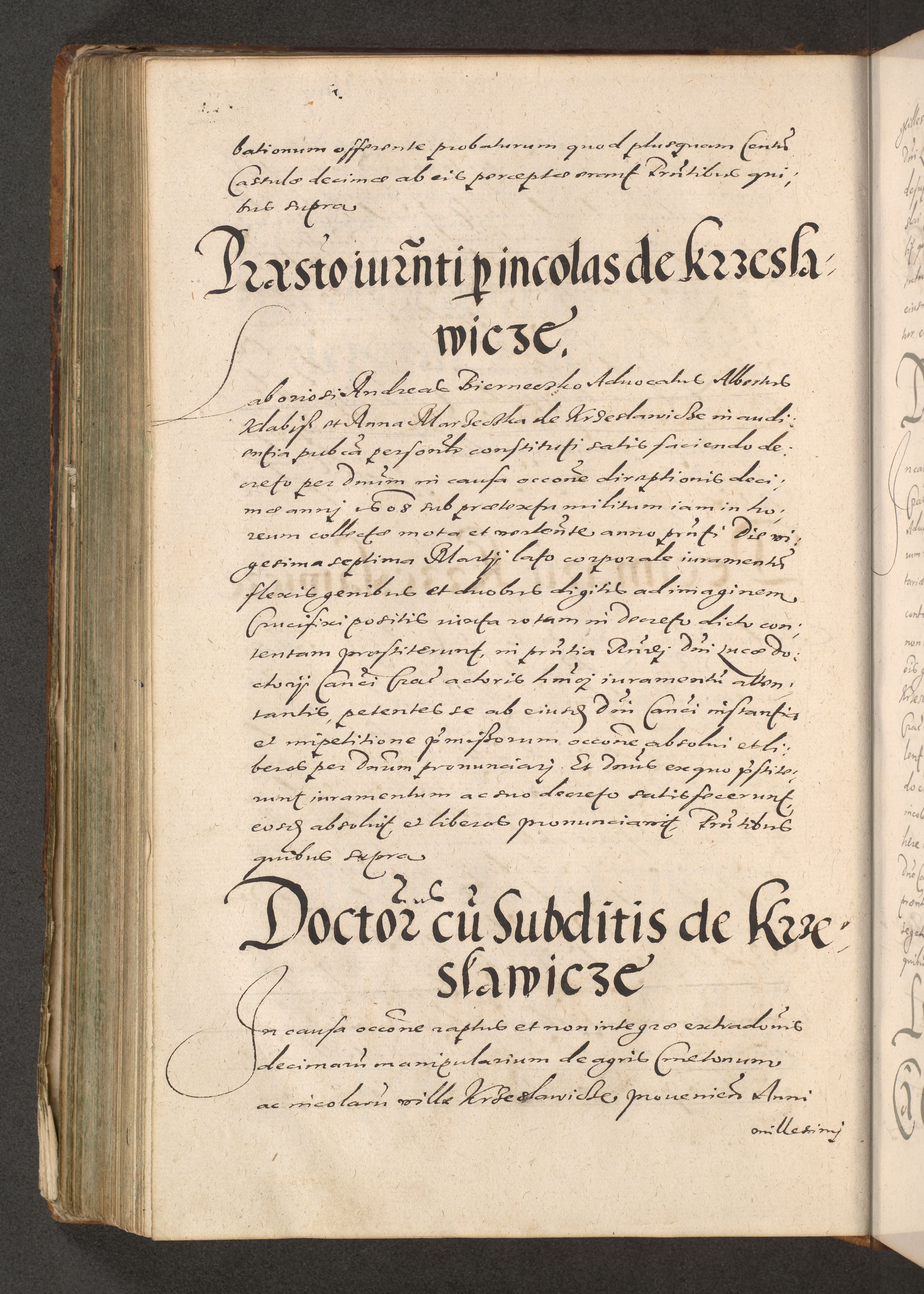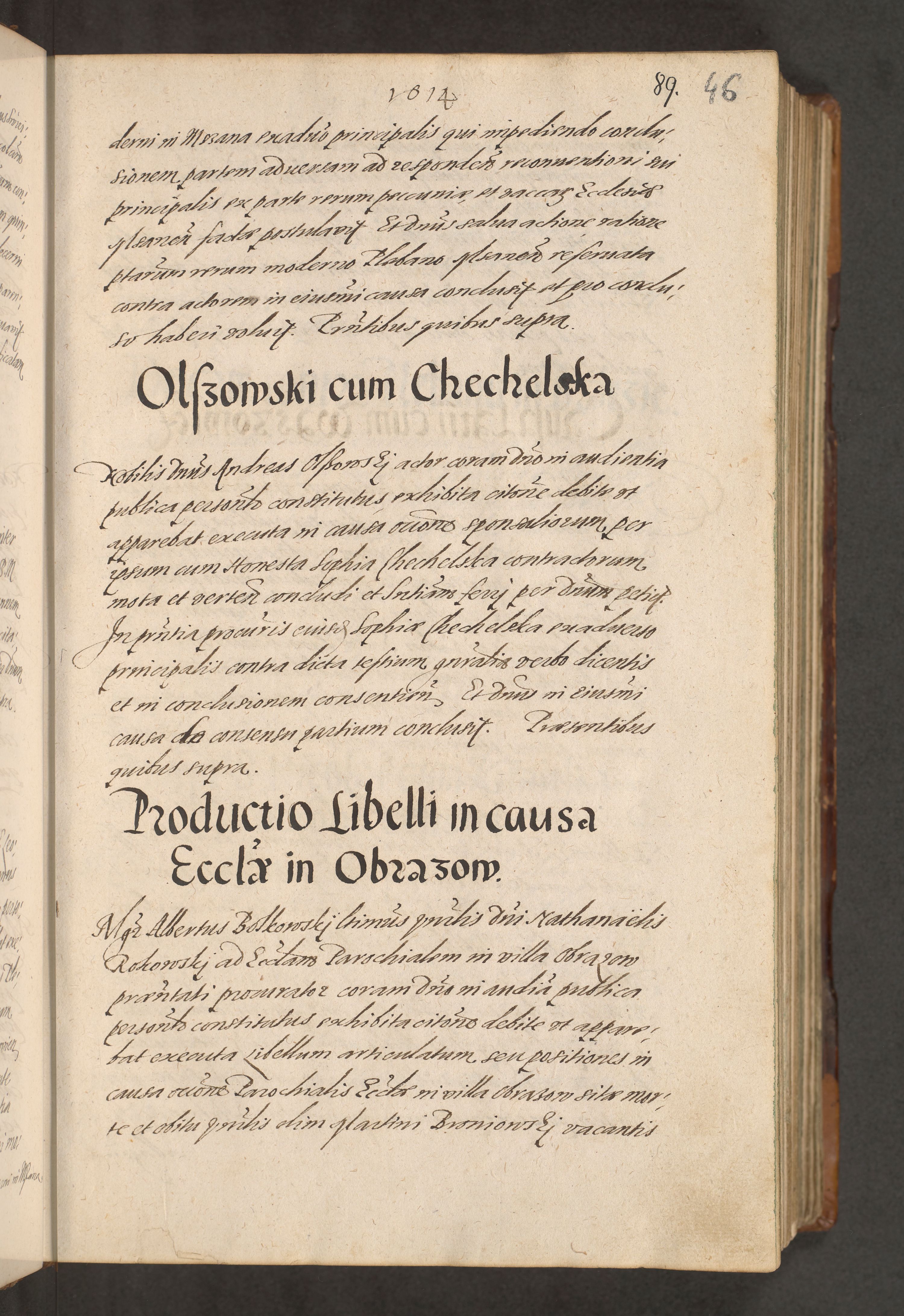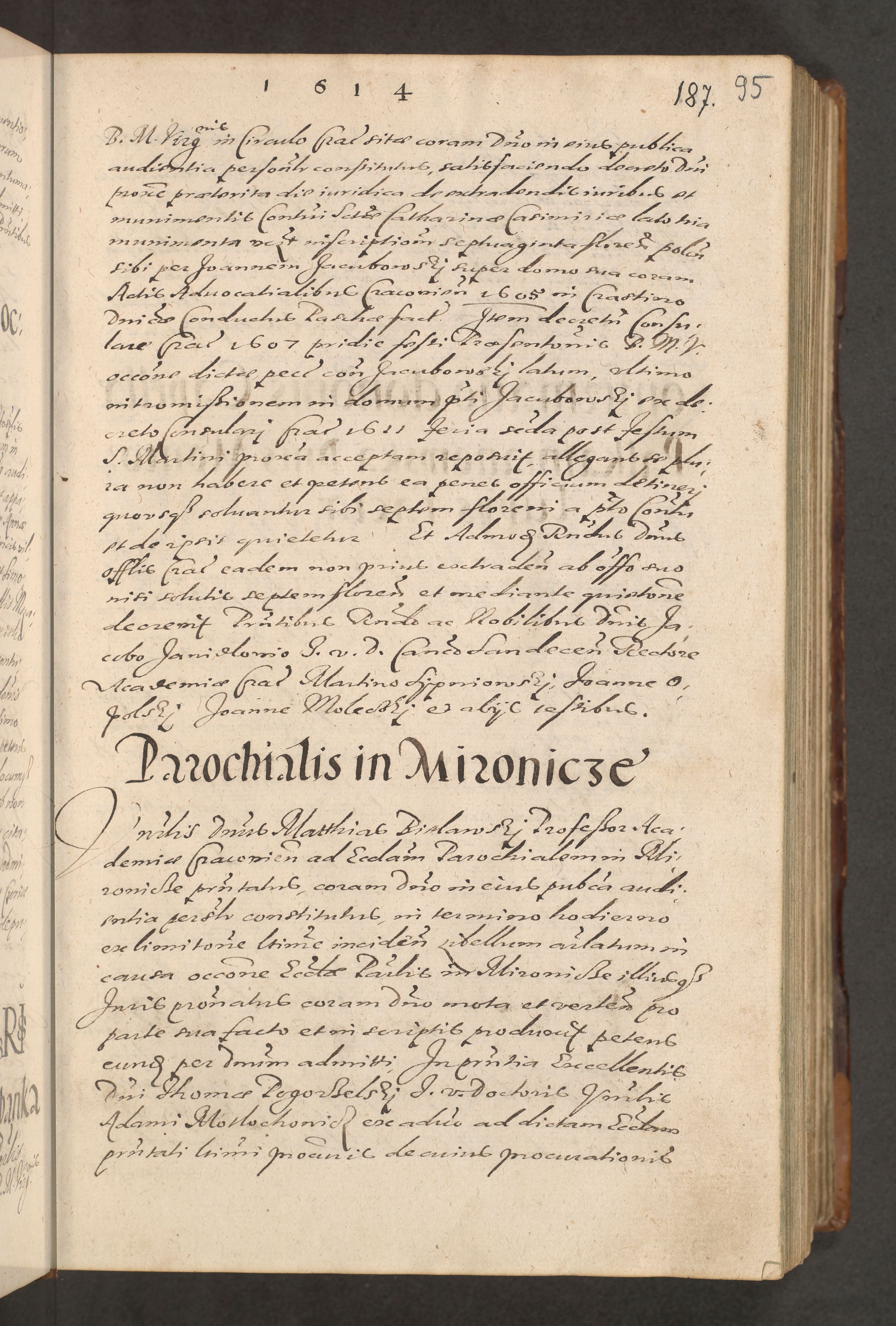 Illustrissimo et Reverendissimo in Christo Patre Domino Domino Petro Tylicki Dei et Apostolice Sedis Gratia Episcopo Cracoviensis Duce Severiensis Acta actorum causarum sententiarum tam interloquutoriarum quam definitivarum decretorum obligationum, quietationum, recognitionum, constitutionum procuratorum etc. etc. coram Admodum Reverendo Domino Thoma Oborski I. V. Doctore Canonico Vicario in Spiritualibus et Officiali generali Cracoviensis in anno Domini Millesimo Sexcentessimo Decimoquarto Cuius Indictio duodecima Pontificus SS. D. N. D. Pauli Divina providentia Papae quinti Anno decimo foeliciter incipiunt