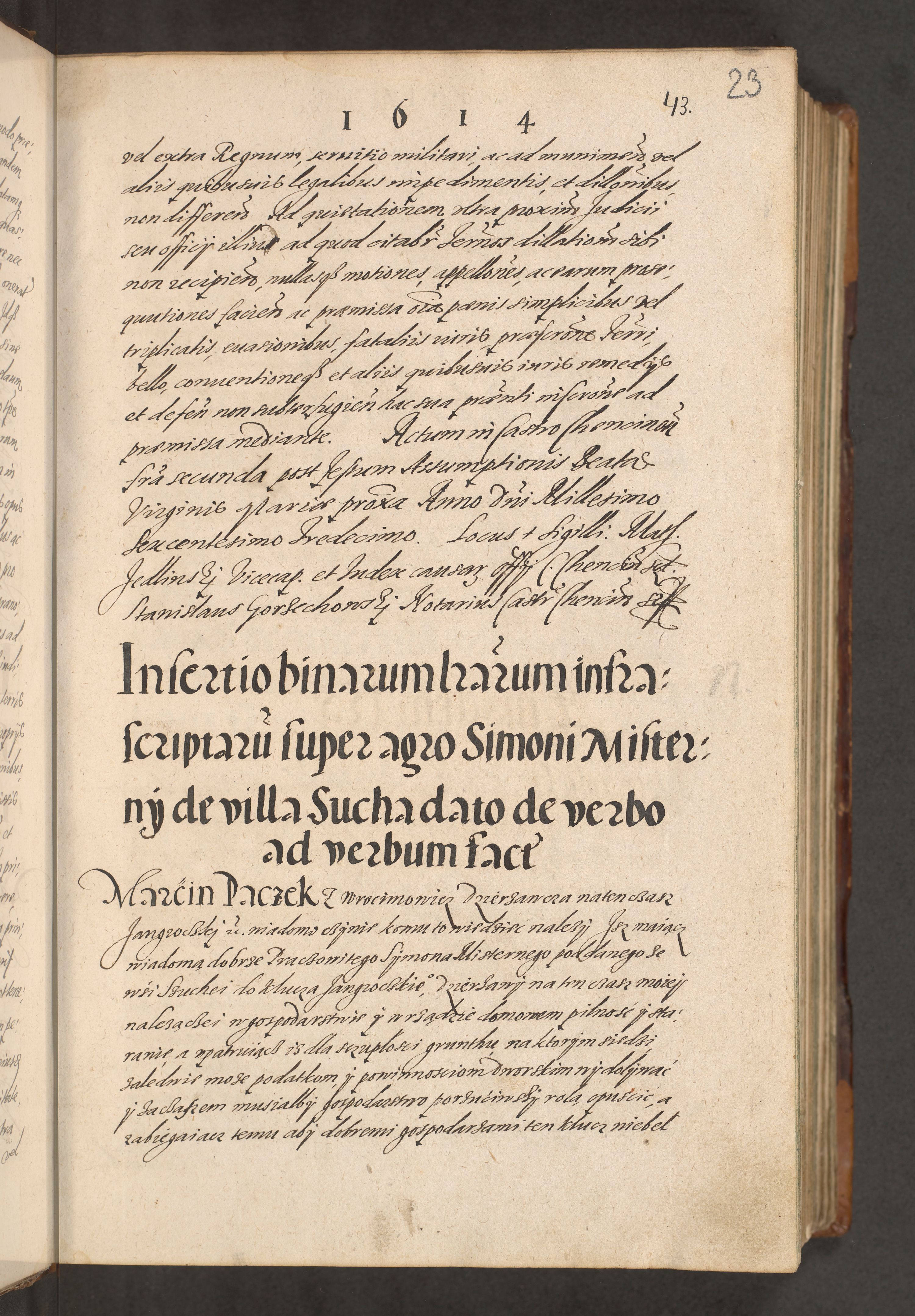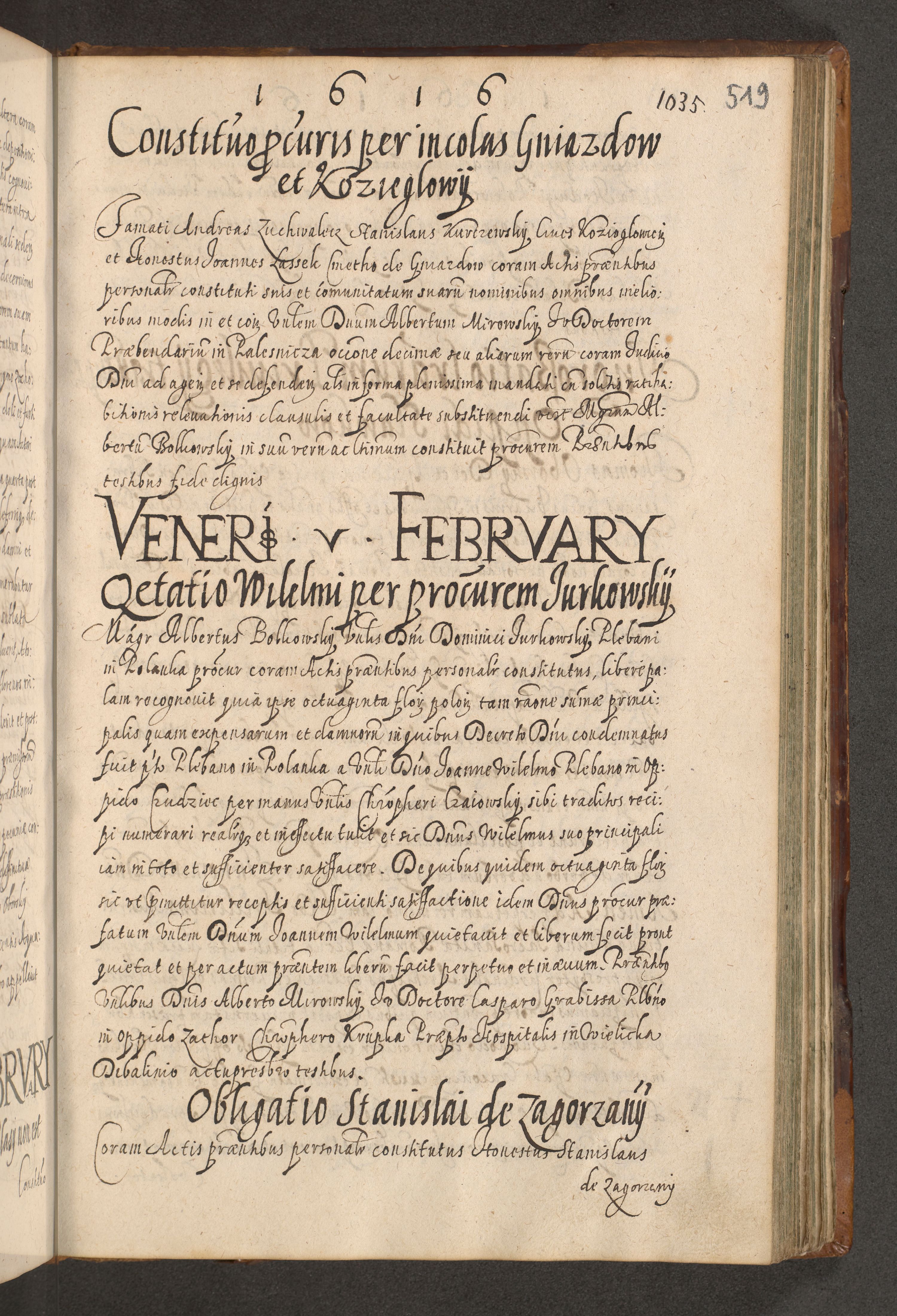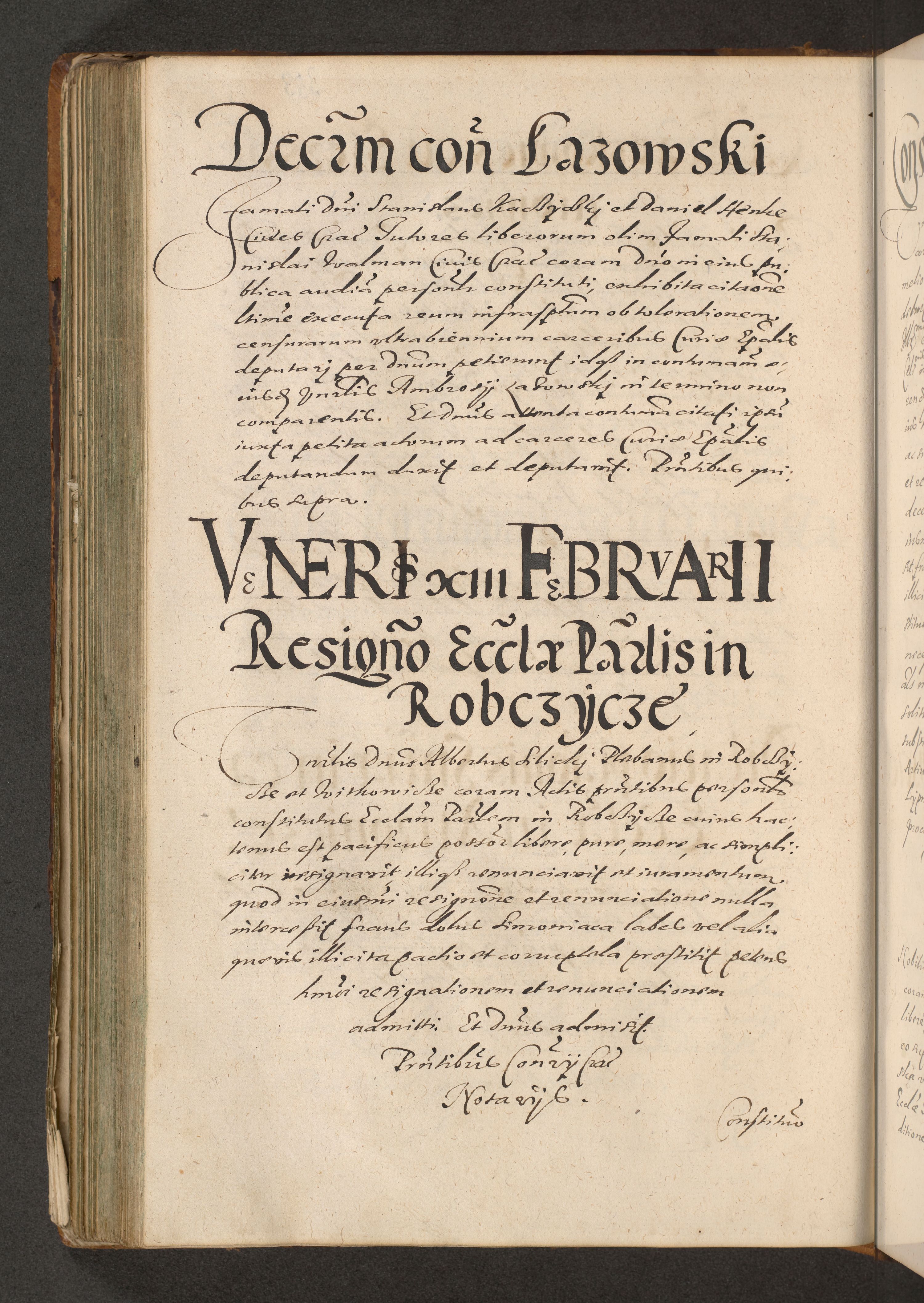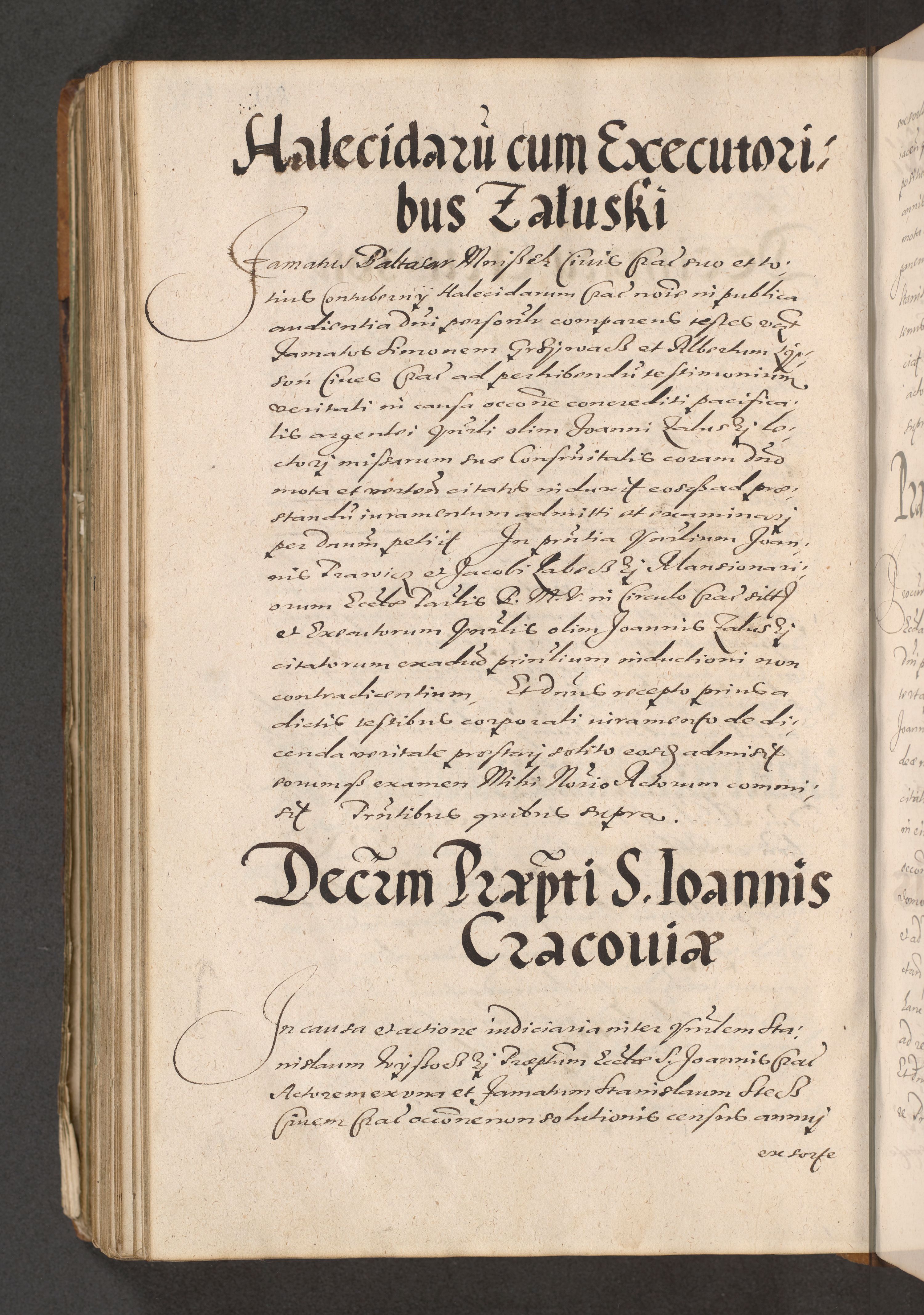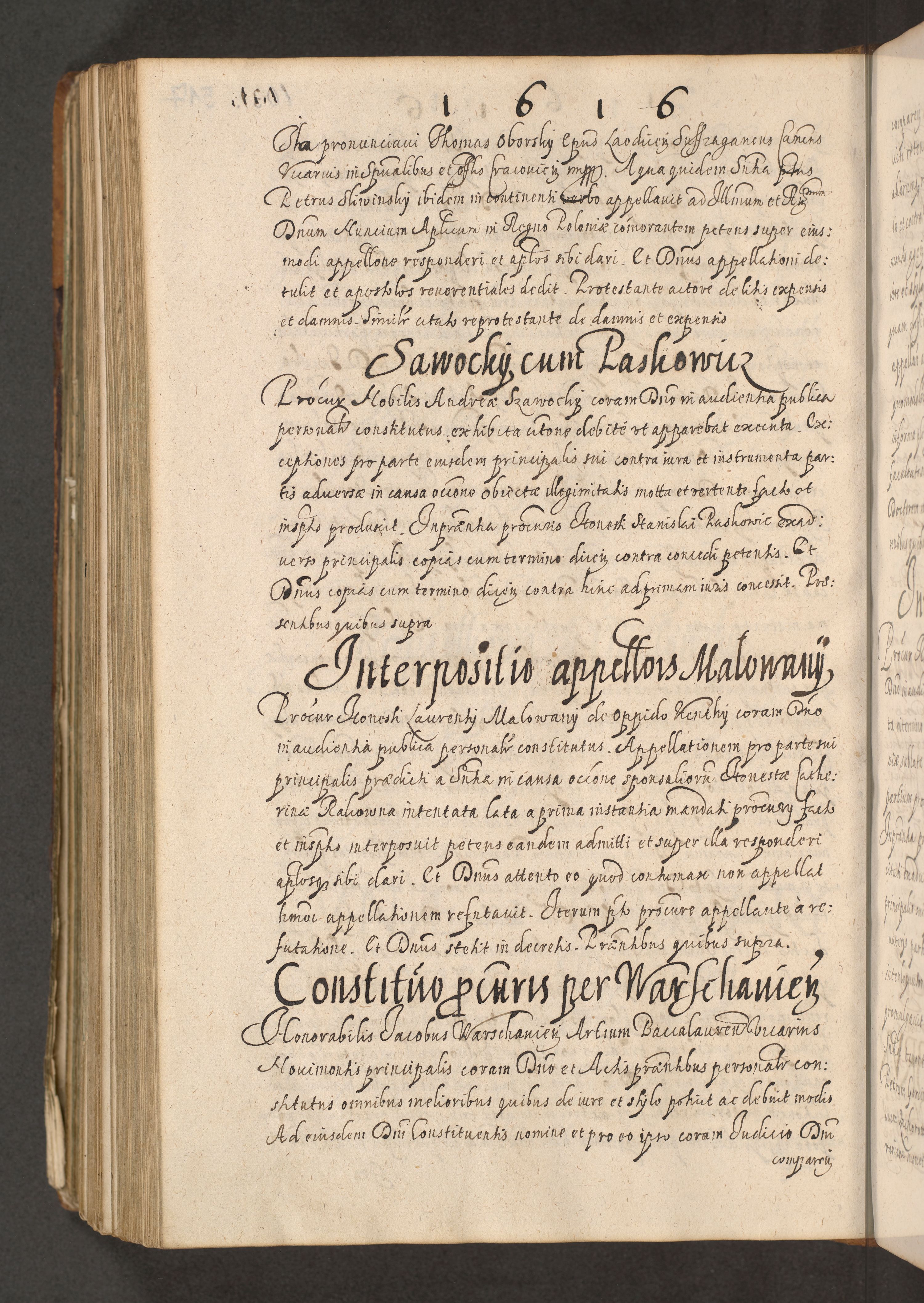Illustrissimo et Reverendissimo in Christo Patre Domino Domino Petro Tylicki Dei et Apostolice Sedis Gratia Episcopo Cracoviensis Duce Severiensis Acta actorum causarum sententiarum tam interloquutoriarum quam definitivarum decretorum obligationum, quietationum, recognitionum, constitutionum procuratorum etc. etc. coram Admodum Reverendo Domino Thoma Oborski I. V. Doctore Canonico Vicario in Spiritualibus et Officiali generali Cracoviensis in anno Domini Millesimo Sexcentessimo Decimoquarto Cuius Indictio duodecima Pontificus SS. D. N. D. Pauli Divina providentia Papae quinti Anno decimo foeliciter incipiunt
