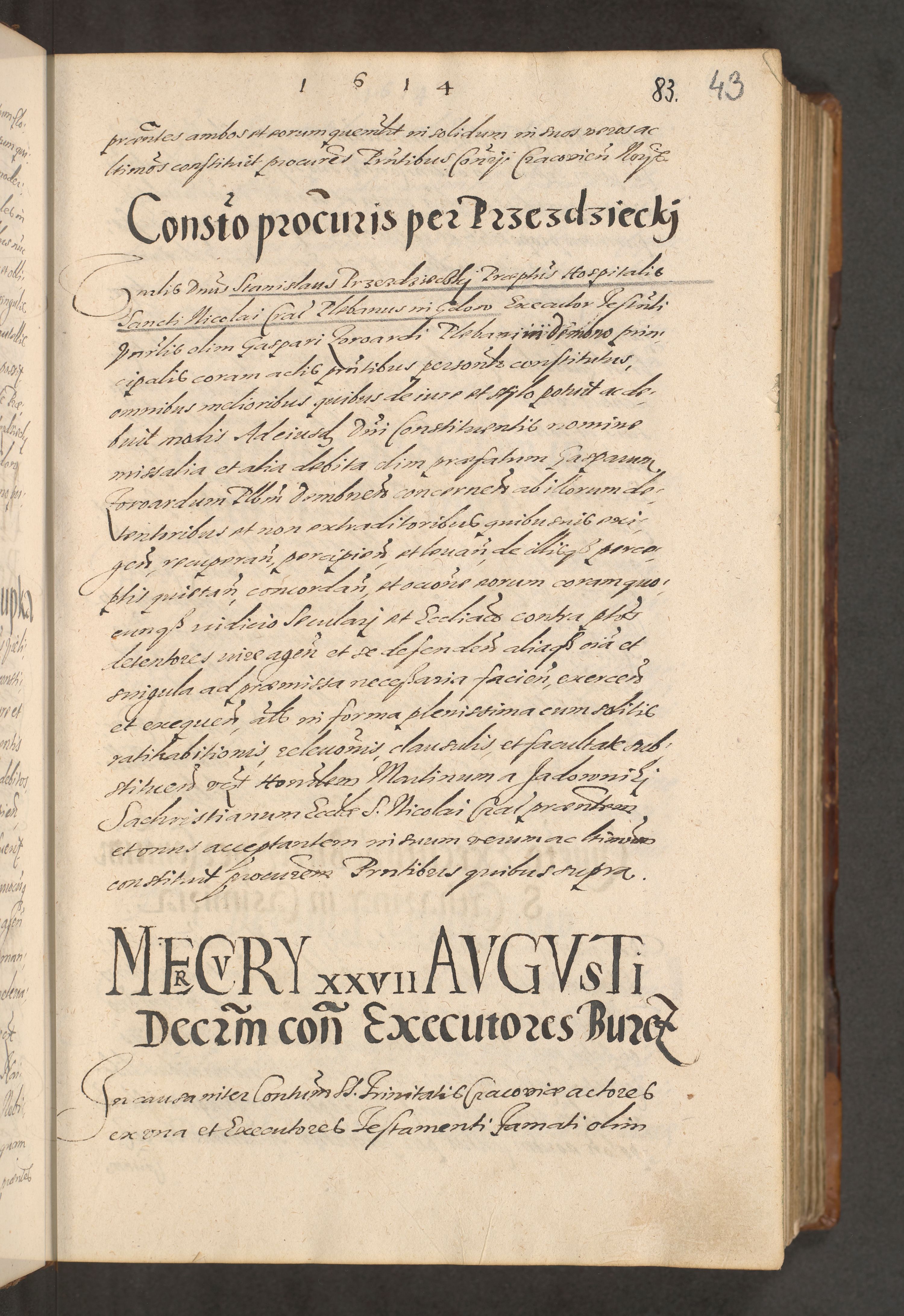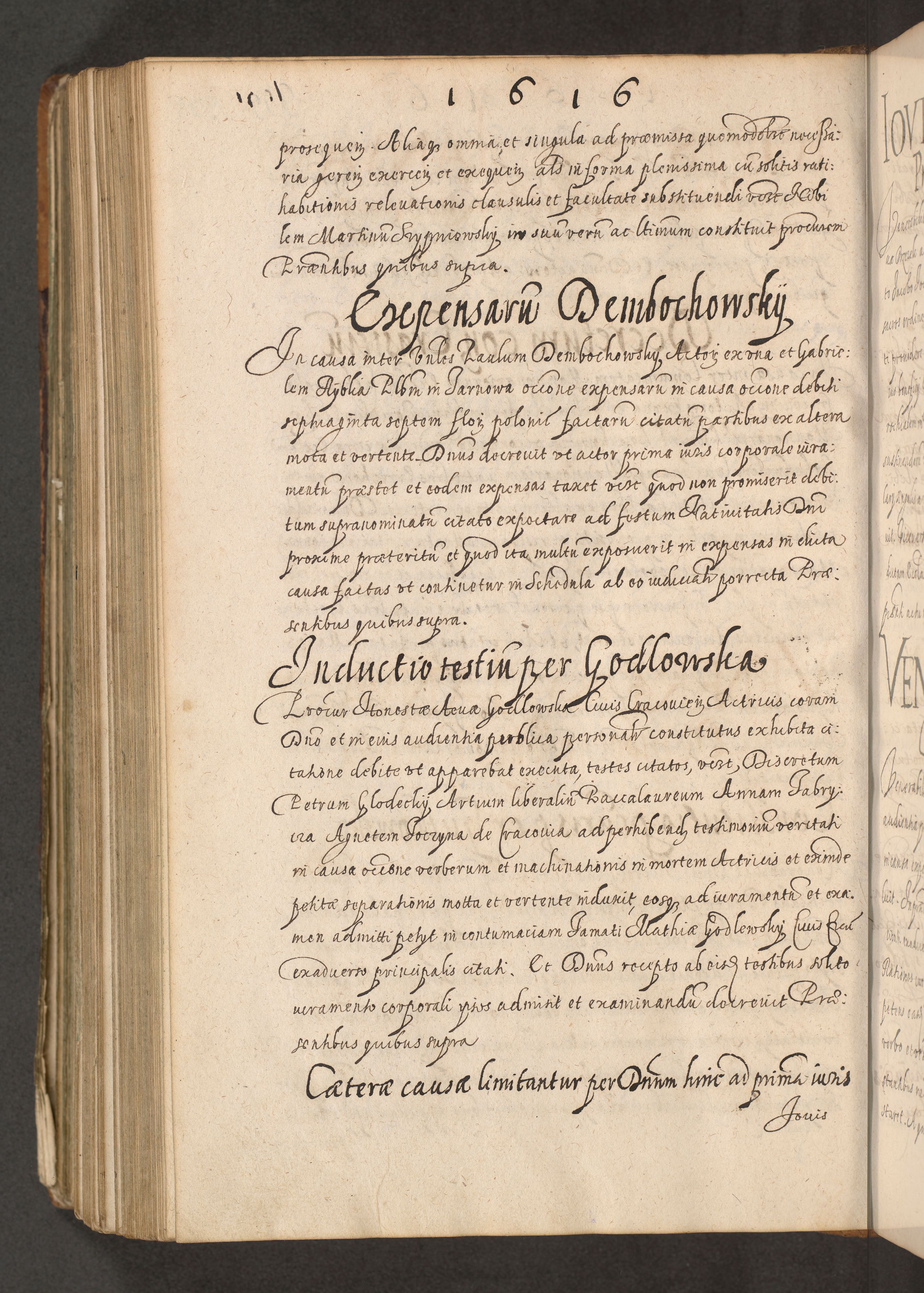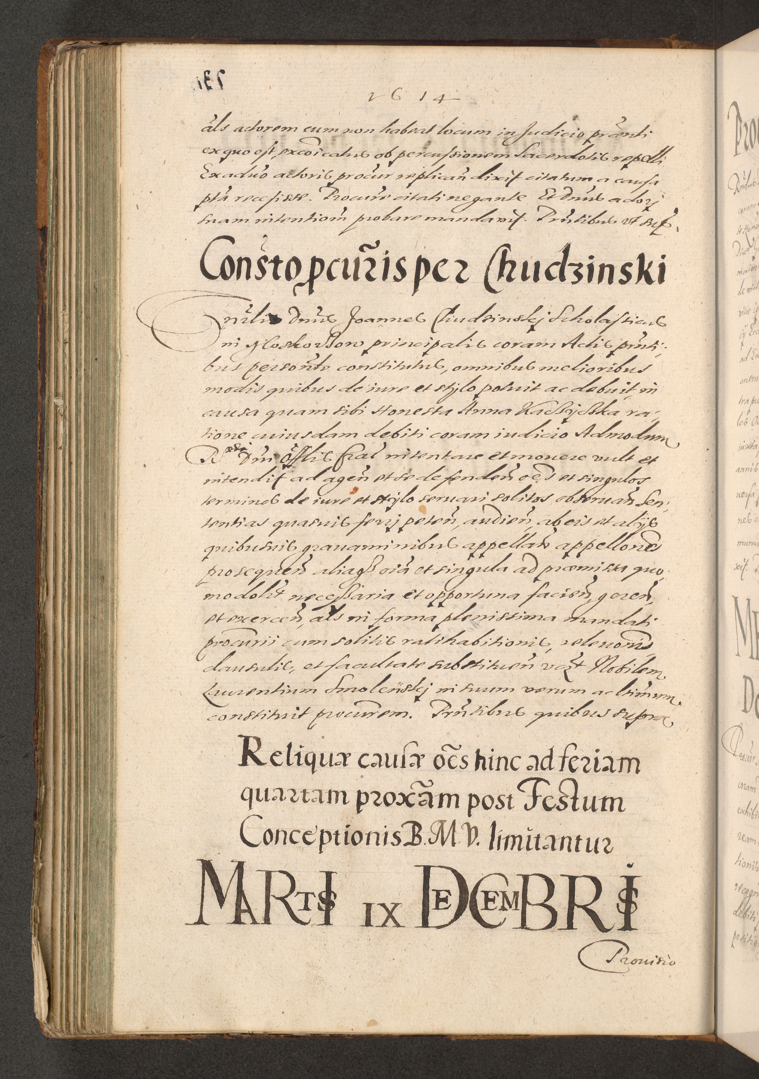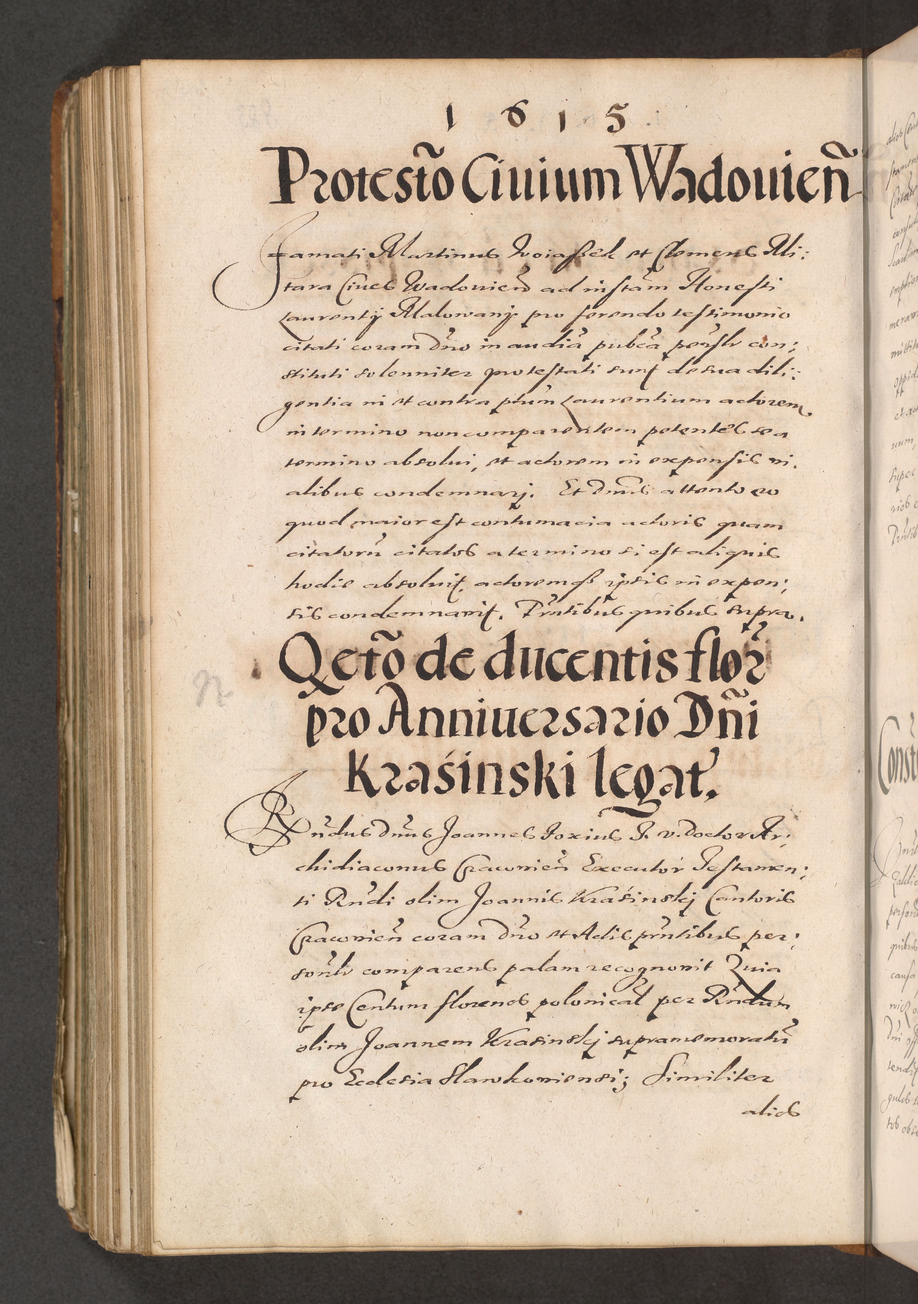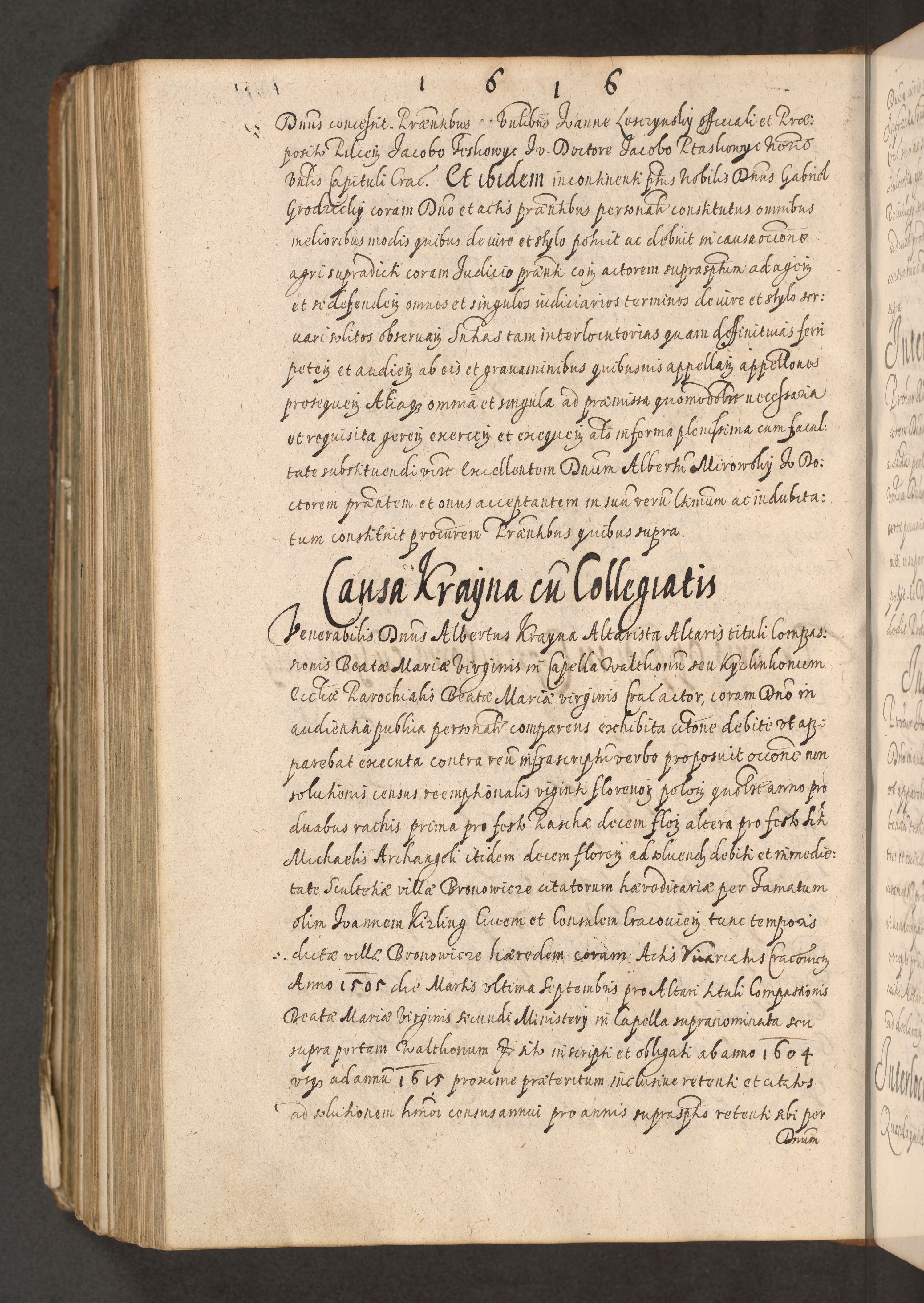 Illustrissimo et Reverendissimo in Christo Patre Domino Domino Petro Tylicki Dei et Apostolice Sedis Gratia Episcopo Cracoviensis Duce Severiensis Acta actorum causarum sententiarum tam interloquutoriarum quam definitivarum decretorum obligationum, quietationum, recognitionum, constitutionum procuratorum etc. etc. coram Admodum Reverendo Domino Thoma Oborski I. V. Doctore Canonico Vicario in Spiritualibus et Officiali generali Cracoviensis in anno Domini Millesimo Sexcentessimo Decimoquarto Cuius Indictio duodecima Pontificus SS. D. N. D. Pauli Divina providentia Papae quinti Anno decimo foeliciter incipiunt