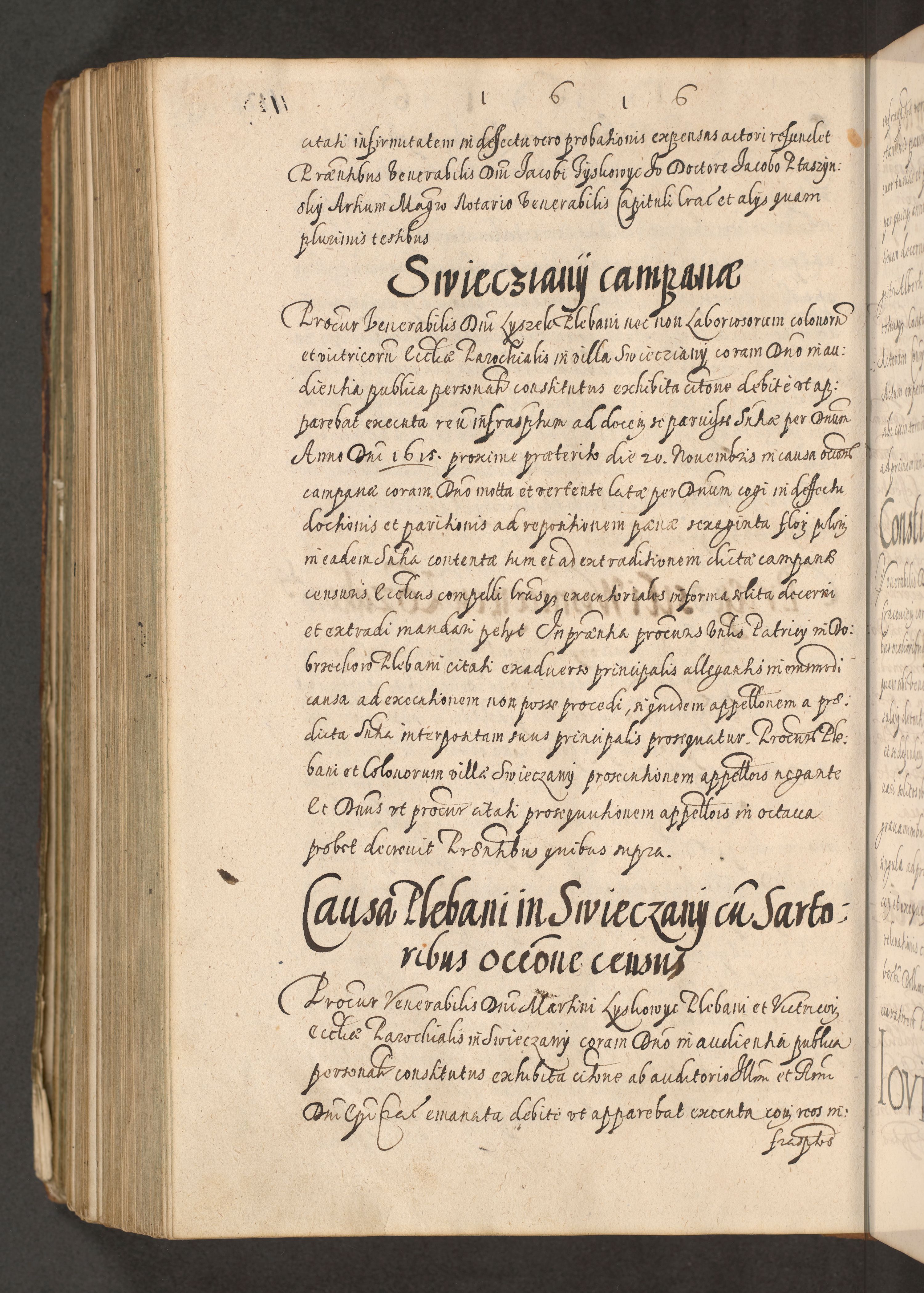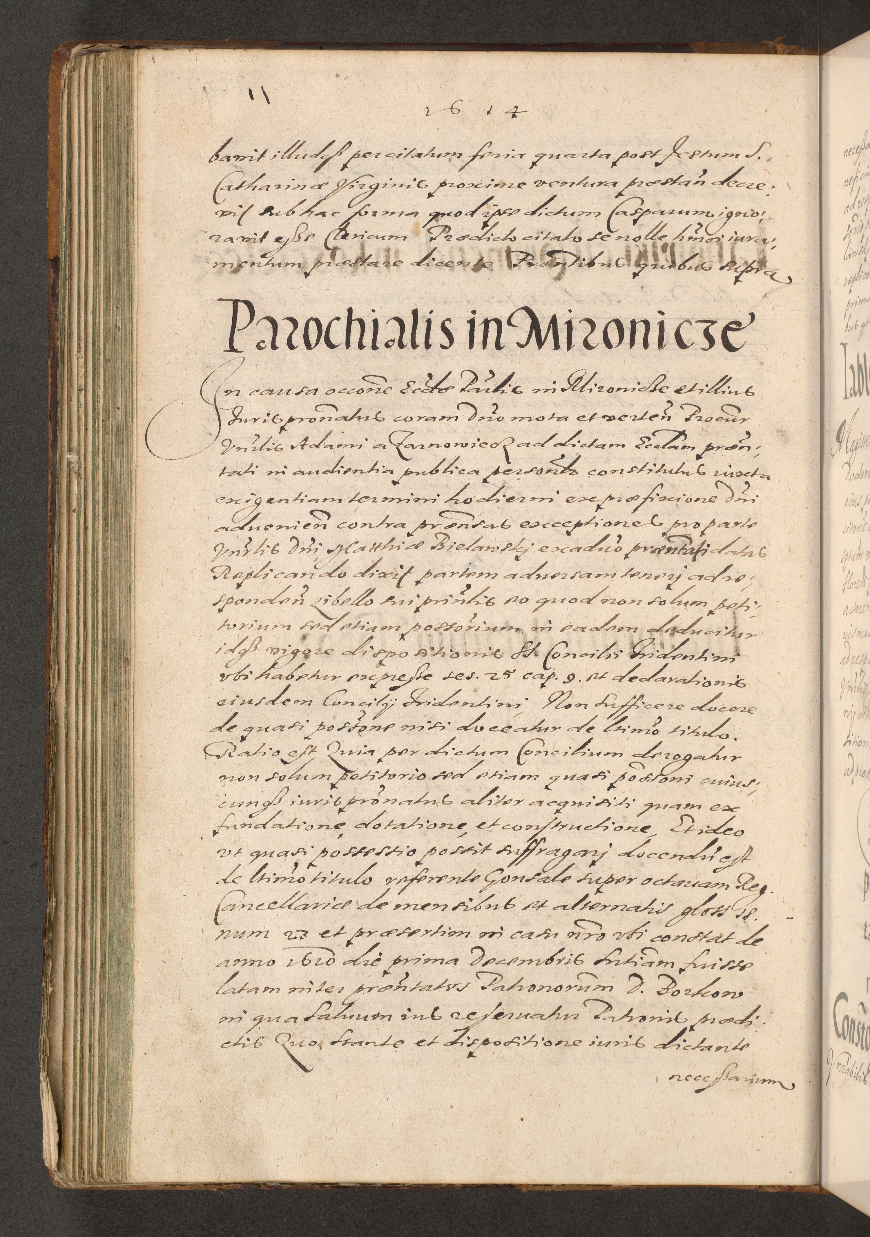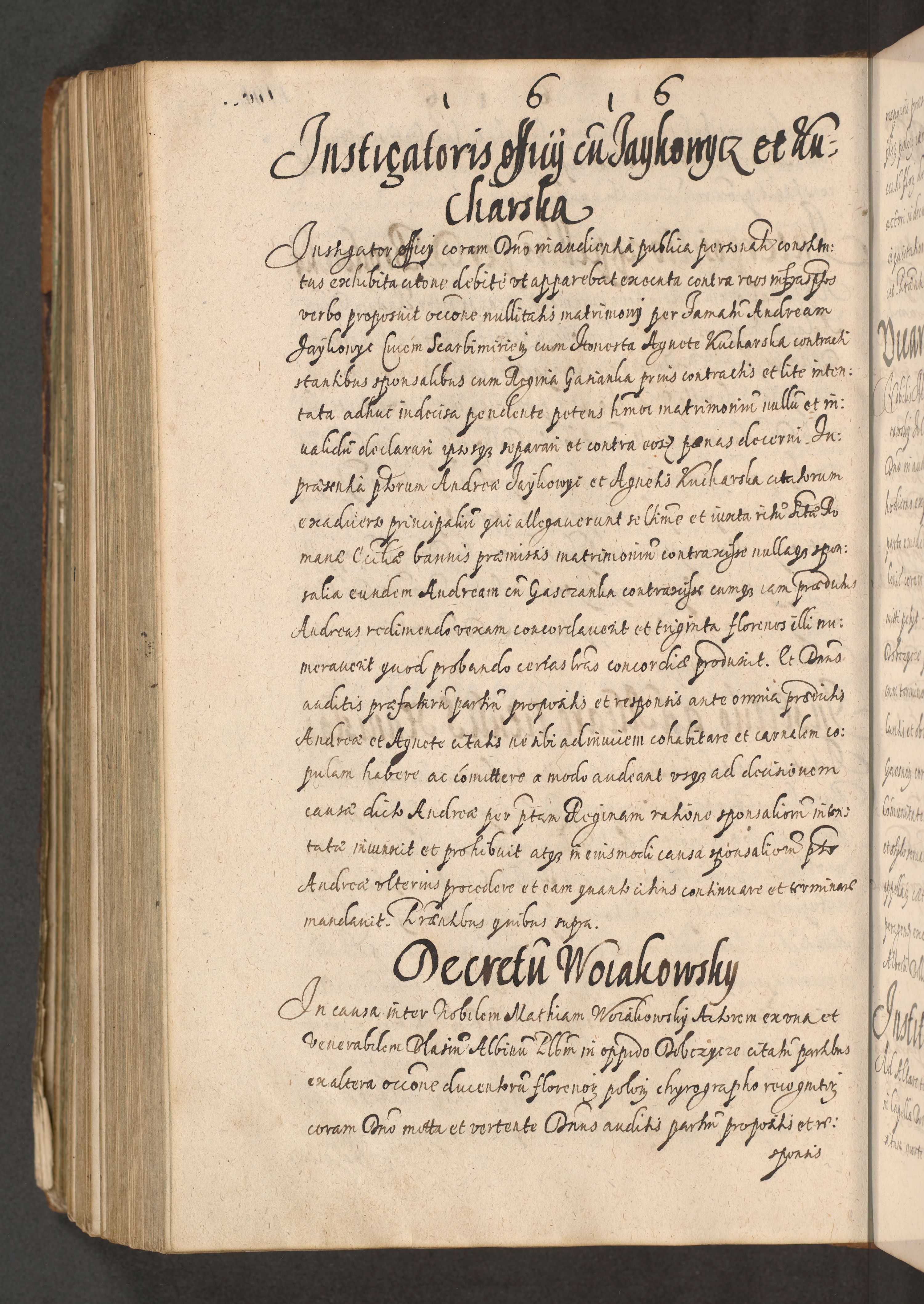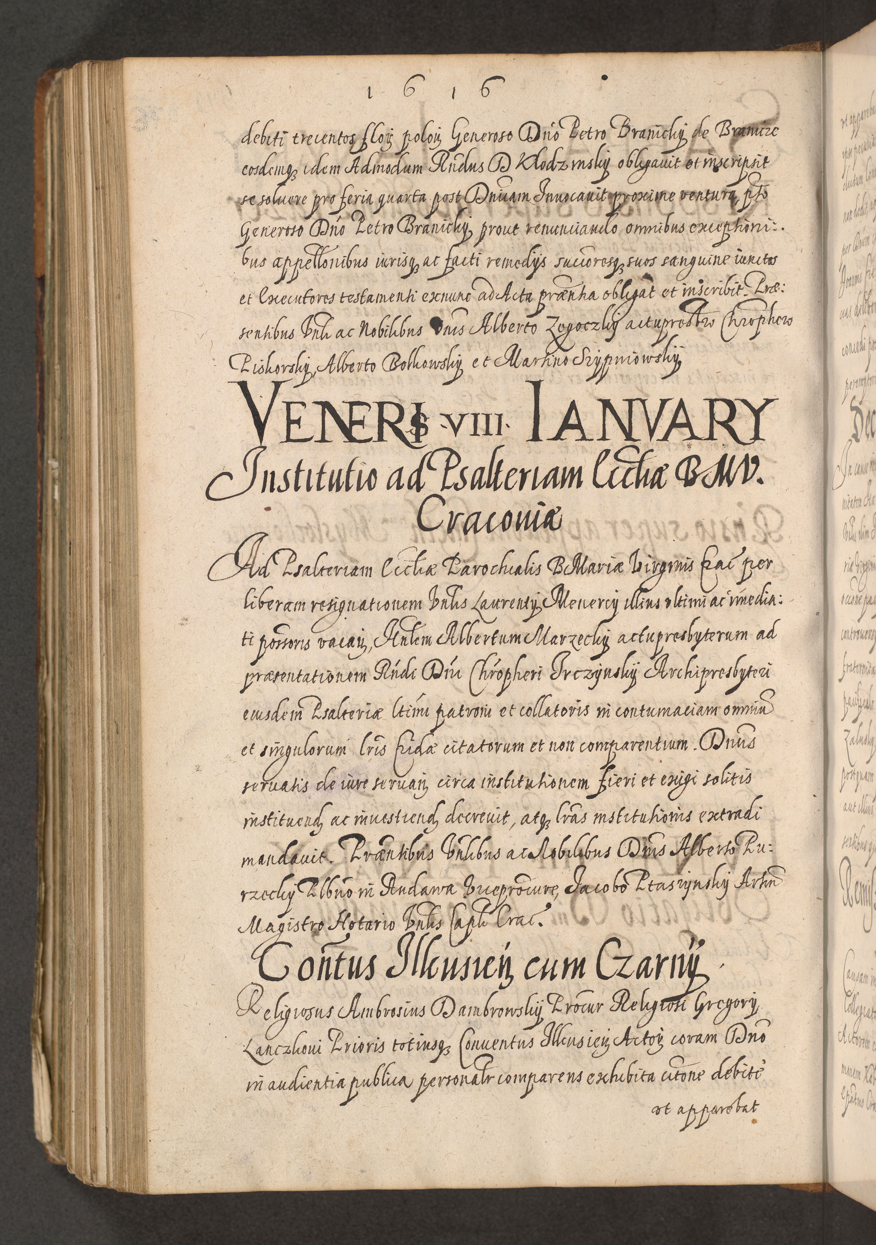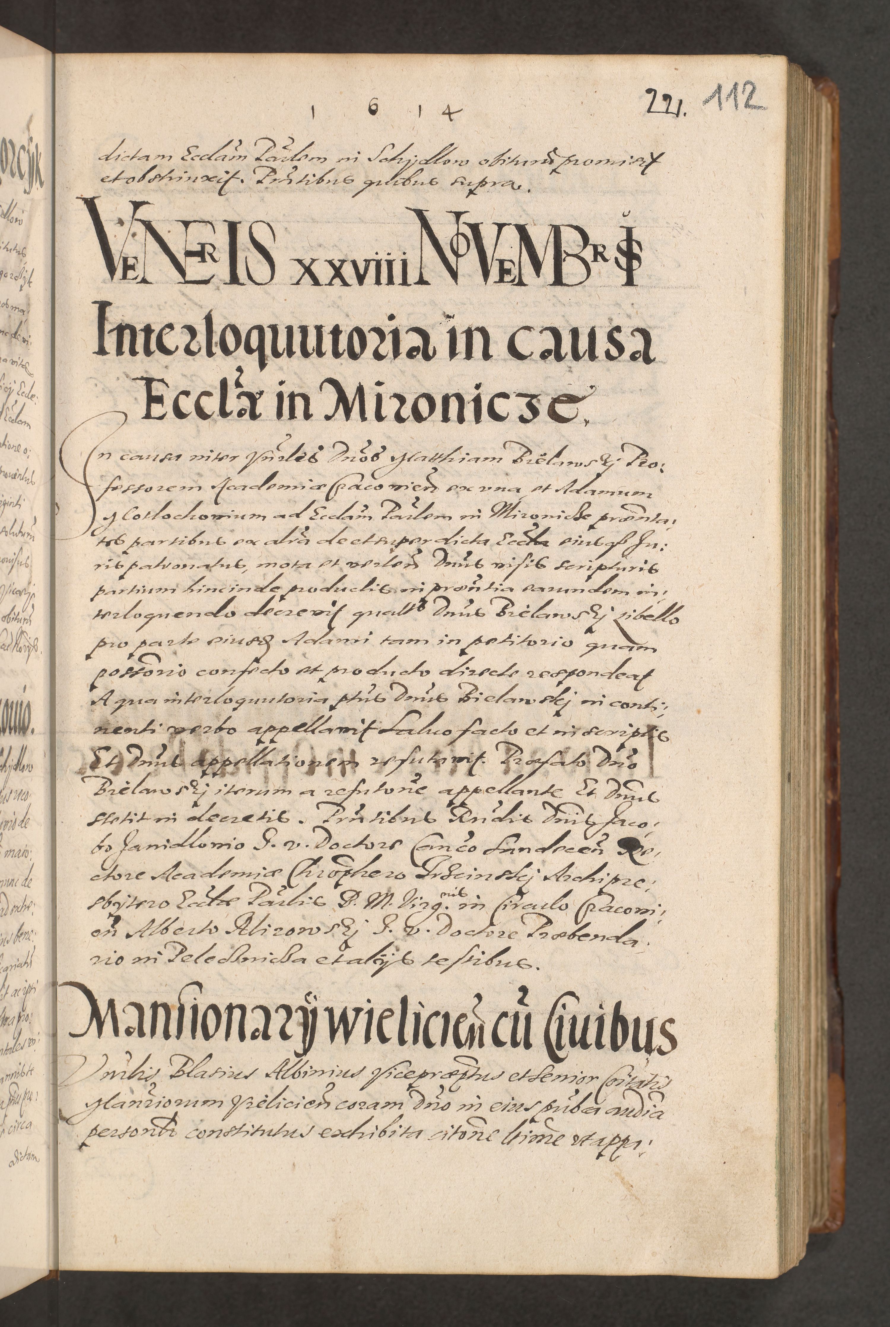 Illustrissimo et Reverendissimo in Christo Patre Domino Domino Petro Tylicki Dei et Apostolice Sedis Gratia Episcopo Cracoviensis Duce Severiensis Acta actorum causarum sententiarum tam interloquutoriarum quam definitivarum decretorum obligationum, quietationum, recognitionum, constitutionum procuratorum etc. etc. coram Admodum Reverendo Domino Thoma Oborski I. V. Doctore Canonico Vicario in Spiritualibus et Officiali generali Cracoviensis in anno Domini Millesimo Sexcentessimo Decimoquarto Cuius Indictio duodecima Pontificus SS. D. N. D. Pauli Divina providentia Papae quinti Anno decimo foeliciter incipiunt