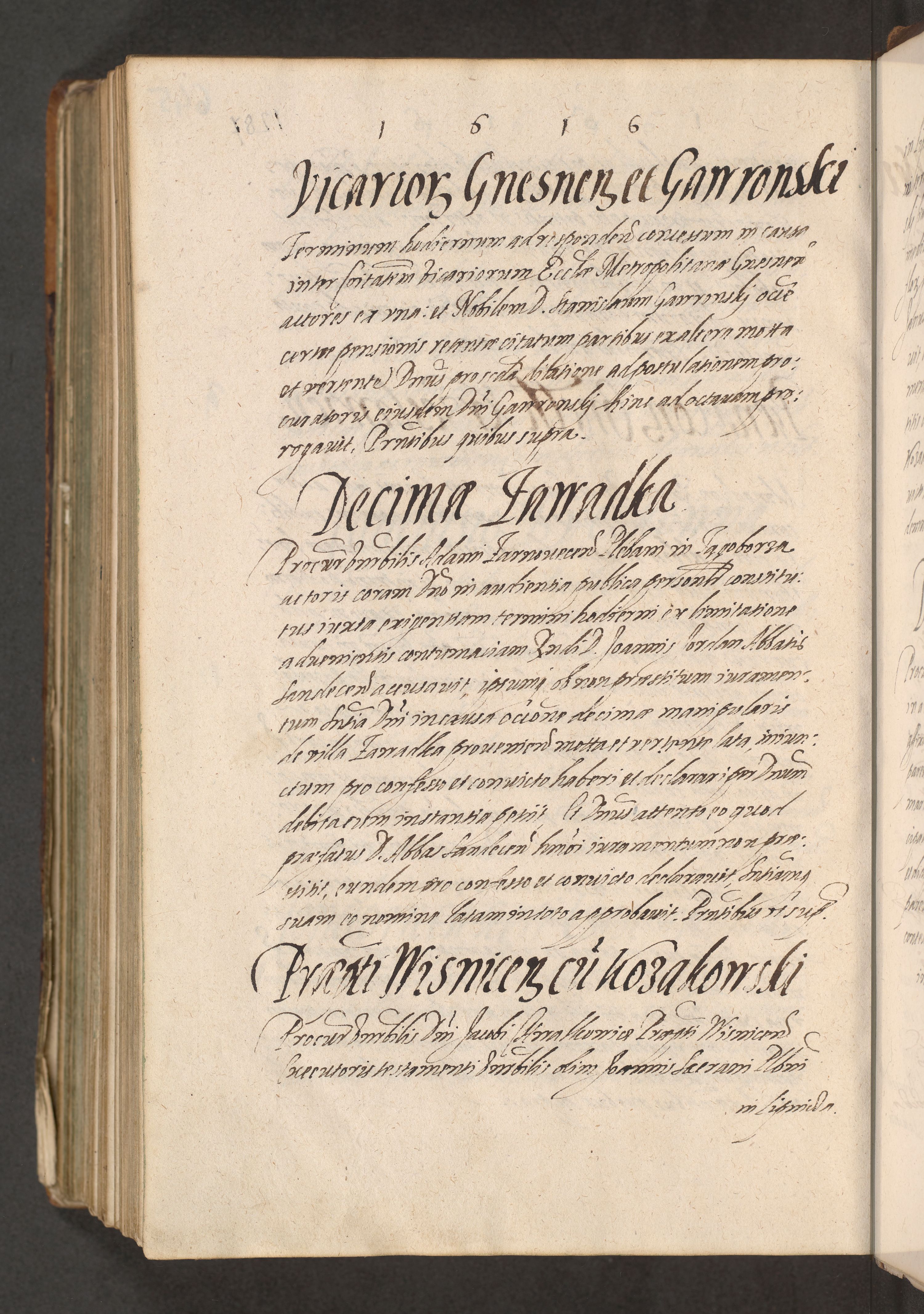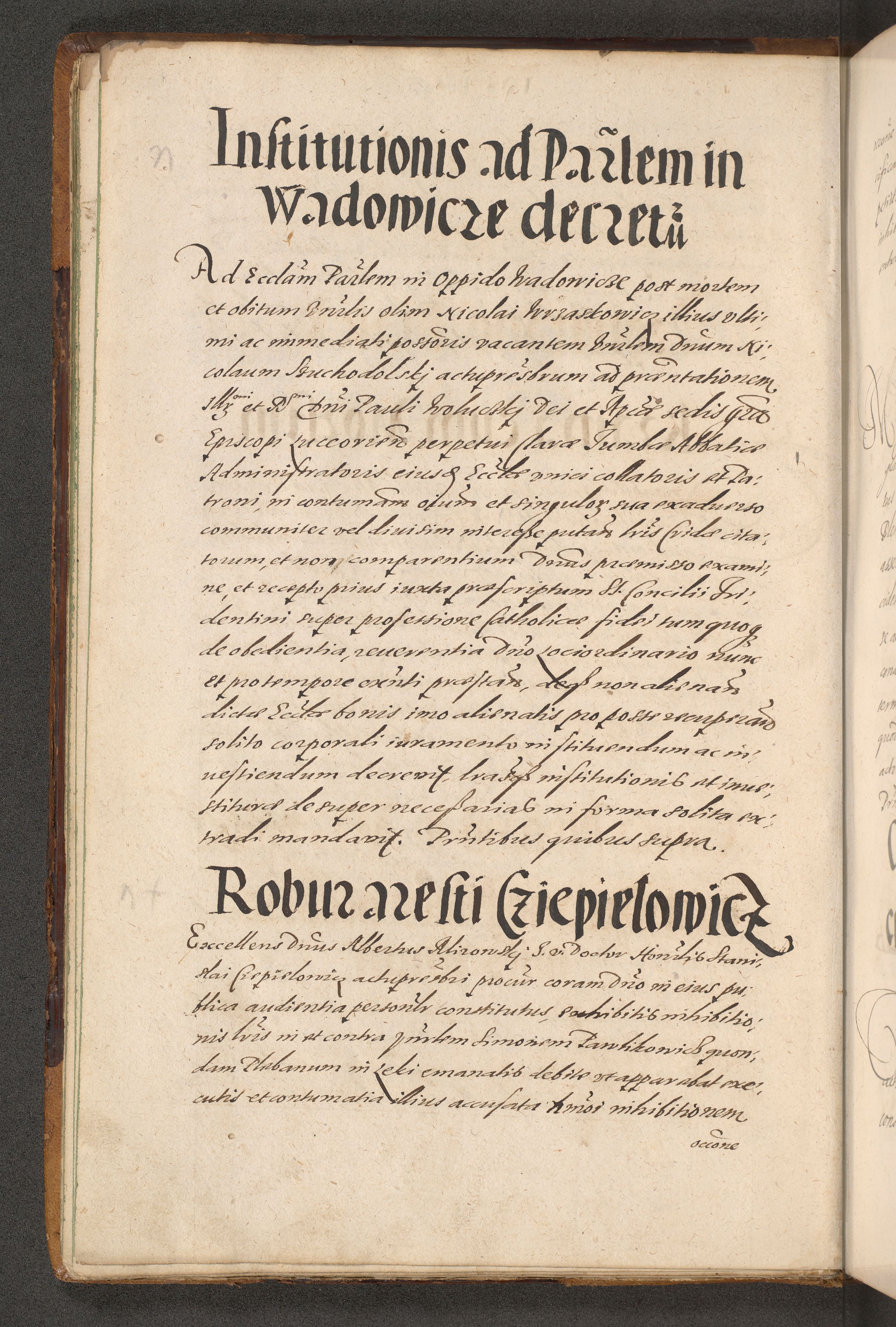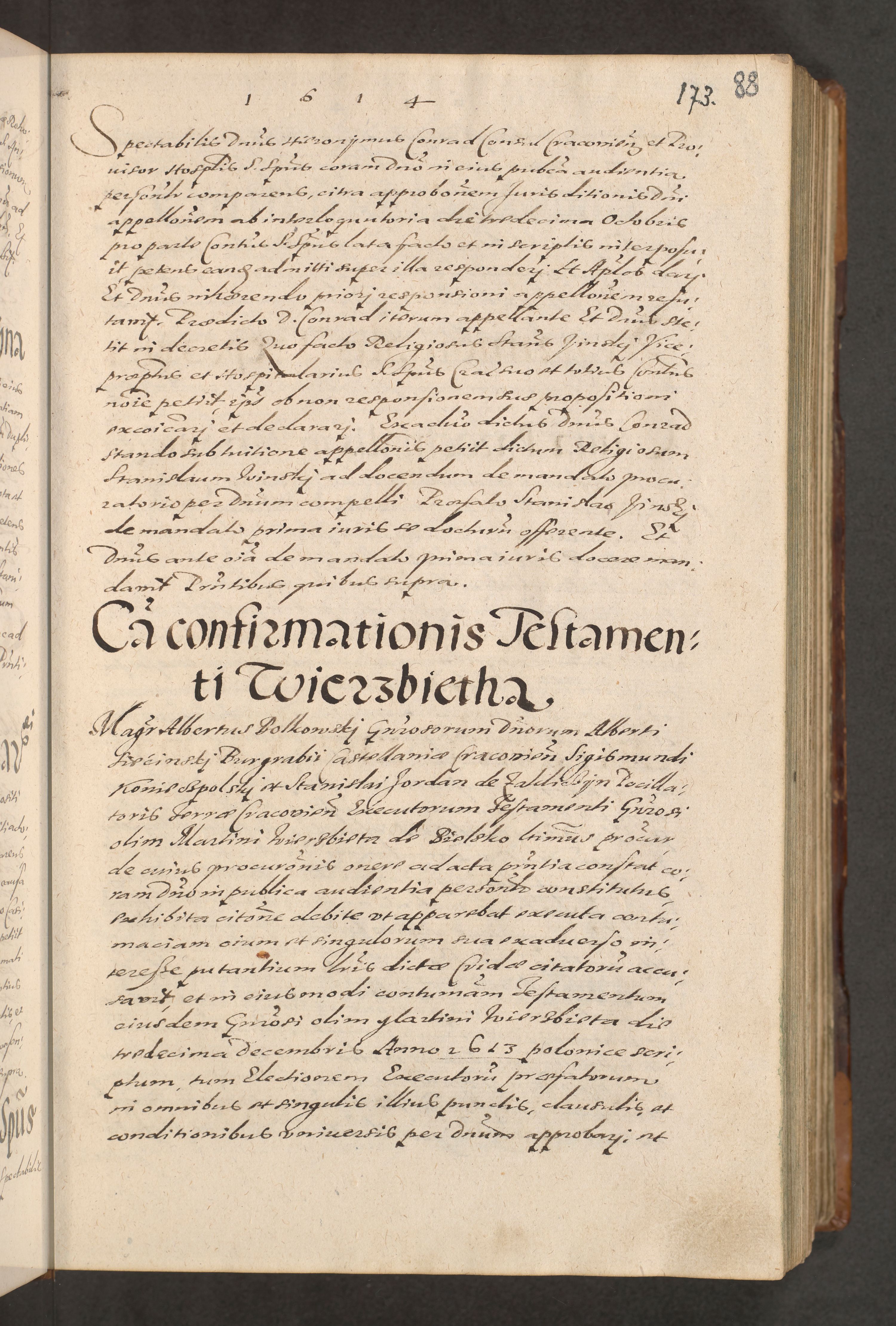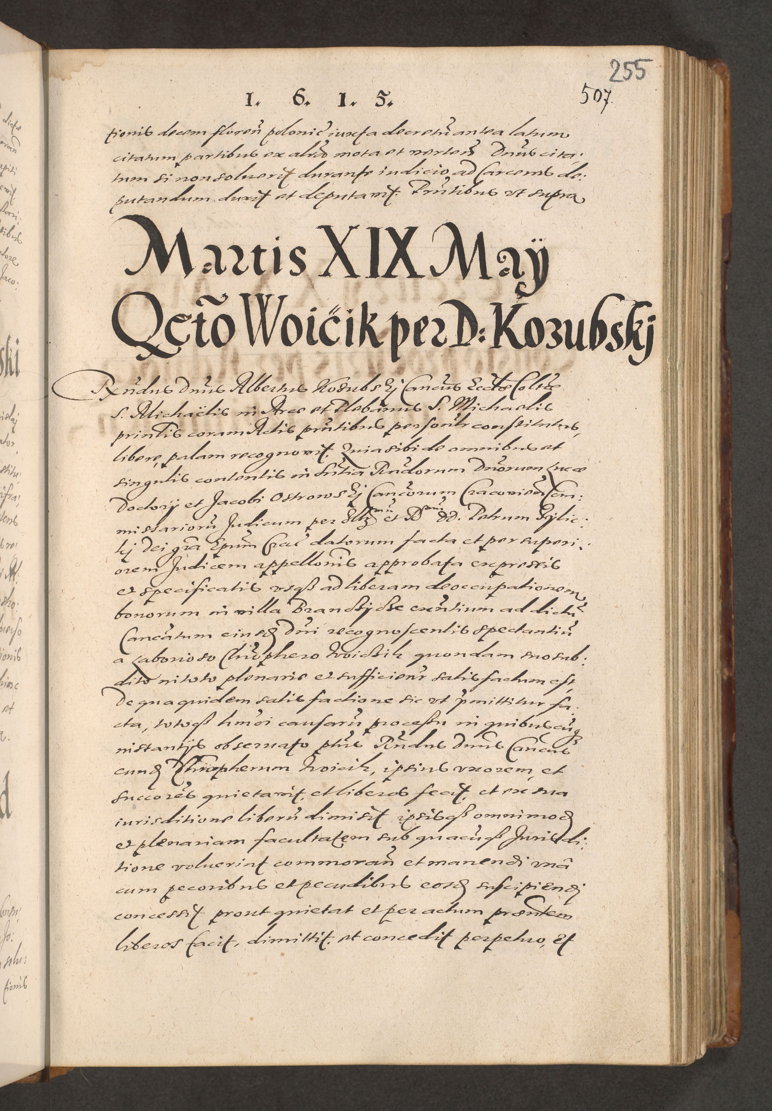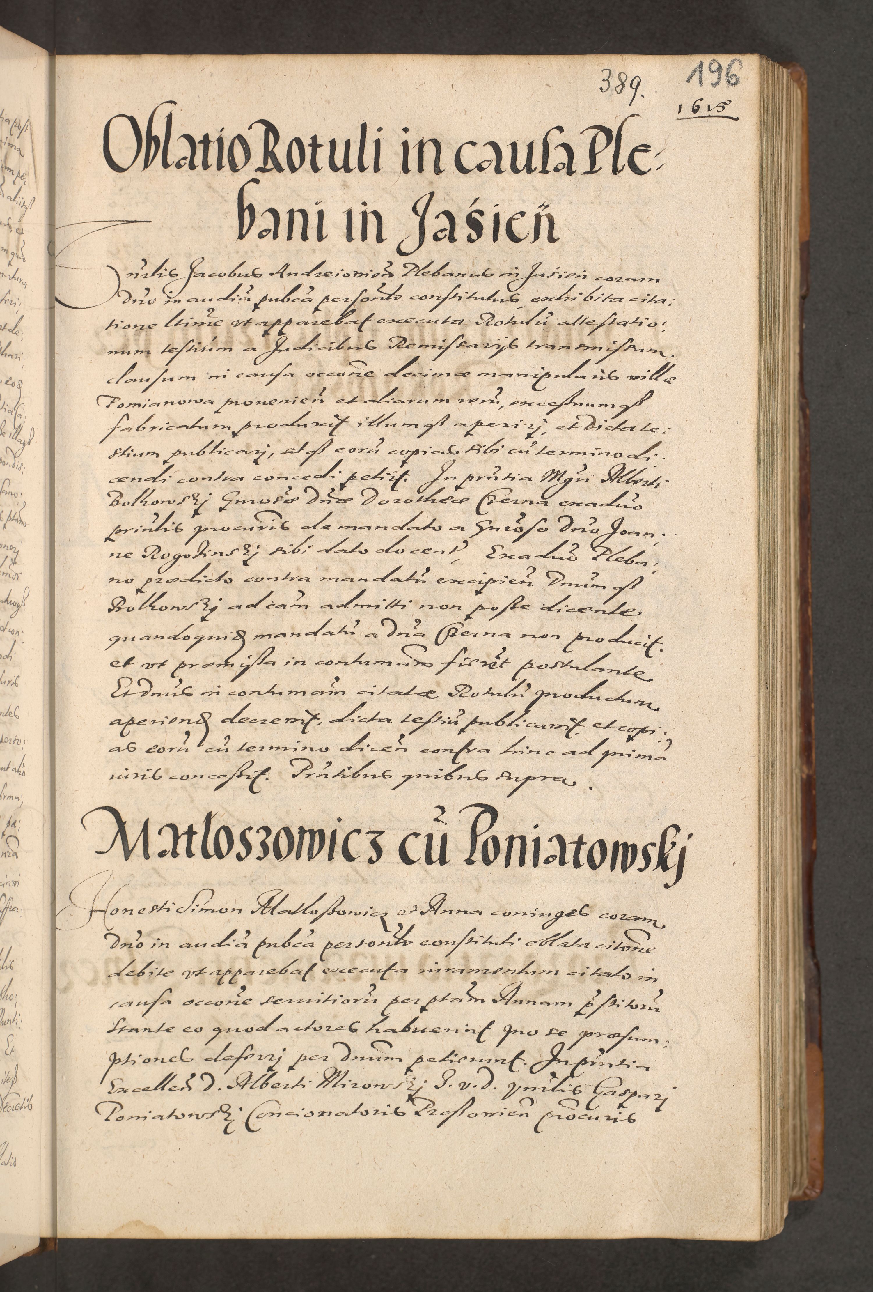 Illustrissimo et Reverendissimo in Christo Patre Domino Domino Petro Tylicki Dei et Apostolice Sedis Gratia Episcopo Cracoviensis Duce Severiensis Acta actorum causarum sententiarum tam interloquutoriarum quam definitivarum decretorum obligationum, quietationum, recognitionum, constitutionum procuratorum etc. etc. coram Admodum Reverendo Domino Thoma Oborski I. V. Doctore Canonico Vicario in Spiritualibus et Officiali generali Cracoviensis in anno Domini Millesimo Sexcentessimo Decimoquarto Cuius Indictio duodecima Pontificus SS. D. N. D. Pauli Divina providentia Papae quinti Anno decimo foeliciter incipiunt