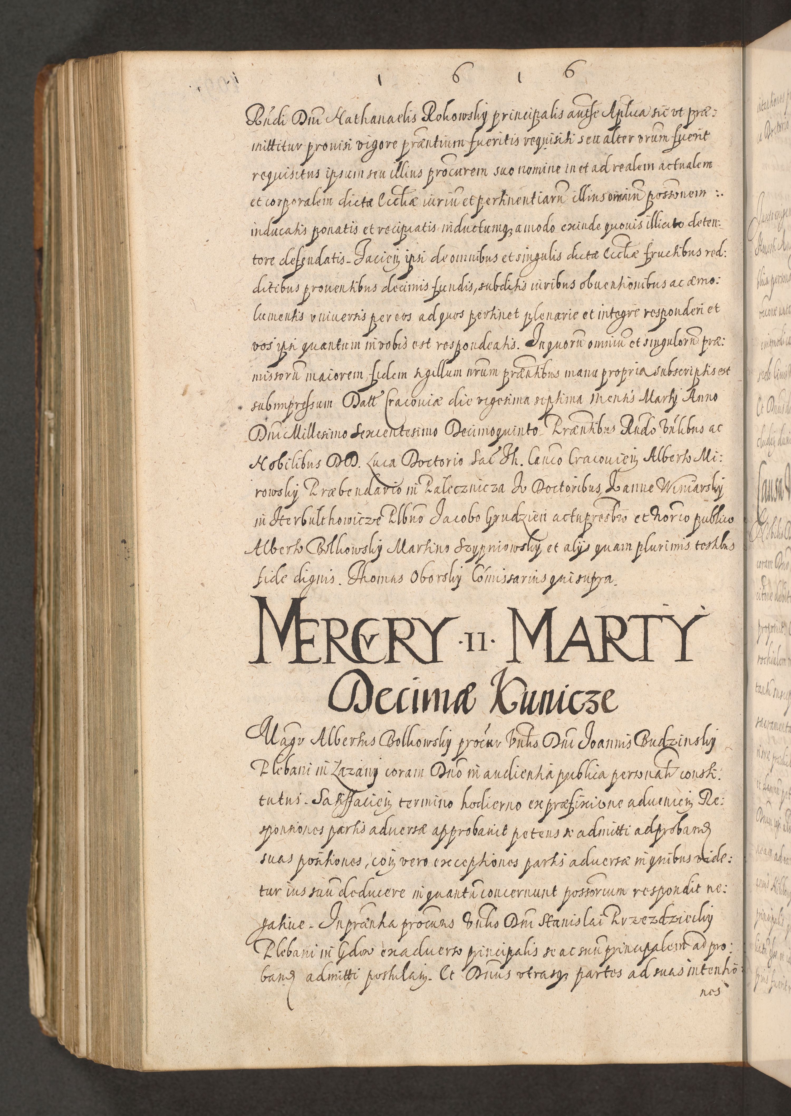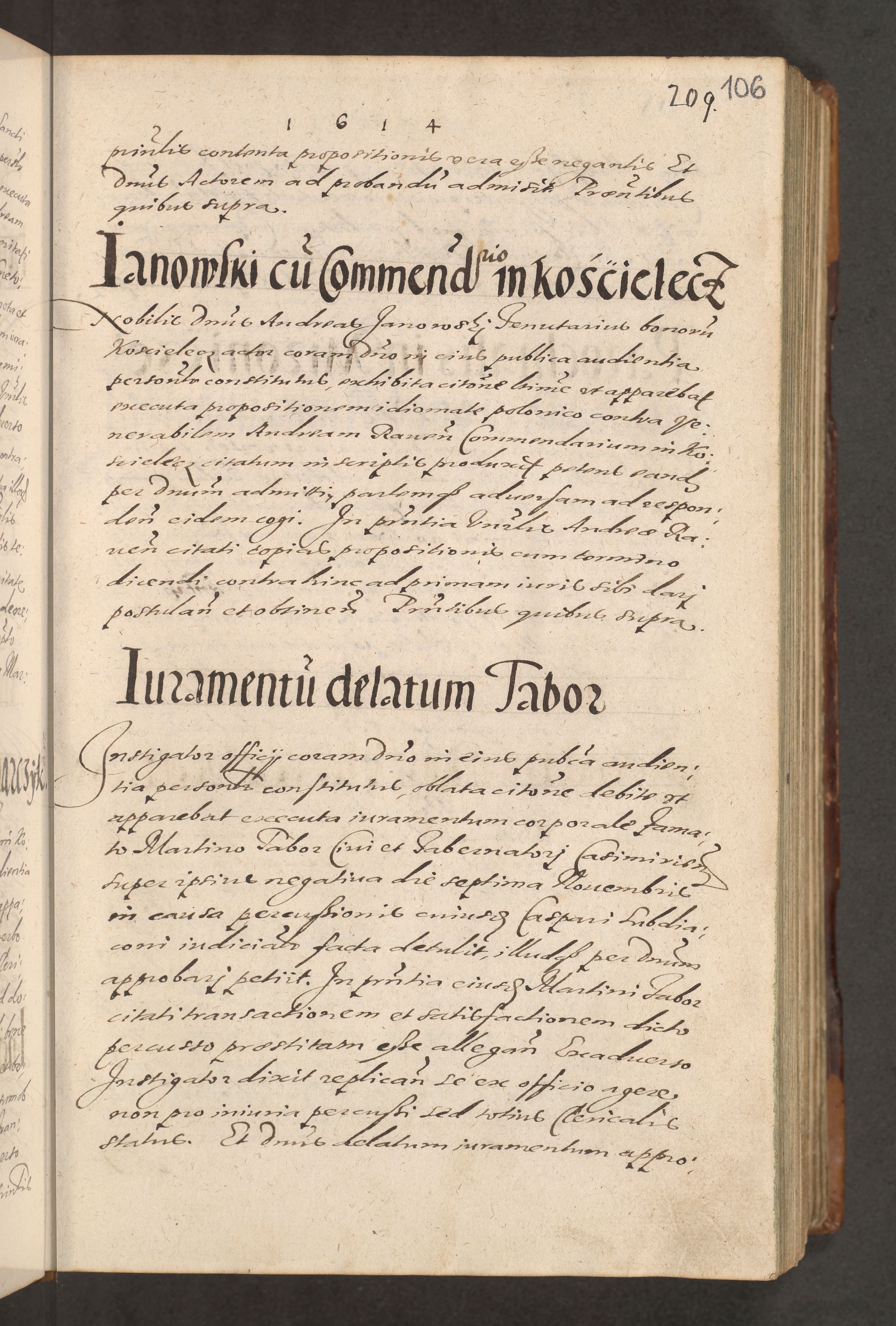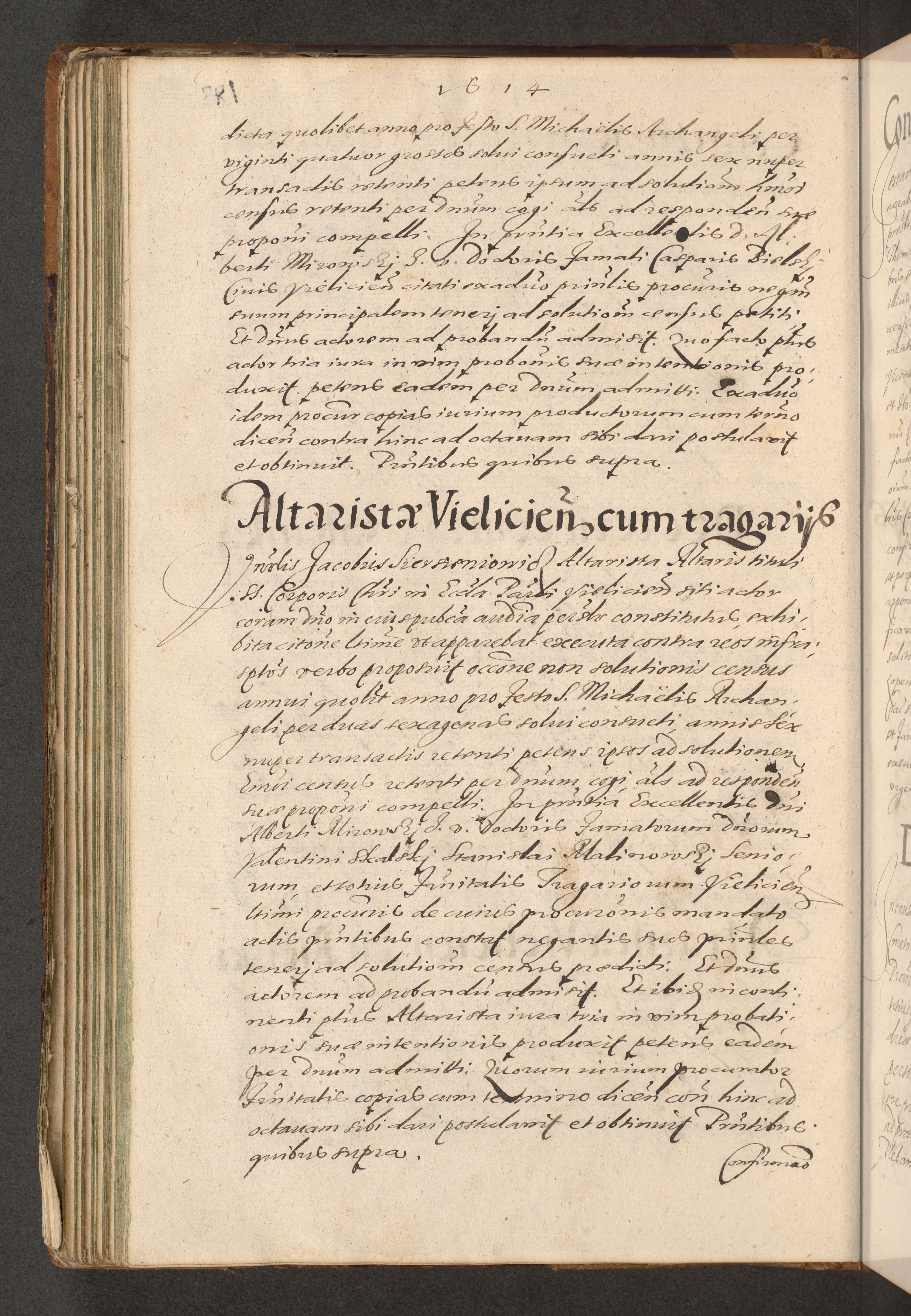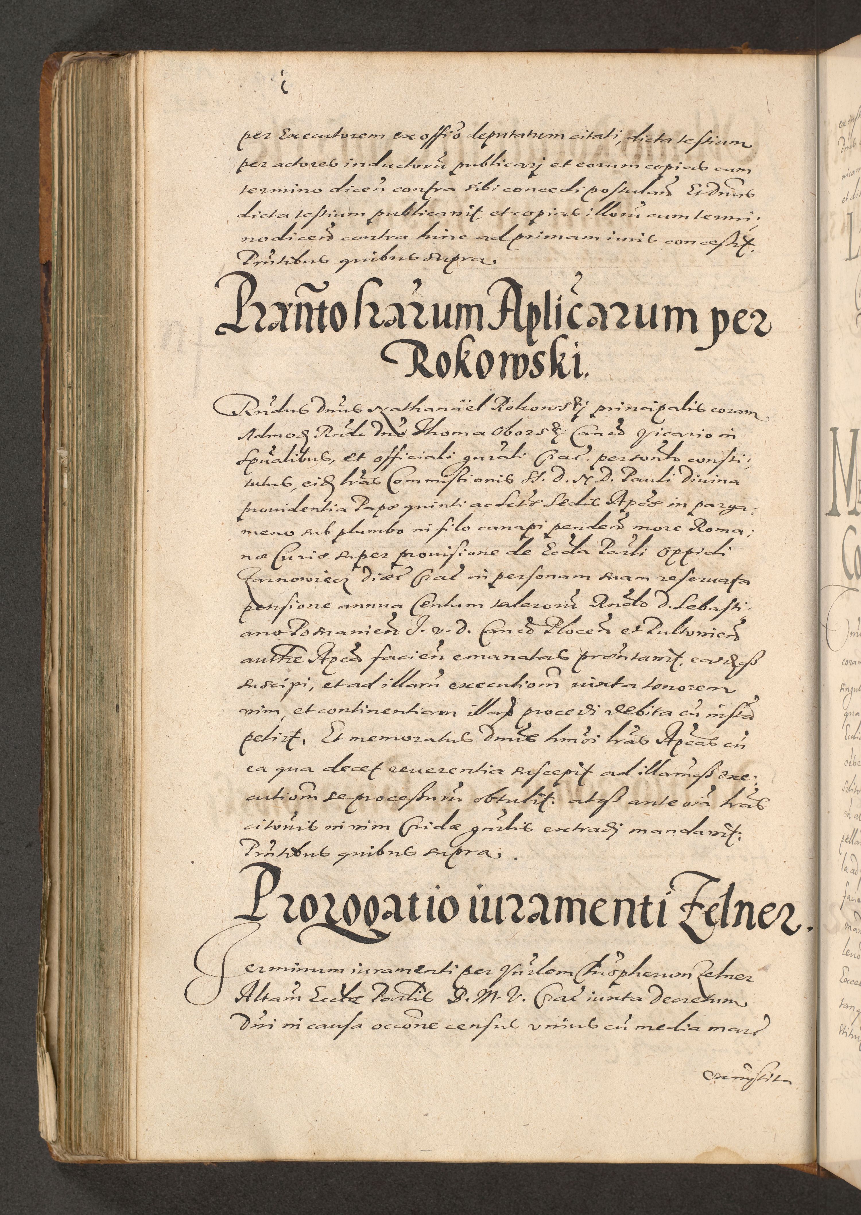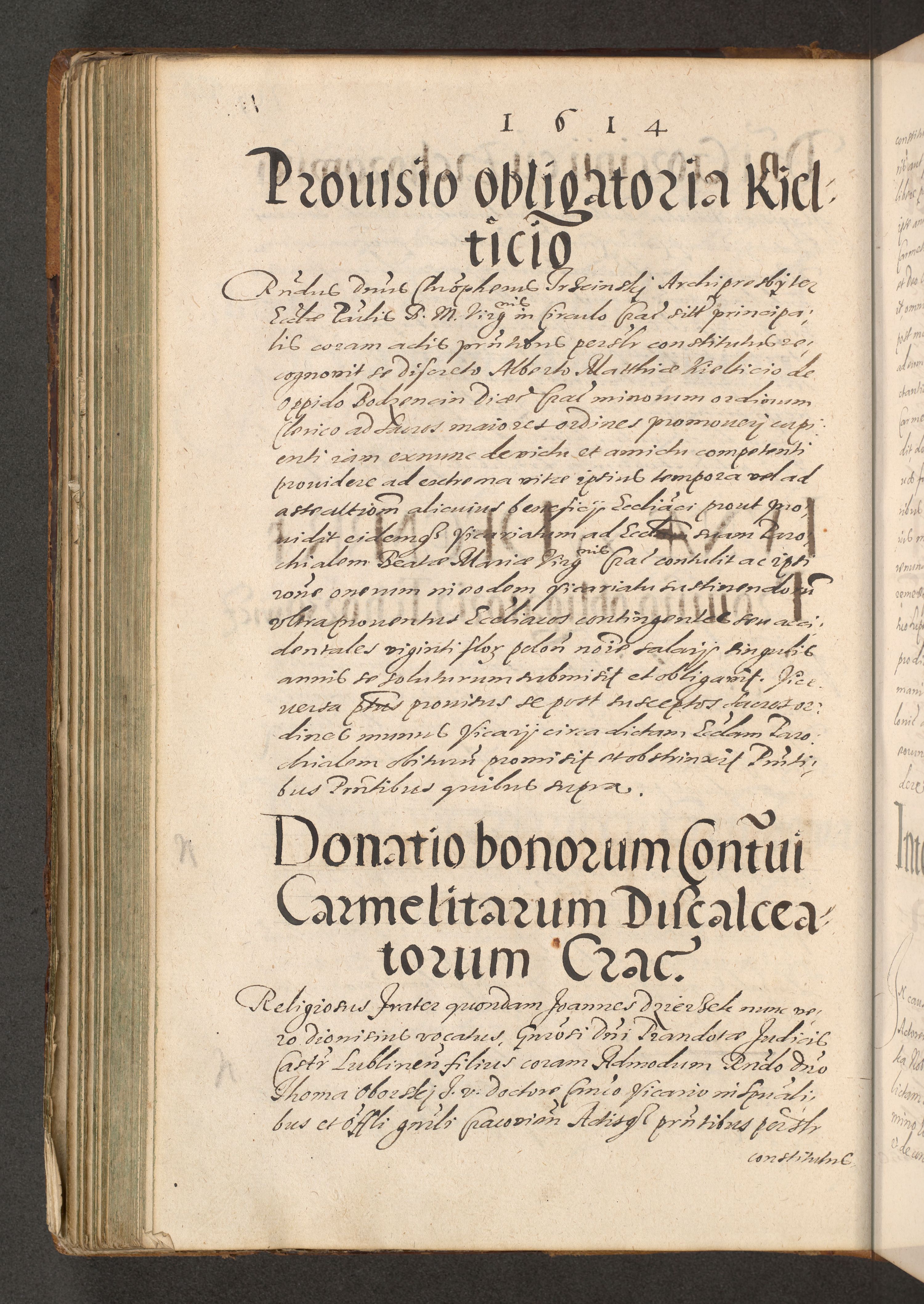 Illustrissimo et Reverendissimo in Christo Patre Domino Domino Petro Tylicki Dei et Apostolice Sedis Gratia Episcopo Cracoviensis Duce Severiensis Acta actorum causarum sententiarum tam interloquutoriarum quam definitivarum decretorum obligationum, quietationum, recognitionum, constitutionum procuratorum etc. etc. coram Admodum Reverendo Domino Thoma Oborski I. V. Doctore Canonico Vicario in Spiritualibus et Officiali generali Cracoviensis in anno Domini Millesimo Sexcentessimo Decimoquarto Cuius Indictio duodecima Pontificus SS. D. N. D. Pauli Divina providentia Papae quinti Anno decimo foeliciter incipiunt