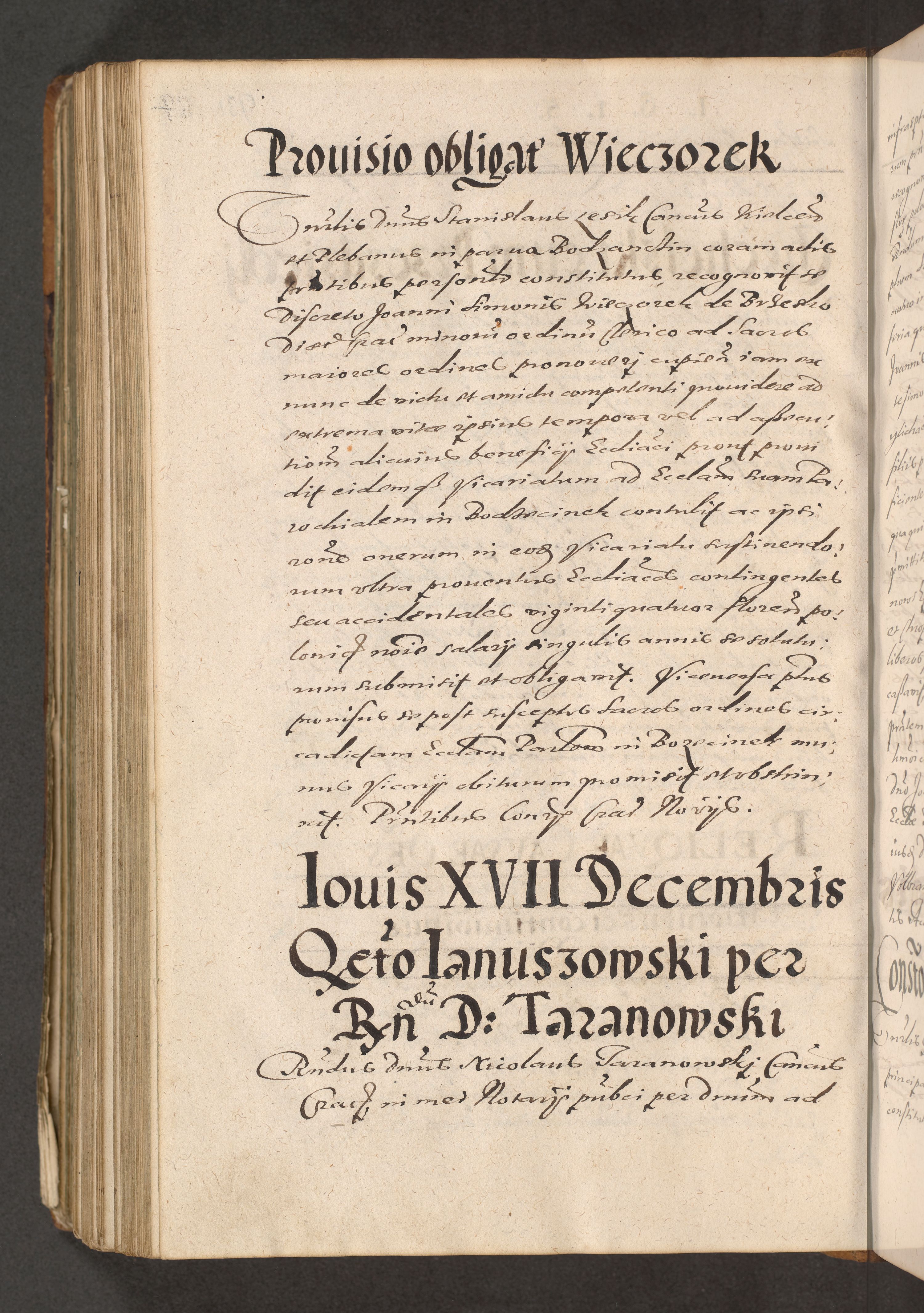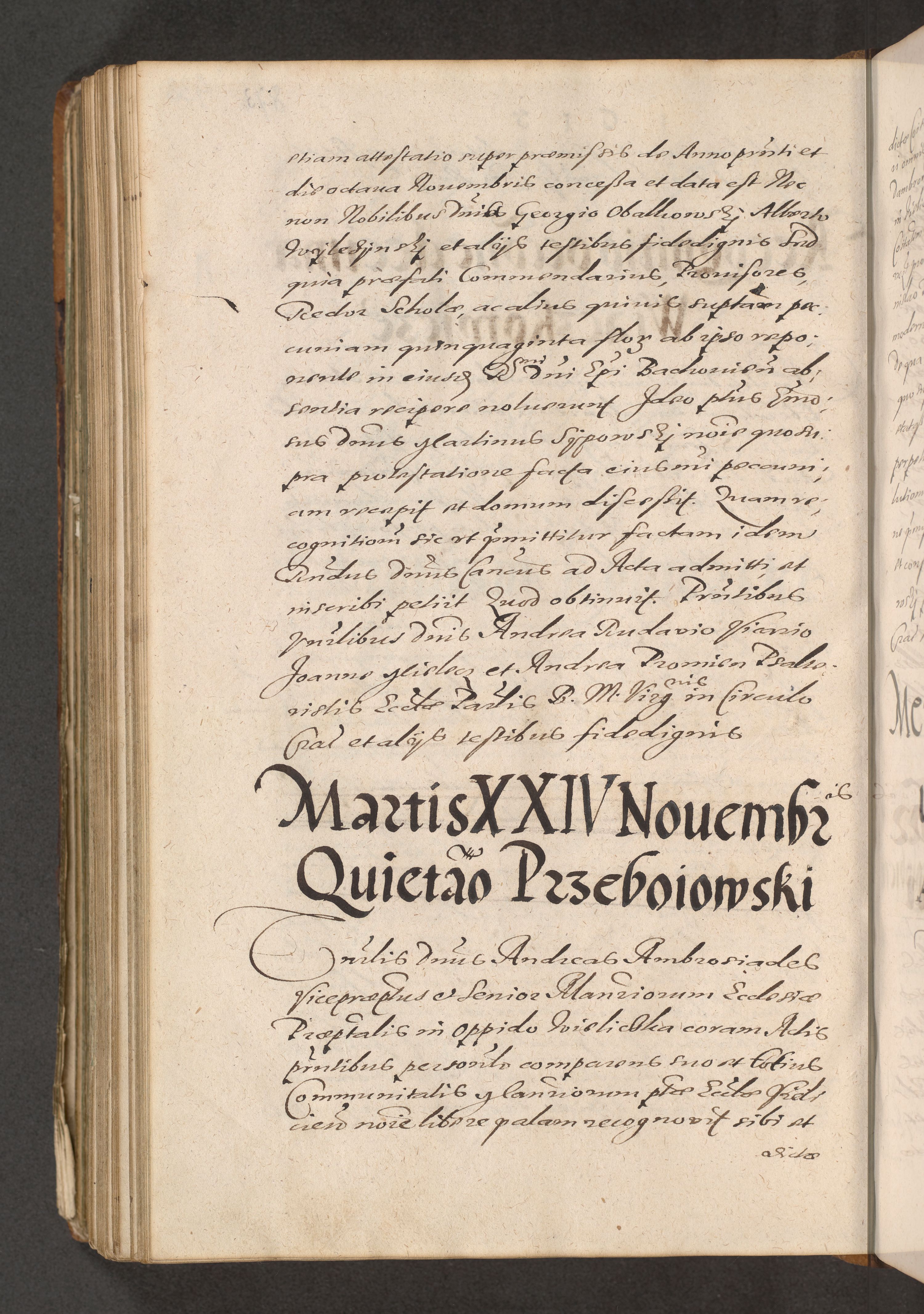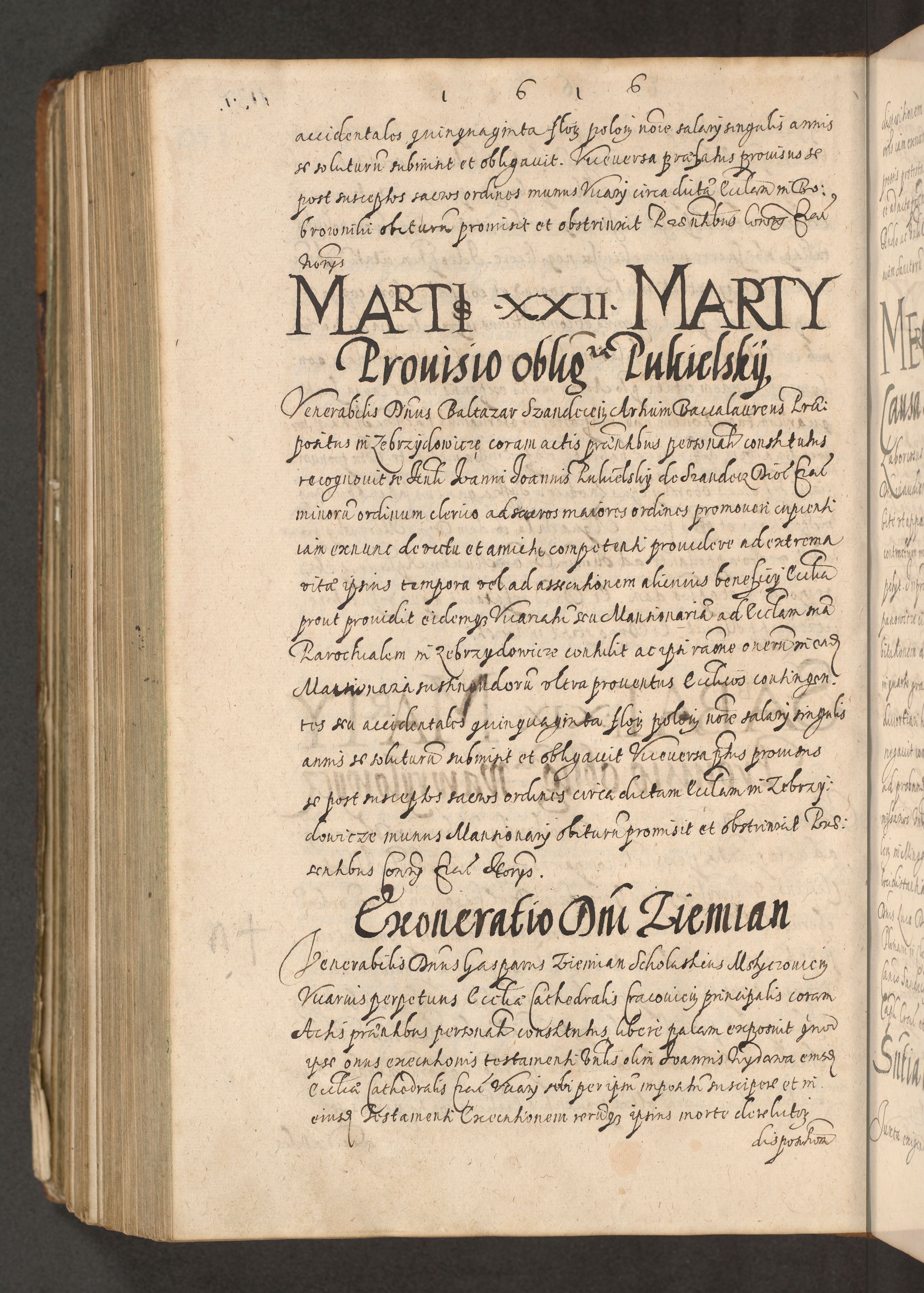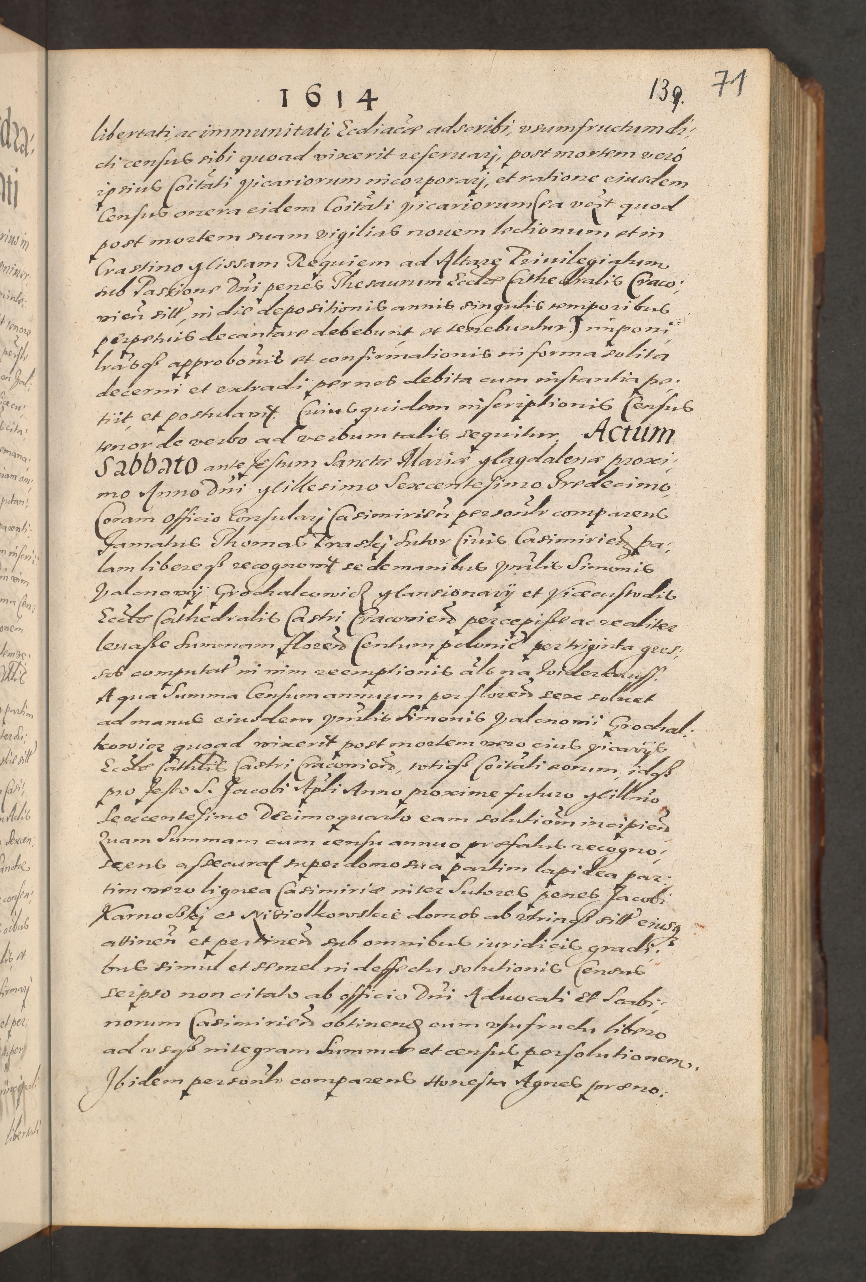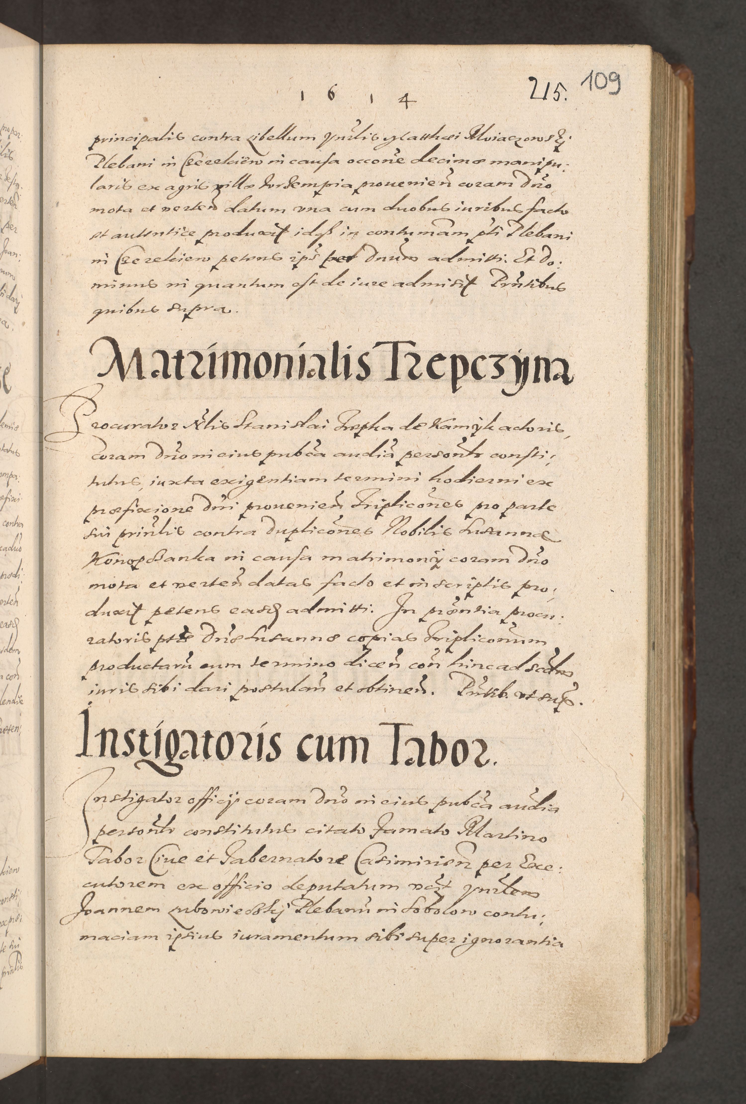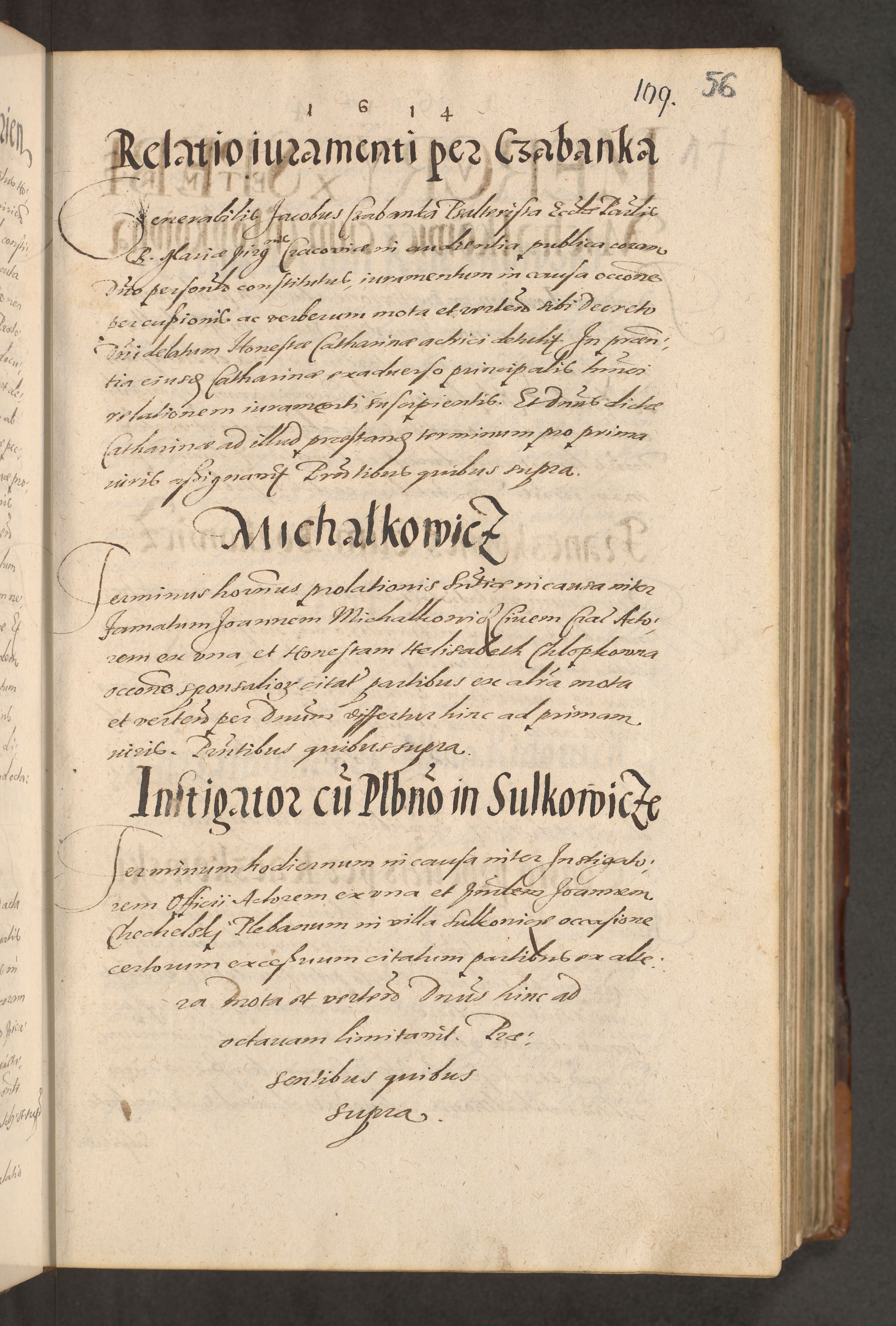 Illustrissimo et Reverendissimo in Christo Patre Domino Domino Petro Tylicki Dei et Apostolice Sedis Gratia Episcopo Cracoviensis Duce Severiensis Acta actorum causarum sententiarum tam interloquutoriarum quam definitivarum decretorum obligationum, quietationum, recognitionum, constitutionum procuratorum etc. etc. coram Admodum Reverendo Domino Thoma Oborski I. V. Doctore Canonico Vicario in Spiritualibus et Officiali generali Cracoviensis in anno Domini Millesimo Sexcentessimo Decimoquarto Cuius Indictio duodecima Pontificus SS. D. N. D. Pauli Divina providentia Papae quinti Anno decimo foeliciter incipiunt