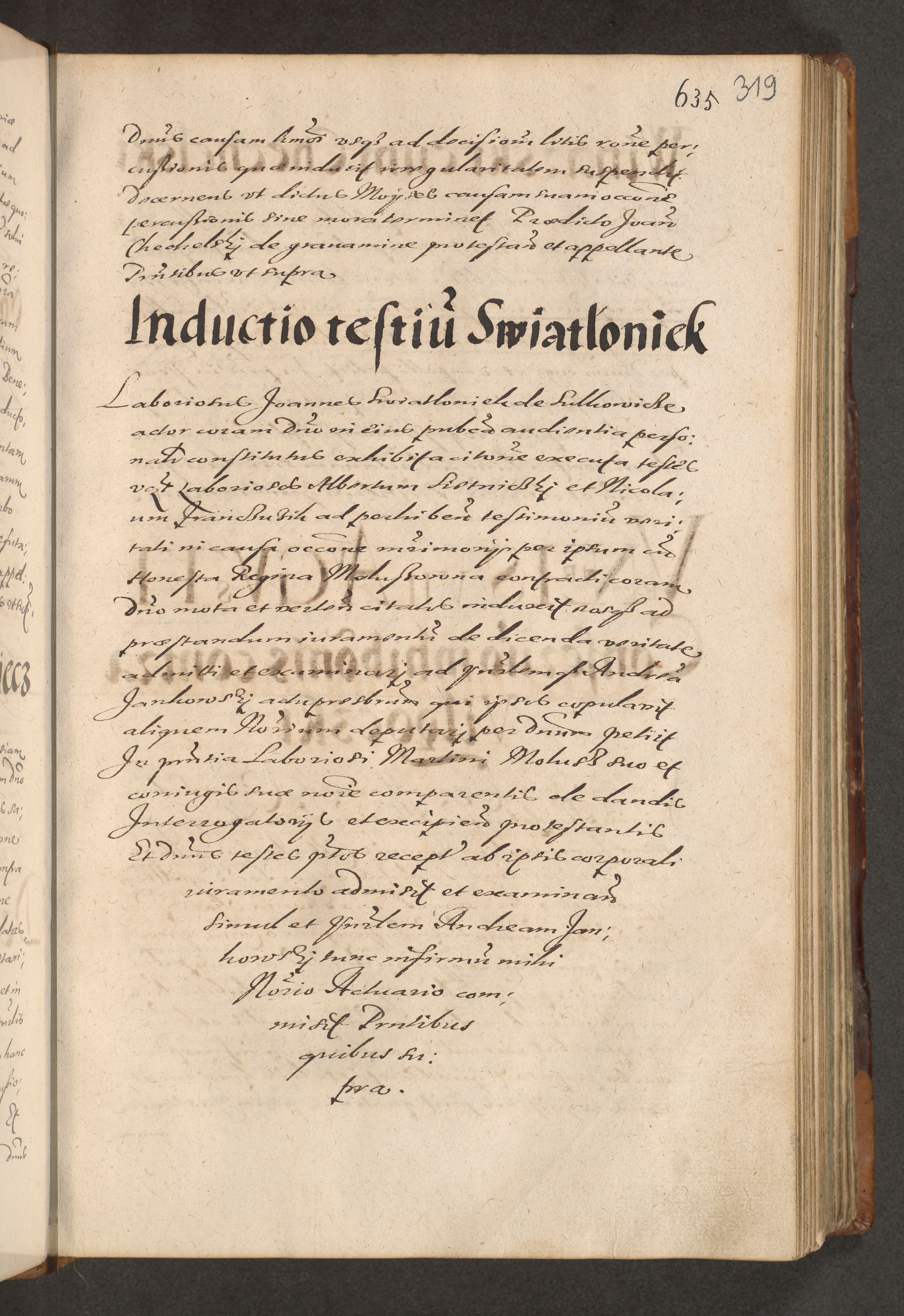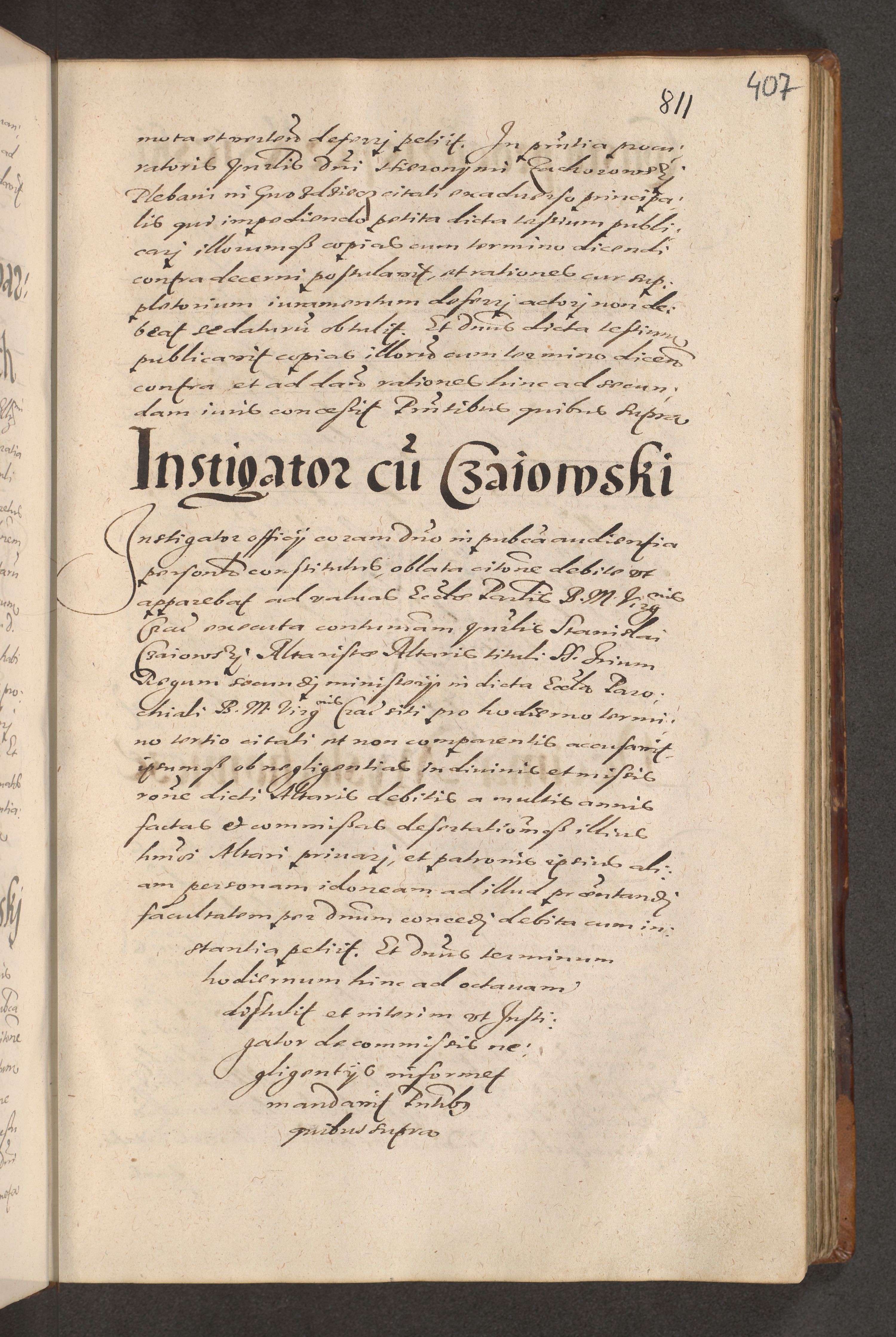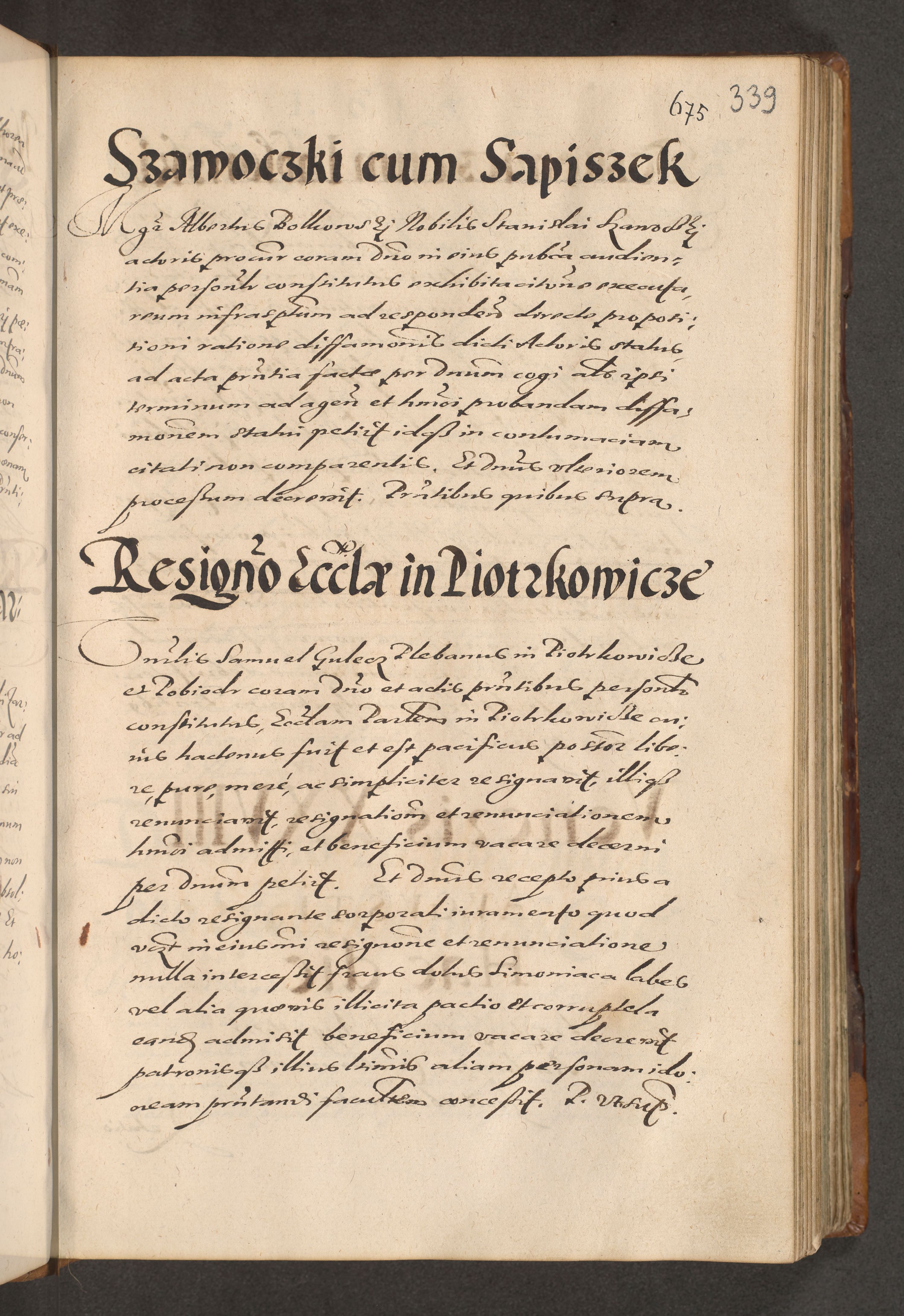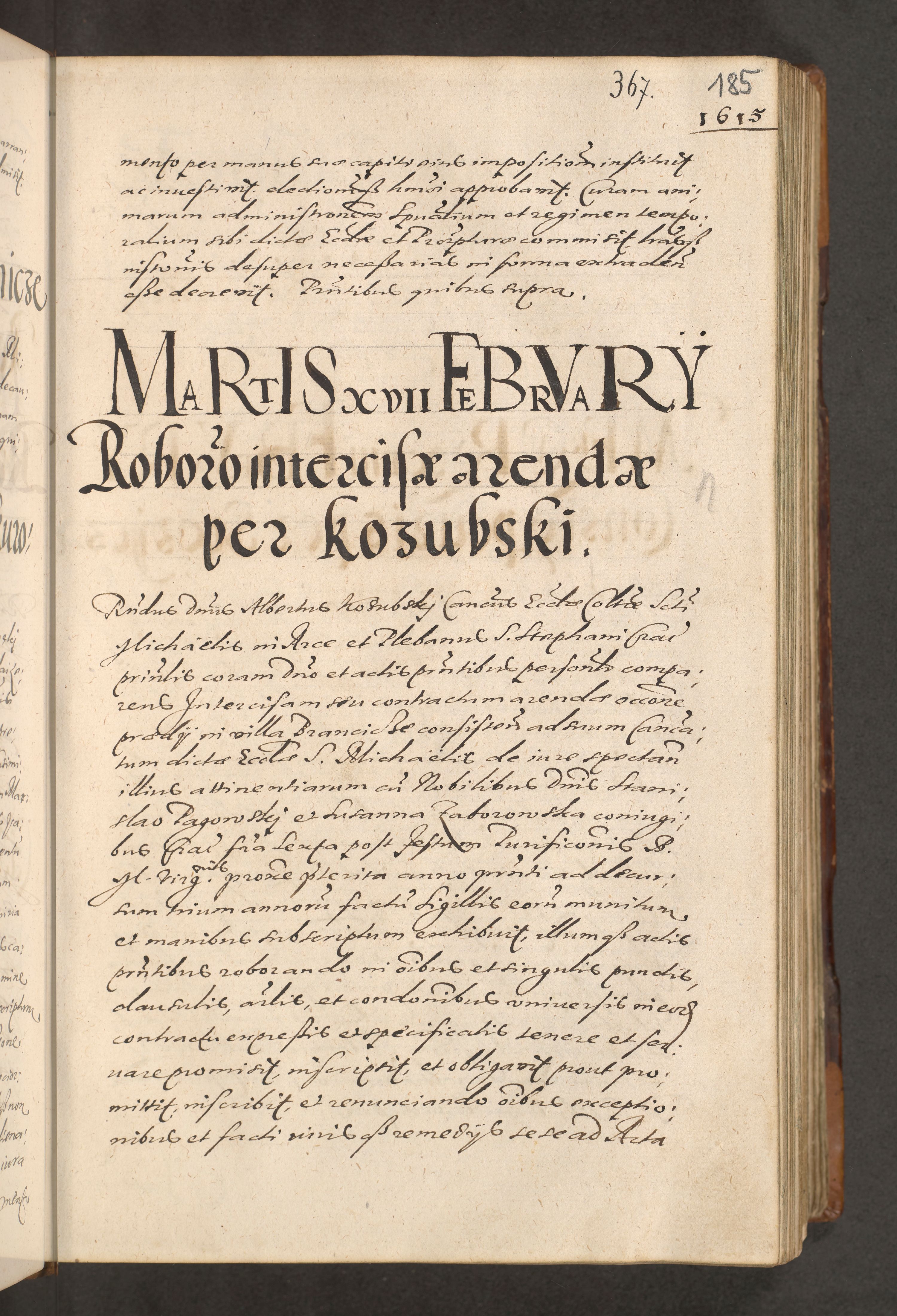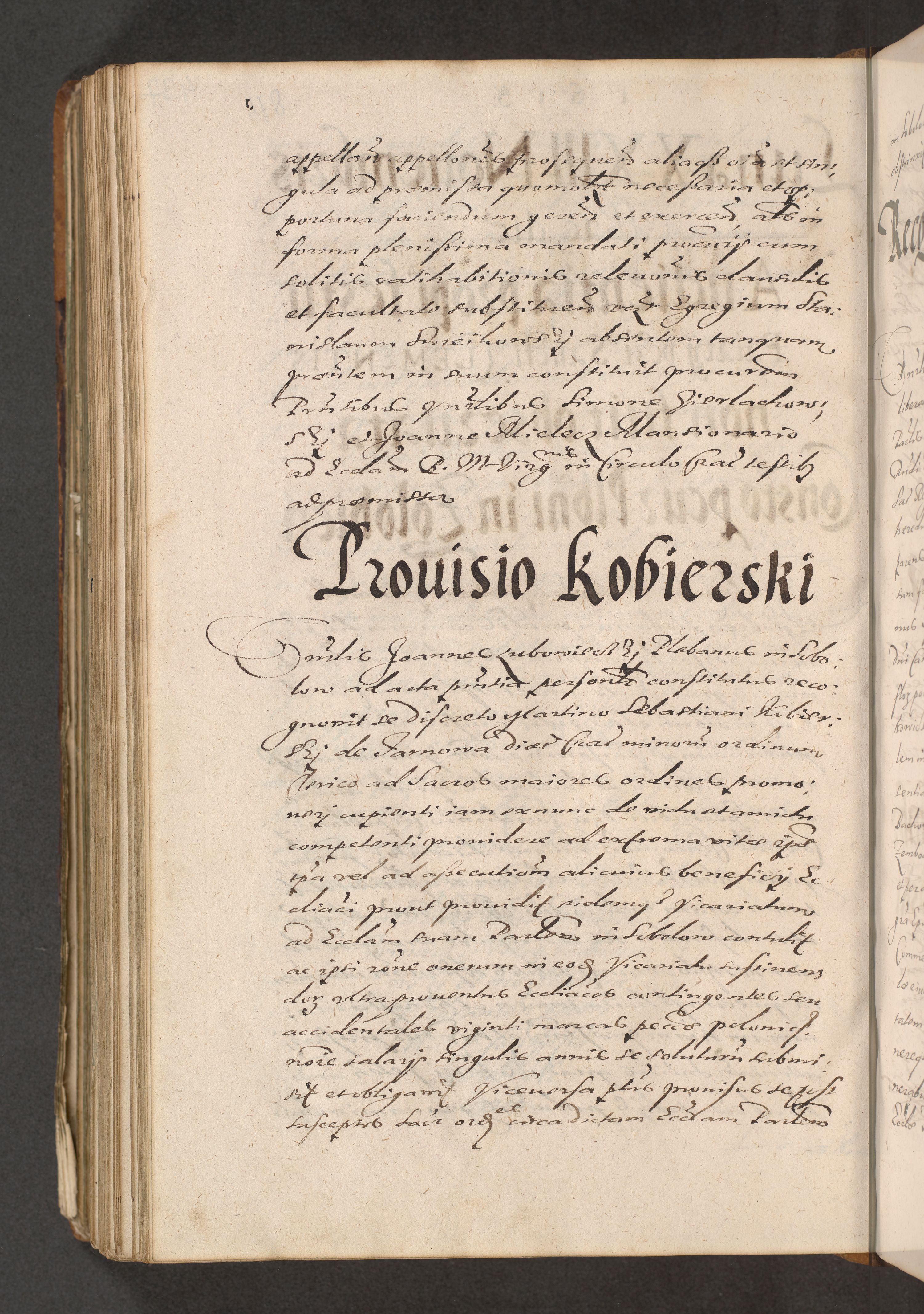 Illustrissimo et Reverendissimo in Christo Patre Domino Domino Petro Tylicki Dei et Apostolice Sedis Gratia Episcopo Cracoviensis Duce Severiensis Acta actorum causarum sententiarum tam interloquutoriarum quam definitivarum decretorum obligationum, quietationum, recognitionum, constitutionum procuratorum etc. etc. coram Admodum Reverendo Domino Thoma Oborski I. V. Doctore Canonico Vicario in Spiritualibus et Officiali generali Cracoviensis in anno Domini Millesimo Sexcentessimo Decimoquarto Cuius Indictio duodecima Pontificus SS. D. N. D. Pauli Divina providentia Papae quinti Anno decimo foeliciter incipiunt