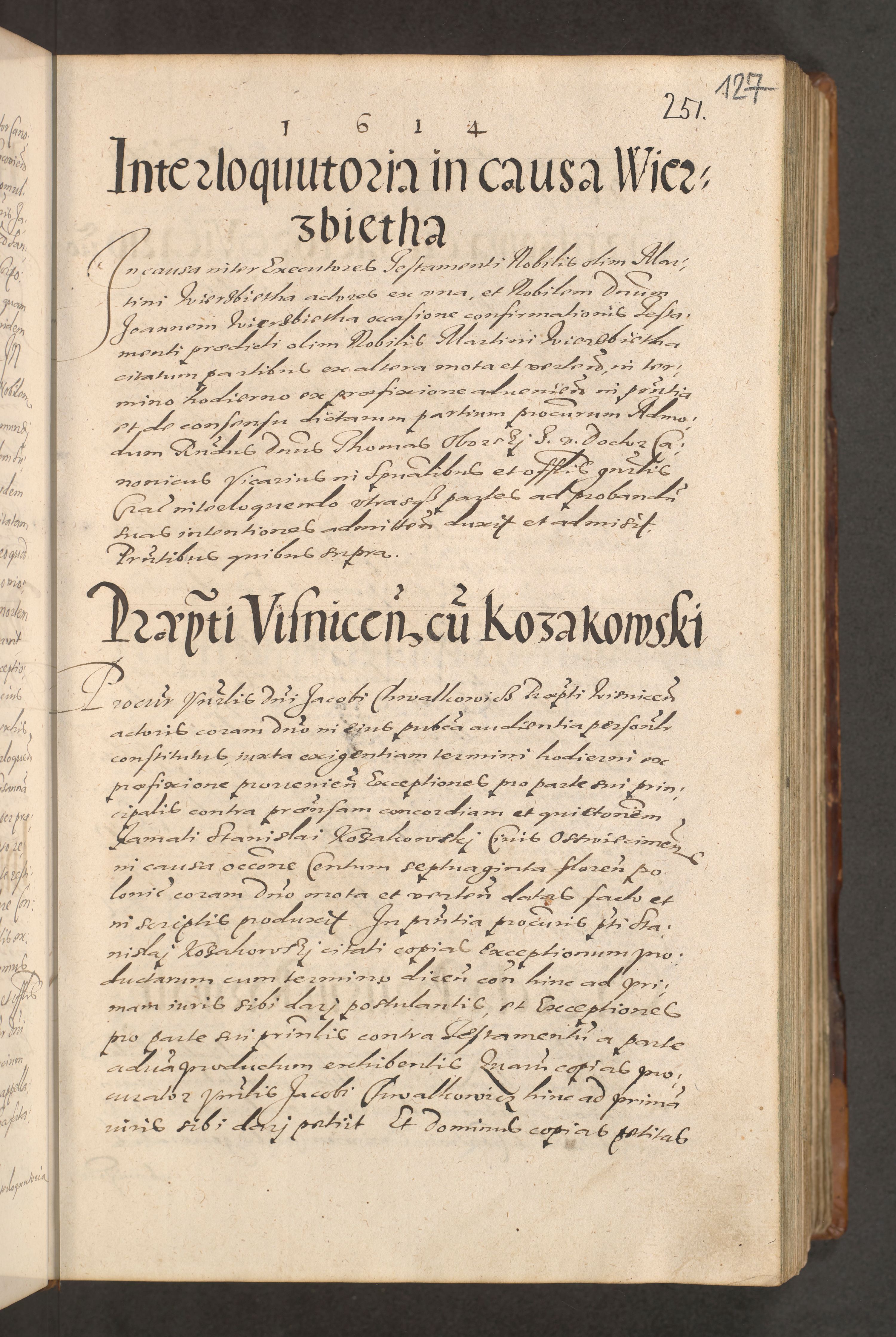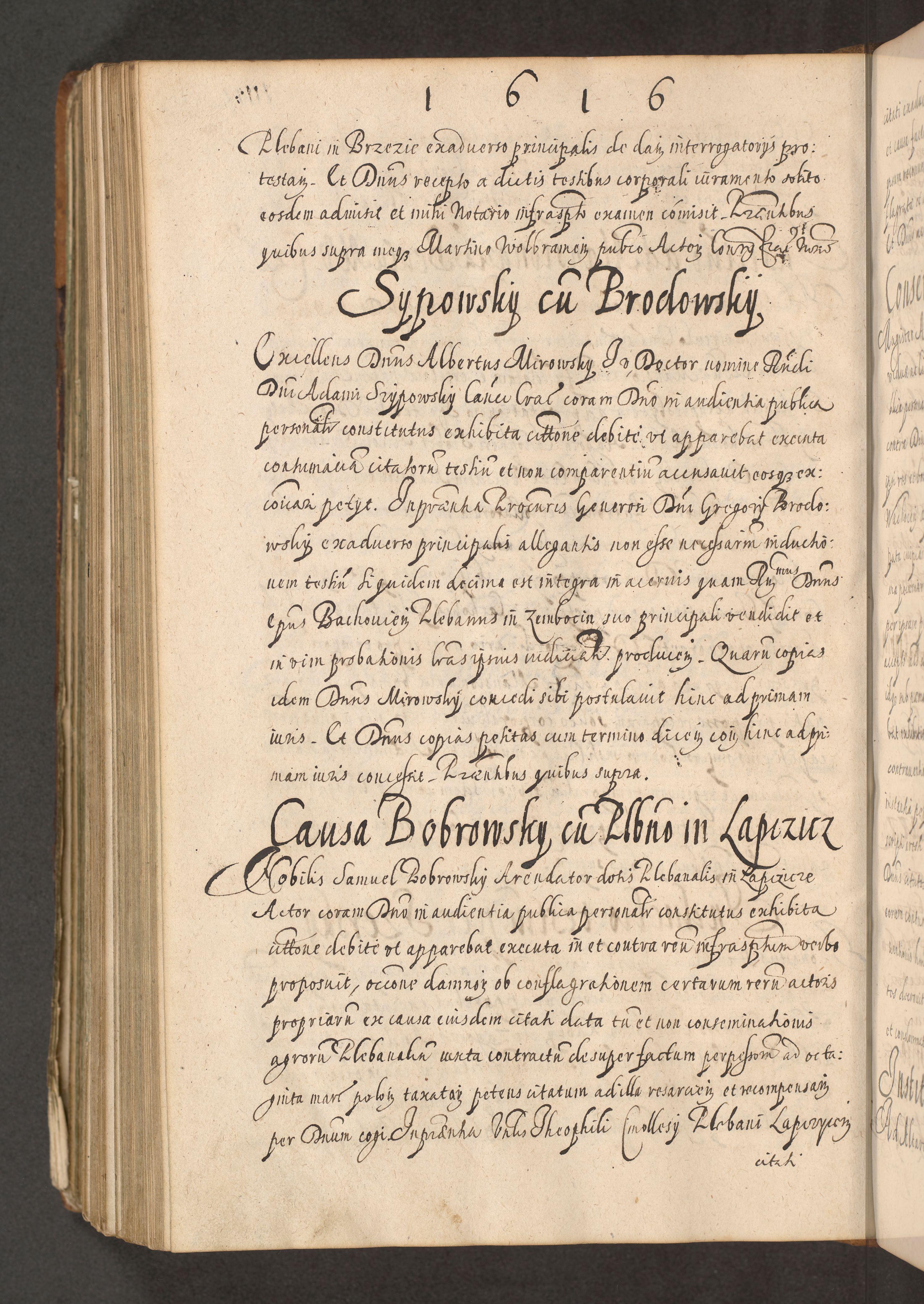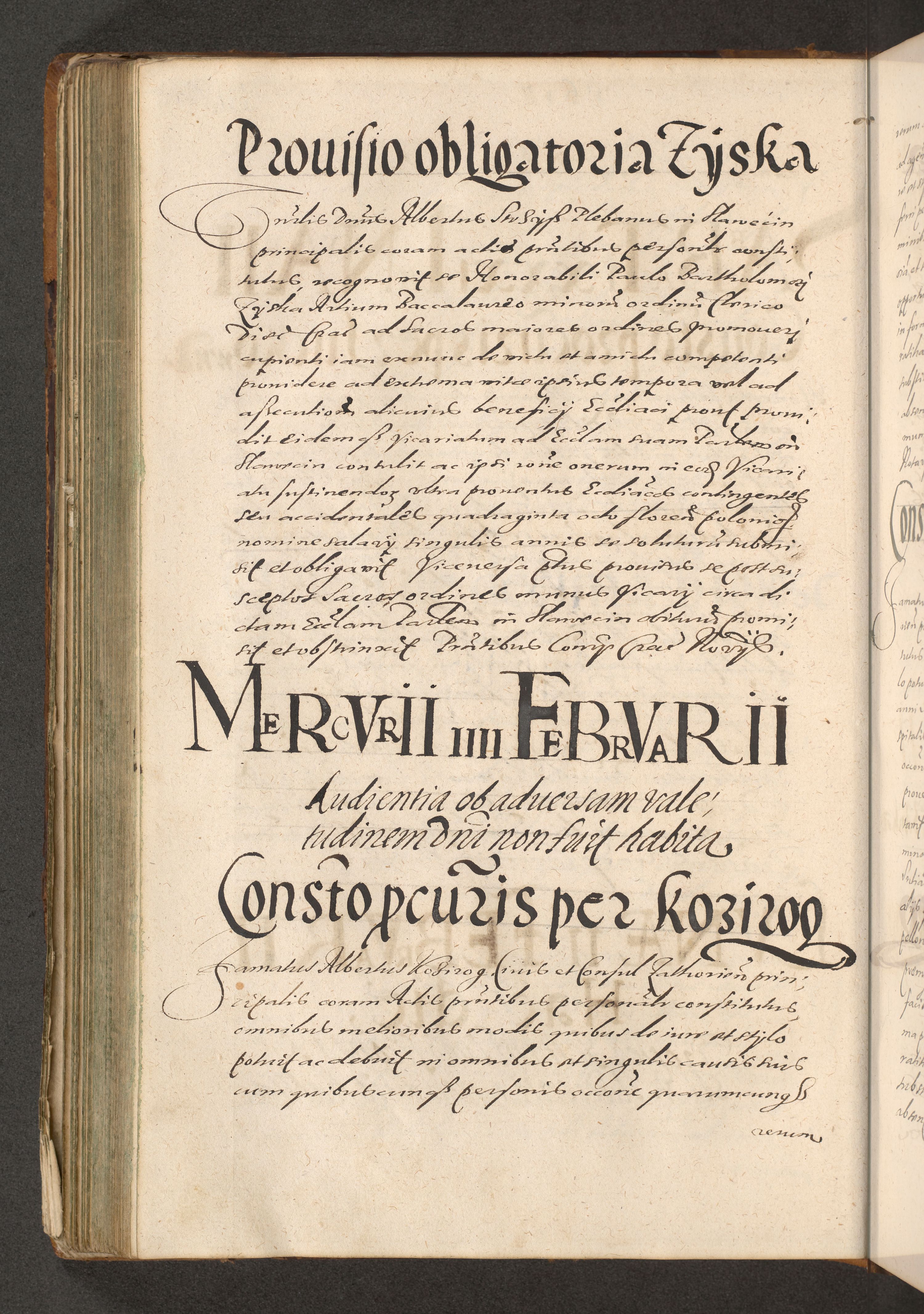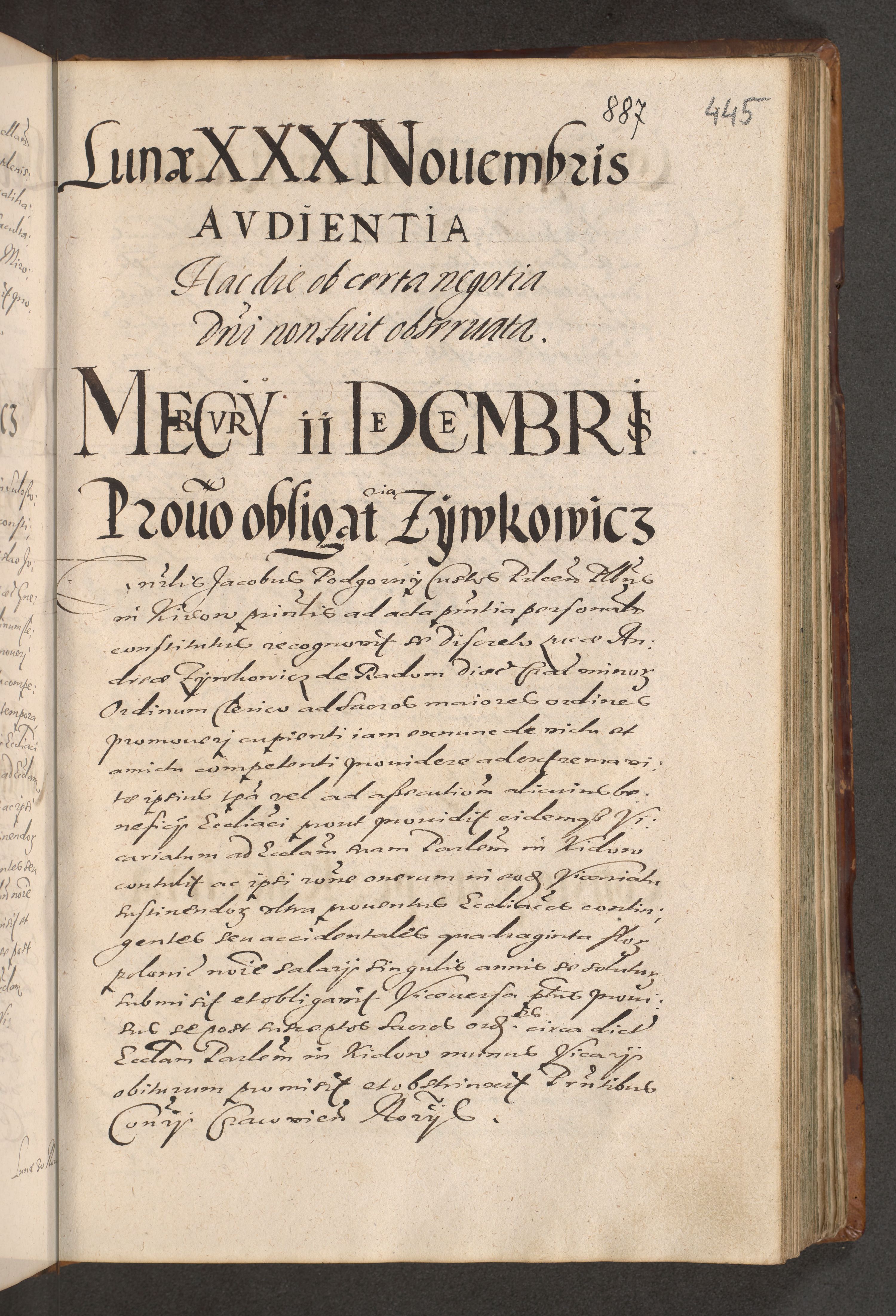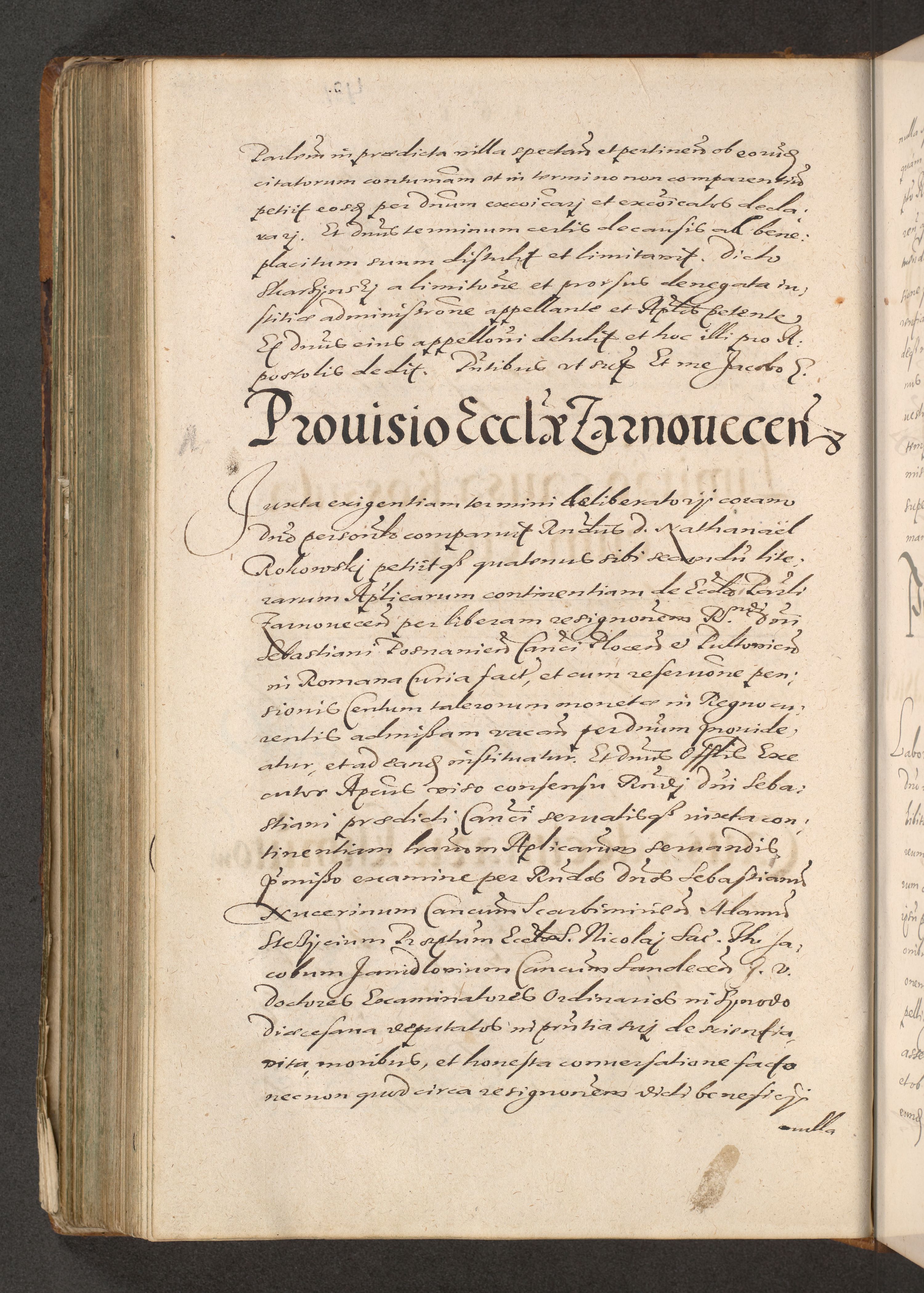 Illustrissimo et Reverendissimo in Christo Patre Domino Domino Petro Tylicki Dei et Apostolice Sedis Gratia Episcopo Cracoviensis Duce Severiensis Acta actorum causarum sententiarum tam interloquutoriarum quam definitivarum decretorum obligationum, quietationum, recognitionum, constitutionum procuratorum etc. etc. coram Admodum Reverendo Domino Thoma Oborski I. V. Doctore Canonico Vicario in Spiritualibus et Officiali generali Cracoviensis in anno Domini Millesimo Sexcentessimo Decimoquarto Cuius Indictio duodecima Pontificus SS. D. N. D. Pauli Divina providentia Papae quinti Anno decimo foeliciter incipiunt