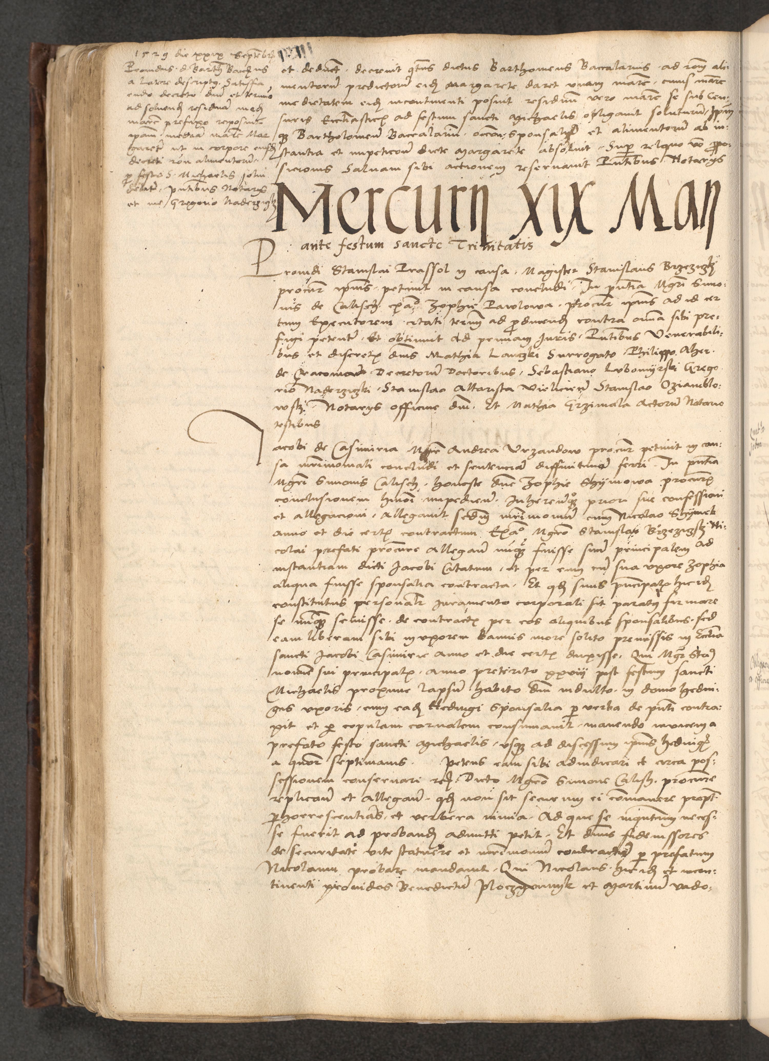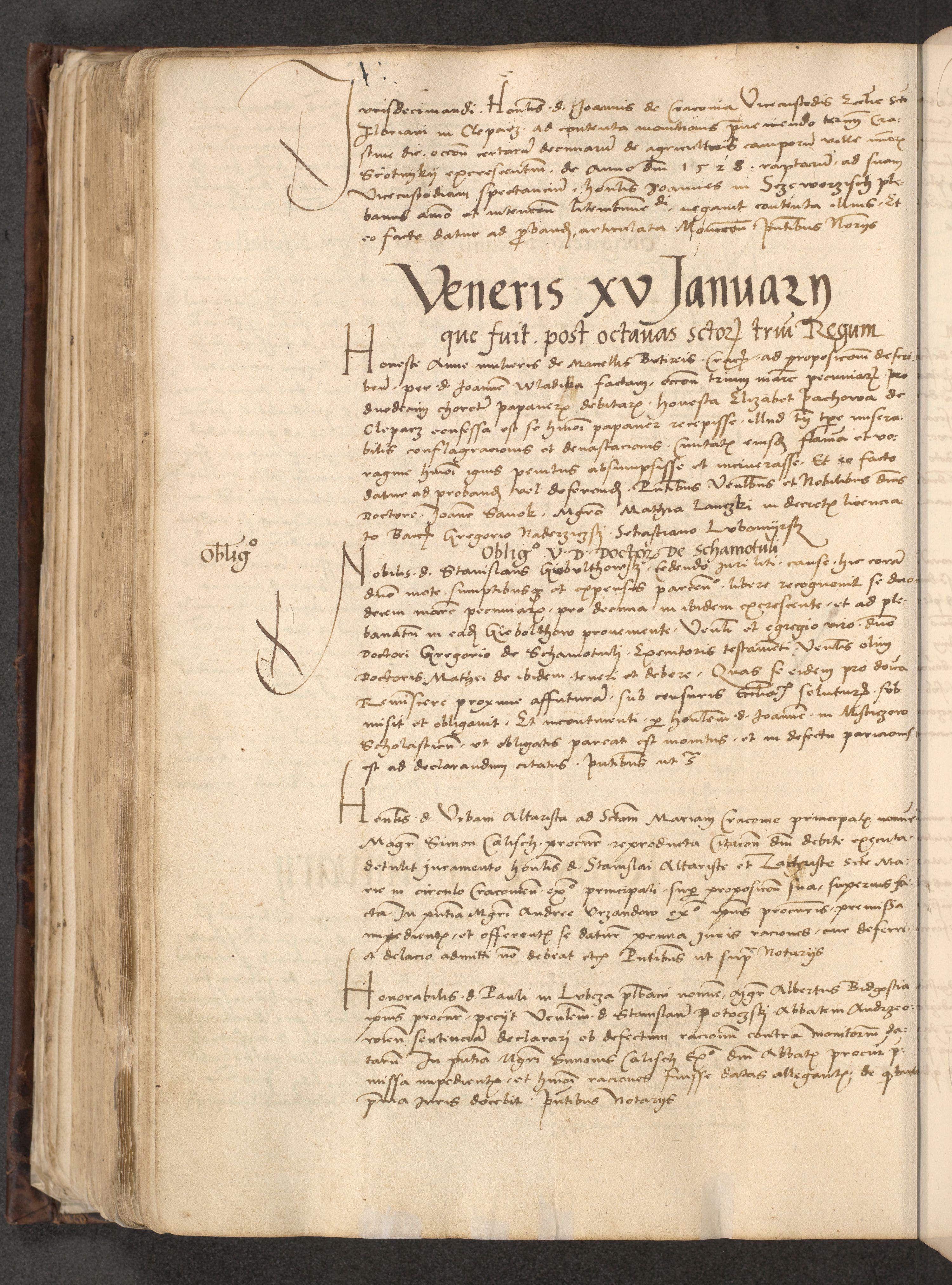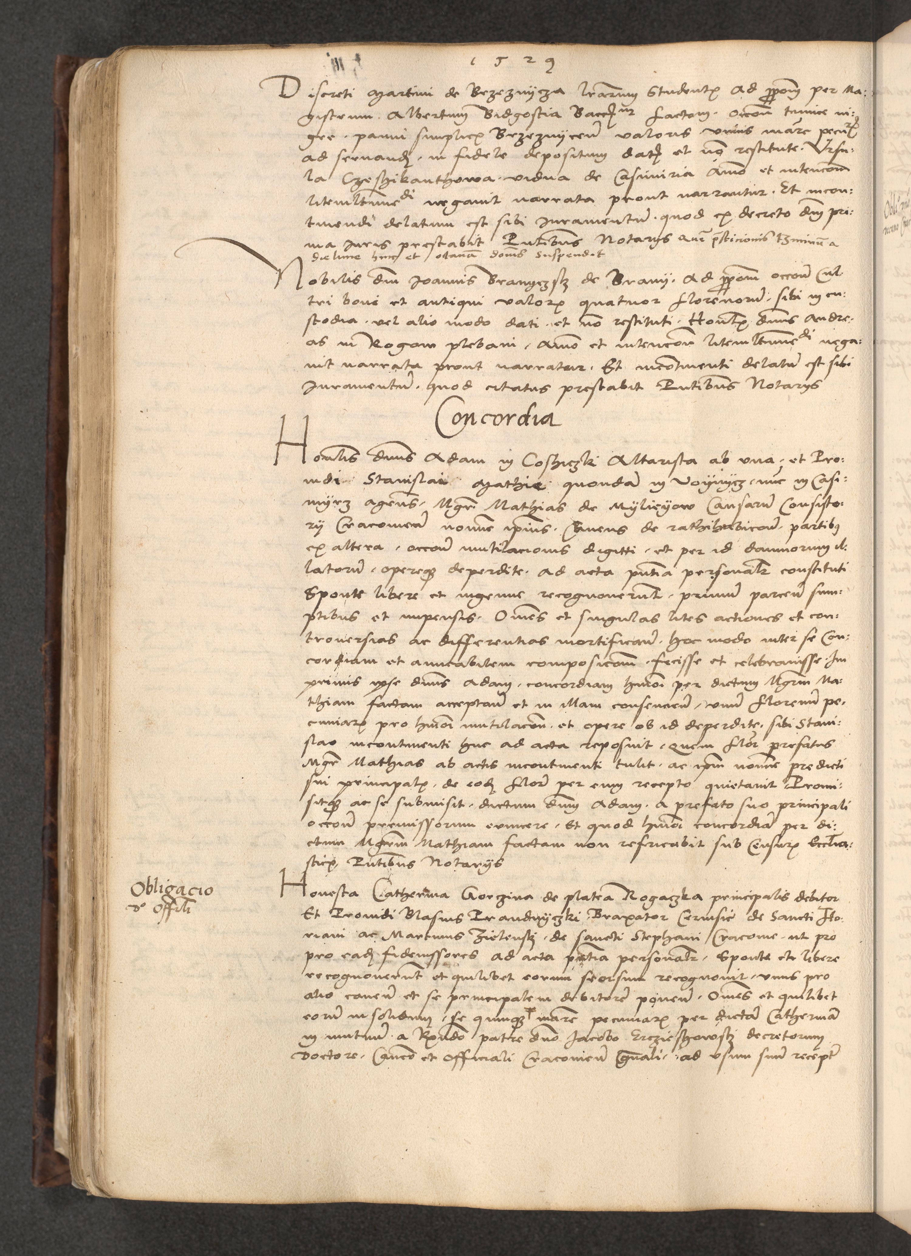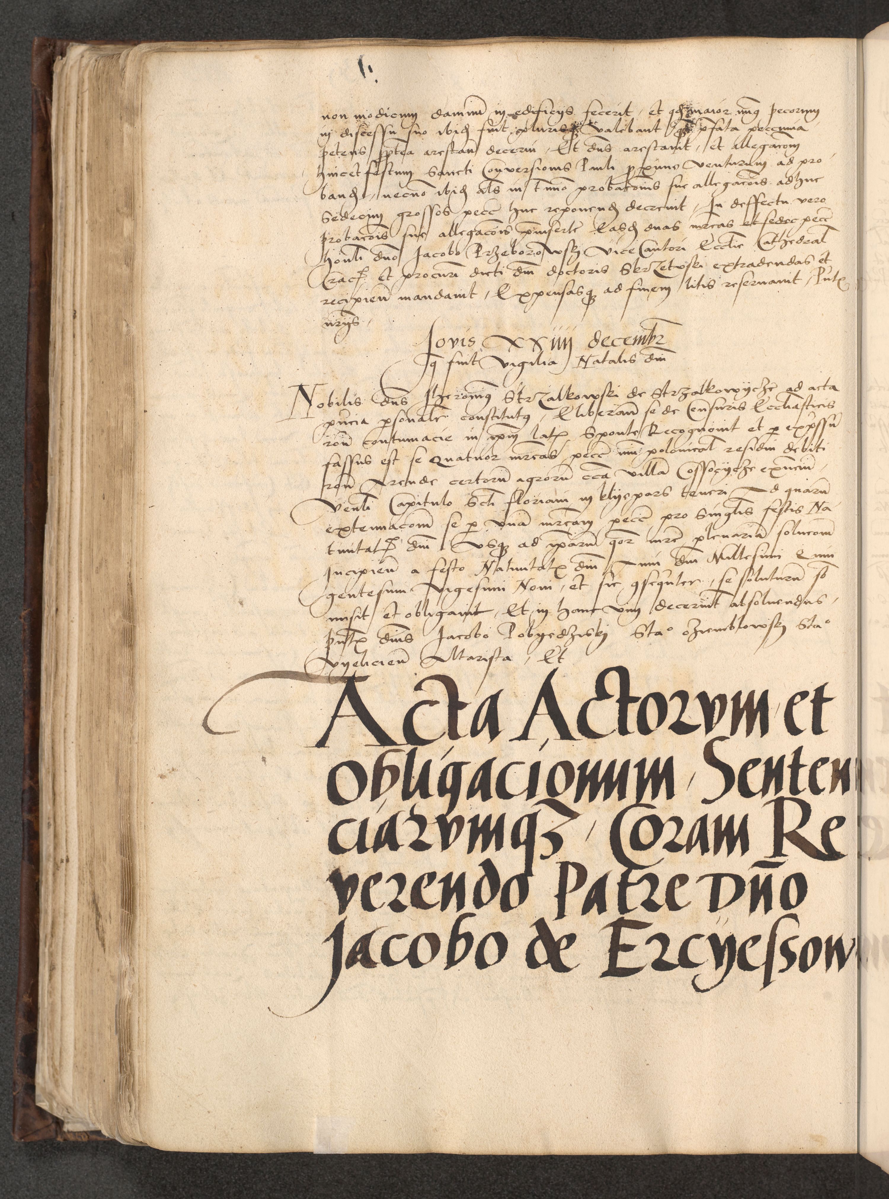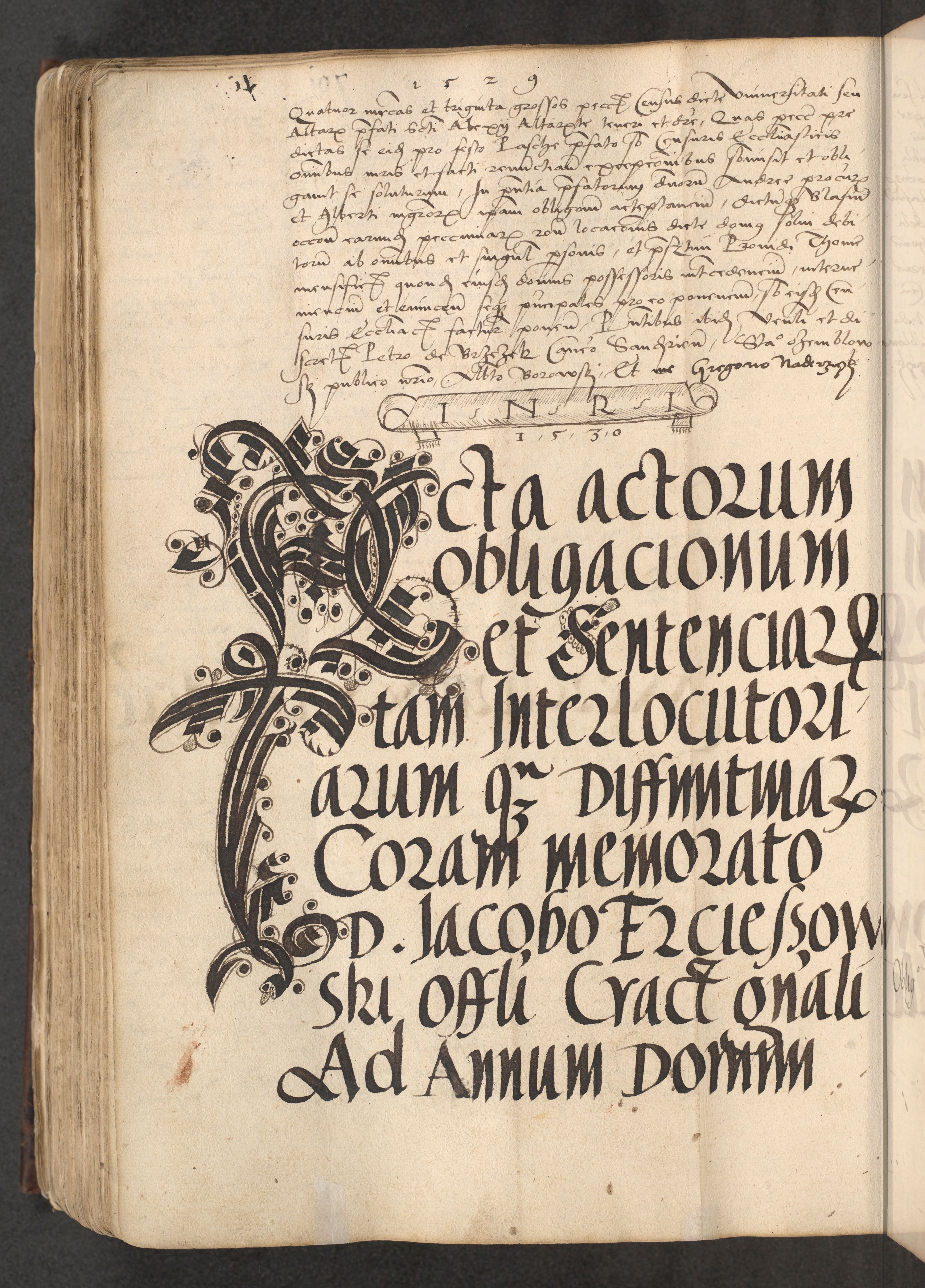 INRI. Acta actorum, obligacionum et sentenciarum tam interlocutoriarum quam diffinitivarum coram reverendo patre ac egregio viro domino Jacobo Erciss[o]wski decretorum doctorem, canonico et officiali generali Cracoviensi ad annum Domini 1528, indicionem primam, pontificatus sanctissimi in Christo patris et domini domini Clementis divina probidendcia pape seprtimi, annum quintum, per Stanislaum de Mordi legalem consistorii notarium omine felici inchoantur