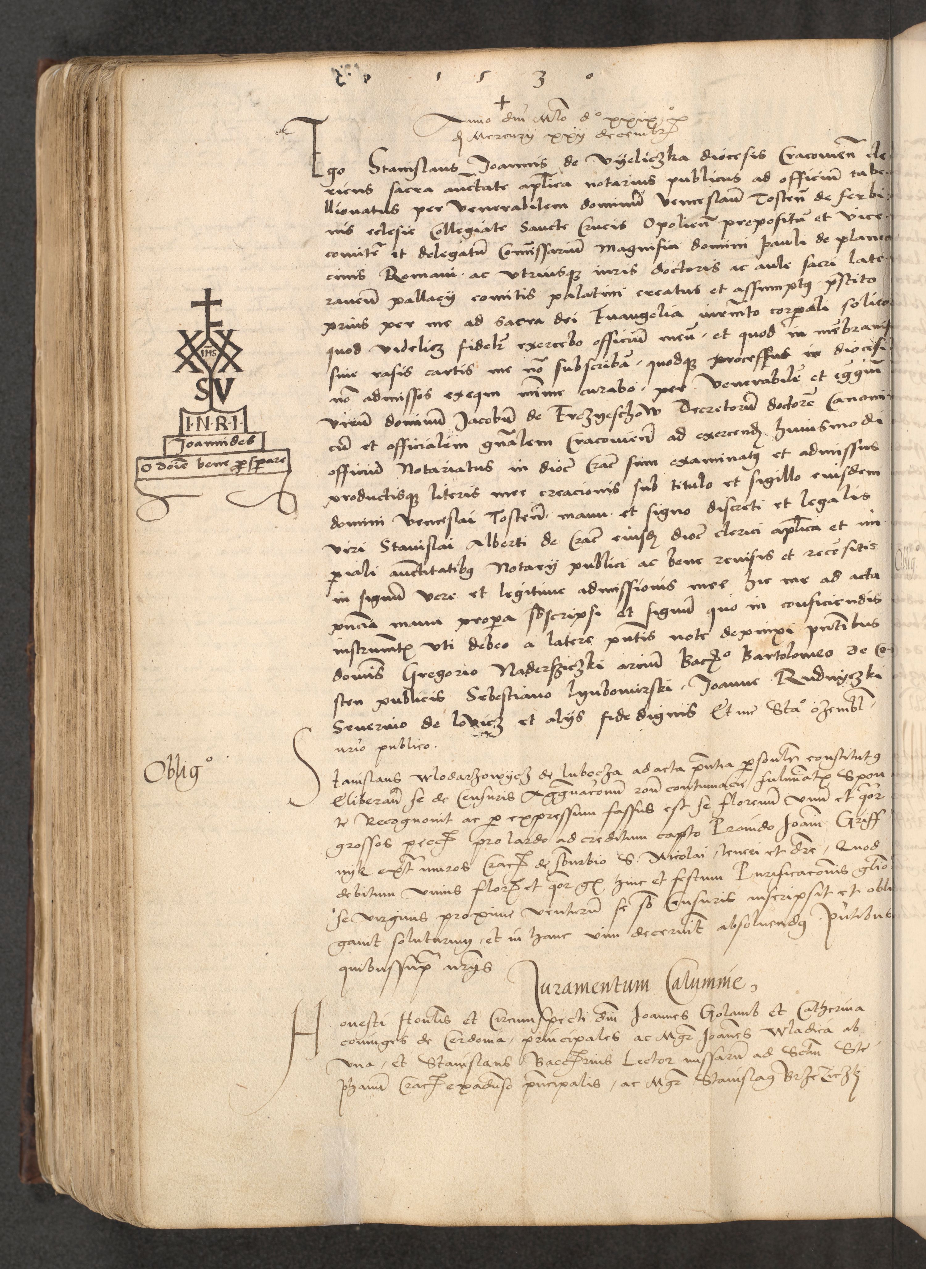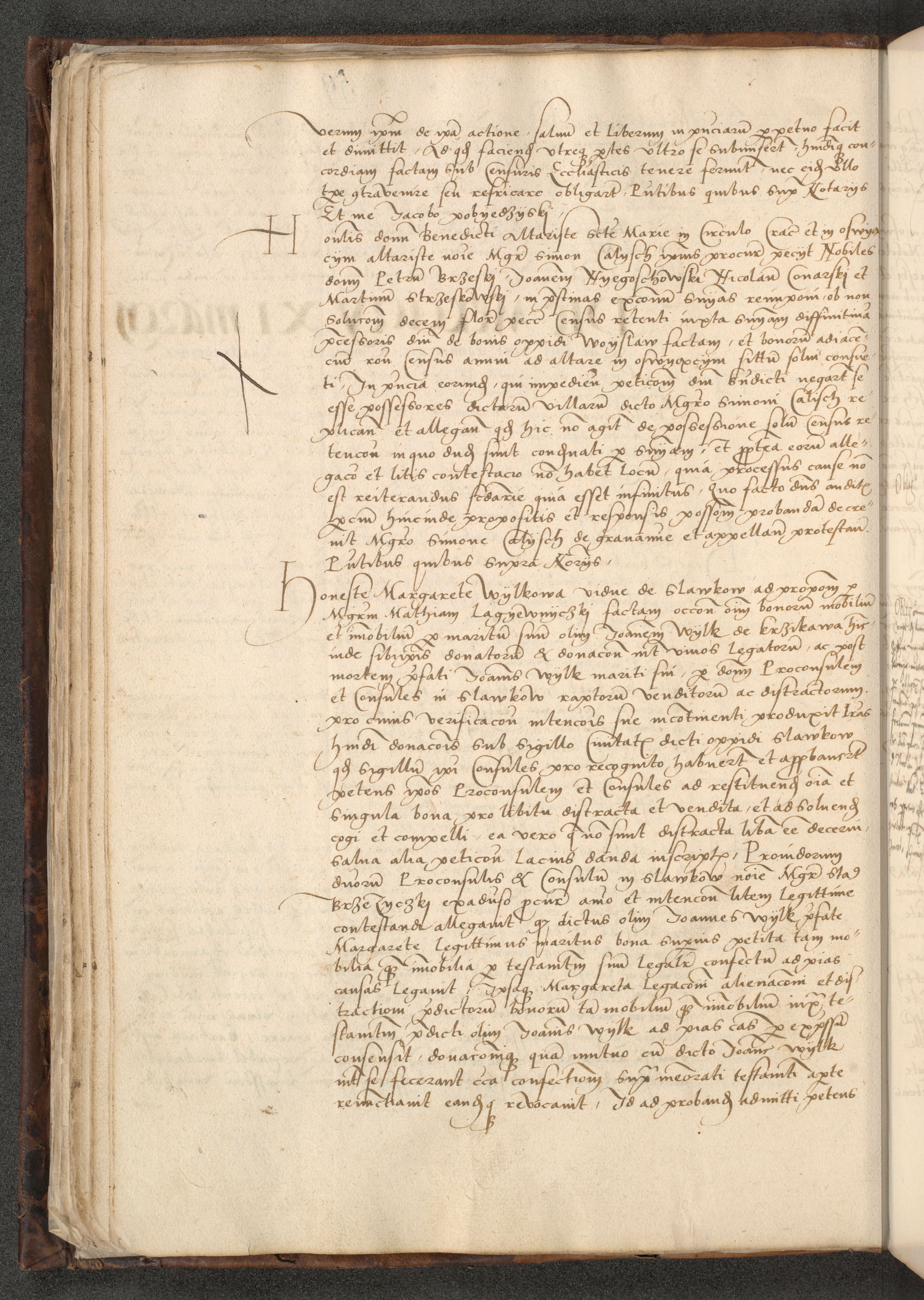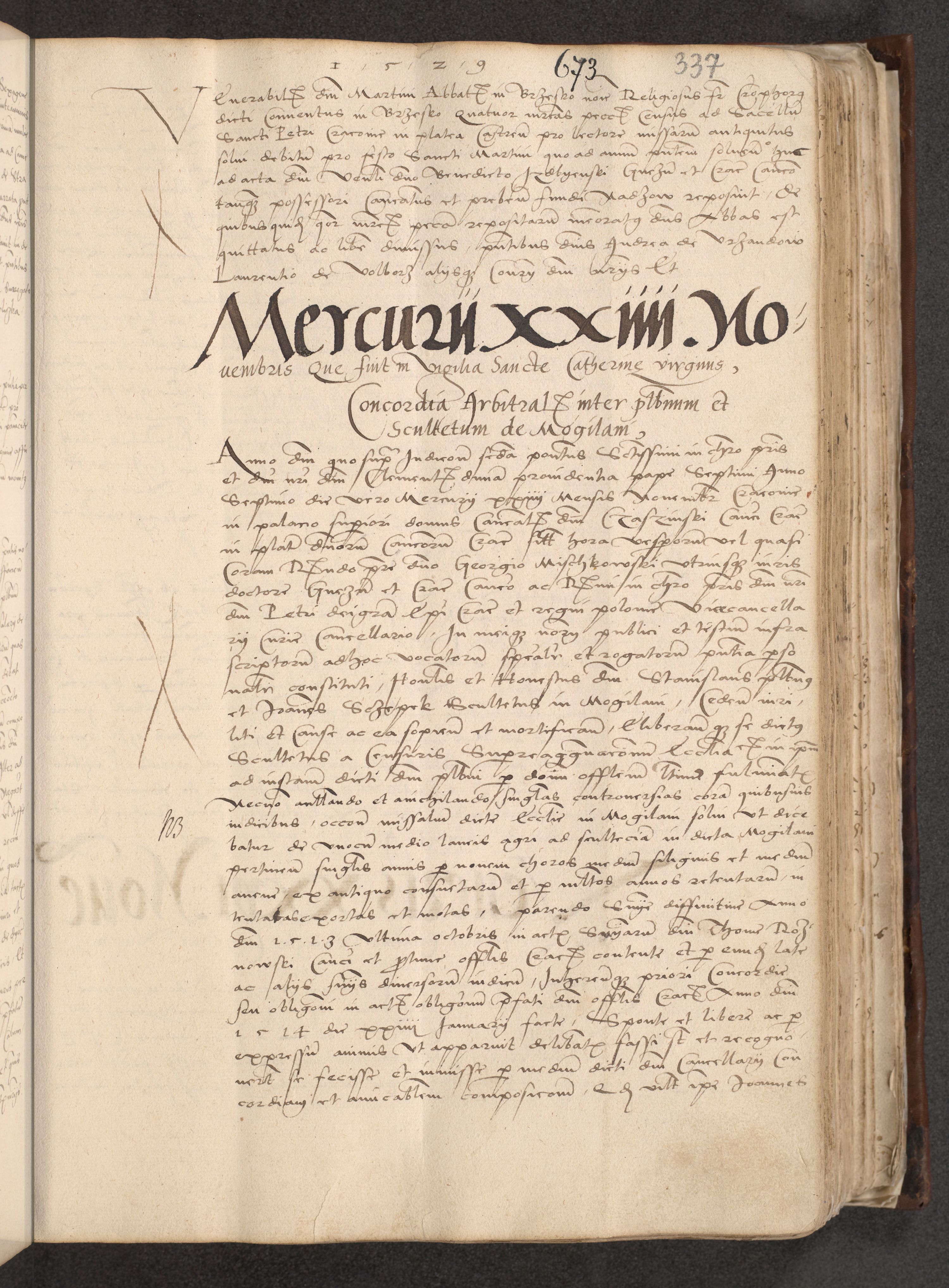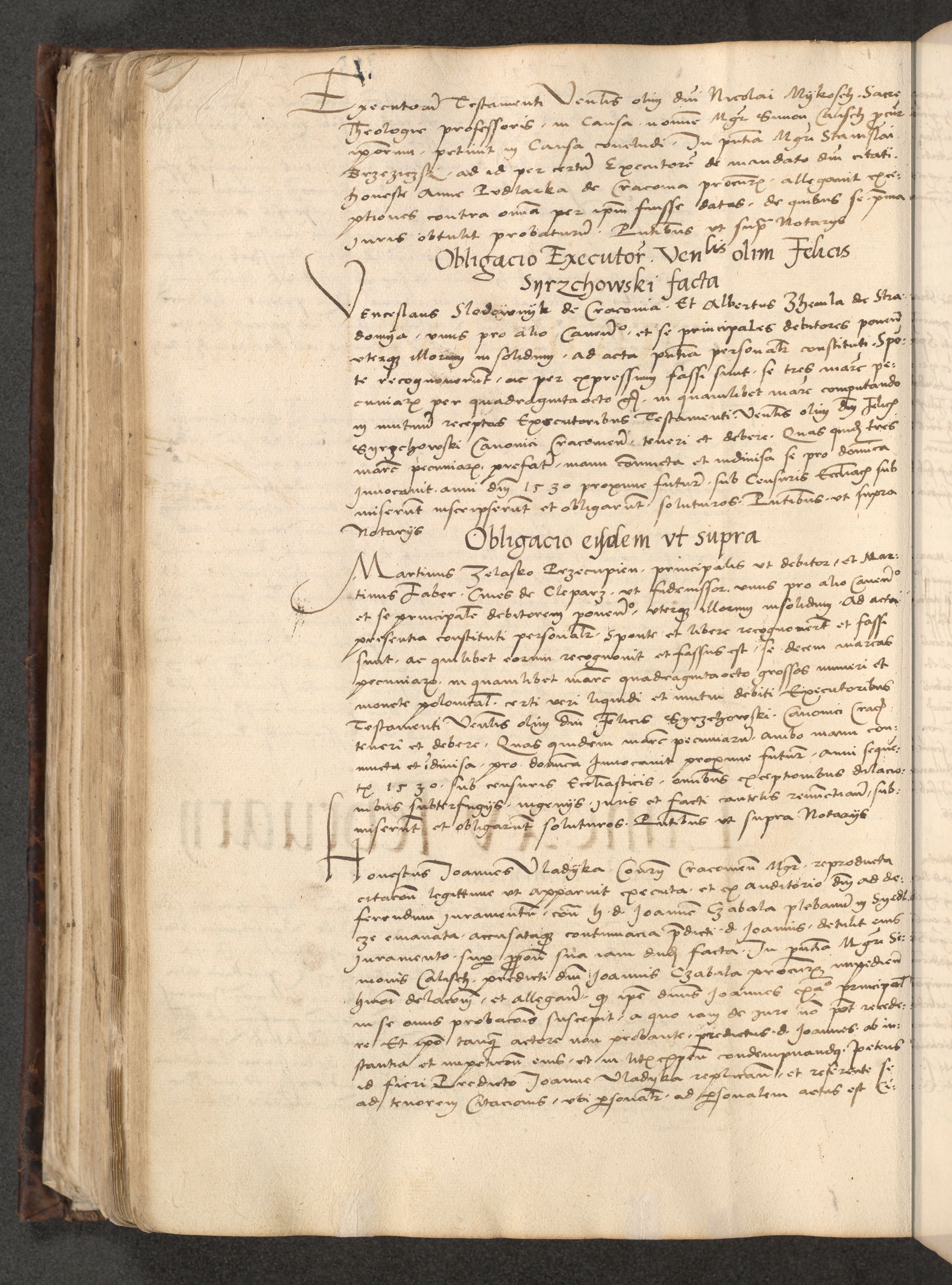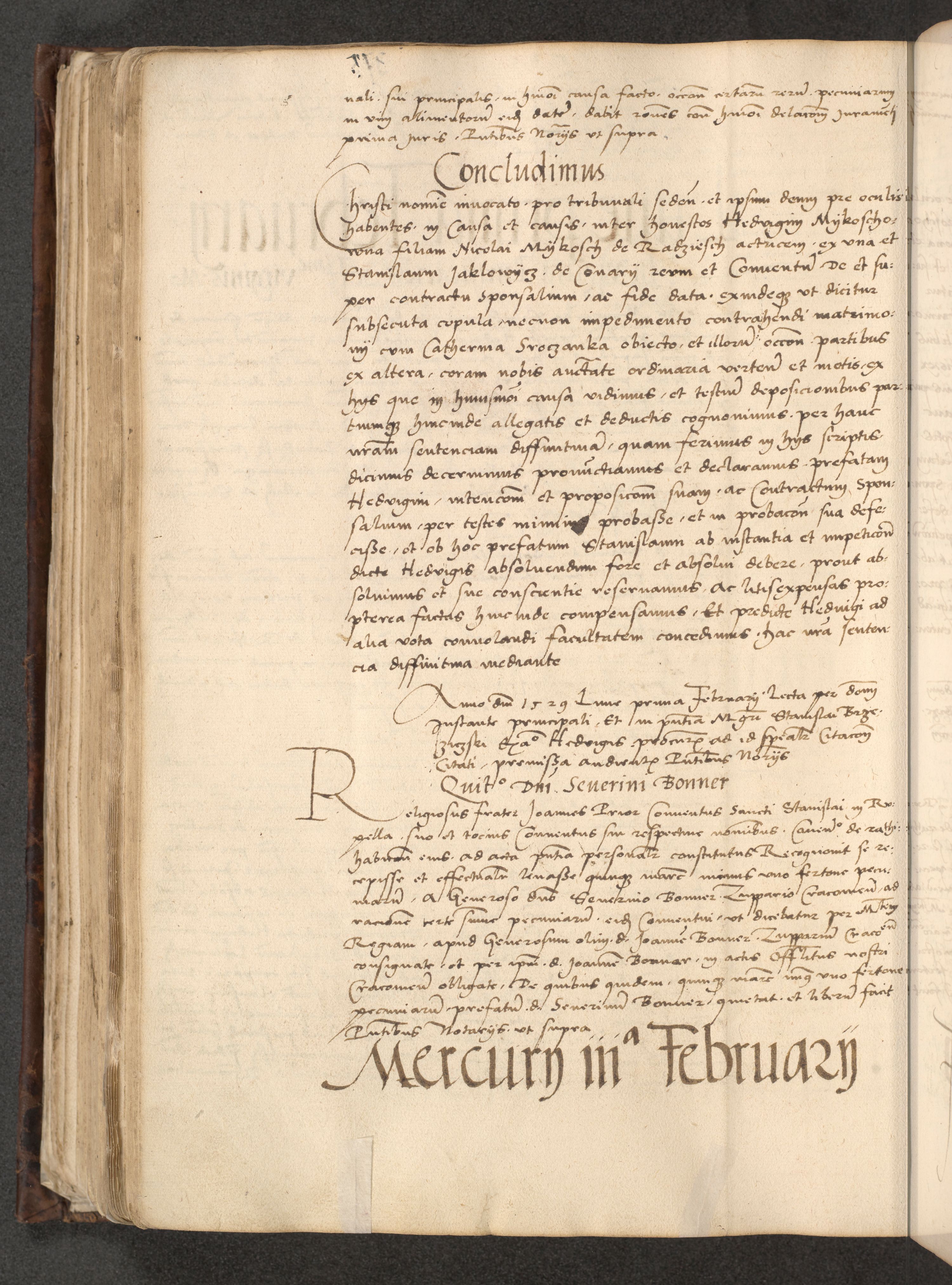 INRI. Acta actorum, obligacionum et sentenciarum tam interlocutoriarum quam diffinitivarum coram reverendo patre ac egregio viro domino Jacobo Erciss[o]wski decretorum doctorem, canonico et officiali generali Cracoviensi ad annum Domini 1528, indicionem primam, pontificatus sanctissimi in Christo patris et domini domini Clementis divina probidendcia pape seprtimi, annum quintum, per Stanislaum de Mordi legalem consistorii notarium omine felici inchoantur