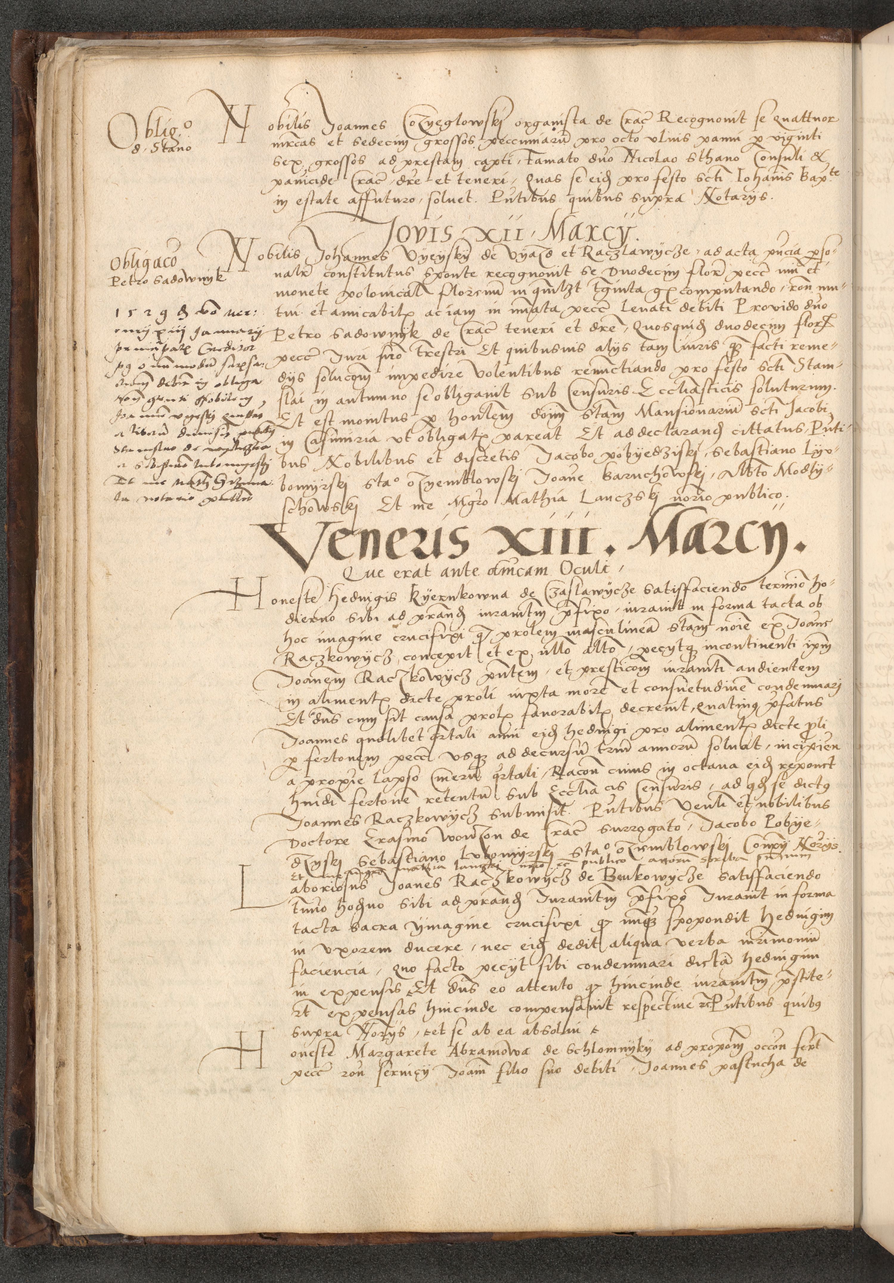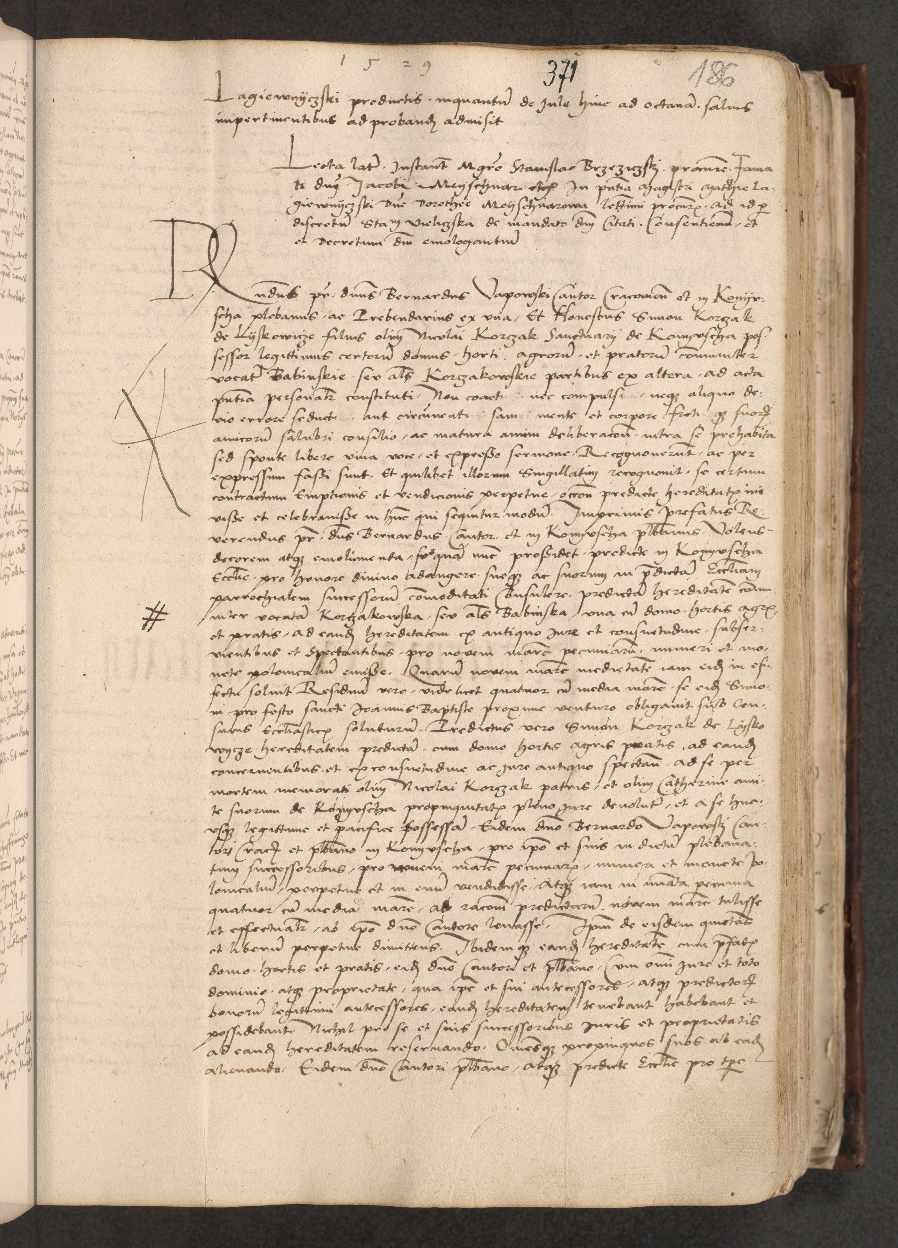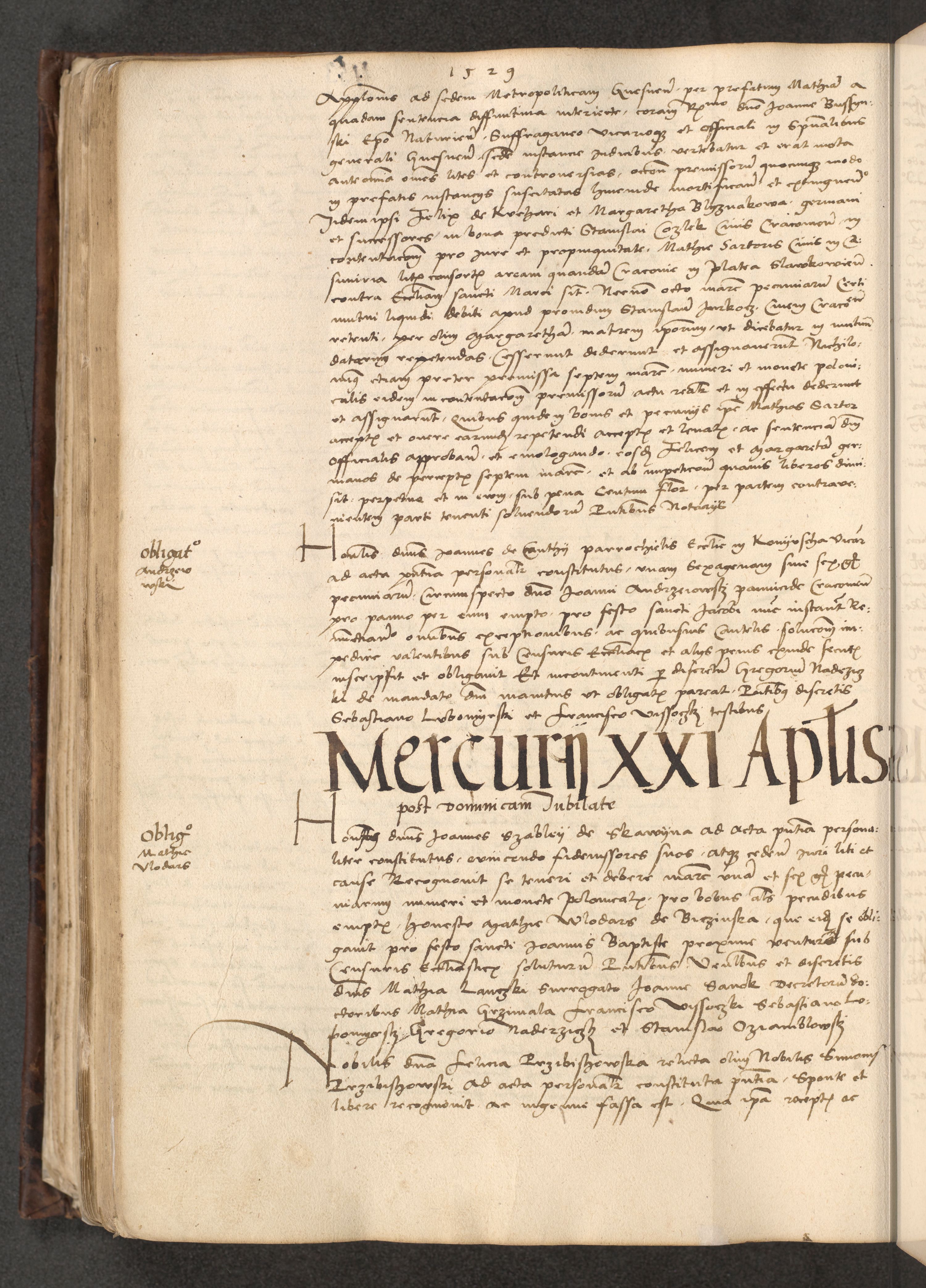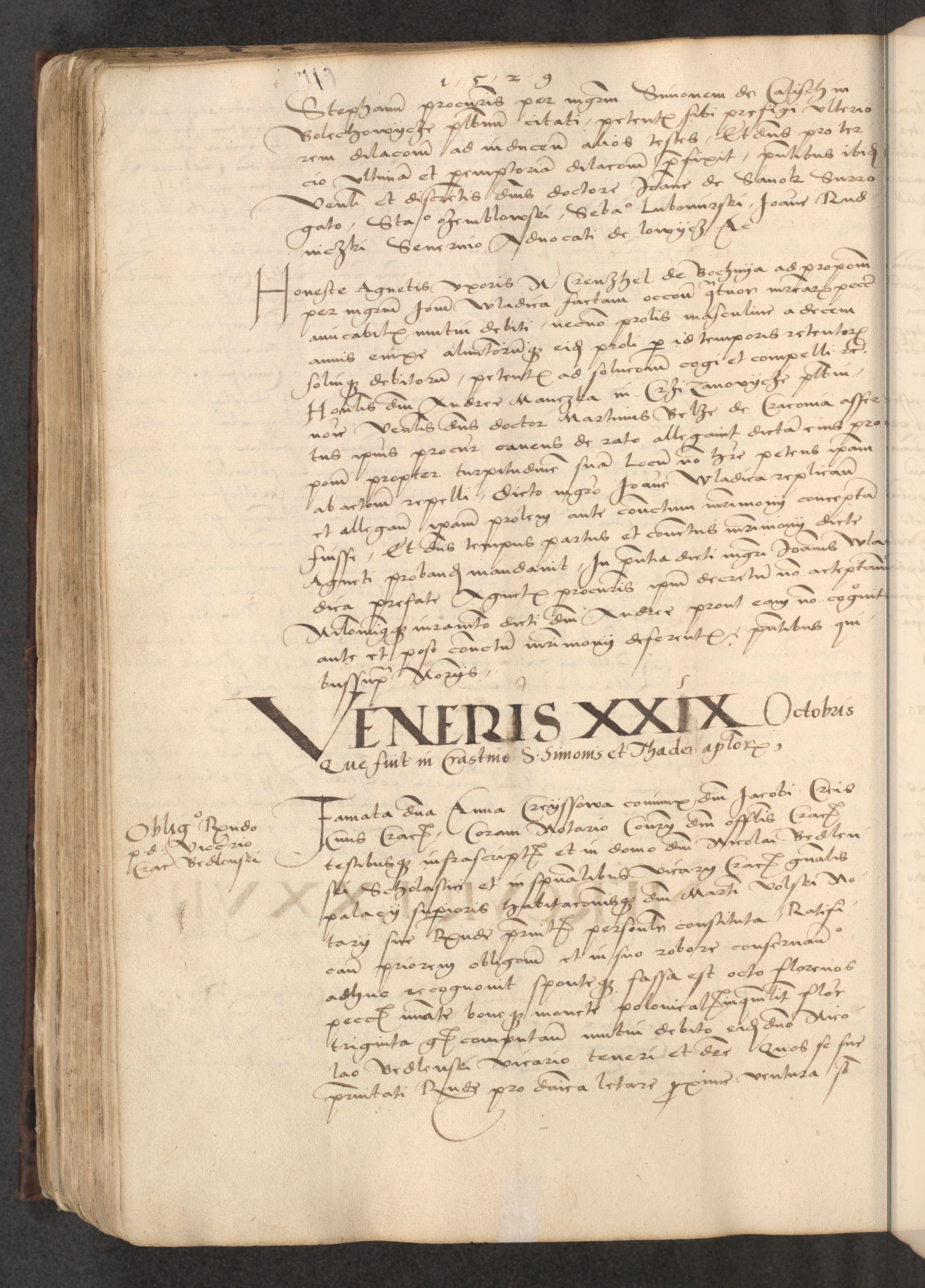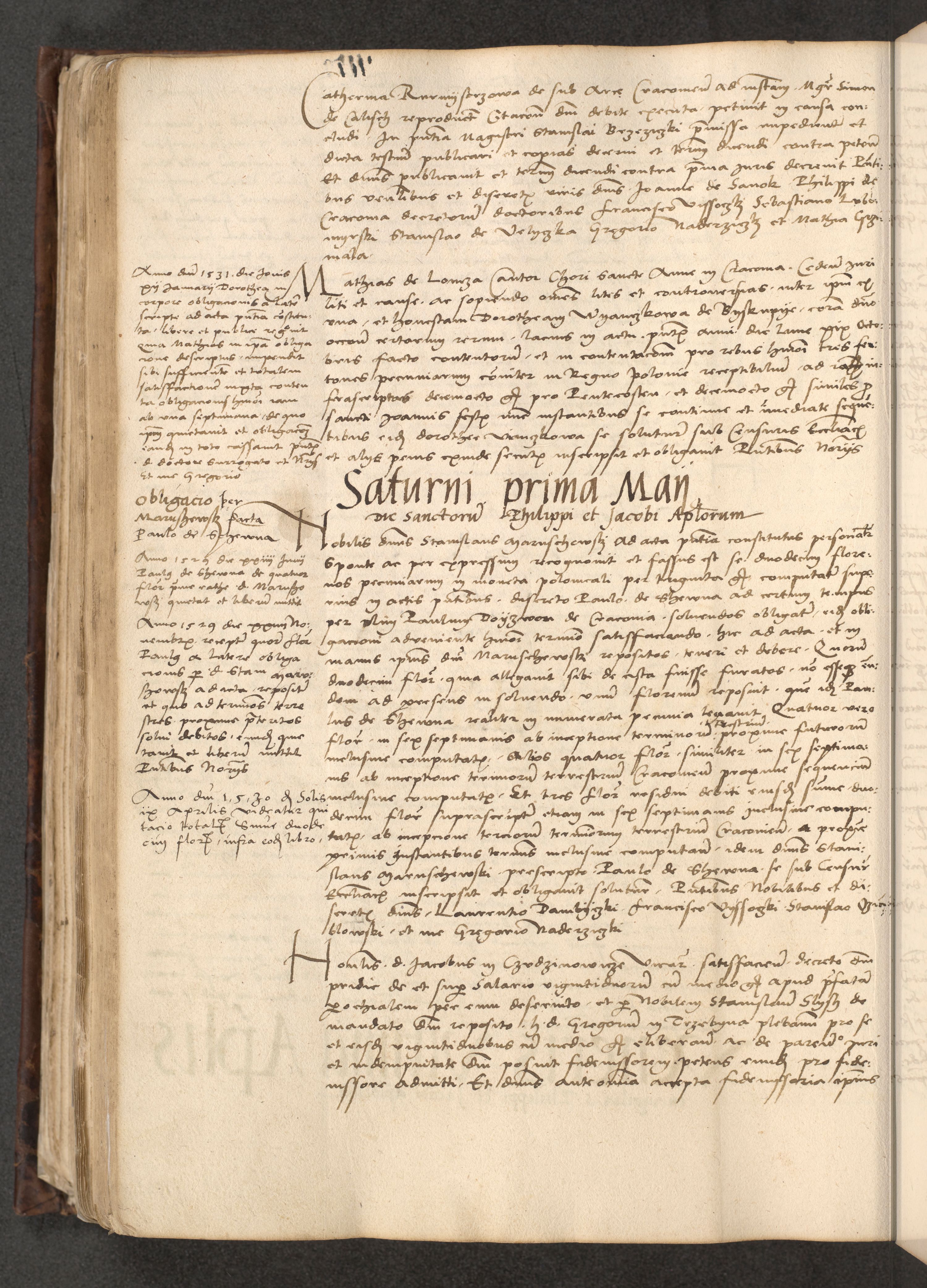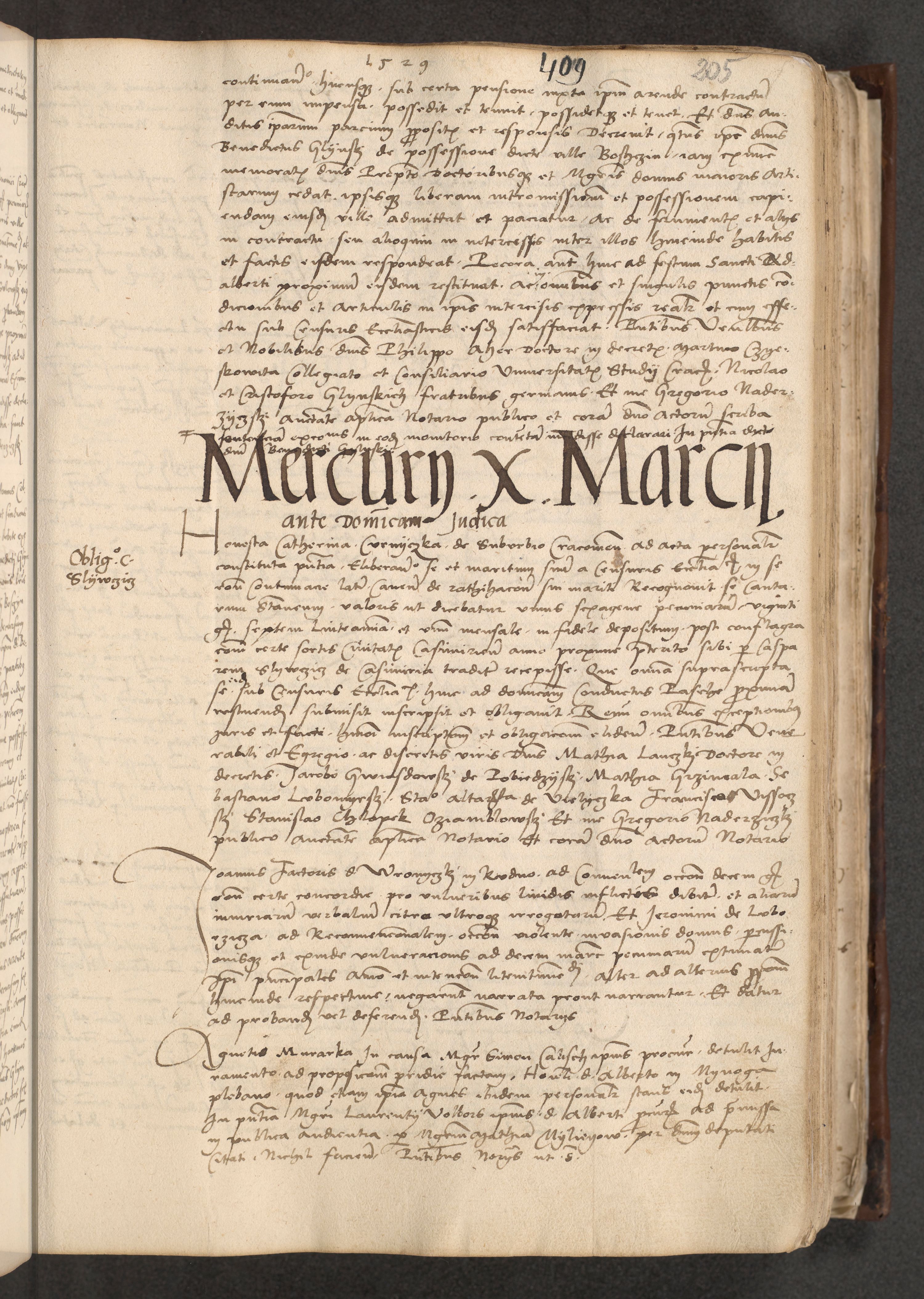 INRI. Acta actorum, obligacionum et sentenciarum tam interlocutoriarum quam diffinitivarum coram reverendo patre ac egregio viro domino Jacobo Erciss[o]wski decretorum doctorem, canonico et officiali generali Cracoviensi ad annum Domini 1528, indicionem primam, pontificatus sanctissimi in Christo patris et domini domini Clementis divina probidendcia pape seprtimi, annum quintum, per Stanislaum de Mordi legalem consistorii notarium omine felici inchoantur