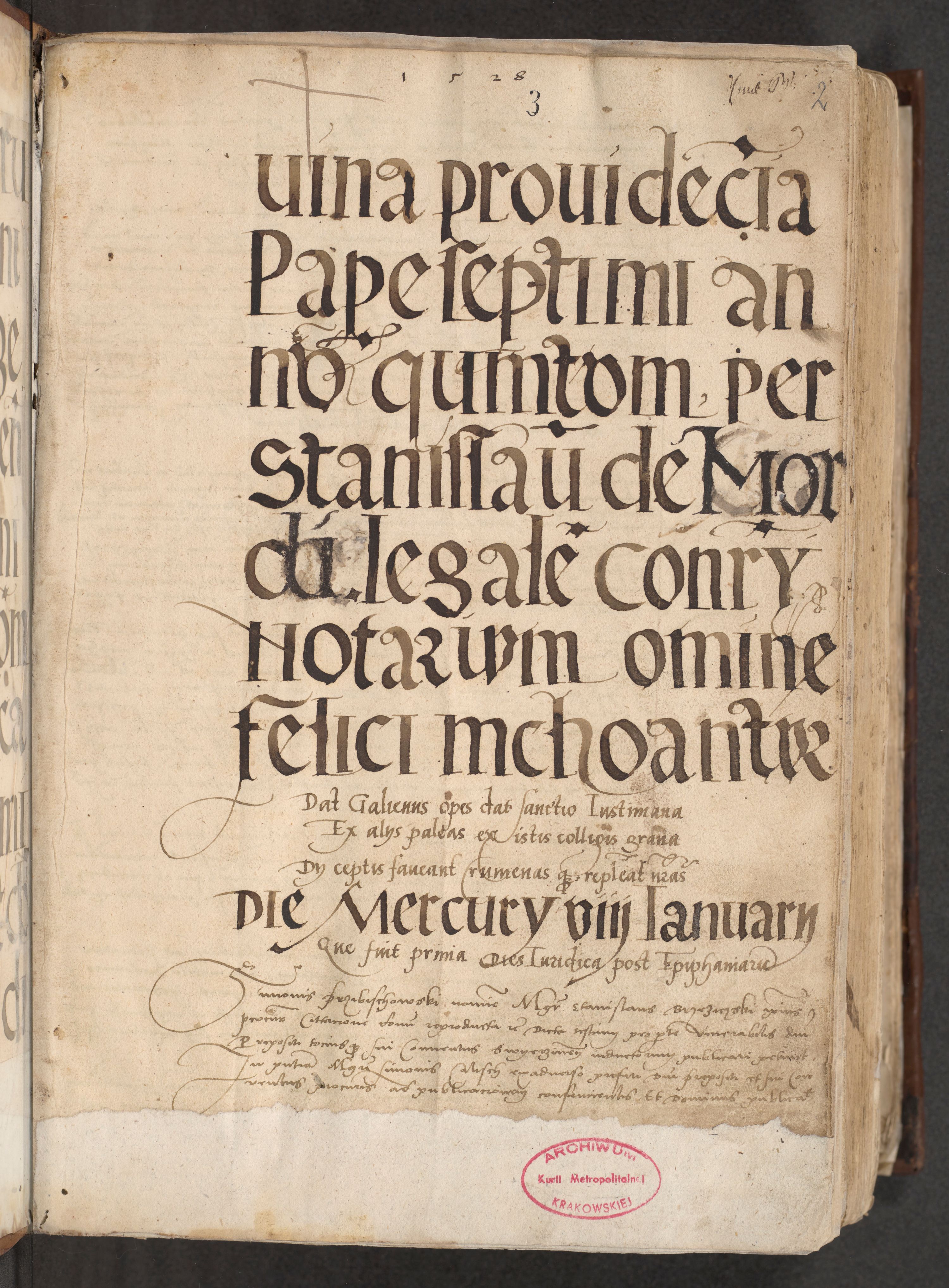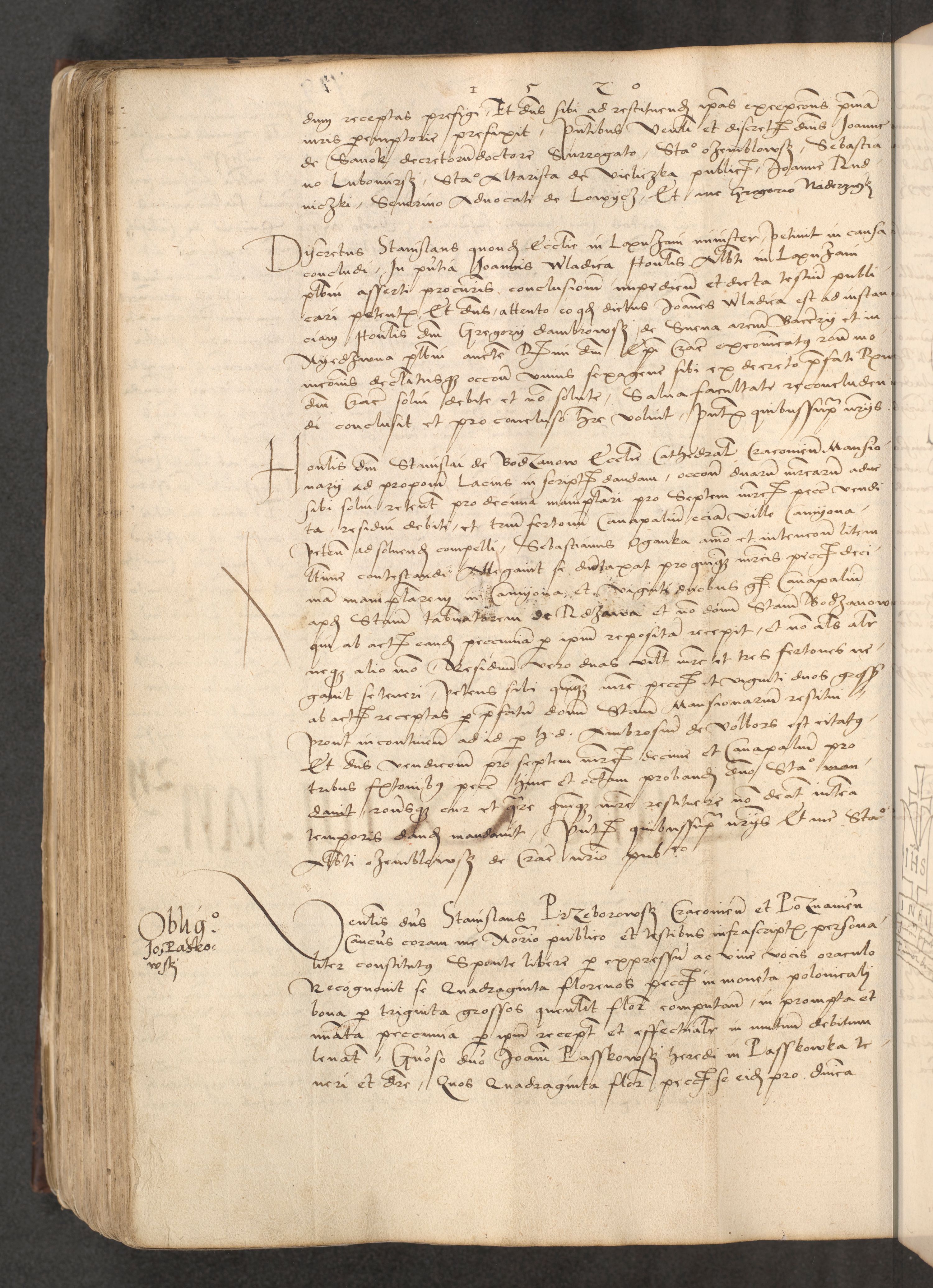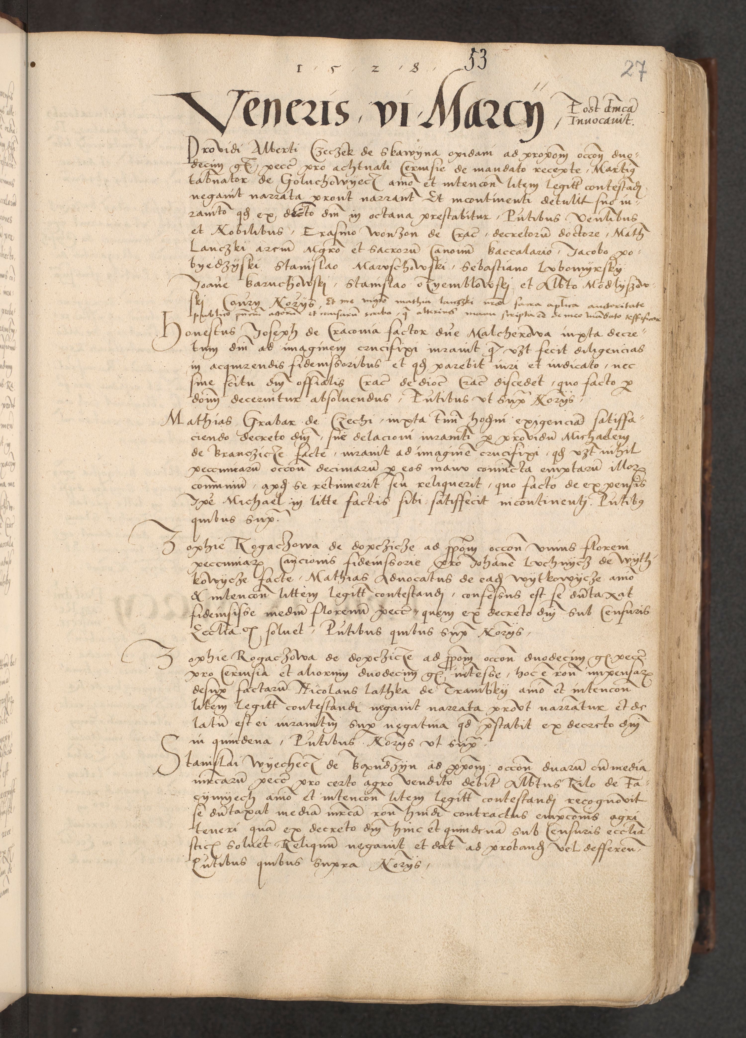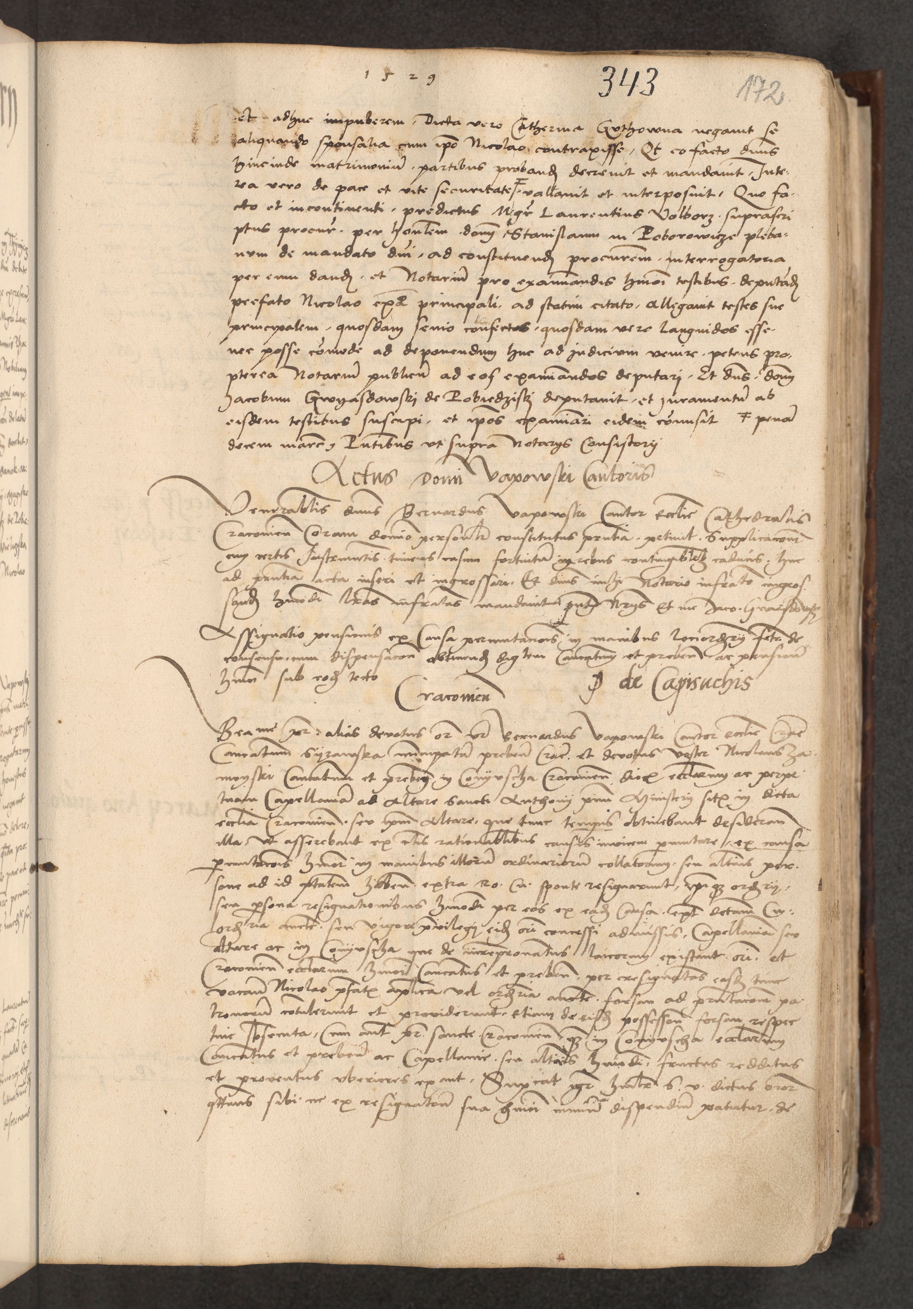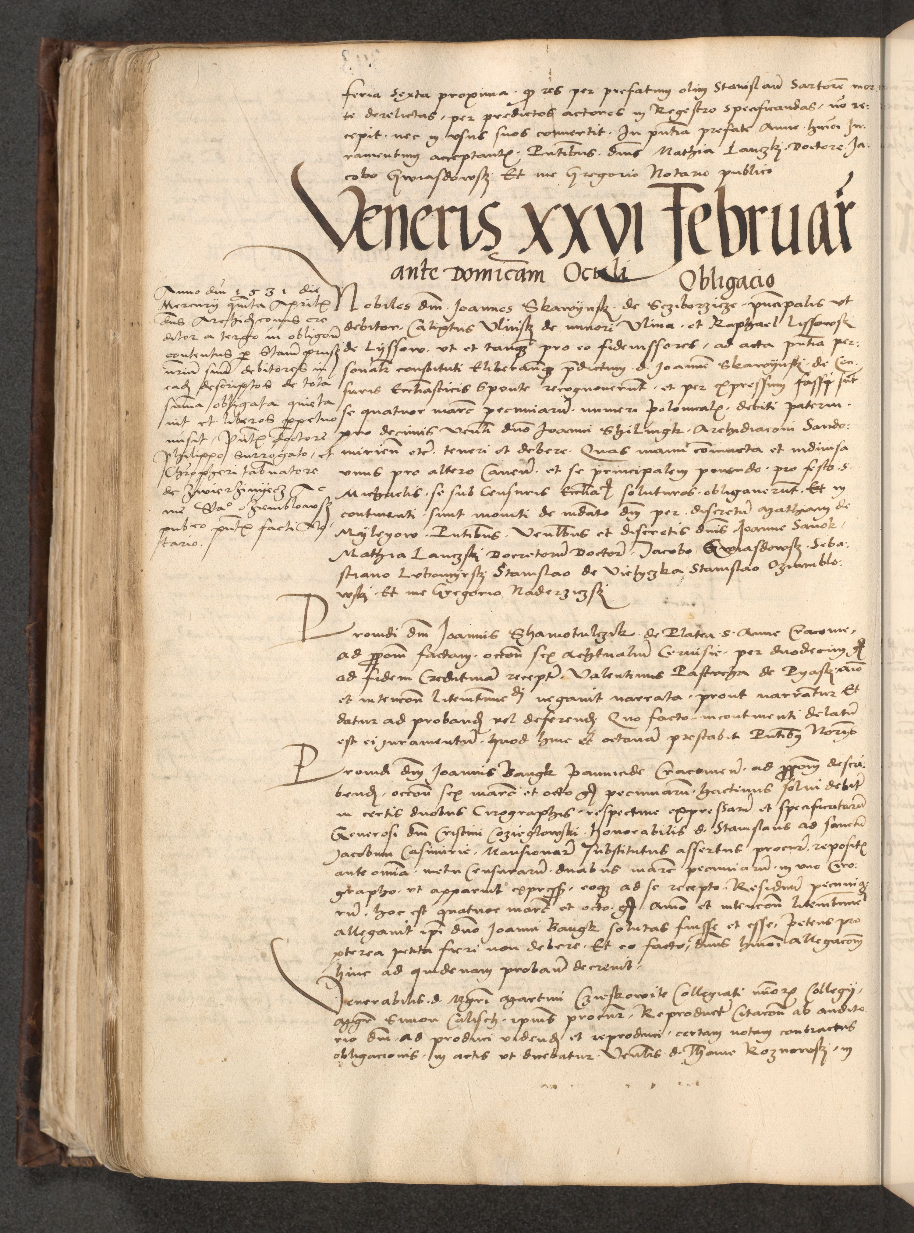 INRI. Acta actorum, obligacionum et sentenciarum tam interlocutoriarum quam diffinitivarum coram reverendo patre ac egregio viro domino Jacobo Erciss[o]wski decretorum doctorem, canonico et officiali generali Cracoviensi ad annum Domini 1528, indicionem primam, pontificatus sanctissimi in Christo patris et domini domini Clementis divina probidendcia pape seprtimi, annum quintum, per Stanislaum de Mordi legalem consistorii notarium omine felici inchoantur