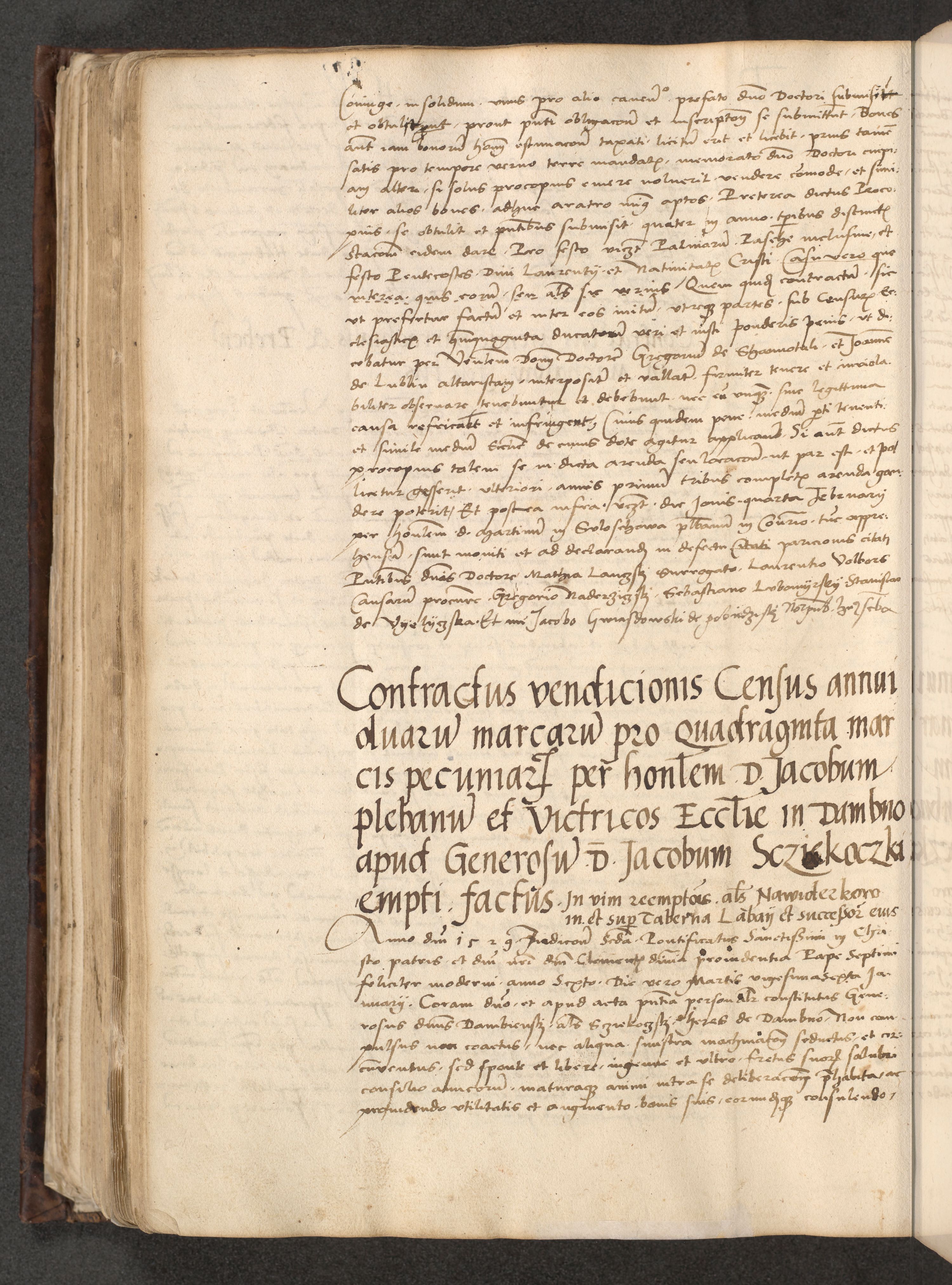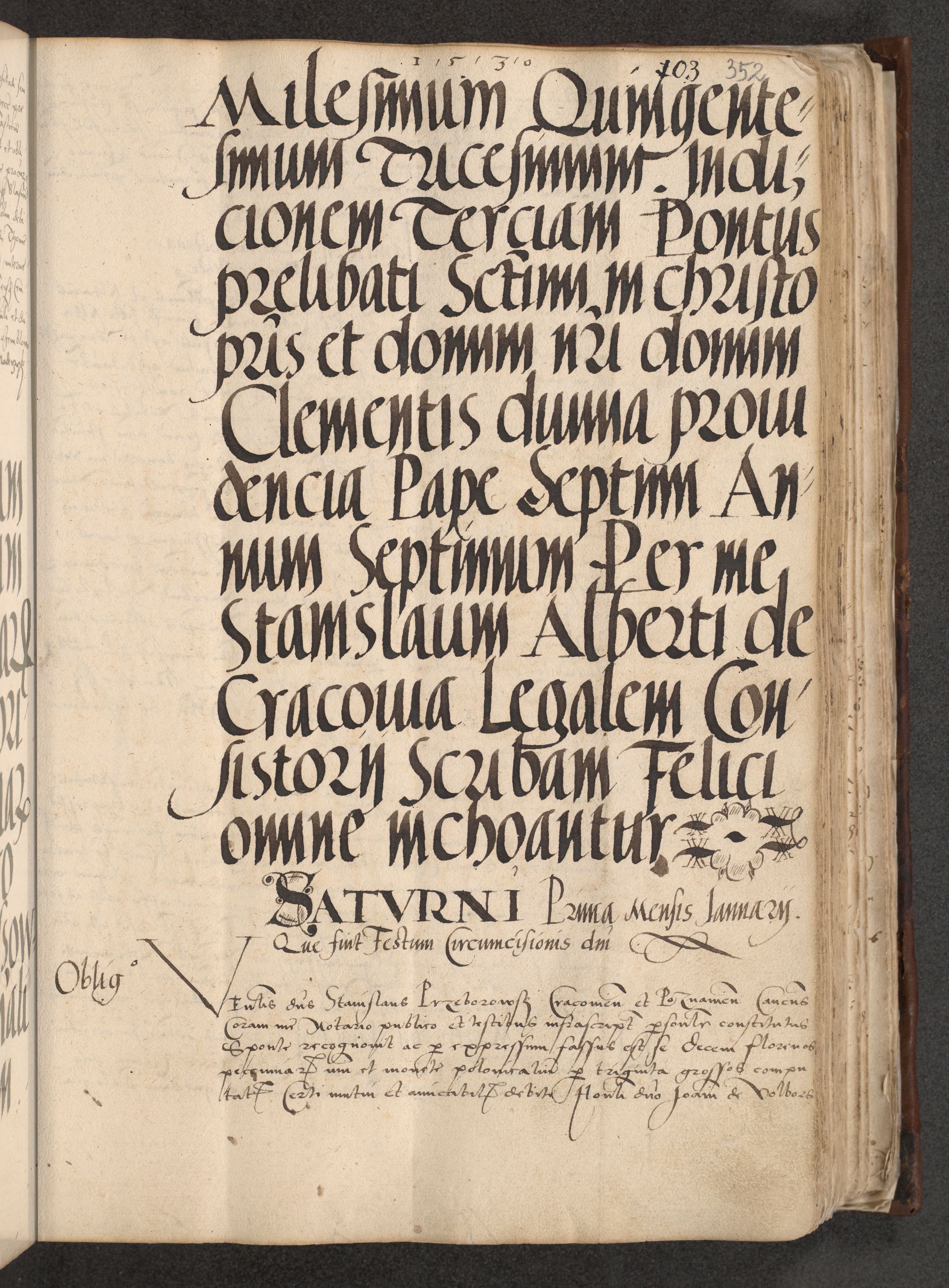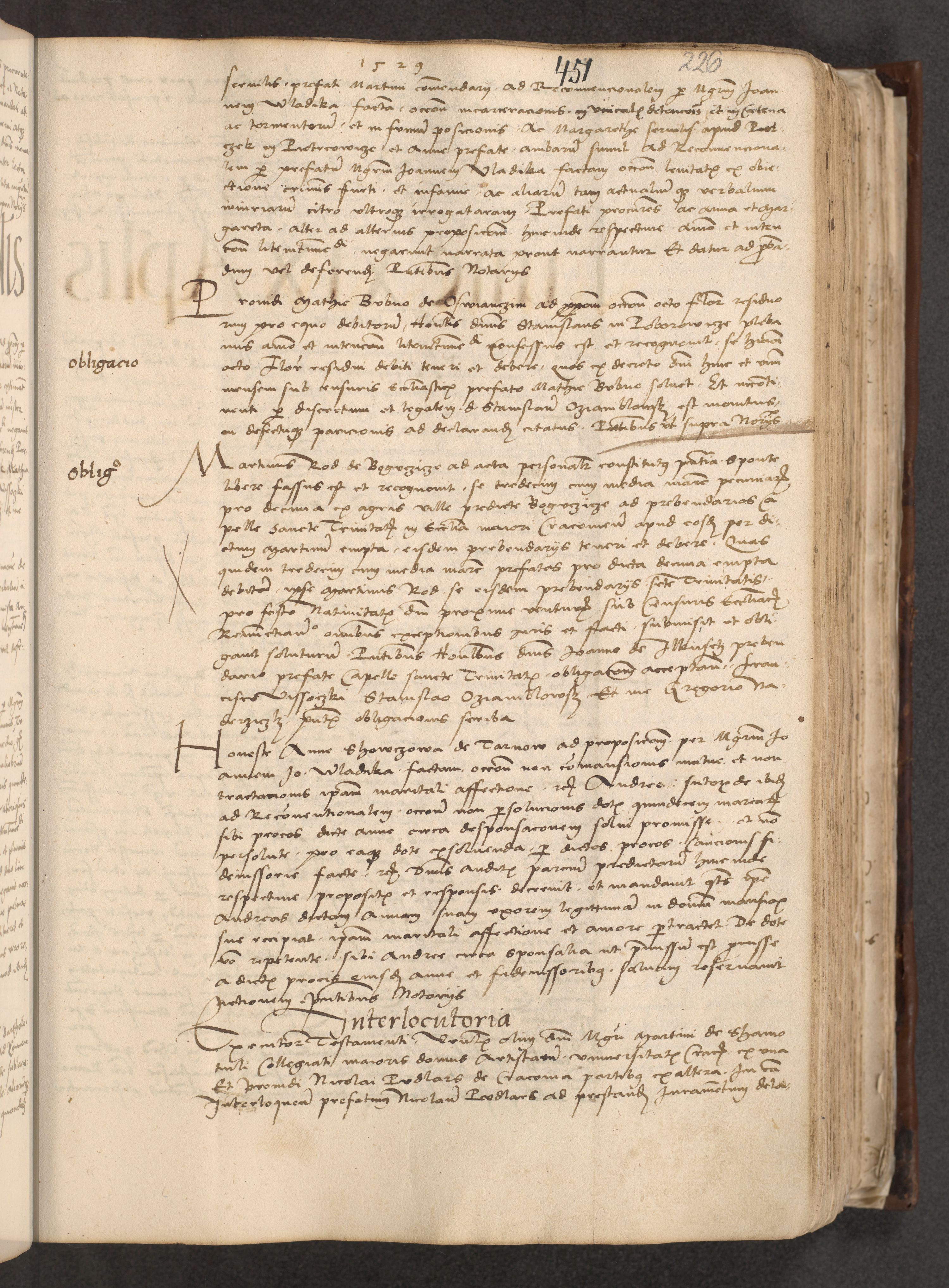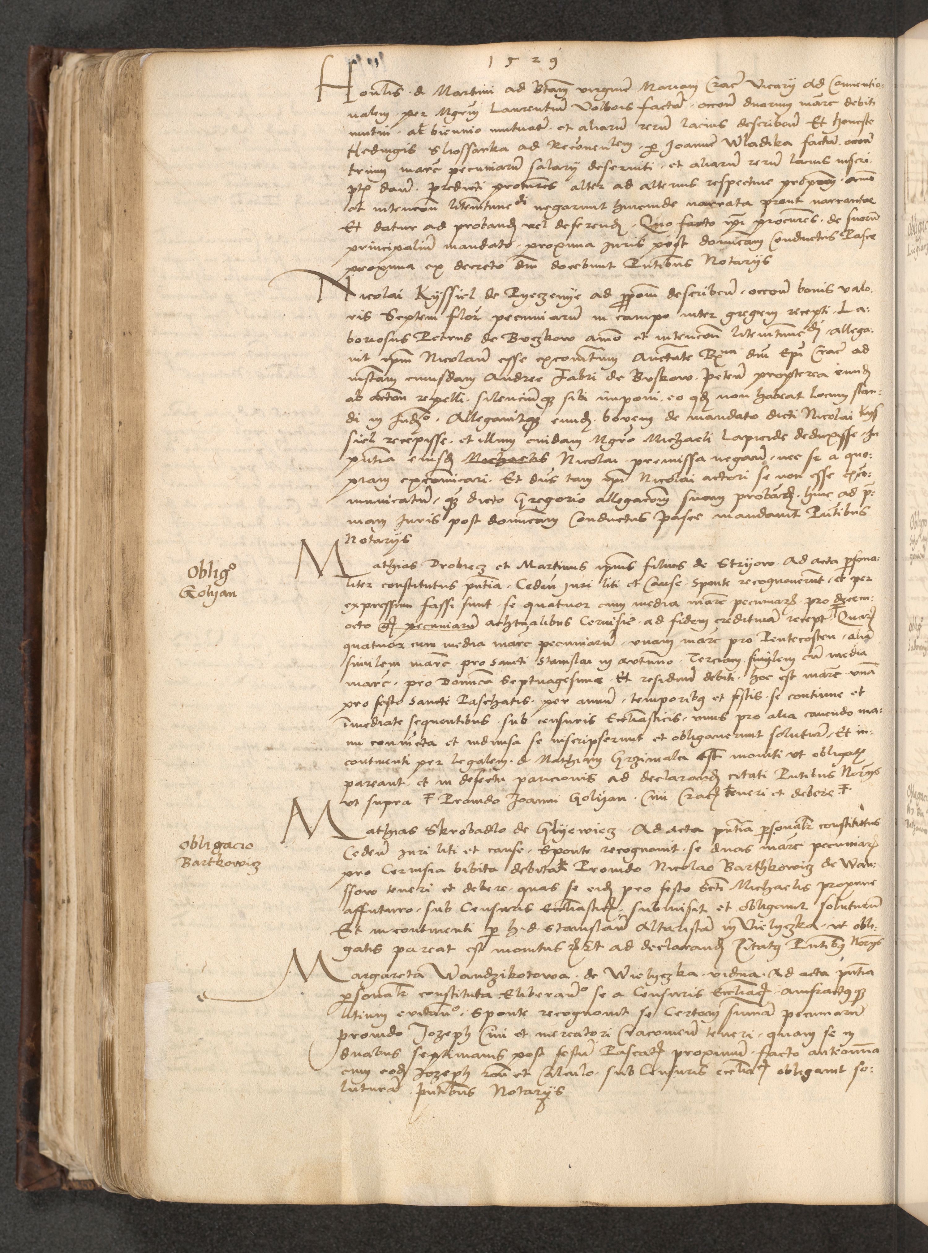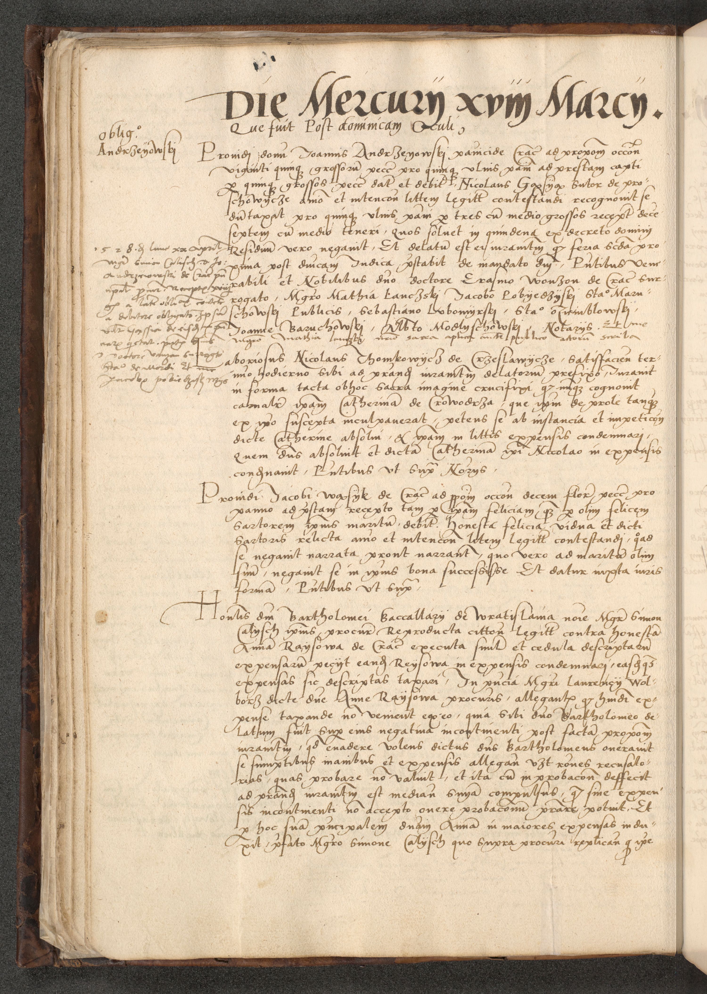 INRI. Acta actorum, obligacionum et sentenciarum tam interlocutoriarum quam diffinitivarum coram reverendo patre ac egregio viro domino Jacobo Erciss[o]wski decretorum doctorem, canonico et officiali generali Cracoviensi ad annum Domini 1528, indicionem primam, pontificatus sanctissimi in Christo patris et domini domini Clementis divina probidendcia pape seprtimi, annum quintum, per Stanislaum de Mordi legalem consistorii notarium omine felici inchoantur