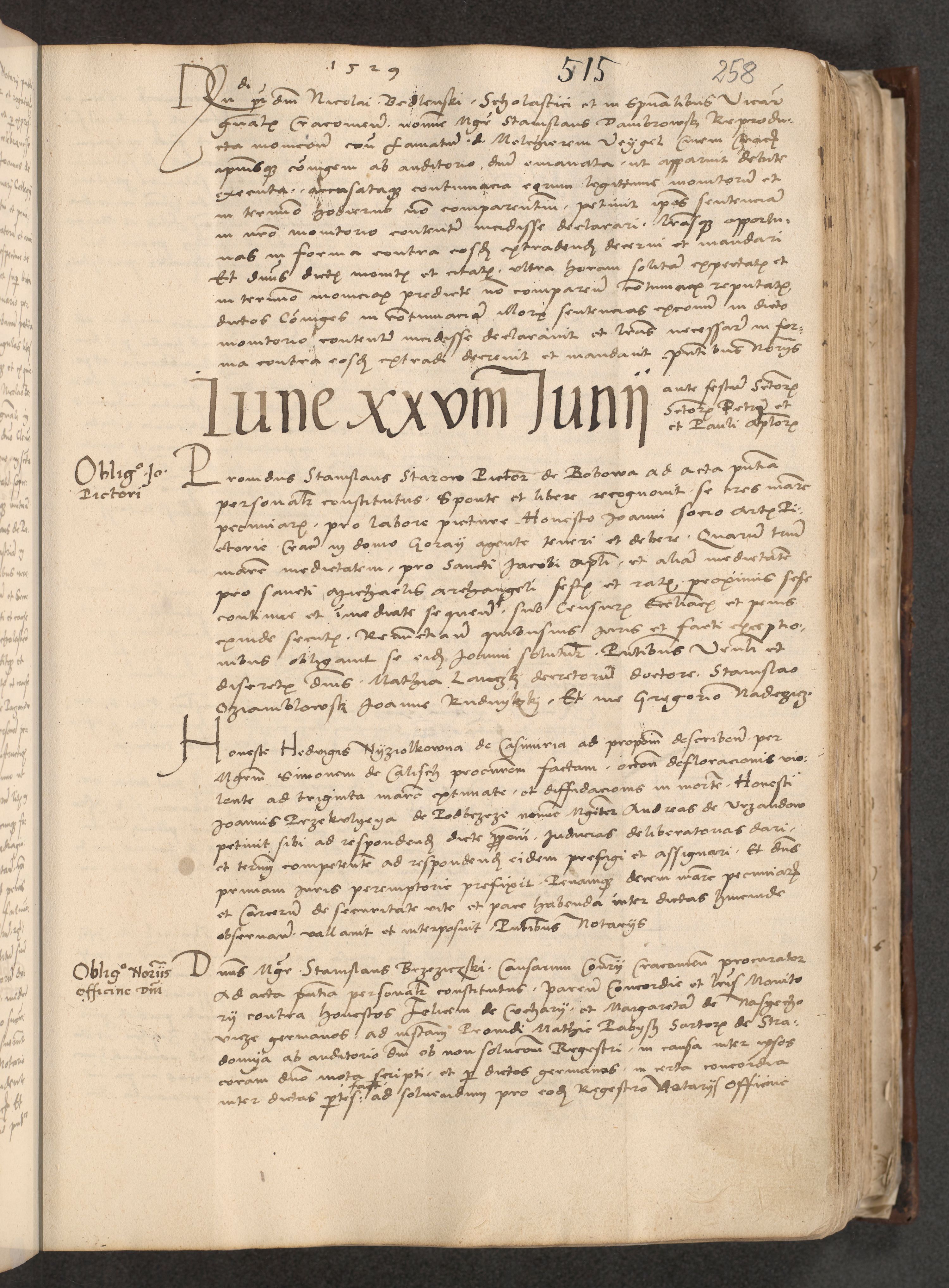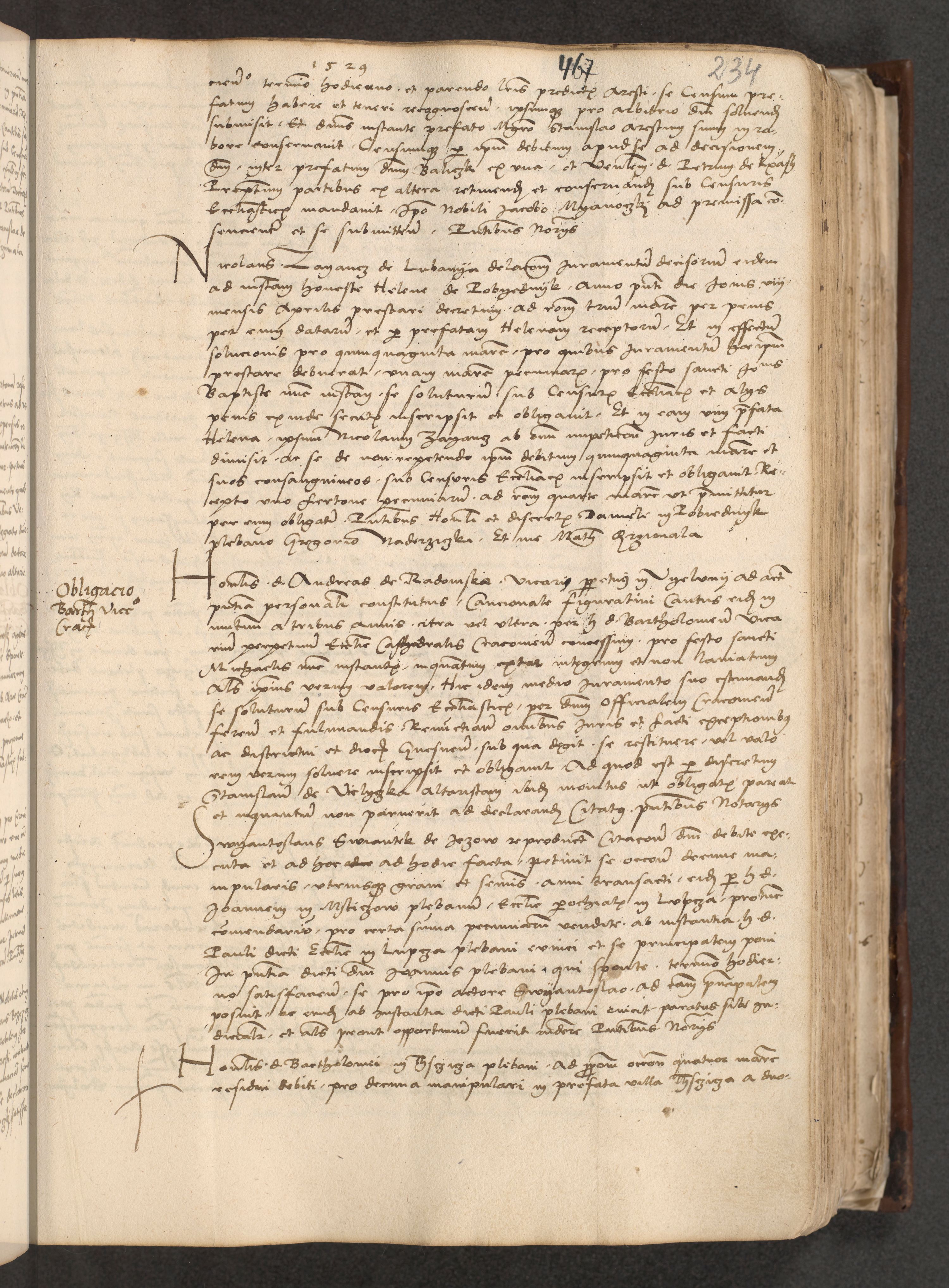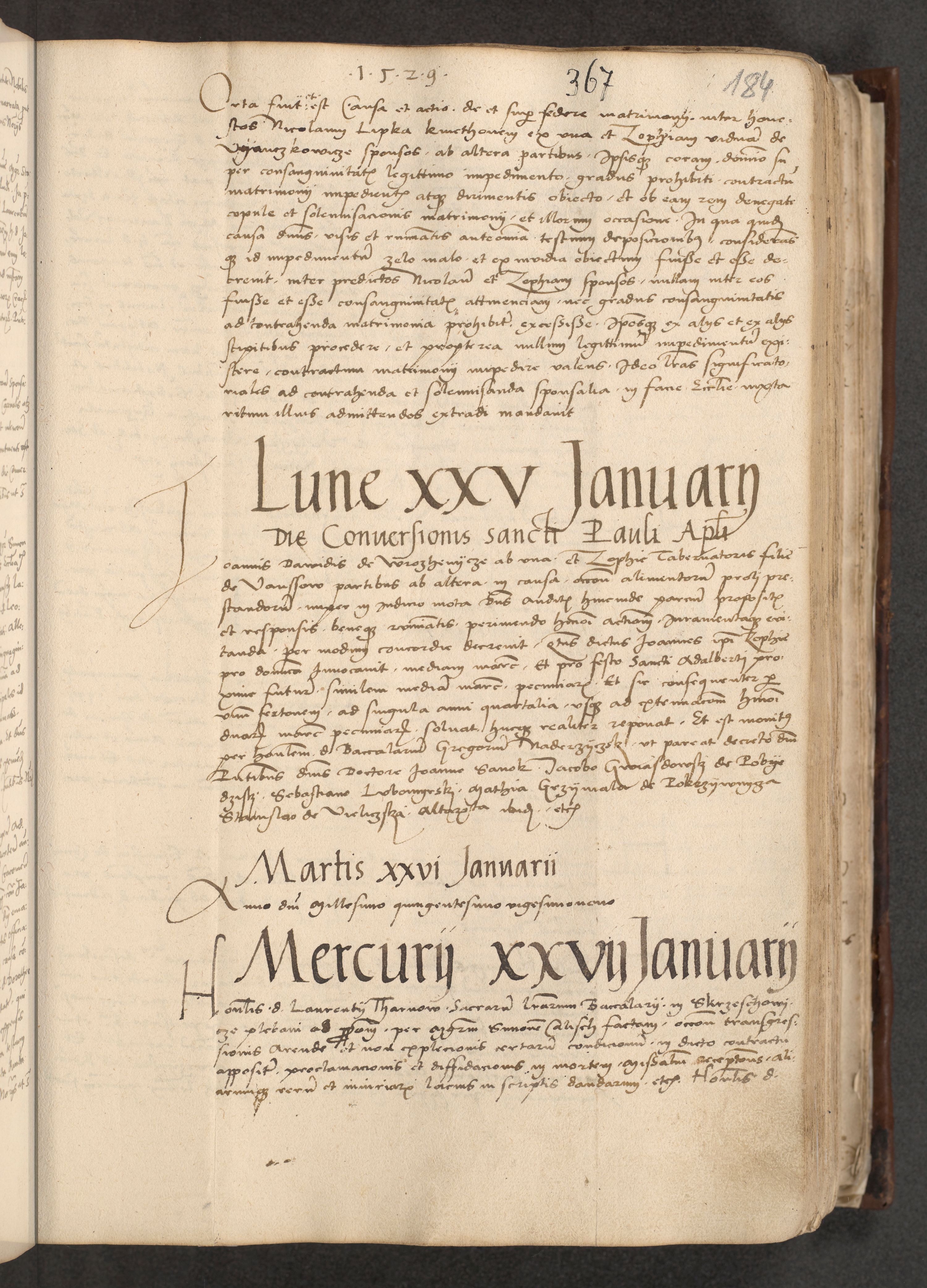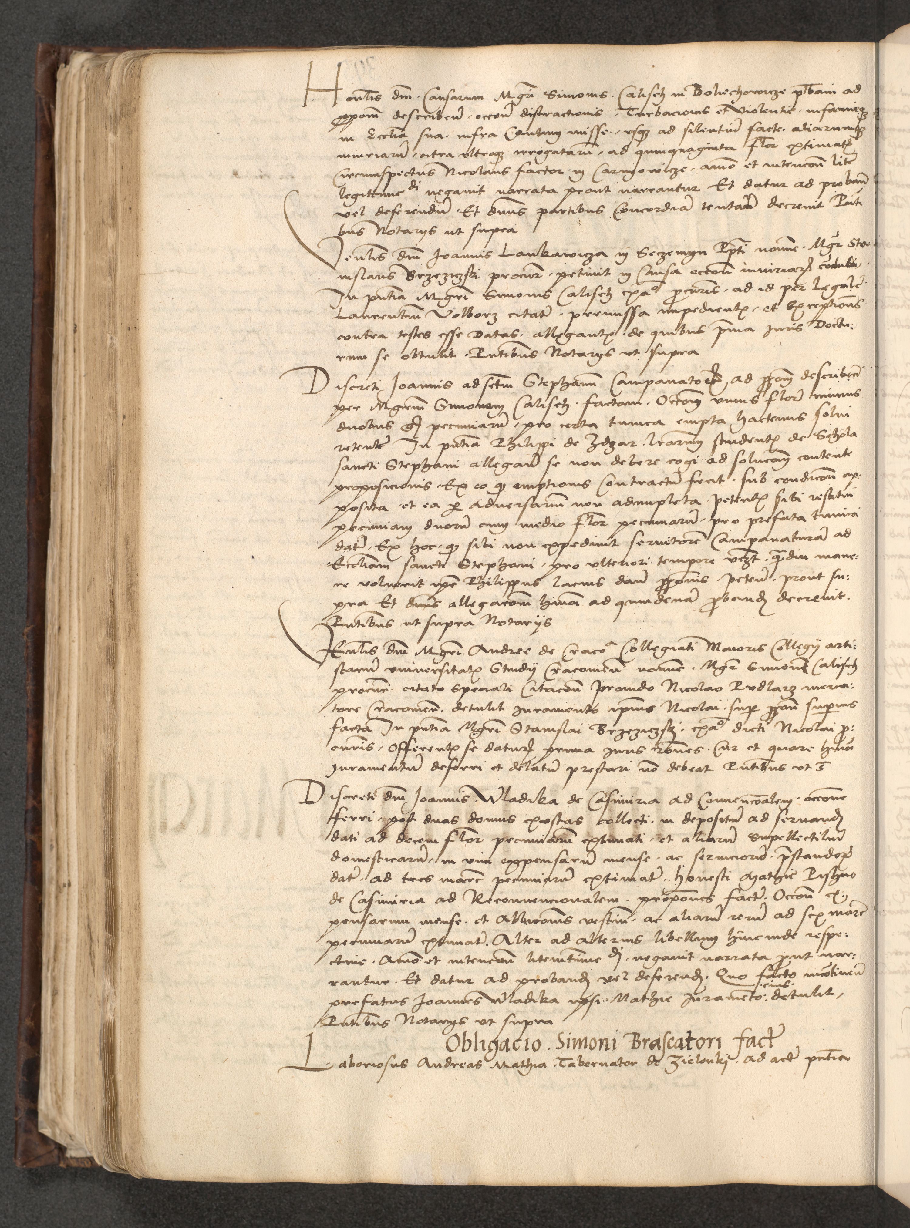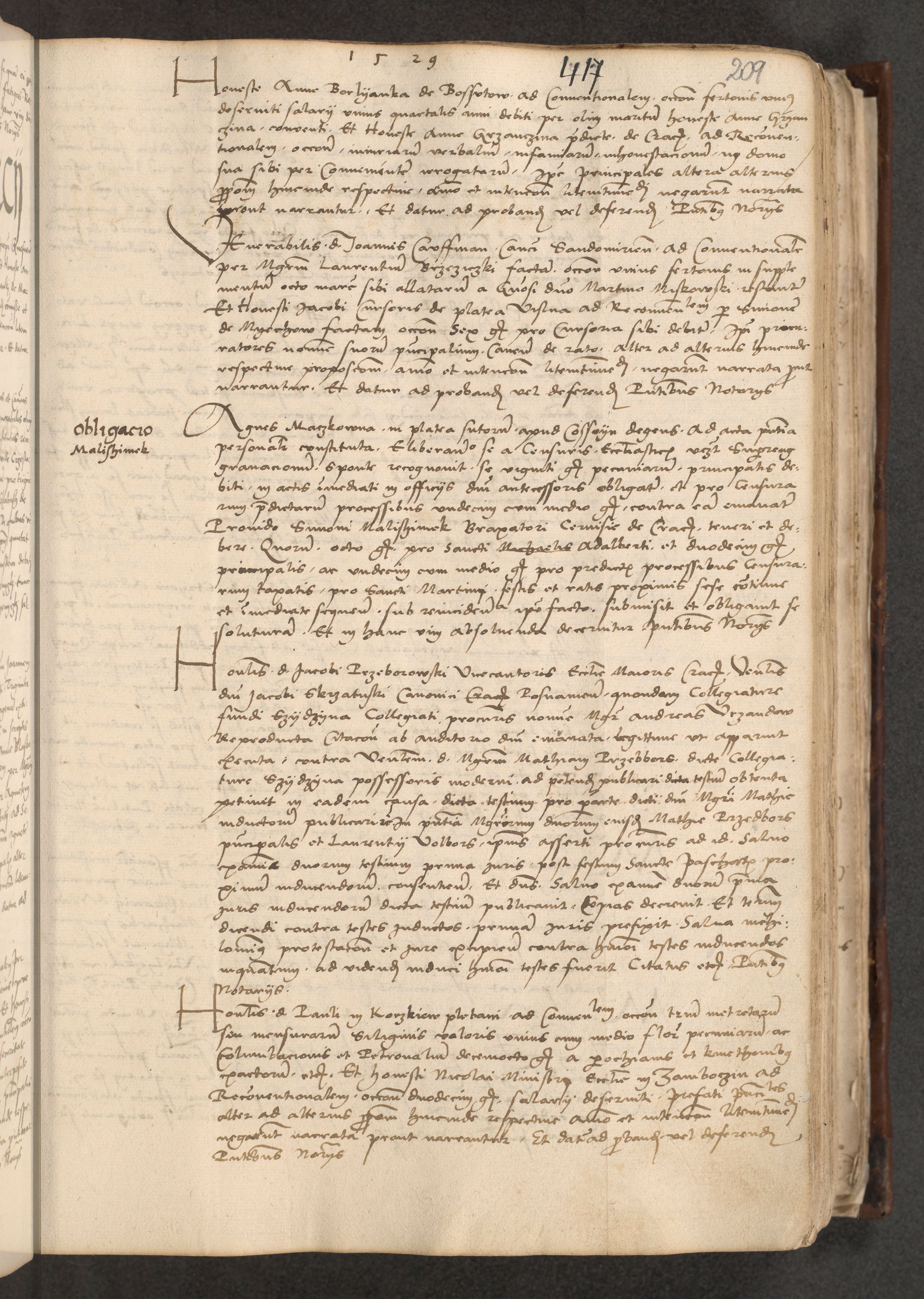 INRI. Acta actorum, obligacionum et sentenciarum tam interlocutoriarum quam diffinitivarum coram reverendo patre ac egregio viro domino Jacobo Erciss[o]wski decretorum doctorem, canonico et officiali generali Cracoviensi ad annum Domini 1528, indicionem primam, pontificatus sanctissimi in Christo patris et domini domini Clementis divina probidendcia pape seprtimi, annum quintum, per Stanislaum de Mordi legalem consistorii notarium omine felici inchoantur