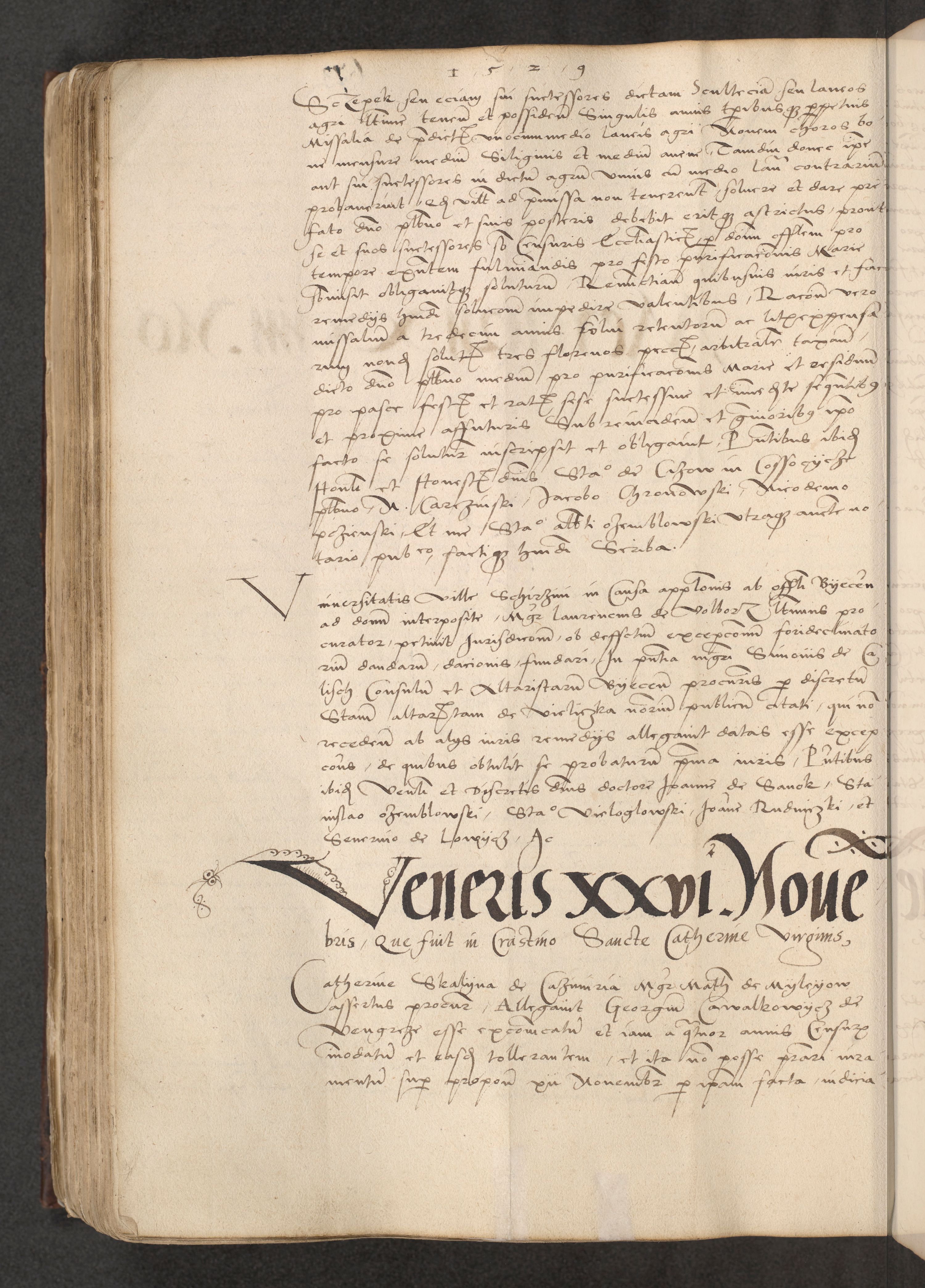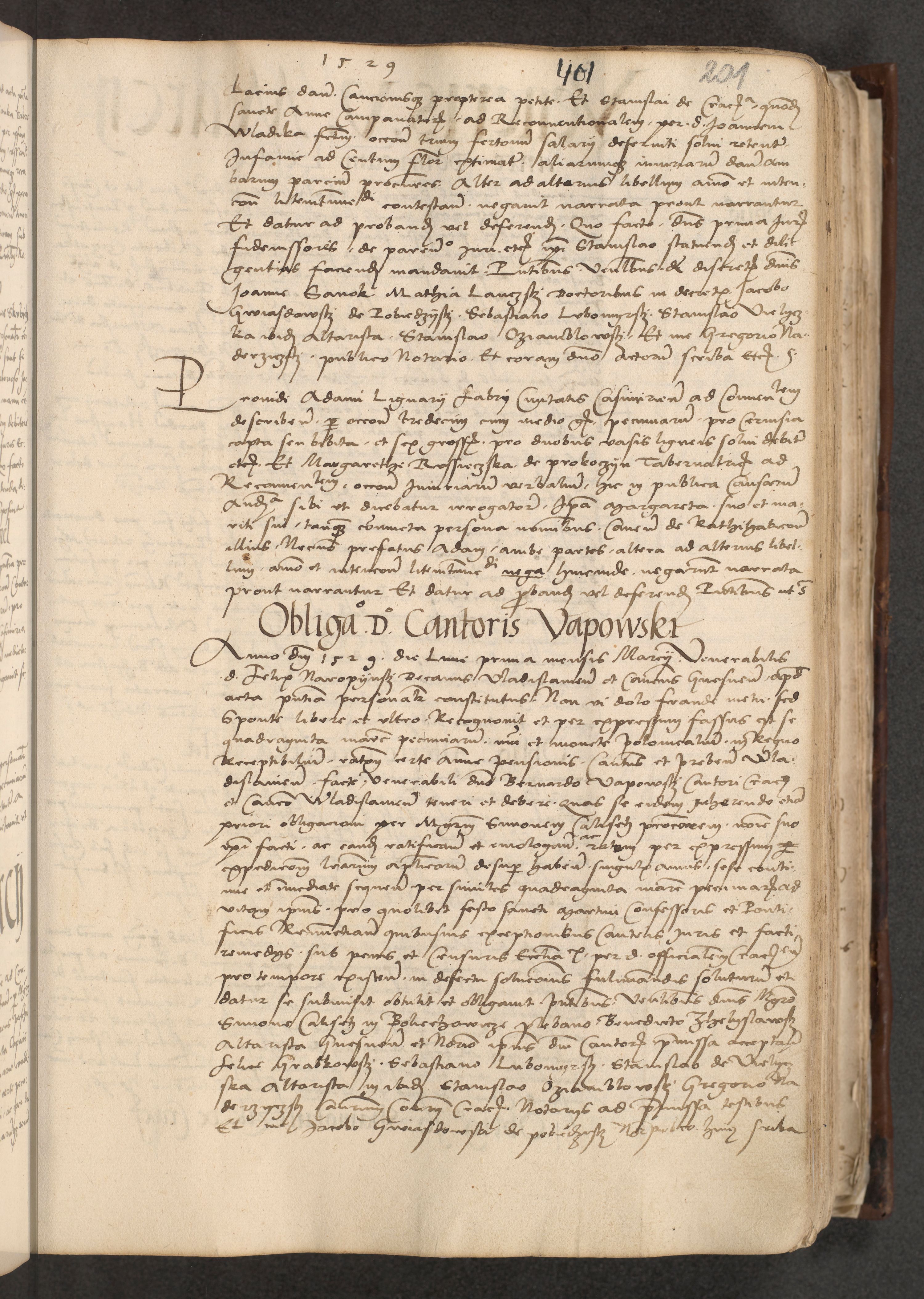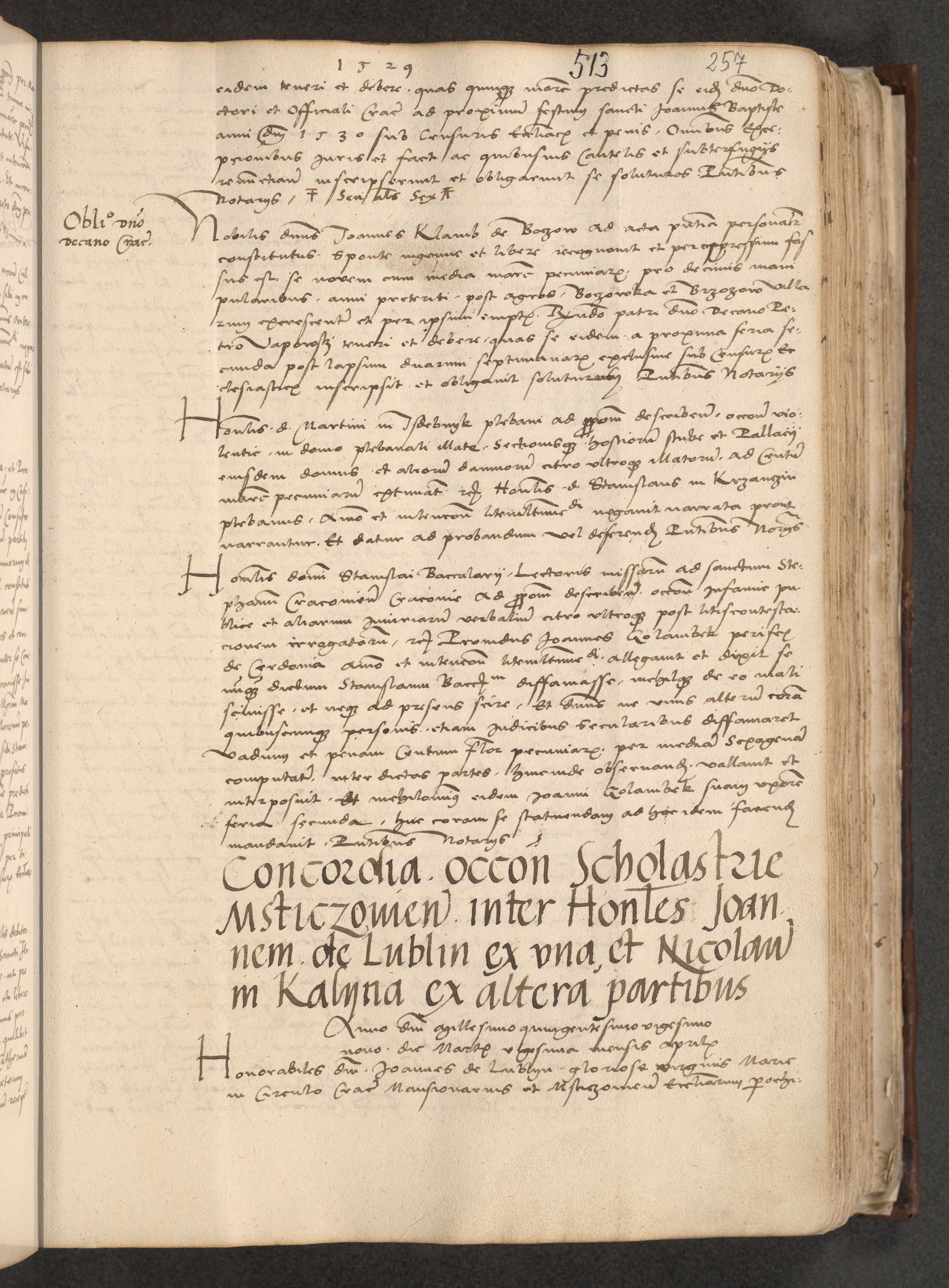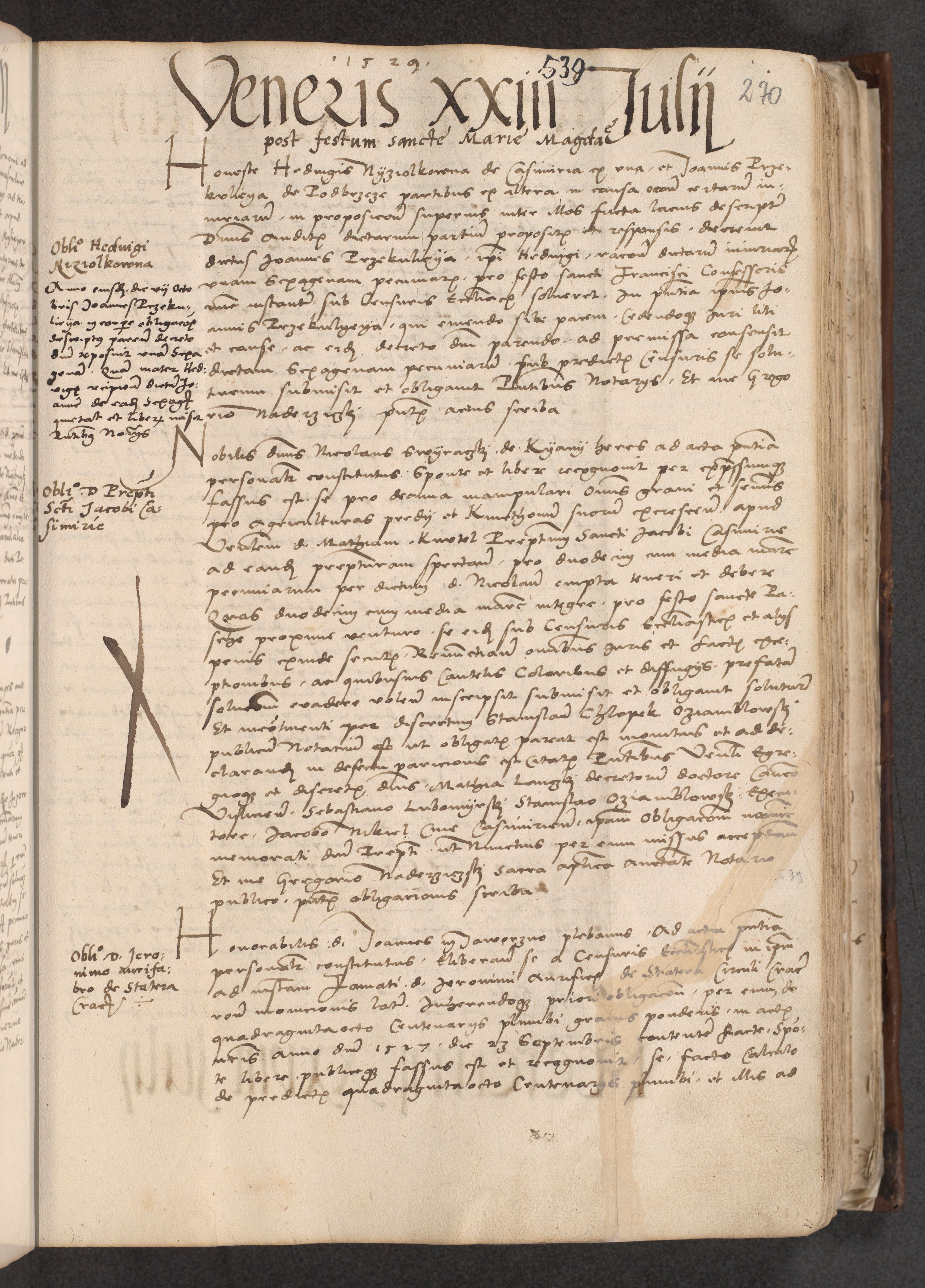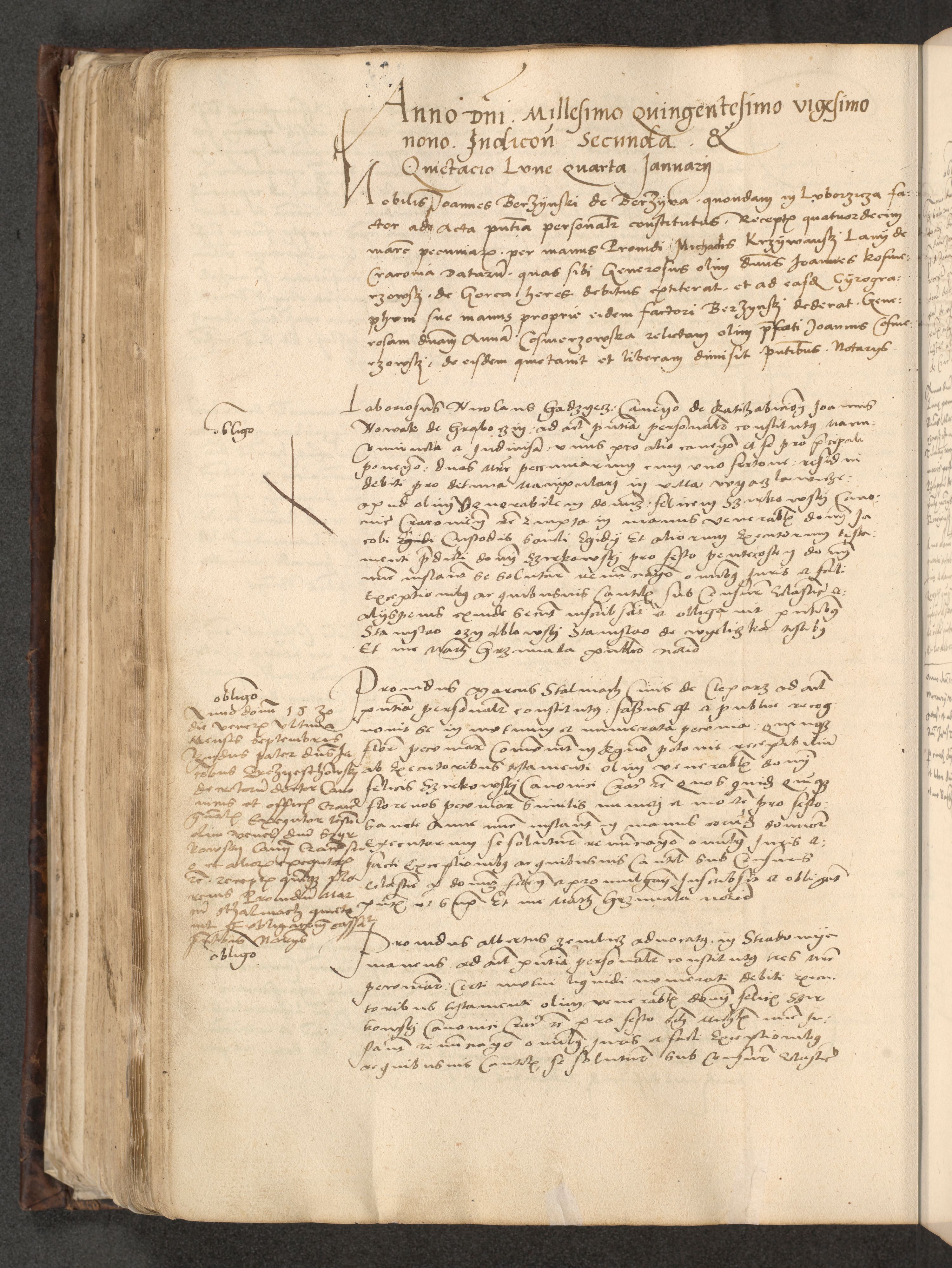 INRI. Acta actorum, obligacionum et sentenciarum tam interlocutoriarum quam diffinitivarum coram reverendo patre ac egregio viro domino Jacobo Erciss[o]wski decretorum doctorem, canonico et officiali generali Cracoviensi ad annum Domini 1528, indicionem primam, pontificatus sanctissimi in Christo patris et domini domini Clementis divina probidendcia pape seprtimi, annum quintum, per Stanislaum de Mordi legalem consistorii notarium omine felici inchoantur