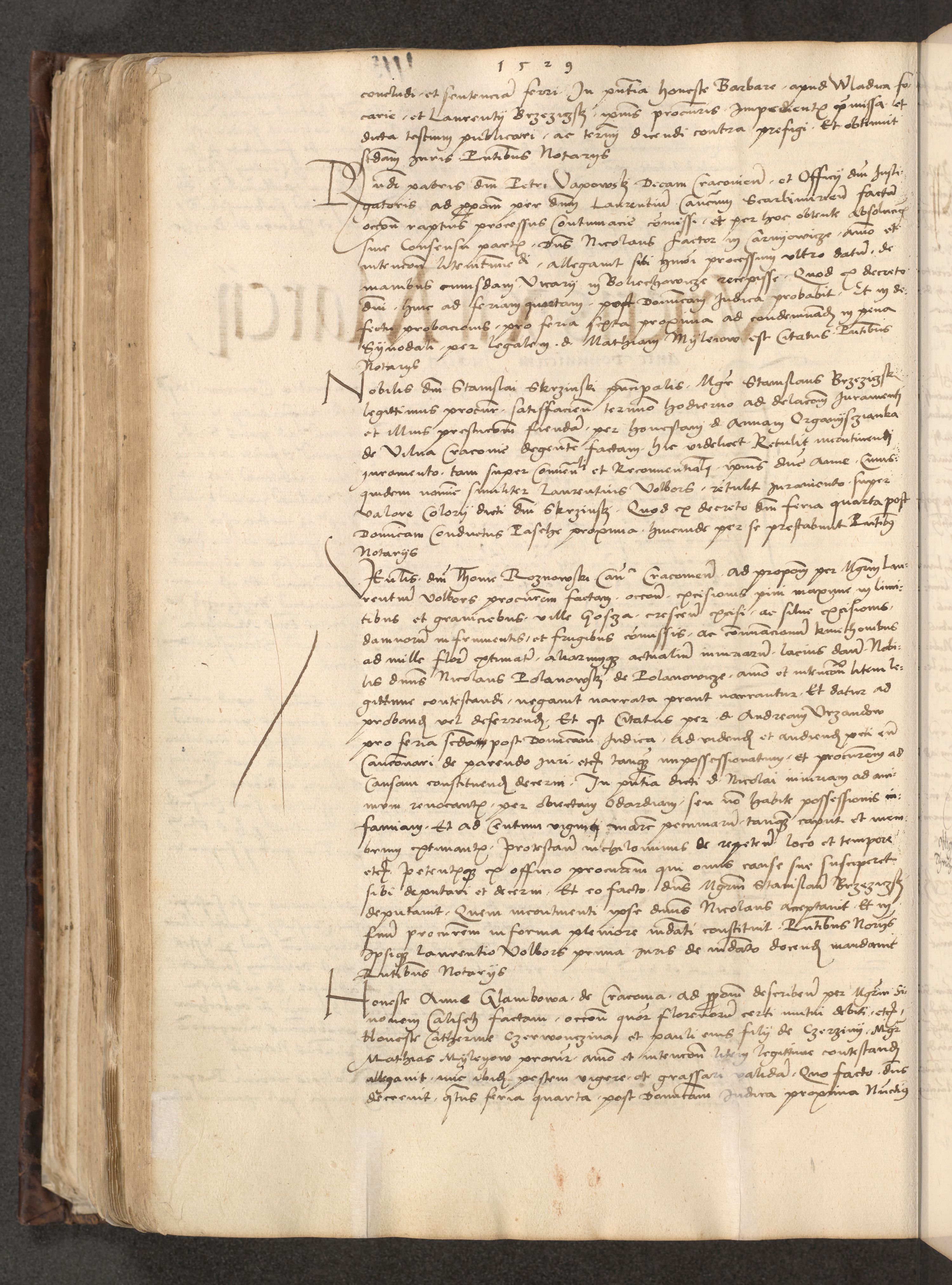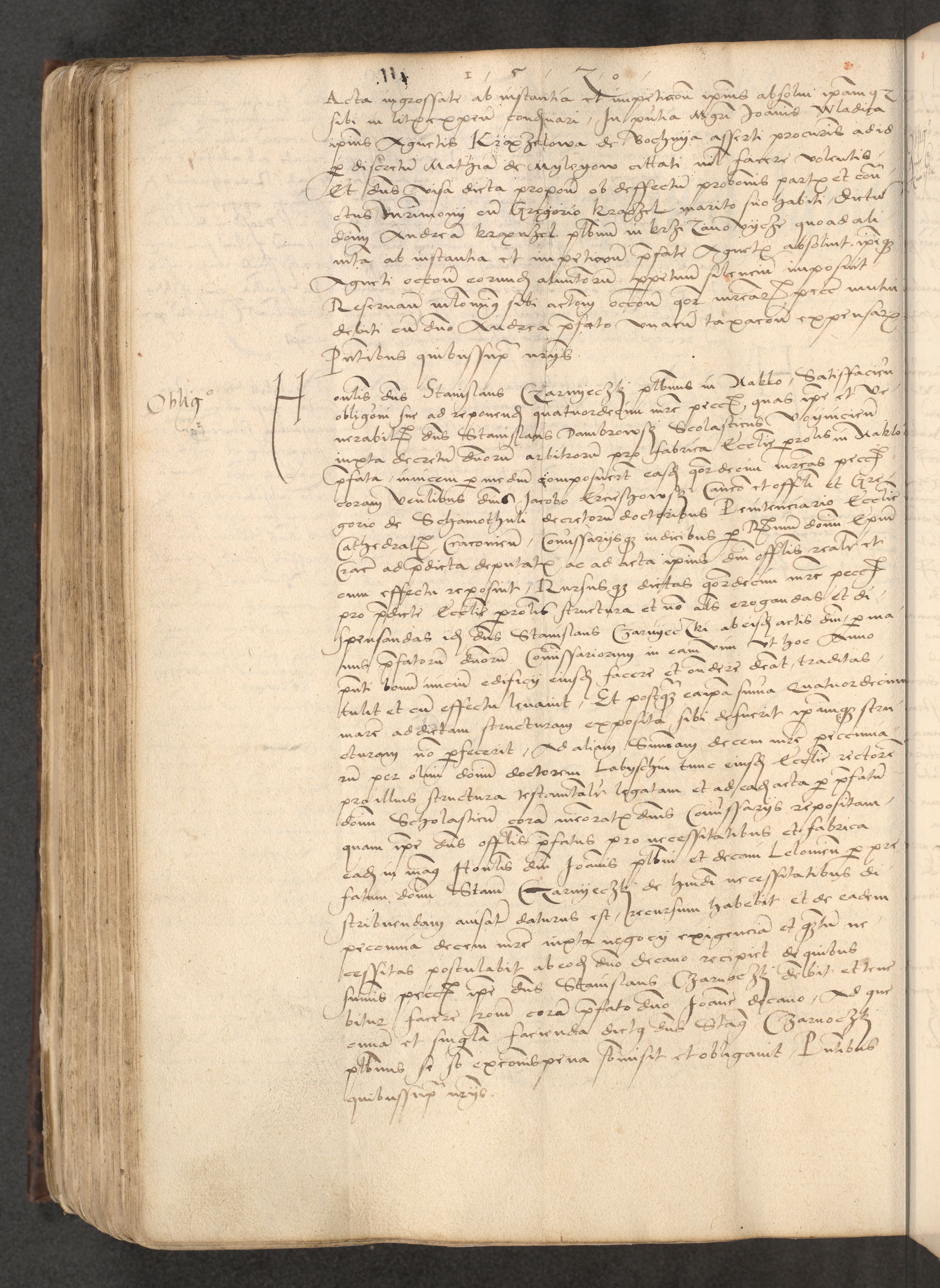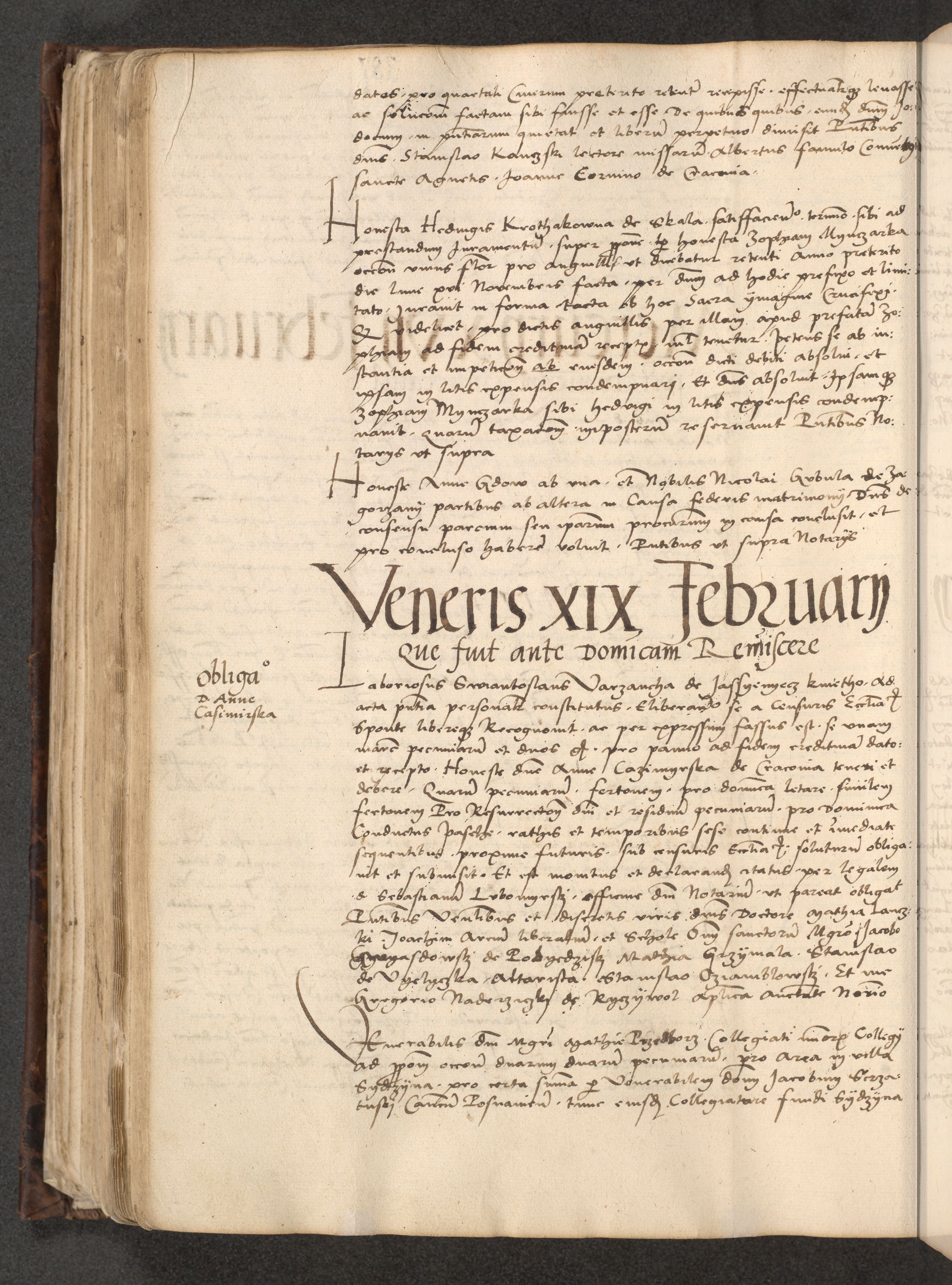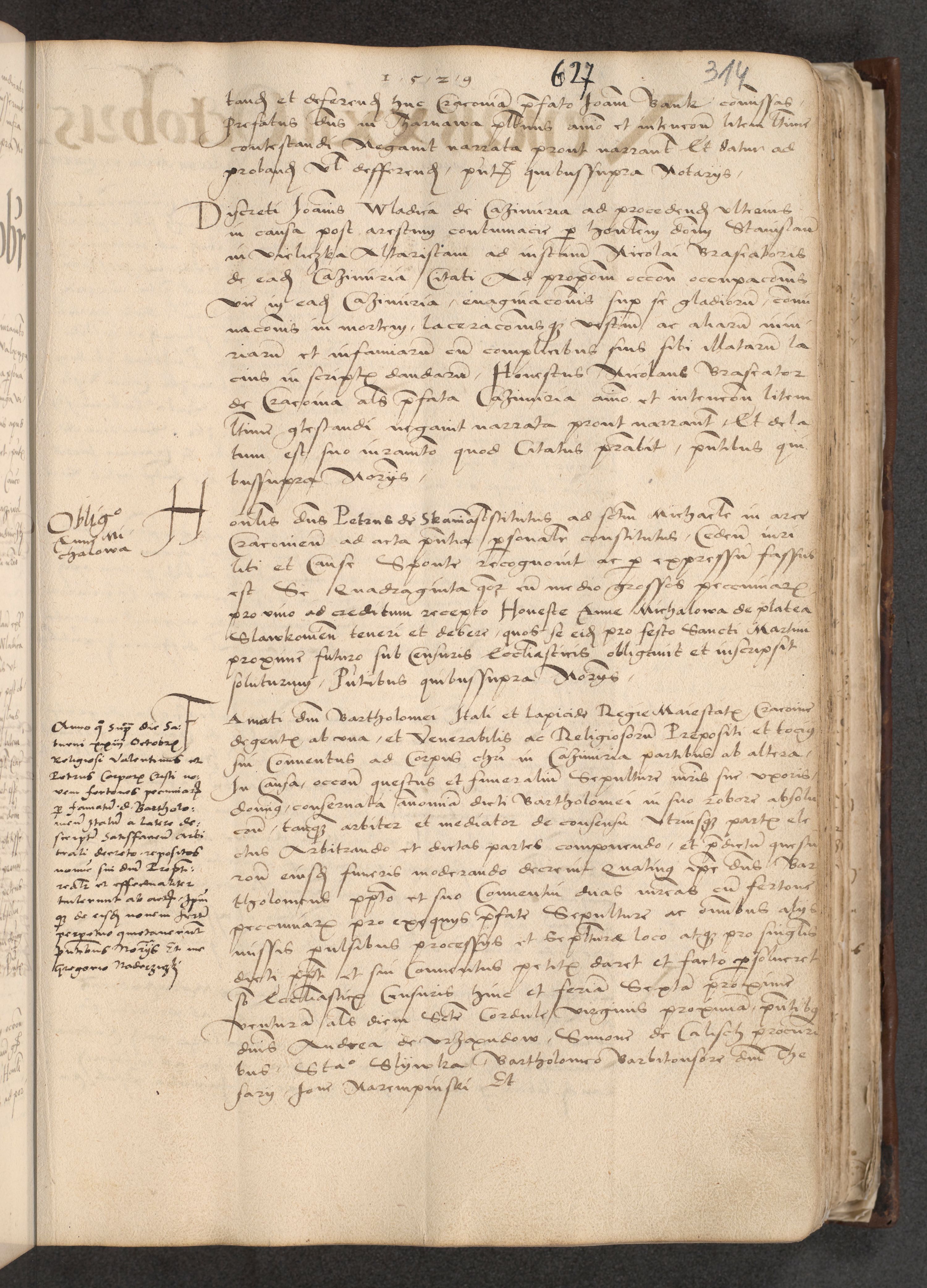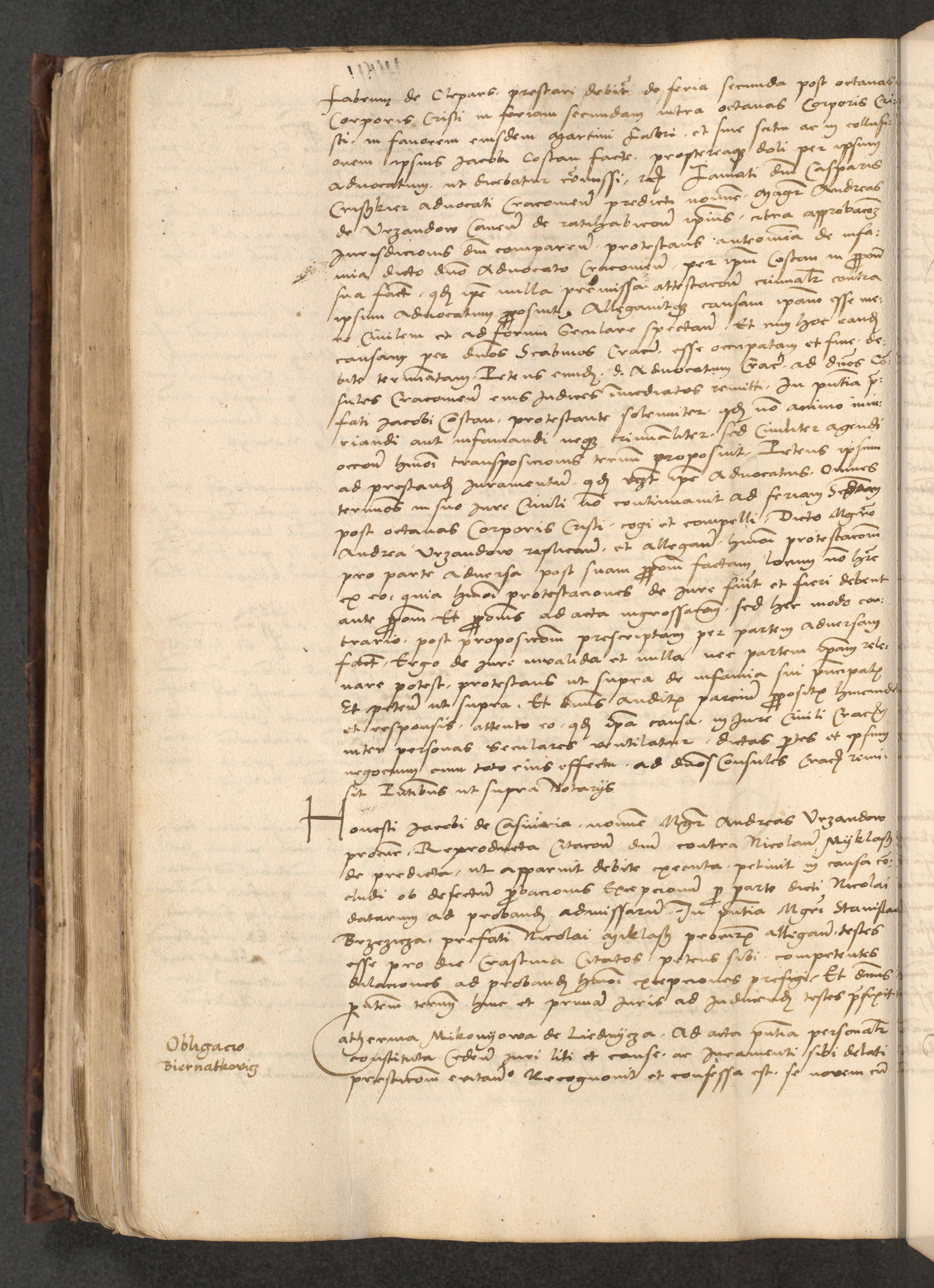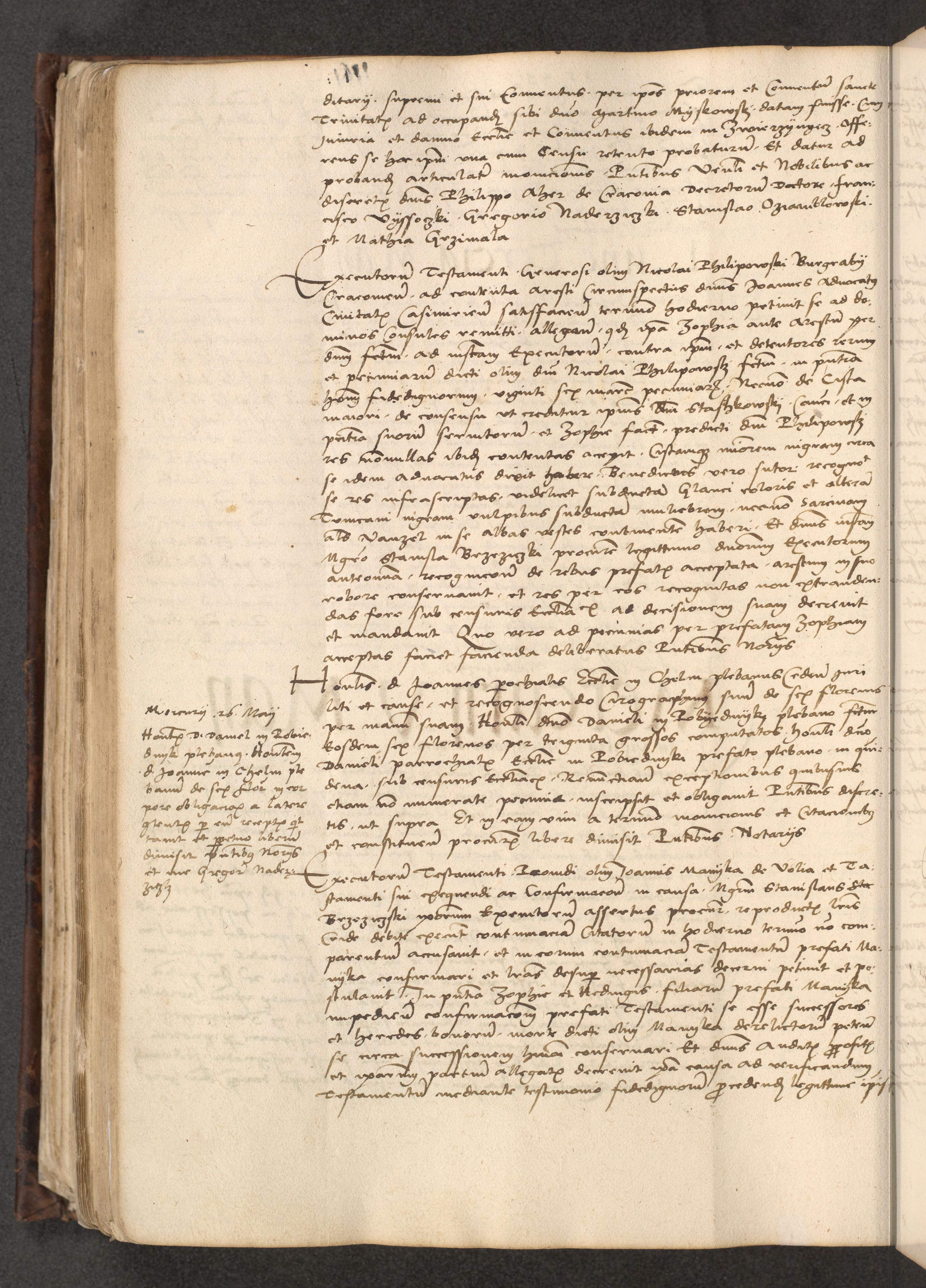 INRI. Acta actorum, obligacionum et sentenciarum tam interlocutoriarum quam diffinitivarum coram reverendo patre ac egregio viro domino Jacobo Erciss[o]wski decretorum doctorem, canonico et officiali generali Cracoviensi ad annum Domini 1528, indicionem primam, pontificatus sanctissimi in Christo patris et domini domini Clementis divina probidendcia pape seprtimi, annum quintum, per Stanislaum de Mordi legalem consistorii notarium omine felici inchoantur