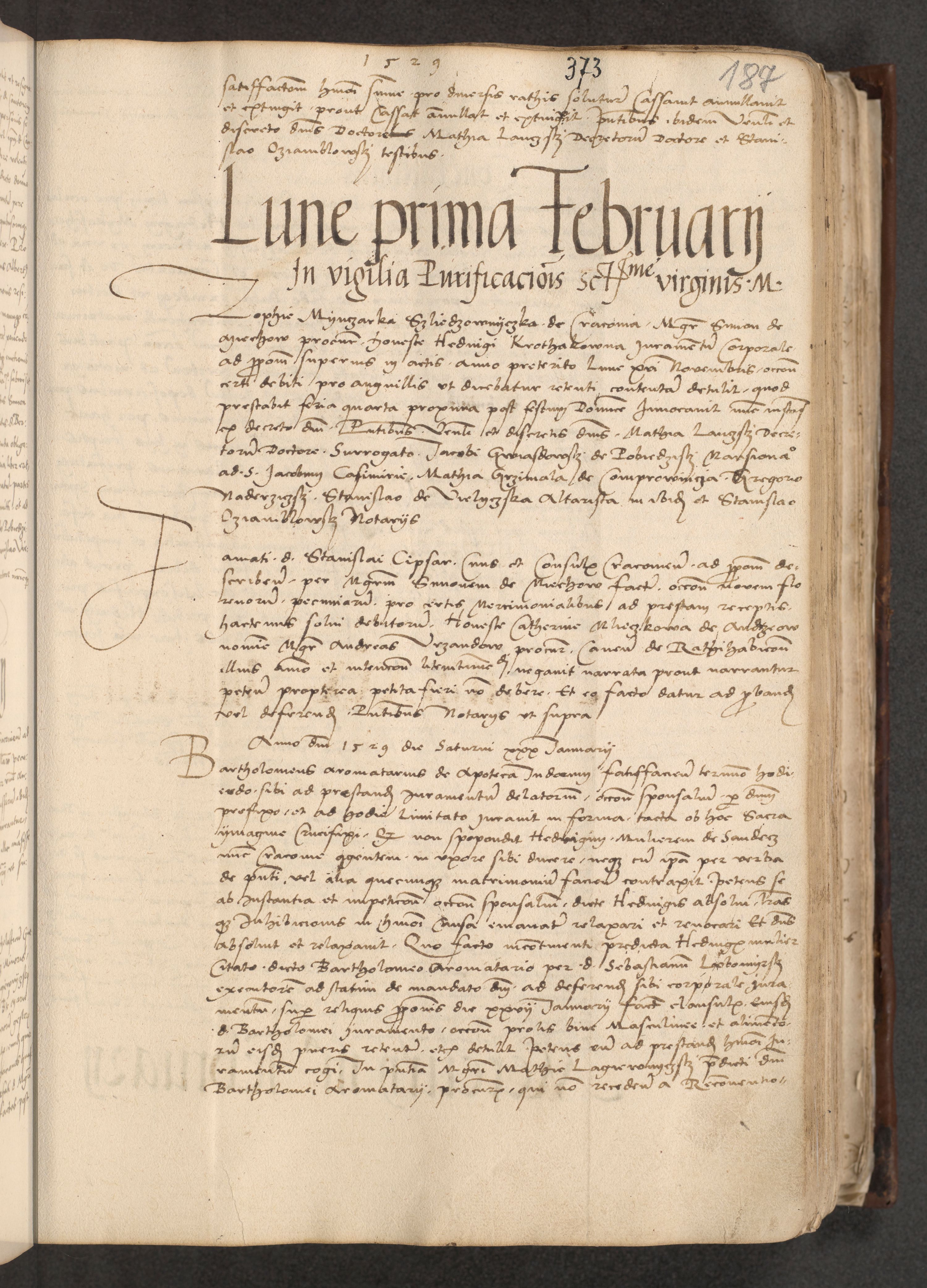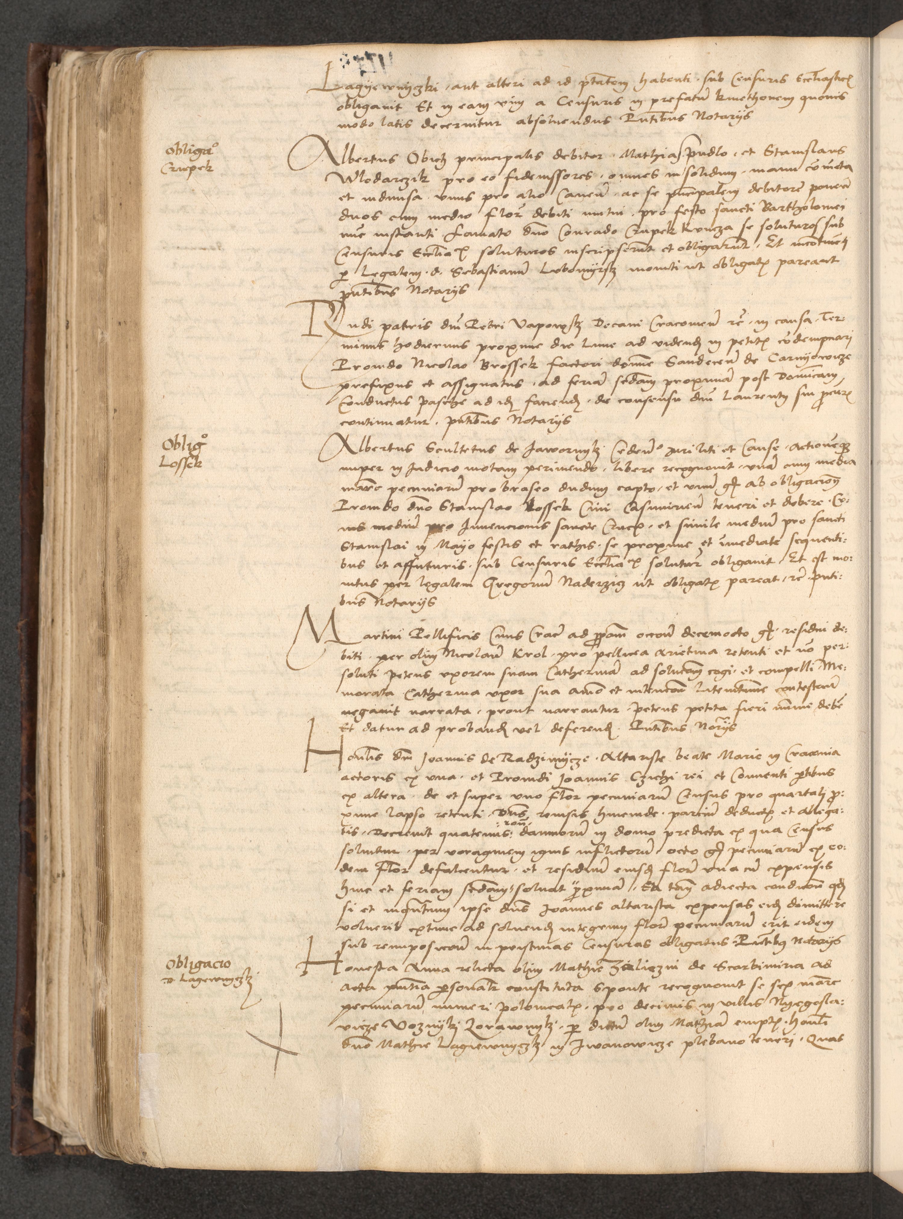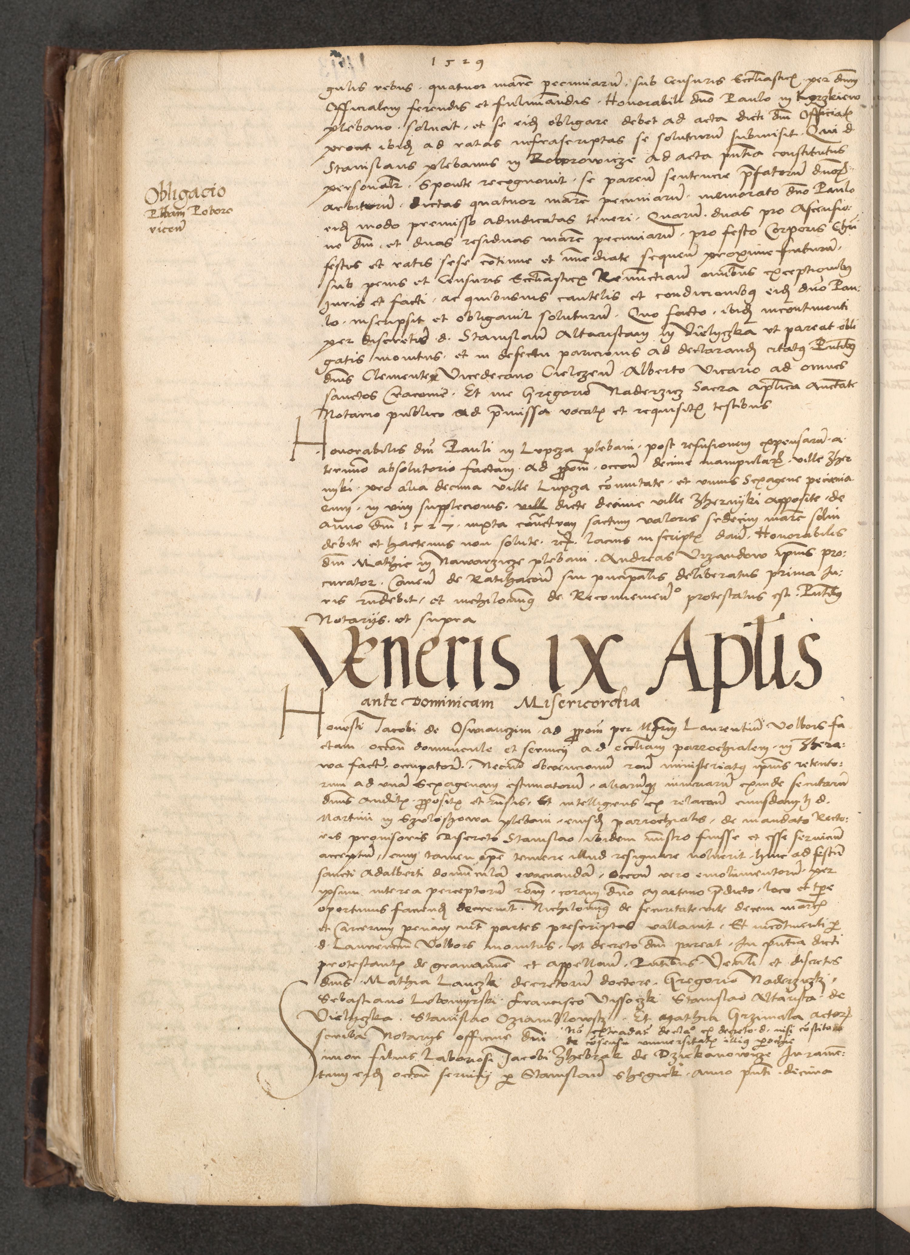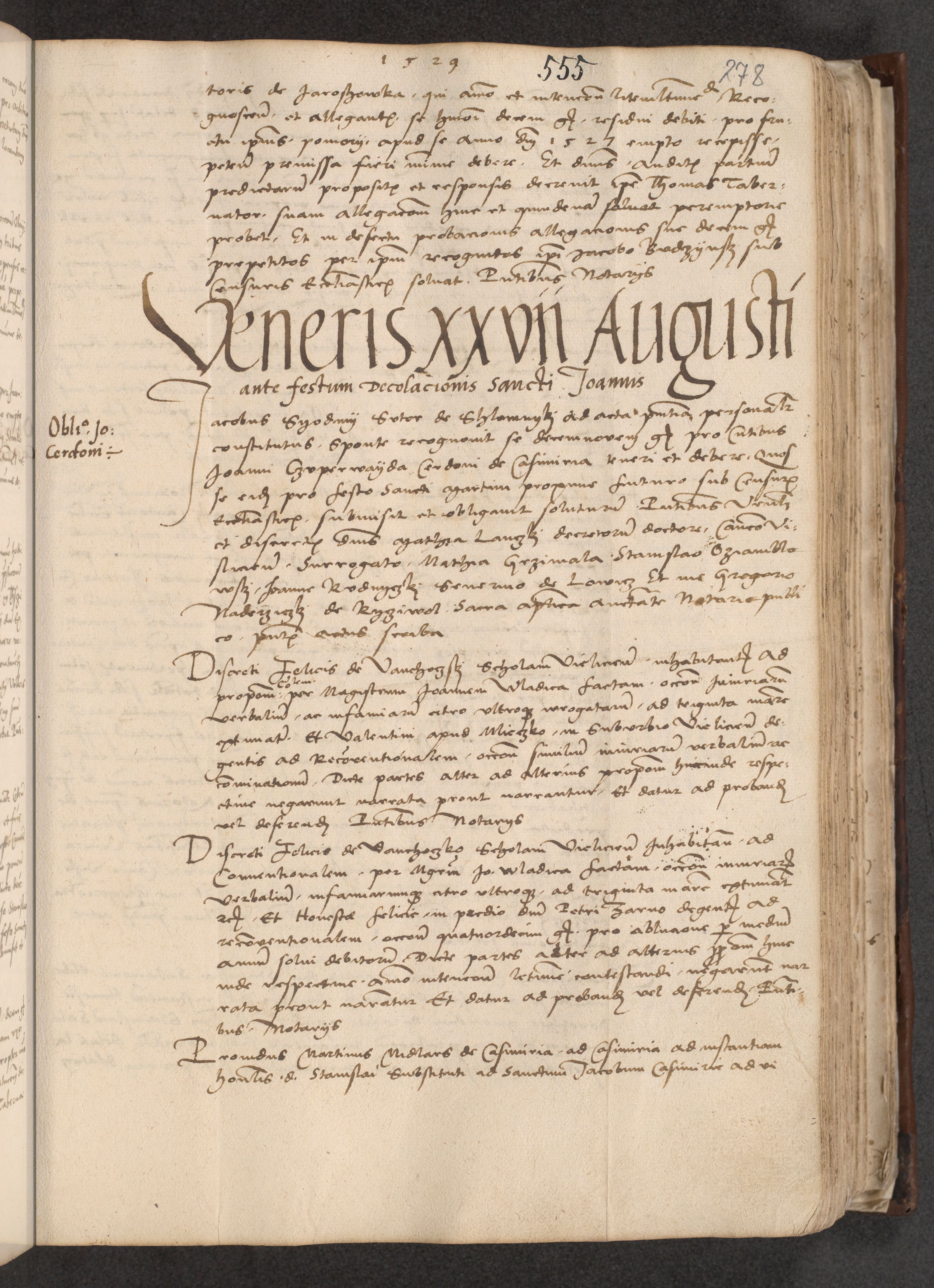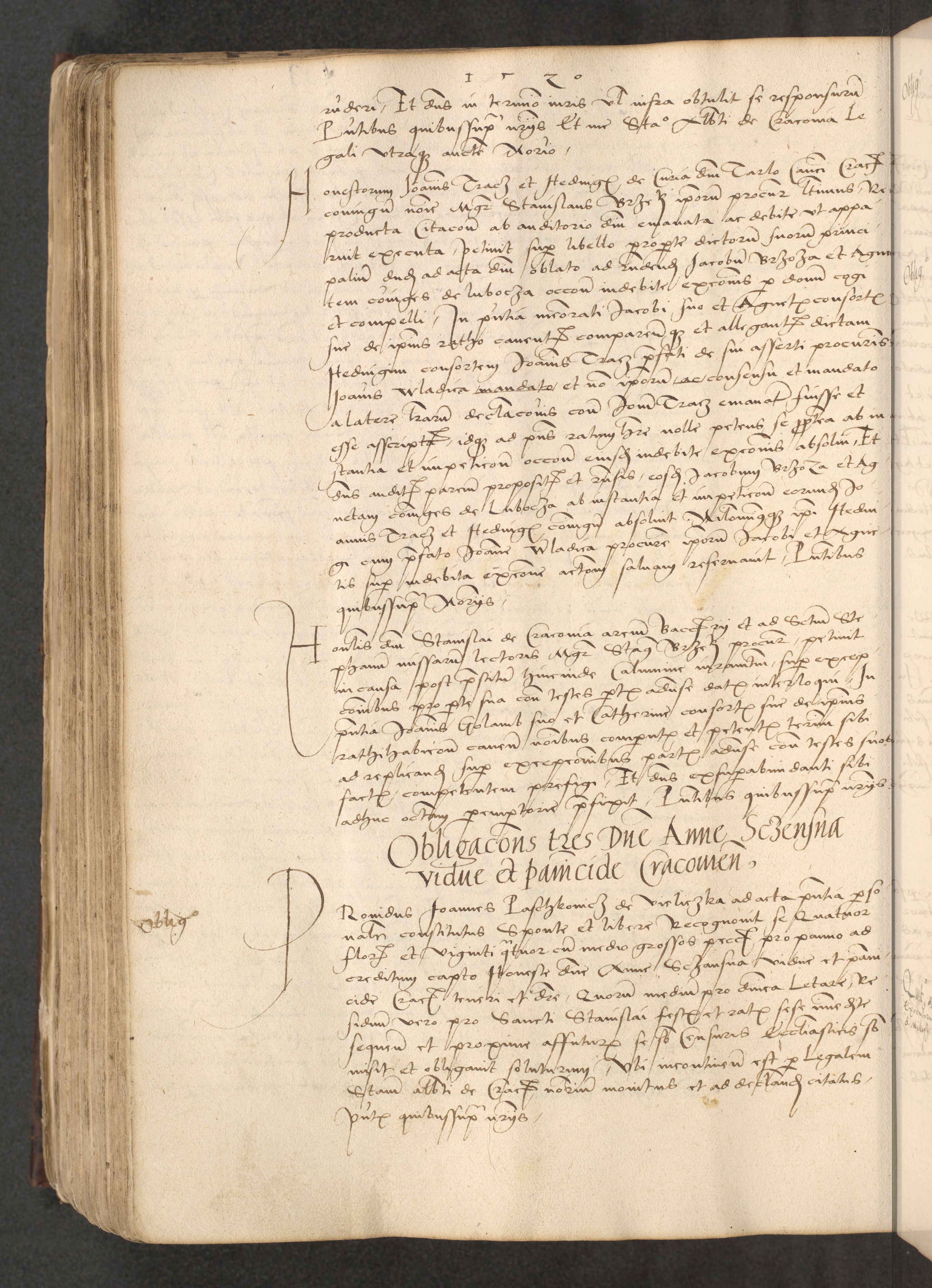 INRI. Acta actorum, obligacionum et sentenciarum tam interlocutoriarum quam diffinitivarum coram reverendo patre ac egregio viro domino Jacobo Erciss[o]wski decretorum doctorem, canonico et officiali generali Cracoviensi ad annum Domini 1528, indicionem primam, pontificatus sanctissimi in Christo patris et domini domini Clementis divina probidendcia pape seprtimi, annum quintum, per Stanislaum de Mordi legalem consistorii notarium omine felici inchoantur