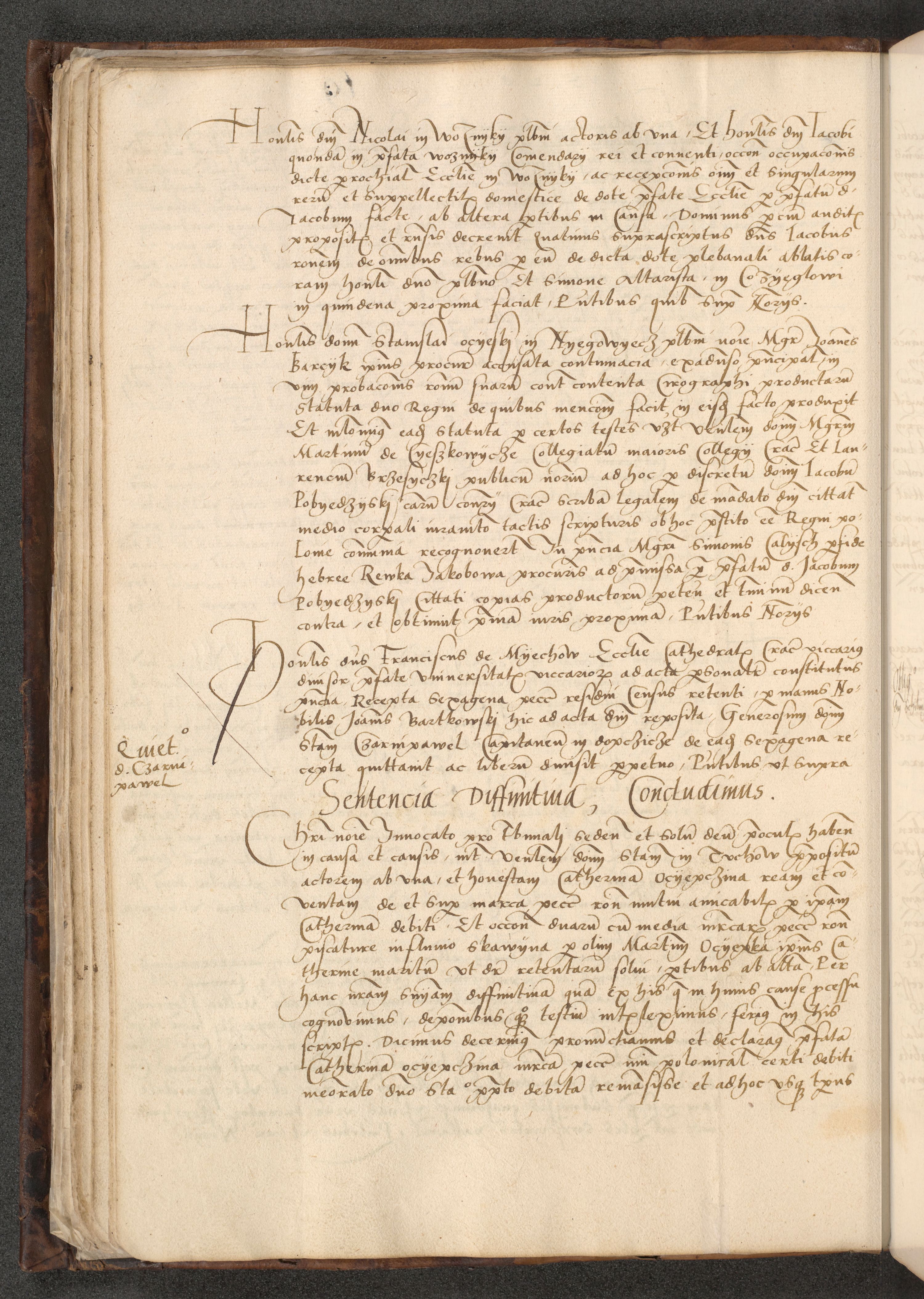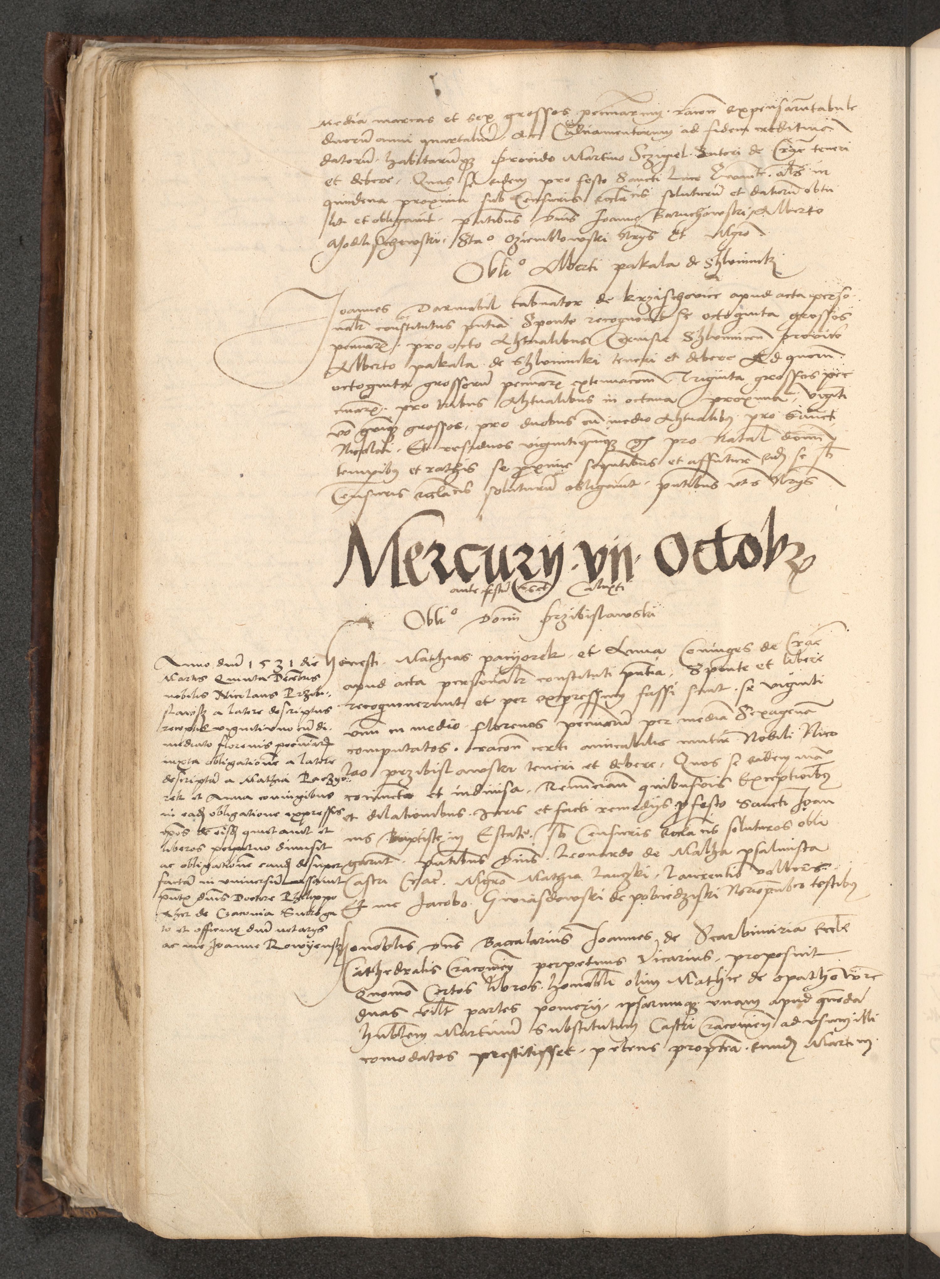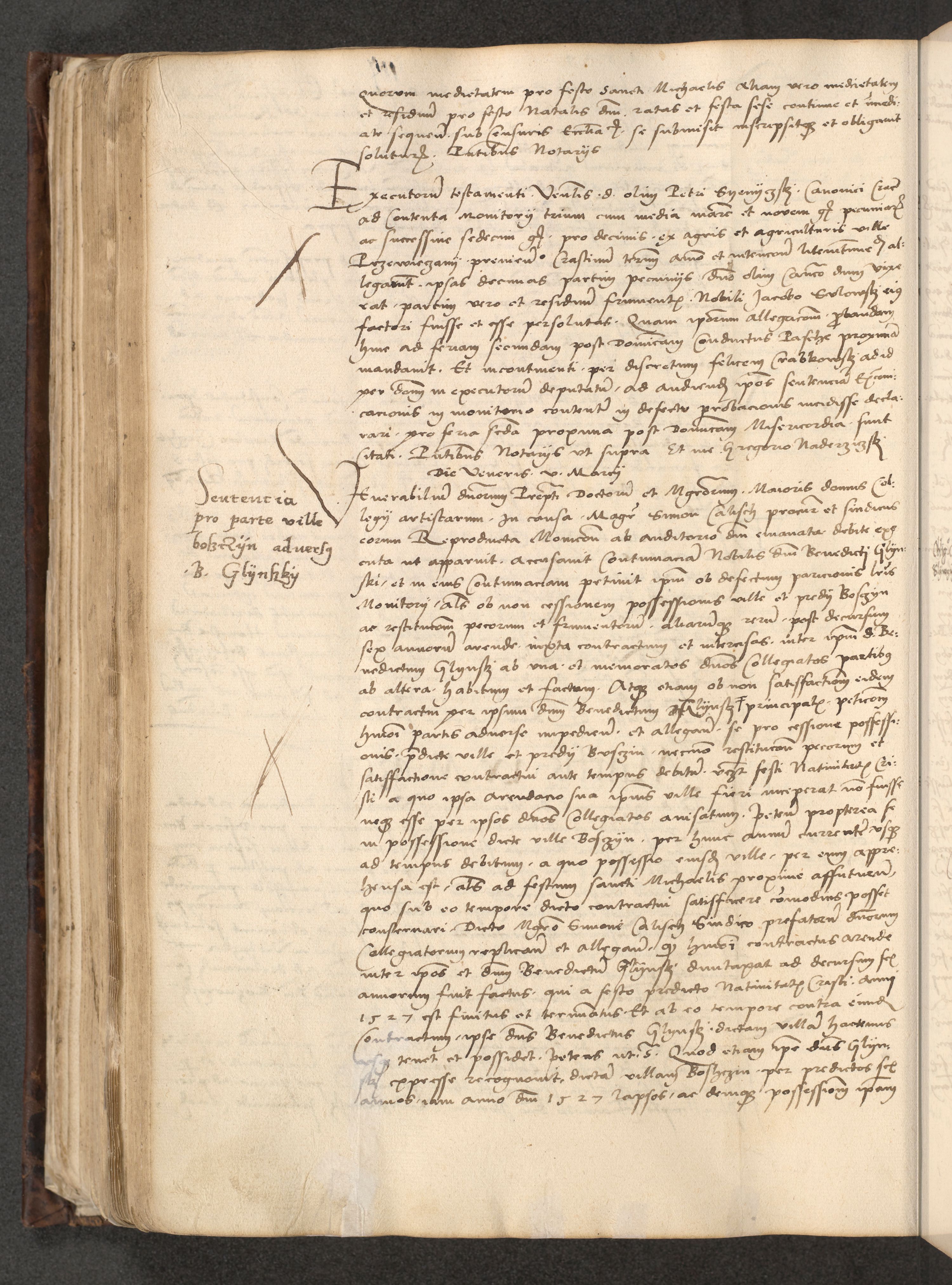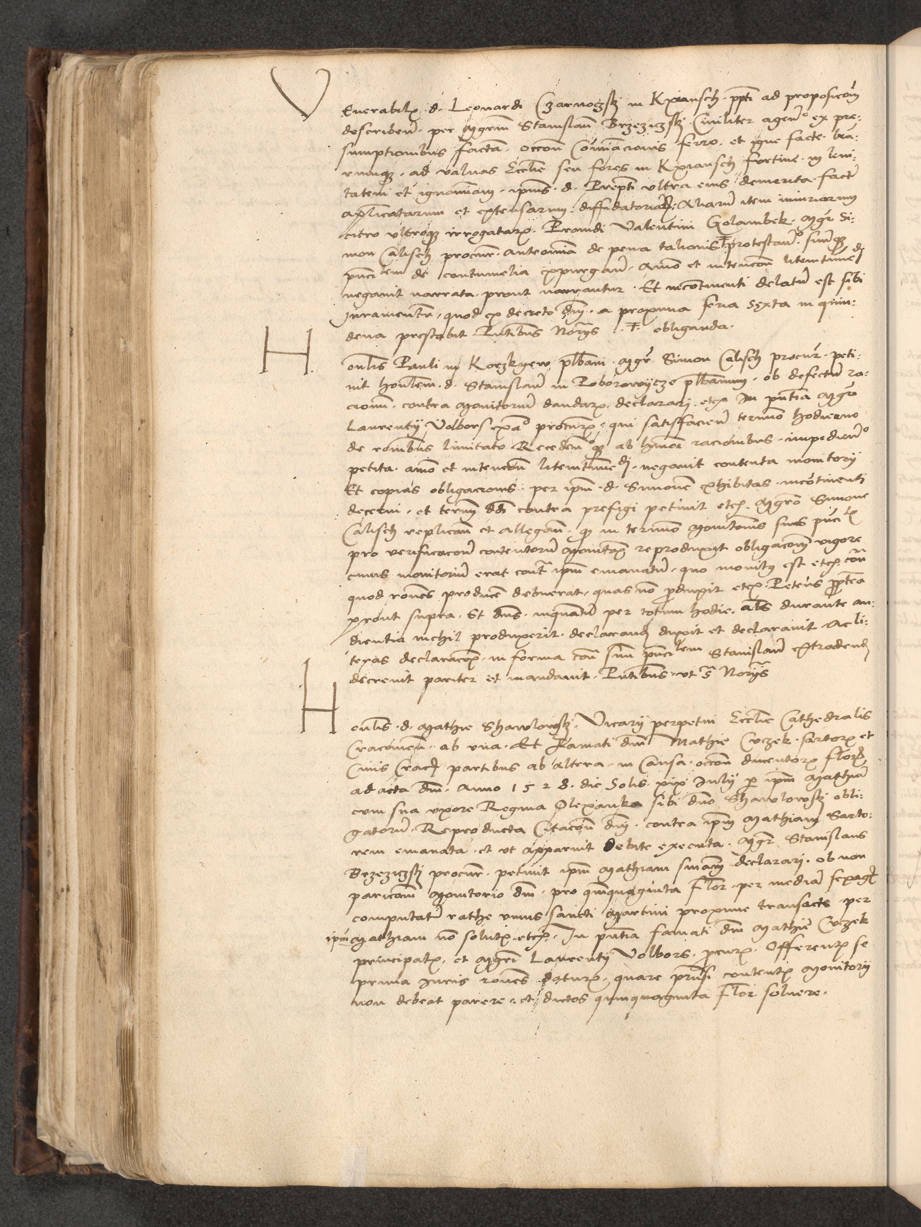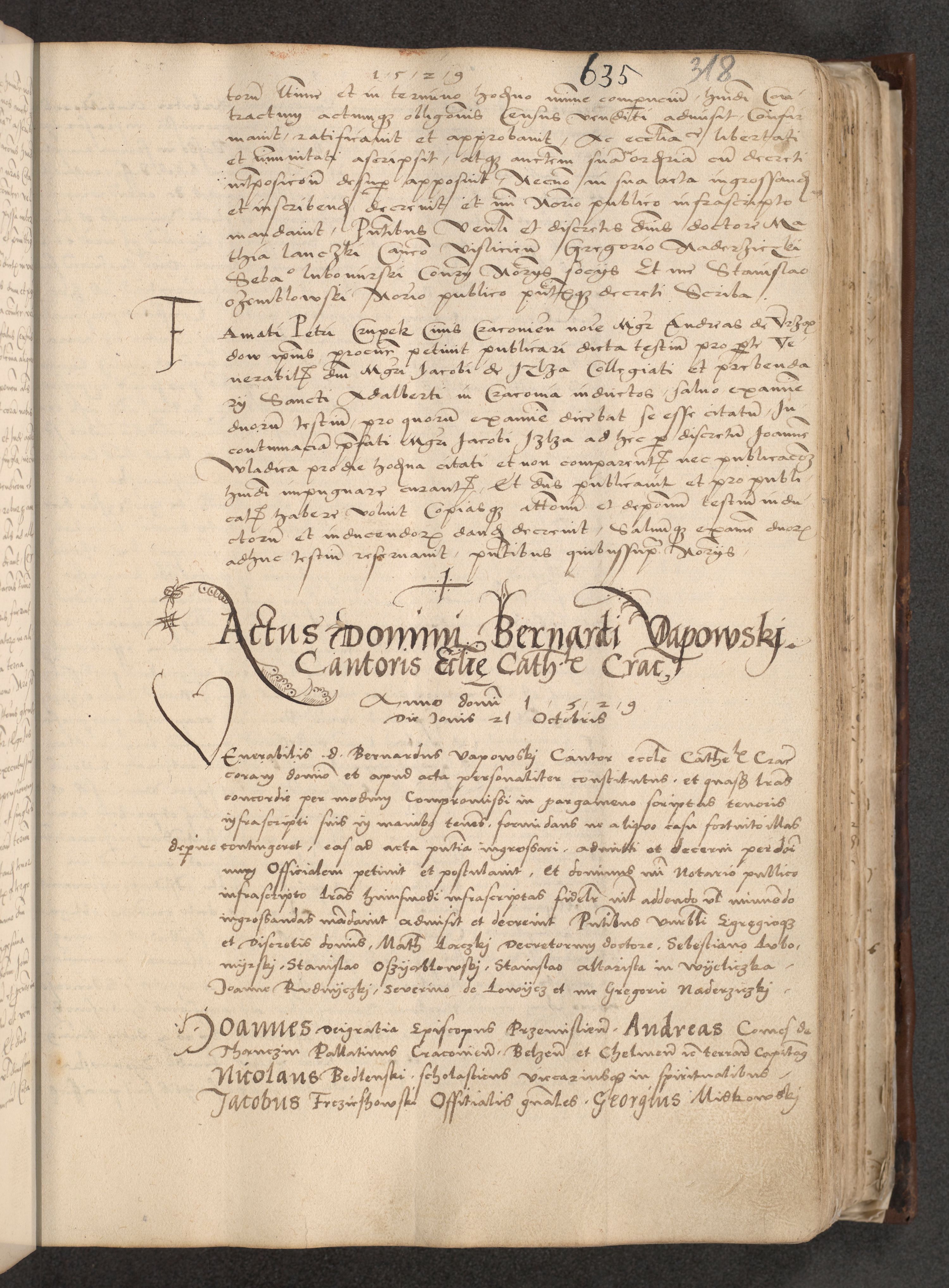 INRI. Acta actorum, obligacionum et sentenciarum tam interlocutoriarum quam diffinitivarum coram reverendo patre ac egregio viro domino Jacobo Erciss[o]wski decretorum doctorem, canonico et officiali generali Cracoviensi ad annum Domini 1528, indicionem primam, pontificatus sanctissimi in Christo patris et domini domini Clementis divina probidendcia pape seprtimi, annum quintum, per Stanislaum de Mordi legalem consistorii notarium omine felici inchoantur