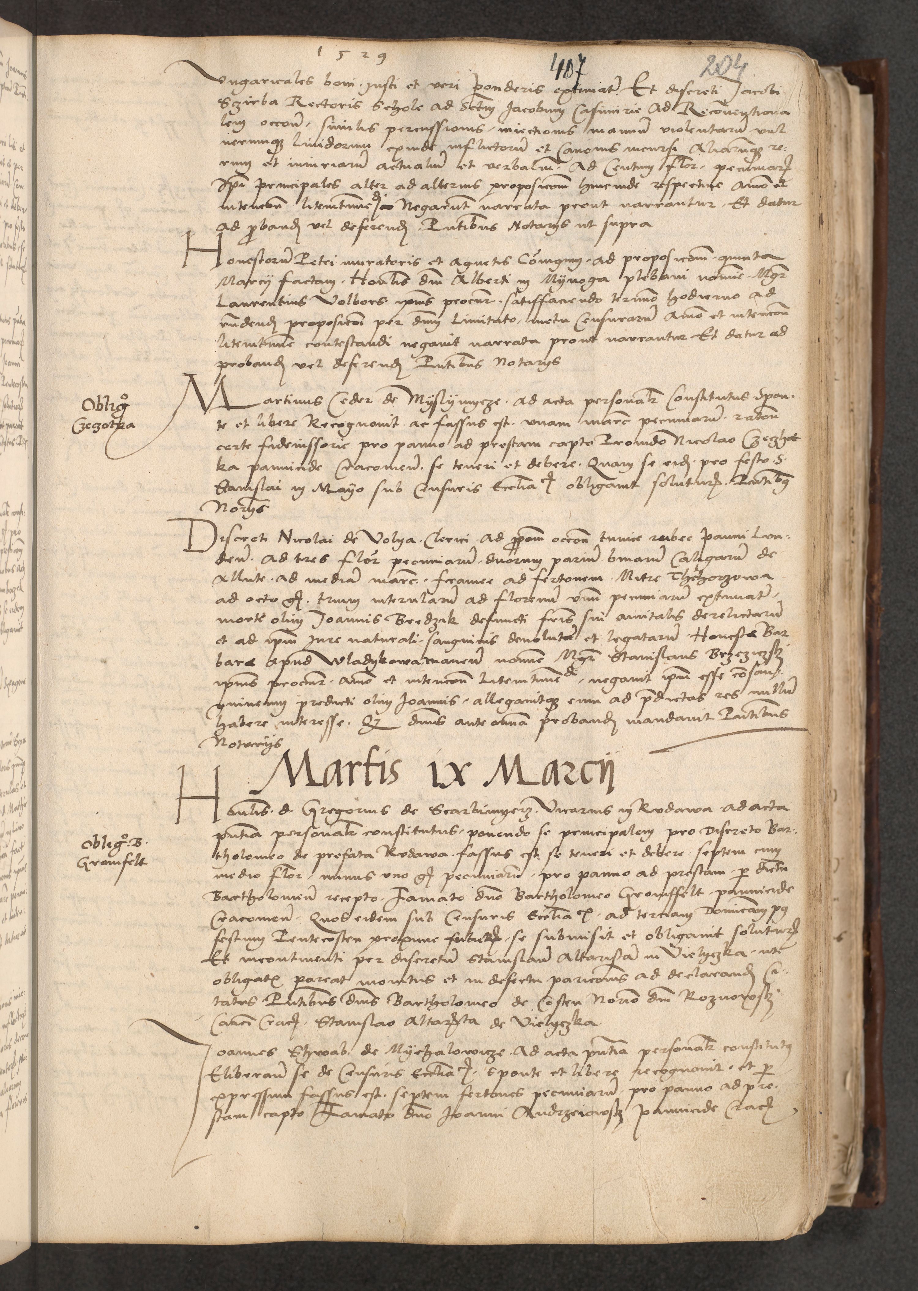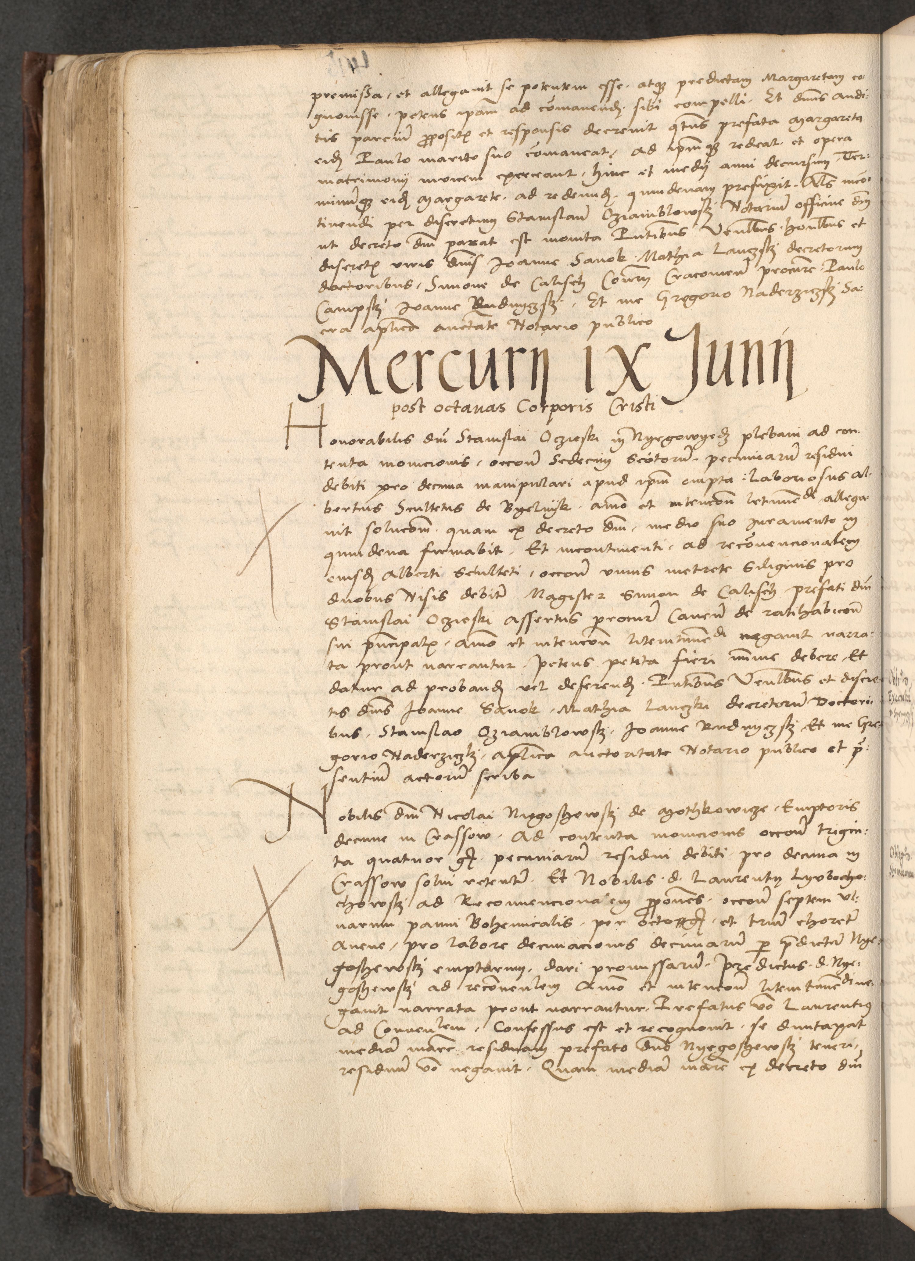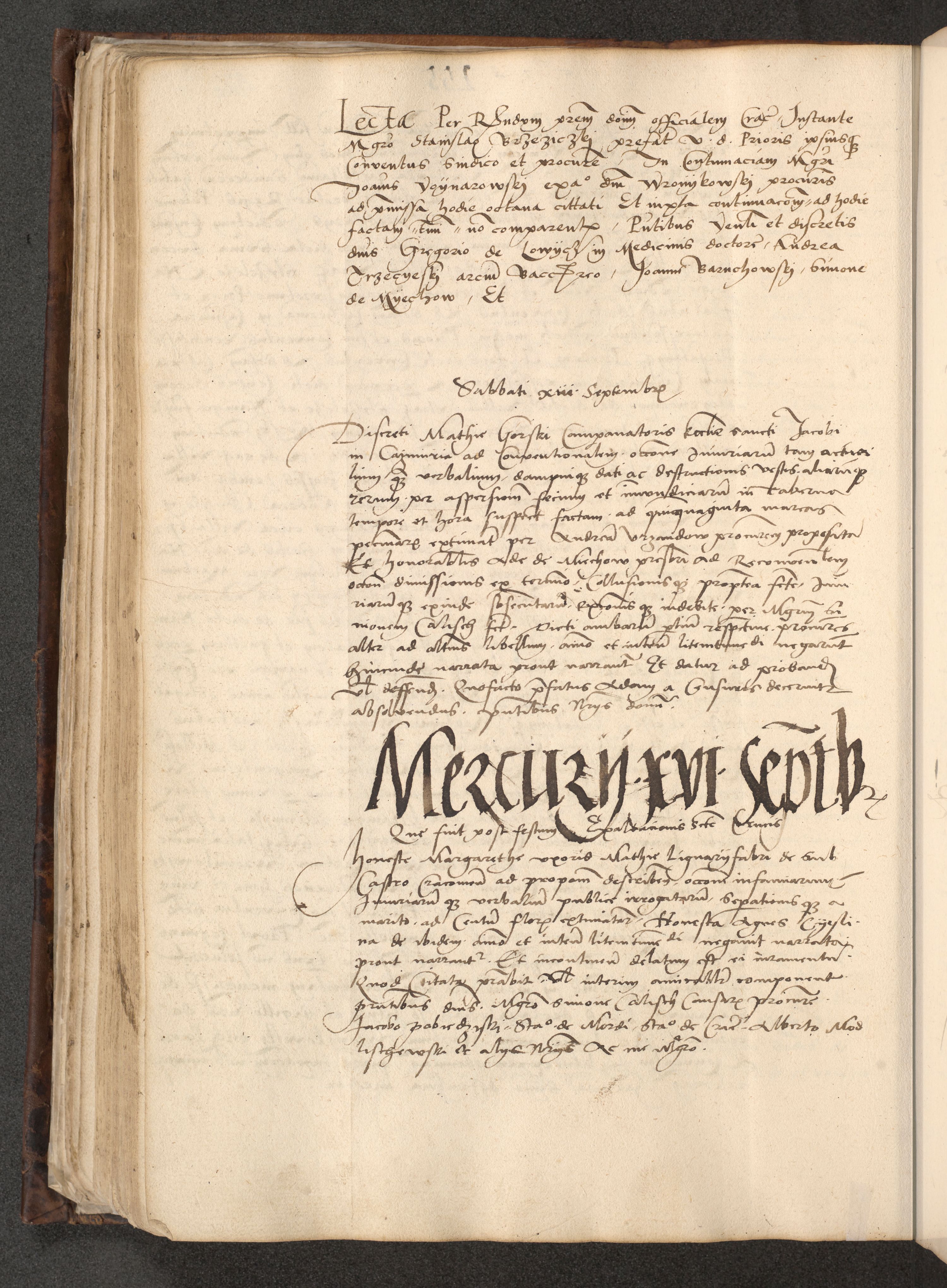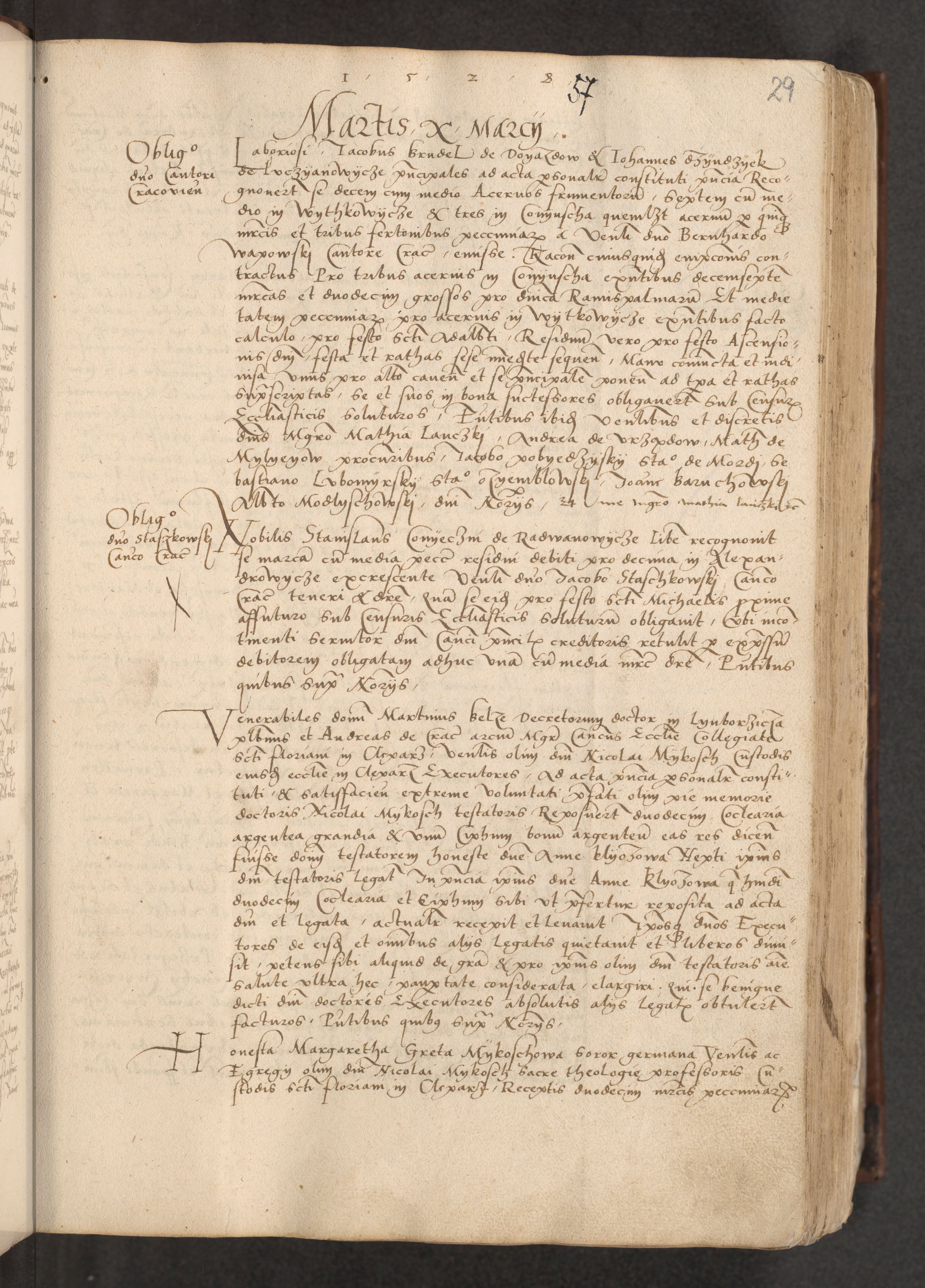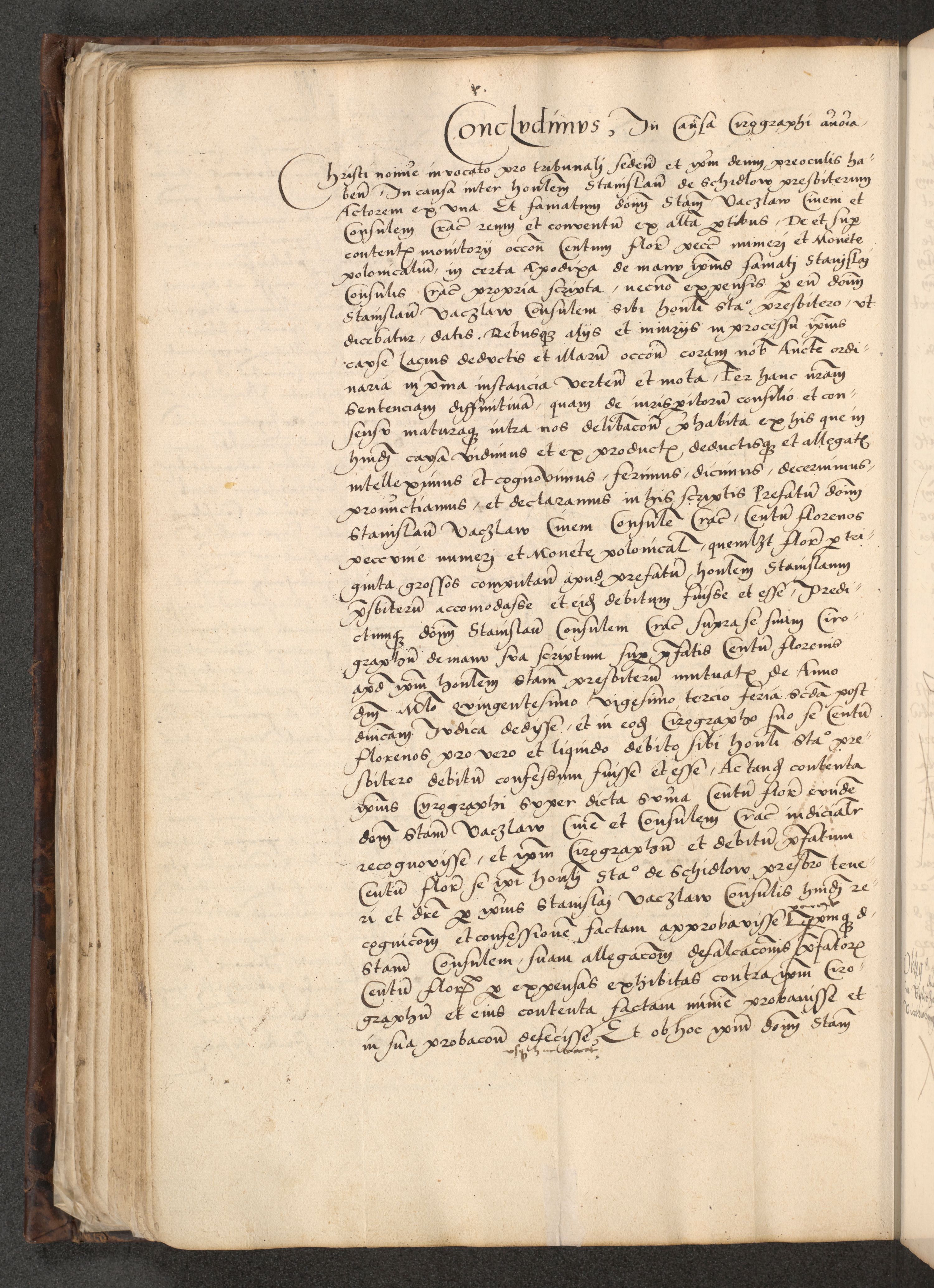 INRI. Acta actorum, obligacionum et sentenciarum tam interlocutoriarum quam diffinitivarum coram reverendo patre ac egregio viro domino Jacobo Erciss[o]wski decretorum doctorem, canonico et officiali generali Cracoviensi ad annum Domini 1528, indicionem primam, pontificatus sanctissimi in Christo patris et domini domini Clementis divina probidendcia pape seprtimi, annum quintum, per Stanislaum de Mordi legalem consistorii notarium omine felici inchoantur