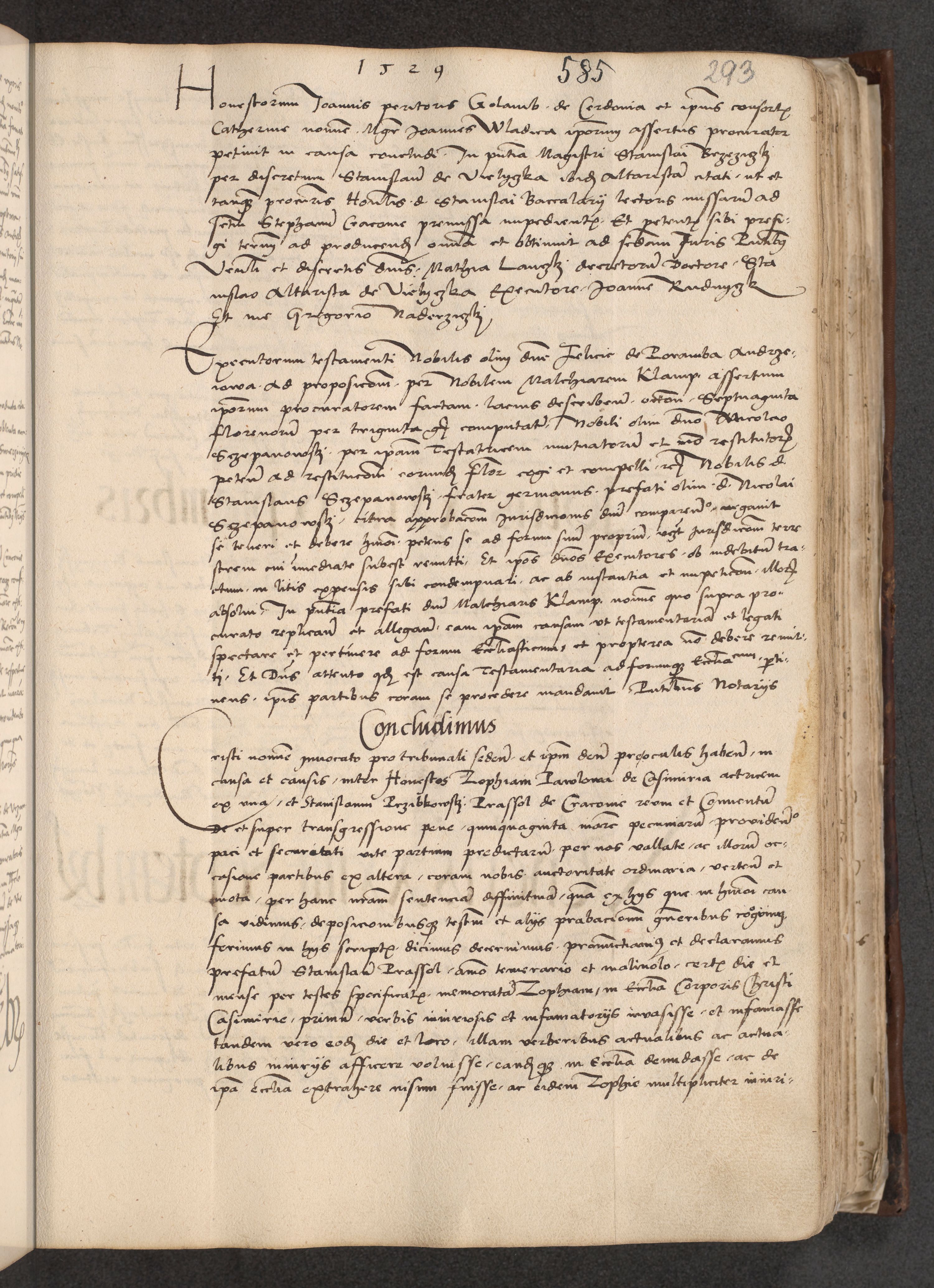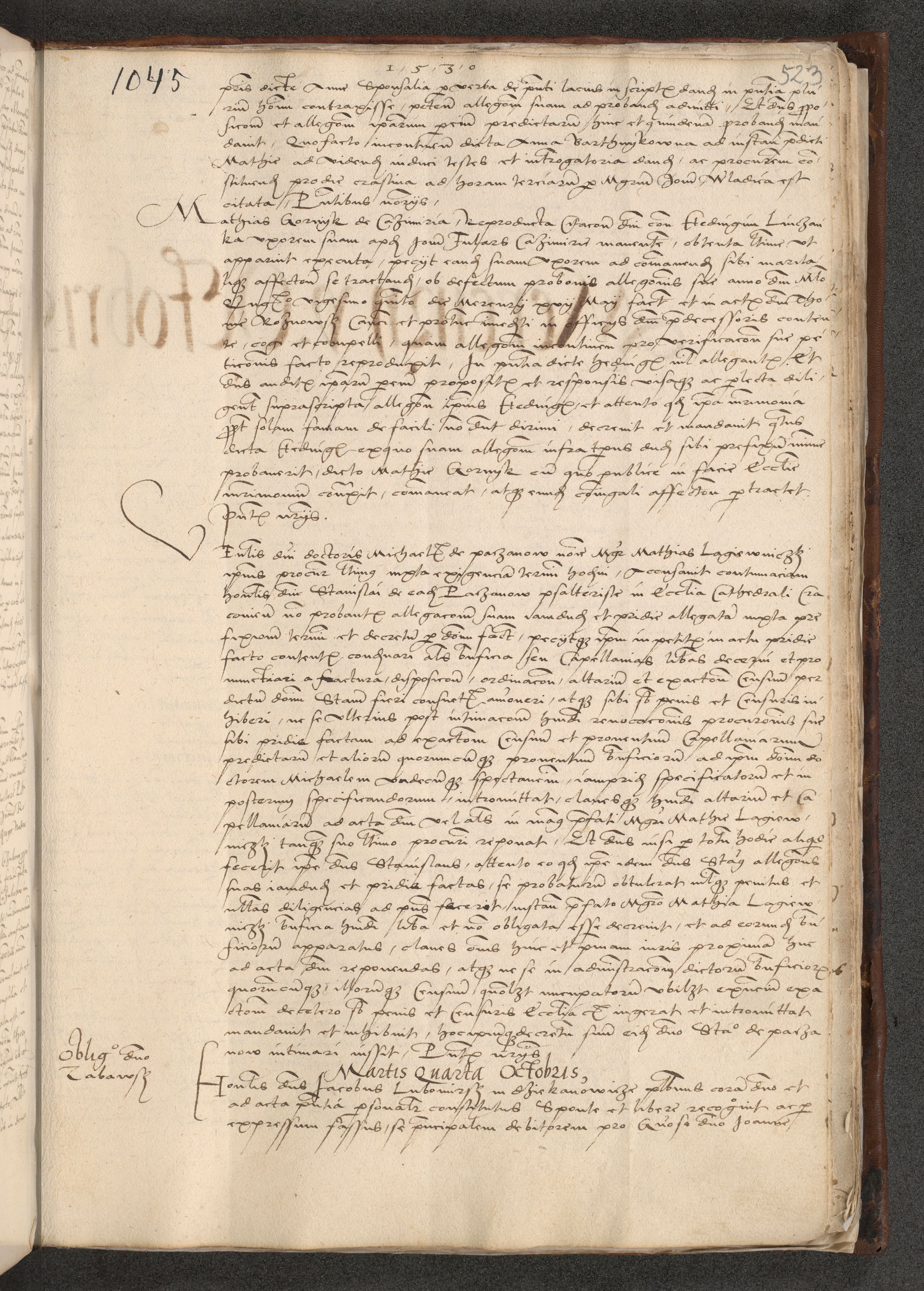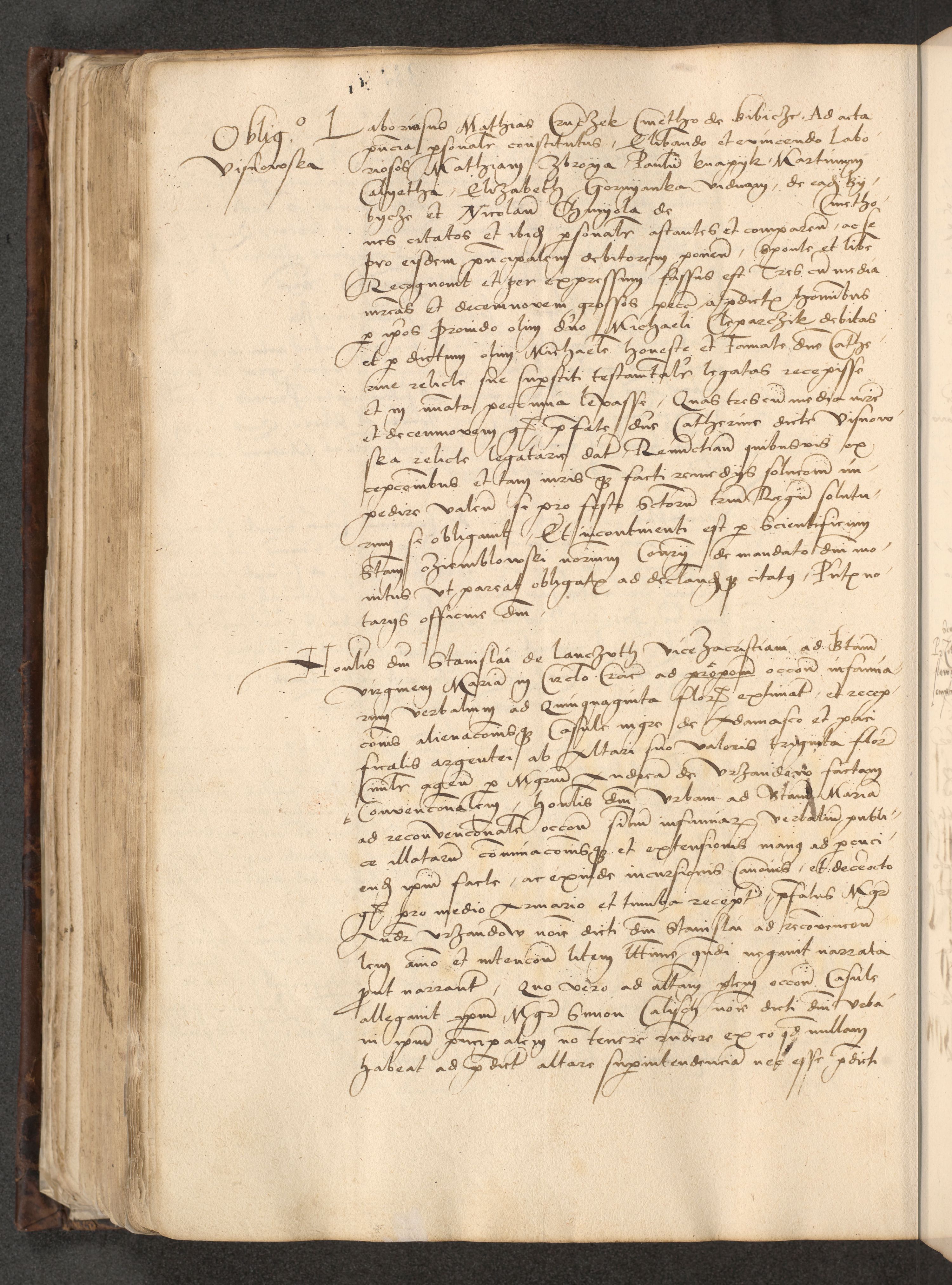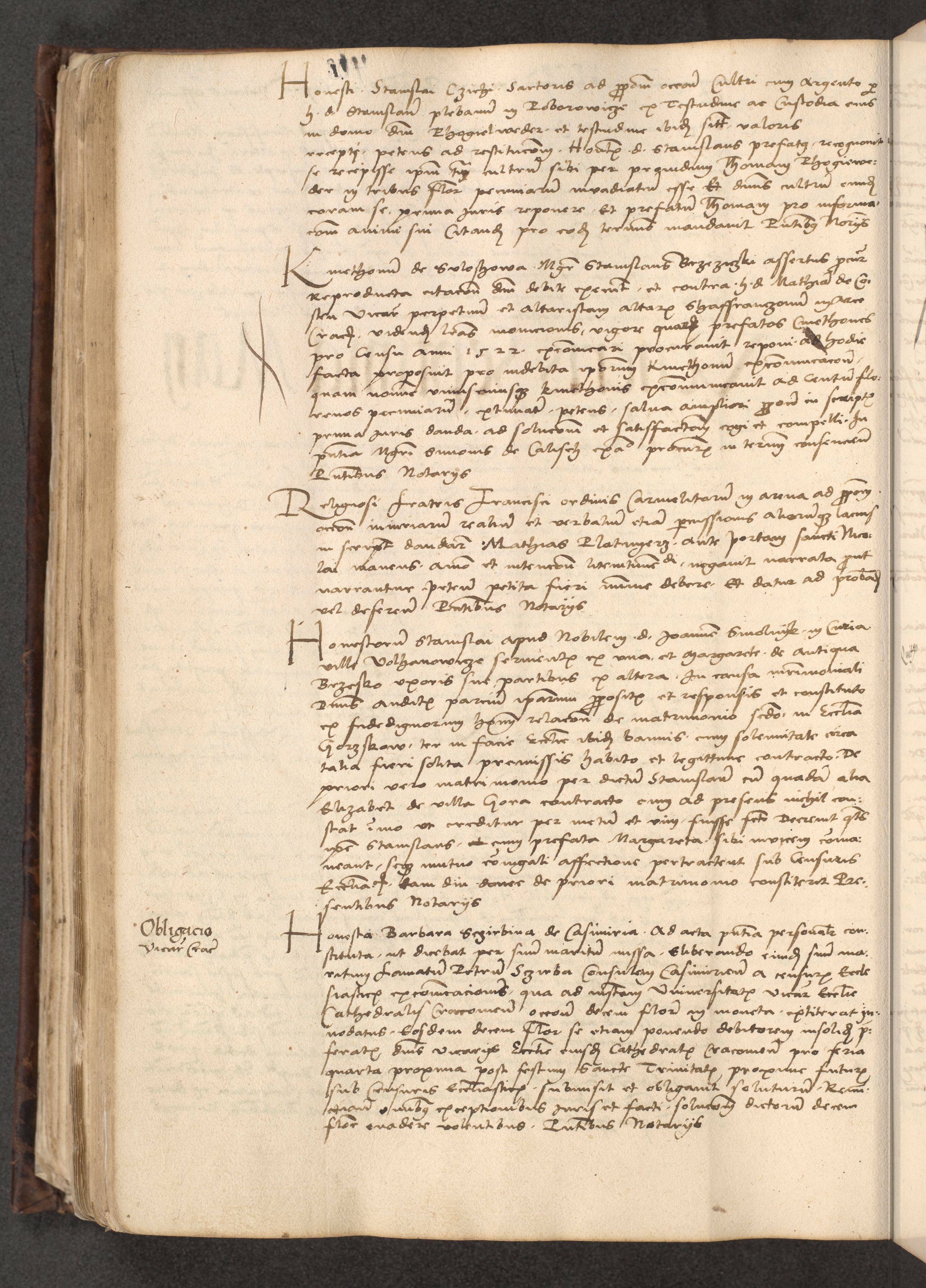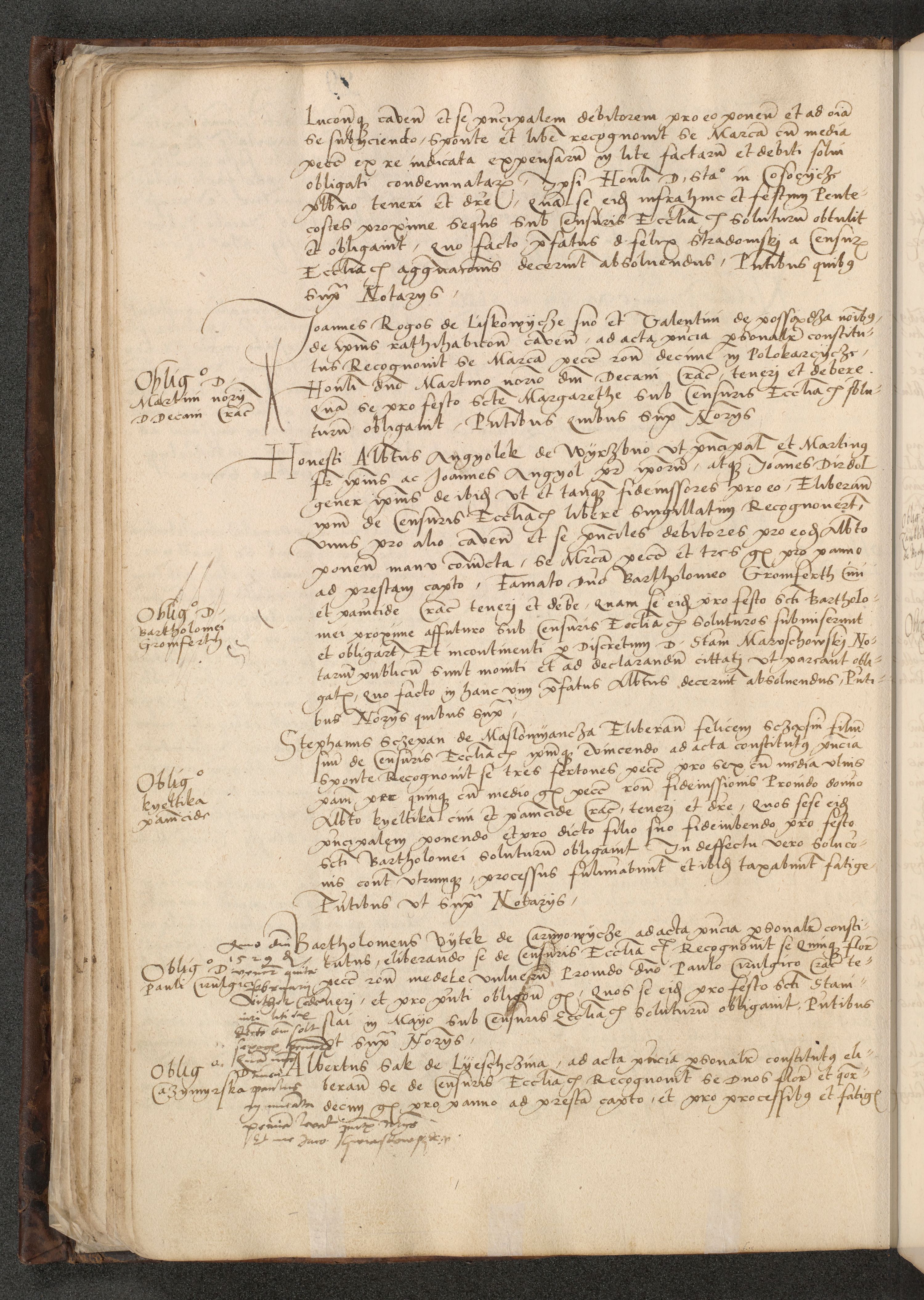 INRI. Acta actorum, obligacionum et sentenciarum tam interlocutoriarum quam diffinitivarum coram reverendo patre ac egregio viro domino Jacobo Erciss[o]wski decretorum doctorem, canonico et officiali generali Cracoviensi ad annum Domini 1528, indicionem primam, pontificatus sanctissimi in Christo patris et domini domini Clementis divina probidendcia pape seprtimi, annum quintum, per Stanislaum de Mordi legalem consistorii notarium omine felici inchoantur