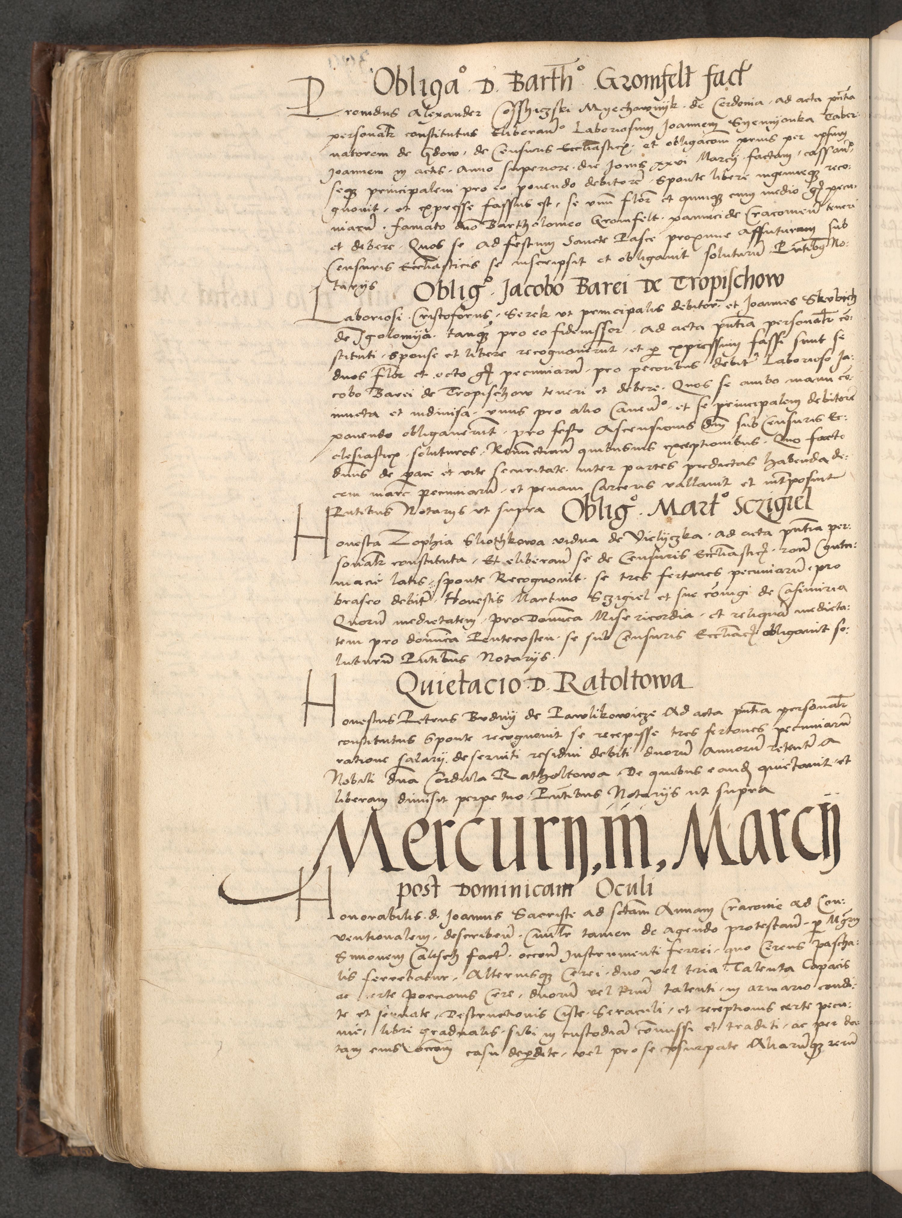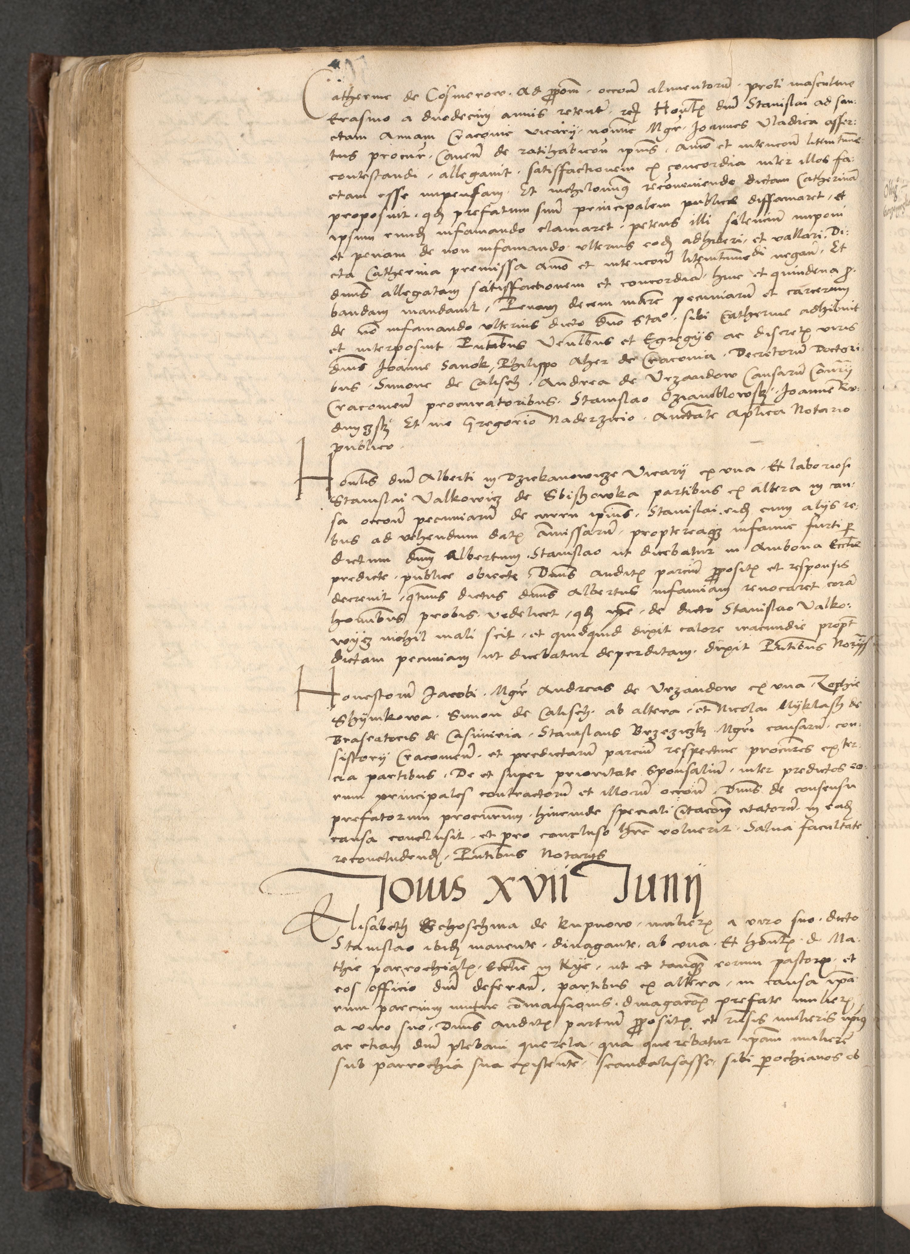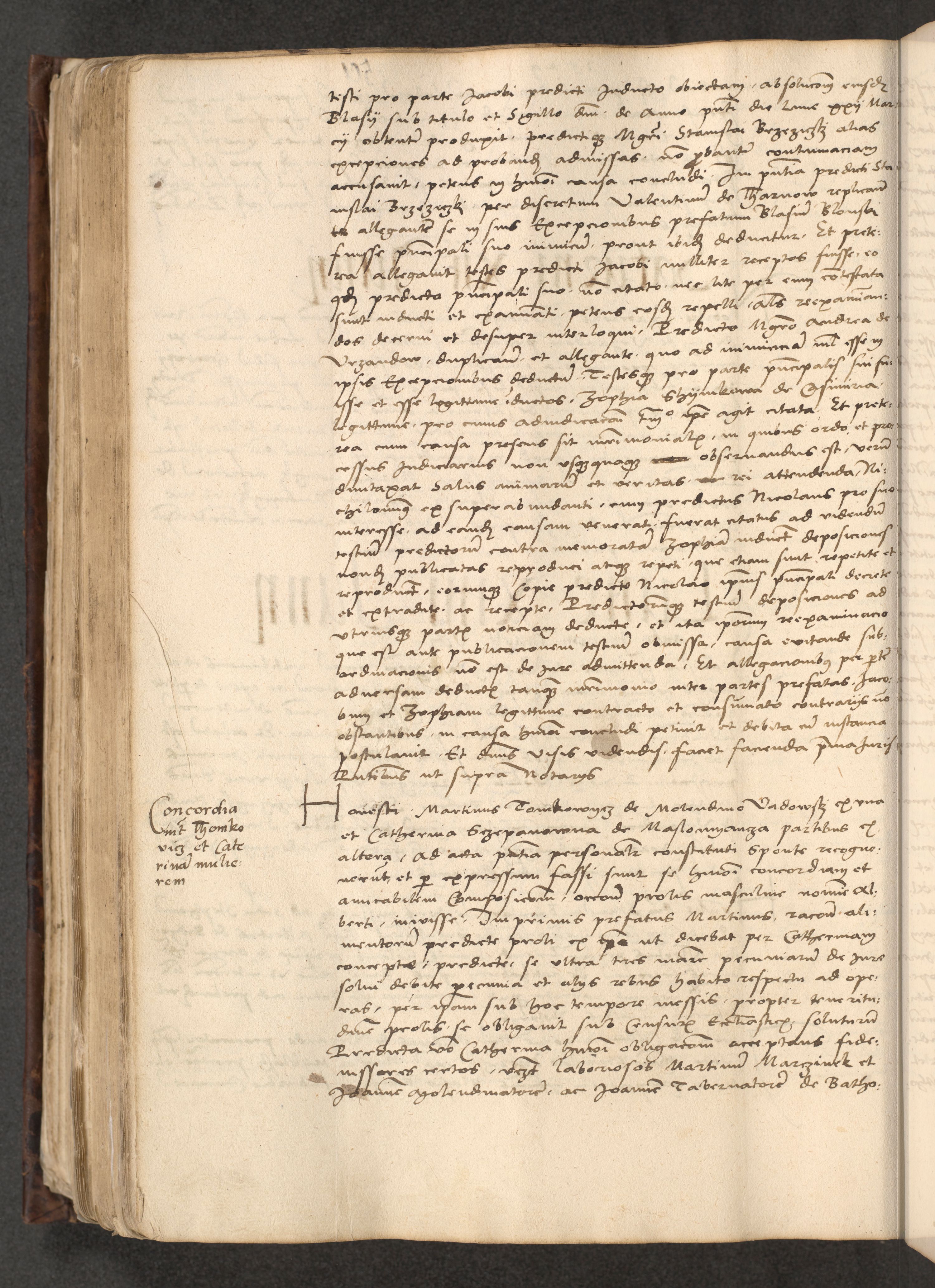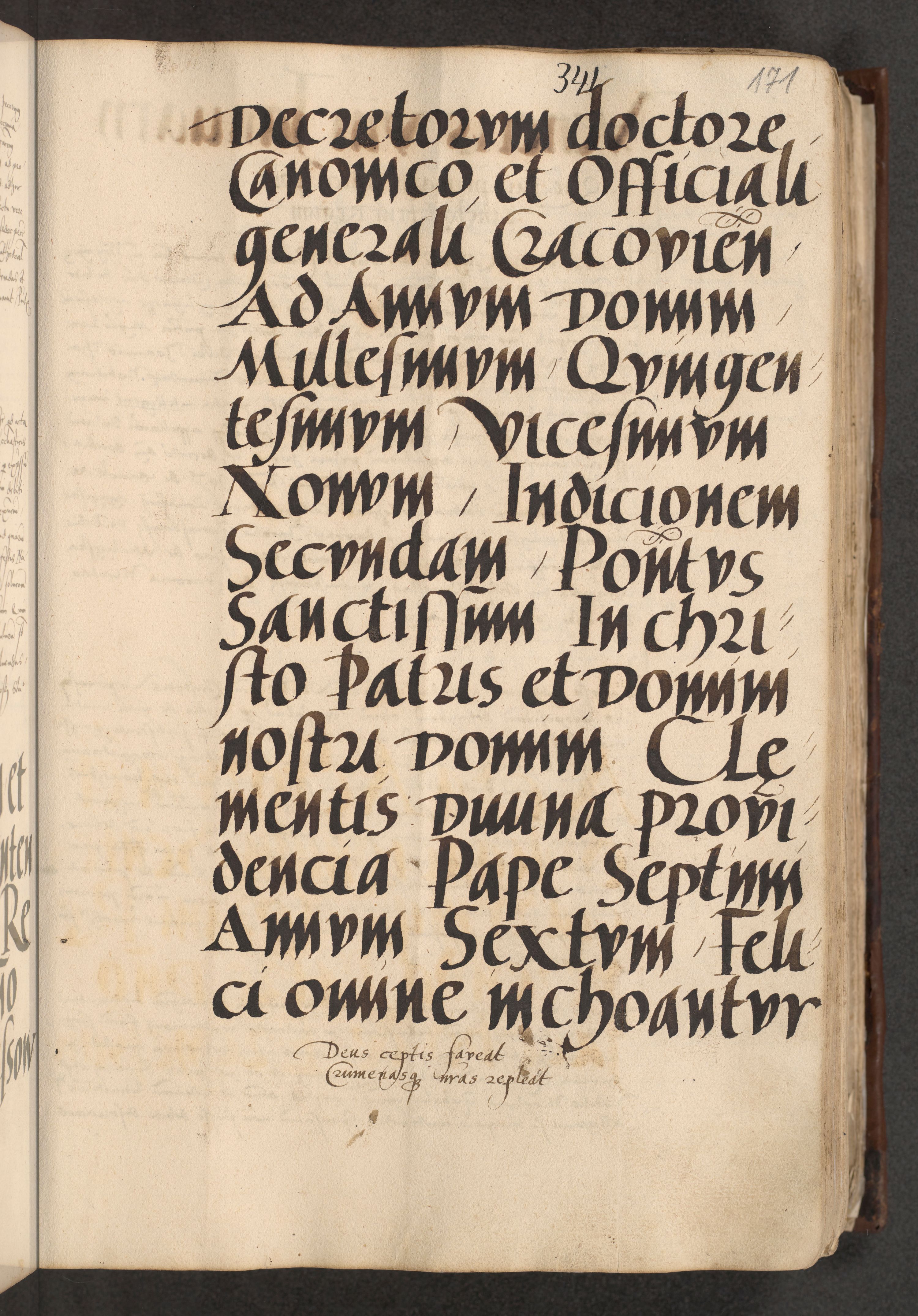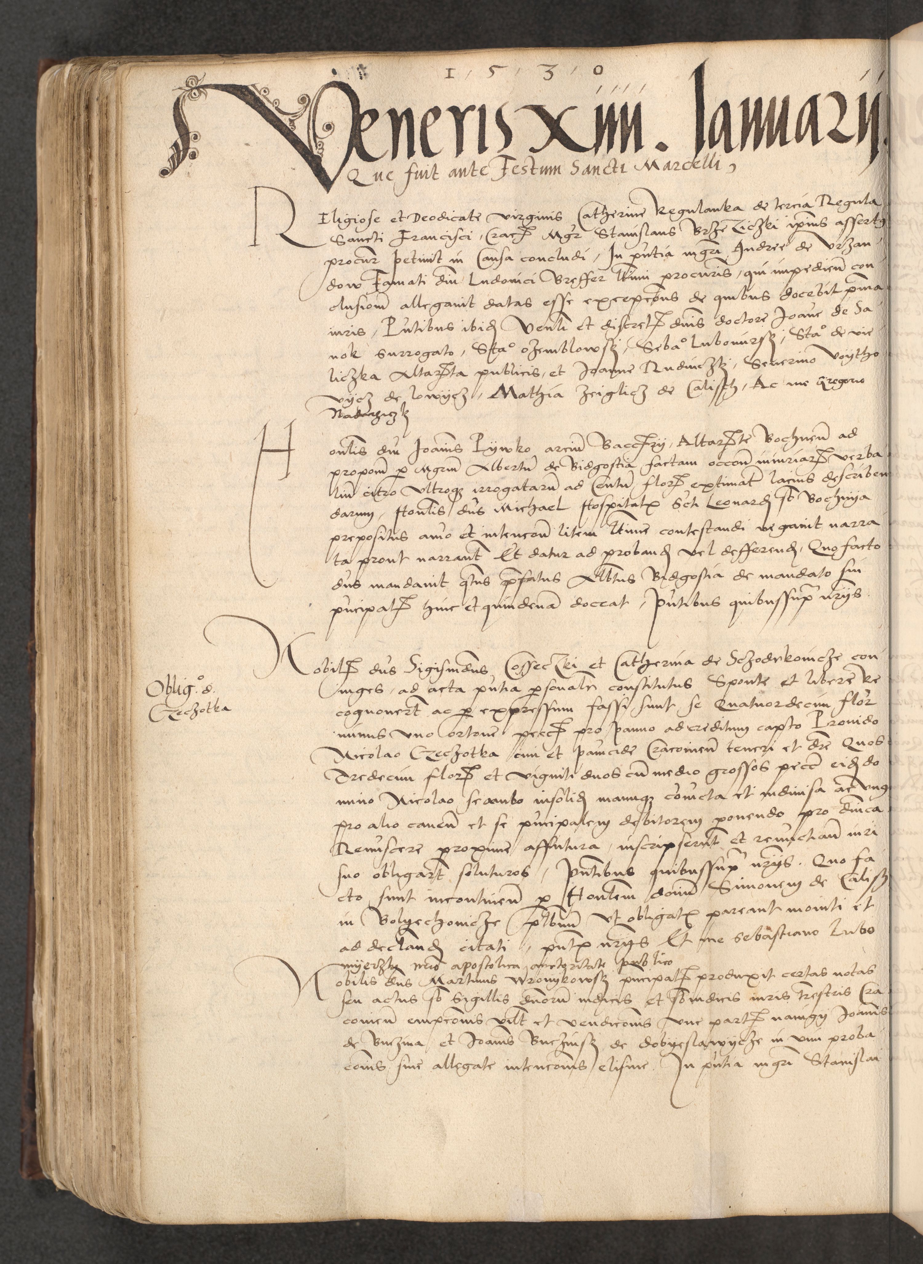INRI. Acta actorum, obligacionum et sentenciarum tam interlocutoriarum quam diffinitivarum coram reverendo patre ac egregio viro domino Jacobo Erciss[o]wski decretorum doctorem, canonico et officiali generali Cracoviensi ad annum Domini 1528, indicionem primam, pontificatus sanctissimi in Christo patris et domini domini Clementis divina probidendcia pape seprtimi, annum quintum, per Stanislaum de Mordi legalem consistorii notarium omine felici inchoantur